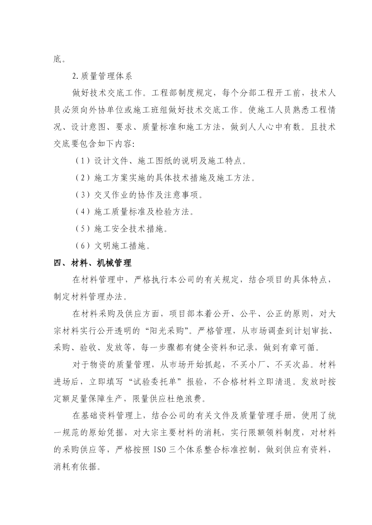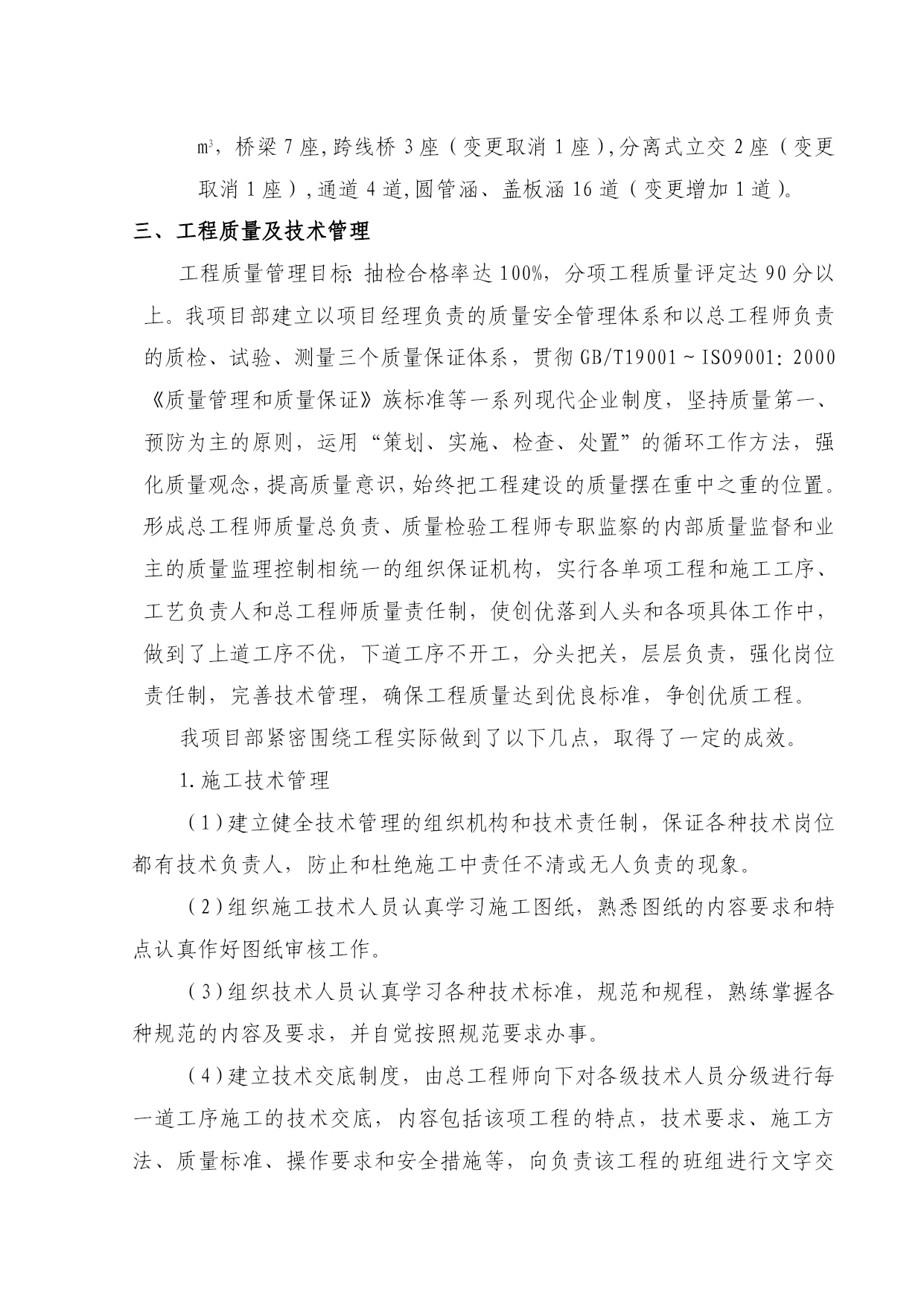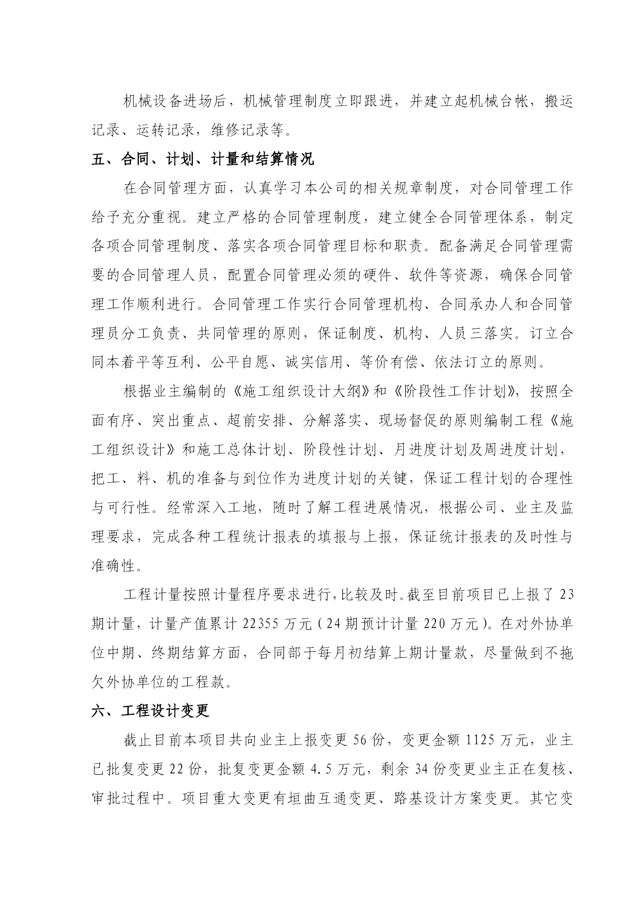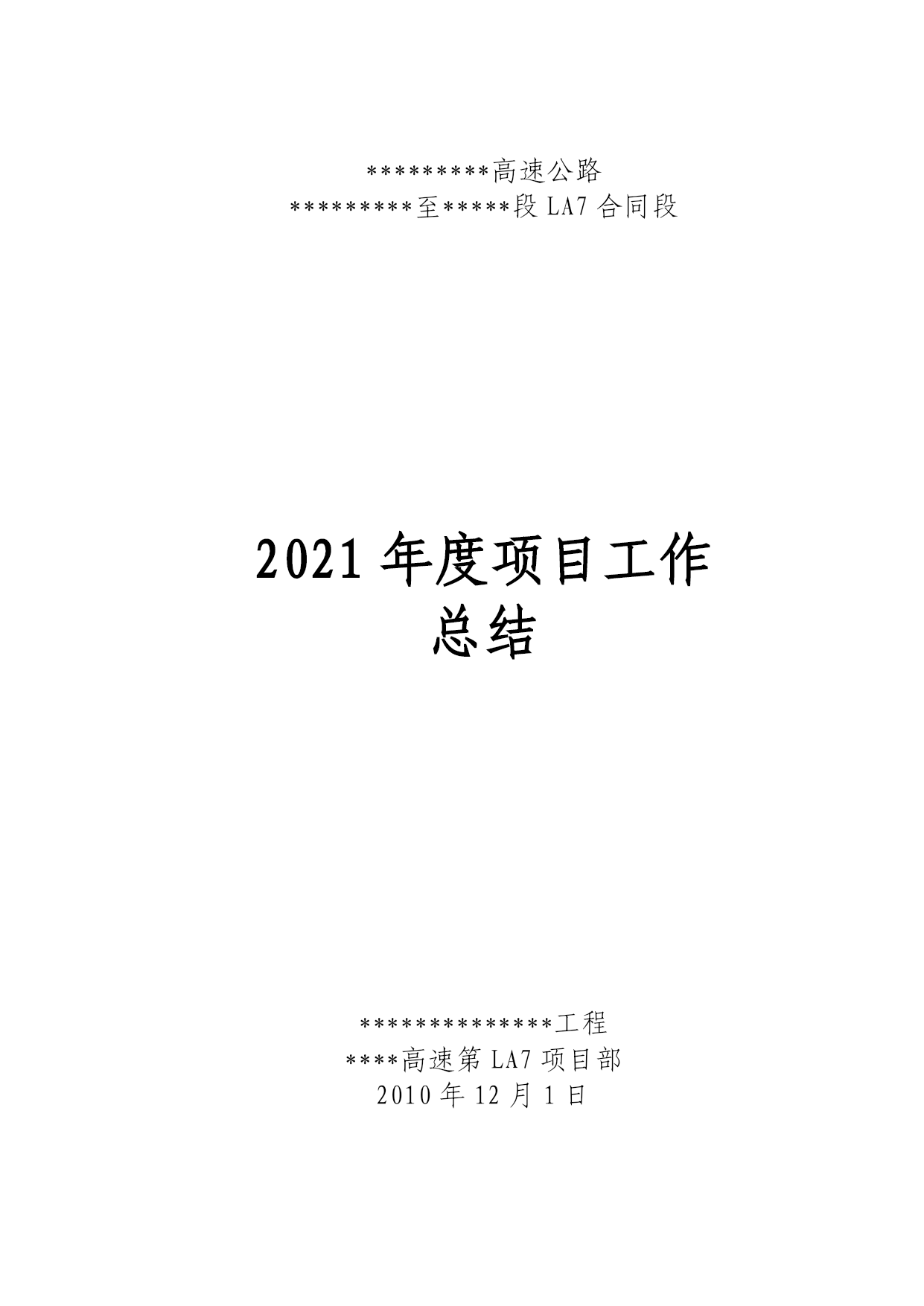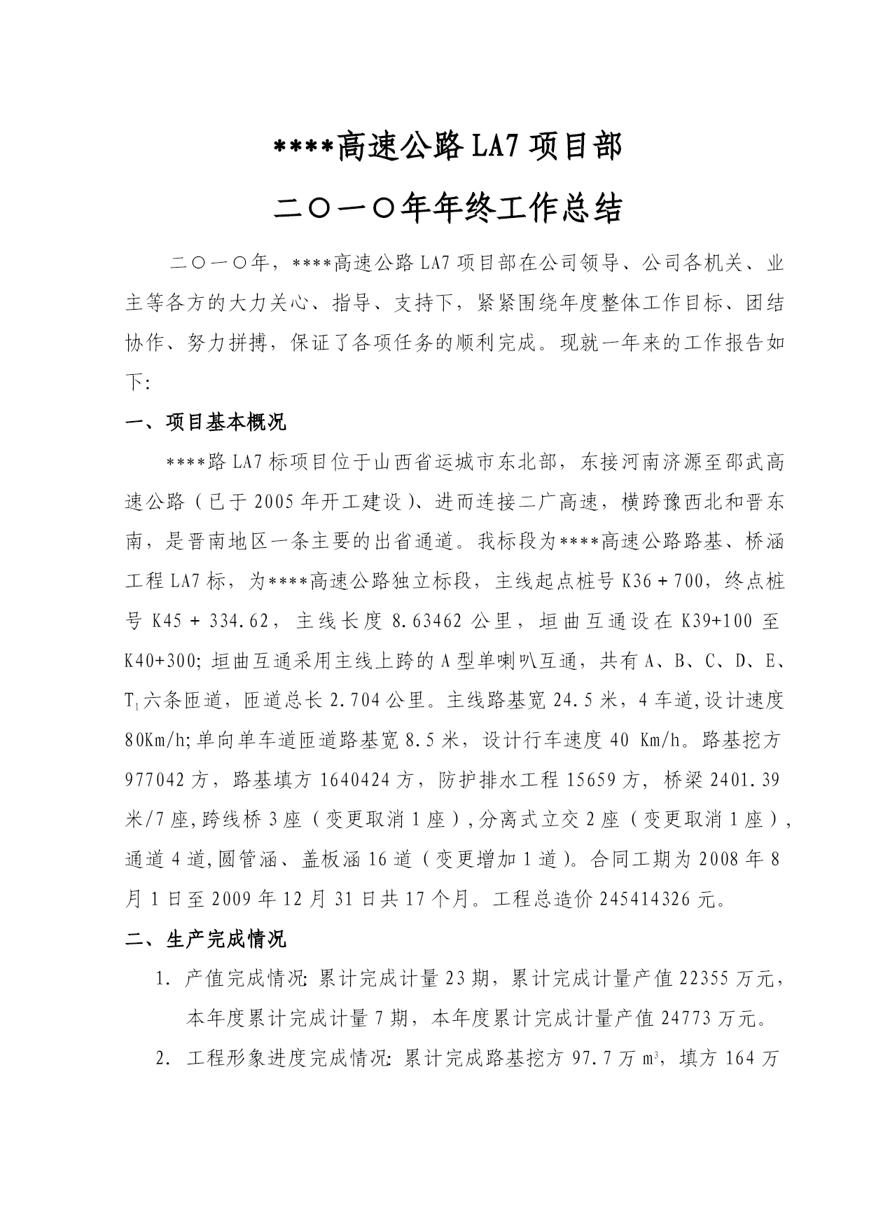 *********高速公路 *********至*****段LA7合同段 2021年度项目工作 总结 **************工程 ****高速第LA7项目部 2010年12月1日 ****高速公路LA7项目部 二○一○年年终工作总结 二○一○年,****高速公路LA7项目部在公司领导、公司各机关、业主等各方的大力关心、指导、支持下,紧紧围绕年度整体工作目标、团结协作、努力拼搏,保证了各项任务的顺利完成。现就一年来的工作报告如下: 一、项目基本概况 ****路LA7标项目位于山西省运城市东北部,东接河南济源至邵武高速公路(已于2005年开工建设)、进而连接二广高速,横跨豫西北和晋东南,是晋南地区一条主要的出省通道。我标段为****高速公路路基、桥涵工程LA7标,为****高速公路独立标段,主线起点桩号K36+700,终点桩号K45+334.62,主线长度8.63462公里,垣曲互通设在K39+100至K40+300;垣曲互通采用主线上跨的A型单喇叭互通,共有A、B、C、D、E、T1六条匝道,匝道总长2.704公里。主线路基宽24.5米,4车道,设计速度80Km/h;单向单车道匝道路基宽8.5米,设计行车速度40Km/h。路基挖方977042方,路基填方1640424方,防护排水工程15659方,桥梁2401.39米/7座,跨线桥3座(变更取消1座),分离式立交2座(变更取消1座),通道4道,圆管涵、盖板涵16道(变更增加1道)。合同工期为2008年8月1日至2009年12月31日共17个月。工程总造价245414326元。 二、生产完成情况 1.产值完成情况:累计完成计量23期,累计完成计量产值22355万元,本年度累计完成计量7期,本年度累计完成计量产值24773万元。 2.工程形象进度完成情况:累计完成路基挖方97.7万m3,填方164万m3,桥梁7座,跨线桥3座(变更取消1座),分离式立交2座(变更取消1座),通道4道,圆管涵、盖板涵16道(变更增加1道)。 三、工程质量及技术管理 工程质量管理目标:抽检合格率达100%,分项工程质量评定达90分以上。我项目部建立以项目经理负责的质量安全管理体系和以总工程师负责的质检、试验、测量三个质量保证体系,贯彻GB/T19001~ISO9001:2000《质量管理和质量保证》族标准等一系列现代企业制度,坚持质量第一、预防为主的原则,运用“策划、实施、检查、处置”的循环工作方法,强化质量观念,提高质量意识,始终把工程建设的质量摆在重中之重的位置。形成总工程师质量总负责、质量检验工程师专职监察的内部质量监督和业主的质量监理控制相统一的组织保证机构,实行各单项工程和施工工序、工艺负责人和总工程师质量责任制,使创优落到人头和各项具体工作中,做到了上道工序不优,下道工序不开工,分头把关,层层负责,强化岗位责任制,完善技术管理,确保工程质量达到优良标准,争创优质工程。 我项目部紧密围绕工程实际做到了以下几点,取得了一定的成效。 1.施工技术管理 (1)建立健全技术管理的组织机构和技术责任制,保证各种技术岗位都有技术负责人,防止和杜绝施工中责任不清或无人负责的现象。 (2)组织施工技术人员认真学习施工图纸,熟悉图纸的内容要求和特点认真作好图纸审核工作。 (3)组织技术人员认真学习各种技术标准,规范和规程,熟练掌握各种规范的内容及要求,并自觉按照规范要求办事。 (4)建立技术交底制度,由总工程师向下对各级技术人员分级进行每一道工序施工的技术交底,内容包括该项工程的特点,技术要求、施工方法、质量标准、操作要求和安全措施等,向负责该工程的班组进行文字交底。 2.质量管理体系 做好技术交底工作。工程部制度规定,每个分部工程开工前,技术人员必须向外协单位或施工班组做好技术交底工作。使施工人员熟悉工程情况、设计意图、要求、质量标准和施工方法,做到人人心中有数。且技术交底要包含如下内容: (1)设计文件、施工图纸的说明及施工特点。 (2)施工方案实施的具体技术措施及施工方法。 (3)交叉作业的协作及注意事项。 (4)施工质量标准及检验方法。 (5)施工安全技术措施。 (6)文明施工措施。 四、材料、机械管理 在材料管理中,严格执行本公司的有关规定,结合项目的具体特点,制定材料管理办法。 在材料采购及供应方面,项目部本着公开、公平、公正的原则,对大宗材料实行公开透明的“阳光采购”。严格管理,从市场调查到计划审批、采购、验收、发放等,每一步骤都有健全资料和记录,做到有章可循。 对于物资的质量管理,从市场开始抓起,不买小厂、不买次品。材料进场后,立即填写“试验委托单”报验,不合格材料立即清退。发放时按定额足量保障生产,限量供