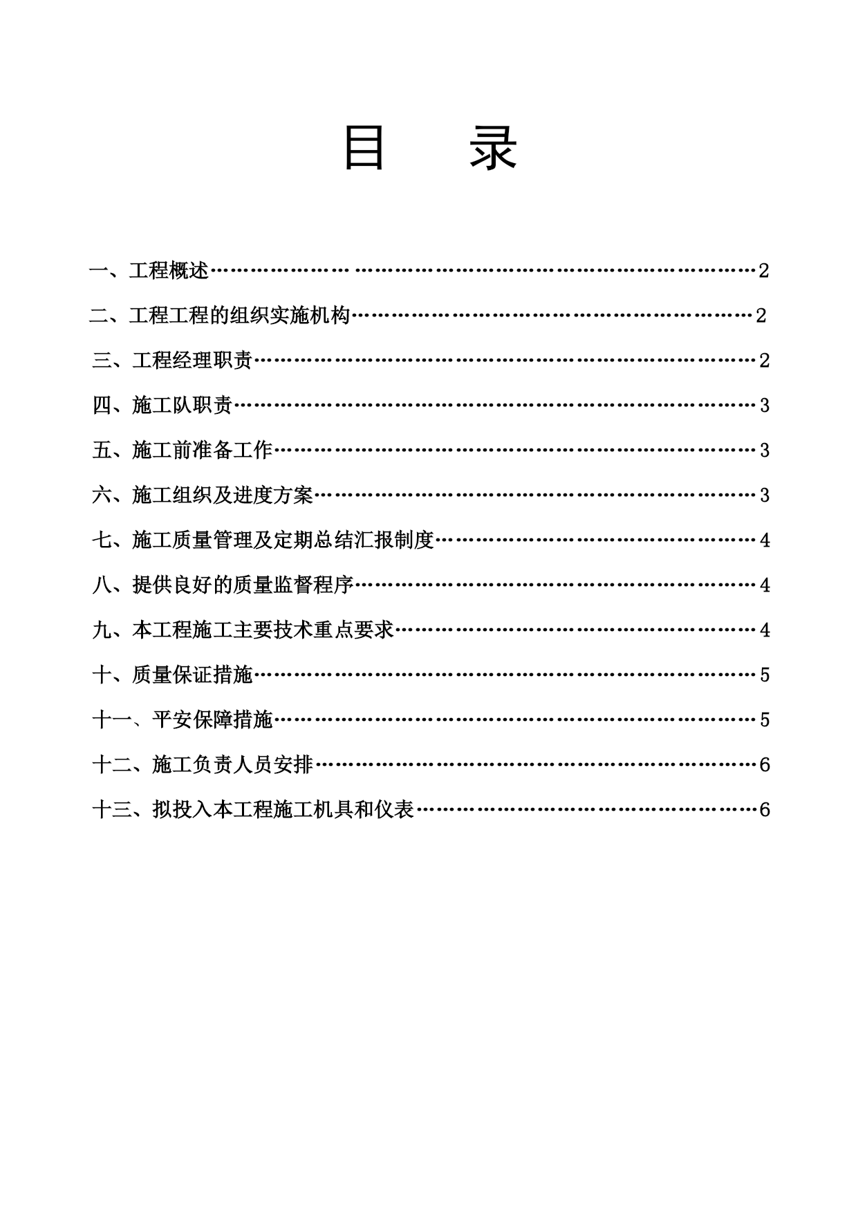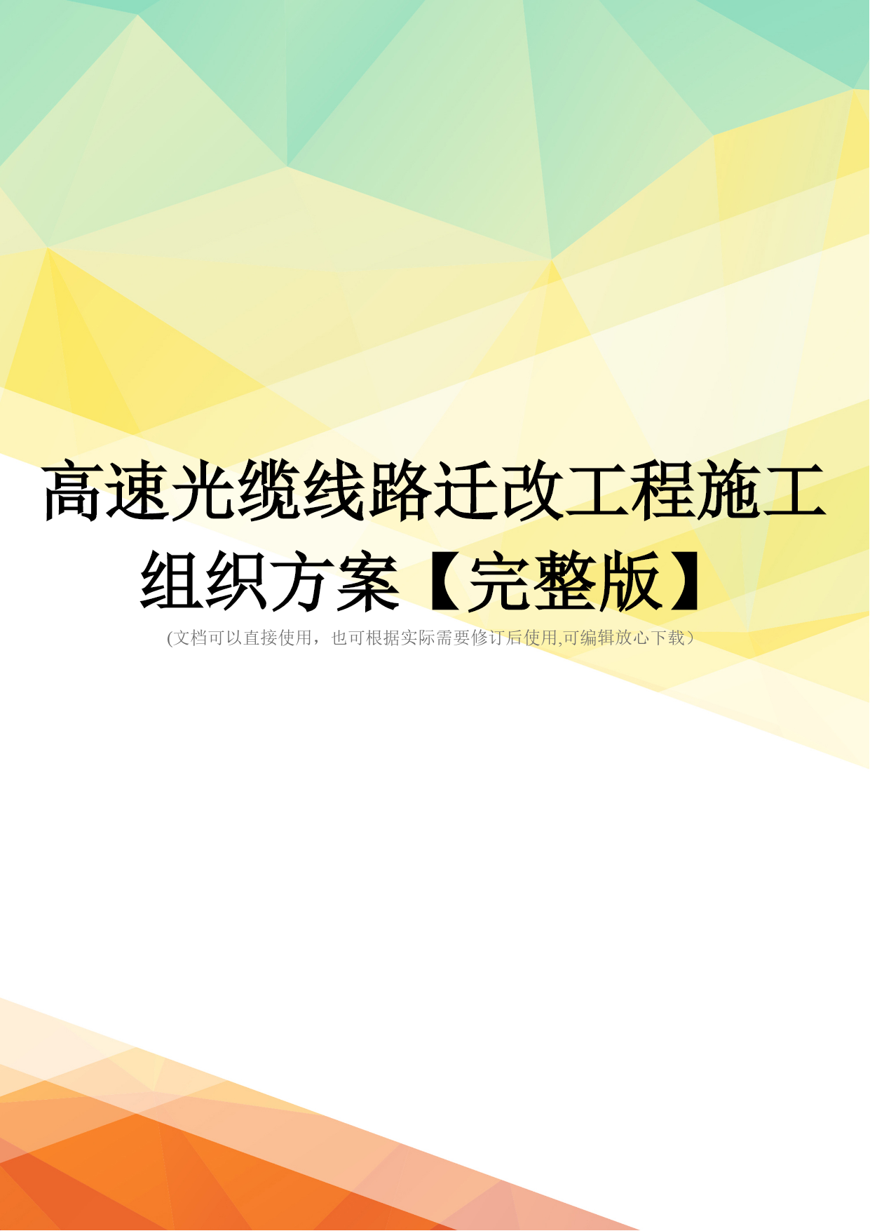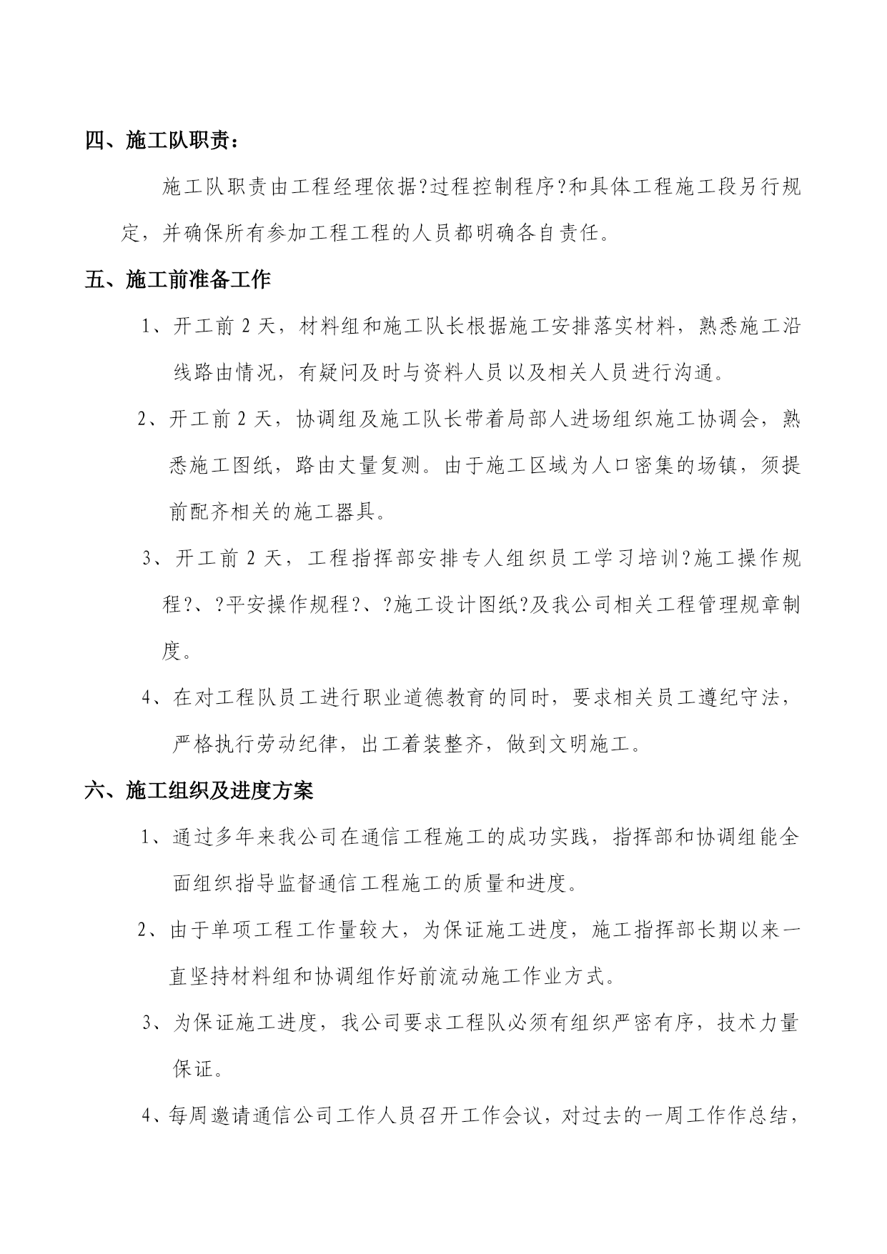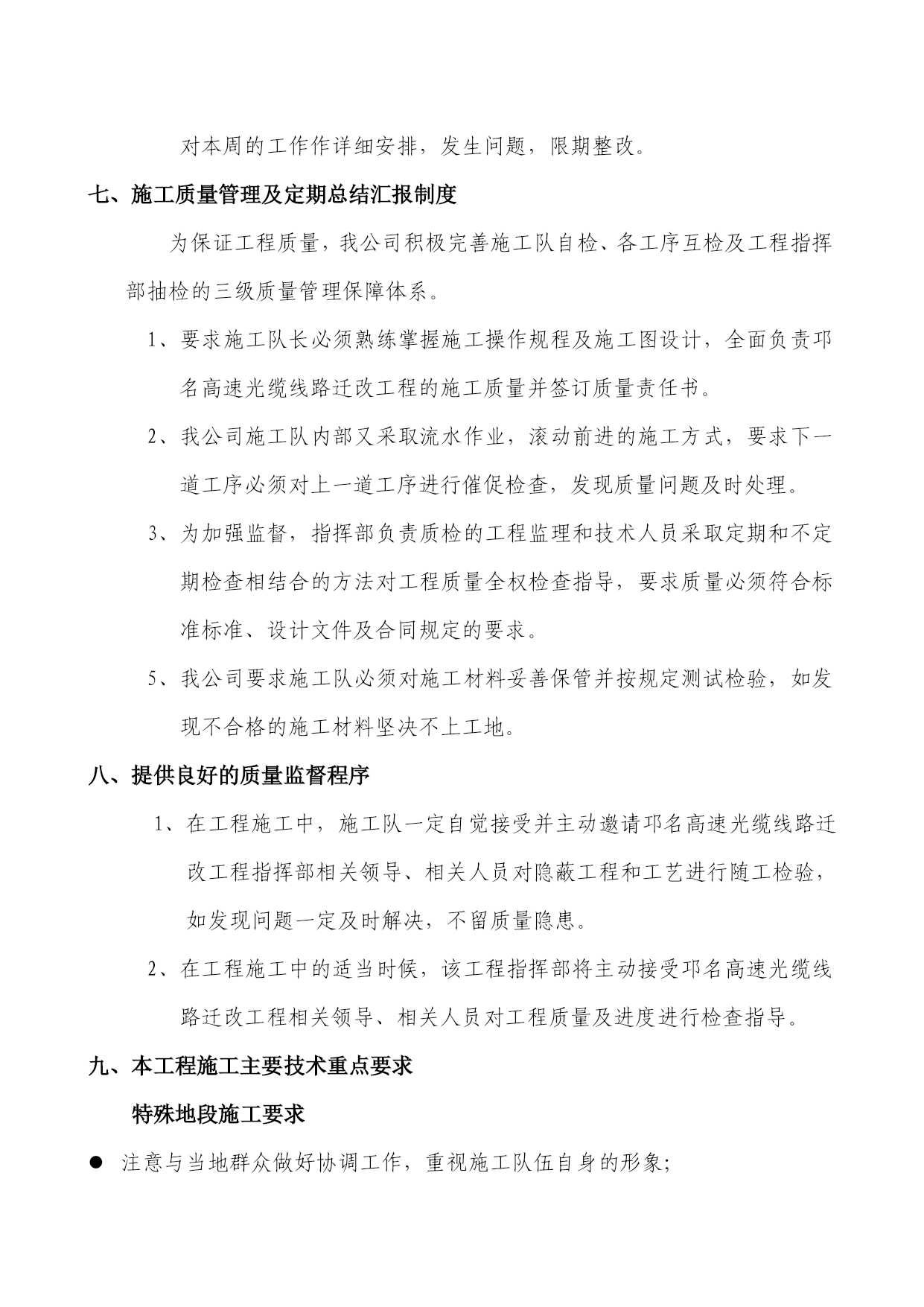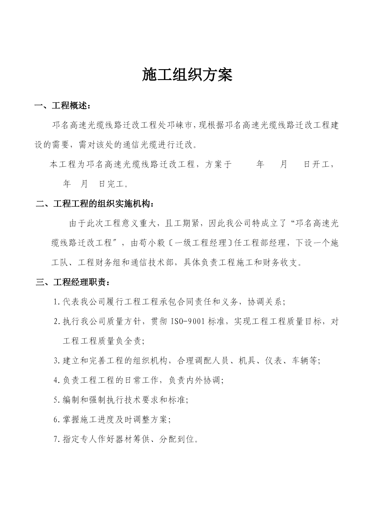 高速光缆线路迁改工程施工组织方案【完整版】 (文档可以直接使用,也可根据实际需要修订后使用,可编辑放心下载) 目录 一、工程概述………………… ……………………………………………………2 二、工程工程的组织实施机构……………………………………………………2 三、工程经理职责…………………………………………………………………2 四、施工队职责……………………………………………………………………3 五、施工前准备工作………………………………………………………………3 六、施工组织及进度方案…………………………………………………………3 七、施工质量管理及定期总结汇报制度…………………………………………4 八、提供良好的质量监督程序……………………………………………………4 九、本工程施工主要技术重点要求………………………………………………4 十、质量保证措施…………………………………………………………………5 十一、平安保障措施………………………………………………………………5 十二、施工负责人员安排…………………………………………………………6 十三、拟投入本工程施工机具和仪表……………………………………………6 施工组织方案 一、工程概述: 邛名高速光缆线路迁改工程处邛崃市,现根据邛名高速光缆线路迁改工程建设的需要,需对该处的通信光缆进行迁改。 本工程为邛名高速光缆线路迁改工程,方案于年月日开工,年月日完工。 二、工程工程的组织实施机构: 由于此次工程意义重大,且工期紧,因此我公司特成立了“邛名高速光缆线路迁改工程〞,由苟小毅〔一级工程经理〕任工程部经理,下设一个施工队、工程财务组和通信技术部,具体负责工程施工和财务收支。 三、工程经理职责: 1.代表我公司履行工程工程承包合同责任和义务,协调关系; 2.执行我公司质量方针,贯彻ISO-9001标准,实现工程工程质量目标,对工程工程质量负全责; 3.建立和完善工程的组织机构,合理调配人员、机具、仪表、车辆等; 4.负责工程工程的日常工作,负责内外协调; 5.编制和强制执行技术要求和标准; 6.掌握施工进度及时调整方案; 7.指定专人作好器材筹供、分配到位。 四、施工队职责: 施工队职责由工程经理依据?过程控制程序?和具体工程施工段另行规定,并确保所有参加工程工程的人员都明确各自责任。 五、施工前准备工作 1、开工前2天,材料组和施工队长根据施工安排落实材料,熟悉施工沿线路由情况,有疑问及时与资料人员以及相关人员进行沟通。 2、开工前2天,协调组及施工队长带着局部人进场组织施工协调会,熟悉施工图纸,路由丈量复测。由于施工区域为人口密集的场镇,须提前配齐相关的施工器具。 3、开工前2天,工程指挥部安排专人组织员工学习培训?施工操作规程?、?平安操作规程?、?施工设计图纸?及我公司相关工程管理规章制度。 4、在对工程队员工进行职业道德教育的同时,要求相关员工遵纪守法,严格执行劳动纪律,出工着装整齐,做到文明施工。 六、施工组织及进度方案 1、通过多年来我公司在通信工程施工的成功实践,指挥部和协调组能全面组织指导监督通信工程施工的质量和进度。 2、由于单项工程工作量较大,为保证施工进度,施工指挥部长期以来一直坚持材料组和协调组作好前流动施工作业方式。 3、为保证施工进度,我公司要求工程队必须有组织严密有序,技术力量保证。 4、每周邀请通信公司工作人员召开工作会议,对过去的一周工作作总结,对本周的工作作详细安排,发生问题,限期整改。 七、施工质量管理及定期总结汇报制度 为保证工程质量,我公司积极完善施工队自检、各工序互检及工程指挥部抽检的三级质量管理保障体系。 1、要求施工队长必须熟练掌握施工操作规程及施工图设计,全面负责邛名高速光缆线路迁改工程的施工质量并签订质量责任书。 2、我公司施工队内部又采取流水作业,滚动前进的施工方式,要求下一道工序必须对上一道工序进行催促检查,发现质量问题及时处理。 3、为加强监督,指挥部负责质检的工程监理和技术人员采取定期和不定期检查相结合的方法对工程质量全权检查指导,要求质量必须符合标准标准、设计文件及合同规定的要求。 5、我公司要求施工队必须对施工材料妥善保管并按规定测试检验,如发现不合格的施工材料坚决不上工地。 八、提供良好的质量监督程序 1、在工程施工中,施工队一定自觉接受并主动邀请邛名高速光缆线路迁改工程指挥部相关领导、相关人员对隐蔽工程和工艺进行随工检验,如发现问题一定及时解决,不留质量隐患。 2、在工程施工中的适当时候,该工程指挥部将主动接受邛名高速光缆线路迁改工程相关领导、相关人员对工程质量及进度进行检查指导。 九、本工程施工主要技术重点要求 特殊地段施工要求 注意与当地群众做好协调工作,重视施工队伍自身的形象; 由于施工地点