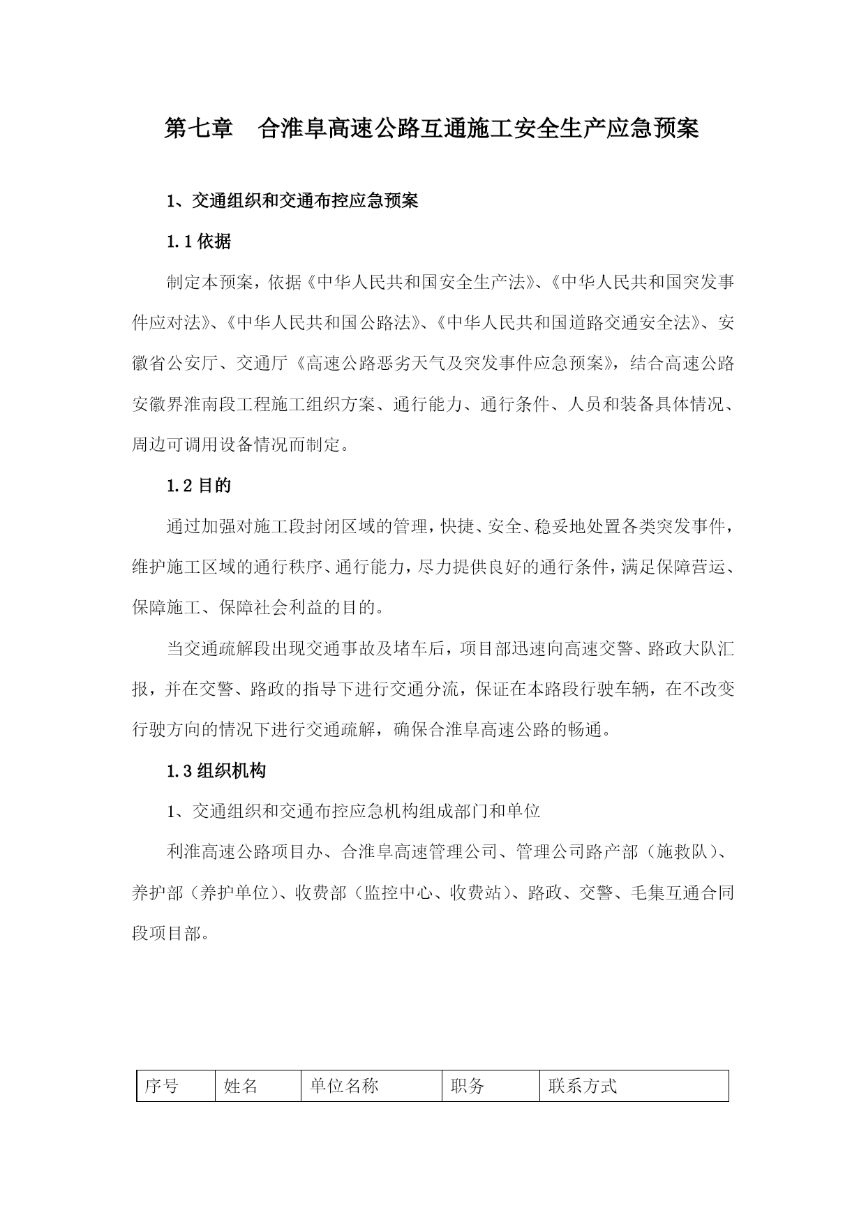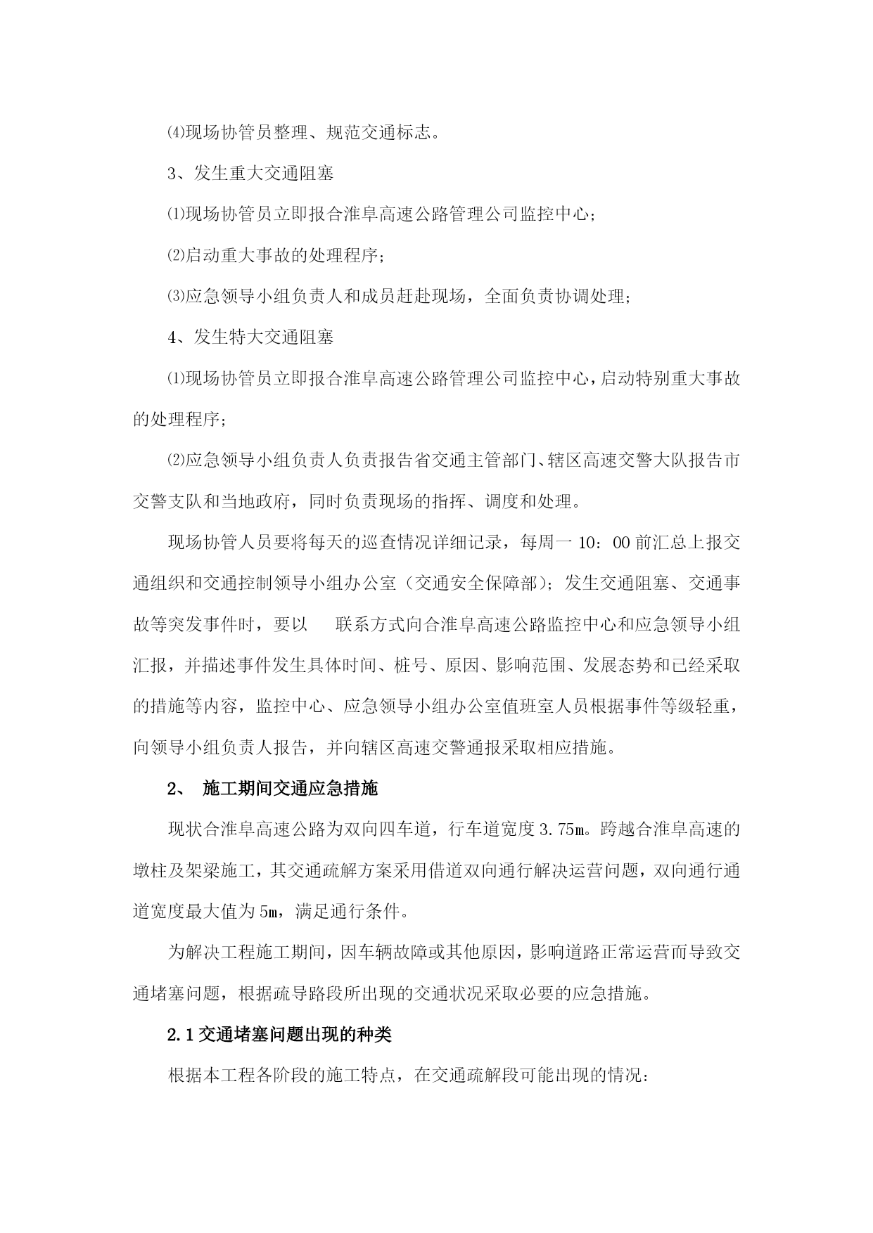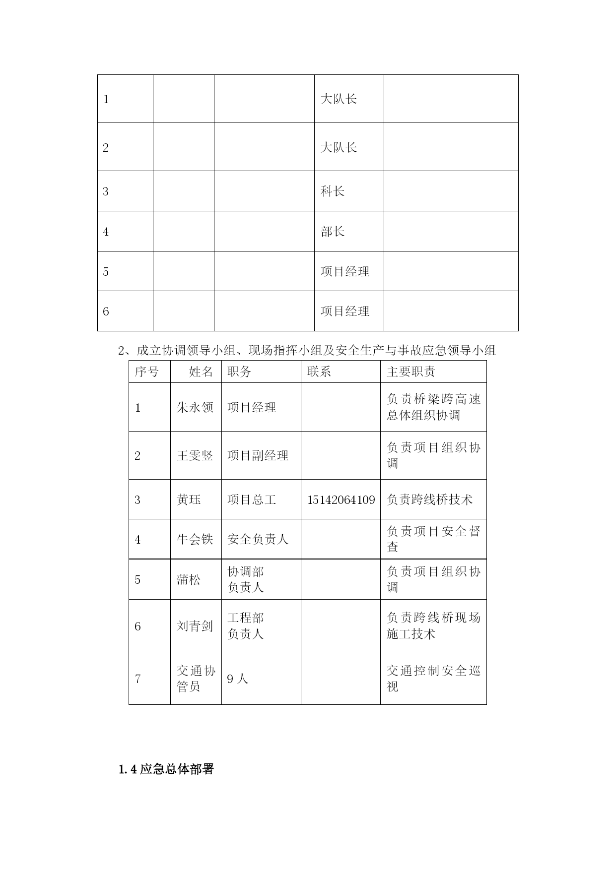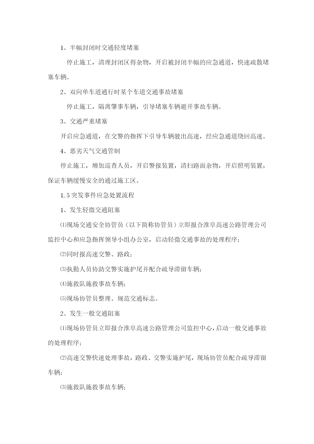 高速公路互通施工安全生产应急预案优质资料 (可以直接使用,可编辑优质资料,欢迎下载) 第七章合淮阜高速公路互通施工安全生产应急预案 1、交通组织和交通布控应急预案 1.1依据 制定本预案,依据《中华人民共和国安全生产法》、《中华人民共和国突发事件应对法》、《中华人民共和国公路法》、《中华人民共和国道路交通安全法》、安徽省公安厅、交通厅《高速公路恶劣天气及突发事件应急预案》,结合高速公路安徽界淮南段工程施工组织方案、通行能力、通行条件、人员和装备具体情况、周边可调用设备情况而制定。 1.2目的 通过加强对施工段封闭区域的管理,快捷、安全、稳妥地处置各类突发事件,维护施工区域的通行秩序、通行能力,尽力提供良好的通行条件,满足保障营运、保障施工、保障社会利益的目的。 当交通疏解段出现交通事故及堵车后,项目部迅速向高速交警、路政大队汇报,并在交警、路政的指导下进行交通分流,保证在本路段行驶车辆,在不改变行驶方向的情况下进行交通疏解,确保合淮阜高速公路的畅通。 1.3组织机构 1、交通组织和交通布控应急机构组成部门和单位 利淮高速公路项目办、合淮阜高速管理公司、管理公司路产部(施救队)、养护部(养护单位)、收费部(监控中心、收费站)、路政、交警、毛集互通合同段项目部。 序号姓名单位名称职务联系方式1大队长2大队长3科长4部长5项目经理6项目经理2、成立协调领导小组、现场指挥小组及安全生产与事故应急领导小组 序号姓名职务联系主要职责1朱永领项目经理负责桥梁跨高速总体组织协调2王雯竖项目副经理负责项目组织协调3黄珏项目总工15142064109负责跨线桥技术4牛会铁安全负责人负责项目安全督查5蒲松协调部 负责人负责项目组织协调6刘青剑工程部 负责人负责跨线桥现场施工技术7交通协管员9人交通控制安全巡视 1.4应急总体部署 1、半幅封闭时交通轻度堵塞 停止施工,清理封闭区得杂物,开启被封闭半幅的应急通道,快速疏散堵塞车辆。 2、双向单车道通行时某个车道交通事故堵塞 停止施工,隔离肇事车辆,引导堵塞车辆避开事故车辆。 3、交通严重堵塞 开启应急通道,在交警的指挥下引导车辆驶出高速,经应急通道绕回高速。 4、恶劣天气交通管制 停止施工,增加巡查人员,开启警报装置,清扫路面杂物,开启照明装置,保证车辆缓慢安全的通过施工区。 1.5突发事件应急处置流程 1、发生轻微交通阻塞 ⑴现场交通安全协管员(以下简称协管员)立即报合淮阜高速公路管理公司监控中心和应急指挥领导小组办公室,启动轻微交通事故的处理程序; ⑵同时报高速交警、路政; ⑶执勤人员协助交警实施护尾并配合疏导滞留车辆; ⑷施救队施救事故车辆; ⑸现场协管员整理、规范交通标志。 2、发生一般交通阻塞 ⑴现场协管员立即报合淮阜高速公路管理公司监控中心,启动一般交通事故的处理程序; ⑵高速交警快速处理事故,路政、交警实施护尾,现场协管员配合疏导滞留车辆; ⑶施救队施救事故车辆; ⑷现场协管员整理、规范交通标志。 3、发生重大交通阻塞 ⑴现场协管员立即报合淮阜高速公路管理公司监控中心; ⑵启动重大事故的处理程序; ⑶应急领导小组负责人和成员赶赴现场,全面负责协调处理; 4、发生特大交通阻塞 ⑴现场协管员立即报合淮阜高速公路管理公司监控中心,启动特别重大事故的处理程序; ⑵应急领导小组负责人负责报告省交通主管部门、辖区高速交警大队报告市交警支队和当地政府,同时负责现场的指挥、调度和处理。 现场协管人员要将每天的巡查情况详细记录,每周一10:00前汇总上报交通组织和交通控制领导小组办公室(交通安全保障部);发生交通阻塞、交通事故等突发事件时,要以联系方式向合淮阜高速公路监控中心和应急领导小组汇报,并描述事件发生具体时间、桩号、原因、影响范围、发展态势和已经采取的措施等内容,监控中心、应急领导小组办公室值班室人员根据事件等级轻重,向领导小组负责人报告,并向辖区高速交警通报采取相应措施。 2、施工期间交通应急措施 现状合淮阜高速公路为双向四车道,行车道宽度3.75m。跨越合淮阜高速的墩柱及架梁施工,其交通疏解方案采用借道双向通行解决运营问题,双向通行通道宽度最大值为5m,满足通行条件。 为解决工程施工期间,因车辆故障或其他原因,影响道路正常运营而导致交通堵塞问题,根据疏导路段所出现的交通状况采取必要的应急措施。 2.1交通堵塞问题出现的种类 根据本工程各阶段的施工特点,在交通疏解段可能出现的情况: 1、恶劣天气时车辆通过施工区域出现事故; 2、施工区出现追尾事故; 3、超宽车辆无法通过; 4、因超限车辆发生交通事故。 2.2应急措施 (1)交通事故解决方案 当疏导道路出现交通事故,应立即向合淮阜高速公路交警及路政大队汇报,同时报项目应急领导小组,汇报人员必须详细的汇报事故发生时间、地点、性质、初步的危害