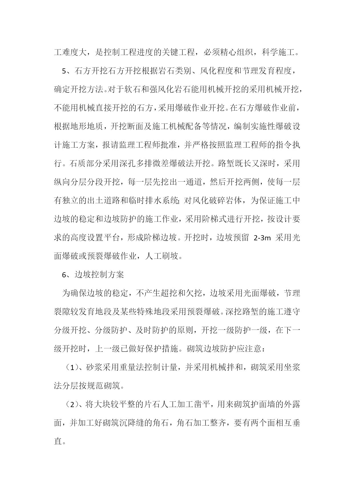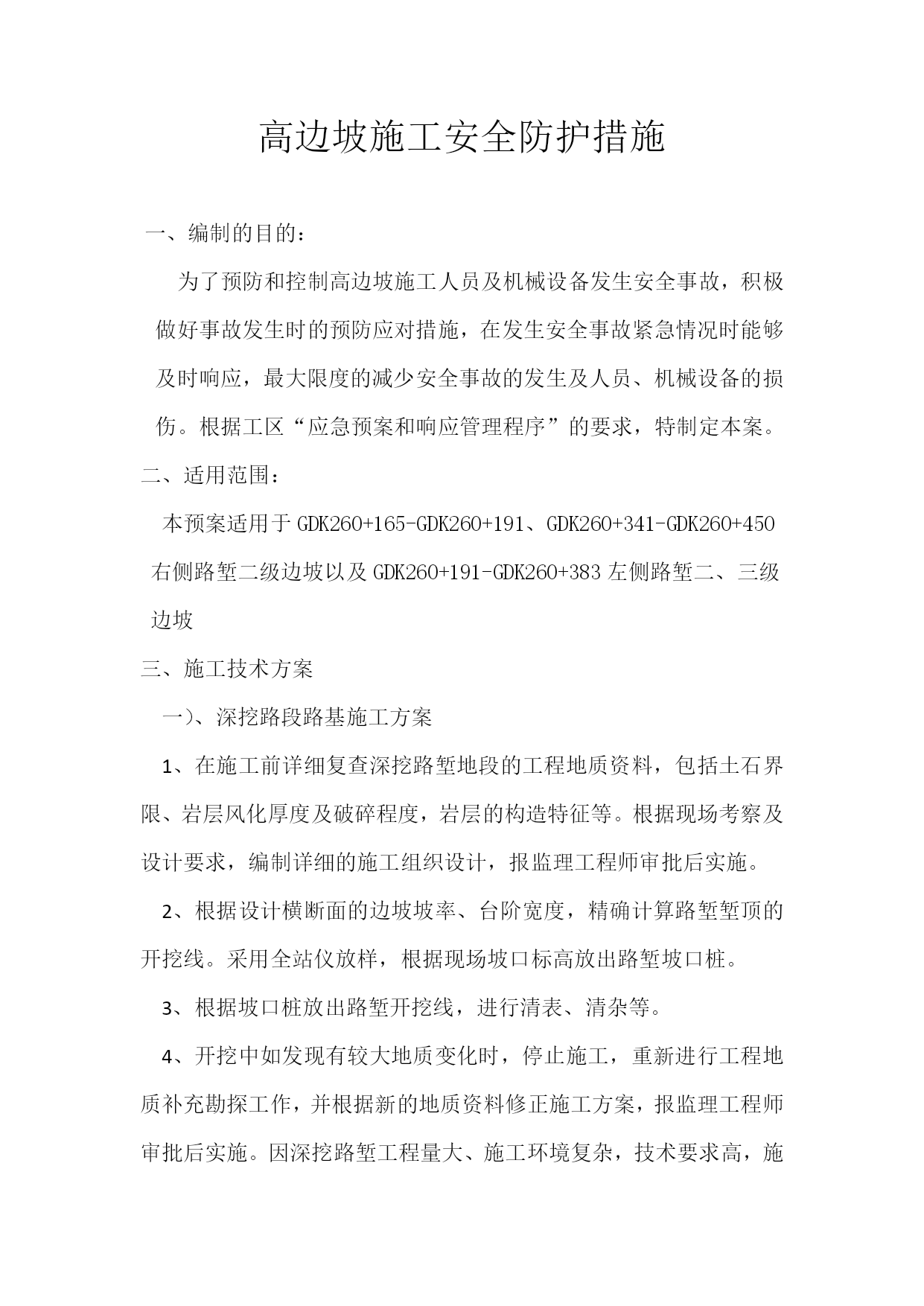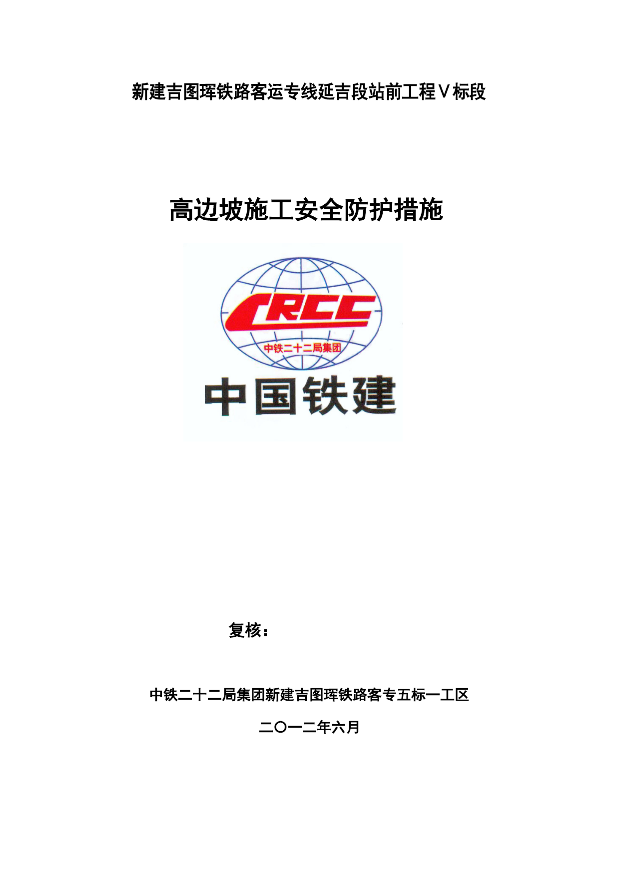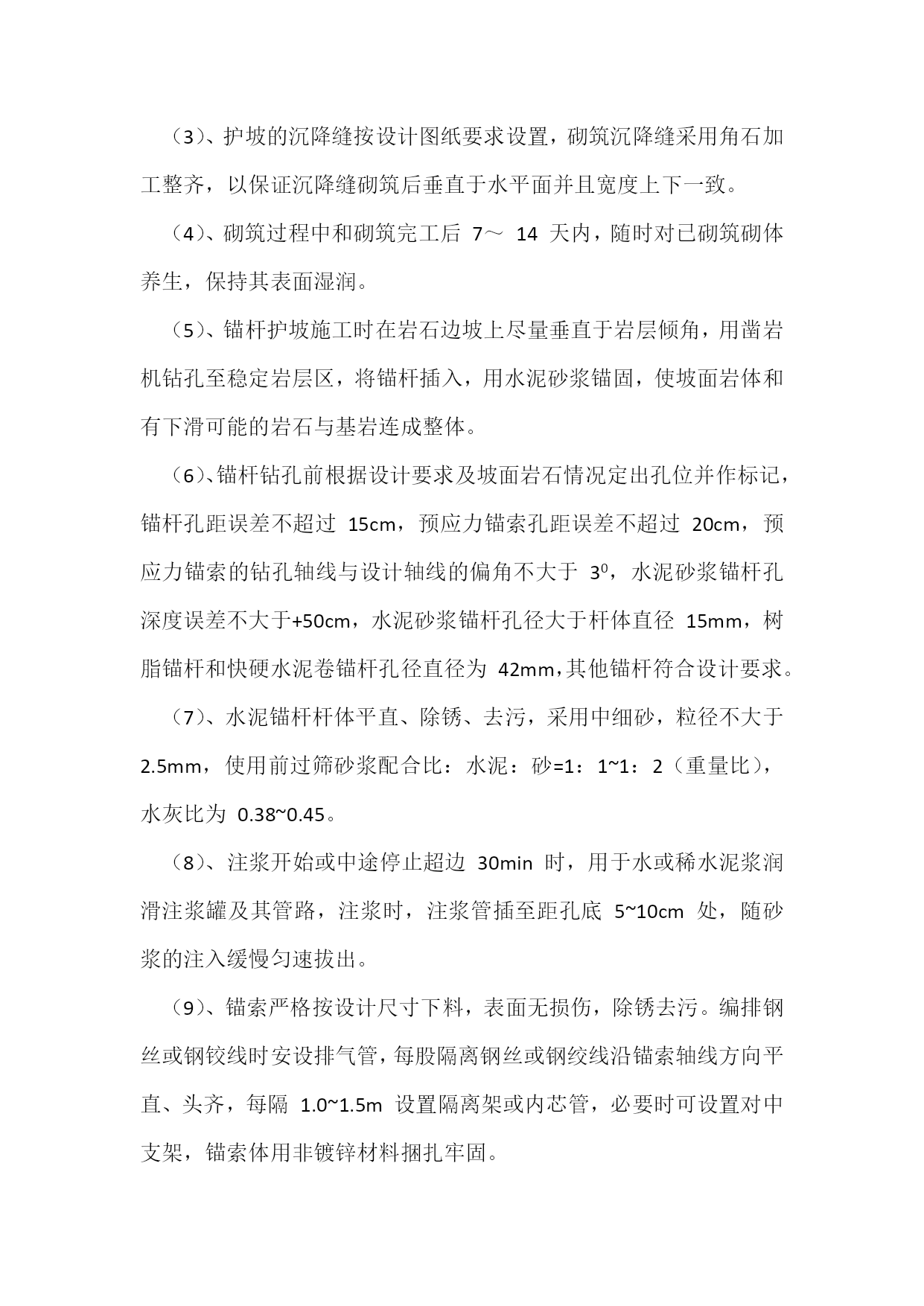 高边坡施工安全防护措施优质资料 (可以直接使用,可编辑优质资料,欢迎下载) 新建吉图珲铁路客运专线延吉段站前工程Ⅴ标段 高边坡施工安全防护措施 复核: 中铁二十二局集团新建吉图珲铁路客专五标一工区 二〇一二年六月 高边坡施工安全防护措施 一、编制的目的: 为了预防和控制高边坡施工人员及机械设备发生安全事故,积极做好事故发生时的预防应对措施,在发生安全事故紧急情况时能够及时响应,最大限度的减少安全事故的发生及人员、机械设备的损伤。根据工区“应急预案和响应管理程序”的要求,特制定本案。 二、适用范围: 本预案适用于GDK260+165-GDK260+191、GDK260+341-GDK260+450右侧路堑二级边坡以及GDK260+191-GDK260+383左侧路堑二、三级边坡 三、施工技术方案 一)、深挖路段路基施工方案 1、在施工前详细复查深挖路堑地段的工程地质资料,包括土石界限、岩层风化厚度及破碎程度,岩层的构造特征等。根据现场考察及设计要求,编制详细的施工组织设计,报监理工程师审批后实施。 2、根据设计横断面的边坡坡率、台阶宽度,精确计算路堑堑顶的开挖线。采用全站仪放样,根据现场坡口标高放出路堑坡口桩。 3、根据坡口桩放出路堑开挖线,进行清表、清杂等。 4、开挖中如发现有较大地质变化时,停止施工,重新进行工程地质补充勘探工作,并根据新的地质资料修正施工方案,报监理工程师审批后实施。因深挖路堑工程量大、施工环境复杂,技术要求高,施工难度大,是控制工程进度的关键工程,必须精心组织,科学施工。 5、石方开挖石方开挖根据岩石类别、风化程度和节理发育程度,确定开挖方法。对于软石和强风化岩石能用机械开挖的采用机械开挖,不能用机械直接开挖的石方,采用爆破作业开挖。在石方爆破作业前,根据地形地质,开挖断面及施工机械配备等情况,编制实施性爆破设计施工方案,报请监理工程师批准,并严格按照监理工程师的指令执行。石质部分采用深孔多排微差爆破法开挖。路堑既长又深时,采用纵向分层分段开挖,每一层先挖出一通道,然后开挖两侧,使每一层有独立的出土道路和临时排水系统;对风化破碎岩体,为保证施工中边坡的稳定和边坡防护的施工作业,采用阶梯式进行开挖,按设计要求的高度设置平台,形成阶梯边坡。开挖时,边坡预留2-3m采用光面爆破或预裂爆破作业,人工刷坡。 6、边坡控制方案 为确保边坡的稳定,不产生超挖和欠挖,边坡采用光面爆破,节理裂隙较发育地段及某些特殊地段采用预裂爆破。深挖路堑的施工遵守分级开挖、分级防护、及时防护的原则,开挖一级防护一级,在下一级开挖时,上一级已做好保护措施。砌筑边坡防护应注意: (1)、砂浆采用重量法控制计量,并采用机械拌和,砌筑采用坐浆法分层按规范砌筑。 (2)、将大块较平整的片石人工加工凿平,用来砌筑护面墙的外露面,并加工好砌筑沉降缝的角石,角石加工整齐,要有两个面相互垂直。 (3)、护坡的沉降缝按设计图纸要求设置,砌筑沉降缝采用角石加工整齐,以保证沉降缝砌筑后垂直于水平面并且宽度上下一致。 (4)、砌筑过程中和砌筑完工后7~14天内,随时对已砌筑砌体养生,保持其表面湿润。 (5)、锚杆护坡施工时在岩石边坡上尽量垂直于岩层倾角,用凿岩机钻孔至稳定岩层区,将锚杆插入,用水泥砂浆锚固,使坡面岩体和有下滑可能的岩石与基岩连成整体。 (6)、锚杆钻孔前根据设计要求及坡面岩石情况定出孔位并作标记,锚杆孔距误差不超过15cm,预应力锚索孔距误差不超过20cm,预应力锚索的钻孔轴线与设计轴线的偏角不大于30,水泥砂浆锚杆孔深度误差不大于+50cm,水泥砂浆锚杆孔径大于杆体直径15mm,树脂锚杆和快硬水泥卷锚杆孔径直径为42mm,其他锚杆符合设计要求。 (7)、水泥锚杆杆体平直、除锈、去污,采用中细砂,粒径不大于2.5mm,使用前过筛砂浆配合比:水泥:砂=1:1~1:2(重量比),水灰比为0.38~0.45。 (8)、注浆开始或中途停止超边30min时,用于水或稀水泥浆润滑注浆罐及其管路,注浆时,注浆管插至距孔底5~10cm处,随砂浆的注入缓慢匀速拔出。 (9)、锚索严格按设计尺寸下料,表面无损伤,除锈去污。编排钢丝或钢铰线时安设排气管,每股隔离钢丝或钢绞线沿锚索轴线方向平直、头齐,每隔1.0~1.5m设置隔离架或内芯管,必要时可设置对中支架,锚索体用非镀锌材料捆扎牢固。 (10)、锚杆防护施工前认真检查和处理锚喷作业区的危石,确保施工队人员的安全,坡面破碎严重时采用先喷后锚,喷射厚度不小于5cm,喷射作业时设专人跟随观察坡面情况,锚杆施工在喷射混凝土终凝3h后进行,施工用电线路、开关设防触电设施,针对施工机械操作制定安全操作规程,对施工人员进行安全教育,非施工人员不得进入施工区,施工用的工作平台牢固可靠并设安全