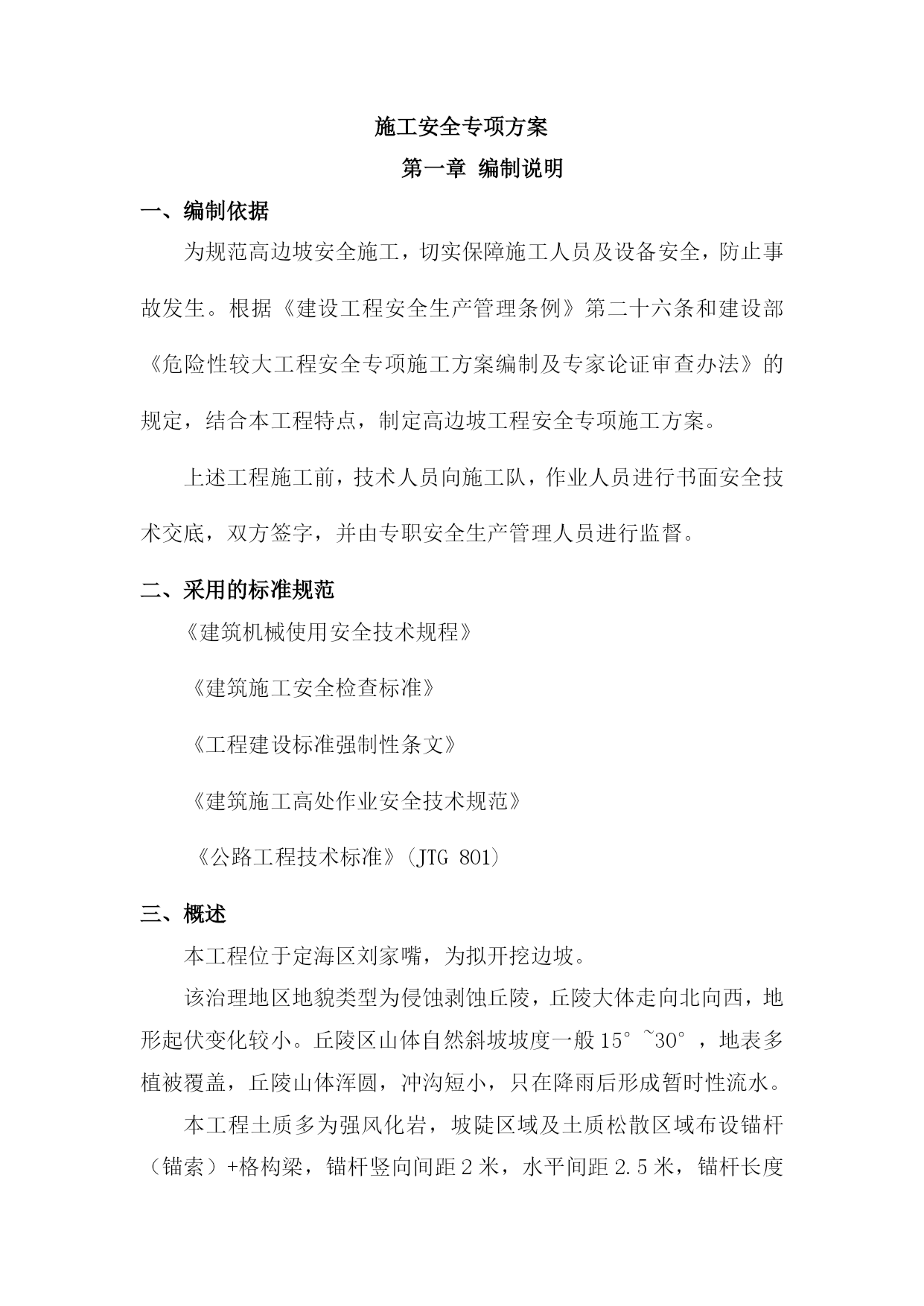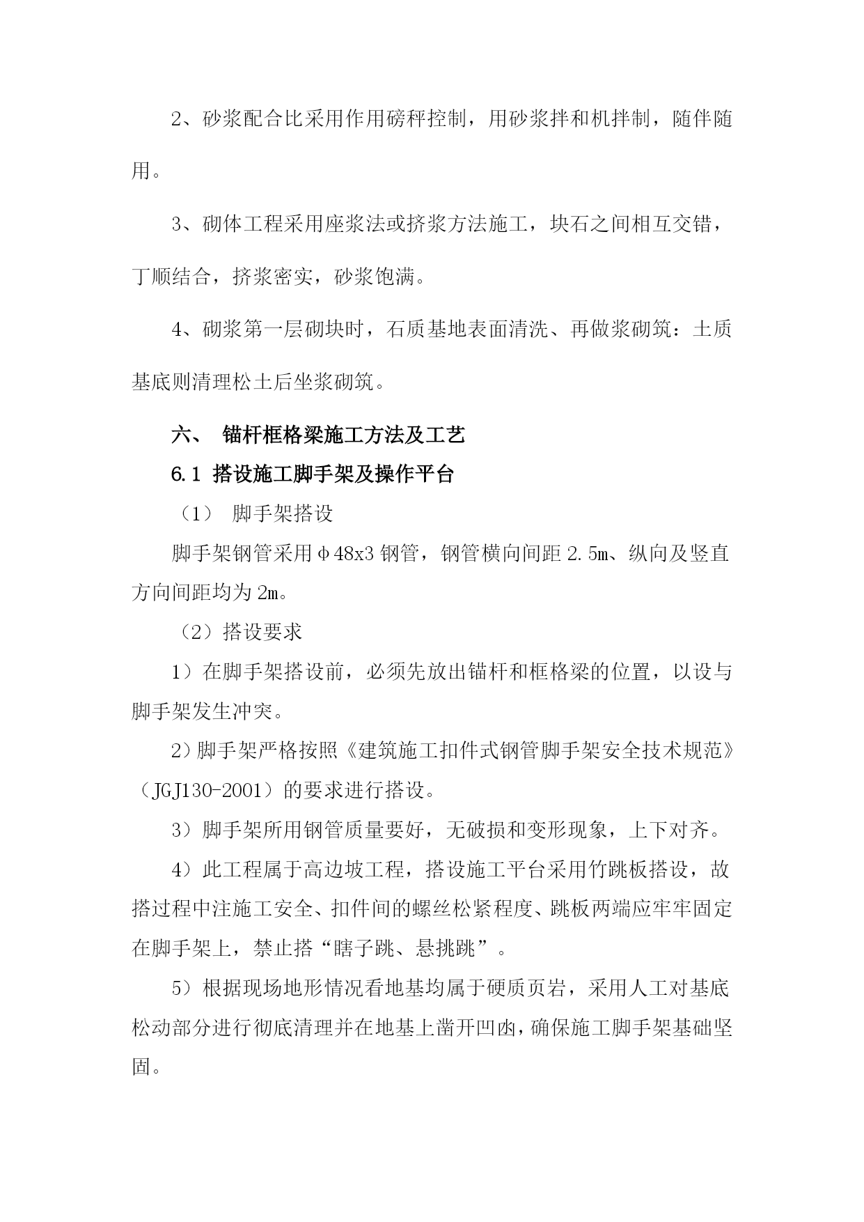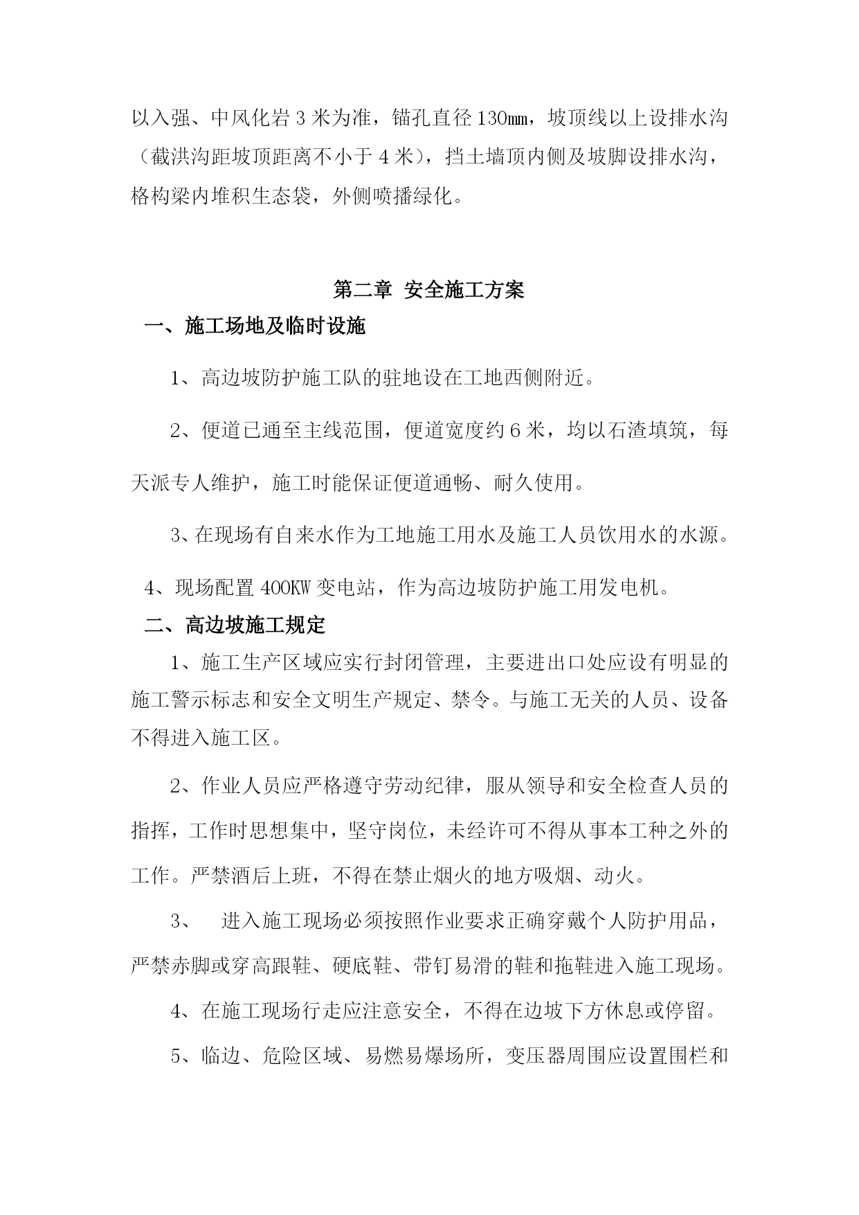 高边坡施工安全专项方案2优质资料 (可以直接使用,可编辑优质资料,欢迎下载) 施工安全专项方案 第一章编制说明 一、编制依据 为规范高边坡安全施工,切实保障施工人员及设备安全,防止事故发生。根据《建设工程安全生产管理条例》第二十六条和建设部《危险性较大工程安全专项施工方案编制及专家论证审查办法》的规定,结合本工程特点,制定高边坡工程安全专项施工方案。 上述工程施工前,技术人员向施工队,作业人员进行书面安全技术交底,双方签字,并由专职安全生产管理人员进行监督。 二、采用的标准规范 《建筑机械使用安全技术规程》 《建筑施工安全检查标准》 《工程建设标准强制性条文》 《建筑施工高处作业安全技术规范》 《公路工程技术标准》(JTG801) 三、概述 本工程位于定海区刘家嘴,为拟开挖边坡。 该治理地区地貌类型为侵蚀剥蚀丘陵,丘陵大体走向北向西,地形起伏变化较小。丘陵区山体自然斜坡坡度一般15°~30°,地表多植被覆盖,丘陵山体浑圆,冲沟短小,只在降雨后形成暂时性流水。 本工程土质多为强风化岩,坡陡区域及土质松散区域布设锚杆(锚索)+格构梁,锚杆竖向间距2米,水平间距2.5米,锚杆长度以入强、中风化岩3米为准,锚孔直径130mm,坡顶线以上设排水沟(截洪沟距坡顶距离不小于4米),挡土墙顶内侧及坡脚设排水沟,格构梁内堆积生态袋,外侧喷播绿化。 第二章安全施工方案 一、施工场地及临时设施 1、高边坡防护施工队的驻地设在工地西侧附近。 2、便道已通至主线范围,便道宽度约6米,均以石渣填筑,每天派专人维护,施工时能保证便道通畅、耐久使用。 3、在现场有自来水作为工地施工用水及施工人员饮用水的水源。 4、现场配置400KW变电站,作为高边坡防护施工用发电机。 二、高边坡施工规定 1、施工生产区域应实行封闭管理,主要进出口处应设有明显的施工警示标志和安全文明生产规定、禁令。与施工无关的人员、设备不得进入施工区。 2、作业人员应严格遵守劳动纪律,服从领导和安全检查人员的指挥,工作时思想集中,坚守岗位,未经许可不得从事本工种之外的工作。严禁酒后上班,不得在禁止烟火的地方吸烟、动火。 3、进入施工现场必须按照作业要求正确穿戴个人防护用品,严禁赤脚或穿高跟鞋、硬底鞋、带钉易滑的鞋和拖鞋进入施工现场。 4、在施工现场行走应注意安全,不得在边坡下方休息或停留。 5、临边、危险区域、易燃易爆场所,变压器周围应设置围栏和安全警示牌,夜间设红灯示警。施工现场各种防护设施、警示标志未经施工负责人批准,不得移动和拆除。 6、从事高边坡作业人员应定期体检,经医生诊断凡患高血压、心脏病、贫血病、癫痫病以及其他不适于高空作业的,不得从事高边坡作业。 7、作业所用材料要堆放平稳,工具应随手放入工具袋内,上下传递物件不得抛掷。8、遇有影响施工安全的恶劣气候时,禁止进行高边坡作业。 三、施工方案、工艺 本高边坡防护工程包括机械削坡、截洪沟、挡土墙、锚杆(锚索)、格构梁、边坡复绿、苗木栽植、后期养护等内容。 四、边坡施工 高边坡施工做好土石方开挖与支护挡加固工程施工的有机结合和进度协调,坚持“分级开挖,分级防护”的原则,自上而下,开挖一级,防护一级,工序衔接紧凑,严禁一挖到底。 高边坡开挖应贯彻“动态设计、信息化施工的原则”,在开挖过程密切注意核对地质情况,发现实际地质情况与设计不符时,或地质有异常变化是,立即通报有关部门。 五、浆砌块石方法 1、使用的原材料的强度、规格等要求符合设计及规范要求。 2、砂浆配合比采用作用磅秤控制,用砂浆拌和机拌制,随伴随用。 3、砌体工程采用座浆法或挤浆方法施工,块石之间相互交错,丁顺结合,挤浆密实,砂浆饱满。 4、砌浆第一层砌块时,石质基地表面清洗、再做浆砌筑:土质基底则清理松土后坐浆砌筑。 六、锚杆框格梁施工方法及工艺 6.1搭设施工脚手架及操作平台 (1)脚手架搭设 脚手架钢管采用φ48x3钢管,钢管横向间距2.5m、纵向及竖直方向间距均为2m。 (2)搭设要求 1)在脚手架搭设前,必须先放出锚杆和框格梁的位置,以设与脚手架发生冲突。 2)脚手架严格按照《建筑施工扣件式钢管脚手架安全技术规范》(JGJ130-2001)的要求进行搭设。 3)脚手架所用钢管质量要好,无破损和变形现象,上下对齐。 4)此工程属于高边坡工程,搭设施工平台采用竹跳板搭设,故搭过程中注施工安全、扣件间的螺丝松紧程度、跳板两端应牢牢固定在脚手架上,禁止搭“瞎子跳、悬挑跳”。 5)根据现场地形情况看地基均属于硬质页岩,采用人工对基底松动部分进行彻底清理并在地基上凿开凹凼,确保施工脚手架基础坚固。 6)脚手架及平台搭设要稳固,具有抗冲击、振动能力。 6.2人工凿打清除坡面松散岩石 (1)进场后采用人工,从上往下清除坡面杂物和松动岩石,凿掉小块松动、悬浮岩石,达到施工面平整。