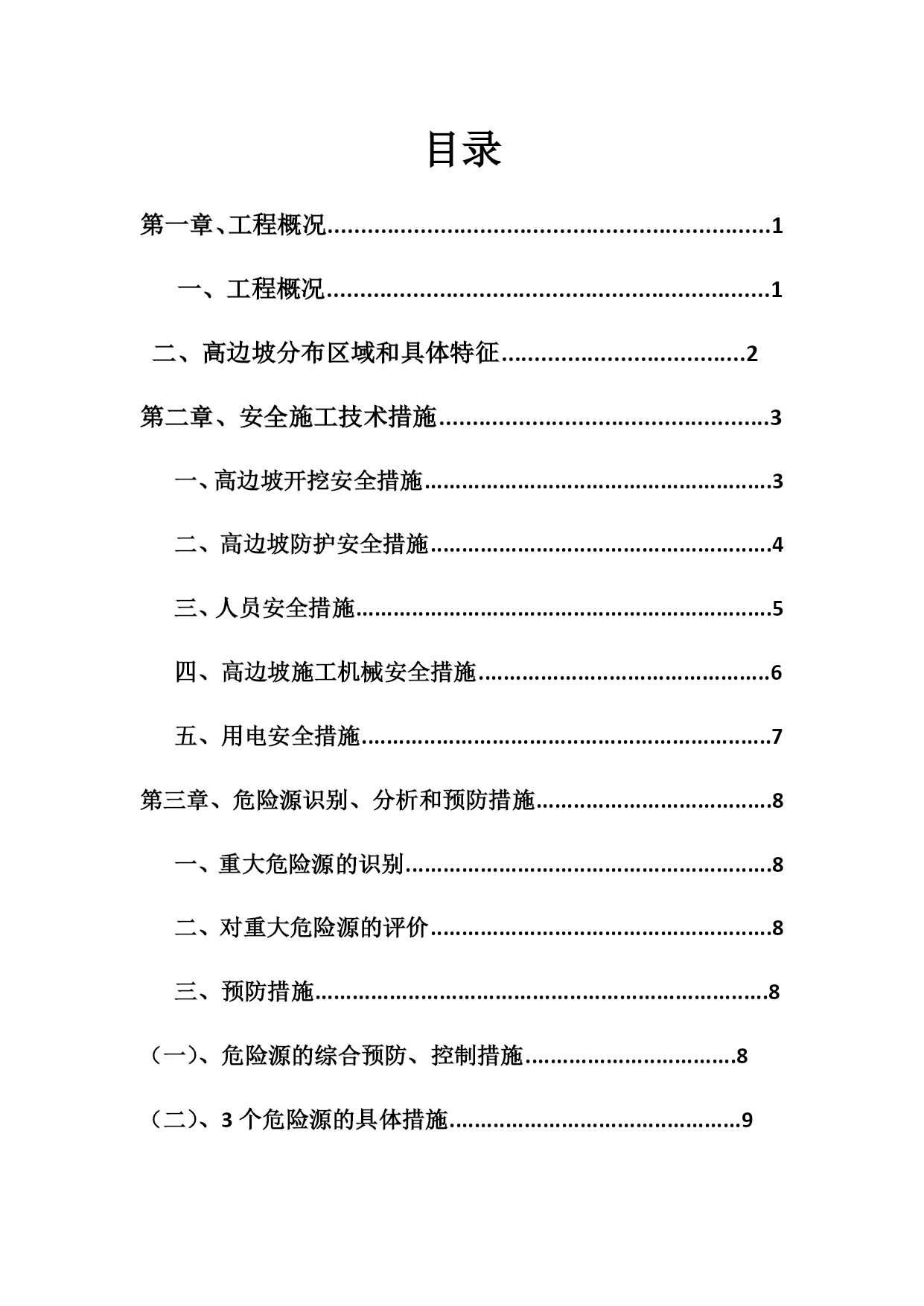 高边坡施工安全专项方案优质资料 (可以直接使用,可编辑优质资料,欢迎下载) 目录 第HYPERLINK\l"_Toc11192"一章、工程概况...................................................................1 HYPERLINK\l"_Toc21056"一、工程概况...................................................................1 二、高边坡分布区域和具体特征.....................................2 第二章、安全施工技术措施..................................................3 一、高边坡开挖安全措施........................................................3 二、高边坡防护安全措施.......................................................4 三、人员安全措施...................................................................5 四、高边坡施工机械安全措施...............................................6 五、用电安全措施..................................................................7 、危险源识别、分析和预防措施......................................8 一、重大危险源的识别...........................................................8 二、对重大危险源的评价.......................................................8 三、预防措施.........................................................................8 (一)、危险源的综合预防、控制措施..................................8 (二)、3个危险源的具体措施...............................................9 (三)、3种危险事故的应急措施..........................................13 、确保工程质量的措施...................................................15 一、质量控制目标................................................................15 二、管理措施........................................................................15 三、质量保证体系................................................................16、安全保证体系..............................................................18 一、安全保证体系的建立.....................................................18 、环境保护及文明施工....................................................20 一、环境保护措施................................................................20 二、文明施工措施................................................................21 工程概况 工程概况 1、水文、地貌 场地位于汉江二级阶地垄岗地貌(工程地质II区),局部分布有第四系全新统冲沟(工程地质I区)及低丘残岗地貌(工程地质III区),区类地形总体较为平缓开阔,地势为东南低西北较高,附近大部分为水田等农作物。 气象 荆门市属亚热带气候,四季分明,日照充足,雨量充沛,无霜期长,十分有利于农作物生长。年平均气温