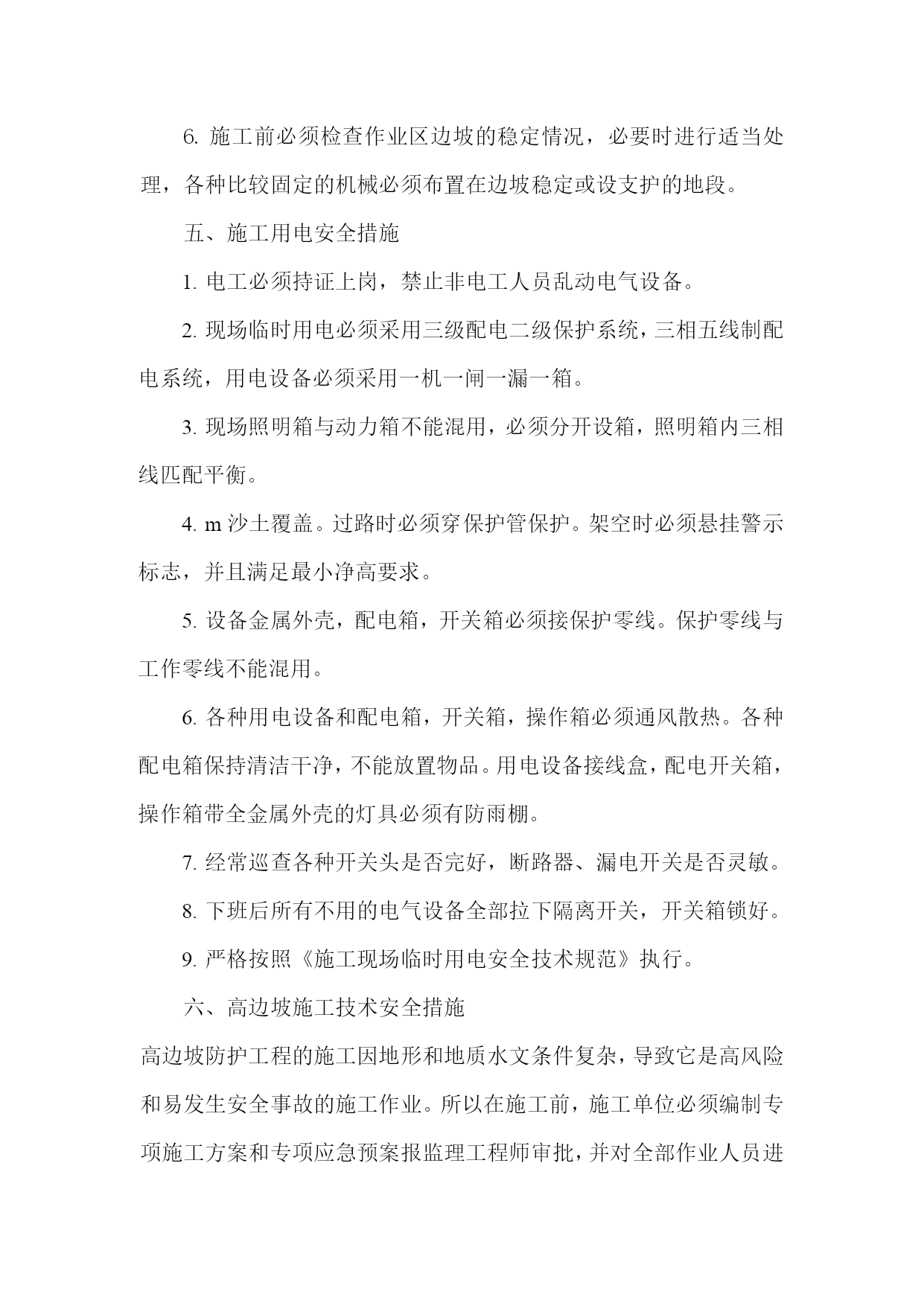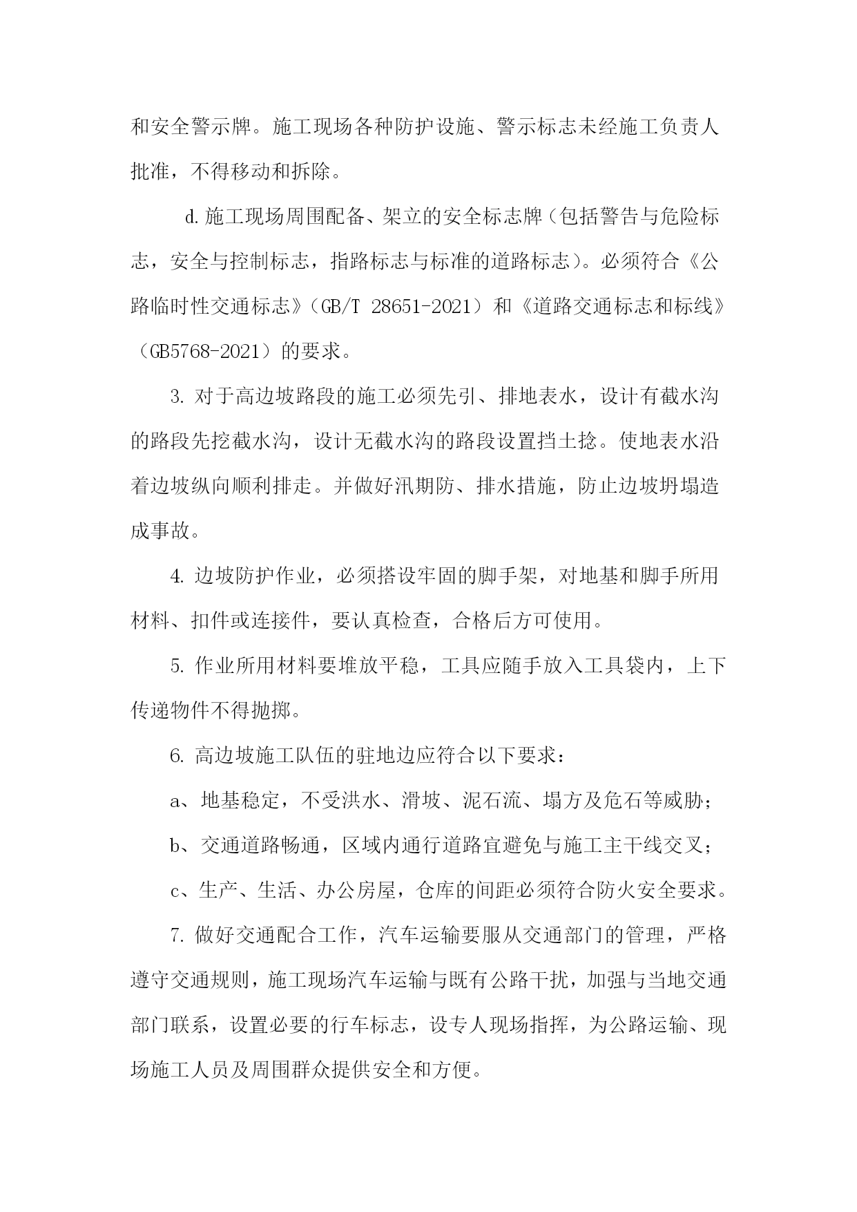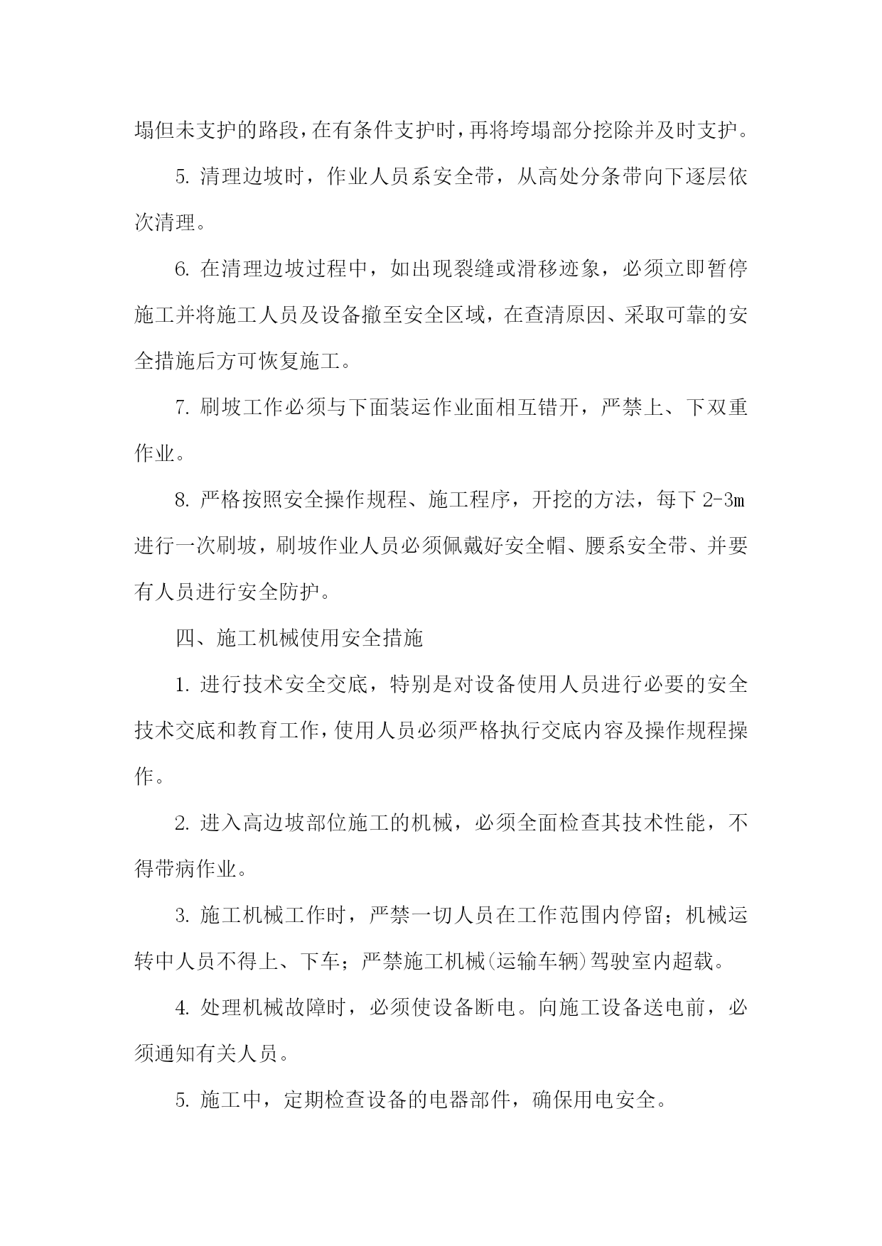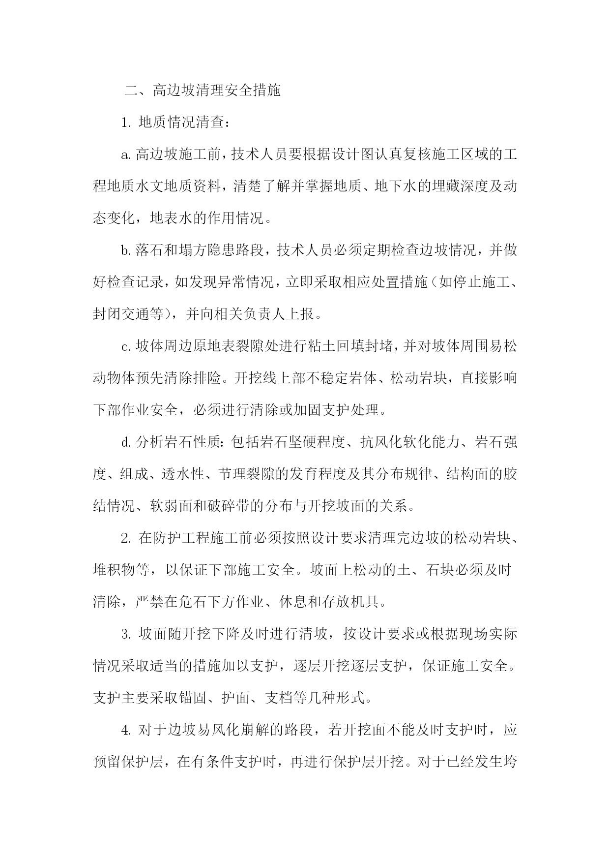高边坡施工安全专项措施 (适用改建工程) 各监理工程办公室、项目经理部: 本着“安全第一、预防为主”的原则,为积极响应十九十的顺利召开、贯彻指挥部办公室关于施工安全的要、提高参建各方的安全意识,项目办制定了高边坡施工安全专项措施。要求施工单位积极落实执行、监理单位加强监督检查。具体内容如下: 一、施工现场安全措施: 所有进入工地的人员,必须佩戴安全帽,施工人员还应穿戴反光衣,遵章守纪听从指挥;加强安全保卫工作,禁止闲杂人员进入施工现场。针对上下运送材料人员,运送料通道加设安全网进行防护。 设立安全标志: a.在已经施工完毕,但未进行坡面防护的路段:一般路段沿着旧路肩设置弹力柱并绑扎三角旗,并经常检查、更换;落石和塌方隐患危及范围内的路段,路线起止两端设置警示标志牌,沿旧路肩纵向设置配有闪光灯的彩钢围挡,高度不得低于2.2米,防止落石砸伤过往车辆和行人。 b.正在进行施工的,在通行路段实行专人看守,设立提醒、指示标志牌和安全警戒线。尽量避免夜间施工。 c.临边、危险区域、易燃易爆场所设置配有闪光灯的彩钢围挡和安全警示牌。施工现场各种防护设施、警示标志未经施工负责人批准,不得移动和拆除。 d.施工现场周围配备、架立的安全标志牌(包括警告与危险标志,安全与控制标志,指路标志与标准的道路标志)。必须符合《公路临时性交通标志》(GB/T28651-2021)和《道路交通标志和标线》(GB5768-2021)的要求。 对于高边坡路段的施工必须先引、排地表水,设计有截水沟的路段先挖截水沟,设计无截水沟的路段设置挡土捻。使地表水沿着边坡纵向顺利排走。并做好汛期防、排水措施,防止边坡坍塌造成事故。 边坡防护作业,必须搭设牢固的脚手架,对地基和脚手所用材料、扣件或连接件,要认真检查,合格后方可使用。 作业所用材料要堆放平稳,工具应随手放入工具袋内,上下传递物件不得抛掷。 高边坡施工队伍的驻地边应符合以下要求: a、地基稳定,不受洪水、滑坡、泥石流、塌方及危石等威胁; b、交通道路畅通,区域内通行道路宜避免与施工主干线交叉; c、生产、生活、办公房屋,仓库的间距必须符合防火安全要求。 做好交通配合工作,汽车运输要服从交通部门的管理,严格遵守交通规则,施工现场汽车运输与既有公路干扰,加强与当地交通部门联系,设置必要的行车标志,设专人现场指挥,为公路运输、现场施工人员及周围群众提供安全和方便。 二、高边坡清理安全措施 地质情况清查: a.高边坡施工前,技术人员要根据设计图认真复核施工区域的工程地质水文地质资料,清楚了解并掌握地质、地下水的埋藏深度及动态变化,地表水的作用情况。 b.落石和塌方隐患路段,技术人员必须定期检查边坡情况,并做好检查记录,如发现异常情况,立即采取相应处置措施(如停止施工、封闭交通等),并向相关负责人上报。 c.坡体周边原地表裂隙处进行粘土回填封堵,并对坡体周围易松动物体预先清除排险。开挖线上部不稳定岩体、松动岩块,直接影响下部作业安全,必须进行清除或加固支护处理。 d.分析岩石性质:包括岩石坚硬程度、抗风化软化能力、岩石强度、组成、透水性、节理裂隙的发育程度及其分布规律、结构面的胶结情况、软弱面和破碎带的分布与开挖坡面的关系。 在防护工程施工前必须按照设计要求清理完边坡的松动岩块、堆积物等,以保证下部施工安全。坡面上松动的土、石块必须及时清除,严禁在危石下方作业、休息和存放机具。 坡面随开挖下降及时进行清坡,按设计要求或根据现场实际情况采取适当的措施加以支护,逐层开挖逐层支护,保证施工安全。支护主要采取锚固、护面、支档等几种形式。 对于边坡易风化崩解的路段,若开挖面不能及时支护时,应预留保护层,在有条件支护时,再进行保护层开挖。对于已经发生垮塌但未支护的路段,在有条件支护时,再将垮塌部分挖除并及时支护。 清理边坡时,作业人员系安全带,从高处分条带向下逐层依次清理。 在清理边坡过程中,如出现裂缝或滑移迹象,必须立即暂停施工并将施工人员及设备撤至安全区域,在查清原因、采取可靠的安全措施后方可恢复施工。 刷坡工作必须与下面装运作业面相互错开,严禁上、下双重作业。 严格按照安全操作规程、施工程序,开挖的方法,每下2-3m进行一次刷坡,刷坡作业人员必须佩戴好安全帽、腰系安全带、并要有人员进行安全防护。 四、施工机械使用安全措施 进行技术安全交底,特别是对设备使用人员进行必要的安全技术交底和教育工作,使用人员必须严格执行交底内容及操作规程操作。 进入高边坡部位施工的机械,必须全面检查其技术性能,不得带病作业。 施工机械工作时,严禁一切人员在工作范围内停留;机械运转中人员不得上、下车;严禁施工机械(运输车辆)驾驶室内超载。 处理机械故障时,必须使设备断电。向施工设备送电前,必须通知有关人员。 施工中,定期检查设备的电器部件,确保用电