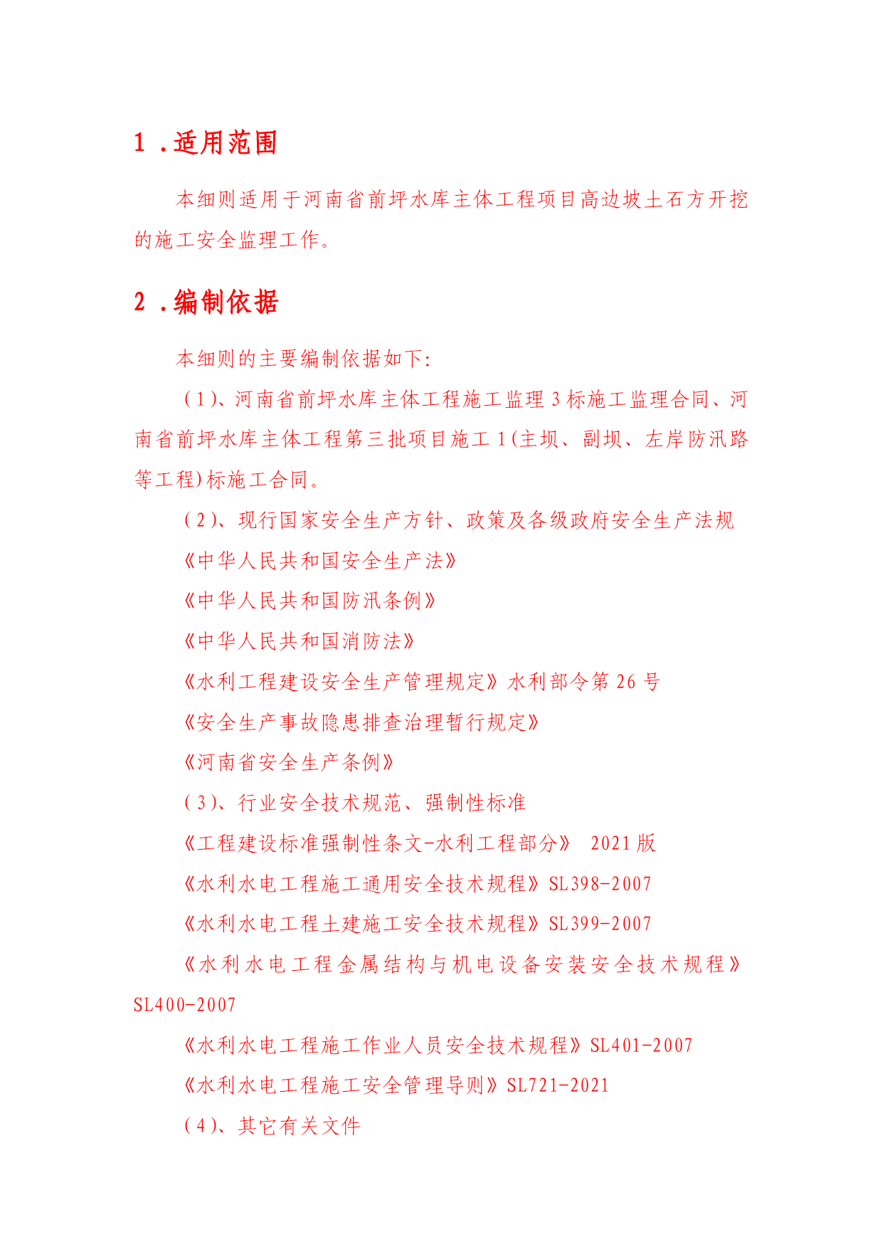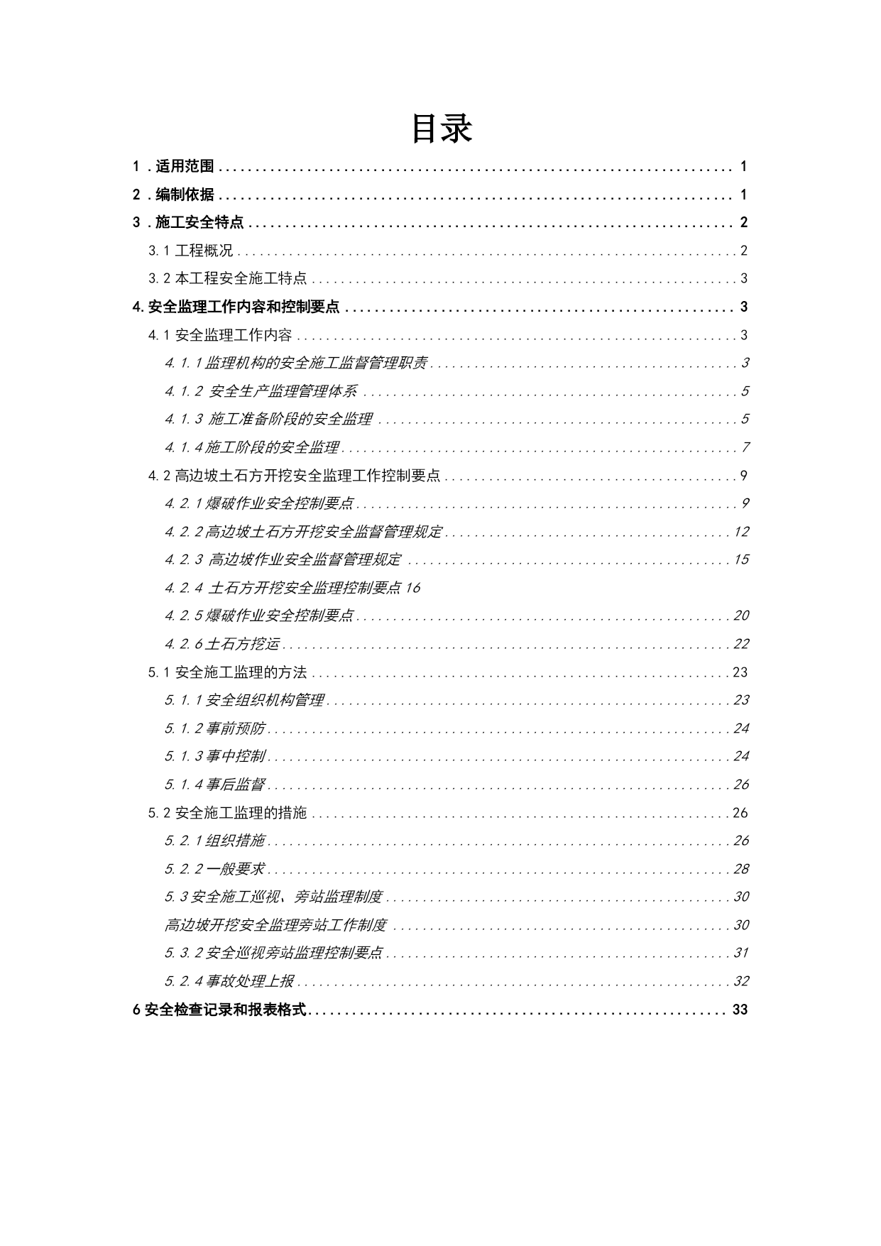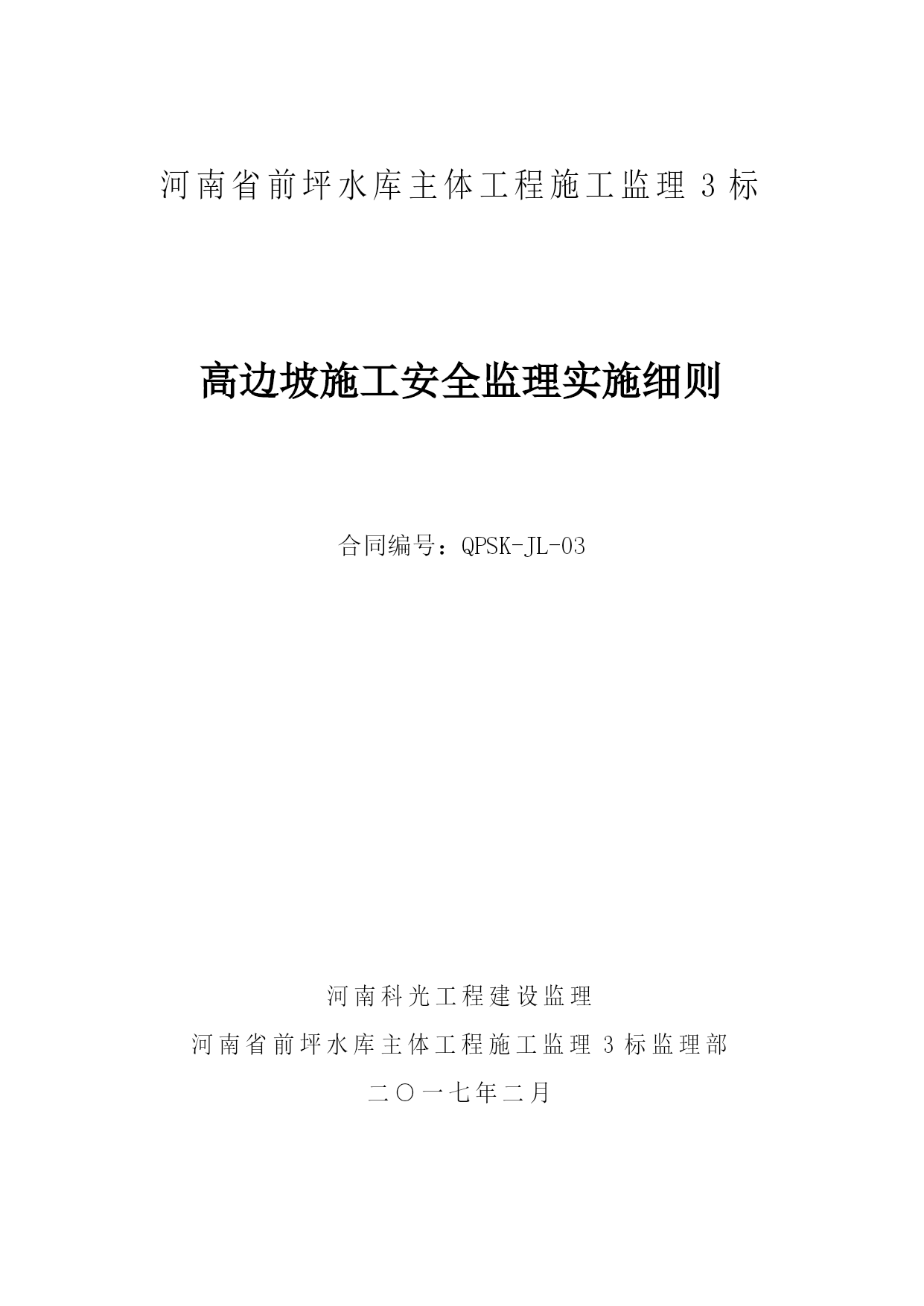高边坡安全施工监理细则优质资料 (可以直接使用,可编辑优质资料,欢迎下载) 河南省前坪水库主体工程施工监理3标 高边坡施工安全监理实施细则 合同编号:QPSK-JL-03 河南科光工程建设监理 河南省前坪水库主体工程施工监理3标监理部 二○一七年二月 审批: 目录 TOC\o"1-3"\h\uHYPERLINK\l_Toc98671.适用范围 PAGEREF_Toc98671 HYPERLINK\l_Toc108212.编制依据 PAGEREF_Toc108211 HYPERLINK\l_Toc127283.施工安全特点 PAGEREF_Toc127282 HYPERLINK\l_Toc248113.1工程概况 PAGEREF_Toc248112 HYPERLINK\l_Toc190333.2本工程安全施工特点 PAGEREF_Toc190333 HYPERLINK\l_Toc45924.安全监理工作内容和控制要点 PAGEREF_Toc45923 HYPERLINK\l_Toc135004.1安全监理工作内容 PAGEREF_Toc135003 HYPERLINK\l_Toc41164.1.1监理机构的安全施工监督管理职责 PAGEREF_Toc41163 HYPERLINK\l_Toc249684.1.2安全生产监理管理体系 PAGEREF_Toc249685 HYPERLINK\l_Toc303744.1.3施工准备阶段的安全监理 PAGEREF_Toc303745 HYPERLINK\l_Toc161404.1.4施工阶段的安全监理 PAGEREF_Toc161407 HYPERLINK\l_Toc87184.2高边坡土石方开挖安全监理工作控制要点 PAGEREF_Toc87189 HYPERLINK\l_Toc25824.2.1爆破作业安全控制要点 PAGEREF_Toc25829 HYPERLINK\l_Toc35234.2.2高边坡土石方开挖安全监督管理规定 PAGEREF_Toc352312 HYPERLINK\l_Toc170574.2.3高边坡作业安全监督管理规定 PAGEREF_Toc1705715 HYPERLINK\l_Toc191394.2.4土石方开挖安全监理控制要点PAGEREF_Toc1913916 HYPERLINK\l_Toc191624.2.5爆破作业安全控制要点 PAGEREF_Toc1916220 HYPERLINK\l_Toc69244.2.6土石方挖运 PAGEREF_Toc692422 HYPERLINK\l_Toc110765.1安全施工监理的方法 PAGEREF_Toc1107623 HYPERLINK\l_Toc250005.1.1安全组织机构管理 PAGEREF_Toc2500023 HYPERLINK\l_Toc33315.1.2事前预防 PAGEREF_Toc333124 HYPERLINK\l_Toc215785.1.3事中控制 PAGEREF_Toc2157824 HYPERLINK\l_Toc173135.1.4事后监督 PAGEREF_Toc1731326 HYPERLINK\l_Toc6485.2安全施工监理的措施 PAGEREF_Toc64826 HYPERLINK\l_Toc188815.2.1组织措施 PAGEREF_Toc1888126 HYPERLINK\l_Toc102965.2.2一般要求 PAGEREF_Toc1029628 HYPERLINK\l_Toc288295.3安全施工巡视、旁站监理制度 PAGEREF_Toc2882930 HYPERLINK\l_Toc11139高边坡开挖安全监理旁站工作制度 PAGEREF_Toc1113930 HYPERLINK\l_Toc164505.3.2安全巡视旁站监理控制要点 PAGEREF_Toc1645031 HYPERLINK\l_Toc278075.2.4事故处理上报 PAGEREF_Toc2780732 HYPERLINK\l_Toc140576安全检查记录和报表格式 PAGEREF_Toc1405733 .适用范围 本
