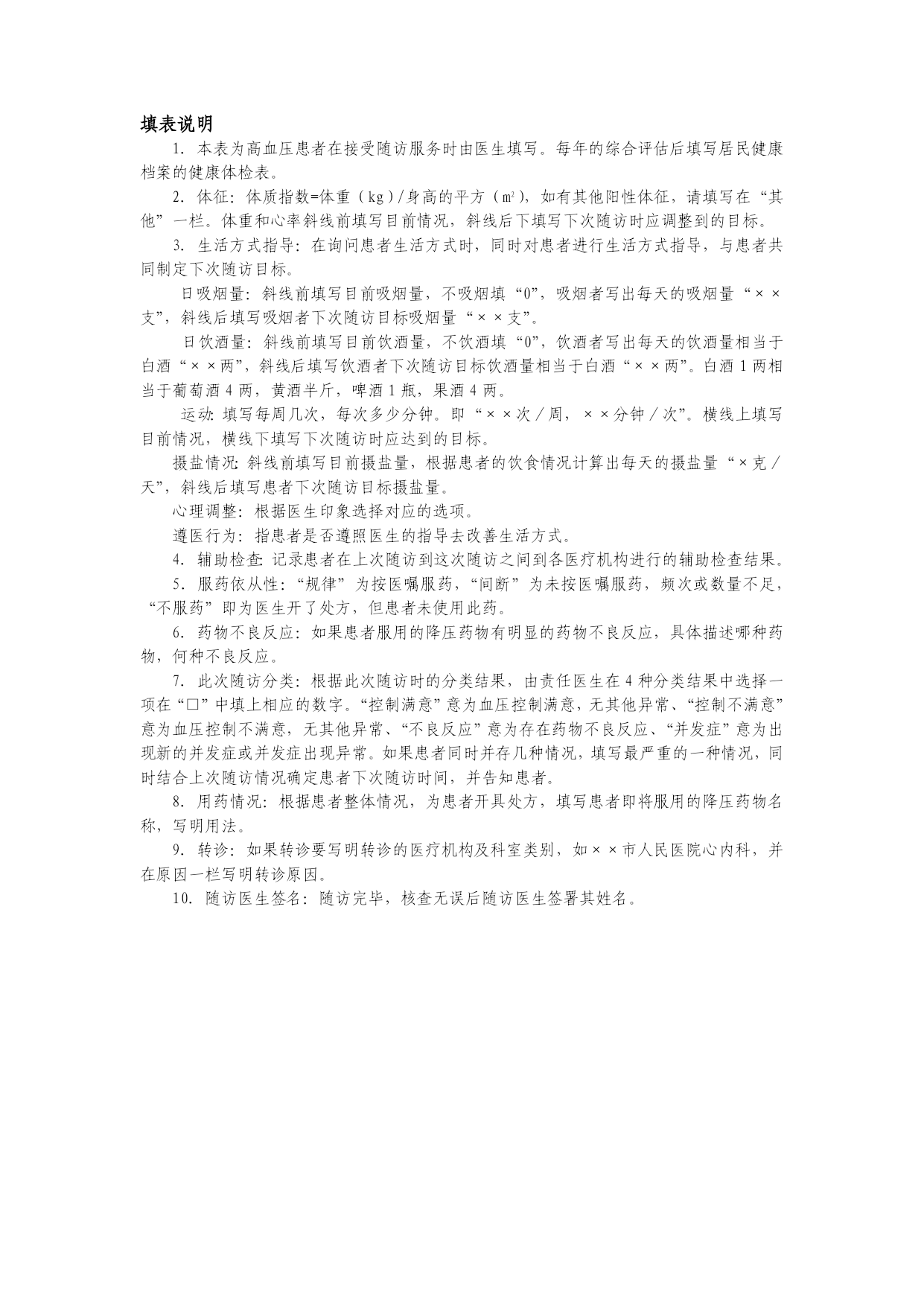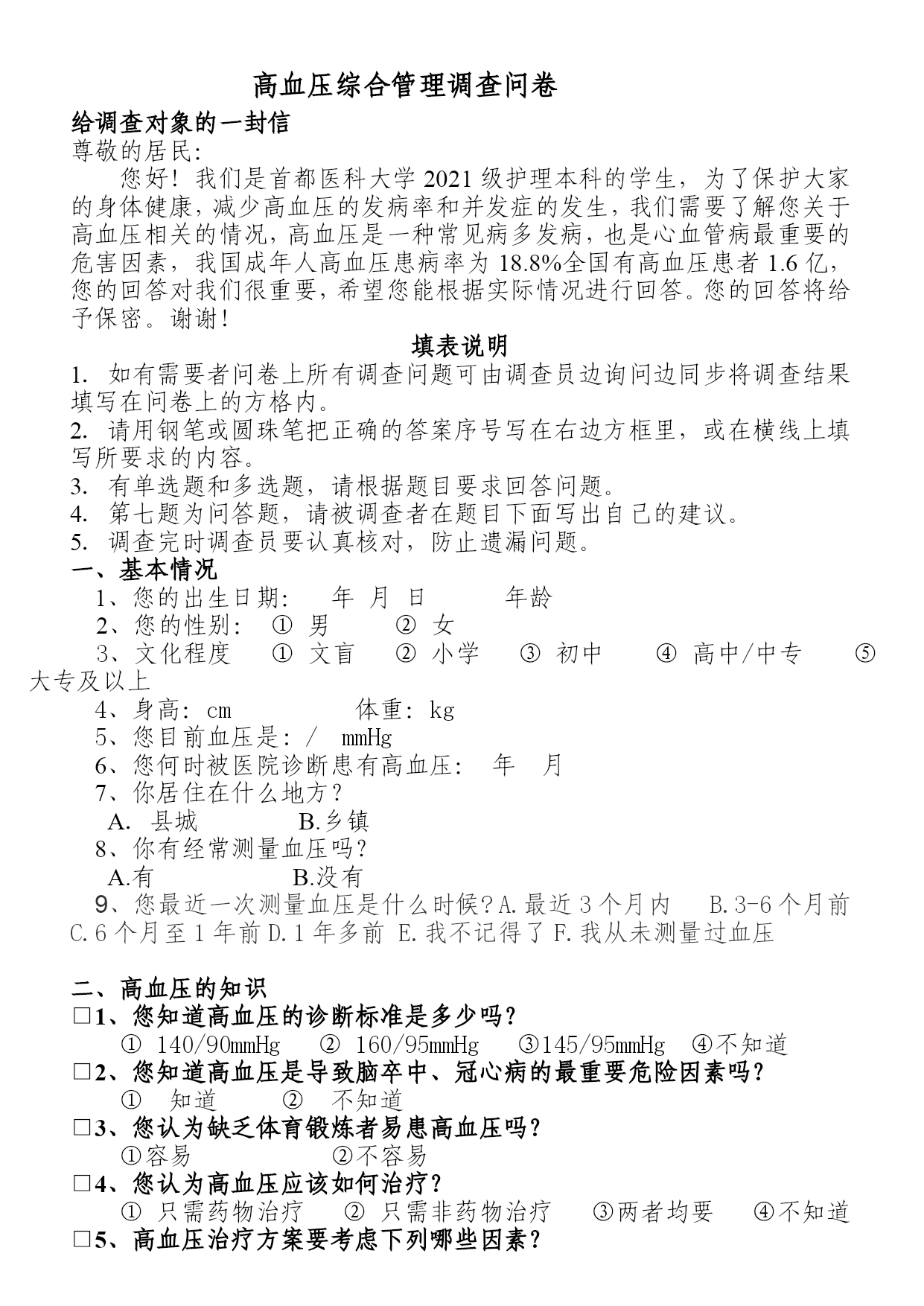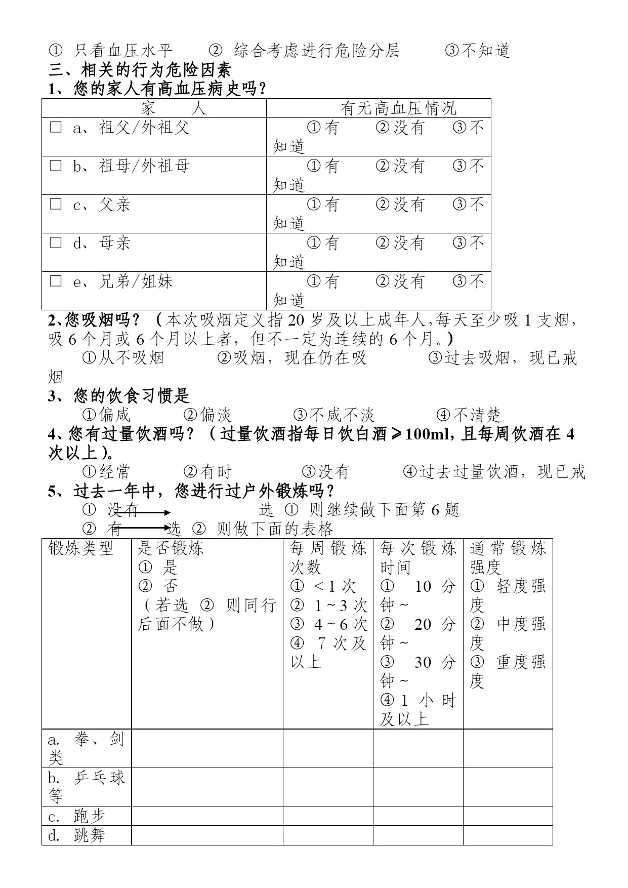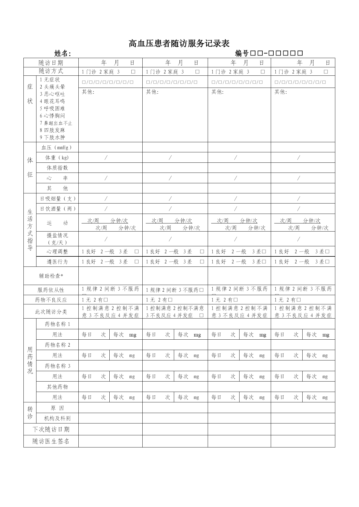 高血压随访记录表优质资料 (可以直接使用,可编辑优质资料,欢迎下载) 高血压患者随访服务记录表 姓名:编号□□-□□□□□ 随访日期年月日年月日年月日年月日随访方式1门诊2家庭3□1门诊2家庭3□1门诊2家庭3□1门诊2家庭3□ 症 状 1无症状 2头痛头晕 3恶心呕吐 4眼花耳鸣 5呼吸困难 6心悸胸闷 7鼻衄出血不止 8四肢发麻 9下肢水肿□/□/□/□/□/□/□/□□/□/□/□/□/□/□/□□/□/□/□/□/□/□/□□/□/□/□/□/□/□/□其他:其他:其他:其他:体 征血压(mmHg)体重(kg)////体质指数心率////其他生 活 方 式 指 导日吸烟量(支)////日饮酒量(两)////运动次/周分钟/次 次/周分钟/次次/周分钟/次 次/周分钟/次次/周分钟/次 次/周分钟/次次/周分钟/次 次/周分钟/次摄盐情况 (克/天)////心理调整1良好2一般3差□1良好2一般3差□1良好2一般3差□1良好2一般3差□遵医行为1良好2一般3差□1良好2一般3差□1良好2一般3差□1良好2一般3差□辅助检查*服药依从性1规律2间断3不服药□1规律2间断3不服药□1规律2间断3不服药□1规律2间断3不服药□药物不良反应1无2有□1无2有□1无2有□1无2有□此次随访分类1控制满意2控制不满意3不良反应4并发症□1控制满意2控制不满意3不良反应4并发症□1控制满意2控制不满意3不良反应4并发症□1控制满意2控制不满意3不良反应4并发症□用 药 情 况药物名称1用法每日次每次mg每日次每次mg每日次每次mg每日次每次mg药物名称2用法每日次每次mg每日次每次mg每日次每次mg每日次每次mg药物名称3用法每日次每次mg每日次每次mg每日次每次mg每日次每次mg其他药物用法每日次每次mg每日次每次mg每日次每次mg每日次每次mg转 诊原因机构及科别下次随访日期随访医生签名填表说明 1.本表为高血压患者在接受随访服务时由医生填写。每年的综合评估后填写居民健康档案的健康体检表。 2.体征:体质指数=体重(kg)/身高的平方(m2),如有其他阳性体征,请填写在“其他”一栏。体重和心率斜线前填写目前情况,斜线后下填写下次随访时应调整到的目标。 3.生活方式指导:在询问患者生活方式时,同时对患者进行生活方式指导,与患者共同制定下次随访目标。 日吸烟量:斜线前填写目前吸烟量,不吸烟填“0”,吸烟者写出每天的吸烟量“××支”,斜线后填写吸烟者下次随访目标吸烟量“××支”。 日饮酒量:斜线前填写目前饮酒量,不饮酒填“0”,饮酒者写出每天的饮酒量相当于白酒“××两”,斜线后填写饮酒者下次随访目标饮酒量相当于白酒“××两”。白酒1两相当于葡萄酒4两,黄酒半斤,啤酒1瓶,果酒4两。 运动:填写每周几次,每次多少分钟。即“××次/周,××分钟/次”。横线上填写目前情况,横线下填写下次随访时应达到的目标。 摄盐情况:斜线前填写目前摄盐量,根据患者的饮食情况计算出每天的摄盐量“×克/天”,斜线后填写患者下次随访目标摄盐量。 心理调整:根据医生印象选择对应的选项。 遵医行为:指患者是否遵照医生的指导去改善生活方式。 4.辅助检查:记录患者在上次随访到这次随访之间到各医疗机构进行的辅助检查结果。 5.服药依从性:“规律”为按医嘱服药,“间断”为未按医嘱服药,频次或数量不足,“不服药”即为医生开了处方,但患者未使用此药。 6.药物不良反应:如果患者服用的降压药物有明显的药物不良反应,具体描述哪种药物,何种不良反应。 7.此次随访分类:根据此次随访时的分类结果,由责任医生在4种分类结果中选择一项在“□”中填上相应的数字。“控制满意”意为血压控制满意,无其他异常、“控制不满意”意为血压控制不满意,无其他异常、“不良反应”意为存在药物不良反应、“并发症”意为出现新的并发症或并发症出现异常。如果患者同时并存几种情况,填写最严重的一种情况,同时结合上次随访情况确定患者下次随访时间,并告知患者。 8.用药情况:根据患者整体情况,为患者开具处方,填写患者即将服用的降压药物名称,写明用法。 9.转诊:如果转诊要写明转诊的医疗机构及科室类别,如××市人民医院心内科,并在原因一栏写明转诊原因。 10.随访医生签名:随访完毕,核查无误后随访医生签署其姓名。 高血压综合管理调查问卷 给调查对象的一封信 尊敬的居民: 您好!我们是首都医科大学2021级护理本科的学生,为了保护大家的身体健康,减少高血压的发病率和并发症的发生,我们需要了解您关于高血压相关的情况,高血压是一种常见病多发病,也是心血管病最重要的危害因素,我国成年人高血压患病率为18.8%全国有高血压患者1.6亿,您的回答对我们很重要,希望您能根据实际情况进行回答。您的回答将给予保密。谢谢! 填表说明 1.如有