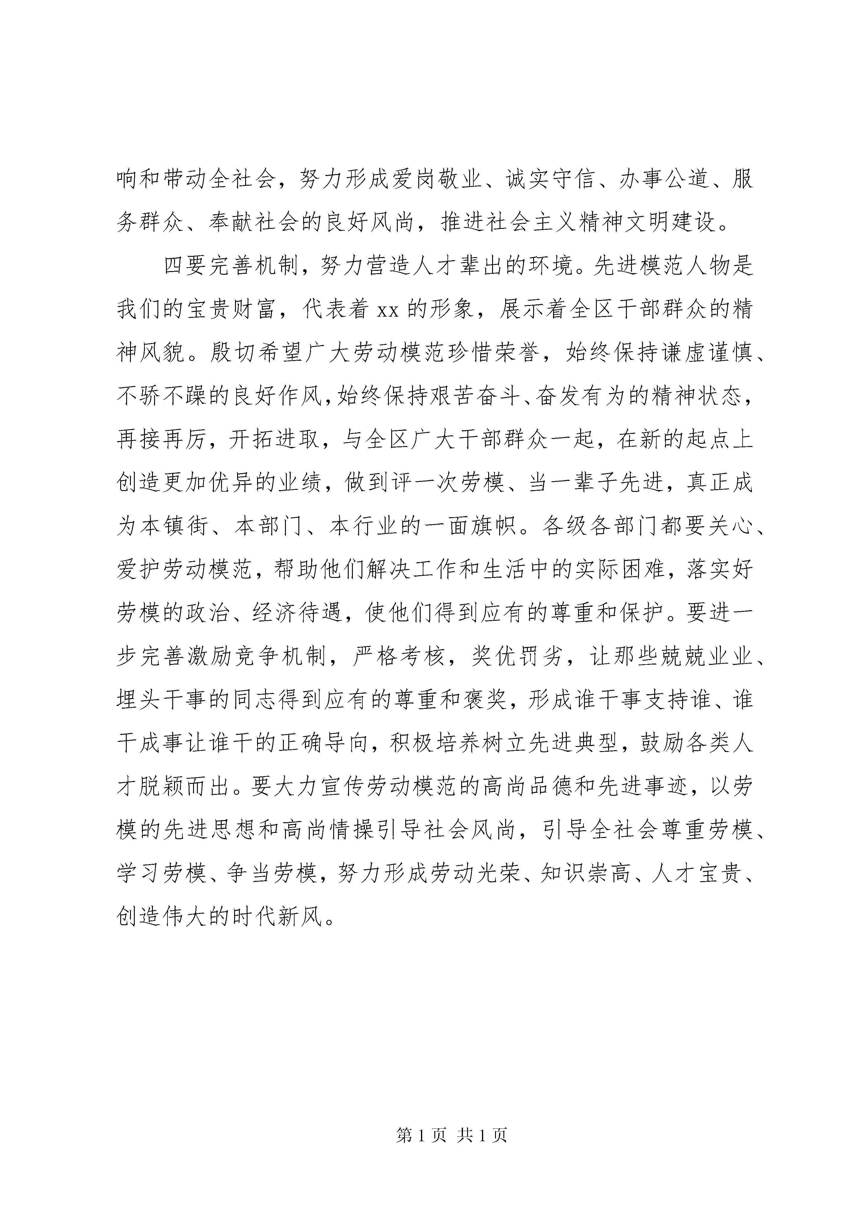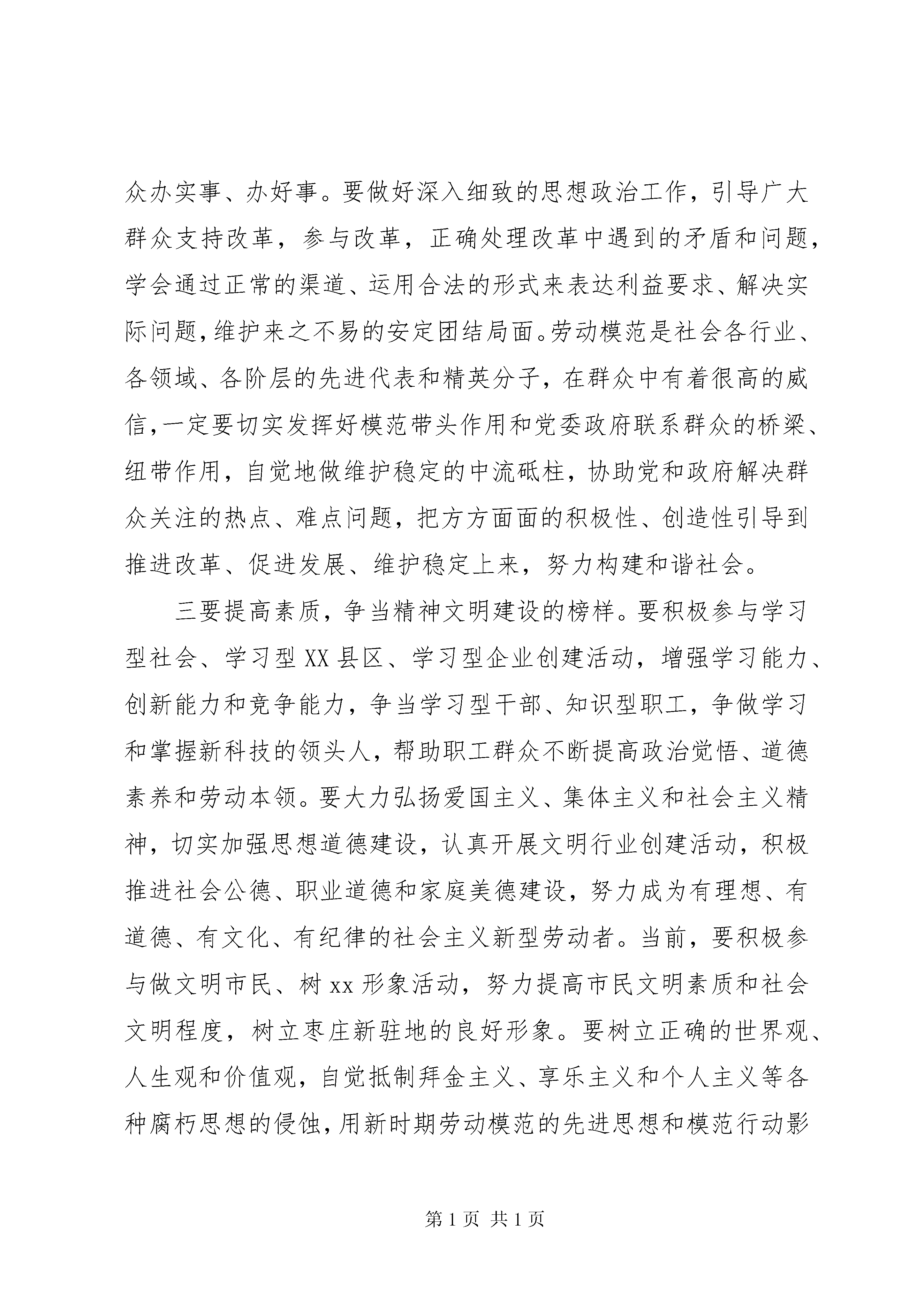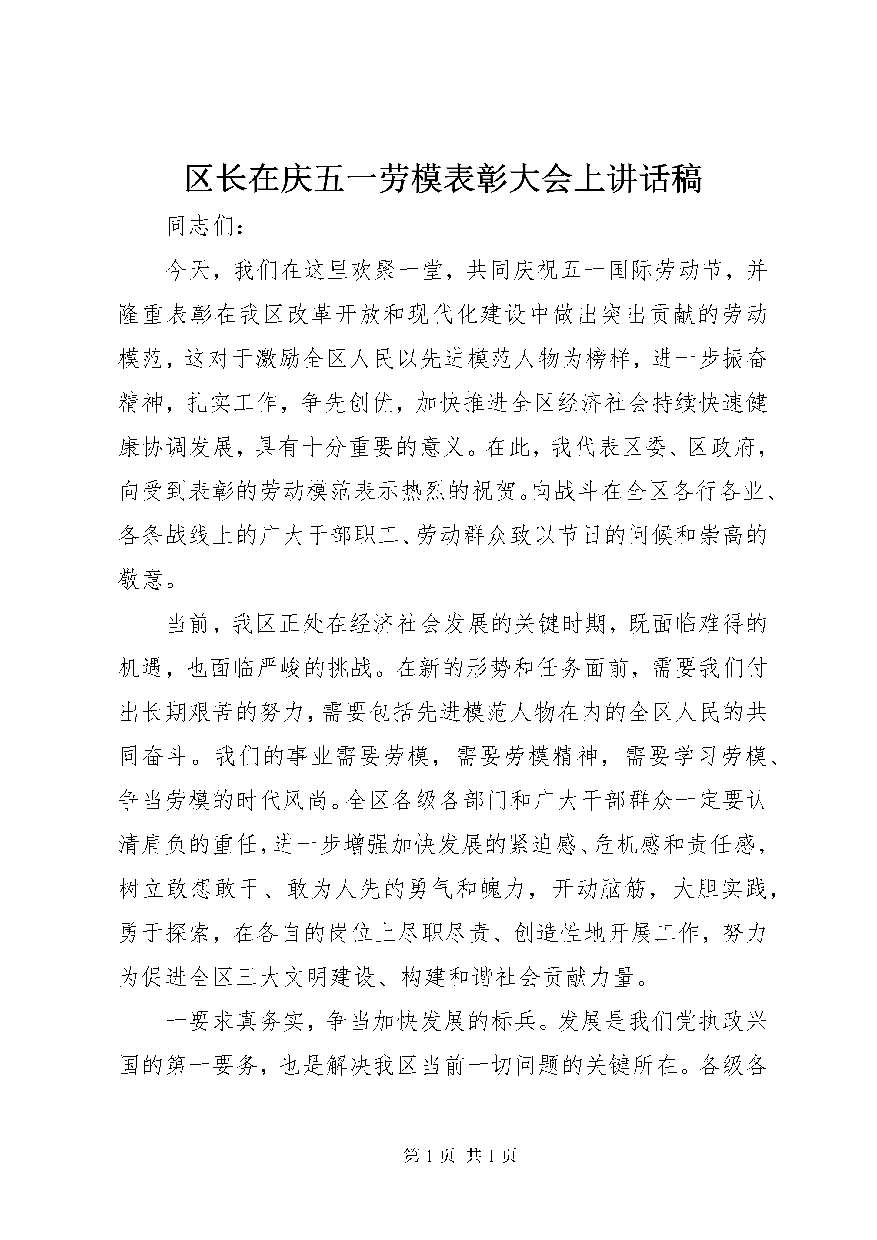 区长在庆五一劳模表彰大会上讲话稿同志们:今天,我们在这里欢聚一堂,共同庆祝五一国际劳动节,并隆重表彰在我区改革开放和现代化建设中做出突出贡献的劳动模范,这对于激励全区人民以先进模范人物为榜样,进一步振奋精神,扎实工作,争先创优,加快推进全区经济社会持续快速健康协调发展,具有十分重要的意义。在此,我代表区委、区政府,向受到表彰的劳动模范表示热烈的祝贺。向战斗在全区各行各业、各条战线上的广大干部职工、劳动群众致以节日的问候和崇高的敬意。当前,我区正处在经济社会发展的关键时期,既面临难得的机遇,也面临严峻的挑战。在新的形势和任务面前,需要我们付出长期艰苦的努力,需要包括先进模范人物在内的全区人民的共同奋斗。我们的事业需要劳模,需要劳模精神,需要学习劳模、争当劳模的时代风尚。全区各级各部门和广大干部群众一定要认清肩负的重任,进一步增强加快发展的紧迫感、危机感和责任感,树立敢想敢干、敢为人先的勇气和魄力,开动脑筋,大胆实践,勇于探索,在各自的岗位上尽职尽责、创造性地开展工作,努力为促进全区三大文明建设、构建和谐社会贡献力量。一要求真务实,争当加快发展的标兵。发展是我们党执政兴国的第一要务,也是解决我区当前一切问题的关键所在。各级各部门要紧紧围绕区委、区政府确立的突出lsquo;五个重点rsquo;、强化lsquo;四项保证rsquo;、实现lsquo;三个增加rsquo;、推进lsquo;三个文明rsquo;协调发展的工作思路,大力招商引资、发展民营经济,积极推进新型工业化、农业产业化、城乡一体化、服务业现代化,统筹发展各项社会事业,努力实现经济社会的全面协调发展。特别是广大党员干部要深刻领会科学发展观,带头落实科学发展观,始终做推进改革的促进派、加快发展的主力军。要坚持从我做起,从现在做起,立足本职、埋头苦干,比学赶超、争创一流,当好改革发展的领头雁和排头兵。要大力发扬艰苦奋斗、自强不息的精神,以忘我的工作热情和坚强的工作斗志,咬定目标不放松,不达目的不罢休,努力在经济建设中大显身手,为全区改革开放和现代化建设再创佳绩、再立新功。二要顾全大局,争当维护稳定的表率。稳定是做好各项工作的前提。没有稳定的社会环境,什么事情也干不成。各级各部门要牢固树立发展是政绩、稳定也是政绩,发展是硬道理、稳定是硬任务的观念,深入推进平安xx建设,全面落实维护稳定的各项措施,建立起维护稳定的长效工作机制,确保社会稳定和谐。要坚持以人为本,坚定立党为公、执政为民的理念,权为民所用,情为民所系,利为民所谋,做好增加农民收入、促进就业和再就业、完善社会保障体系、帮扶弱势群体等工作,真心实意地为群众办实事、办好事。要做好深入细致的思想政治工作,引导广大群众支持改革,参与改革,正确处理改革中遇到的矛盾和问题,学会通过正常的渠道、运用合法的形式来表达利益要求、解决实际问题,维护来之不易的安定团结局面。劳动模范是社会各行业、各领域、各阶层的先进代表和精英分子,在群众中有着很高的威信,一定要切实发挥好模范带头作用和党委政府联系群众的桥梁、纽带作用,自觉地做维护稳定的中流砥柱,协助党和政府解决群众关注的热点、难点问题,把方方面面的积极性、创造性引导到推进改革、促进发展、维护稳定上来,努力构建和谐社会。三要提高素质,争当精神文明建设的榜样。要积极参与学习型社会、学习型XX县区、学习型企业创建活动,增强学习能力、创新能力和竞争能力,争当学习型干部、知识型职工,争做学习和掌握新科技的领头人,帮助职工群众不断提高政治觉悟、道德素养和劳动本领。要大力弘扬爱国主义、集体主义和社会主义精神,切实加强思想道德建设,认真开展文明行业创建活动,积极推进社会公德、职业道德和家庭美德建设,努力成为有理想、有道德、有文化、有纪律的社会主义新型劳动者。当前,要积极参与做文明市民、树xx形象活动,努力提高市民文明素质和社会文明程度,树立枣庄新驻地的良好形象。要树立正确的世界观、人生观和价值观,自觉抵制拜金主义、享乐主义和个人主义等各种腐朽思想的侵蚀,用新时期劳动模范的先进思想和模范行动影响和带动全社会,努力形成爱岗敬业、诚实守信、办事公道、服务群众、奉献社会的良好风尚,推进社会主义精神文明建设。四要完善机制,努力营造人才辈出的环境。先进模范人物是我们的宝贵财富,代表着xx的形象,展示着全区干部群众的精神风貌。殷切希望广大劳动模范珍惜荣誉,始终保持谦虚谨慎、不骄不躁的良好作风,始终保持艰苦奋斗、奋发有为的精神状态,再接再厉,开拓进取,与全区广大干部群众一起,在新的起点上创造更加优异的业绩,做到评一次劳模、当一辈子先进,真正成为本镇街、本部门、本行业的一面旗帜。各级各部门都要关心、爱护劳动模范,帮助他们解决工作和生活中的实际困难,落实好劳模的政治、经济待遇,使他们得到应有的尊重和保