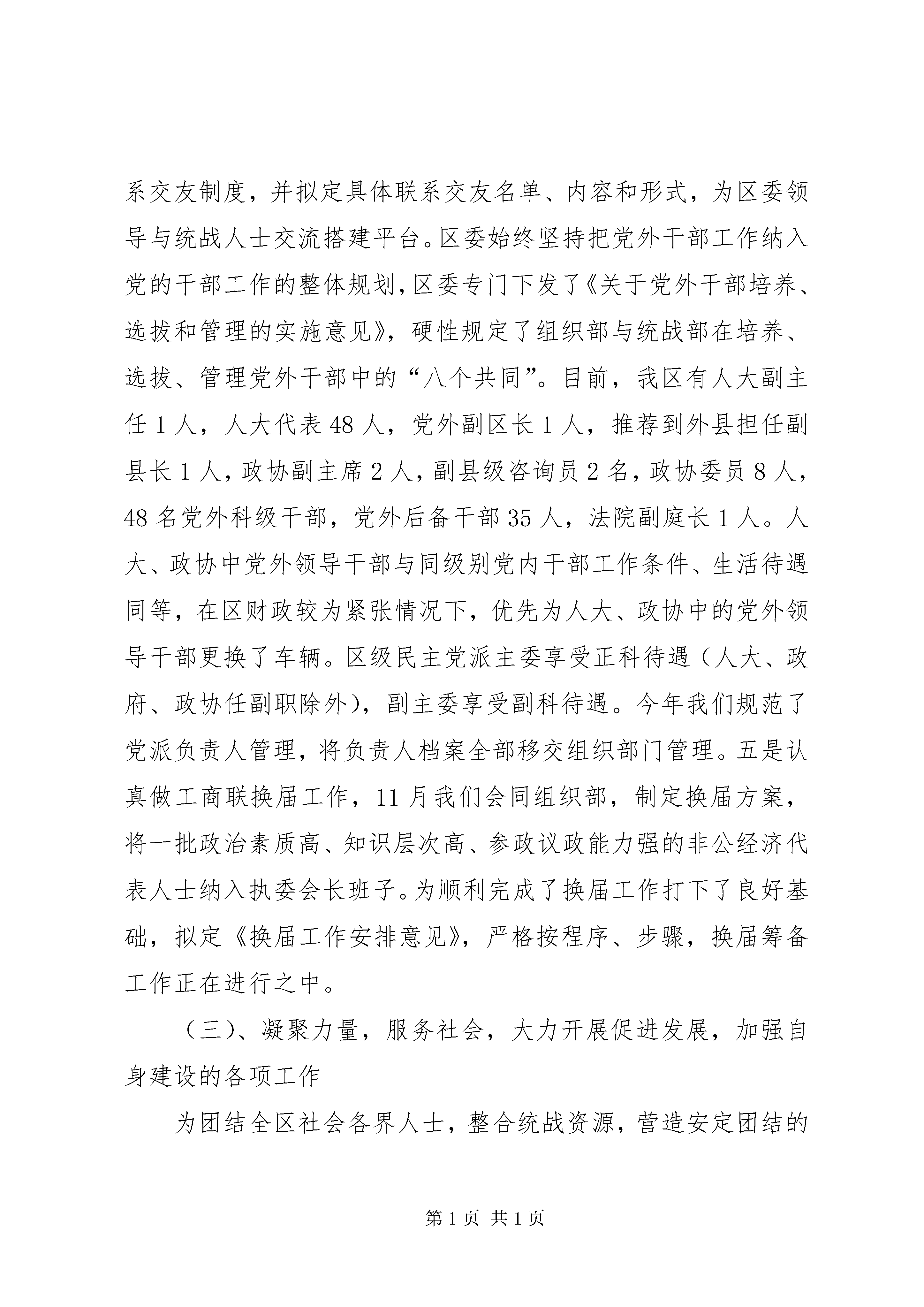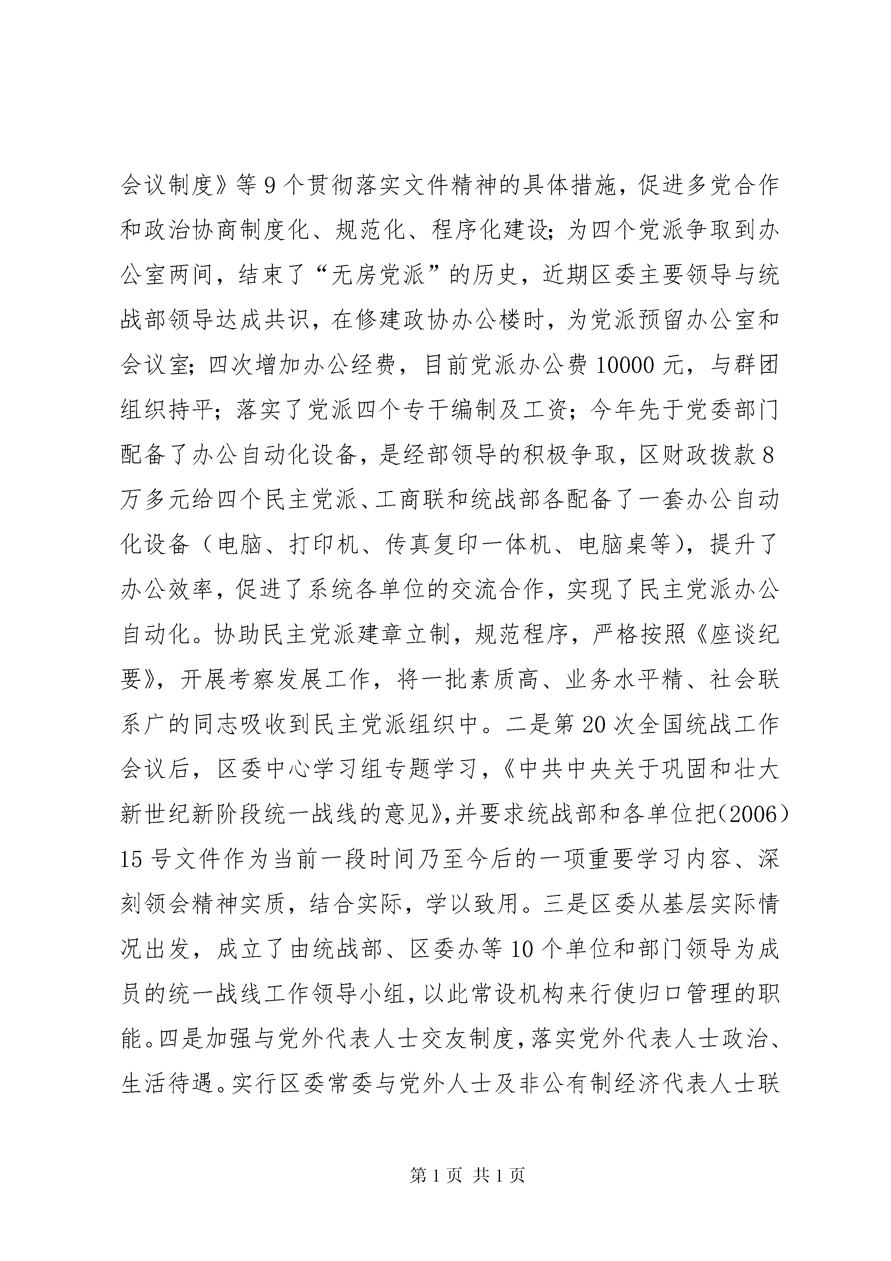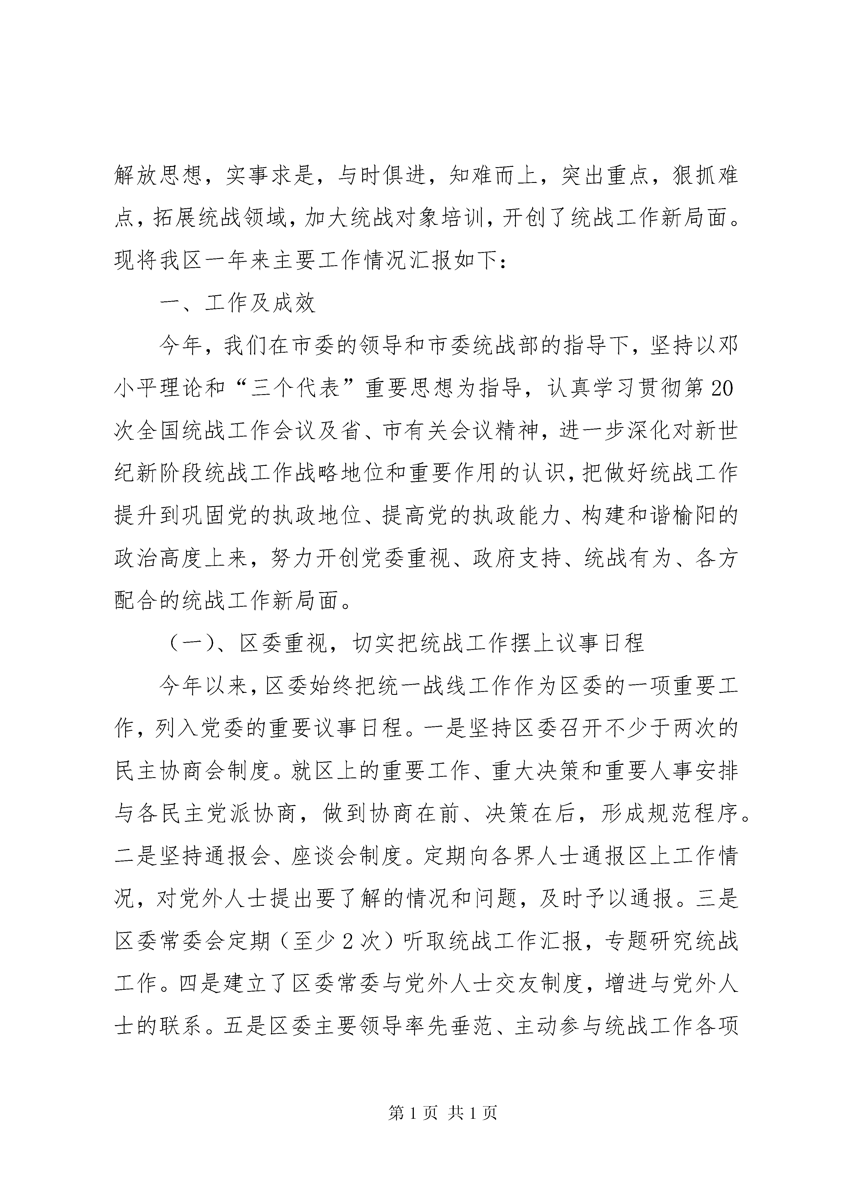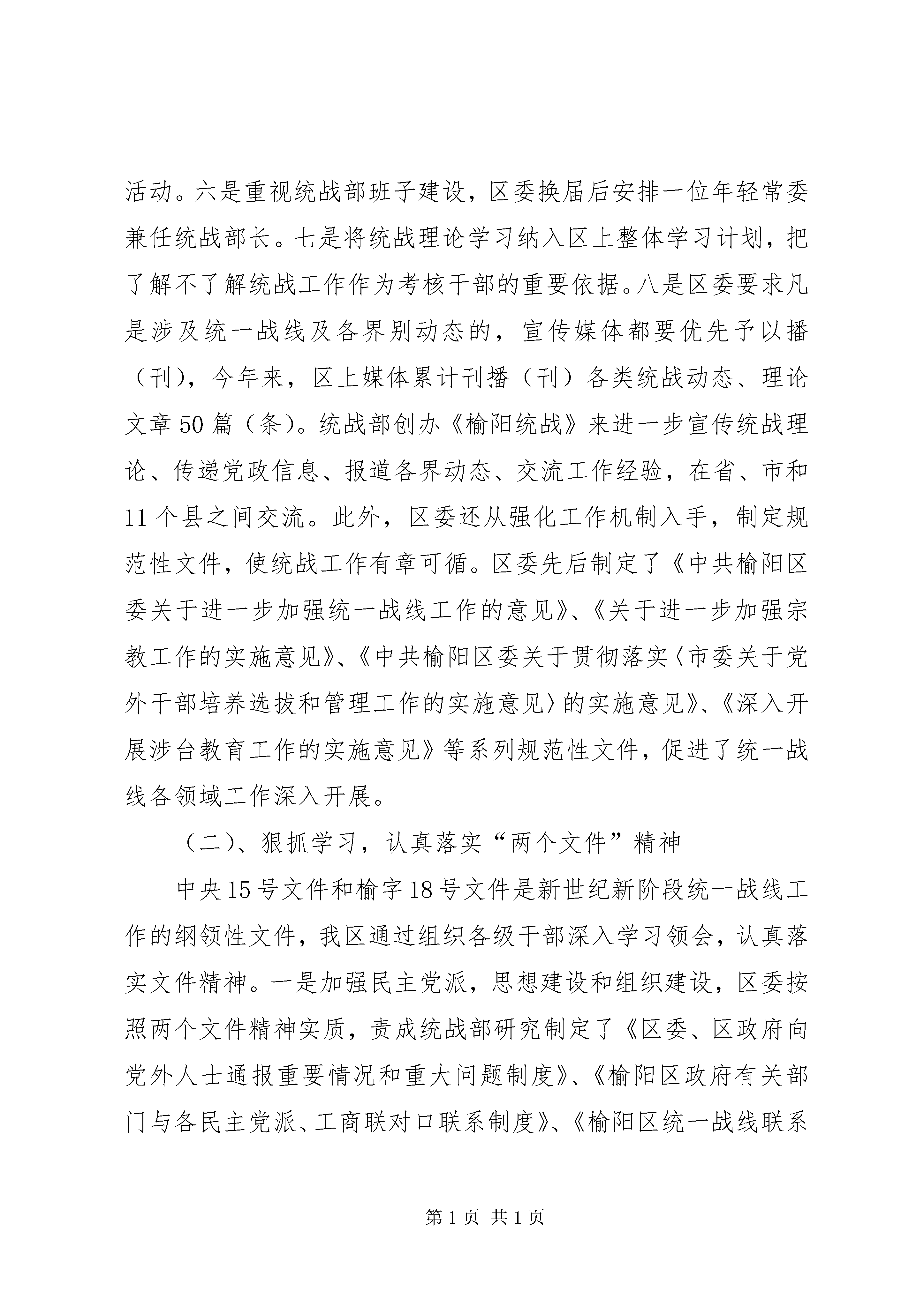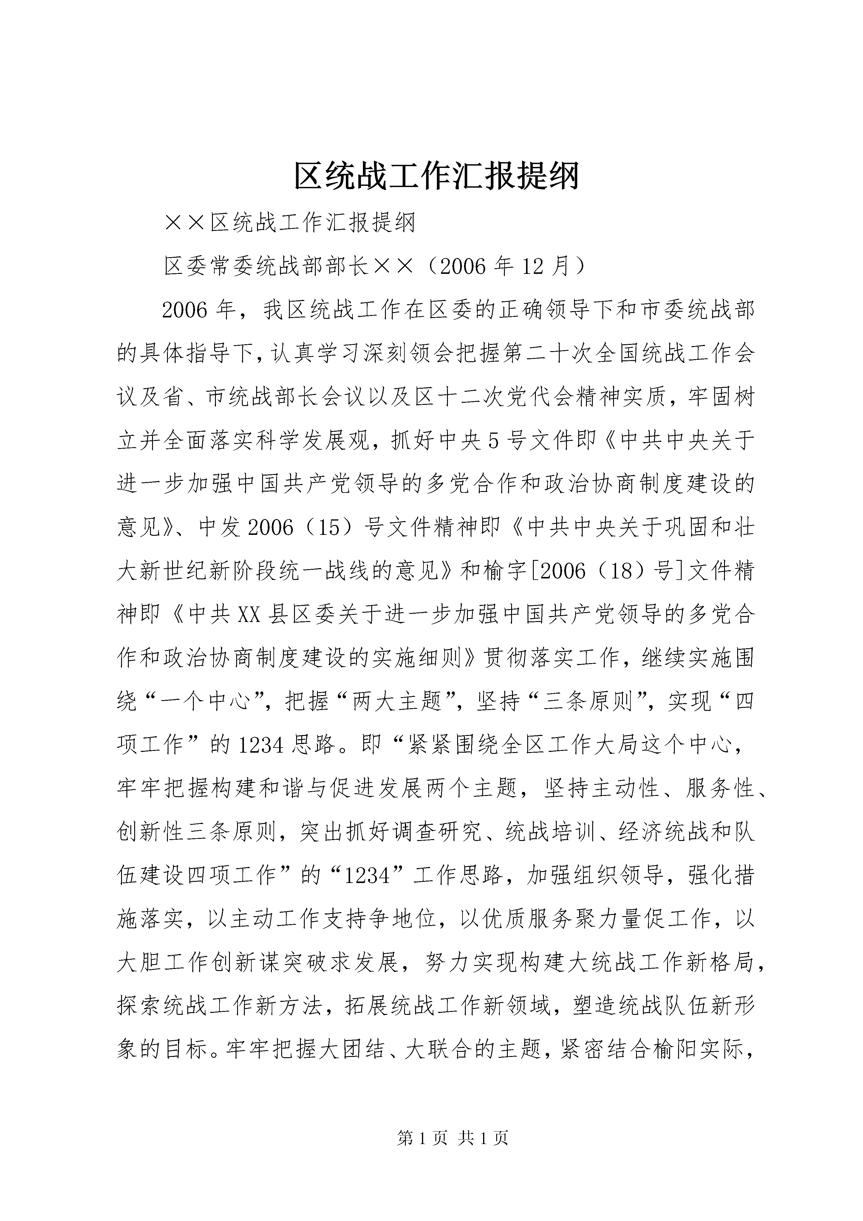 区统战工作汇报提纲××区统战工作汇报提纲区委常委统战部部长××(2006年12月)2006年,我区统战工作在区委的正确领导下和市委统战部的具体指导下,认真学习深刻领会把握第二十次全国统战工作会议及省、市统战部长会议以及区十二次党代会精神实质,牢固树立并全面落实科学发展观,抓好中央5号文件即《中共中央关于进一步加强中国共产党领导的多党合作和政治协商制度建设的意见》、中发2006(15)号文件精神即《中共中央关于巩固和壮大新世纪新阶段统一战线的意见》和榆字[2006(18)号]文件精神即《中共XX县区委关于进一步加强中国共产党领导的多党合作和政治协商制度建设的实施细则》贯彻落实工作,继续实施围绕“一个中心”,把握“两大主题”,坚持“三条原则”,实现“四项工作”的1234思路。即“紧紧围绕全区工作大局这个中心,牢牢把握构建和谐与促进发展两个主题,坚持主动性、服务性、创新性三条原则,突出抓好调查研究、统战培训、经济统战和队伍建设四项工作”的“1234”工作思路,加强组织领导,强化措施落实,以主动工作支持争地位,以优质服务聚力量促工作,以大胆工作创新谋突破求发展,努力实现构建大统战工作新格局,探索统战工作新方法,拓展统战工作新领域,塑造统战队伍新形象的目标。牢牢把握大团结、大联合的主题,紧密结合榆阳实际,解放思想,实事求是,与时俱进,知难而上,突出重点,狠抓难点,拓展统战领域,加大统战对象培训,开创了统战工作新局面。现将我区一年来主要工作情况汇报如下:一、工作及成效今年,我们在市委的领导和市委统战部的指导下,坚持以邓小平理论和“三个代表”重要思想为指导,认真学习贯彻第20次全国统战工作会议及省、市有关会议精神,进一步深化对新世纪新阶段统战工作战略地位和重要作用的认识,把做好统战工作提升到巩固党的执政地位、提高党的执政能力、构建和谐榆阳的政治高度上来,努力开创党委重视、政府支持、统战有为、各方配合的统战工作新局面。(一)、区委重视,切实把统战工作摆上议事日程今年以来,区委始终把统一战线工作作为区委的一项重要工作,列入党委的重要议事日程。一是坚持区委召开不少于两次的民主协商会制度。就区上的重要工作、重大决策和重要人事安排与各民主党派协商,做到协商在前、决策在后,形成规范程序。二是坚持通报会、座谈会制度。定期向各界人士通报区上工作情况,对党外人士提出要了解的情况和问题,及时予以通报。三是区委常委会定期(至少2次)听取统战工作汇报,专题研究统战工作。四是建立了区委常委与党外人士交友制度,增进与党外人士的联系。五是区委主要领导率先垂范、主动参与统战工作各项活动。六是重视统战部班子建设,区委换届后安排一位年轻常委兼任统战部长。七是将统战理论学习纳入区上整体学习计划,把了解不了解统战工作作为考核干部的重要依据。八是区委要求凡是涉及统一战线及各界别动态的,宣传媒体都要优先予以播(刊),今年来,区上媒体累计刊播(刊)各类统战动态、理论文章50篇(条)。统战部创办《榆阳统战》来进一步宣传统战理论、传递党政信息、报道各界动态、交流工作经验,在省、市和11个县之间交流。此外,区委还从强化工作机制入手,制定规范性文件,使统战工作有章可循。区委先后制定了《中共榆阳区委关于进一步加强统一战线工作的意见》、《关于进一步加强宗教工作的实施意见》、《中共榆阳区委关于贯彻落实〈市委关于党外干部培养选拔和管理工作的实施意见〉的实施意见》、《深入开展涉台教育工作的实施意见》等系列规范性文件,促进了统一战线各领域工作深入开展。(二)、狠抓学习,认真落实“两个文件”精神中央15号文件和榆字18号文件是新世纪新阶段统一战线工作的纲领性文件,我区通过组织各级干部深入学习领会,认真落实文件精神。一是加强民主党派,思想建设和组织建设,区委按照两个文件精神实质,责成统战部研究制定了《区委、区政府向党外人士通报重要情况和重大问题制度》、《榆阳区政府有关部门与各民主党派、工商联对口联系制度》、《榆阳区统一战线联系会议制度》等9个贯彻落实文件精神的具体措施,促进多党合作和政治协商制度化、规范化、程序化建设;为四个党派争取到办公室两间,结束了“无房党派”的历史,近期区委主要领导与统战部领导达成共识,在修建政协办公楼时,为党派预留办公室和会议室;四次增加办公经费,目前党派办公费10000元,与群团组织持平;落实了党派四个专干编制及工资;今年先于党委部门配备了办公自动化设备,是经部领导的积极争取,区财政拨款8万多元给四个民主党派、工商联和统战部各配备了一套办公自动化设备(电脑、打印机、传真复印一体机、电脑桌等),提升了办公效率,促进了系统各单位的交流合作,实现了民主党派办公自动化。协助民主党派建章立制,规范程序,严格按照《座谈纪要》,开展考察发展工作,将一批素质高、业务水平精、