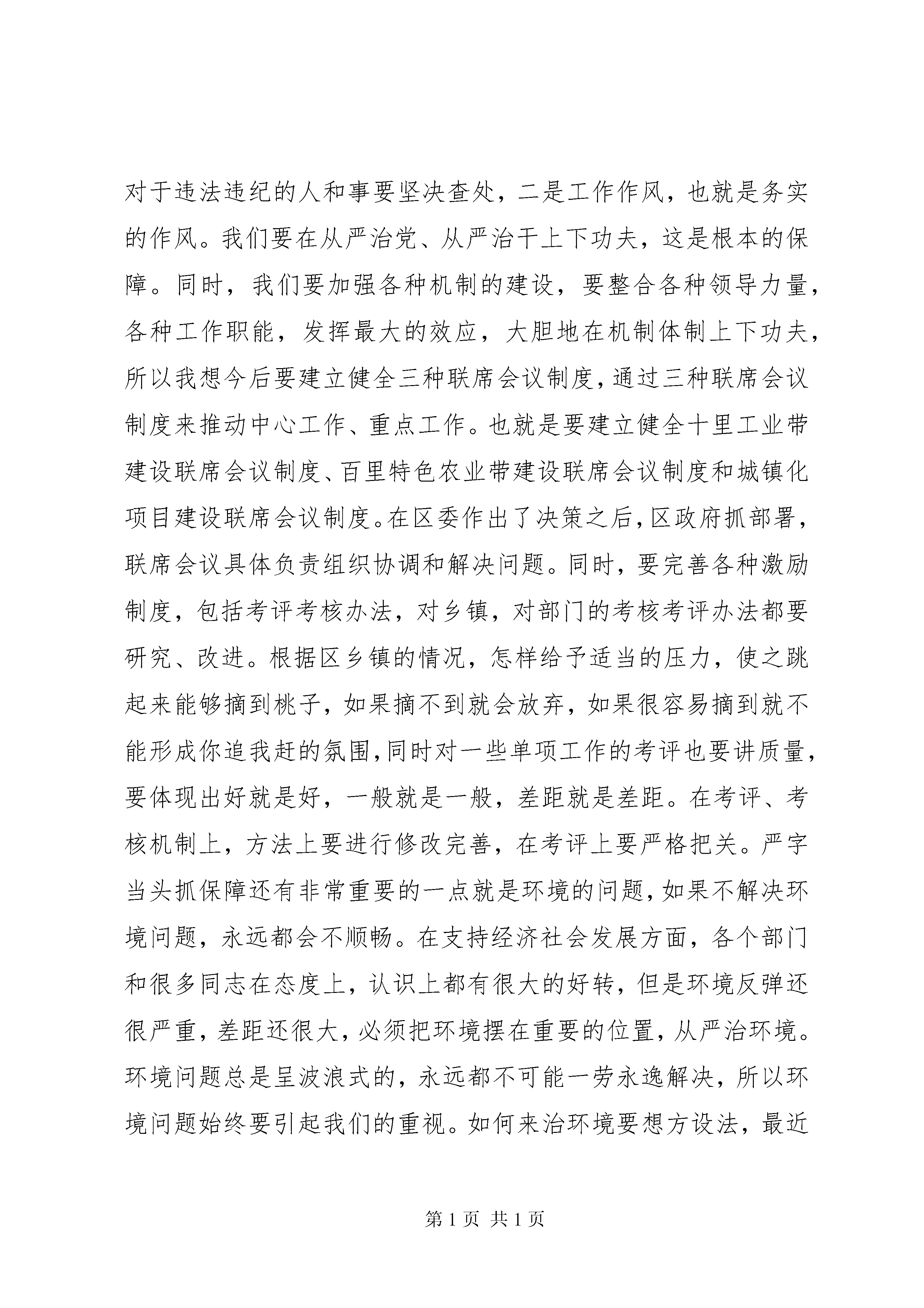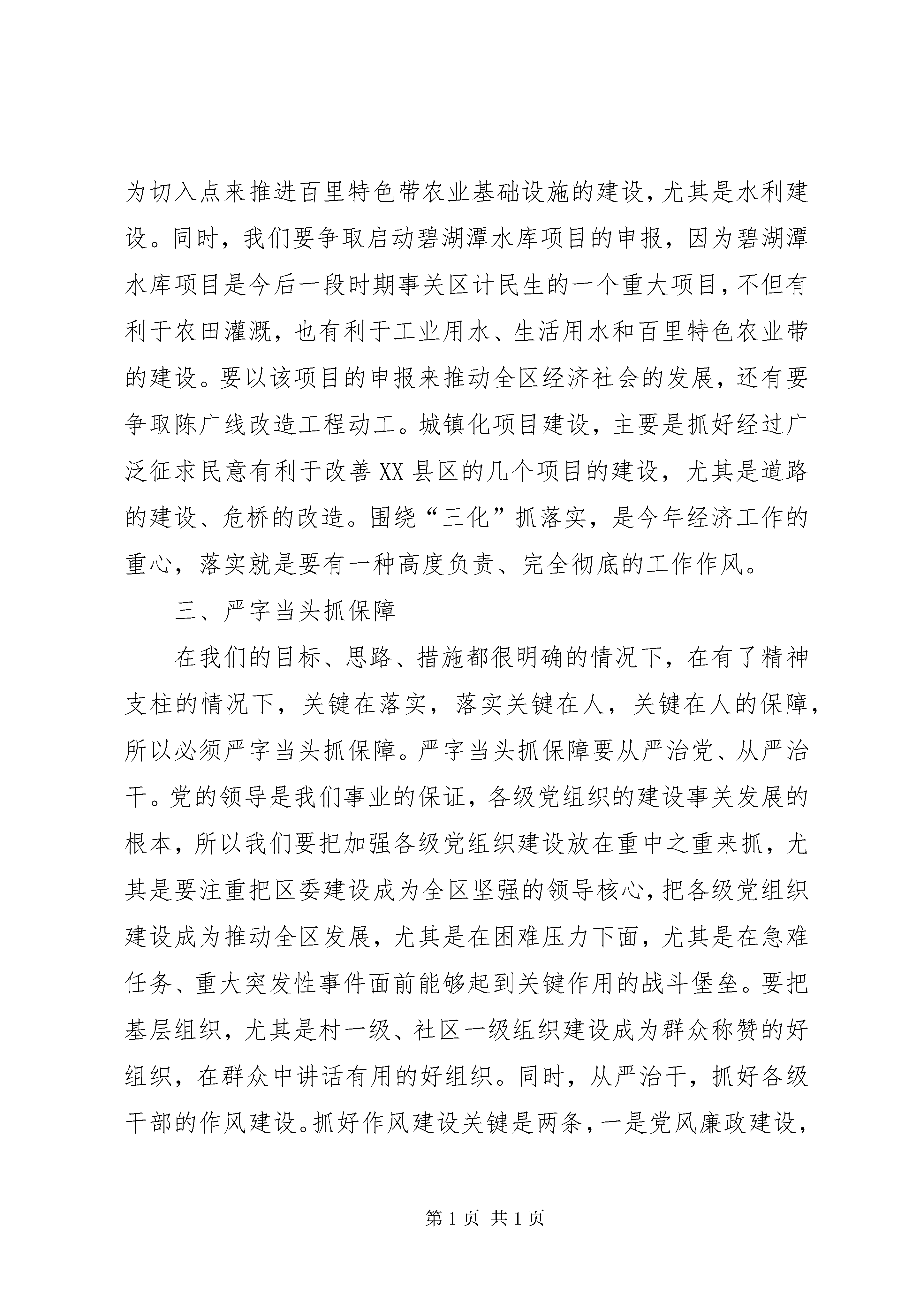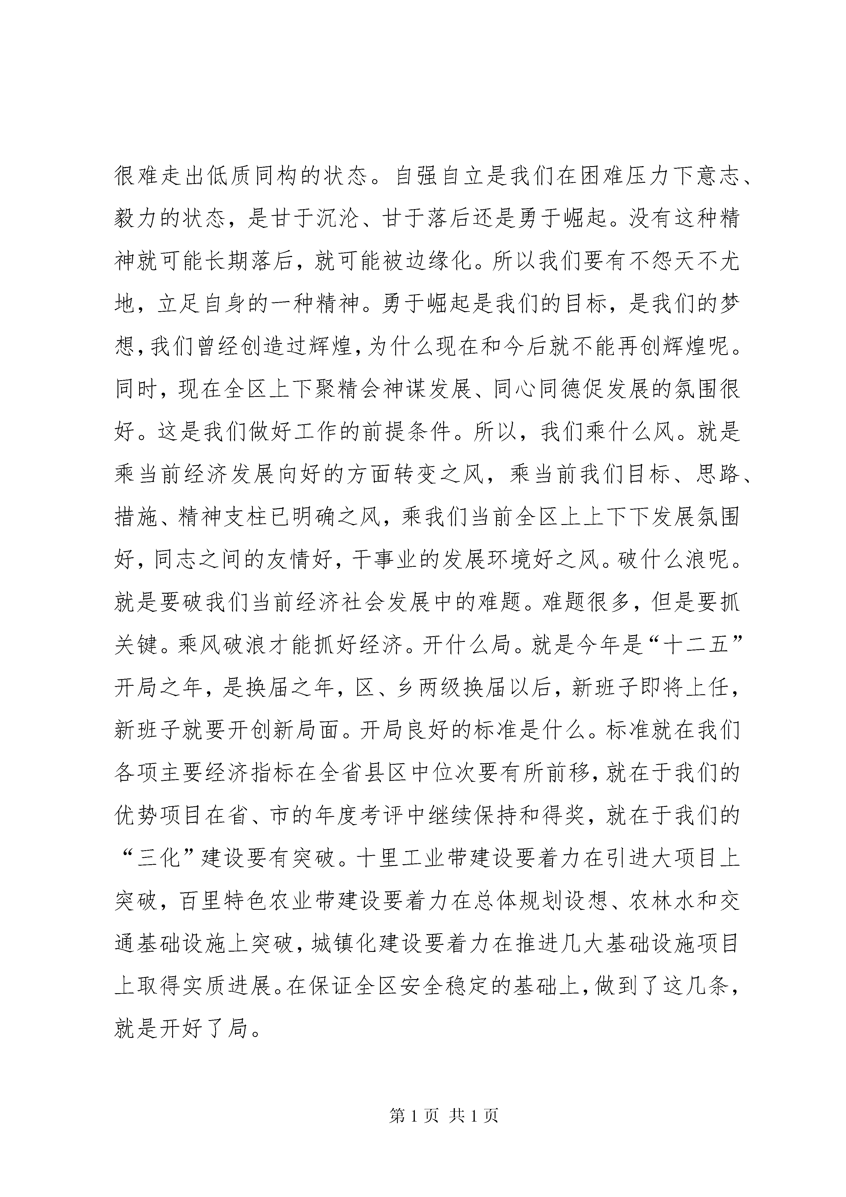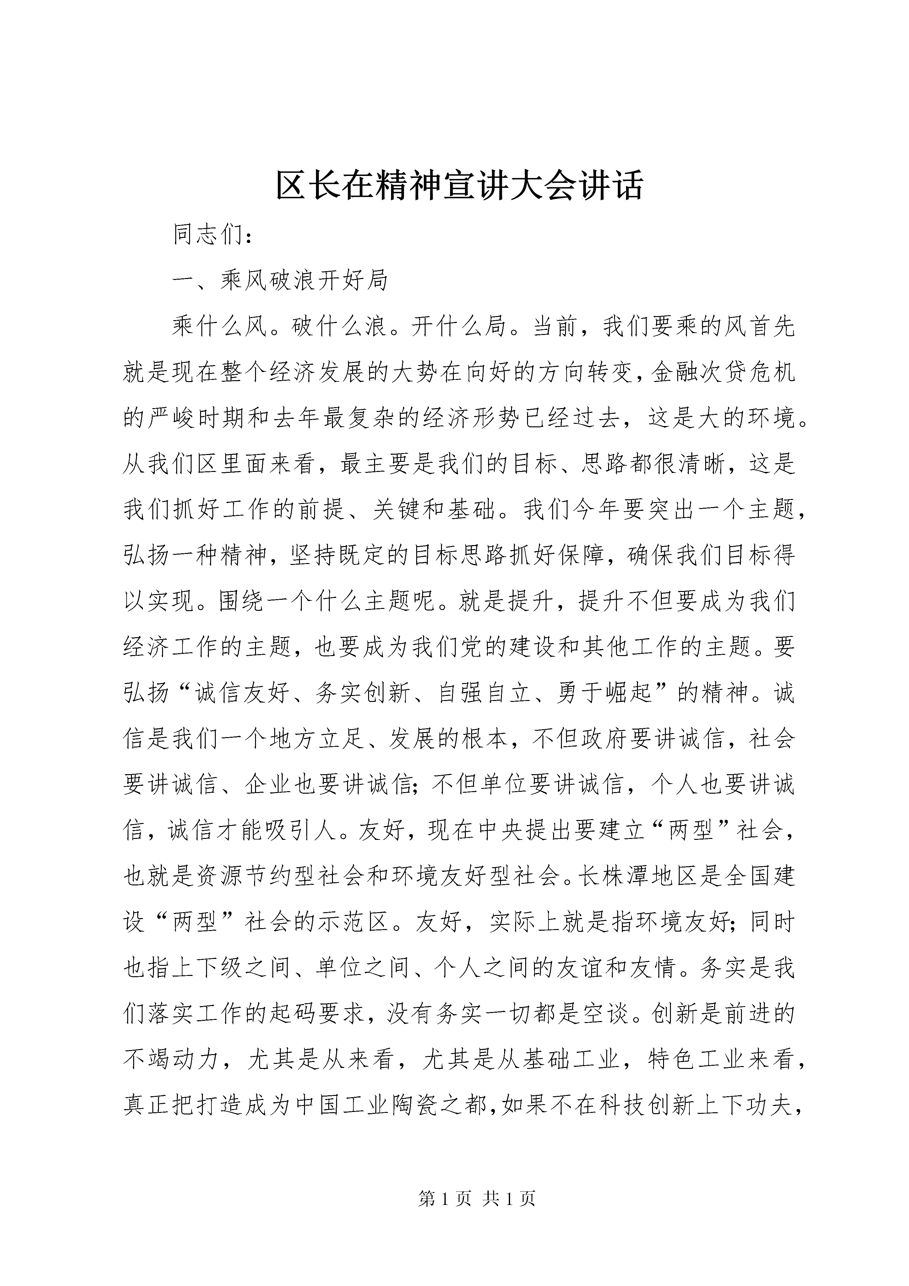 区长在精神宣讲大会讲话同志们:一、乘风破浪开好局乘什么风。破什么浪。开什么局。当前,我们要乘的风首先就是现在整个经济发展的大势在向好的方向转变,金融次贷危机的严峻时期和去年最复杂的经济形势已经过去,这是大的环境。从我们区里面来看,最主要是我们的目标、思路都很清晰,这是我们抓好工作的前提、关键和基础。我们今年要突出一个主题,弘扬一种精神,坚持既定的目标思路抓好保障,确保我们目标得以实现。围绕一个什么主题呢。就是提升,提升不但要成为我们经济工作的主题,也要成为我们党的建设和其他工作的主题。要弘扬“诚信友好、务实创新、自强自立、勇于崛起”的精神。诚信是我们一个地方立足、发展的根本,不但政府要讲诚信,社会要讲诚信、企业也要讲诚信;不但单位要讲诚信,个人也要讲诚信,诚信才能吸引人。友好,现在中央提出要建立“两型”社会,也就是资源节约型社会和环境友好型社会。长株潭地区是全国建设“两型”社会的示范区。友好,实际上就是指环境友好;同时也指上下级之间、单位之间、个人之间的友谊和友情。务实是我们落实工作的起码要求,没有务实一切都是空谈。创新是前进的不竭动力,尤其是从来看,尤其是从基础工业,特色工业来看,真正把打造成为中国工业陶瓷之都,如果不在科技创新上下功夫,很难走出低质同构的状态。自强自立是我们在困难压力下意志、毅力的状态,是甘于沉沦、甘于落后还是勇于崛起。没有这种精神就可能长期落后,就可能被边缘化。所以我们要有不怨天不尤地,立足自身的一种精神。勇于崛起是我们的目标,是我们的梦想,我们曾经创造过辉煌,为什么现在和今后就不能再创辉煌呢。同时,现在全区上下聚精会神谋发展、同心同德促发展的氛围很好。这是我们做好工作的前提条件。所以,我们乘什么风。就是乘当前经济发展向好的方面转变之风,乘当前我们目标、思路、措施、精神支柱已明确之风,乘我们当前全区上上下下发展氛围好,同志之间的友情好,干事业的发展环境好之风。破什么浪呢。就是要破我们当前经济社会发展中的难题。难题很多,但是要抓关键。乘风破浪才能抓好经济。开什么局。就是今年是“十二五”开局之年,是换届之年,区、乡两级换届以后,新班子即将上任,新班子就要开创新局面。开局良好的标准是什么。标准就在我们各项主要经济指标在全省县区中位次要有所前移,就在于我们的优势项目在省、市的年度考评中继续保持和得奖,就在于我们的“三化”建设要有突破。十里工业带建设要着力在引进大项目上突破,百里特色农业带建设要着力在总体规划设想、农林水和交通基础设施上突破,城镇化建设要着力在推进几大基础设施项目上取得实质进展。在保证全区安全稳定的基础上,做到了这几条,就是开好了局。二、围绕“三化”抓落实“三化”建设也就是新型工业化、农业现代化和城镇化。“三化”建设是当前和今后全区经济工作的中心。讲得更具体一点就是推进十里工业带建设、推进百里特色农业带建设、推进城镇化基础设施项目建设。推进十里工业带的建设,龙头在产业基地,今年产业基地首先就要抓好两项工作,一个是要拿下省级工业园的牌子,一个是争取成功申报国家级高新技术工业陶瓷技术产业园。今后要继续抓好陶瓷产业基地基础设施建设,重点是铁路专用线的建设以及水、电、气的建设,既要解决好多元化供气的问题,又要在工业园规划建设新的变电站。在此基础上要整治好工业园的环境,最终要落脚在两点上,一点就是工业园要千方百计举全区之力引进1—2个投资10亿元以上的能形成产业的大项目。如果做不到这一点,勇于崛起就会缺乏产业支柱。最终的落脚点就是工业园要实现税收1.5亿元。只有把这两点做好了,工业园的建设才开好了局。百里特色农业带的建设关键是抓设想,抓基础。设想也就是百里特色农业带的建设逐步取得共识,在取得共识的基础上,要有总体设想,百里特色农业带的建设,哪些点,哪些基地,如何把点和基地连接起来,必须要有总体考虑。同时,就是抓基础,抓什么基础。就是抓我们农业基础设施的建设,尤其是要抓好今年中央一号文件关于水利设施建设的落实。以落实中央一号文件为切入点来推进百里特色带农业基础设施的建设,尤其是水利建设。同时,我们要争取启动碧湖潭水库项目的申报,因为碧湖潭水库项目是今后一段时期事关区计民生的一个重大项目,不但有利于农田灌溉,也有利于工业用水、生活用水和百里特色农业带的建设。要以该项目的申报来推动全区经济社会的发展,还有要争取陈广线改造工程动工。城镇化项目建设,主要是抓好经过广泛征求民意有利于改善XX县区的几个项目的建设,尤其是道路的建设、危桥的改造。围绕“三化”抓落实,是今年经济工作的重心,落实就是要有一种高度负责、完全彻底的工作作风。三、严字当头抓保障在我们的目标、思路、措施都很明确的情况下,在有了精神支柱的情况下,关键在落实,落实关键在人,关键在人的保障,所以必须严字当头抓保障。严字当头抓保障要从严