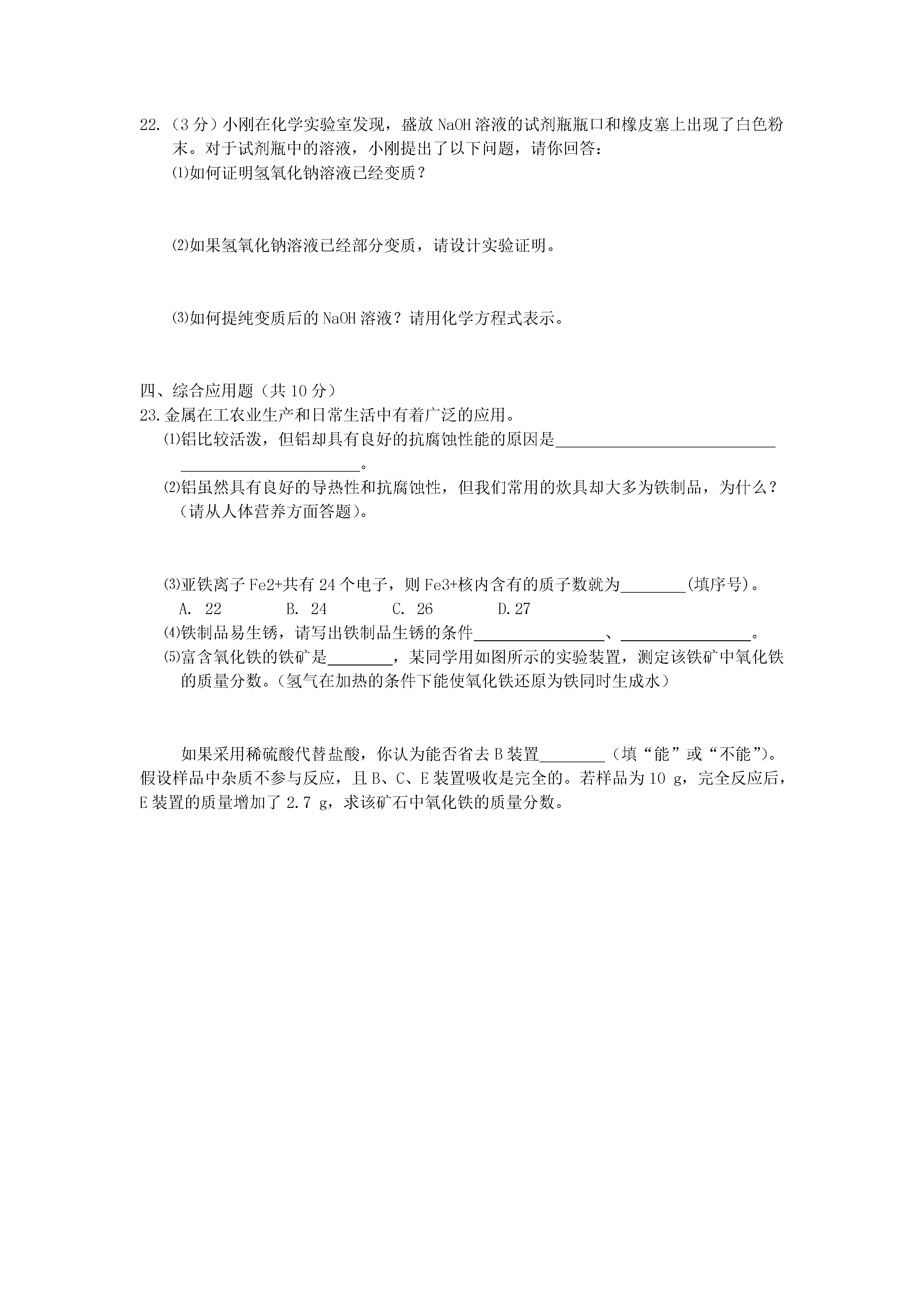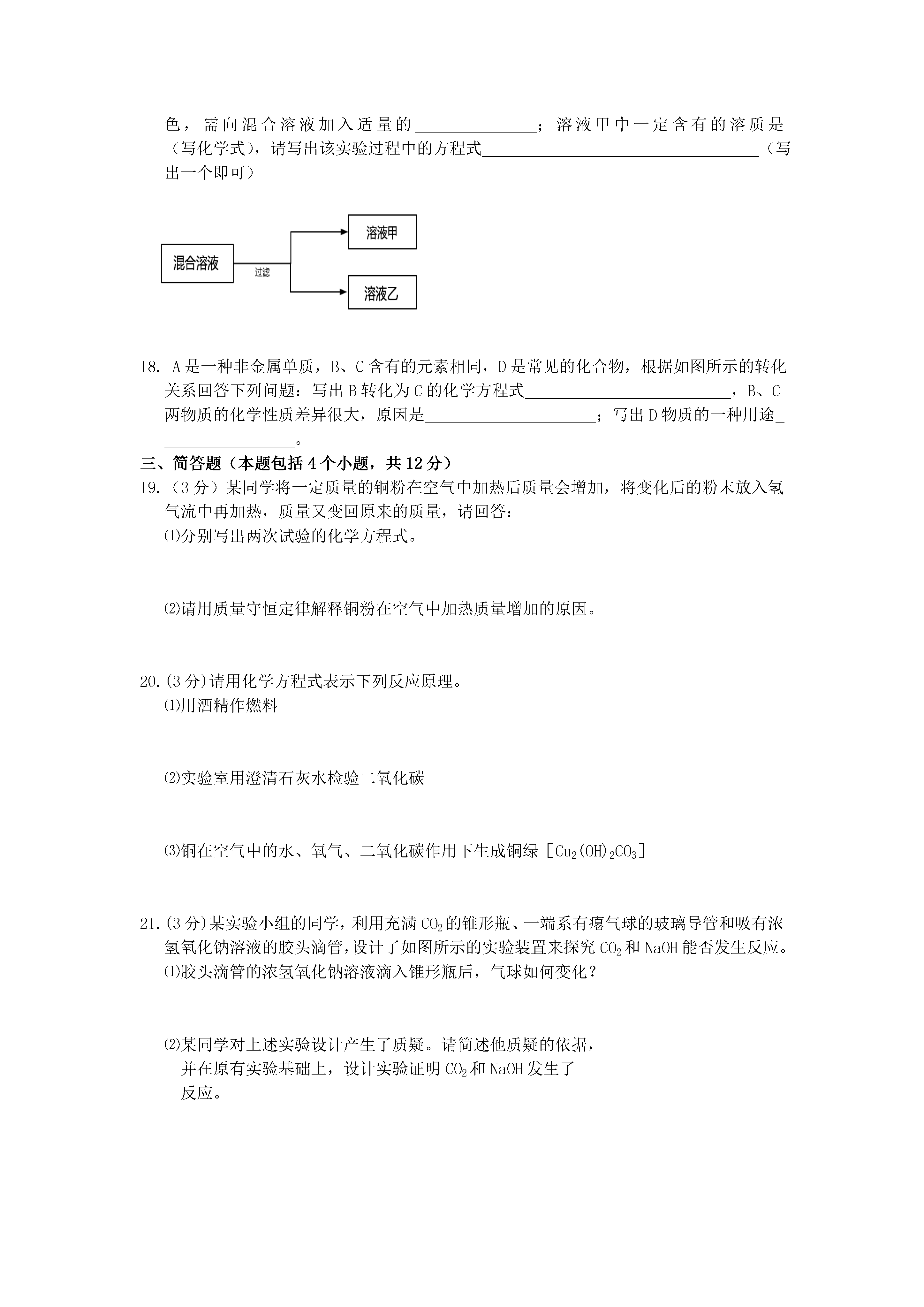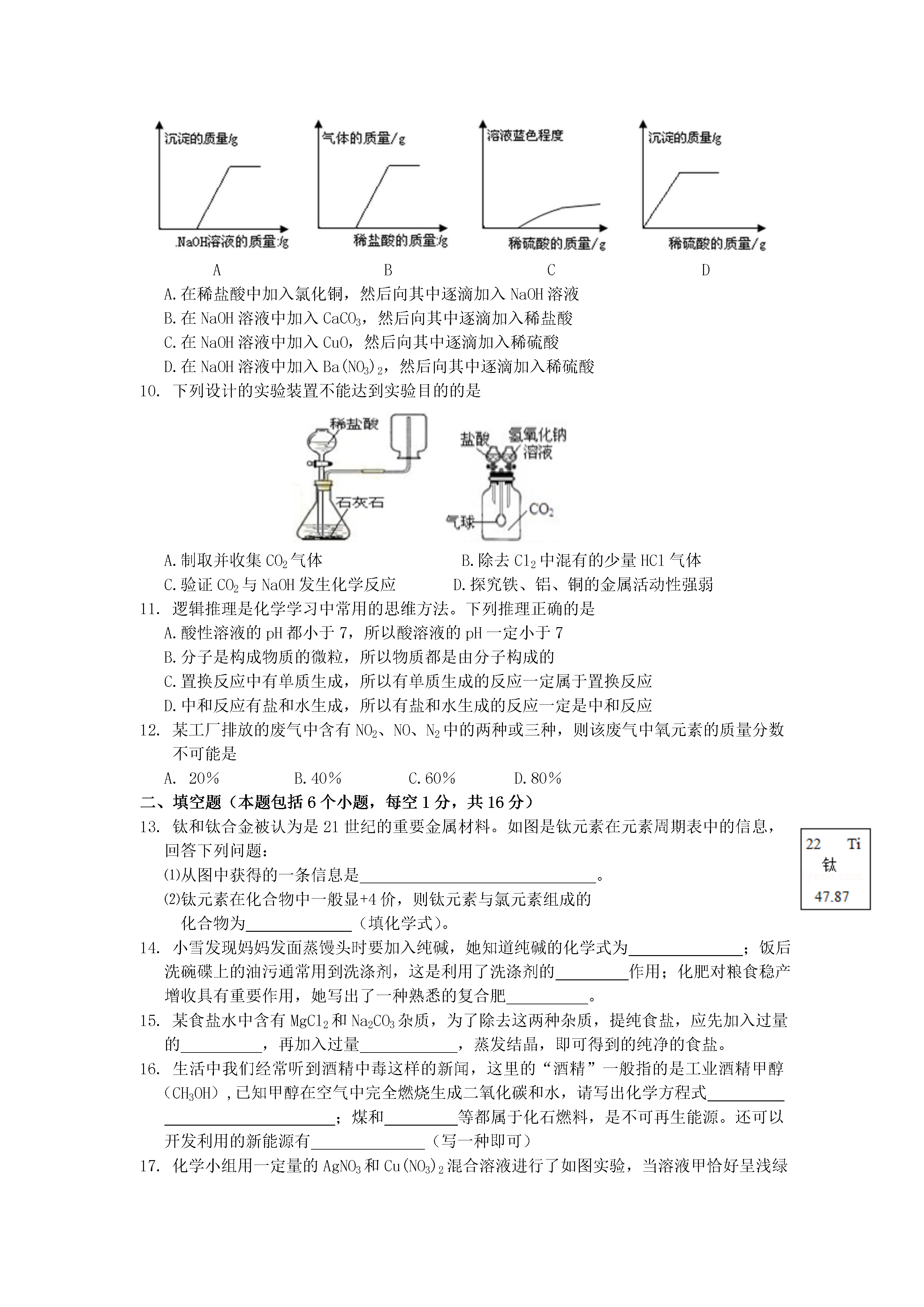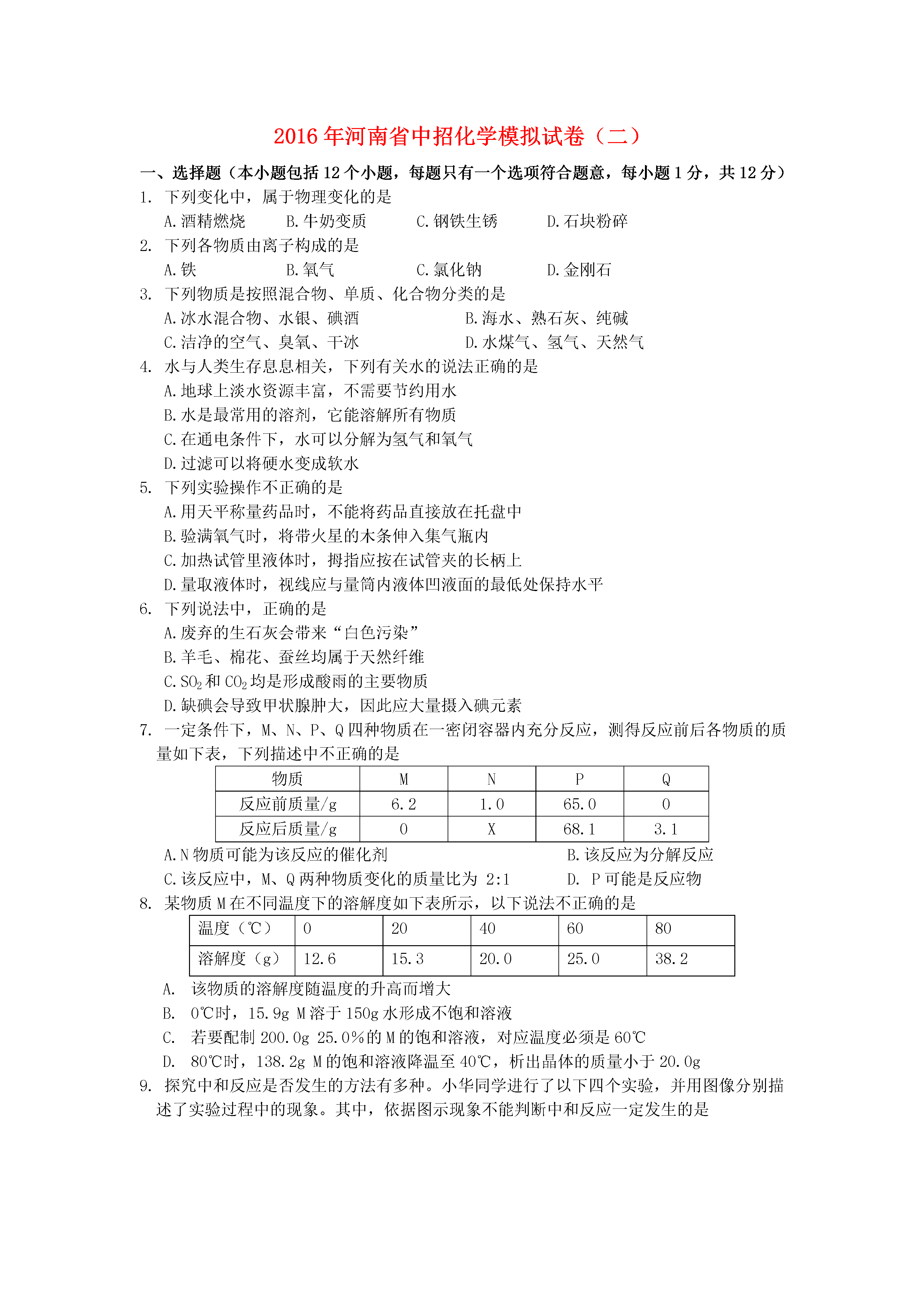2016年河南省中招化学模拟试卷(二)一、选择题(本小题包括12个小题,每题只有一个选项符合题意,每小题1分,共12分)1.下列变化中,属于物理变化的是A.酒精燃烧B.牛奶变质C.钢铁生锈D.石块粉碎2.下列各物质由离子构成的是A.铁B.氧气C.氯化钠D.金刚石3.下列物质是按照混合物、单质、化合物分类的是A.冰水混合物、水银、碘酒B.海水、熟石灰、纯碱C.洁净的空气、臭氧、干冰D.水煤气、氢气、天然气4.水与人类生存息息相关,下列有关水的说法正确的是A.地球上淡水资源丰富,不需要节约用水B.水是最常用的溶剂,它能溶解所有物质C.在通电条件下,水可以分解为氢气和氧气D.过滤可以将硬水变成软水5.下列实验操作不正确的是A.用天平称量药品时,不能将药品直接放在托盘中B.验满氧气时,将带火星的木条伸入集气瓶内C.加热试管里液体时,拇指应按在试管夹的长柄上D.量取液体时,视线应与量筒内液体凹液面的最低处保持水平6.下列说法中,正确的是A.废弃的生石灰会带来“白色污染”B.羊毛、棉花、蚕丝均属于天然纤维C.SO2和CO2均是形成酸雨的主要物质D.缺碘会导致甲状腺肿大,因此应大量摄入碘元素7.一定条件下,M、N、P、Q四种物质在一密闭容器内充分反应,测得反应前后各物质的质量如下表,下列描述中不正确的是物质MNPQ反应前质量/g6.21.065.00反应后质量/g0X68.13.1A.N物质可能为该反应的催化剂B.该反应为分解反应C.该反应中,M、Q两种物质变化的质量比为2:1D.P可能是反应物8.某物质M在不同温度下的溶解度如下表所示,以下说法不正确的是温度(℃)020406080溶解度(g)12.615.320.025.038.2该物质的溶解度随温度的升高而增大0℃时,15.9gM溶于150g水形成不饱和溶液若要配制200.0g25.0%的M的饱和溶液,对应温度必须是60℃80℃时,138.2gM的饱和溶液降温至40℃,析出晶体的质量小于20.0g9.探究中和反应是否发生的方法有多种。小华同学进行了以下四个实验,并用图像分别描述了实验过程中的现象。其中,依据图示现象不能判断中和反应一定发生的是ABCDA.在稀盐酸中加入氯化铜,然后向其中逐滴加入NaOH溶液B.在NaOH溶液中加入CaCO3,然后向其中逐滴加入稀盐酸C.在NaOH溶液中加入CuO,然后向其中逐滴加入稀硫酸D.在NaOH溶液中加入Ba(NO3)2,然后向其中逐滴加入稀硫酸10.下列设计的实验装置不能达到实验目的的是A.制取并收集CO2气体B.除去Cl2中混有的少量HCl气体C.验证CO2与NaOH发生化学反应D.探究铁、铝、铜的金属活动性强弱11.逻辑推理是化学学习中常用的思维方法。下列推理正确的是A.酸性溶液的pH都小于7,所以酸溶液的pH一定小于7B.分子是构成物质的微粒,所以物质都是由分子构成的C.置换反应中有单质生成,所以有单质生成的反应一定属于置换反应D.中和反应有盐和水生成,所以有盐和水生成的反应一定是中和反应12.某工厂排放的废气中含有NO2、NO、N2中的两种或三种,则该废气中氧元素的质量分数不可能是A.20%B.40%C.60%D.80%二、填空题(本题包括6个小题,每空1分,共16分)13.钛和钛合金被认为是21世纪的重要金属材料。如图是钛元素在元素周期表中的信息,回答下列问题:⑴从图中获得的一条信息是。⑵钛元素在化合物中一般显+4价,则钛元素与氯元素组成的化合物为(填化学式)。14.小雪发现妈妈发面蒸馒头时要加入纯碱,她知道纯碱的化学式为;饭后洗碗碟上的油污通常用到洗涤剂,这是利用了洗涤剂的作用;化肥对粮食稳产增收具有重要作用,她写出了一种熟悉的复合肥。15.某食盐水中含有MgCl2和Na2CO3杂质,为了除去这两种杂质,提纯食盐,应先加入过量的,再加入过量,蒸发结晶,即可得到的纯净的食盐。16.生活中我们经常听到酒精中毒这样的新闻,这里的“酒精”一般指的是工业酒精甲醇(CH3OH),已知甲醇在空气中完全燃烧生成二氧化碳和水,请写出化学方程式;煤和等都属于化石燃料,是不可再生能源。还可以开发利用的新能源有(写一种即可)17.化学小组用一定量的AgNO3和Cu(NO3)2混合溶液进行了如图实验,当溶液甲恰好呈浅绿色,需向混合溶液加入适量的;溶液甲中一定含有的溶质是(写化学式),请写出该实验过程中的方程式(写出一个即可)18.A是一种非金属单质,B、C含有的元素相同,D是常见的化合物,根据如图所示的转化关系回答下列问题:写出B转化为C的化学方程式,B、C两物质的化学性质差异很大,原因是;写出D物质的一种用途。三、简答题(