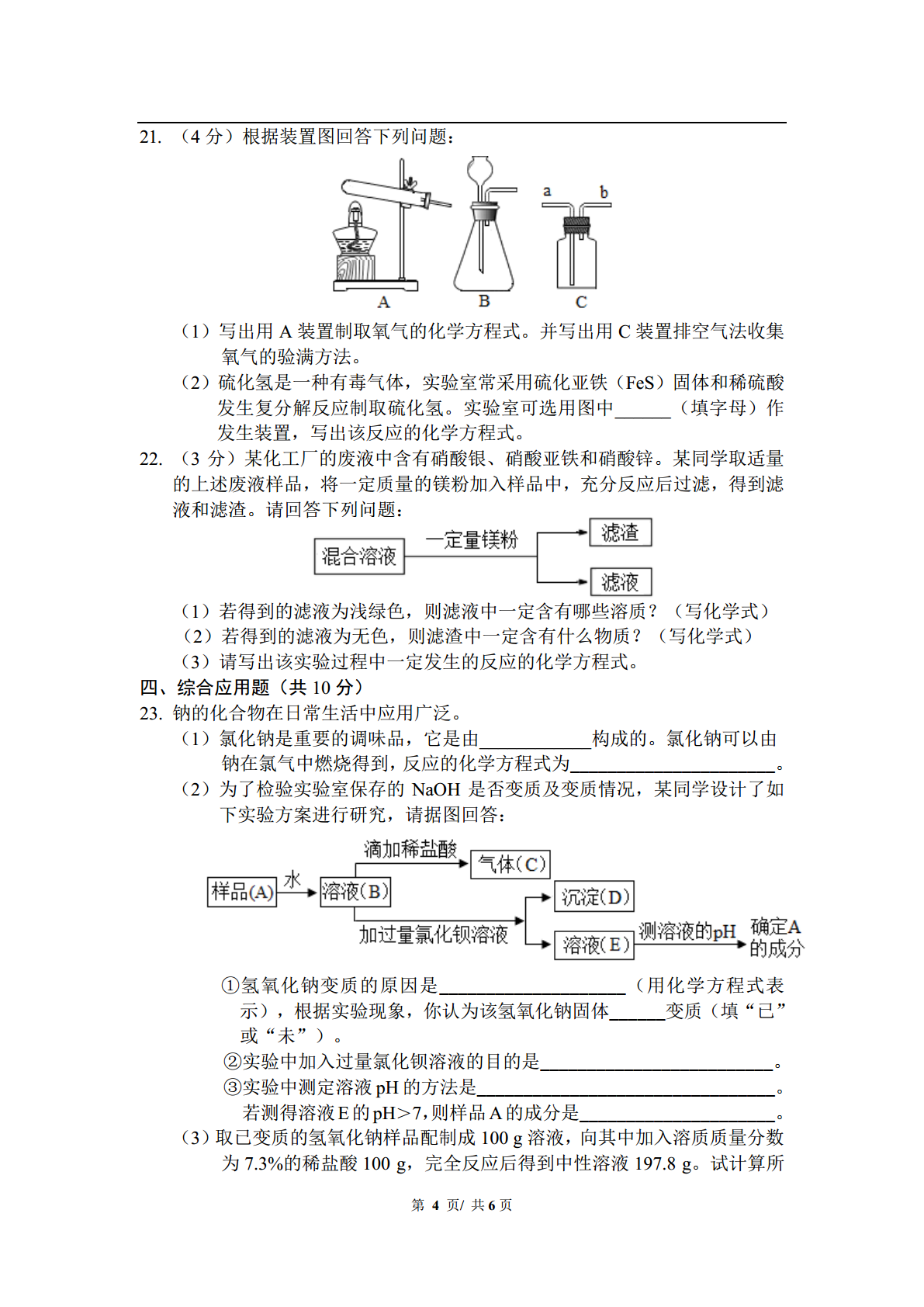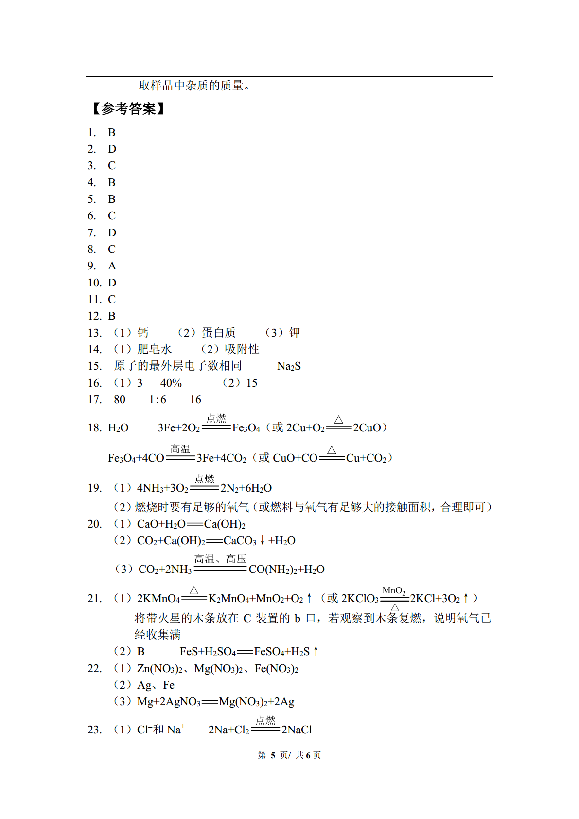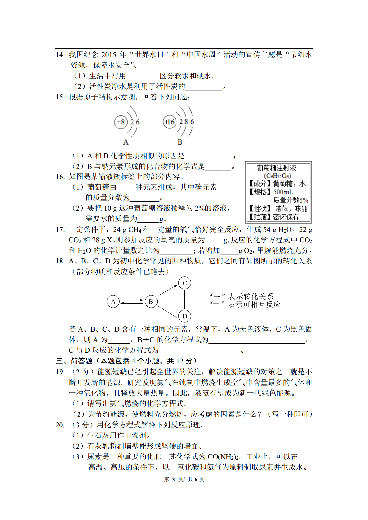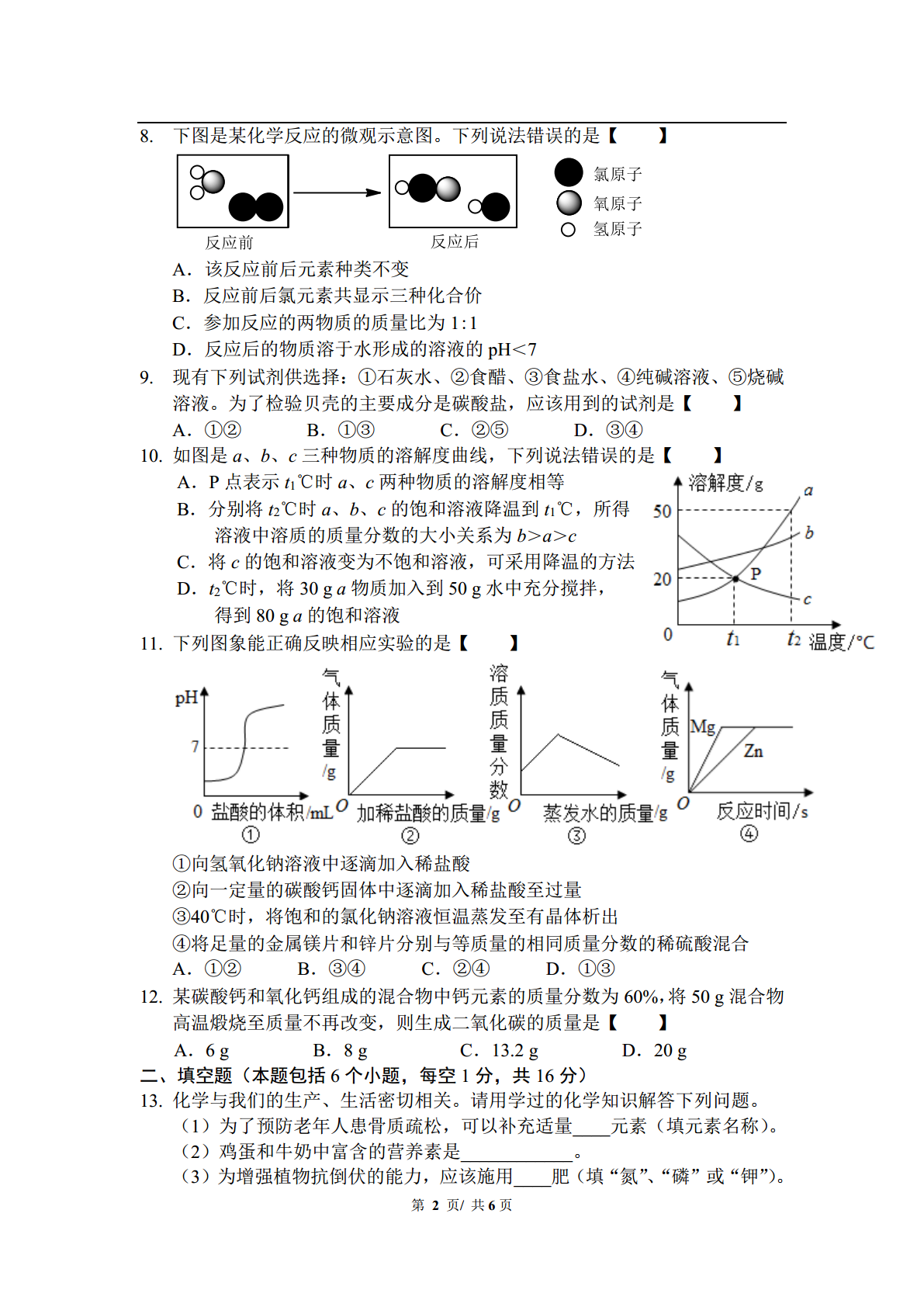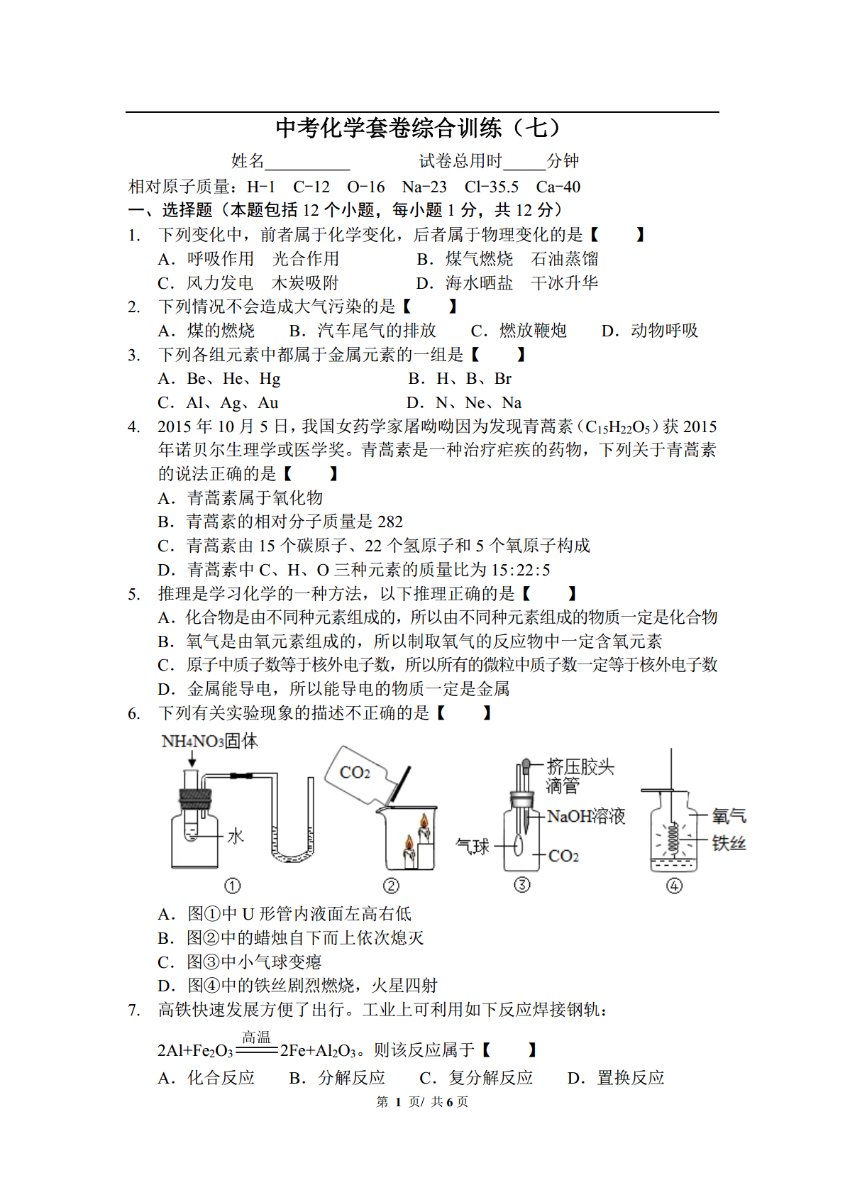 中考化学套卷综合训练(七)姓名__________试卷总用时_____分钟相对原子质量:H-1C-12O-16Na-23Cl-35.5Ca-40一、选择题(本题包括12个小题,每小题1分,共12分)1.下列变化中,前者属于化学变化,后者属于物理变化的是【】A.呼吸作用光合作用B.煤气燃烧石油蒸馏C.风力发电木炭吸附D.海水晒盐干冰升华2.下列情况不会造成大气污染的是【】A.煤的燃烧B.汽车尾气的排放C.燃放鞭炮D.动物呼吸3.下列各组元素中都属于金属元素的一组是【】A.Be、He、HgB.H、B、BrC.Al、Ag、AuD.N、Ne、Na4.2015年10月5日,我国女药学家屠呦呦因为发现青蒿素(C15H22O5)获2015年诺贝尔生理学或医学奖。青蒿素是一种治疗疟疾的药物,下列关于青蒿素的说法正确的是【】A.青蒿素属于氧化物B.青蒿素的相对分子质量是282C.青蒿素由15个碳原子、22个氢原子和5个氧原子构成D.青蒿素中C、H、O三种元素的质量比为15:22:55.推理是学习化学的一种方法,以下推理正确的是【】A.化合物是由不同种元素组成的,所以由不同种元素组成的物质一定是化合物B.氧气是由氧元素组成的,所以制取氧气的反应物中一定含氧元素C.原子中质子数等于核外电子数,所以所有的微粒中质子数一定等于核外电子数D.金属能导电,所以能导电的物质一定是金属6.下列有关实验现象的描述不正确的是【】A.图①中U形管内液面左高右低B.图②中的蜡烛自下而上依次熄灭C.图③中小气球变瘪D.图④中的铁丝剧烈燃烧,火星四射7.高铁快速发展方便了出行。工业上可利用如下反应焊接钢轨:2Al+Fe2O32Fe+Al2O3。则该反应属于【】A.化合反应B.分解反应C.复分解反应D.置换反应/8.下图是某化学反应的微观示意图。下列说法错误的是【】A.该反应前后元素种类不变B.反应前后氯元素共显示三种化合价C.参加反应的两物质的质量比为1:1D.反应后的物质溶于水形成的溶液的pH<79.现有下列试剂供选择:①石灰水、②食醋、③食盐水、④纯碱溶液、⑤烧碱溶液。为了检验贝壳的主要成分是碳酸盐,应该用到的试剂是【】A.①②B.①③C.②⑤D.③④10.如图是a、b、c三种物质的溶解度曲线,下列说法错误的是【】A.P点表示t1℃时a、c两种物质的溶解度相等B.分别将t2℃时a、b、c的饱和溶液降温到t1℃,所得溶液中溶质的质量分数的大小关系为b>a>cC.将c的饱和溶液变为不饱和溶液,可采用降温的方法D.t2℃时,将30ga物质加入到50g水中充分搅拌,得到80ga的饱和溶液11.下列图象能正确反映相应实验的是【】①向氢氧化钠溶液中逐滴加入稀盐酸②向一定量的碳酸钙固体中逐滴加入稀盐酸至过量③40℃时,将饱和的氯化钠溶液恒温蒸发至有晶体析出④将足量的金属镁片和锌片分别与等质量的相同质量分数的稀硫酸混合A.①②B.③④C.②④D.①③12.某碳酸钙和氧化钙组成的混合物中钙元素的质量分数为60%,将50g混合物高温煅烧至质量不再改变,则生成二氧化碳的质量是【】A.6gB.8gC.13.2gD.20g二、填空题(本题包括6个小题,每空1分,共16分)13.化学与我们的生产、生活密切相关。请用学过的化学知识解答下列问题。(1)为了预防老年人患骨质疏松,可以补充适量____元素(填元素名称)。(2)鸡蛋和牛奶中富含的营养素是____________。(3)为增强植物抗倒伏的能力,应该施用____肥(填“氮”、“磷”或“钾”)。/14.我国纪念2015年“世界水日”和“中国水周”活动的宣传主题是“节约水资源,保障水安全”。(1)生活中常用_________区分软水和硬水。(2)活性炭净水是利用了活性炭的__________。15.根据原子结构示意图,回答下列问题:(1)A和B化学性质相似的原因是_____________;(2)B与钠元素形成的化合物的化学式是_______。16.如图是某输液瓶标签上的部分内容。(1)葡萄糖由_____种元素组成,其中碳元素的质量分数为________;(2)要把10g这种葡萄糖溶液稀释为2%的溶液,需要水的质量为______g。17.一定条件下,24gCH4和一定量的氧气恰好完全反应,生成54gH2O、22gCO2和28gX。则参加反应的氧气的质量为_____g,反应的化学方程式中CO2和H2O的化学计量数之比为_________;若增加_____gO2,甲烷能燃烧充分。18.A、B、C、D为初中化学常见的四种物质,