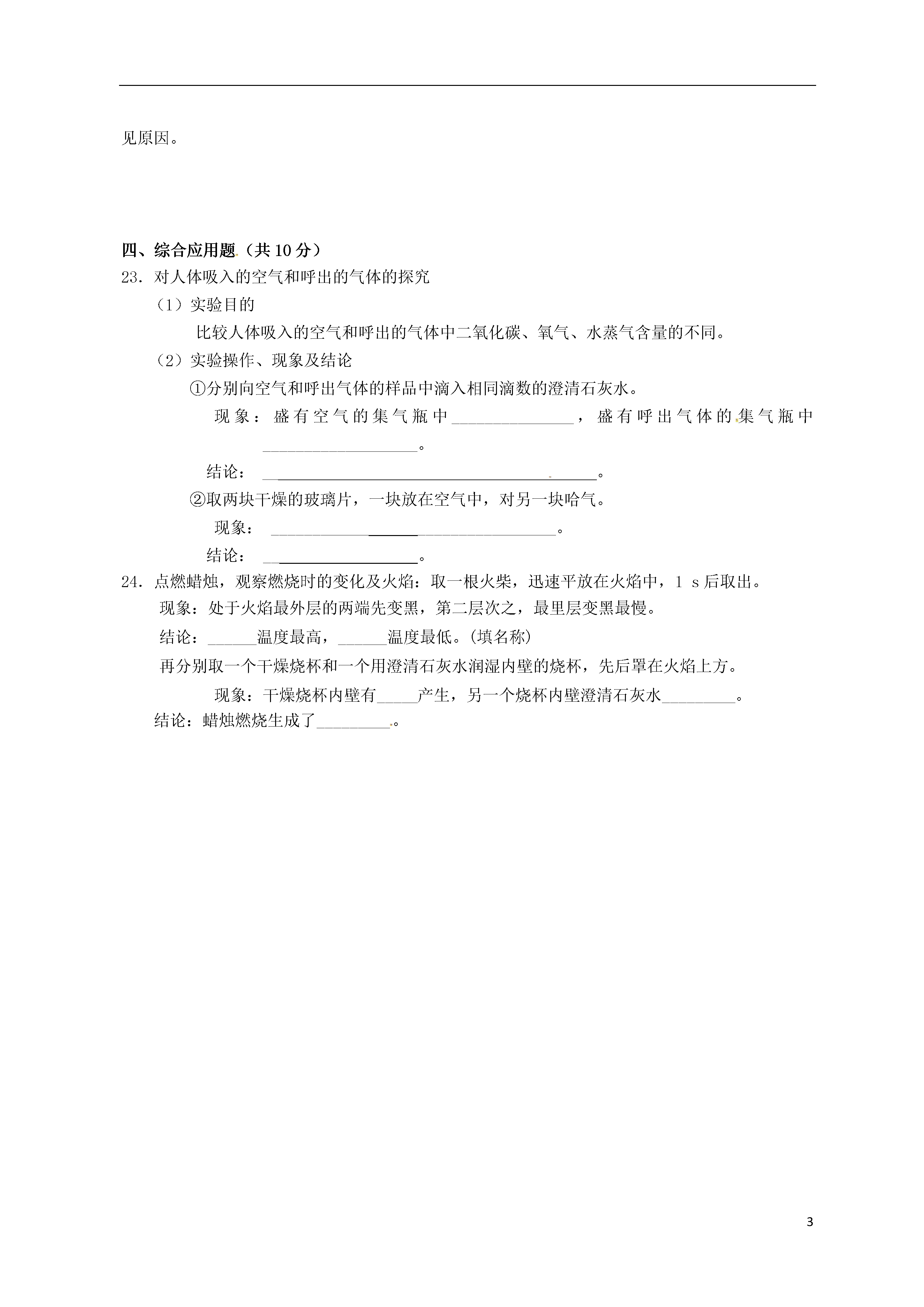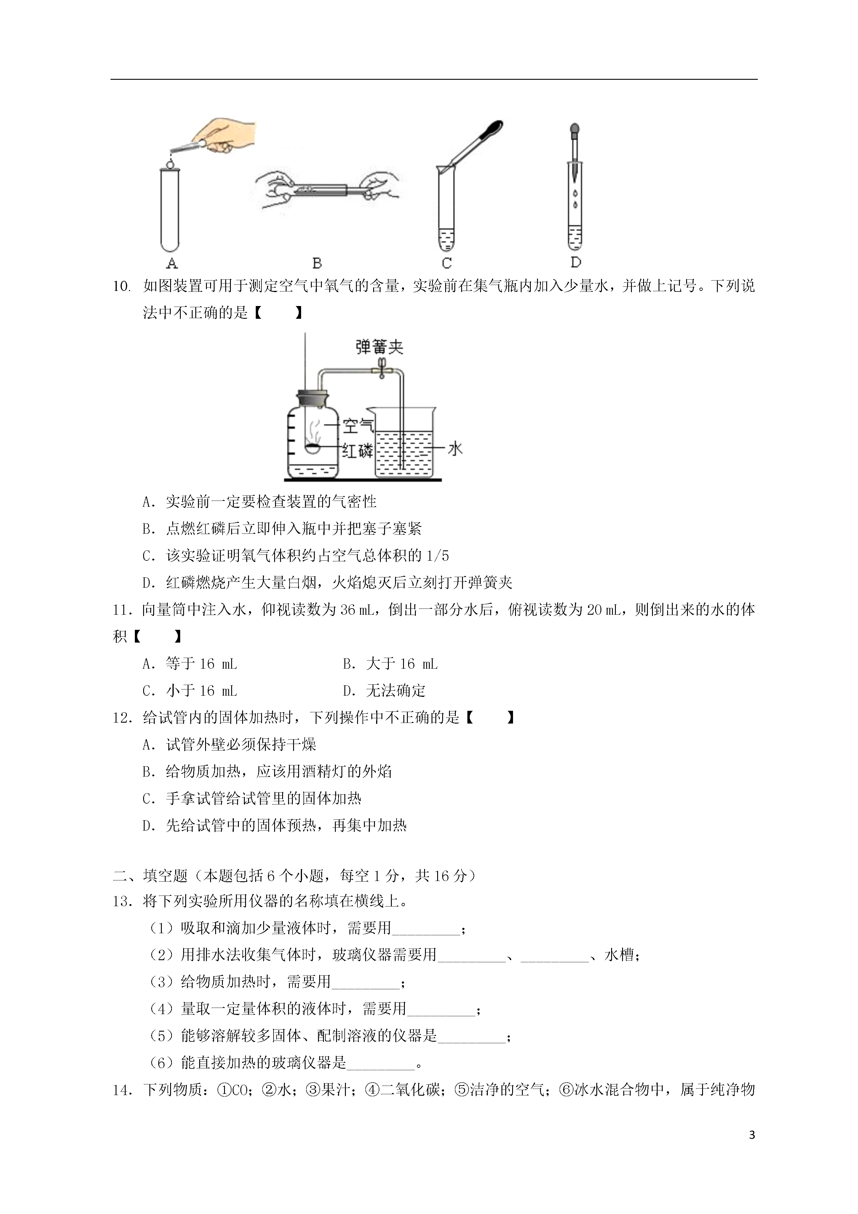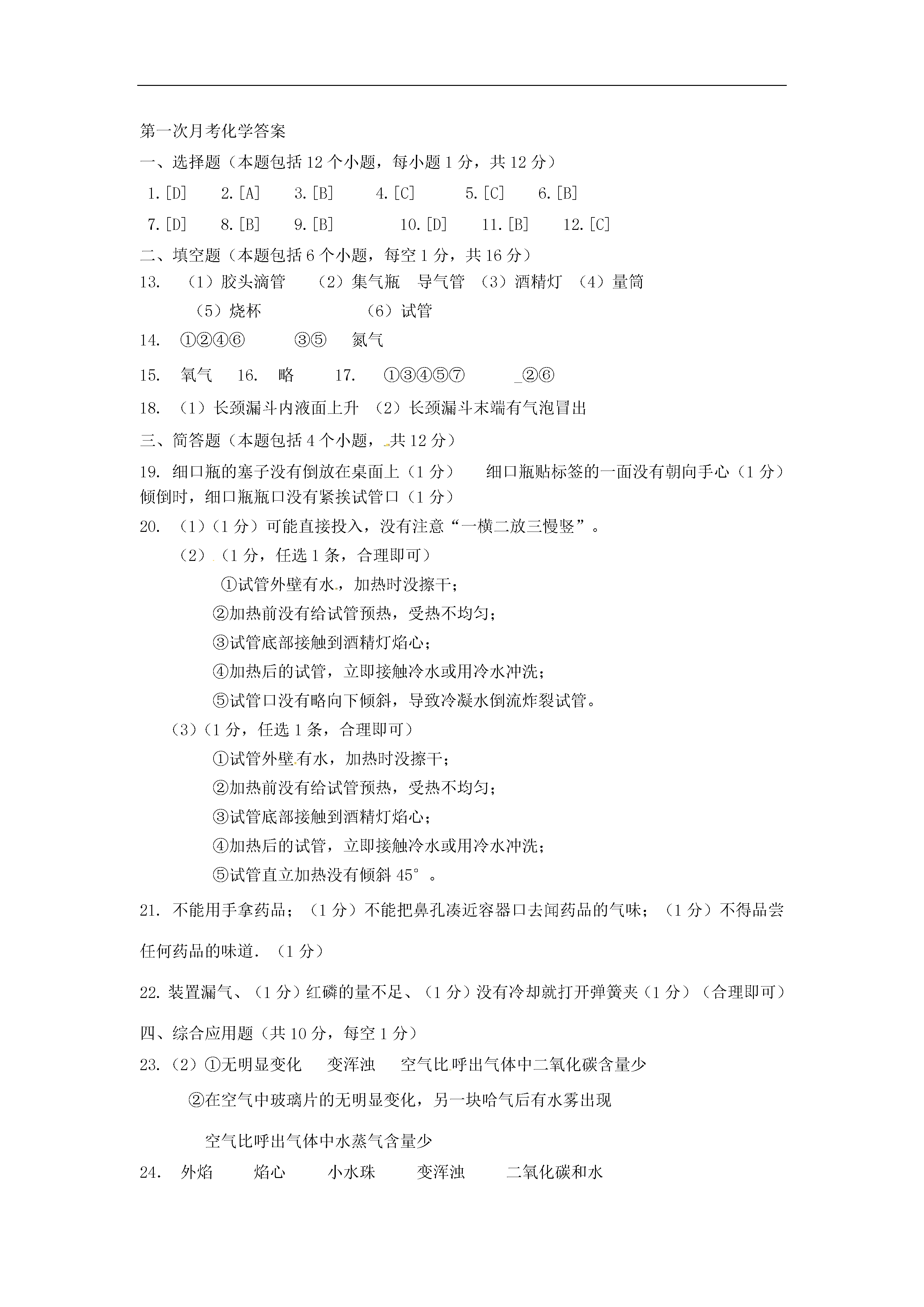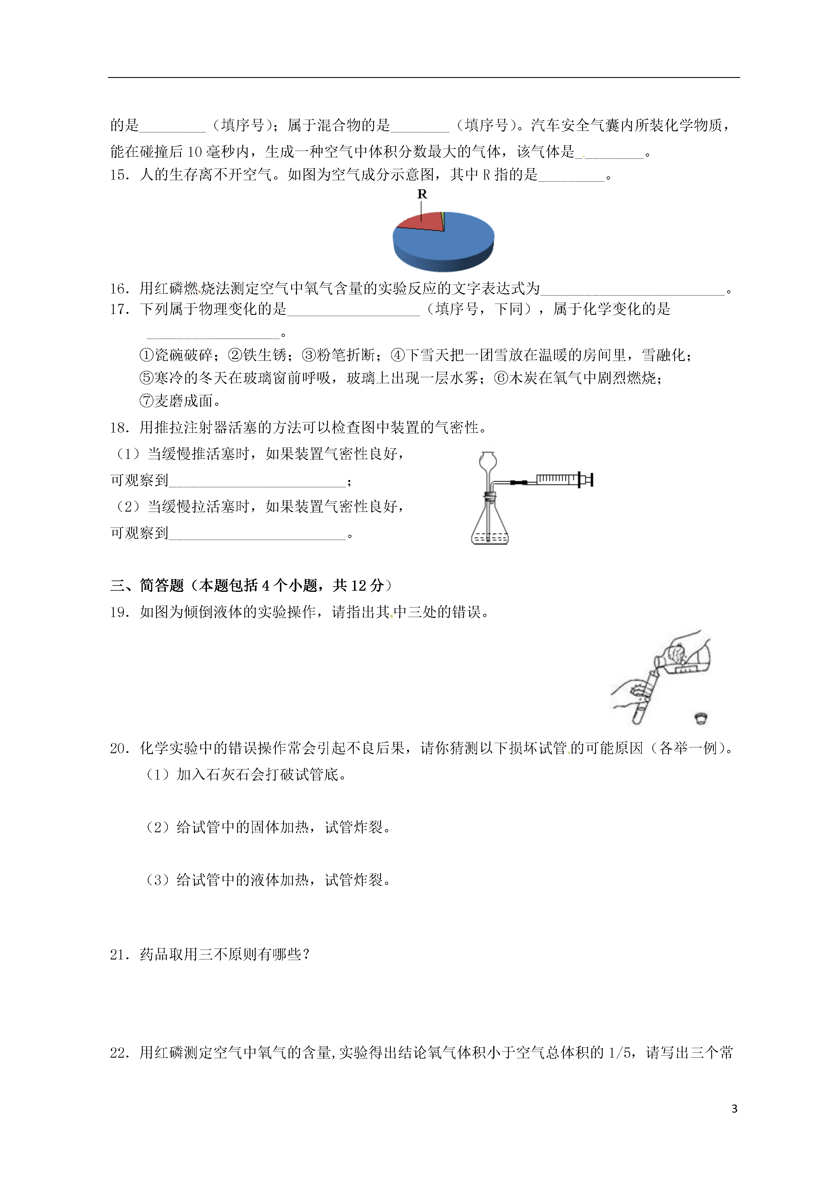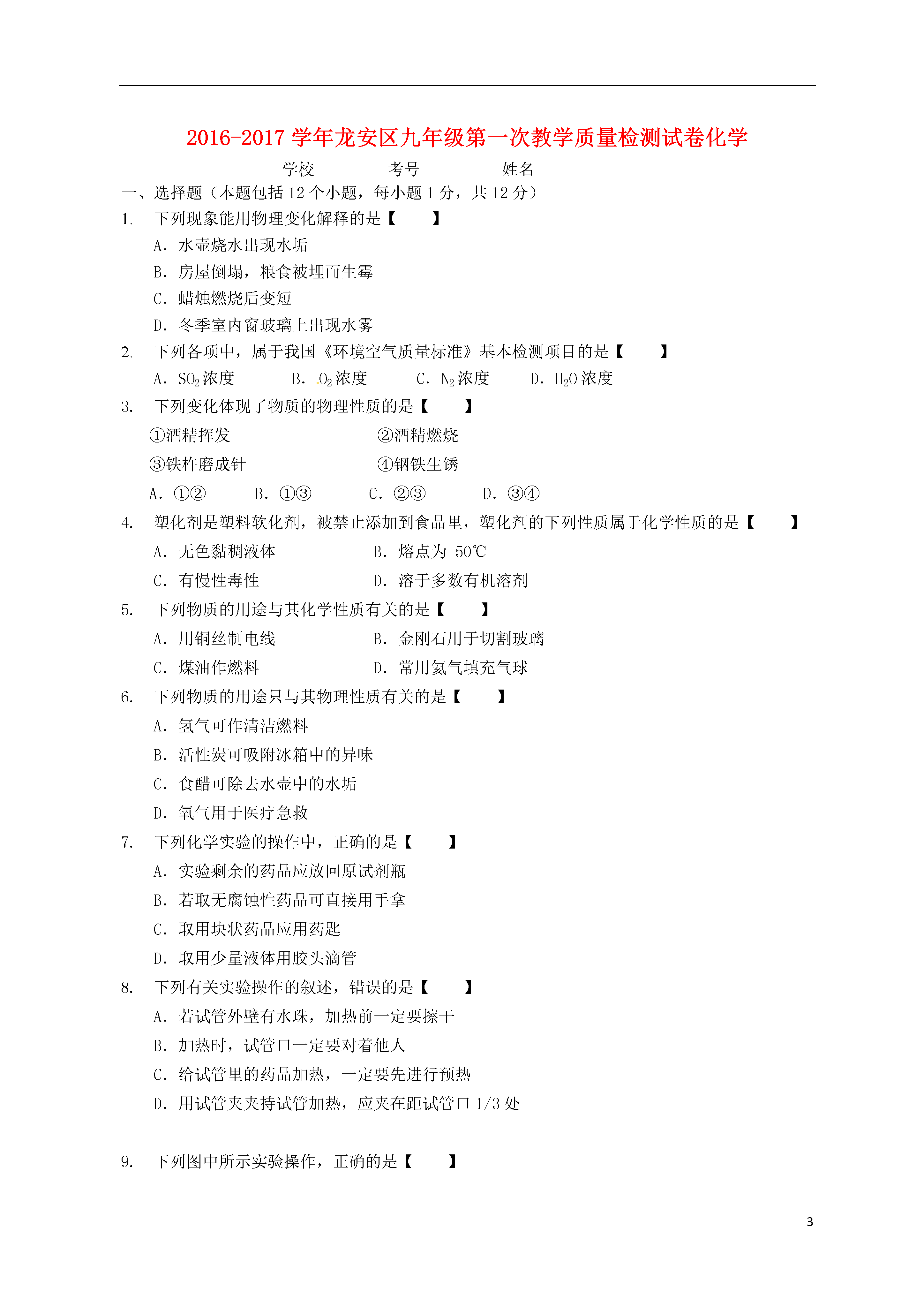 32016-2017学年龙安区九年级第一次教学质量检测试卷化学学校_________考号__________姓名__________一、选择题(本题包括12个小题,每小题1分,共12分)下列现象能用物理变化解释的是【】A.水壶烧水出现水垢B.房屋倒塌,粮食被埋而生霉C.蜡烛燃烧后变短D.冬季室内窗玻璃上出现水雾下列各项中,属于我国《环境空气质量标准》基本检测项目的是【】A.SO2浓度B.O2浓度C.N2浓度D.H2O浓度下列变化体现了物质的物理性质的是【】①酒精挥发②酒精燃烧③铁杵磨成针④钢铁生锈A.①②B.①③C.②③D.③④塑化剂是塑料软化剂,被禁止添加到食品里,塑化剂的下列性质属于化学性质的是【】A.无色黏稠液体B.熔点为-50℃C.有慢性毒性D.溶于多数有机溶剂下列物质的用途与其化学性质有关的是【】A.用铜丝制电线B.金刚石用于切割玻璃C.煤油作燃料D.常用氦气填充气球下列物质的用途只与其物理性质有关的是【】A.氢气可作清洁燃料B.活性炭可吸附冰箱中的异味C.食醋可除去水壶中的水垢D.氧气用于医疗急救下列化学实验的操作中,正确的是【】A.实验剩余的药品应放回原试剂瓶B.若取无腐蚀性药品可直接用手拿C.取用块状药品应用药匙D.取用少量液体用胶头滴管下列有关实验操作的叙述,错误的是【】A.若试管外壁有水珠,加热前一定要擦干B.加热时,试管口一定要对着他人C.给试管里的药品加热,一定要先进行预热D.用试管夹夹持试管加热,应夹在距试管口1/3处下列图中所示实验操作,正确的是【】如图装置可用于测定空气中氧气的含量,实验前在集气瓶内加入少量水,并做上记号。下列说法中不正确的是【】A.实验前一定要检查装置的气密性B.点燃红磷后立即伸入瓶中并把塞子塞紧C.该实验证明氧气体积约占空气总体积的1/5D.红磷燃烧产生大量白烟,火焰熄灭后立刻打开弹簧夹11.向量筒中注入水,仰视读数为36mL,倒出一部分水后,俯视读数为20mL,则倒出来的水的体积【】A.等于16mLB.大于16mLC.小于16mLD.无法确定12.给试管内的固体加热时,下列操作中不正确的是【】A.试管外壁必须保持干燥B.给物质加热,应该用酒精灯的外焰C.手拿试管给试管里的固体加热D.先给试管中的固体预热,再集中加热二、填空题(本题包括6个小题,每空1分,共16分)13.将下列实验所用仪器的名称填在横线上。(1)吸取和滴加少量液体时,需要用_________;(2)用排水法收集气体时,玻璃仪器需要用_________、_________、水槽;(3)给物质加热时,需要用_________;(4)量取一定量体积的液体时,需要用_________;(5)能够溶解较多固体、配制溶液的仪器是_________;(6)能直接加热的玻璃仪器是_________。14.下列物质:①CO;②水;③果汁;④二氧化碳;⑤洁净的空气;⑥冰水混合物中,属于纯净物的是_________(填序号);属于混合物的是________(填序号)。汽车安全气囊内所装化学物质,能在碰撞后10毫秒内,生成一种空气中体积分数最大的气体,该气体是_________。15.人的生存离不开空气。如图为空气成分示意图,其中R指的是_________。16.用红磷燃烧法测定空气中氧气含量的实验反应的文字表达式为_________________________。17.下列属于物理变化的是__________________(填序号,下同),属于化学变化的是__________________。①瓷碗破碎;②铁生锈;③粉笔折断;④下雪天把一团雪放在温暖的房间里,雪融化;⑤寒冷的冬天在玻璃窗前呼吸,玻璃上出现一层水雾;⑥木炭在氧气中剧烈燃烧;⑦麦磨成面。18.用推拉注射器活塞的方法可以检查图中装置的气密性。(1)当缓慢推活塞时,如果装置气密性良好,可观察到________________________;(2)当缓慢拉活塞时,如果装置气密性良好,可观察到________________________。三、简答题(本题包括4个小题,共12分)19.如图为倾倒液体的实验操作,请指出其中三处的错误。20.化学实验中的错误操作常会引起不良后果,请你猜测以下损坏试管的可能原因(各举一例)。(1)加入石灰石会打破试管底。(2)给试管中的固体加热,试管炸裂。(3)给试管中的液体加热,试管炸裂。21.药品取用三不原则有哪些?22.用红磷测定空气中氧气的含量,实验得出结论氧气体积小于空气总体积的1/5,请写出三个常见原因。四、综合应用题(