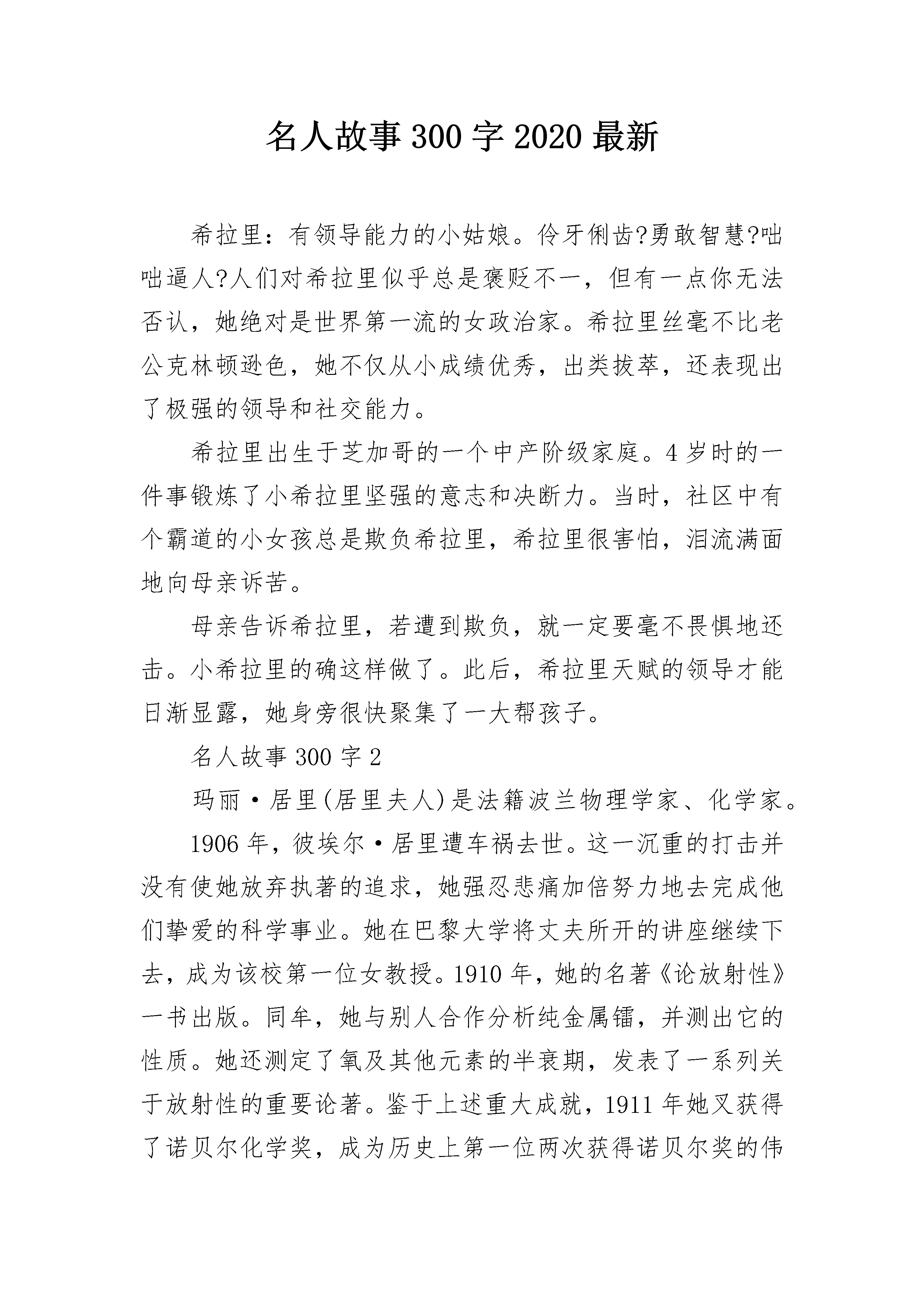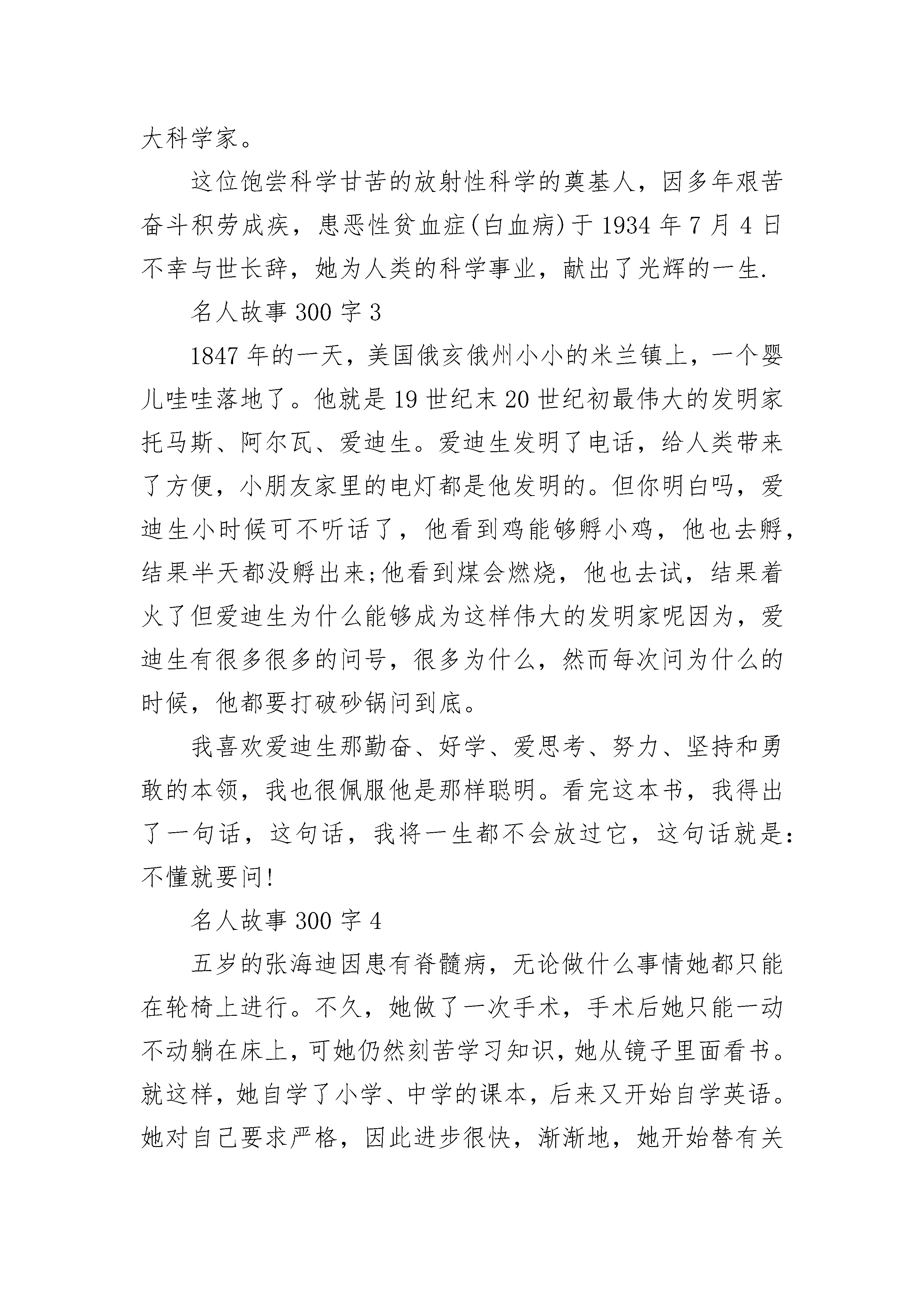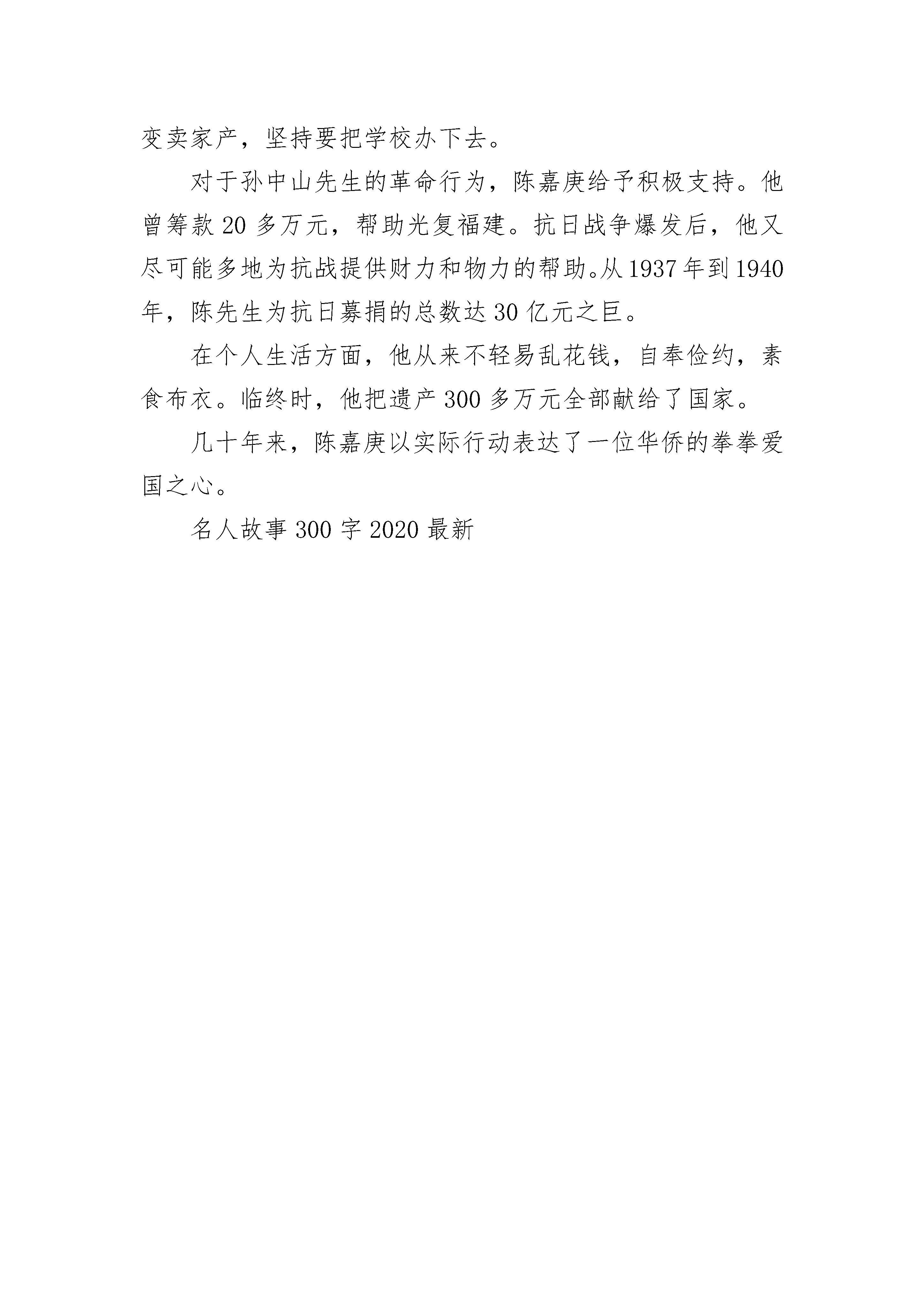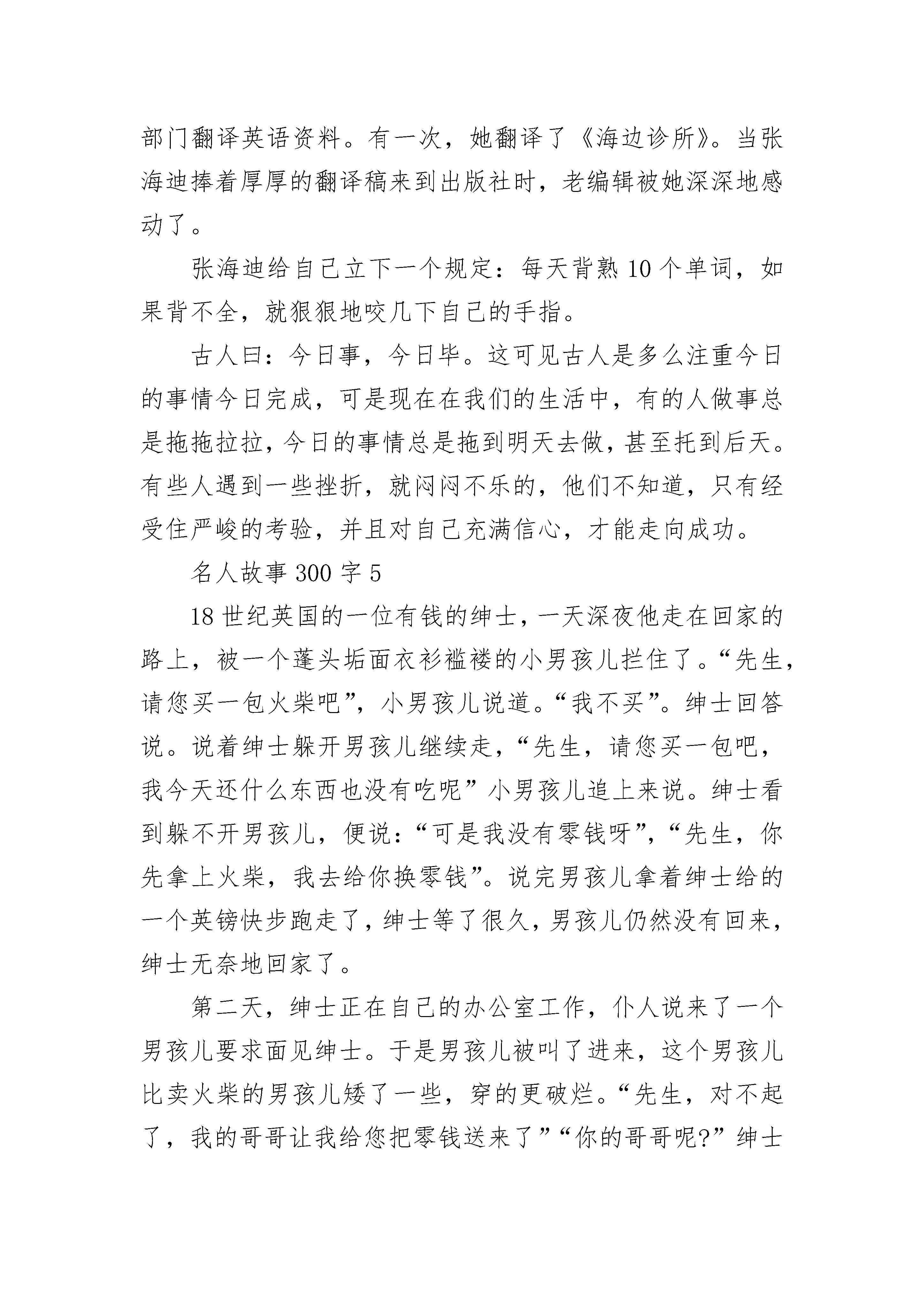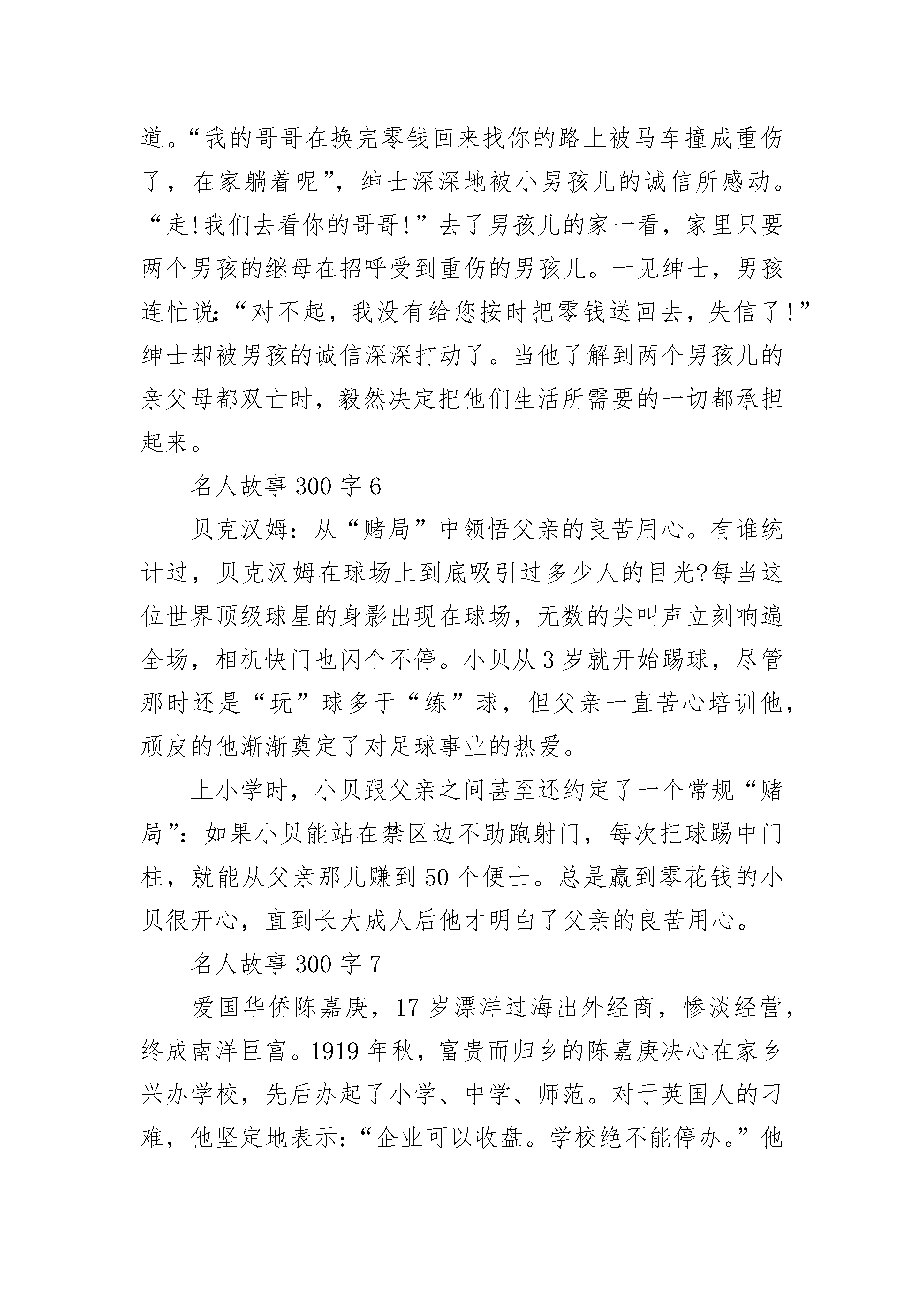 名人故事300字2020最新希拉里:有领导能力的小姑娘。伶牙俐齿?勇敢智慧?咄咄逼人?人们对希拉里似乎总是褒贬不一,但有一点你无法否认,她绝对是世界第一流的女政治家。希拉里丝毫不比老公克林顿逊色,她不仅从小成绩优秀,出类拔萃,还表现出了极强的领导和社交能力。希拉里出生于芝加哥的一个中产阶级家庭。4岁时的一件事锻炼了小希拉里坚强的意志和决断力。当时,社区中有个霸道的小女孩总是欺负希拉里,希拉里很害怕,泪流满面地向母亲诉苦。母亲告诉希拉里,若遭到欺负,就一定要毫不畏惧地还击。小希拉里的确这样做了。此后,希拉里天赋的领导才能日渐显露,她身旁很快聚集了一大帮孩子。名人故事300字2玛丽·居里(居里夫人)是法籍波兰物理学家、化学家。1906年,彼埃尔·居里遭车祸去世。这一沉重的打击并没有使她放弃执著的追求,她强忍悲痛加倍努力地去完成他们挚爱的科学事业。她在巴黎大学将丈夫所开的讲座继续下去,成为该校第一位女教授。1910年,她的名著《论放射性》一书出版。同牟,她与别人合作分析纯金属镭,并测出它的性质。她还测定了氧及其他元素的半衰期,发表了一系列关于放射性的重要论著。鉴于上述重大成就,1911年她叉获得了诺贝尔化学奖,成为历史上第一位两次获得诺贝尔奖的伟大科学家。这位饱尝科学甘苦的放射性科学的奠基人,因多年艰苦奋斗积劳成疾,患恶性贫血症(白血病)于1934年7月4日不幸与世长辞,她为人类的科学事业,献出了光辉的一生.名人故事300字31847年的一天,美国俄亥俄州小小的米兰镇上,一个婴儿哇哇落地了。他就是19世纪末20世纪初最伟大的发明家托马斯、阿尔瓦、爱迪生。爱迪生发明了电话,给人类带来了方便,小朋友家里的电灯都是他发明的。但你明白吗,爱迪生小时候可不听话了,他看到鸡能够孵小鸡,他也去孵,结果半天都没孵出来;他看到煤会燃烧,他也去试,结果着火了但爱迪生为什么能够成为这样伟大的发明家呢因为,爱迪生有很多很多的问号,很多为什么,然而每次问为什么的时候,他都要打破砂锅问到底。我喜欢爱迪生那勤奋、好学、爱思考、努力、坚持和勇敢的本领,我也很佩服他是那样聪明。看完这本书,我得出了一句话,这句话,我将一生都不会放过它,这句话就是:不懂就要问!名人故事300字4五岁的张海迪因患有脊髓病,无论做什么事情她都只能在轮椅上进行。不久,她做了一次手术,手术后她只能一动不动躺在床上,可她仍然刻苦学习知识,她从镜子里面看书。就这样,她自学了小学、中学的课本,后来又开始自学英语。她对自己要求严格,因此进步很快,渐渐地,她开始替有关部门翻译英语资料。有一次,她翻译了《海边诊所》。当张海迪捧着厚厚的翻译稿来到出版社时,老编辑被她深深地感动了。张海迪给自己立下一个规定:每天背熟10个单词,如果背不全,就狠狠地咬几下自己的手指。古人曰:今日事,今日毕。这可见古人是多么注重今日的事情今日完成,可是现在在我们的生活中,有的人做事总是拖拖拉拉,今日的事情总是拖到明天去做,甚至托到后天。有些人遇到一些挫折,就闷闷不乐的,他们不知道,只有经受住严峻的考验,并且对自己充满信心,才能走向成功。名人故事300字518世纪英国的一位有钱的绅士,一天深夜他走在回家的路上,被一个蓬头垢面衣衫褴褛的小男孩儿拦住了。“先生,请您买一包火柴吧”,小男孩儿说道。“我不买”。绅士回答说。说着绅士躲开男孩儿继续走,“先生,请您买一包吧,我今天还什么东西也没有吃呢”小男孩儿追上来说。绅士看到躲不开男孩儿,便说:“可是我没有零钱呀”,“先生,你先拿上火柴,我去给你换零钱”。说完男孩儿拿着绅士给的一个英镑快步跑走了,绅士等了很久,男孩儿仍然没有回来,绅士无奈地回家了。第二天,绅士正在自己的办公室工作,仆人说来了一个男孩儿要求面见绅士。于是男孩儿被叫了进来,这个男孩儿比卖火柴的男孩儿矮了一些,穿的更破烂。“先生,对不起了,我的哥哥让我给您把零钱送来了”“你的哥哥呢?”绅士道。“我的哥哥在换完零钱回来找你的路上被马车撞成重伤了,在家躺着呢”,绅士深深地被小男孩儿的诚信所感动。“走!我们去看你的哥哥!”去了男孩儿的家一看,家里只要两个男孩的继母在招呼受到重伤的男孩儿。一见绅士,男孩连忙说:“对不起,我没有给您按时把零钱送回去,失信了!”绅士却被男孩的诚信深深打动了。当他了解到两个男孩儿的亲父母都双亡时,毅然决定把他们生活所需要的一切都承担起来。名人故事300字6贝克汉姆:从“赌局”中领悟父亲的良苦用心。有谁统计过,贝克汉姆在球场上到底吸引过多少人的目光?每当这位世界顶级球星的身影出现在球场,无数的尖叫声立刻响遍全场,相机快门也闪个不停。小贝从3岁就开始踢球,尽管那时还是“玩”球多于“练”球,但父亲一直苦心培训他,顽皮的他渐渐奠定了对足球事业的热爱。上小学时,小贝跟父亲之间甚至还约定了一个常规“赌局”:如果小贝能站在