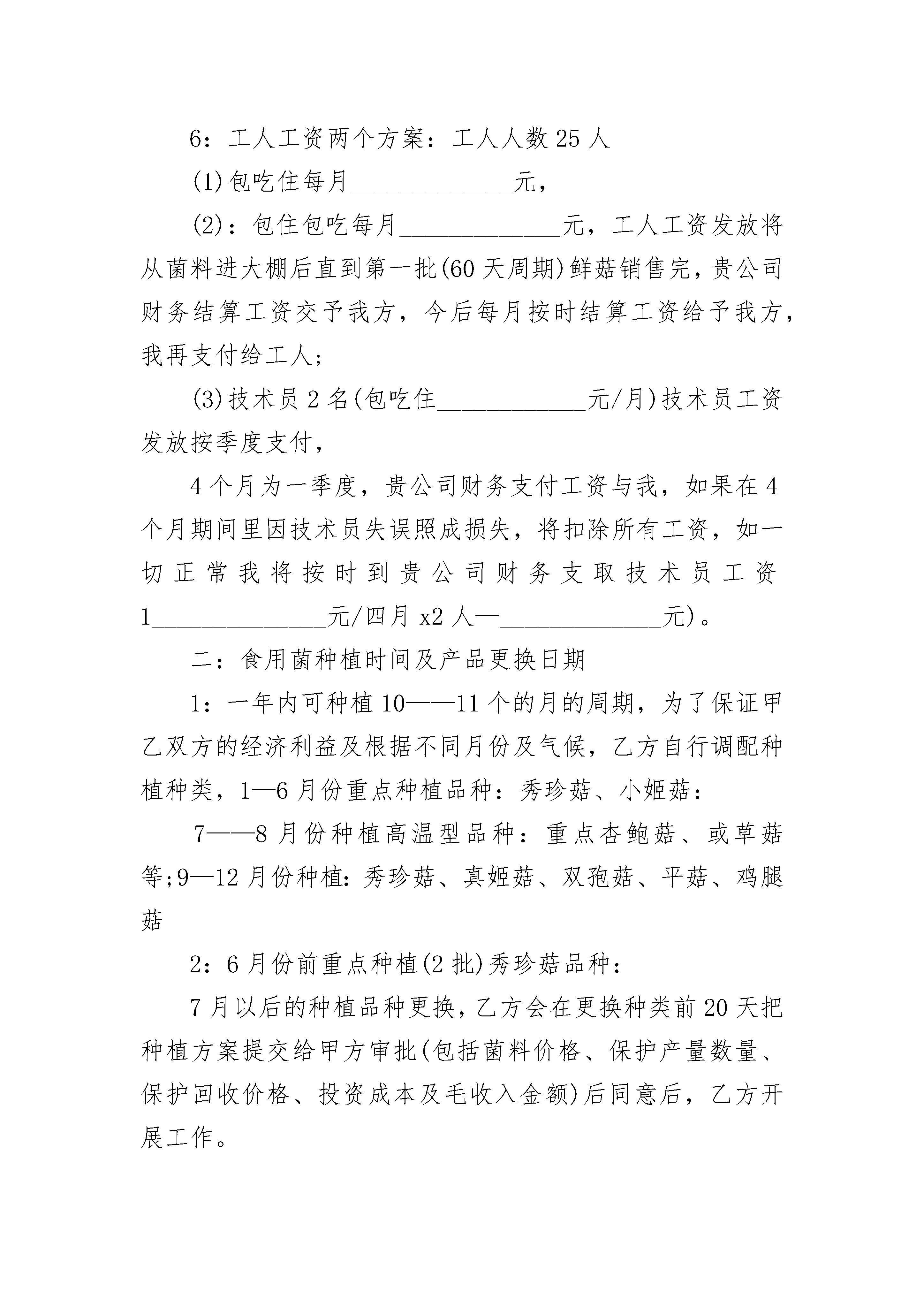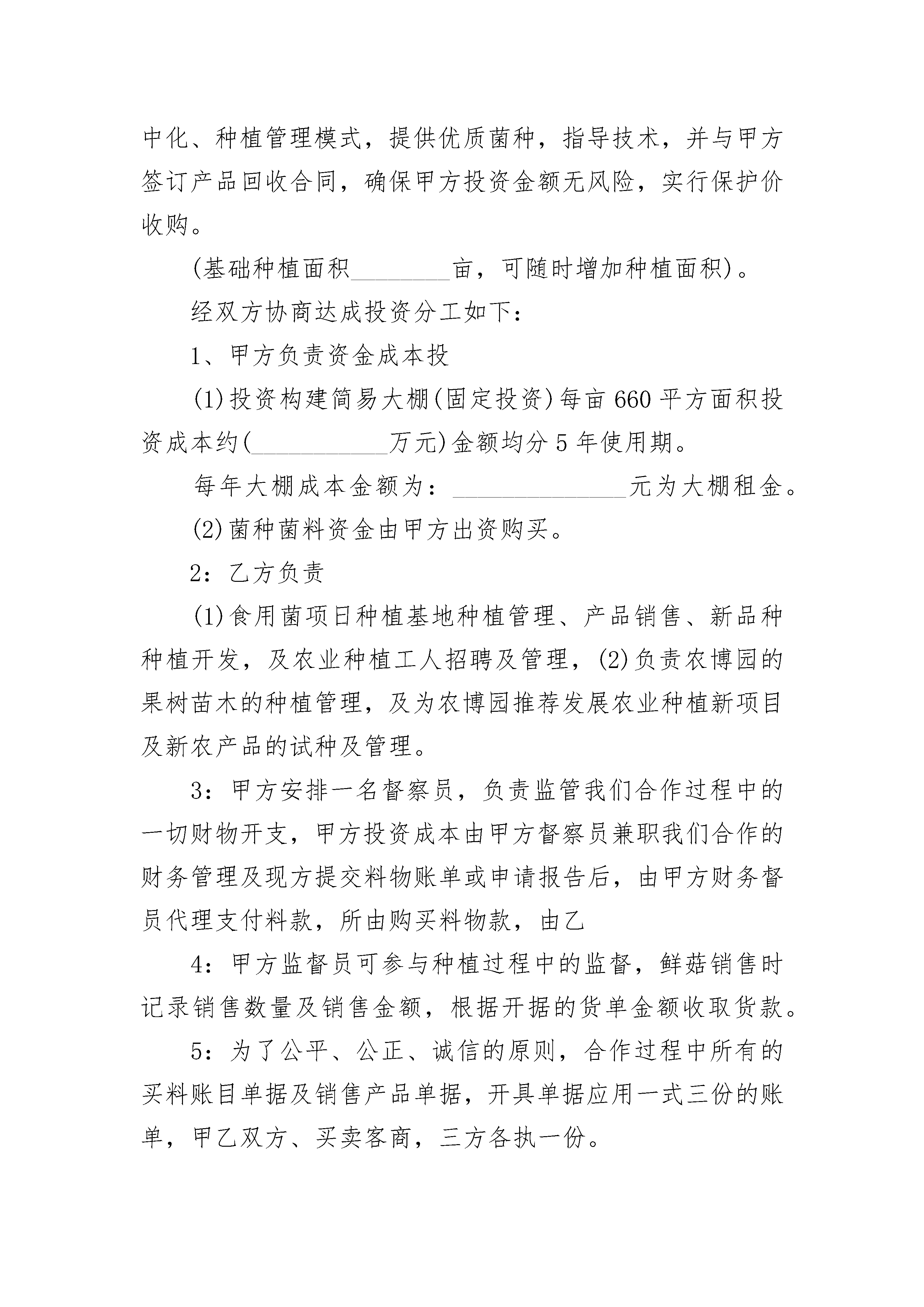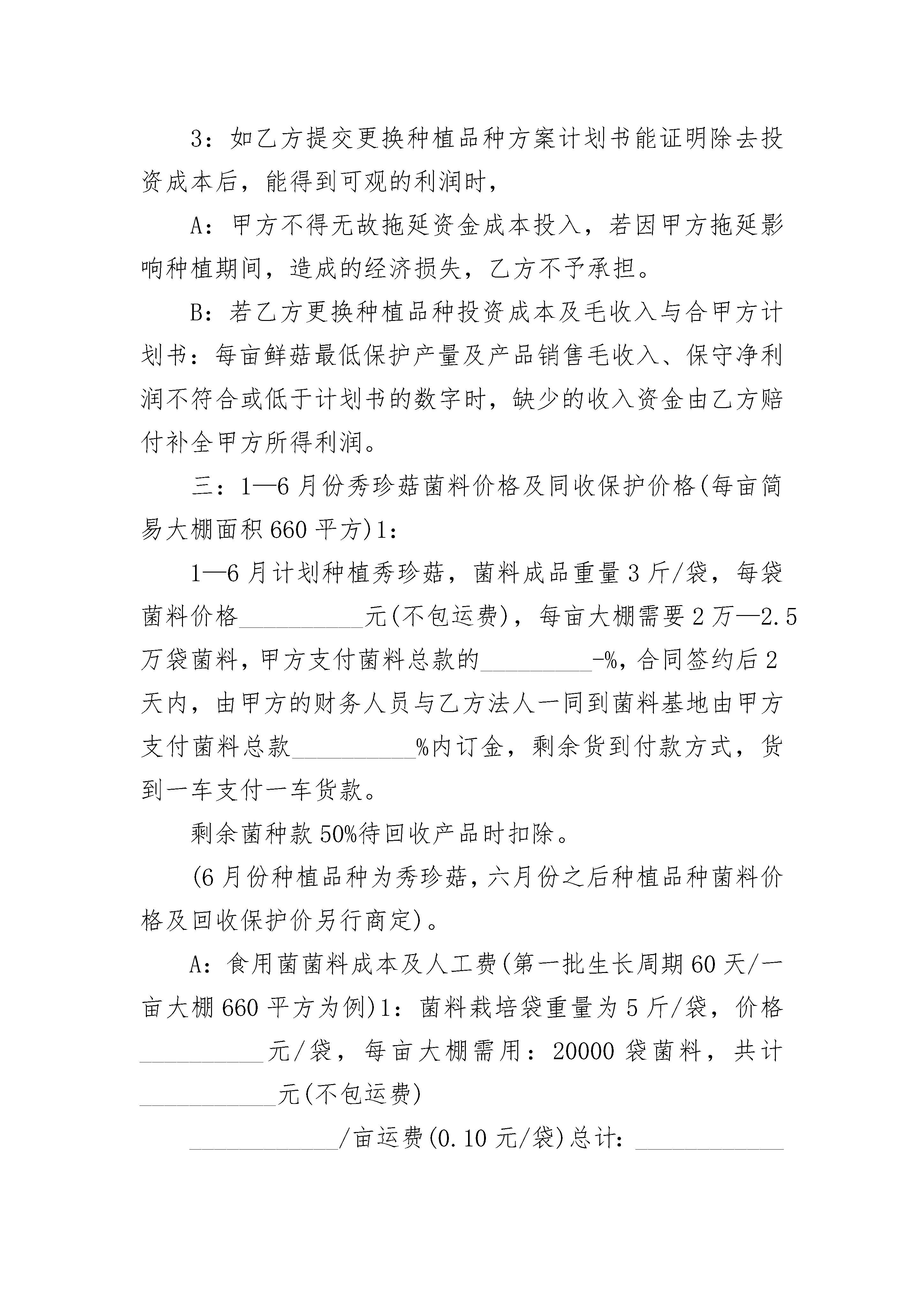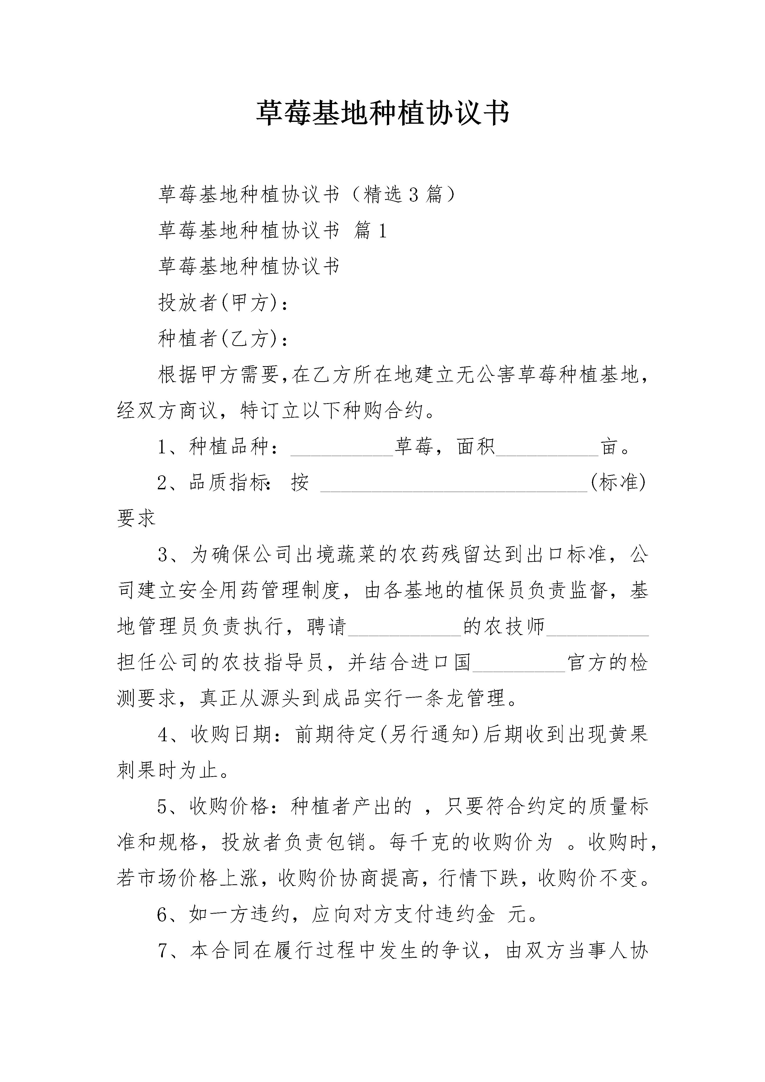 草莓基地种植协议书草莓基地种植协议书(精选3篇)草莓基地种植协议书篇1草莓基地种植协议书投放者(甲方):种植者(乙方):根据甲方需要,在乙方所在地建立无公害草莓种植基地,经双方商议,特订立以下种购合约。1、种植品种:__________草莓,面积__________亩。2、品质指标:按__________________________(标准)要求3、为确保公司出境蔬菜的农药残留达到出口标准,公司建立安全用药管理制度,由各基地的植保员负责监督,基地管理员负责执行,聘请___________的农技师__________担任公司的农技指导员,并结合进口国_________官方的检测要求,真正从源头到成品实行一条龙管理。4、收购日期:前期待定(另行通知)后期收到出现黄果刺果时为止。5、收购价格:种植者产出的,只要符合约定的质量标准和规格,投放者负责包销。每千克的收购价为。收购时,若市场价格上涨,收购价协商提高,行情下跌,收购价不变。6、如一方违约,应向对方支付违约金元。7、本合同在履行过程中发生的争议,由双方当事人协商解决;也可由当地工商行政管理部门调解;协商或调解不成的按下列种方式解决:(一)提交仲裁委员会仲裁;(二)依法向人民法院起诉。8、本合同自生效,于失效。附:(1)为稳定收购计划,防止大起大落,以每亩_____吨为基数,上下可浮动_________%(由于气候等自然因素导致的除外)。(2)由于公司是承包基地种植产品,公司已全部付清土地承包款,并聘请相应的草莓农技师,故乙方需支付一定的定金(协商)。(3)本协议双方盖章签名后生效。投放者:种植者:法定代表人:签约地点:签约日期:年月日草莓基地种植协议书篇2甲方:_________________国际农博园乙方:______________________果蔬种植专业合作社本合同经甲乙双方共同协商达成以下协议:(以下用甲乙简称)一:乙方在甲方农博园共同发展种植食用菌姬菇种植基地项目,为更好的经济收入,乙方采用工厂化、规模化、集中化、种植管理模式,提供优质菌种,指导技术,并与甲方签订产品回收合同,确保甲方投资金额无风险,实行保护价收购。(基础种植面积________亩,可随时增加种植面积)。经双方协商达成投资分工如下:1、甲方负责资金成本投(1)投资构建简易大棚(固定投资)每亩660平方面积投资成本约(___________万元)金额均分5年使用期。每年大棚成本金额为:______________元为大棚租金。(2)菌种菌料资金由甲方出资购买。2:乙方负责(1)食用菌项日种植基地种植管理、产品销售、新品种种植开发,及农业种植工人招聘及管理,(2)负责农博园的果树苗木的种植管理,及为农博园推荐发展农业种植新项目及新农产品的试种及管理。3:甲方安排一名督察员,负责监管我们合作过程中的一切财物开支,甲方投资成本由甲方督察员兼职我们合作的财务管理及现方提交料物账单或申请报告后,由甲方财务督员代理支付料款,所由购买料物款,由乙4:甲方监督员可参与种植过程中的监督,鲜菇销售时记录销售数量及销售金额,根据开据的货单金额收取货款。5:为了公平、公正、诚信的原则,合作过程中所有的买料账目单据及销售产品单据,开具单据应用一式三份的账单,甲乙双方、买卖客商,三方各执一份。6:工人工资两个方案:工人人数25人(1)包吃住每月_____________元,(2):包住包吃每月_____________元,工人工资发放将从菌料进大棚后直到第一批(60天周期)鲜菇销售完,贵公司财务结算工资交予我方,今后每月按时结算工资给予我方,我再支付给工人;(3)技术员2名(包吃住____________元/月)技术员工资发放按季度支付,4个月为一季度,贵公司财务支付工资与我,如果在4个月期间里因技术员失误照成损失,将扣除所有工资,如一切正常我将按时到贵公司财务支取技术员工资1______________元/四月x2人—_____________元)。二:食用菌种植时间及产品更换日期1:一年内可种植10——11个的月的周期,为了保证甲乙双方的经济利益及根据不同月份及气候,乙方自行调配种植种类,1—6月份重点种植品种:秀珍菇、小姬菇:7——8月份种植高温型品种:重点杏鲍菇、或草菇等;9—12月份种植:秀珍菇、真姬菇、双孢菇、平菇、鸡腿菇2:6月份前重点种植(2批)秀珍菇品种:7月以后的种植品种更换,乙方会在更换种类前20天把种植方案提交给甲方审批(包括菌料价格、保护产量数量、保护回收价格、投资成本及毛收入金额)后同意后,乙方开展工作。3:如乙方提交更换种植品种方案计划书能证明除去投资成本后,能得到可观的利润时,A:甲方不得无故拖延资金成本投入,若因甲方拖延影响种植期间,造成的经济损失,乙方不予承担。B:若乙方更换种植品种