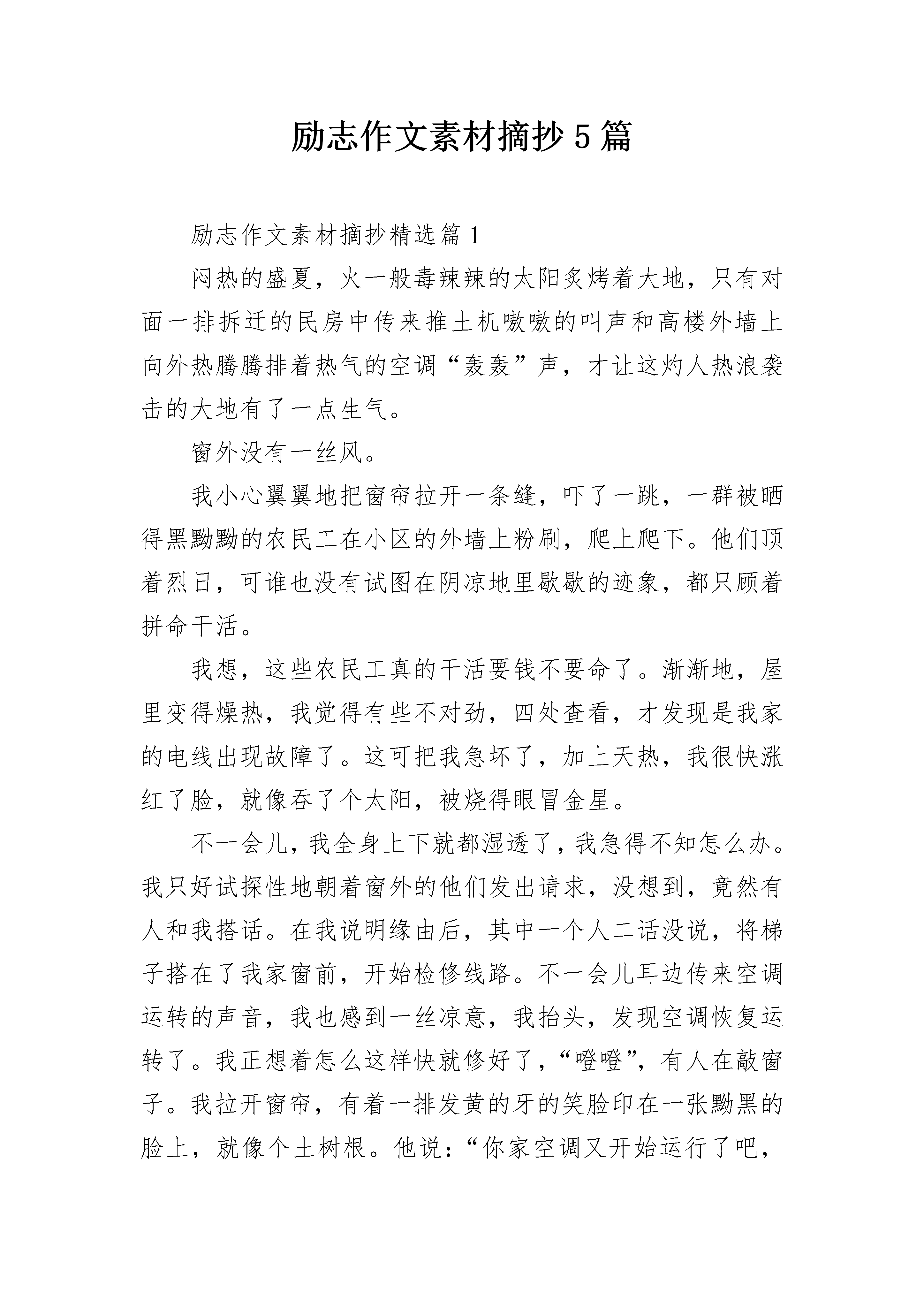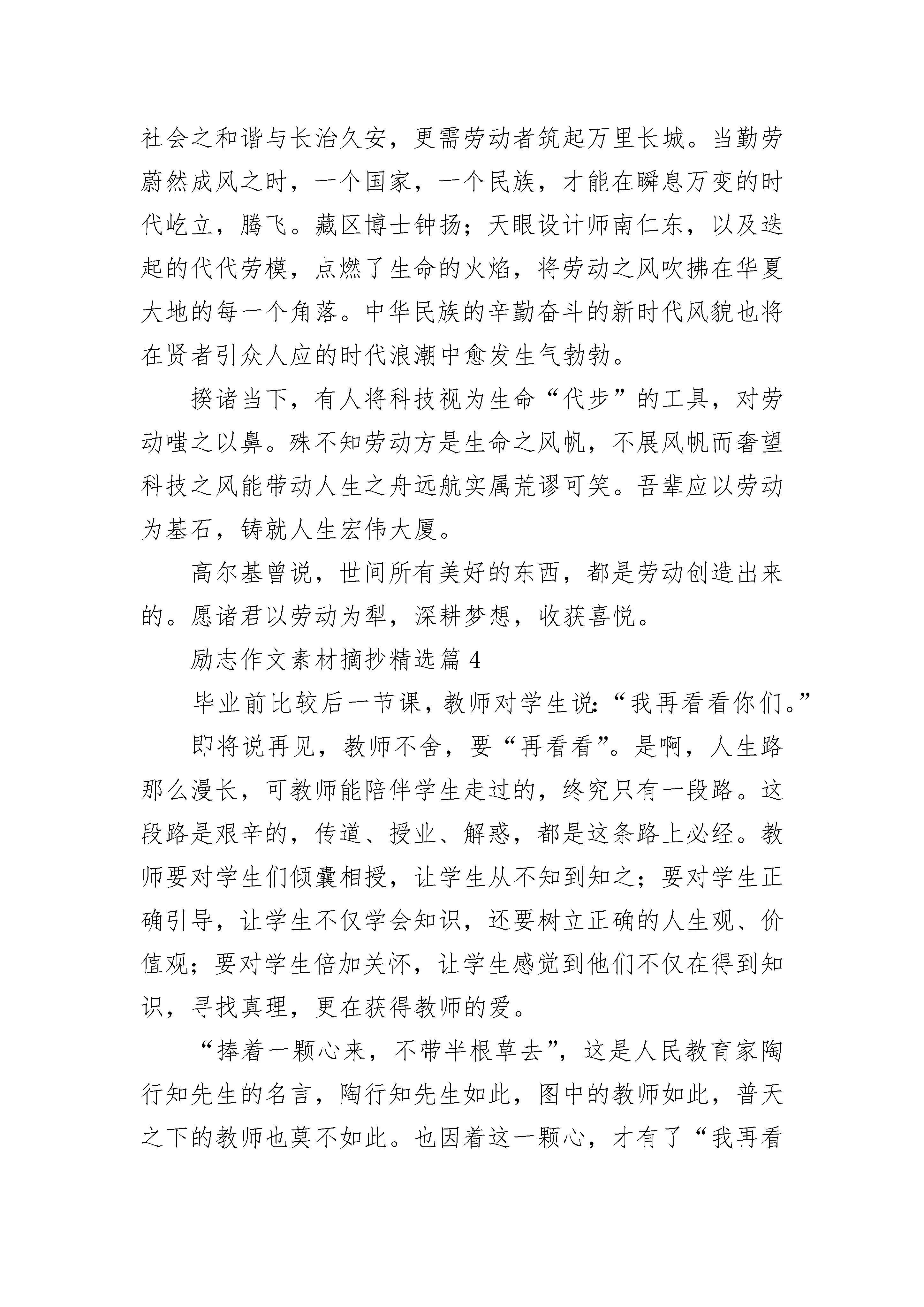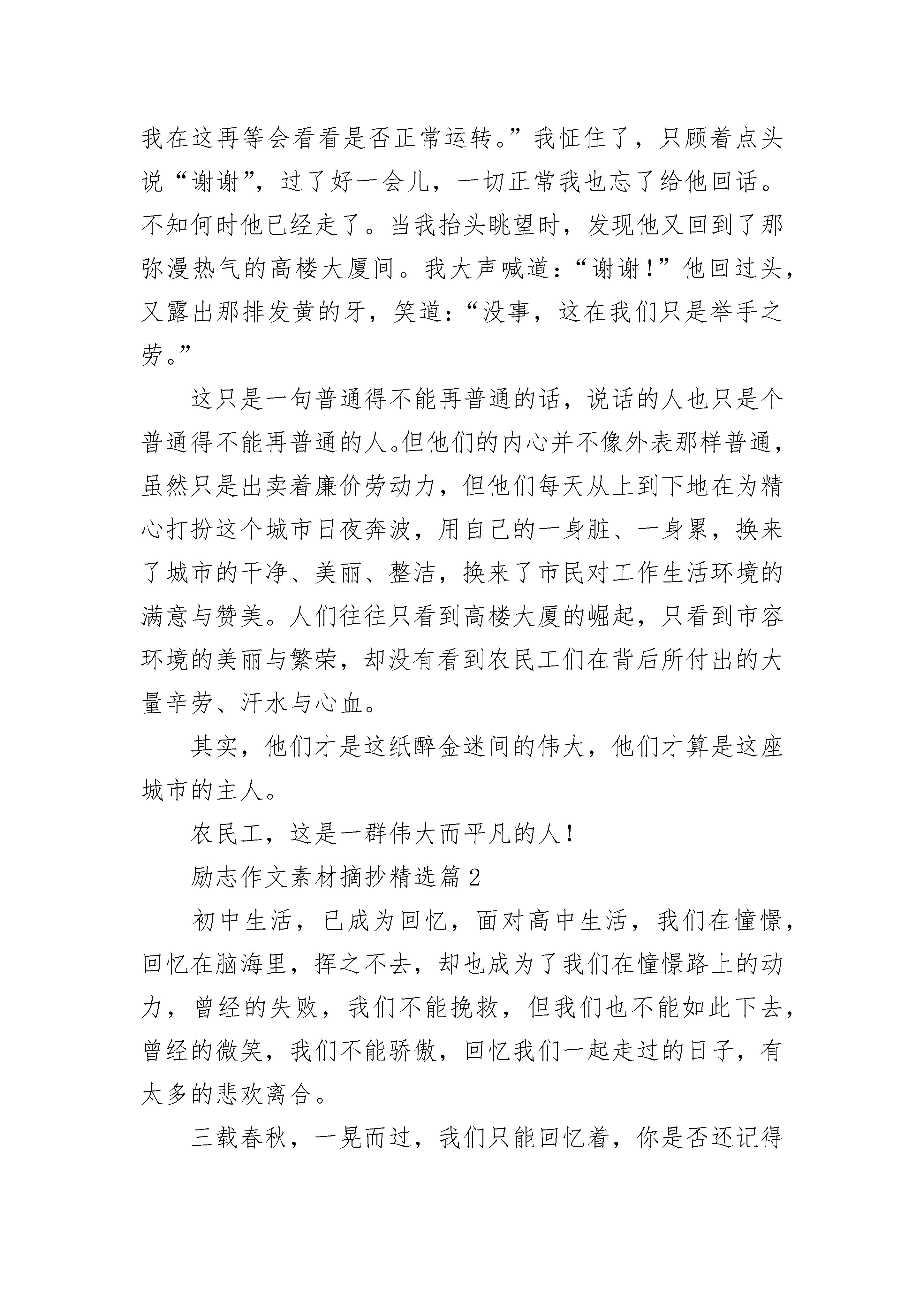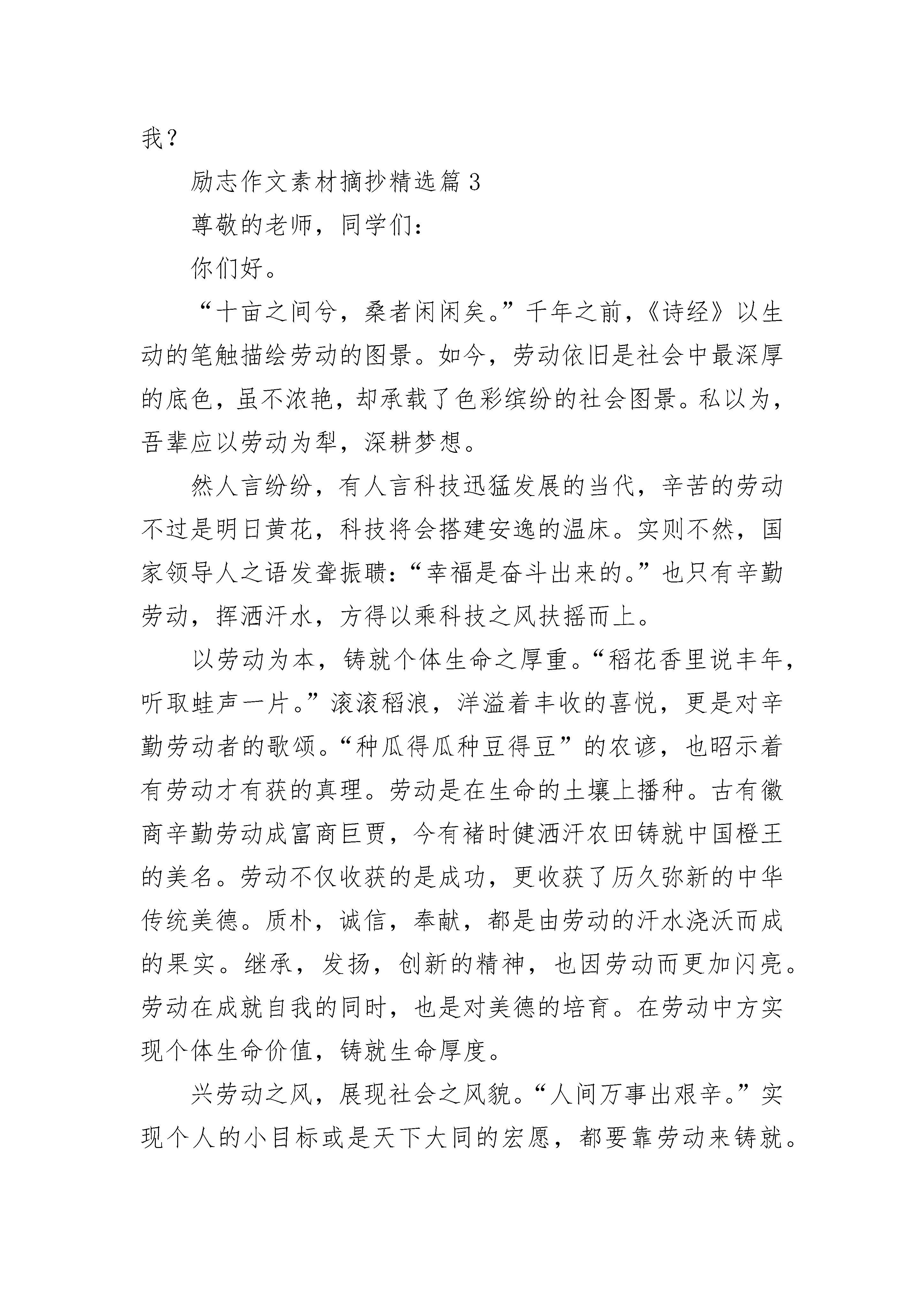 励志作文素材摘抄5篇励志作文素材摘抄精选篇1闷热的盛夏,火一般毒辣辣的太阳炙烤着大地,只有对面一排拆迁的民房中传来推土机嗷嗷的叫声和高楼外墙上向外热腾腾排着热气的空调“轰轰”声,才让这灼人热浪袭击的大地有了一点生气。窗外没有一丝风。我小心翼翼地把窗帘拉开一条缝,吓了一跳,一群被晒得黑黝黝的农民工在小区的外墙上粉刷,爬上爬下。他们顶着烈日,可谁也没有试图在阴凉地里歇歇的迹象,都只顾着拼命干活。我想,这些农民工真的干活要钱不要命了。渐渐地,屋里变得燥热,我觉得有些不对劲,四处查看,才发现是我家的电线出现故障了。这可把我急坏了,加上天热,我很快涨红了脸,就像吞了个太阳,被烧得眼冒金星。不一会儿,我全身上下就都湿透了,我急得不知怎么办。我只好试探性地朝着窗外的他们发出请求,没想到,竟然有人和我搭话。在我说明缘由后,其中一个人二话没说,将梯子搭在了我家窗前,开始检修线路。不一会儿耳边传来空调运转的声音,我也感到一丝凉意,我抬头,发现空调恢复运转了。我正想着怎么这样快就修好了,“噔噔”,有人在敲窗子。我拉开窗帘,有着一排发黄的牙的笑脸印在一张黝黑的脸上,就像个土树根。他说:“你家空调又开始运行了吧,我在这再等会看看是否正常运转。”我怔住了,只顾着点头说“谢谢”,过了好一会儿,一切正常我也忘了给他回话。不知何时他已经走了。当我抬头眺望时,发现他又回到了那弥漫热气的高楼大厦间。我大声喊道:“谢谢!”他回过头,又露出那排发黄的牙,笑道:“没事,这在我们只是举手之劳。”这只是一句普通得不能再普通的话,说话的人也只是个普通得不能再普通的人。但他们的内心并不像外表那样普通,虽然只是出卖着廉价劳动力,但他们每天从上到下地在为精心打扮这个城市日夜奔波,用自己的一身脏、一身累,换来了城市的干净、美丽、整洁,换来了市民对工作生活环境的满意与赞美。人们往往只看到高楼大厦的崛起,只看到市容环境的美丽与繁荣,却没有看到农民工们在背后所付出的大量辛劳、汗水与心血。其实,他们才是这纸醉金迷间的伟大,他们才算是这座城市的主人。农民工,这是一群伟大而平凡的人!励志作文素材摘抄精选篇2初中生活,已成为回忆,面对高中生活,我们在憧憬,回忆在脑海里,挥之不去,却也成为了我们在憧憬路上的动力,曾经的失败,我们不能挽救,但我们也不能如此下去,曾经的微笑,我们不能骄傲,回忆我们一起走过的日子,有太多的悲欢离合。三载春秋,一晃而过,我们只能回忆着,你是否还记得刚上初一时的我们,我们在别人背后的小动作,我们会搭帮结派,针对某某同学。有一年,我们过去了,这时的我们,长大了一岁,是的,我们团结了,我们的课程增加了,科任老师也成为了我们针对的对象,我们会对班主任接电话的动作进行模仿,我们会对老师批评我们而憎恨,我们会团结起来整蛊老师。到了初三,我们懂得了学习的重要性,我们会比以前更加团结,对老师的依依不舍,就这样,我们一起走过了从懵懂到成熟的日子。那是初一的我们,一个下午,因为第二天是五四青年节,我们要准备节目,我们需要大扫除,我们去逃跑,对班长说坏话,会不理班长,那时的我们多么可笑,多么幼稚。还记得初二的我们,那是愚人节,我们全班一起骗英语老师,让他在操场上等了近二十分钟,回到班上,我们一起喊“愚人节快乐”老师笑了,那时的我们迈向了成长。初三了,经历了两年的风风雨雨,我们彼此更加了解,那年的我们紧张的学习,老师一直鼓励着我们,“你想成龙还是成蛇”这是老师一直不变的话,三年了,是时候分开了,那时的我们想着的不是那短暂的分离,而是日后用怎样的方式见面,从毕业照咔嚓的那一瞬间,班歌到尾声的那一霎那,离开校园的一个脚印,最后一滴泪水,我们成熟了,三年,我们一起走过那悲欢离合的日子。如今的我们,各奔东西,神话里的生活我们在向往着,那些回忆我们各自收藏,成为了抹不去的记忆,只是那些话语,你是否还记得?是否还记得一起走过的日子里有你有我?励志作文素材摘抄精选篇3尊敬的老师,同学们:你们好。“十亩之间兮,桑者闲闲矣。”千年之前,《诗经》以生动的笔触描绘劳动的图景。如今,劳动依旧是社会中最深厚的底色,虽不浓艳,却承载了色彩缤纷的社会图景。私以为,吾辈应以劳动为犁,深耕梦想。然人言纷纷,有人言科技迅猛发展的当代,辛苦的劳动不过是明日黄花,科技将会搭建安逸的温床。实则不然,国家领导人之语发聋振聩:“幸福是奋斗出来的。”也只有辛勤劳动,挥洒汗水,方得以乘科技之风扶摇而上。以劳动为本,铸就个体生命之厚重。“稻花香里说丰年,听取蛙声一片。”滚滚稻浪,洋溢着丰收的喜悦,更是对辛勤劳动者的歌颂。“种瓜得瓜种豆得豆”的农谚,也昭示着有劳动才有获的真理。劳动是在生命的土壤上播种。古有徽商辛勤劳动成富商巨贾,今有褚时健洒汗农田铸就中国橙王的美名。劳动不仅收获的是成功,更收获了历久弥新的中华传统美德。质朴,诚信,奉献,都是由劳
