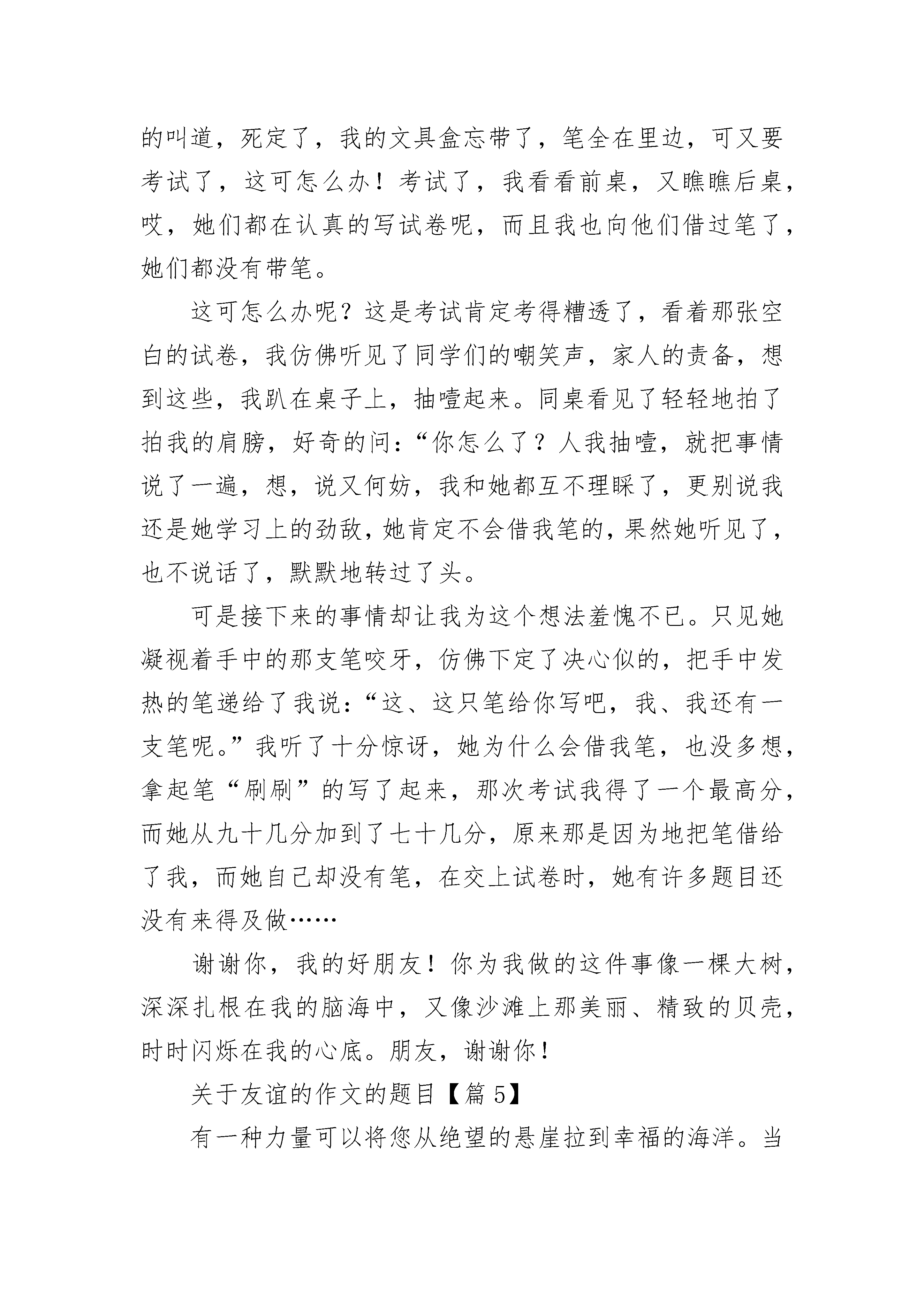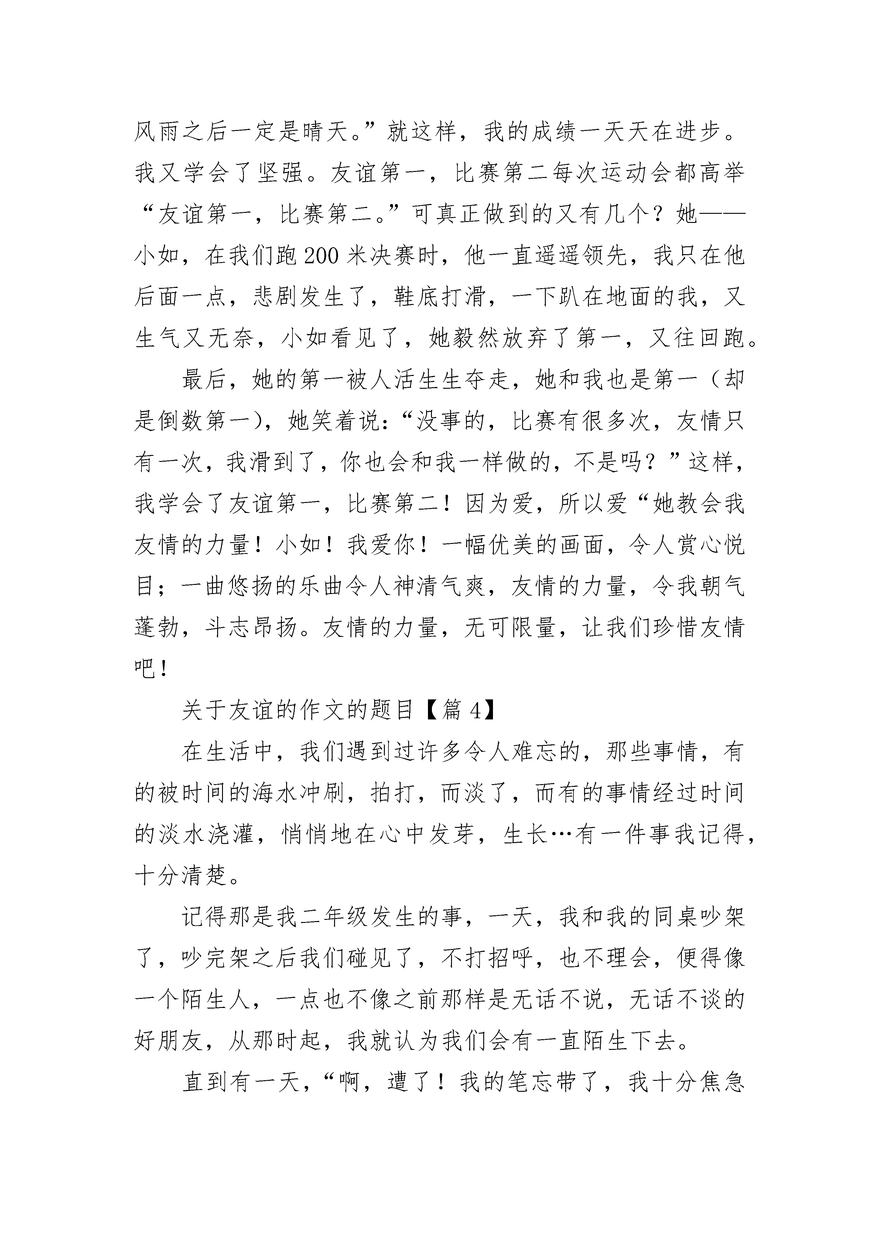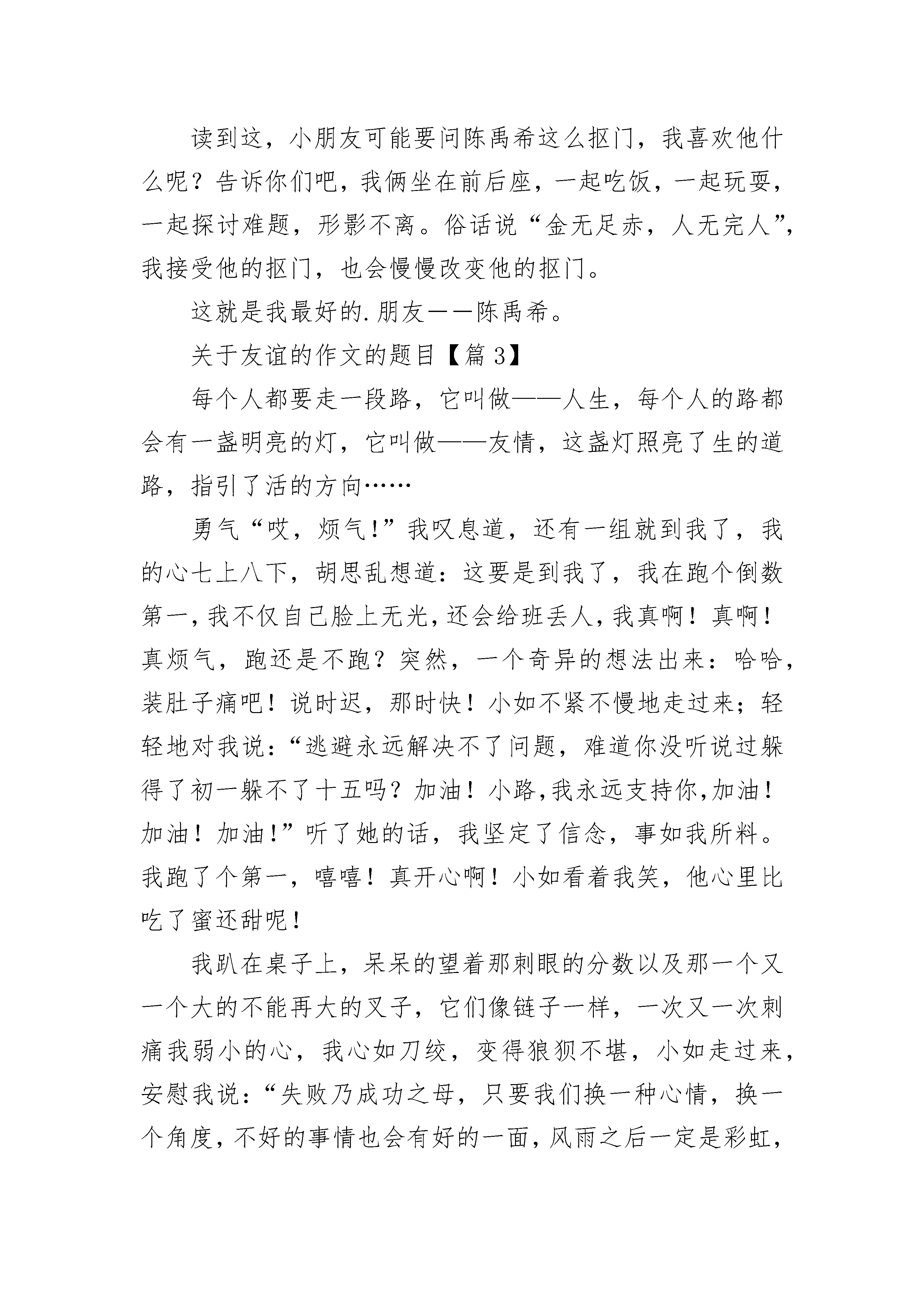 关于友谊的作文的题目5篇关于友谊的作文的题目【篇1】水,天生我材必有用,学习,可以增长知识,刻苦学习是我们的支柱。在校园里,我们都能看到一个认真学习,文静而刻苦,多才多艺,能歌善舞,全面发展。在老师眼中的好学生,一个认真负责的课代表,家长心目中的乖孩子,是同学们心中的榜样与佼佼者。成功与否,在于坚持。所谓友谊,就是一颗心在两个身体里可是,幸福却如此的短暂,一次,回家路上,我见到她亲切的问候,可她呢?对我不理不睬,如同陌生人一般。这对于我来说,无一不是以重打击,我的心碎了!我想在与朋友的谈话中,令我感到惊奇的是,她也遇到这中情况。我在想,她怎么了,我对她感到很同情,我决定帮助她,是我很担心,应为我们毕竟是好友呀,我找到了她,她却不知怎么的就像我发起了脾气,我气得打了她一巴掌,然后气冲冲的走了。朋友的劝告,为何她会置之不理呢?使我感到不解。到后来得知,踏上初中的旅途,她迷上了电子游戏,经常逃学,这使我更加坚定了我的信念,使她走出歧途,做从前心中的她,记过我们的共同努力,她感动了,她笑了。告诉我们,她会通过自己的努力,实现自己的梦想。我们呢?也会为她加油,共同创造。我感到特别的欣慰,真的为她的转变而感到自豪。慢慢地,走在乡间的小路上,总能看到一对形影不离的闺蜜,那就是我们。我们互相学习,互相扶持,一起创造出与我们的未来。我们共同加油,创造一片属于我们的新天地。加油吧!关于友谊的作文的题目【篇2】我的好朋友是个调皮、抠门的小帅哥,他就是我们班的纪律委员陈禹希。他个子比我矮,身材比我瘦,好像一阵风就能把他吹走了。走起路来上窜下跳,搔头挠耳,全身像长满跳蚤似的。他长着一张瓜子脸,头发中间有个很大的旋儿,同学们都说那是他的“第三只眼”。浓浓的眉毛下面是一对黑黝黝的大眼睛,透出狡黠的光。一笑起来,眼睛又眯成了一条线儿,真是太有趣了!陈禹希画画很神。一天,我吃完午饭回到教室,看见他画了一朵花放在桌上。那朵花色彩绚丽,含苞待放,娇艳欲滴,似乎还飘着缕缕幽香。一只蜜蜂飞了过来,要吸那朵“花”里的花蜜吃,可是它吸了半天,却什么也没吸着,只好无力地飞走了。虽然他画画很好看,但是他也很抠门。一天,我尺子没带,就找他借一下。他想了想后大声地对我说:“收费!五根自动铅芯!”又坏坏地笑着说:“小费再加三根哦!”不带这么坑的吧!好吧,我只好交了八根铅笔芯给他,他满载而归,我却空空如也,真拿他没办法!读到这,小朋友可能要问陈禹希这么抠门,我喜欢他什么呢?告诉你们吧,我俩坐在前后座,一起吃饭,一起玩耍,一起探讨难题,形影不离。俗话说“金无足赤,人无完人”,我接受他的抠门,也会慢慢改变他的抠门。这就是我最好的.朋友――陈禹希。关于友谊的作文的题目【篇3】每个人都要走一段路,它叫做——人生,每个人的路都会有一盏明亮的灯,它叫做——友情,这盏灯照亮了生的道路,指引了活的方向……勇气“哎,烦气!”我叹息道,还有一组就到我了,我的心七上八下,胡思乱想道:这要是到我了,我在跑个倒数第一,我不仅自己脸上无光,还会给班丢人,我真啊!真啊!真烦气,跑还是不跑?突然,一个奇异的想法出来:哈哈,装肚子痛吧!说时迟,那时快!小如不紧不慢地走过来;轻轻地对我说:“逃避永远解决不了问题,难道你没听说过躲得了初一躲不了十五吗?加油!小路,我永远支持你,加油!加油!加油!”听了她的话,我坚定了信念,事如我所料。我跑了个第一,嘻嘻!真开心啊!小如看着我笑,他心里比吃了蜜还甜呢!我趴在桌子上,呆呆的望着那刺眼的分数以及那一个又一个大的不能再大的叉子,它们像链子一样,一次又一次刺痛我弱小的心,我心如刀绞,变得狼狈不堪,小如走过来,安慰我说:“失败乃成功之母,只要我们换一种心情,换一个角度,不好的事情也会有好的一面,风雨之后一定是彩虹,风雨之后一定是晴天。”就这样,我的成绩一天天在进步。我又学会了坚强。友谊第一,比赛第二每次运动会都高举“友谊第一,比赛第二。”可真正做到的又有几个?她——小如,在我们跑200米决赛时,他一直遥遥领先,我只在他后面一点,悲剧发生了,鞋底打滑,一下趴在地面的我,又生气又无奈,小如看见了,她毅然放弃了第一,又往回跑。最后,她的第一被人活生生夺走,她和我也是第一(却是倒数第一),她笑着说:“没事的,比赛有很多次,友情只有一次,我滑到了,你也会和我一样做的,不是吗?”这样,我学会了友谊第一,比赛第二!因为爱,所以爱“她教会我友情的力量!小如!我爱你!一幅优美的画面,令人赏心悦目;一曲悠扬的乐曲令人神清气爽,友情的力量,令我朝气蓬勃,斗志昂扬。友情的力量,无可限量,让我们珍惜友情吧!关于友谊的作文的题目【篇4】在生活中,我们遇到过许多令人难忘的,那些事情,有的被时间的海水冲刷,拍打,而淡了,而有的事情经过时间的淡水浇灌,悄悄地在心中发芽,生长…有一件事我记得,十分清楚。记得那是我二
