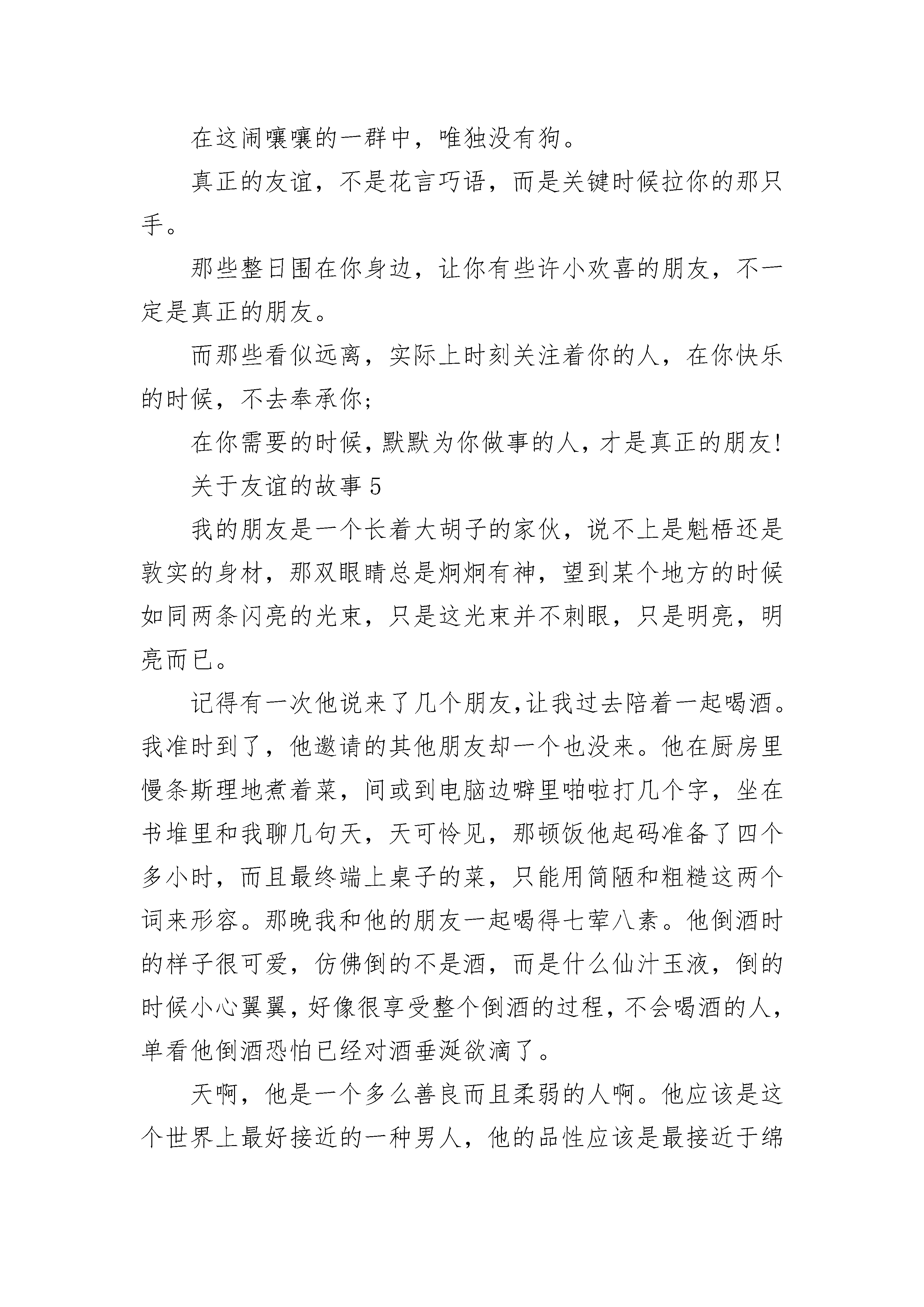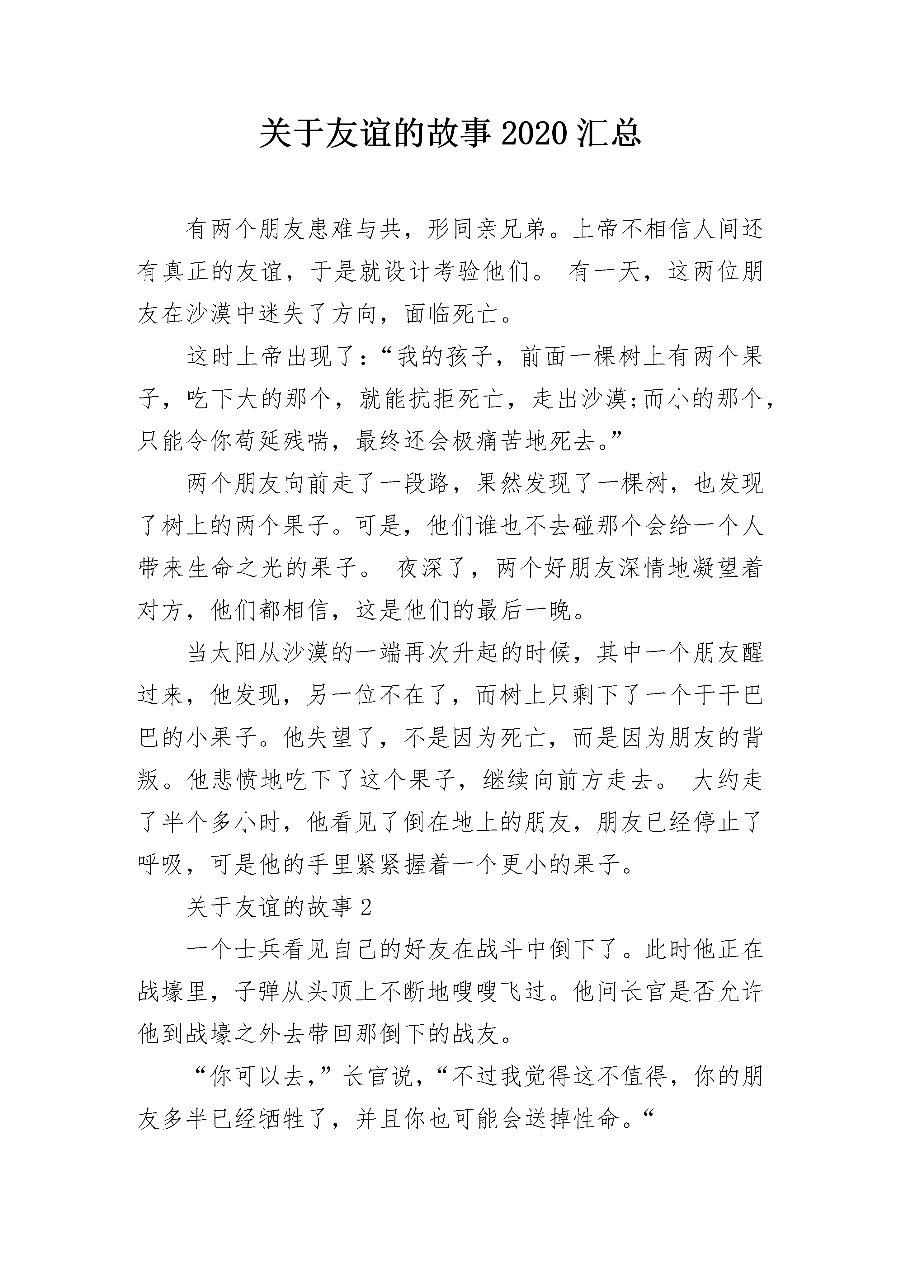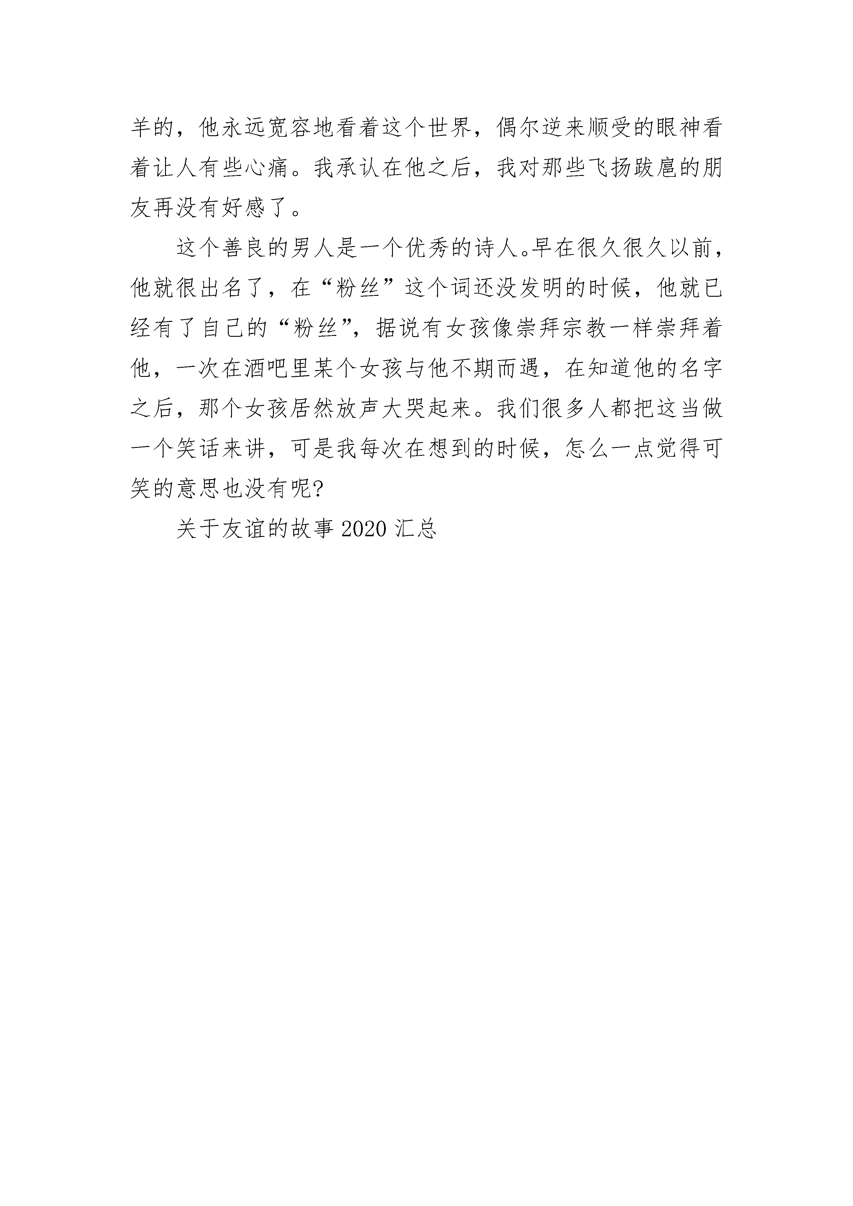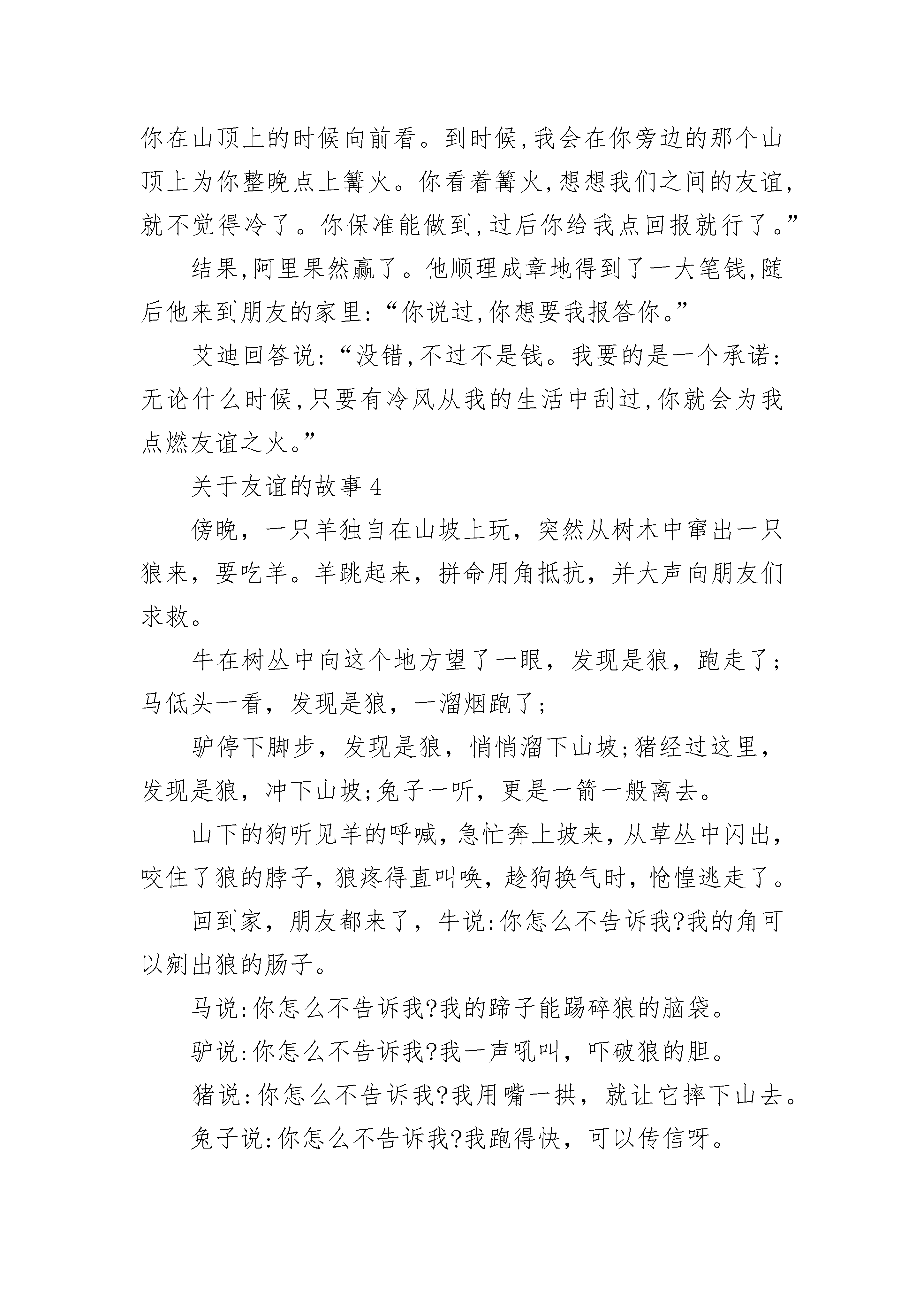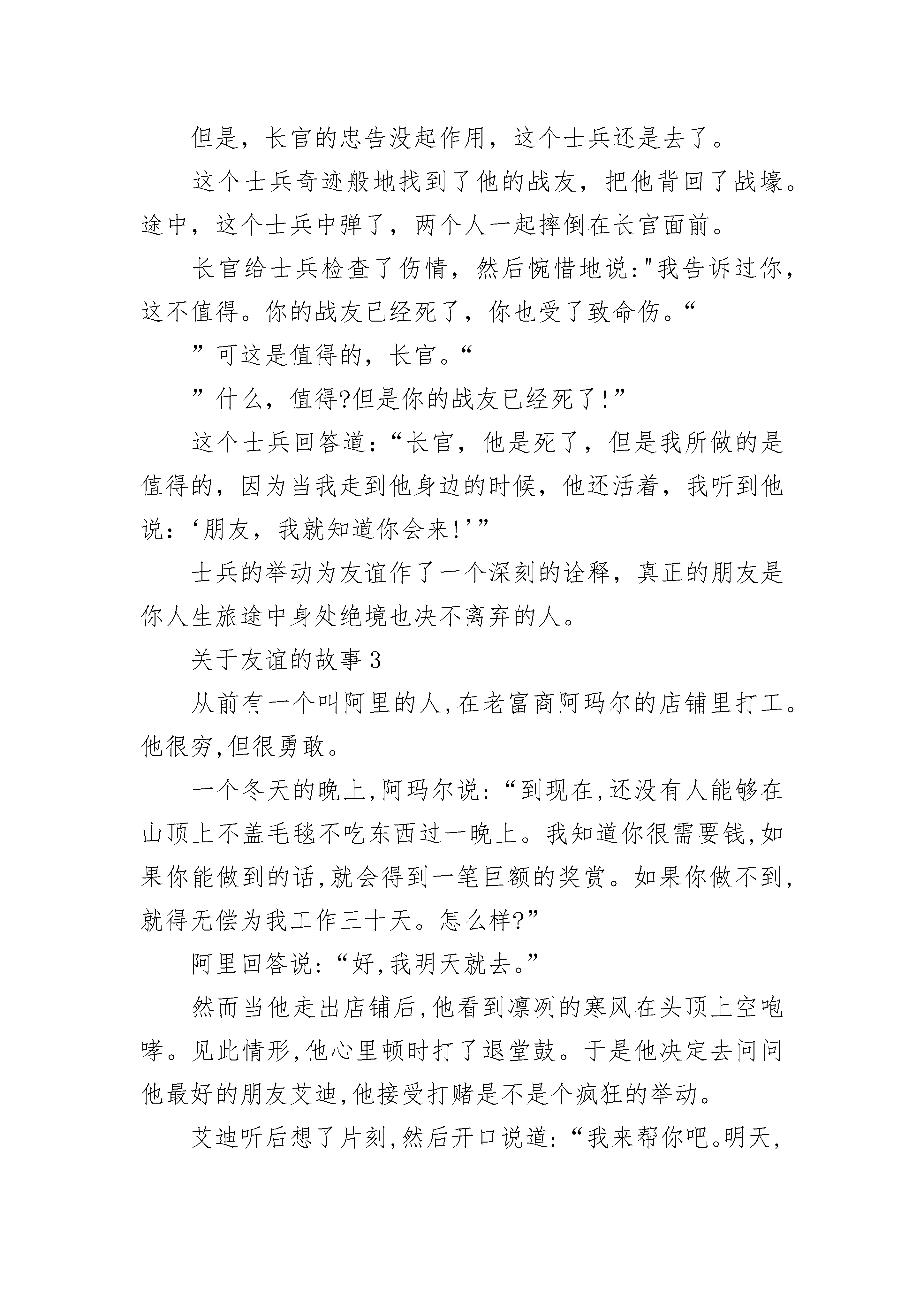 关于友谊的故事2020汇总有两个朋友患难与共,形同亲兄弟。上帝不相信人间还有真正的友谊,于是就设计考验他们。有一天,这两位朋友在沙漠中迷失了方向,面临死亡。这时上帝出现了:“我的孩子,前面一棵树上有两个果子,吃下大的那个,就能抗拒死亡,走出沙漠;而小的那个,只能令你苟延残喘,最终还会极痛苦地死去。”两个朋友向前走了一段路,果然发现了一棵树,也发现了树上的两个果子。可是,他们谁也不去碰那个会给一个人带来生命之光的果子。夜深了,两个好朋友深情地凝望着对方,他们都相信,这是他们的最后一晚。当太阳从沙漠的一端再次升起的时候,其中一个朋友醒过来,他发现,另一位不在了,而树上只剩下了一个干干巴巴的小果子。他失望了,不是因为死亡,而是因为朋友的背叛。他悲愤地吃下了这个果子,继续向前方走去。大约走了半个多小时,他看见了倒在地上的朋友,朋友已经停止了呼吸,可是他的手里紧紧握着一个更小的果子。关于友谊的故事2一个士兵看见自己的好友在战斗中倒下了。此时他正在战壕里,子弹从头顶上不断地嗖嗖飞过。他问长官是否允许他到战壕之外去带回那倒下的战友。“你可以去,”长官说,“不过我觉得这不值得,你的朋友多半已经牺牲了,并且你也可能会送掉性命。“但是,长官的忠告没起作用,这个士兵还是去了。这个士兵奇迹般地找到了他的战友,把他背回了战壕。途中,这个士兵中弹了,两个人一起摔倒在长官面前。长官给士兵检查了伤情,然后惋惜地说:"我告诉过你,这不值得。你的战友已经死了,你也受了致命伤。“”可这是值得的,长官。“”什么,值得?但是你的战友已经死了!”这个士兵回答道:“长官,他是死了,但是我所做的是值得的,因为当我走到他身边的时候,他还活着,我听到他说:‘朋友,我就知道你会来!’”士兵的举动为友谊作了一个深刻的诠释,真正的朋友是你人生旅途中身处绝境也决不离弃的人。关于友谊的故事3从前有一个叫阿里的人,在老富商阿玛尔的店铺里打工。他很穷,但很勇敢。一个冬天的晚上,阿玛尔说:“到现在,还没有人能够在山顶上不盖毛毯不吃东西过一晚上。我知道你很需要钱,如果你能做到的话,就会得到一笔巨额的奖赏。如果你做不到,就得无偿为我工作三十天。怎么样?”阿里回答说:“好,我明天就去。”然而当他走出店铺后,他看到凛冽的寒风在头顶上空咆哮。见此情形,他心里顿时打了退堂鼓。于是他决定去问问他最好的朋友艾迪,他接受打赌是不是个疯狂的举动。艾迪听后想了片刻,然后开口说道:“我来帮你吧。明天,你在山顶上的时候向前看。到时候,我会在你旁边的那个山顶上为你整晚点上篝火。你看着篝火,想想我们之间的友谊,就不觉得冷了。你保准能做到,过后你给我点回报就行了。”结果,阿里果然赢了。他顺理成章地得到了一大笔钱,随后他来到朋友的家里:“你说过,你想要我报答你。”艾迪回答说:“没错,不过不是钱。我要的是一个承诺:无论什么时候,只要有冷风从我的生活中刮过,你就会为我点燃友谊之火。”关于友谊的故事4傍晚,一只羊独自在山坡上玩,突然从树木中窜出一只狼来,要吃羊。羊跳起来,拼命用角抵抗,并大声向朋友们求救。牛在树丛中向这个地方望了一眼,发现是狼,跑走了;马低头一看,发现是狼,一溜烟跑了;驴停下脚步,发现是狼,悄悄溜下山坡;猪经过这里,发现是狼,冲下山坡;兔子一听,更是一箭一般离去。山下的狗听见羊的呼喊,急忙奔上坡来,从草丛中闪出,咬住了狼的脖子,狼疼得直叫唤,趁狗换气时,怆惶逃走了。回到家,朋友都来了,牛说:你怎么不告诉我?我的角可以剜出狼的肠子。马说:你怎么不告诉我?我的蹄子能踢碎狼的脑袋。驴说:你怎么不告诉我?我一声吼叫,吓破狼的胆。猪说:你怎么不告诉我?我用嘴一拱,就让它摔下山去。兔子说:你怎么不告诉我?我跑得快,可以传信呀。在这闹嚷嚷的一群中,唯独没有狗。真正的友谊,不是花言巧语,而是关键时候拉你的那只手。那些整日围在你身边,让你有些许小欢喜的朋友,不一定是真正的朋友。而那些看似远离,实际上时刻关注着你的人,在你快乐的时候,不去奉承你;在你需要的时候,默默为你做事的人,才是真正的朋友!关于友谊的故事5我的朋友是一个长着大胡子的家伙,说不上是魁梧还是敦实的身材,那双眼睛总是炯炯有神,望到某个地方的时候如同两条闪亮的光束,只是这光束并不刺眼,只是明亮,明亮而已。记得有一次他说来了几个朋友,让我过去陪着一起喝酒。我准时到了,他邀请的其他朋友却一个也没来。他在厨房里慢条斯理地煮着菜,间或到电脑边噼里啪啦打几个字,坐在书堆里和我聊几句天,天可怜见,那顿饭他起码准备了四个多小时,而且最终端上桌子的菜,只能用简陋和粗糙这两个词来形容。那晚我和他的朋友一起喝得七荤八素。他倒酒时的样子很可爱,仿佛倒的不是酒,而是什么仙汁玉液,倒的时候小心翼翼,好像很享受整个倒酒的过程,不会喝酒的人,单看他倒酒恐怕已经对酒垂涎欲滴了。天啊,他是一个多么善良而