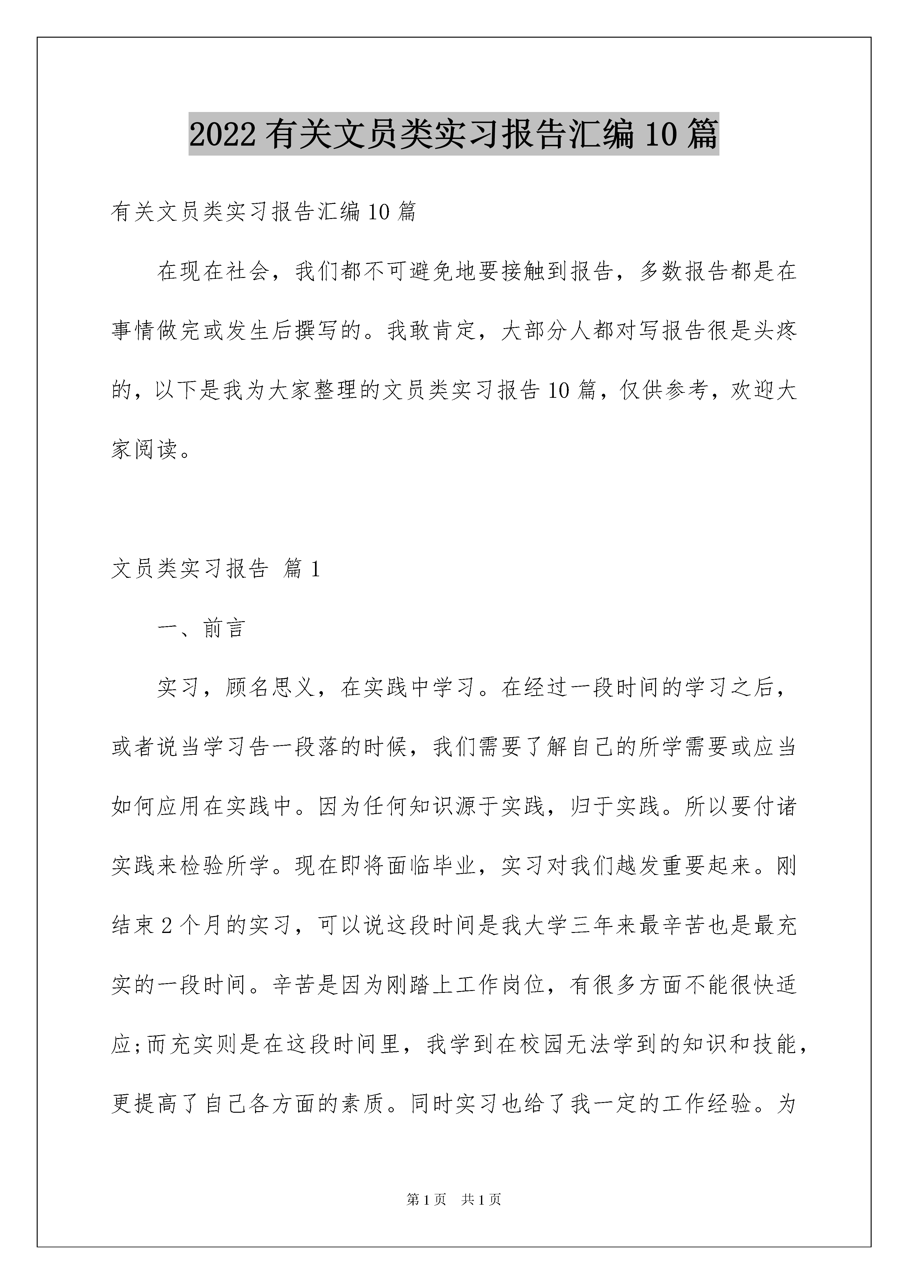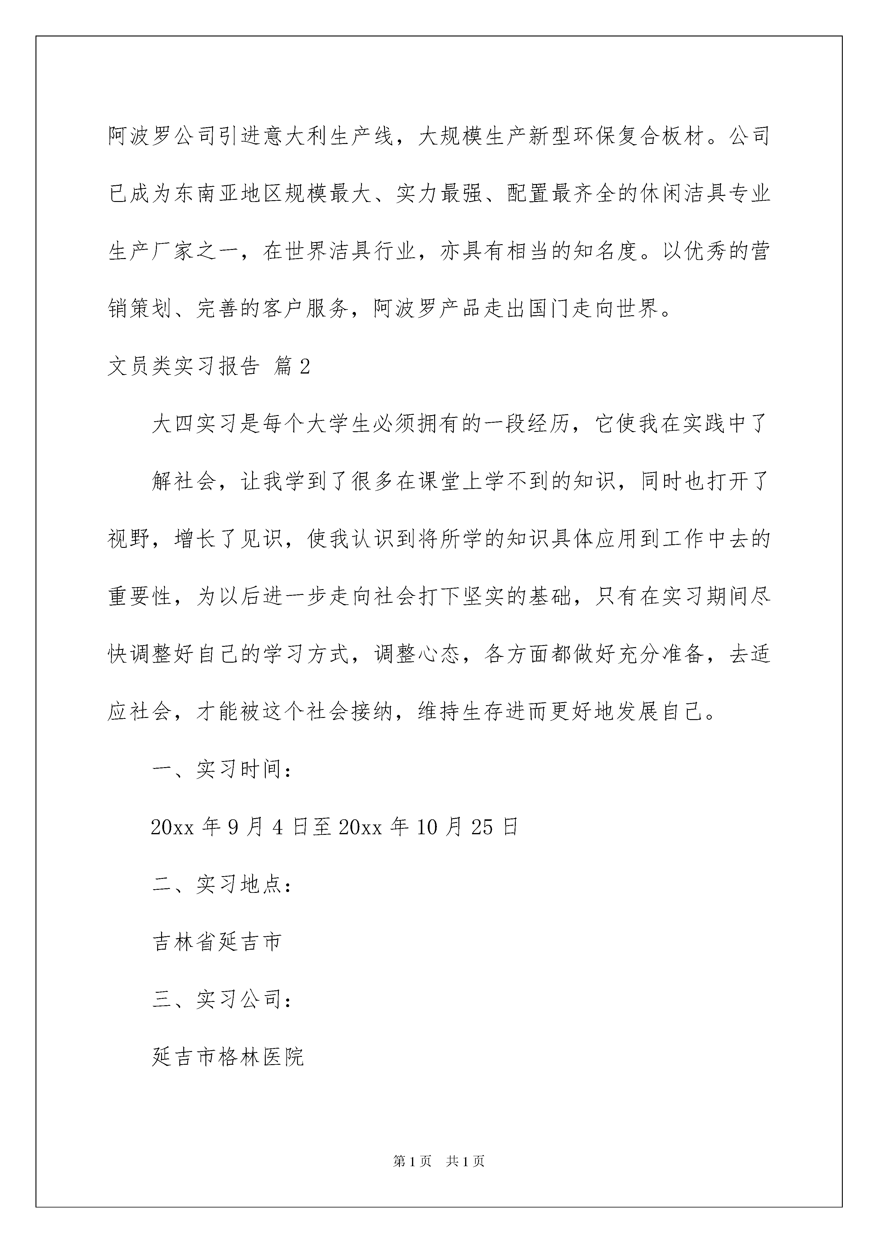 2022有关文员类实习报告汇编10篇有关文员类实习报告汇编10篇在现在社会,我们都不可避免地要接触到报告,多数报告都是在事情做完或发生后撰写的。我敢肯定,大部分人都对写报告很是头疼的,以下是我为大家整理的文员类实习报告10篇,仅供参考,欢迎大家阅读。文员类实习报告篇1一、前言实习,顾名思义,在实践中学习。在经过一段时间的学习之后,或者说当学习告一段落的时候,我们需要了解自己的所学需要或应当如何应用在实践中。因为任何知识源于实践,归于实践。所以要付诸实践来检验所学。现在即将面临毕业,实习对我们越发重要起来。刚结束2个月的实习,可以说这段时间是我大学三年来最辛苦也是最充实的一段时间。辛苦是因为刚踏上工作岗位,有很多方面不能很快适应;而充实则是在这段时间里,我学到在校园无法学到的知识和技能,更提高了自己各方面的素质。同时实习也给了我一定的工作经验。为将来谋求一份好职业打下了基础。现将这些日子在工作中取得的成绩和不足做个小结。一来总结一下经验,二来也对自己的工作情况有个系统的认识。二、公司概况我是在广州市阿波罗建材科技有限公司实习的。生产基地与科研开发广州市阿波罗建材科技有限公司是研制、生产电脑蒸汽房、按摩浴缸等高级休闲卫生洁具的专业厂家。阿波罗公司营销部位于广州市最繁华的天河商务区高盛大厦,办公面积约1000平方米;其基地位于广州市海珠区风光秀丽的琶洲地区。公司现有员工约1000人,厂房面积约8万平方米,厂内绿树成荫,车间规划有序,“阿波罗”旗帜在厂门口高高飘扬。它共设立了电子、五金、机械加工、塑料五金、模具、注塑、包装材料、板材生产、玻璃制品、洁具生产、组装等十几个生产部门。阿波罗技术开发部门拥有30多名工程技术、电脑设计、工艺管理等专业人才,雄厚的技术力量使阿波罗产品品质及设计风范一直站在市场的最前沿。厂区内设立了一个大型的产品展示区(展厅),所有展品都是最新设计的产品,各地客商、外商能从容的选购各类最新设计的优秀产品,同时也让公司的技术人员对产品进行研究改良。阿波罗公司引进意大利生产线,大规模生产新型环保复合板材。公司已成为东南亚地区规模最大、实力最强、配置最齐全的休闲洁具专业生产厂家之一,在世界洁具行业,亦具有相当的知名度。以优秀的营销策划、完善的客户服务,阿波罗产品走出国门走向世界。文员类实习报告篇2大四实习是每个大学生必须拥有的一段经历,它使我在实践中了解社会,让我学到了很多在课堂上学不到的知识,同时也打开了视野,增长了见识,使我认识到将所学的知识具体应用到工作中去的重要性,为以后进一步走向社会打下坚实的基础,只有在实习期间尽快调整好自己的学习方式,调整心态,各方面都做好充分准备,去适应社会,才能被这个社会接纳,维持生存进而更好地发展自己。一、实习时间:20xx年9月4日至20xx年10月25日二、实习地点:吉林省延吉市三、实习公司:延吉市格林医院四、实习目的:更好的了解与体验办公室文员一职,提高自己各方面的能力:调查研究、搜集资料、整理资料的能力,理论与实际相结合的能力。为以后真正步入工作岗位做一个较为充分的准备。五、实习基本情况:20xx年9月4日这一天我以一位医院办公室实习文员的身份进入了延吉市格林医院,开始了我的实习经历。我怀着一颗激动而紧张的心踏入延吉市格林医院,刚进入医院办公室的那一刻,我觉得我正在走进另一个领域,在这里我即将度过两个多月的时间,更会在这里认识更多的同事和朋友,学到更多的知识。吉市格林医院是一所综合性质的中小型医院,具有自己的独立药房。我的工作虽然量不是很大,却很繁琐。六、实习内容:在医院办公室实习期间,我从事的是办公室文员工作,主要负责:办公室的清洁卫生,接听、转接电话,接待来访人员,做好办公室资料收集、整理工作,负责传真件的收发工作。负责医院、信件、邮件、报刊杂志的分送,做好医院宣传专栏的组稿,统计每月考勤并交财务做帐、留底,做好医院食堂费用支出、流水帐登记,并对餐费做统计及餐费的收纳、保管,接受其他临时工作。七、实习过程:刚进医院办公室时,对整个办公室的工作非常陌生,文员工作也不知道从何下手,更谈不上管理。后来在主任和同事的指导帮助下,开始对医院、对职位职责有所了解,这些事情看上去很简单,但是真正实施起来难度不小,需要注意几个方面:1、医院办公室工作流程的了解;2、各种办公软件的运用;3、人际关系的协调等。这些在学校是远远学不到的,只能是大概的有些了解,并不是很清楚,经过一段时间的实践,才让我真正的全方位的了解,当然还有很多东西目前掌握的还不够,需要以后的多加了解和学习。虽然一开始只是接听电话和打印整理资料,但是这里还很有学问,你要