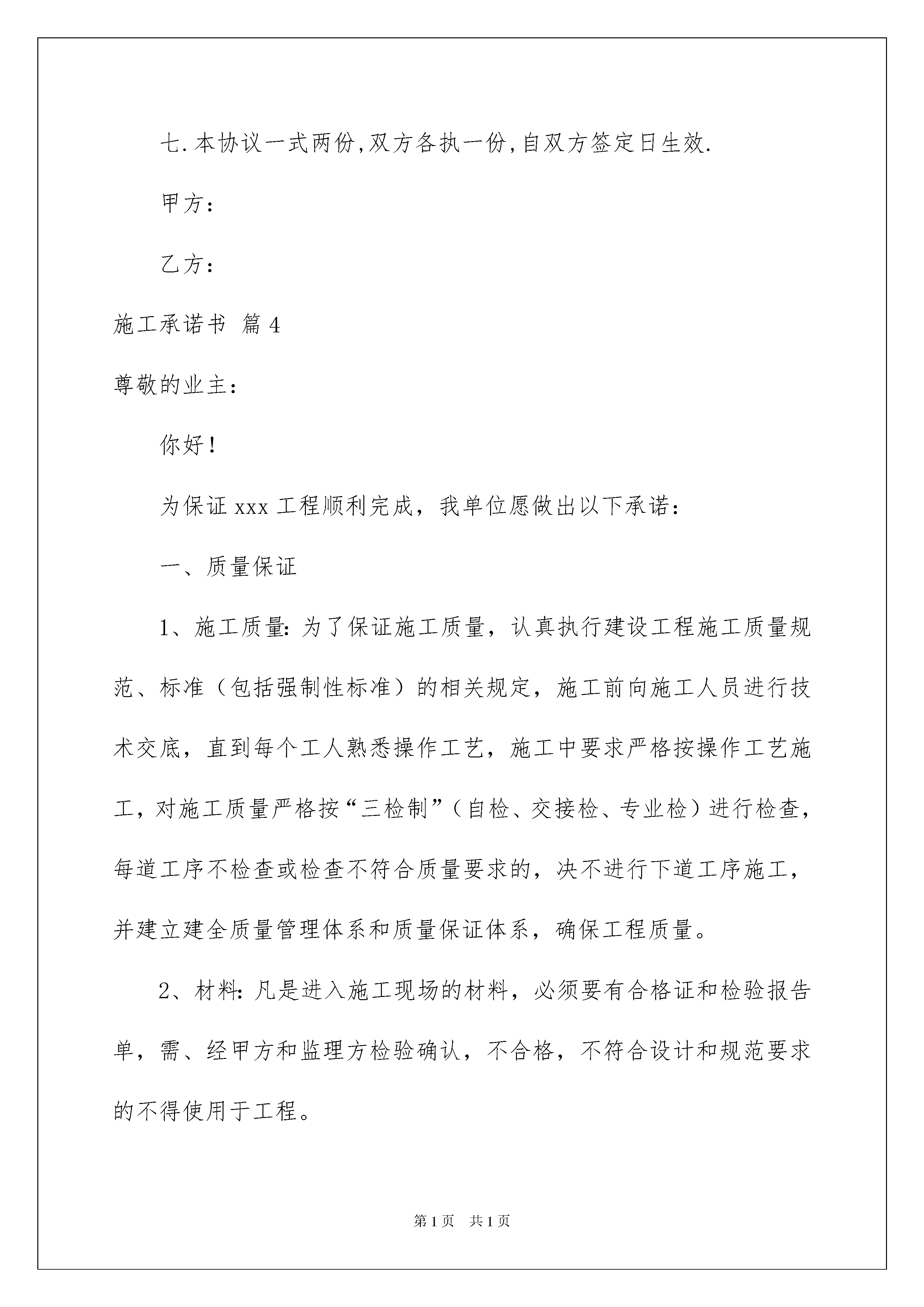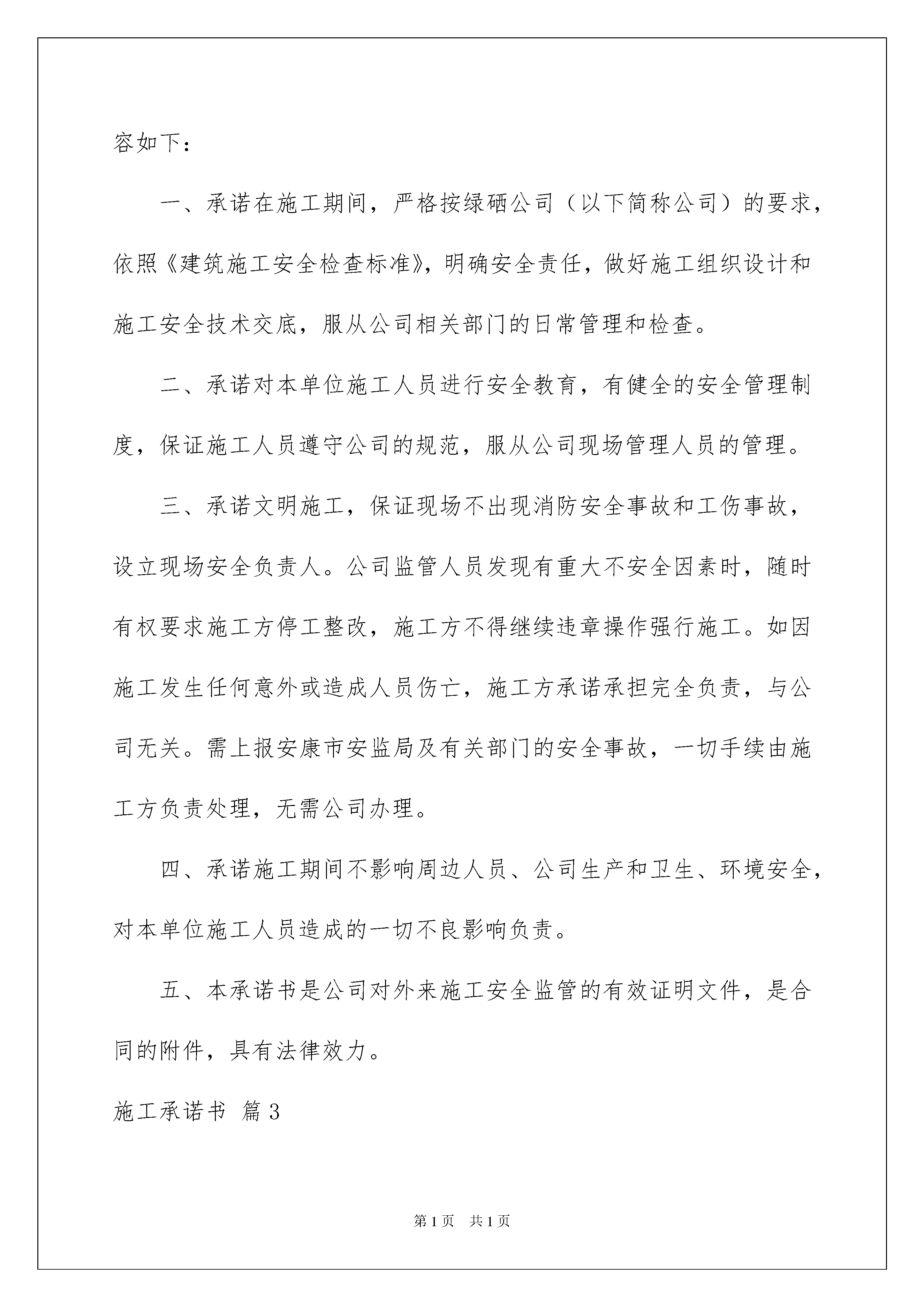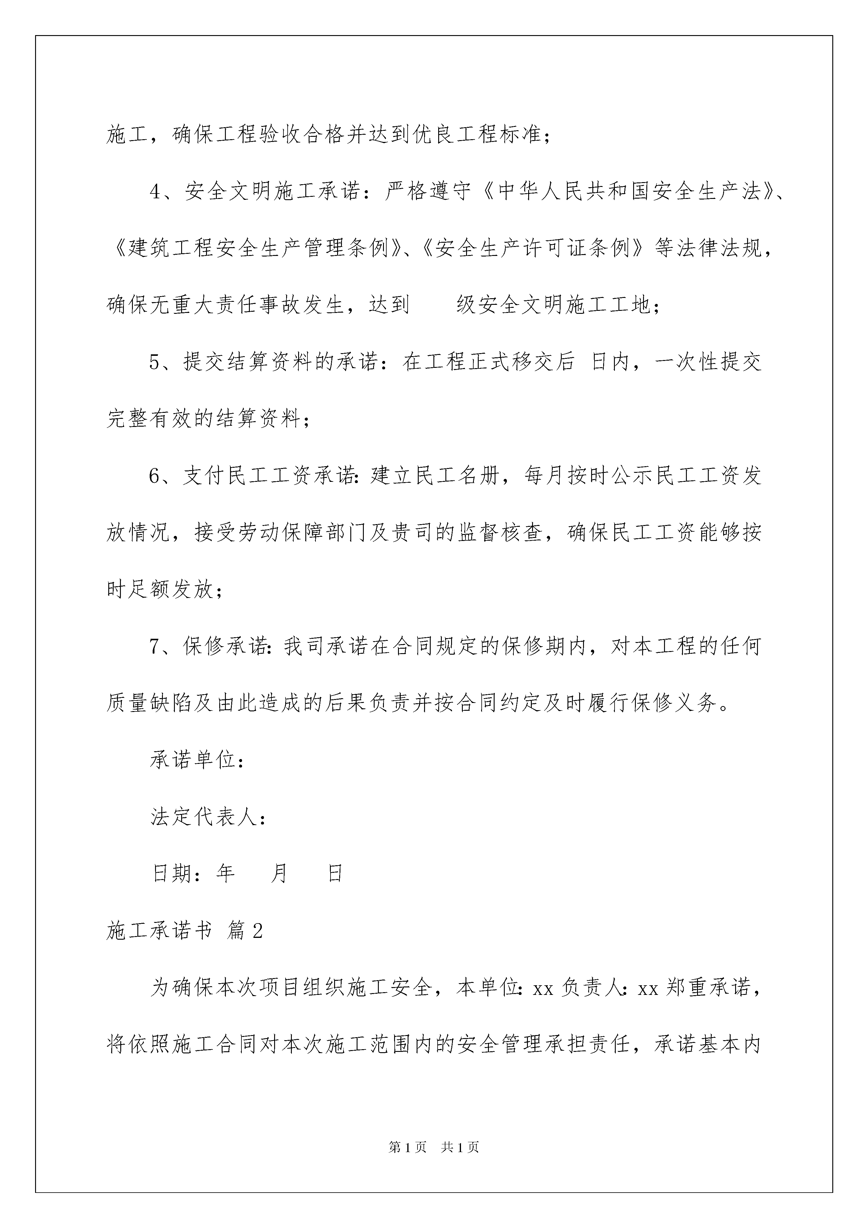 2022有关施工承诺书4篇有关施工承诺书4篇现如今,能够利用到承诺书的场合越来越多,承诺书是把口头承诺书面化规范化的一种产物。相信写承诺书是一个让许多人都头痛的问题,以下是我收集整理的施工承诺书4篇,欢迎大家分享。施工承诺书篇1xx有限公司:在接到贵司xxx的招标文件后,我司将立即组织有关人员进行认真、细致的研究,并按照招标文件的范围和要求编制投标书,现结合我司的实际情况就xx工程有关合同条件、工期、质量、安全文明施工、结算资料、民工工资支付、保修等方面的事宜对招标人承诺如下:1、对合同条件的承诺:承认并接受贵方《招标文件》的要求和合同条件的约束;2、工期承诺:如果中标,我司保证在接到开工通知后,在规定时间内开工,并保证按合同工期、节点要求完成全部工程施工;3、工程质量承诺:保证按照招标文件的技术要求和质量要求进行施工,确保工程验收合格并达到优良工程标准;4、安全文明施工承诺:严格遵守《中华人民共和国安全生产法》、《建筑工程安全生产管理条例》、《安全生产许可证条例》等法律法规,确保无重大责任事故发生,达到级安全文明施工工地;5、提交结算资料的承诺:在工程正式移交后日内,一次性提交完整有效的结算资料;6、支付民工工资承诺:建立民工名册,每月按时公示民工工资发放情况,接受劳动保障部门及贵司的监督核查,确保民工工资能够按时足额发放;7、保修承诺:我司承诺在合同规定的保修期内,对本工程的任何质量缺陷及由此造成的后果负责并按合同约定及时履行保修义务。承诺单位:法定代表人:日期:年月日施工承诺书篇2为确保本次项目组织施工安全,本单位:xx负责人:xx郑重承诺,将依照施工合同对本次施工范围内的安全管理承担责任,承诺基本内容如下:一、承诺在施工期间,严格按绿硒公司(以下简称公司)的要求,依照《建筑施工安全检查标准》,明确安全责任,做好施工组织设计和施工安全技术交底,服从公司相关部门的日常管理和检查。二、承诺对本单位施工人员进行安全教育,有健全的安全管理制度,保证施工人员遵守公司的规范,服从公司现场管理人员的管理。三、承诺文明施工,保证现场不出现消防安全事故和工伤事故,设立现场安全负责人。公司监管人员发现有重大不安全因素时,随时有权要求施工方停工整改,施工方不得继续违章操作强行施工。如因施工发生任何意外或造成人员伤亡,施工方承诺承担完全负责,与公司无关。需上报安康市安监局及有关部门的安全事故,一切手续由施工方负责处理,无需公司办理。四、承诺施工期间不影响周边人员、公司生产和卫生、环境安全,对本单位施工人员造成的一切不良影响负责。五、本承诺书是公司对外来施工安全监管的有效证明文件,是合同的附件,具有法律效力。施工承诺书篇3甲方:乙方:甲方将位于沙刘路旁的旧平房拆除和清除工程承包给乙方,经甲乙双方协商,达成协议如下:一.甲方的旧房拆除和清除全权由乙方负责。二.旧房拆除自20xx年5月19日开始,两天内拆除清除完毕。三.乙方必须按照相关安全规定做好拆房安全措施,在拆房过程中发生的任何伤亡事故均由乙方自行负责,与甲方无关(即甲方不出任何医疗伤亡事故方面的`费用)。四.在拆房过程中产生的环境等影响问题由甲乙双方协商解决.五.由乙方负责的旧房拆除和清除工程要达到如下要求:①乙方负责将地平面以上的房屋建筑全部拆除完毕,拆除产生的所有垃圾由乙方负责清理,运到旧房前,填在旧房前的地面上.②拆除下来的檩子和瓦板要搬到指定地点堆放整齐。③拆除下来的砖刮干净(断砖除外),搬到指定地点堆放整齐。六.甲方向乙方需支付拆房费用元(大写计),并在乙方按协议书上的要求拆房完工后当日付清。七.本协议一式两份,双方各执一份,自双方签定日生效.甲方:乙方:施工承诺书篇4尊敬的业主:你好!为保证xxx工程顺利完成,我单位愿做出以下承诺:一、质量保证1、施工质量:为了保证施工质量,认真执行建设工程施工质量规范、标准(包括强制性标准)的相关规定,施工前向施工人员进行技术交底,直到每个工人熟悉操作工艺,施工中要求严格按操作工艺施工,对施工质量严格按“三检制”(自检、交接检、专业检)进行检查,每道工序不检查或检查不符合质量要求的,决不进行下道工序施工,并建立建全质量管理体系和质量保证体系,确保工程质量。2、材料:凡是进入施工现场的材料,必须要有合格证和检验报告单,需、经甲方和监理方检验确认,不合格,不符合设计和规范要求的不得使用于工程。二、工期保证1、组织合理措施:①由项目管理部统一调度管理。②及时落实材料、机具、劳力的进场和调度、管理。做好工序安排,提前做好工作面的准备工作。2、实施进度管理:①每周安排计划,下达班组和个人的定额和完成的