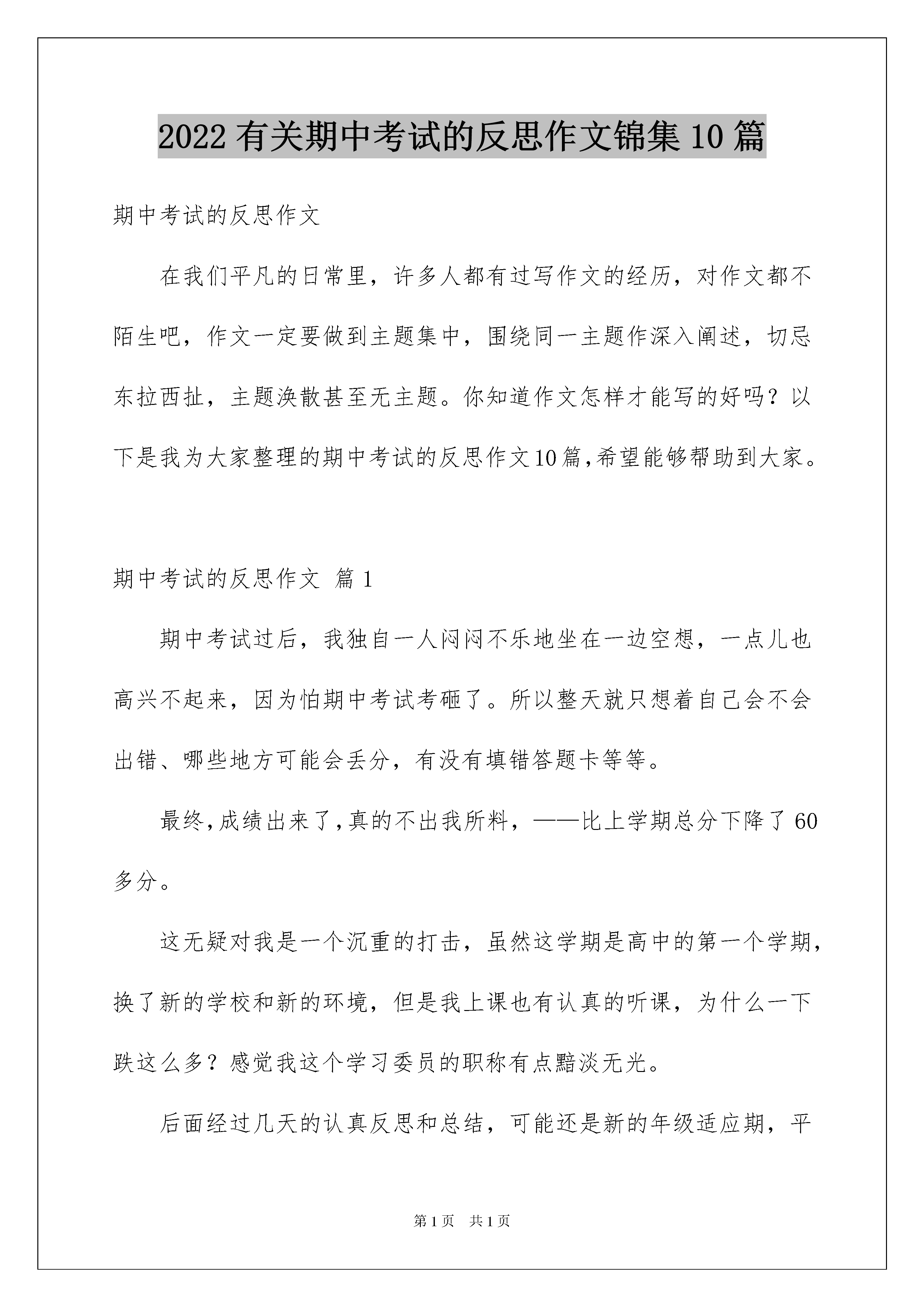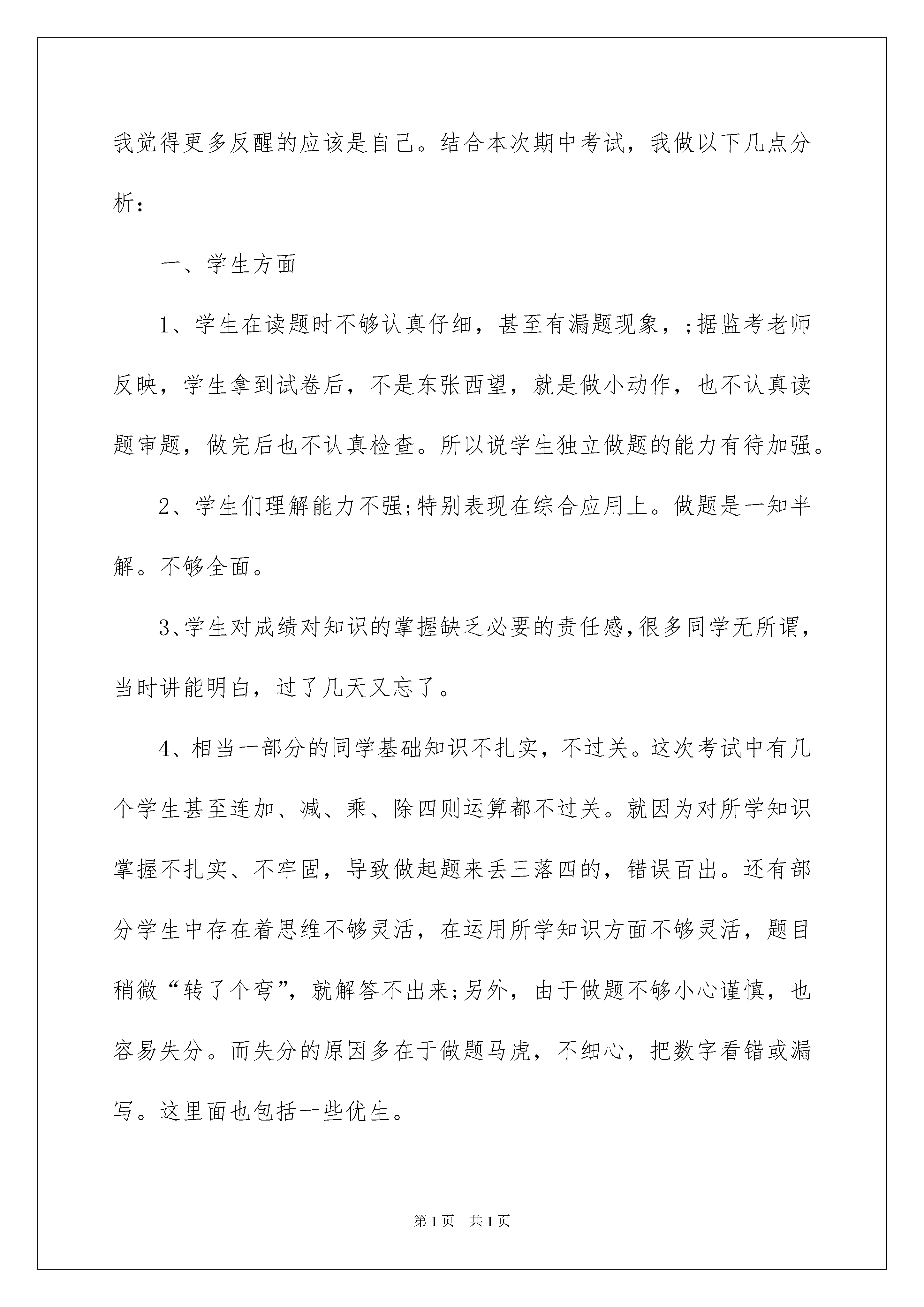 2022有关期中考试的反思作文锦集10篇期中考试的反思作文在我们平凡的日常里,许多人都有过写作文的经历,对作文都不陌生吧,作文一定要做到主题集中,围绕同一主题作深入阐述,切忌东拉西扯,主题涣散甚至无主题。你知道作文怎样才能写的好吗?以下是我为大家整理的期中考试的反思作文10篇,希望能够帮助到大家。期中考试的反思作文篇1期中考试过后,我独自一人闷闷不乐地坐在一边空想,一点儿也高兴不起来,因为怕期中考试考砸了。所以整天就只想着自己会不会出错、哪些地方可能会丢分,有没有填错答题卡等等。最终,成绩出来了,真的不出我所料,——比上学期总分下降了60多分。这无疑对我是一个沉重的打击,虽然这学期是高中的第一个学期,换了新的学校和新的环境,但是我上课也有认真的听课,为什么一下跌这么多?感觉我这个学习委员的职称有点黯淡无光。后面经过几天的认真反思和总结,可能还是新的年级适应期,平时需要各科成绩都要下功夫,所以,为了成功,必须有一套好的学习方法和学习习惯,为此,我决定;做到以下几点:1、课前预习第二天要上的各科内容。大致看一下当天要学习的内容,不懂的问老师或同学,有一些实在不懂的地方标上记号,做到心中有数;2、上课认真听讲,把思路跟着老师走,如果还不懂,可以等下课问老师同学,在认真听讲同时还要把自己认为重要的地方勾画或抄下来。3、课后复习。把当天所学的内容和所做的笔记整理好,好好复习,把该背的背下来。4、独立完成作业,认真完成,不抄袭。做到了这些我相信在期末考试后我的成绩一定会升上去。期中考试的反思作文篇2着时光的流逝,我和三年级学生又度过了半个学期的光阴。在这段日子里我有过喜悦,也有过困惑;有收获,也有失败。期中考试也结束了,我所带的班,学生考得不太理想。作为三年级数学老师的我也在不断反思,为什么学生的成绩考得不高。面对那一张张稚嫩的小脸我觉得更多反醒的应该是自己。结合本次期中考试,我做以下几点分析:一、学生方面1、学生在读题时不够认真仔细,甚至有漏题现象,;据监考老师反映,学生拿到试卷后,不是东张西望,就是做小动作,也不认真读题审题,做完后也不认真检查。所以说学生独立做题的能力有待加强。2、学生们理解能力不强;特别表现在综合应用上。做题是一知半解。不够全面。3、学生对成绩对知识的掌握缺乏必要的责任感,很多同学无所谓,当时讲能明白,过了几天又忘了。4、相当一部分的同学基础知识不扎实,不过关。这次考试中有几个学生甚至连加、减、乘、除四则运算都不过关。就因为对所学知识掌握不扎实、不牢固,导致做起题来丢三落四的,错误百出。还有部分学生中存在着思维不够灵活,在运用所学知识方面不够灵活,题目稍微“转了个弯”,就解答不出来;另外,由于做题不够小心谨慎,也容易失分。而失分的原因多在于做题马虎,不细心,把数字看错或漏写。这里面也包括一些优生。原因分析:1、对于学生来说,有的父母长期在外面打工,孩子的生活和学习无法得到父母的照顾和指导,成了留守儿童。这些学生在家学习上无人指导和监督,就变得自由散慢,学习无自主性。2、部分学生上课不认真听讲,平时作业也不认真,根本没有把心思放在学习上。3、学生的成绩提不高,还在于很多学生对于数学的学习兴趣不够,不能自觉、自主地学习。遇到不懂的问题,也不闻不问,得过且过。甚至有些学生,根本就不知道自己哪些知识不懂,整天迷迷糊糊的。学生的学习兴趣非常重要,很多学生对于学习没兴趣,上课也不能专心听讲,课后又不能自主学习,成绩就无法提高了。再者,根据家访所了解到的情况,很多学生在家里的学习不自觉,相当一部分的学生回到家里只是完成当天的作业而已,谈不上预习、复习。二、采取的措施本次考试主要检查了学生半学期来对基本知识学习、掌握的情况,也是检验学生分析问题和解决问题的能力,当然更是检查教师教学是否面向全体,是否提高学生的整体水平。以此达到查漏补缺,不断改进教学方法,提高教学质量的目的。通过本次考试,经过反思自己平时的教学,我认为今后教学主要从以下几方面着手:第一,要激发学生的学习数学的兴趣,提高学好数学的信心。在平日的教学中,要创造性使用教材,为学生创设了一些现实的情境,使教学内容更贴近学生的生活。让学生乐于学习。第二,培养学生良好的解题习惯。减少学生因不良的学习习惯造成试卷上所反映的审题不仔细、看错符号、漏做试题、漏写结果等现象。对于一些概念性的题目,老师平时要讲透,练习的形式要多样化。要培养学生仔细审题、细心做题、做好检查的良好习惯,引导学生全面细致地分析题意。第三,对学生的作业批改及时、认真,分析并记录学生的作业情况,将他们在作业中出现的问题作出分类总结,进行透彻地评讲,并针对有关