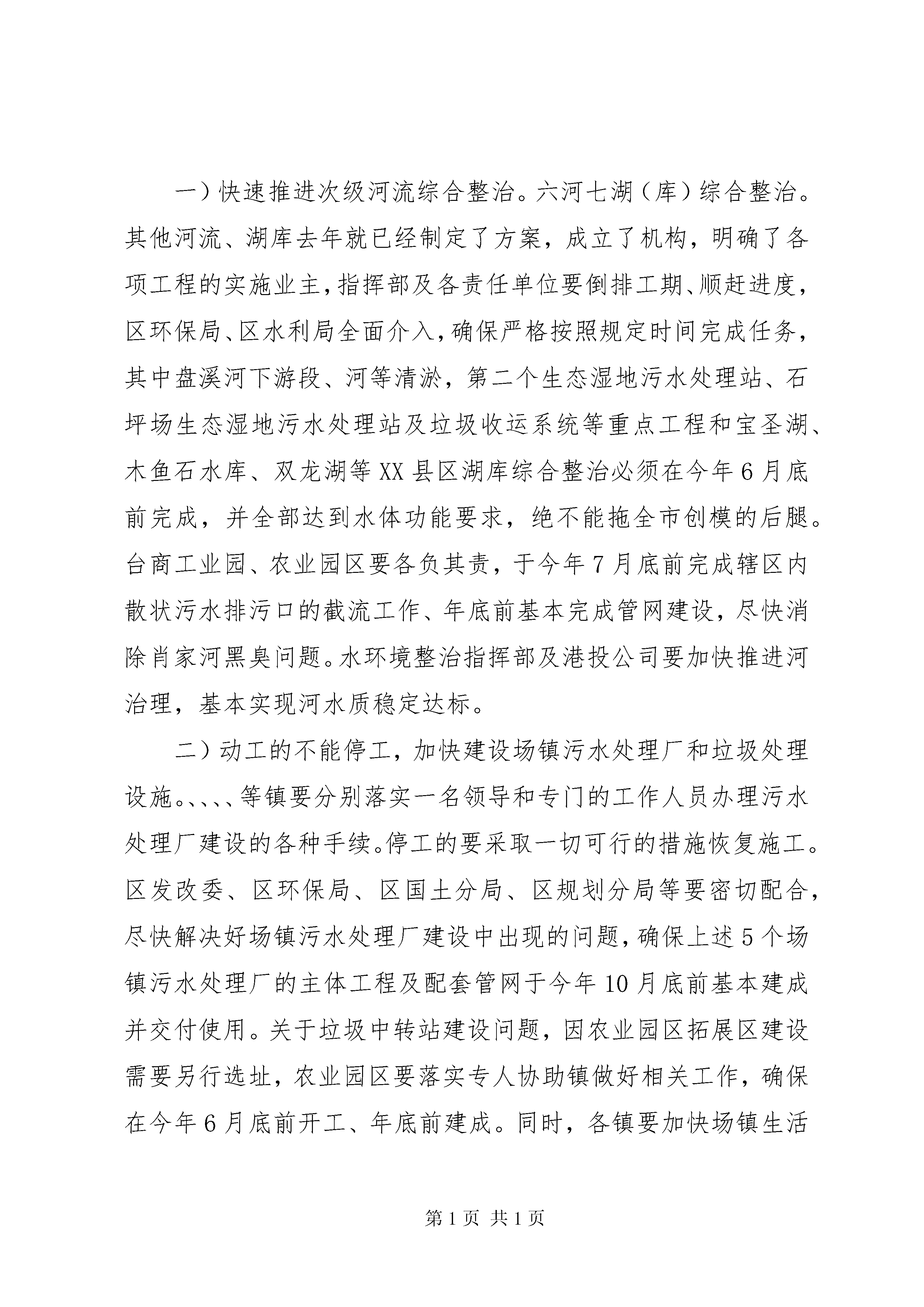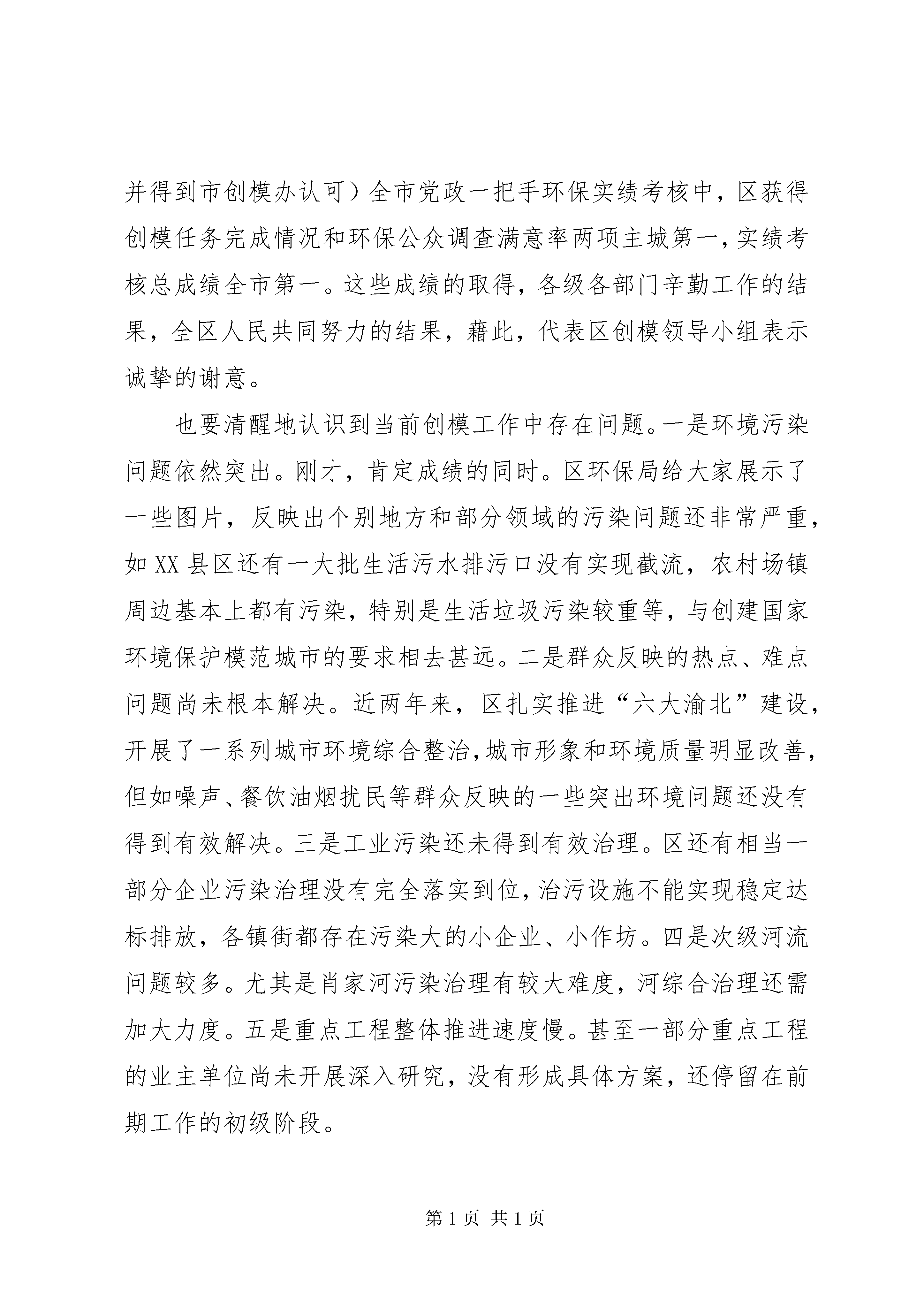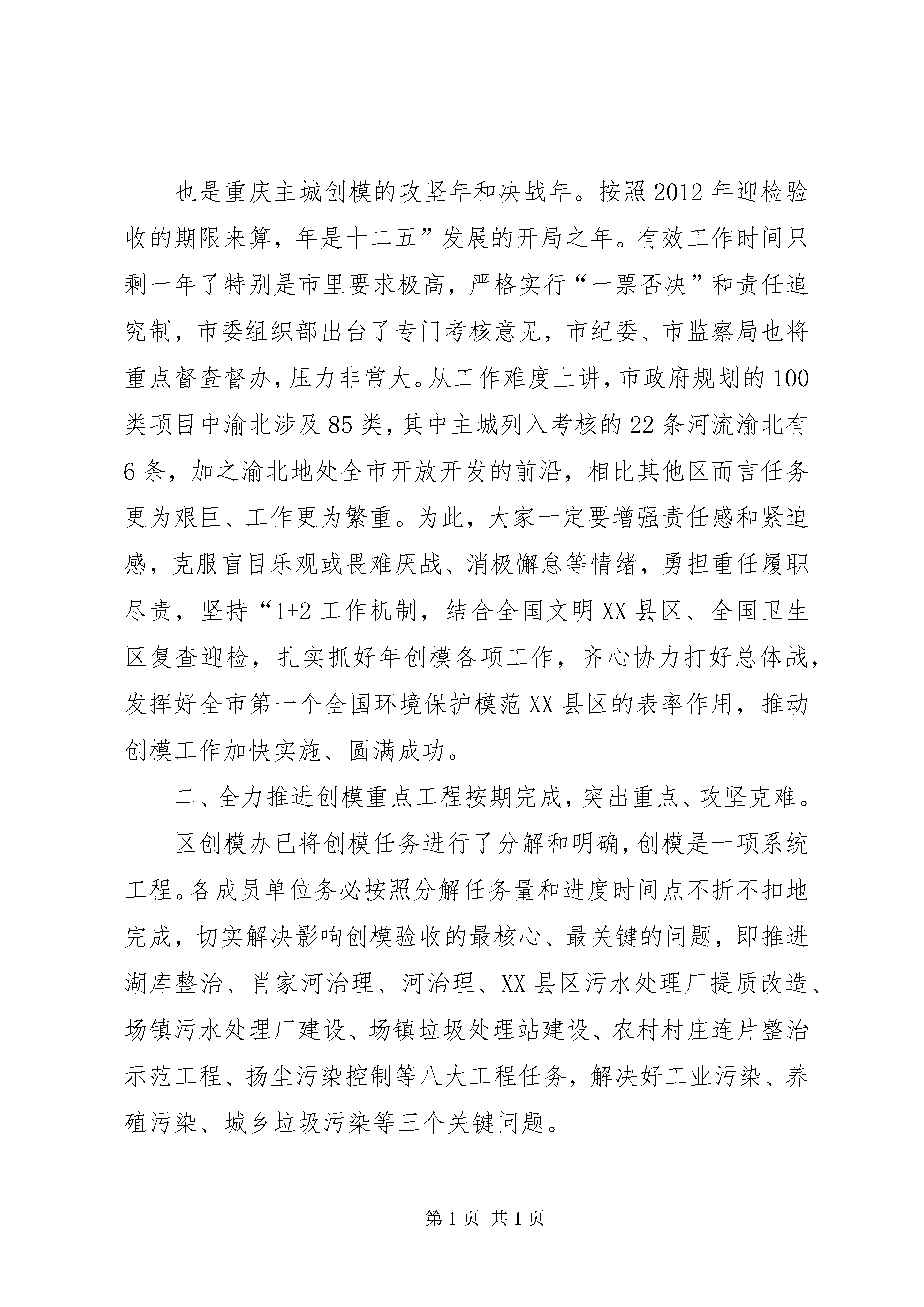 区长城市创模座谈上讲话一项功在当代、惠及千秋的德政工程,同志们创建全国环境保护模范城市。也是一项提升环境、助推开放的发展工程。各级各部门务必按照全市统一部署,全力投入“创模”工作,促进生产、生活、生态“三统一”推动经济、社会、环境同发展,为成功创建全国环境保护模范城市做出积极贡献。研究部署年我区创模工作。刚才,今天会议的主要任务是贯彻落实3月17日市创模领导小组第二次工作调度会议精神。区创模办总结布置了年度工作,几个成员单位也作了很好的发言。为扎实做好年创模工作,下面我再讲三点意见。一、找准差距,正视问题。切实增强创模工作责任感和紧迫感区委区政府坚持将改善环境质量、提升宜居水平作为落实科学发展观的重要内容,年。把创模作为优化经济社会发展的重要手段,以环保“四大行动”和总量减排为抓手,以加强环境污染防治为重点,着力解决影响可持续发展和损害群众环境权益的突出问题,全区治污设施配套更加完备,总量减排任务超额完成,社会环保意识普遍增强,辖区环境质量和环保能力大幅提升。特别值得肯定的年市下达我区8大系列创模工程任务,涉及43个类别、185个小项,按期推进并全面完成177项、占95.7%有8项因两江XX县区建设规划、农业园区拓展区建设影响暂停实施并得到市创模办认可)全市党政一把手环保实绩考核中,区获得创模任务完成情况和环保公众调查满意率两项主城第一,实绩考核总成绩全市第一。这些成绩的取得,各级各部门辛勤工作的结果,全区人民共同努力的结果,藉此,代表区创模领导小组表示诚挚的谢意。也要清醒地认识到当前创模工作中存在问题。一是环境污染问题依然突出。刚才,肯定成绩的同时。区环保局给大家展示了一些图片,反映出个别地方和部分领域的污染问题还非常严重,如XX县区还有一大批生活污水排污口没有实现截流,农村场镇周边基本上都有污染,特别是生活垃圾污染较重等,与创建国家环境保护模范城市的要求相去甚远。二是群众反映的热点、难点问题尚未根本解决。近两年来,区扎实推进“六大渝北”建设,开展了一系列城市环境综合整治,城市形象和环境质量明显改善,但如噪声、餐饮油烟扰民等群众反映的一些突出环境问题还没有得到有效解决。三是工业污染还未得到有效治理。区还有相当一部分企业污染治理没有完全落实到位,治污设施不能实现稳定达标排放,各镇街都存在污染大的小企业、小作坊。四是次级河流问题较多。尤其是肖家河污染治理有较大难度,河综合治理还需加大力度。五是重点工程整体推进速度慢。甚至一部分重点工程的业主单位尚未开展深入研究,没有形成具体方案,还停留在前期工作的初级阶段。也是重庆主城创模的攻坚年和决战年。按照2012年迎检验收的期限来算,年是十二五”发展的开局之年。有效工作时间只剩一年了特别是市里要求极高,严格实行“一票否决”和责任追究制,市委组织部出台了专门考核意见,市纪委、市监察局也将重点督查督办,压力非常大。从工作难度上讲,市政府规划的100类项目中渝北涉及85类,其中主城列入考核的22条河流渝北有6条,加之渝北地处全市开放开发的前沿,相比其他区而言任务更为艰巨、工作更为繁重。为此,大家一定要增强责任感和紧迫感,克服盲目乐观或畏难厌战、消极懈怠等情绪,勇担重任履职尽责,坚持“1+2工作机制,结合全国文明XX县区、全国卫生区复查迎检,扎实抓好年创模各项工作,齐心协力打好总体战,发挥好全市第一个全国环境保护模范XX县区的表率作用,推动创模工作加快实施、圆满成功。二、全力推进创模重点工程按期完成,突出重点、攻坚克难。区创模办已将创模任务进行了分解和明确,创模是一项系统工程。各成员单位务必按照分解任务量和进度时间点不折不扣地完成,切实解决影响创模验收的最核心、最关键的问题,即推进湖库整治、肖家河治理、河治理、XX县区污水处理厂提质改造、场镇污水处理厂建设、场镇垃圾处理站建设、农村村庄连片整治示范工程、扬尘污染控制等八大工程任务,解决好工业污染、养殖污染、城乡垃圾污染等三个关键问题。一)快速推进次级河流综合整治。六河七湖(库)综合整治。其他河流、湖库去年就已经制定了方案,成立了机构,明确了各项工程的实施业主,指挥部及各责任单位要倒排工期、顺赶进度,区环保局、区水利局全面介入,确保严格按照规定时间完成任务,其中盘溪河下游段、河等清淤,第二个生态湿地污水处理站、石坪场生态湿地污水处理站及垃圾收运系统等重点工程和宝圣湖、木鱼石水库、双龙湖等XX县区湖库综合整治必须在今年6月底前完成,并全部达到水体功能要求,绝不能拖全市创模的后腿。台商工业园、农业园区要各负其责,于今年7月底前完成辖区内散状污水排污口的截流工作、年底前基本完成管网建设,尽快消除肖家河黑臭问题。水环境整治指挥部及港投公司要加快推进河治理,基本实现河水质稳定达标。二)动工的不能停工,加快建设场镇污水处理厂和垃圾处理设