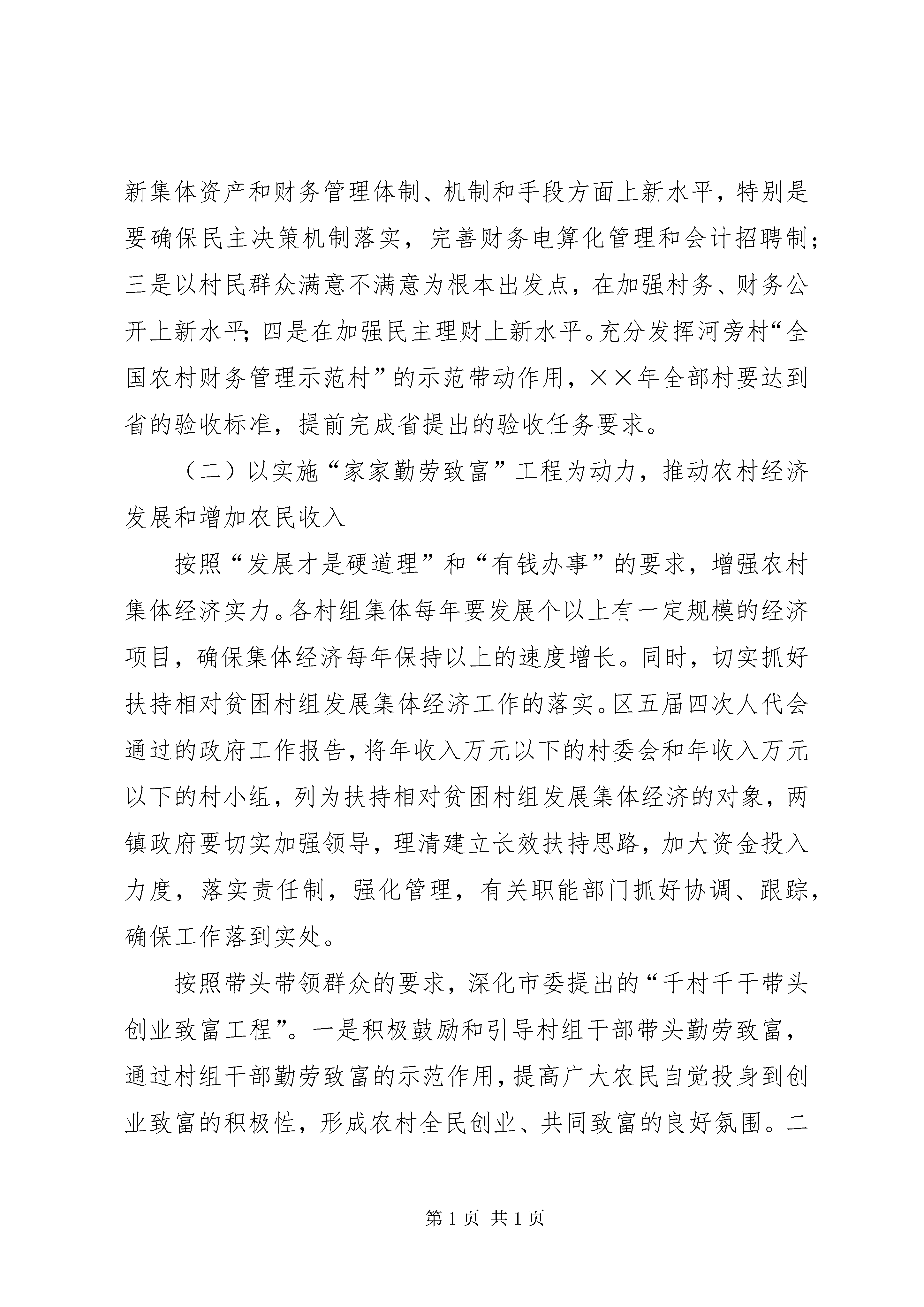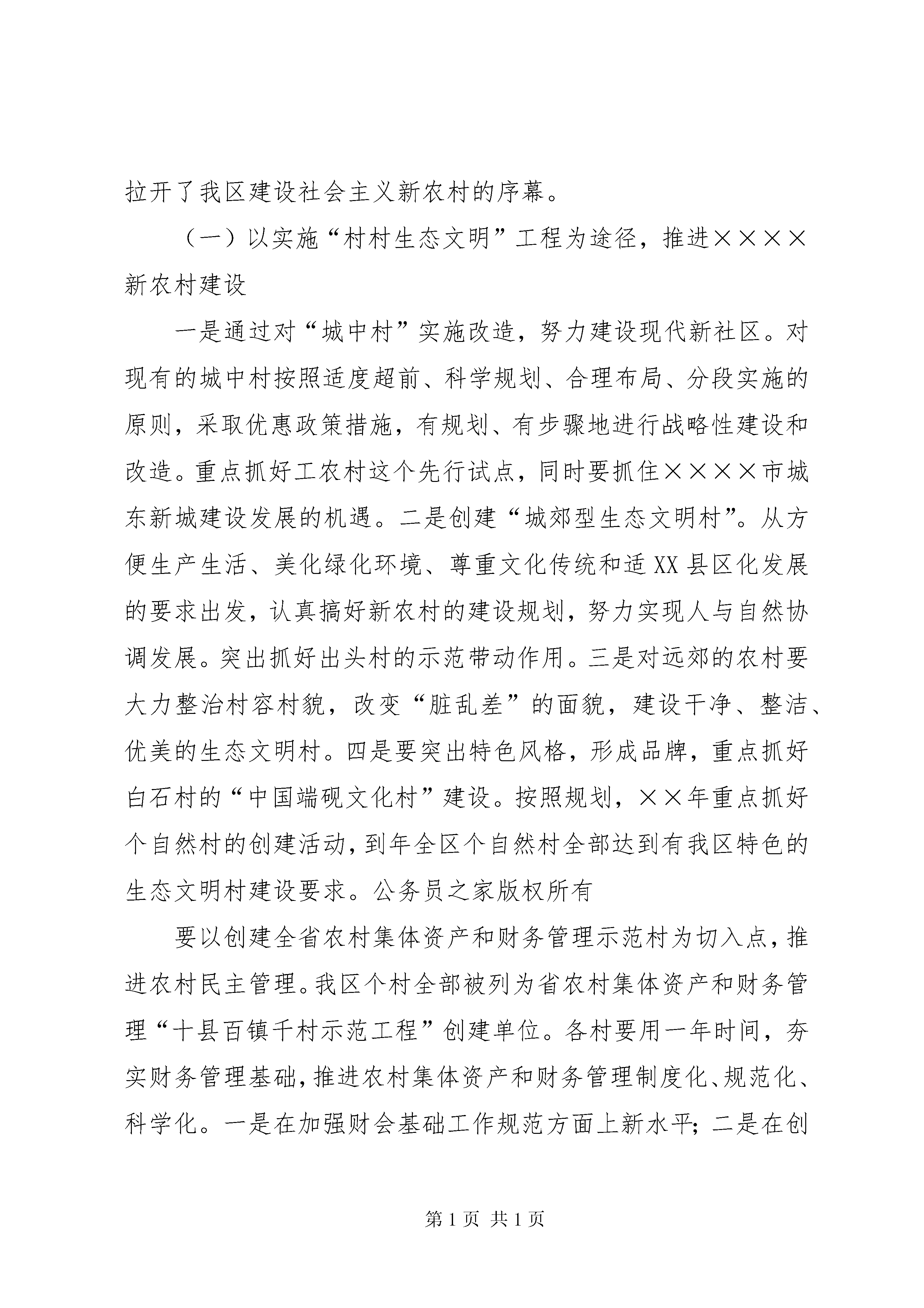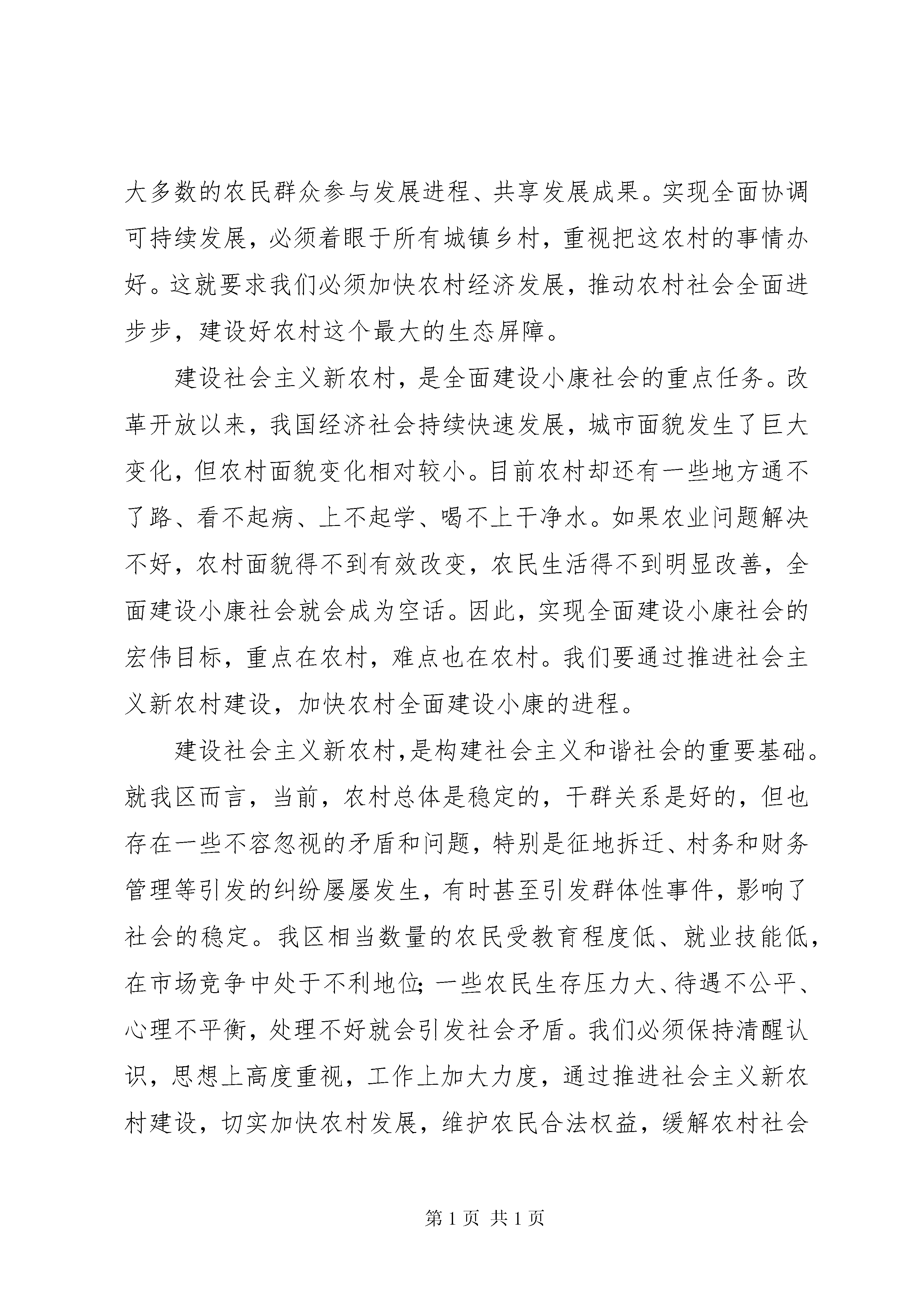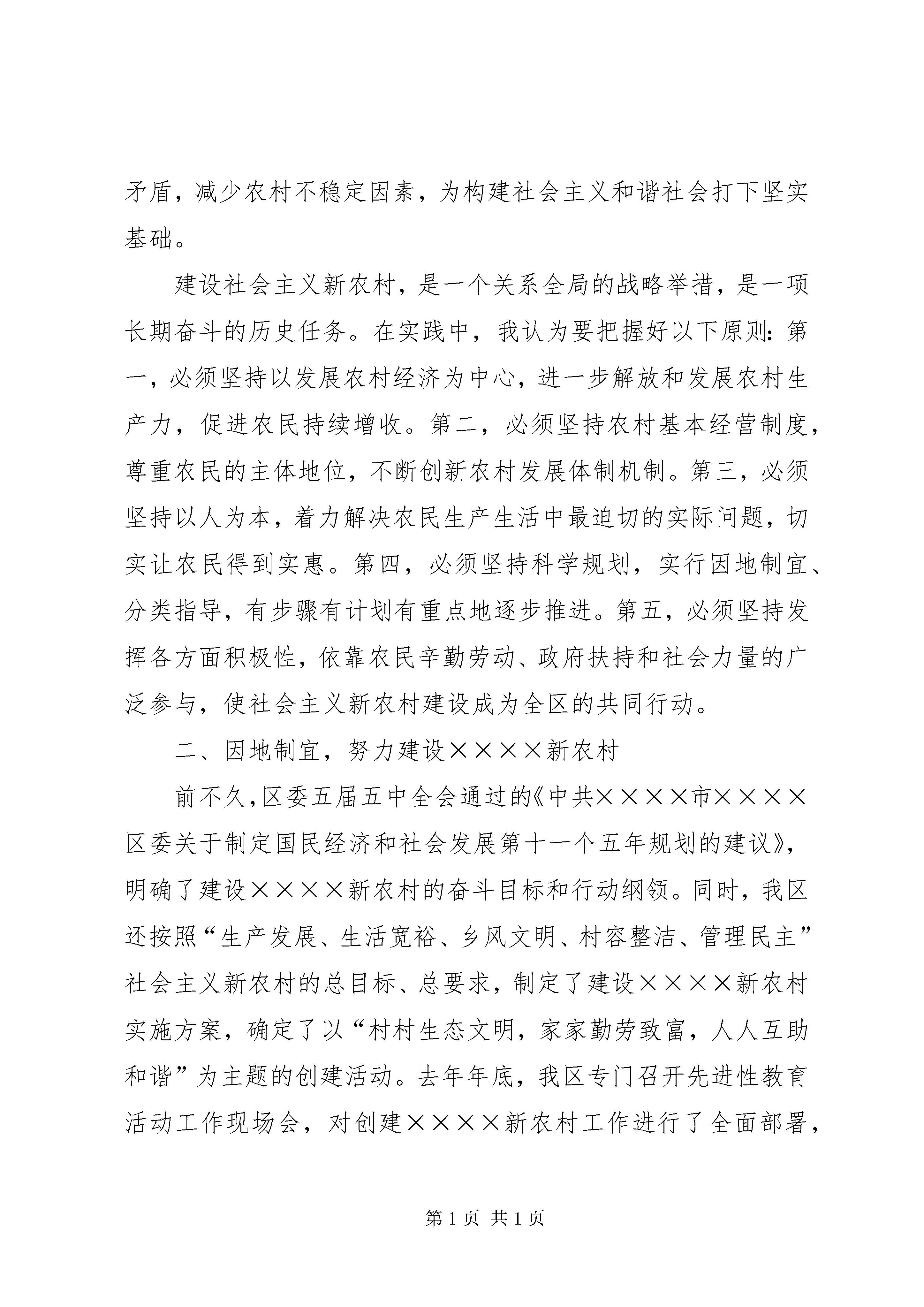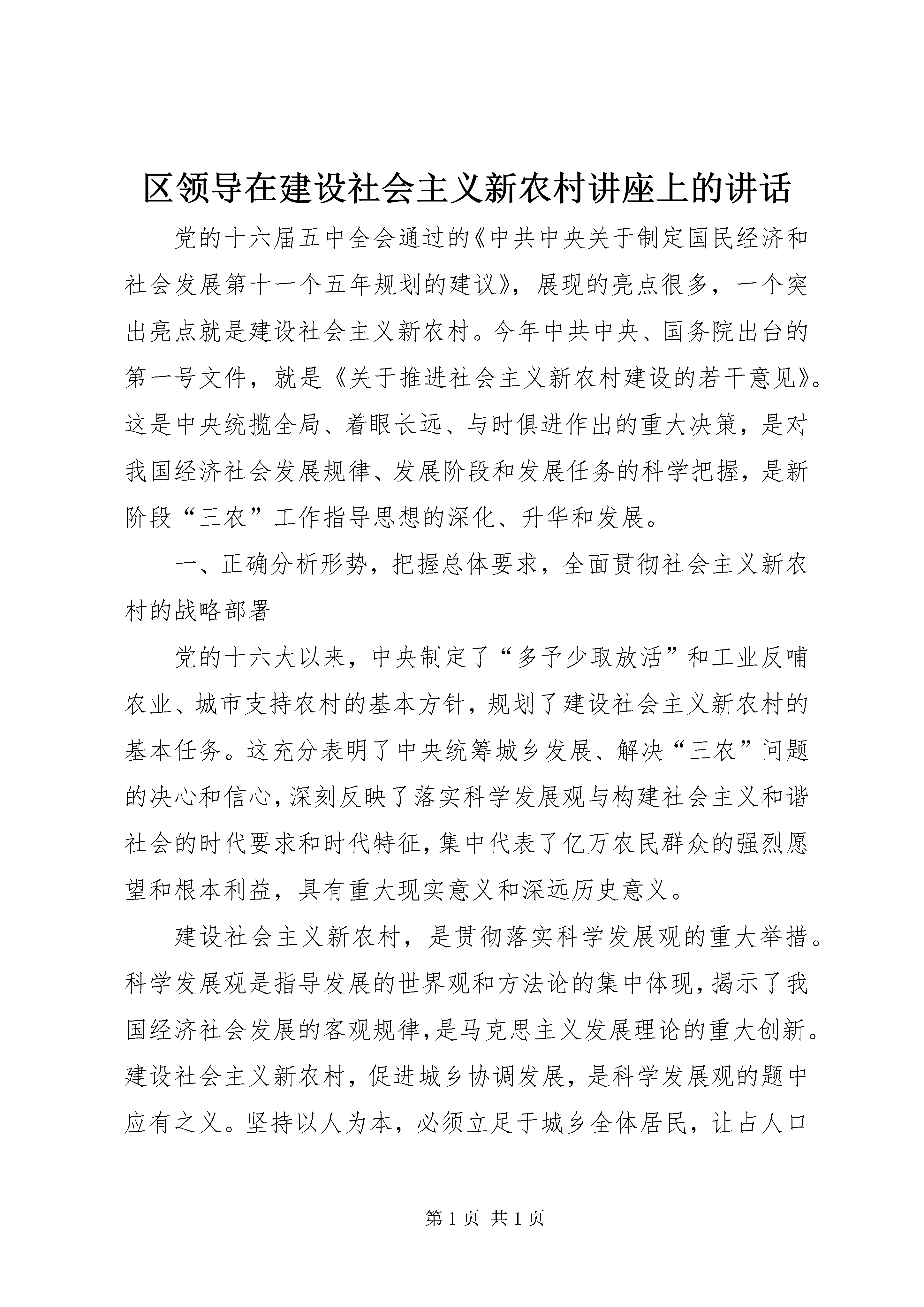 区领导在建设社会主义新农村讲座上的讲话党的十六届五中全会通过的《中共中央关于制定国民经济和社会发展第十一个五年规划的建议》,展现的亮点很多,一个突出亮点就是建设社会主义新农村。今年中共中央、国务院出台的第一号文件,就是《关于推进社会主义新农村建设的若干意见》。这是中央统揽全局、着眼长远、与时俱进作出的重大决策,是对我国经济社会发展规律、发展阶段和发展任务的科学把握,是新阶段“三农”工作指导思想的深化、升华和发展。一、正确分析形势,把握总体要求,全面贯彻社会主义新农村的战略部署党的十六大以来,中央制定了“多予少取放活”和工业反哺农业、城市支持农村的基本方针,规划了建设社会主义新农村的基本任务。这充分表明了中央统筹城乡发展、解决“三农”问题的决心和信心,深刻反映了落实科学发展观与构建社会主义和谐社会的时代要求和时代特征,集中代表了亿万农民群众的强烈愿望和根本利益,具有重大现实意义和深远历史意义。建设社会主义新农村,是贯彻落实科学发展观的重大举措。科学发展观是指导发展的世界观和方法论的集中体现,揭示了我国经济社会发展的客观规律,是马克思主义发展理论的重大创新。建设社会主义新农村,促进城乡协调发展,是科学发展观的题中应有之义。坚持以人为本,必须立足于城乡全体居民,让占人口大多数的农民群众参与发展进程、共享发展成果。实现全面协调可持续发展,必须着眼于所有城镇乡村,重视把这农村的事情办好。这就要求我们必须加快农村经济发展,推动农村社会全面进步步,建设好农村这个最大的生态屏障。建设社会主义新农村,是全面建设小康社会的重点任务。改革开放以来,我国经济社会持续快速发展,城市面貌发生了巨大变化,但农村面貌变化相对较小。目前农村却还有一些地方通不了路、看不起病、上不起学、喝不上干净水。如果农业问题解决不好,农村面貌得不到有效改变,农民生活得不到明显改善,全面建设小康社会就会成为空话。因此,实现全面建设小康社会的宏伟目标,重点在农村,难点也在农村。我们要通过推进社会主义新农村建设,加快农村全面建设小康的进程。建设社会主义新农村,是构建社会主义和谐社会的重要基础。就我区而言,当前,农村总体是稳定的,干群关系是好的,但也存在一些不容忽视的矛盾和问题,特别是征地拆迁、村务和财务管理等引发的纠纷屡屡发生,有时甚至引发群体性事件,影响了社会的稳定。我区相当数量的农民受教育程度低、就业技能低,在市场竞争中处于不利地位;一些农民生存压力大、待遇不公平、心理不平衡,处理不好就会引发社会矛盾。我们必须保持清醒认识,思想上高度重视,工作上加大力度,通过推进社会主义新农村建设,切实加快农村发展,维护农民合法权益,缓解农村社会矛盾,减少农村不稳定因素,为构建社会主义和谐社会打下坚实基础。建设社会主义新农村,是一个关系全局的战略举措,是一项长期奋斗的历史任务。在实践中,我认为要把握好以下原则:第一,必须坚持以发展农村经济为中心,进一步解放和发展农村生产力,促进农民持续增收。第二,必须坚持农村基本经营制度,尊重农民的主体地位,不断创新农村发展体制机制。第三,必须坚持以人为本,着力解决农民生产生活中最迫切的实际问题,切实让农民得到实惠。第四,必须坚持科学规划,实行因地制宜、分类指导,有步骤有计划有重点地逐步推进。第五,必须坚持发挥各方面积极性,依靠农民辛勤劳动、政府扶持和社会力量的广泛参与,使社会主义新农村建设成为全区的共同行动。二、因地制宜,努力建设××××新农村前不久,区委五届五中全会通过的《中共××××市××××区委关于制定国民经济和社会发展第十一个五年规划的建议》,明确了建设××××新农村的奋斗目标和行动纲领。同时,我区还按照“生产发展、生活宽裕、乡风文明、村容整洁、管理民主”社会主义新农村的总目标、总要求,制定了建设××××新农村实施方案,确定了以“村村生态文明,家家勤劳致富,人人互助和谐”为主题的创建活动。去年年底,我区专门召开先进性教育活动工作现场会,对创建××××新农村工作进行了全面部署,拉开了我区建设社会主义新农村的序幕。(一)以实施“村村生态文明”工程为途径,推进××××新农村建设一是通过对“城中村”实施改造,努力建设现代新社区。对现有的城中村按照适度超前、科学规划、合理布局、分段实施的原则,采取优惠政策措施,有规划、有步骤地进行战略性建设和改造。重点抓好工农村这个先行试点,同时要抓住××××市城东新城建设发展的机遇。二是创建“城郊型生态文明村”。从方便生产生活、美化绿化环境、尊重文化传统和适XX县区化发展的要求出发,认真搞好新农村的建设规划,努力实现人与自然协调发展。突出抓好出头村的示范带动作用。三是对远郊的农村要大力整治村容村貌,改变“脏乱差”的面貌,建设干净、整洁、优美的生态文明村。四是要突出特色风格,形成品牌,重点抓好白石村的