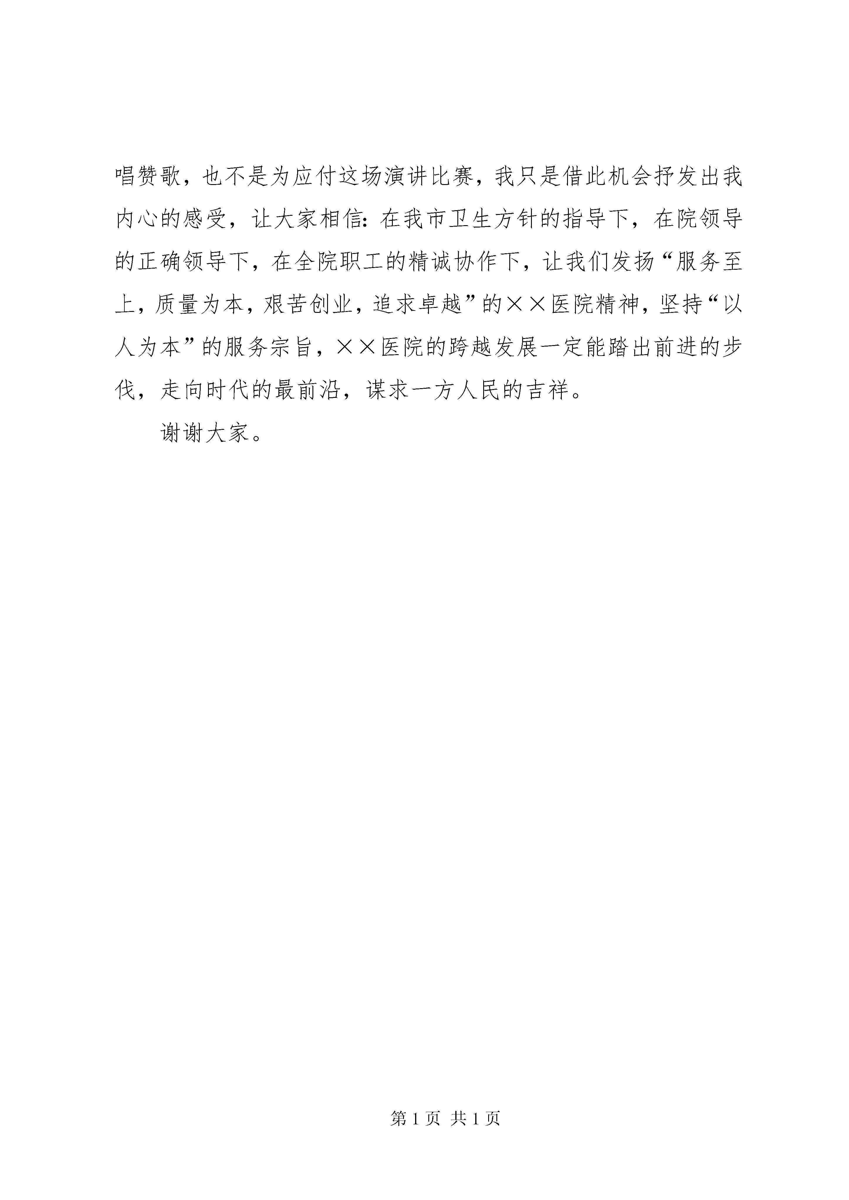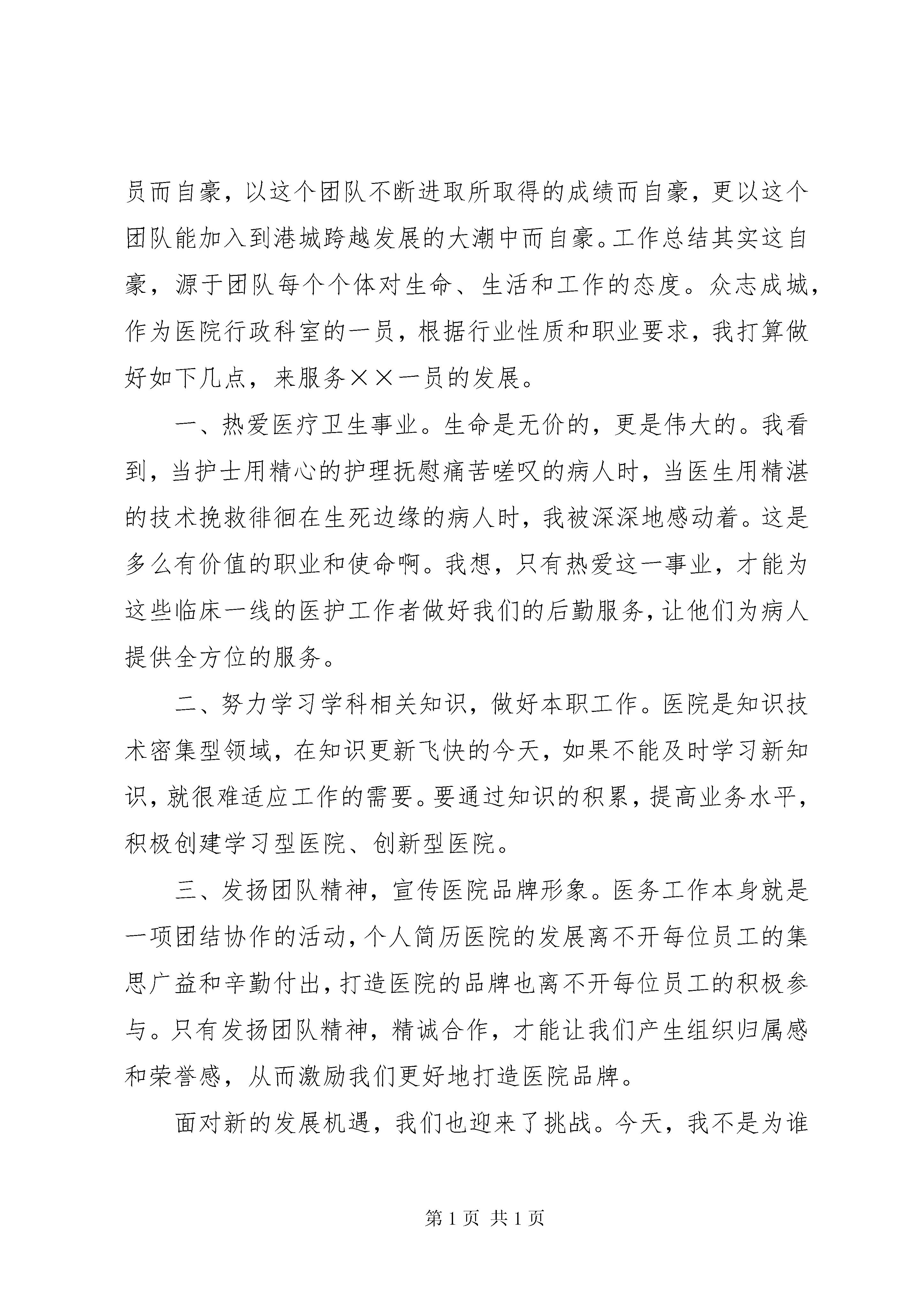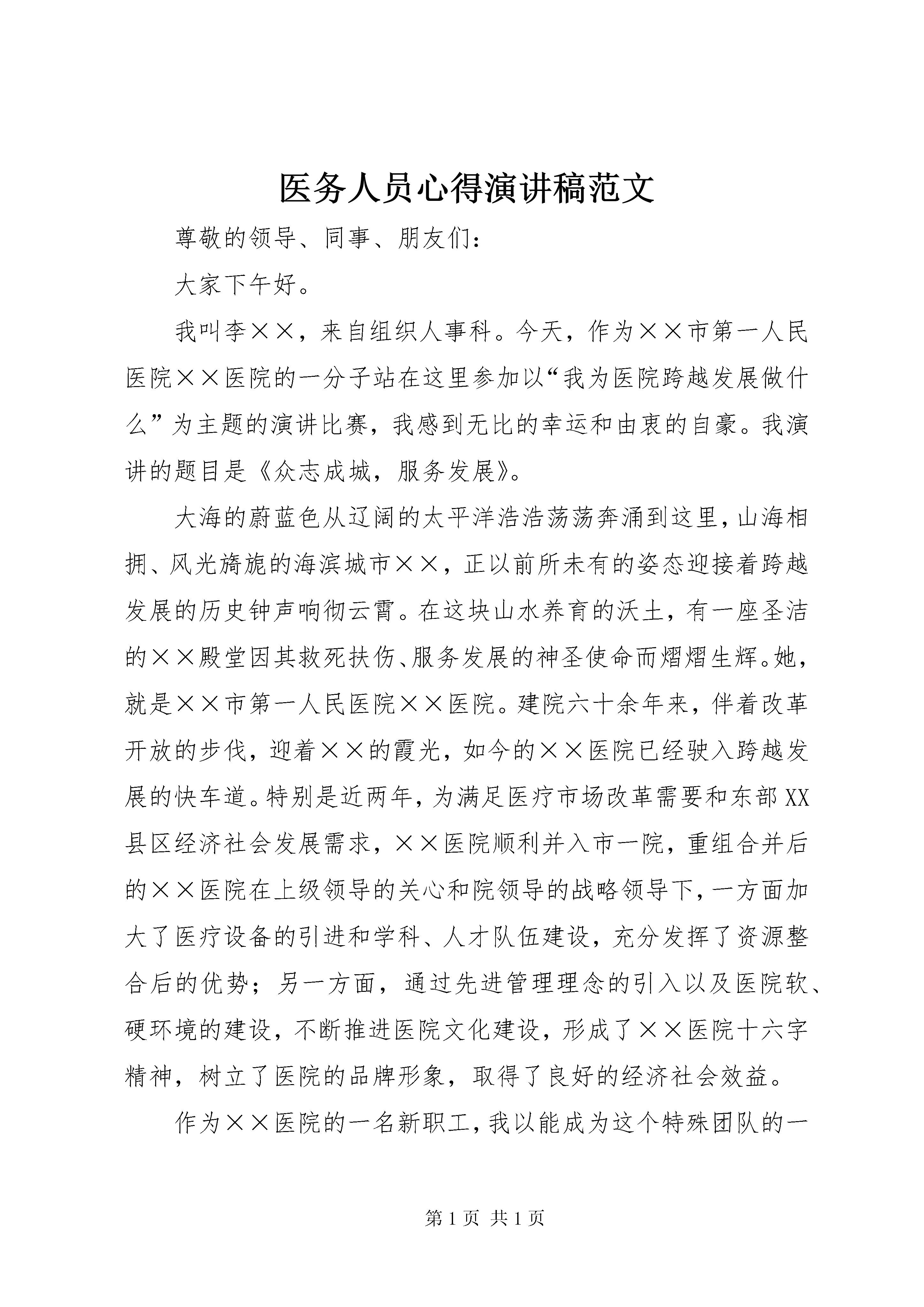 医务人员心得演讲稿范文尊敬的领导、同事、朋友们:大家下午好。我叫李××,来自组织人事科。今天,作为××市第一人民医院××医院的一分子站在这里参加以“我为医院跨越发展做什么”为主题的演讲比赛,我感到无比的幸运和由衷的自豪。我演讲的题目是《众志成城,服务发展》。大海的蔚蓝色从辽阔的太平洋浩浩荡荡奔涌到这里,山海相拥、风光旖旎的海滨城市××,正以前所未有的姿态迎接着跨越发展的历史钟声响彻云霄。在这块山水养育的沃土,有一座圣洁的××殿堂因其救死扶伤、服务发展的神圣使命而熠熠生辉。她,就是××市第一人民医院××医院。建院六十余年来,伴着改革开放的步伐,迎着××的霞光,如今的××医院已经驶入跨越发展的快车道。特别是近两年,为满足医疗市场改革需要和东部XX县区经济社会发展需求,××医院顺利并入市一院,重组合并后的××医院在上级领导的关心和院领导的战略领导下,一方面加大了医疗设备的引进和学科、人才队伍建设,充分发挥了资源整合后的优势;另一方面,通过先进管理理念的引入以及医院软、硬环境的建设,不断推进医院文化建设,形成了××医院十六字精神,树立了医院的品牌形象,取得了良好的经济社会效益。作为××医院的一名新职工,我以能成为这个特殊团队的一员而自豪,以这个团队不断进取所取得的成绩而自豪,更以这个团队能加入到港城跨越发展的大潮中而自豪。工作总结其实这自豪,源于团队每个个体对生命、生活和工作的态度。众志成城,作为医院行政科室的一员,根据行业性质和职业要求,我打算做好如下几点,来服务××一员的发展。一、热爱医疗卫生事业。生命是无价的,更是伟大的。我看到,当护士用精心的护理抚慰痛苦嗟叹的病人时,当医生用精湛的技术挽救徘徊在生死边缘的病人时,我被深深地感动着。这是多么有价值的职业和使命啊。我想,只有热爱这一事业,才能为这些临床一线的医护工作者做好我们的后勤服务,让他们为病人提供全方位的服务。二、努力学习学科相关知识,做好本职工作。医院是知识技术密集型领域,在知识更新飞快的今天,如果不能及时学习新知识,就很难适应工作的需要。要通过知识的积累,提高业务水平,积极创建学习型医院、创新型医院。三、发扬团队精神,宣传医院品牌形象。医务工作本身就是一项团结协作的活动,个人简历医院的发展离不开每位员工的集思广益和辛勤付出,打造医院的品牌也离不开每位员工的积极参与。只有发扬团队精神,精诚合作,才能让我们产生组织归属感和荣誉感,从而激励我们更好地打造医院品牌。面对新的发展机遇,我们也迎来了挑战。今天,我不是为谁唱赞歌,也不是为应付这场演讲比赛,我只是借此机会抒发出我内心的感受,让大家相信:在我市卫生方针的指导下,在院领导的正确领导下,在全院职工的精诚协作下,让我们发扬“服务至上,质量为本,艰苦创业,追求卓越”的××医院精神,坚持“以人为本”的服务宗旨,××医院的跨越发展一定能踏出前进的步伐,走向时代的最前沿,谋求一方人民的吉祥。谢谢大家。