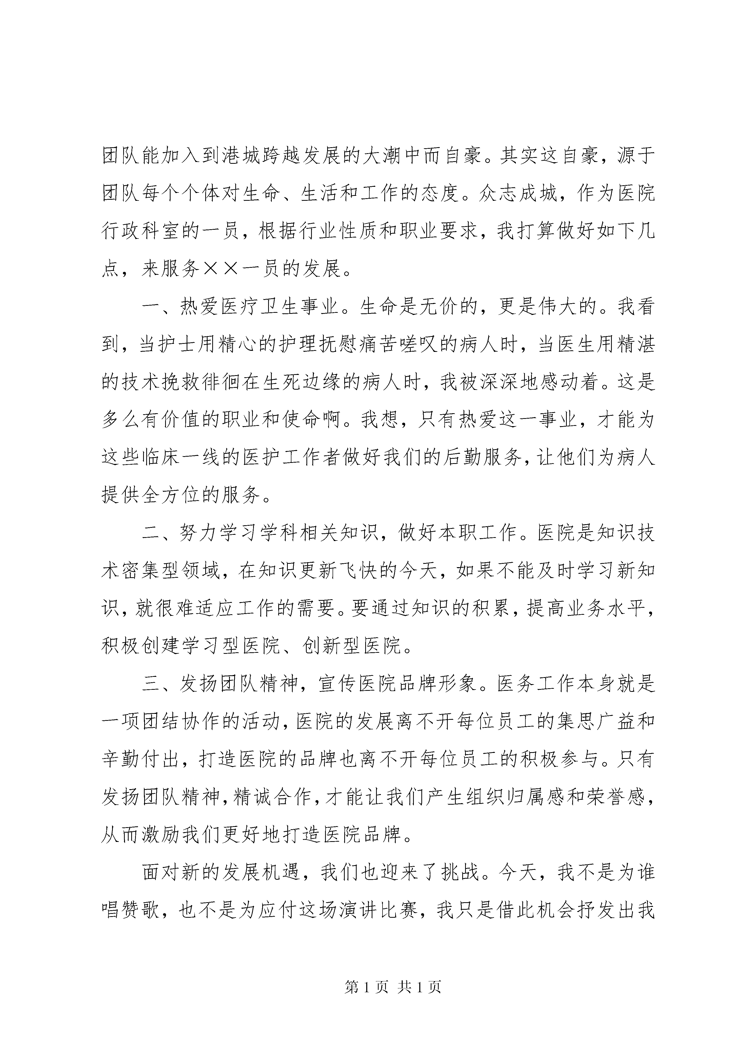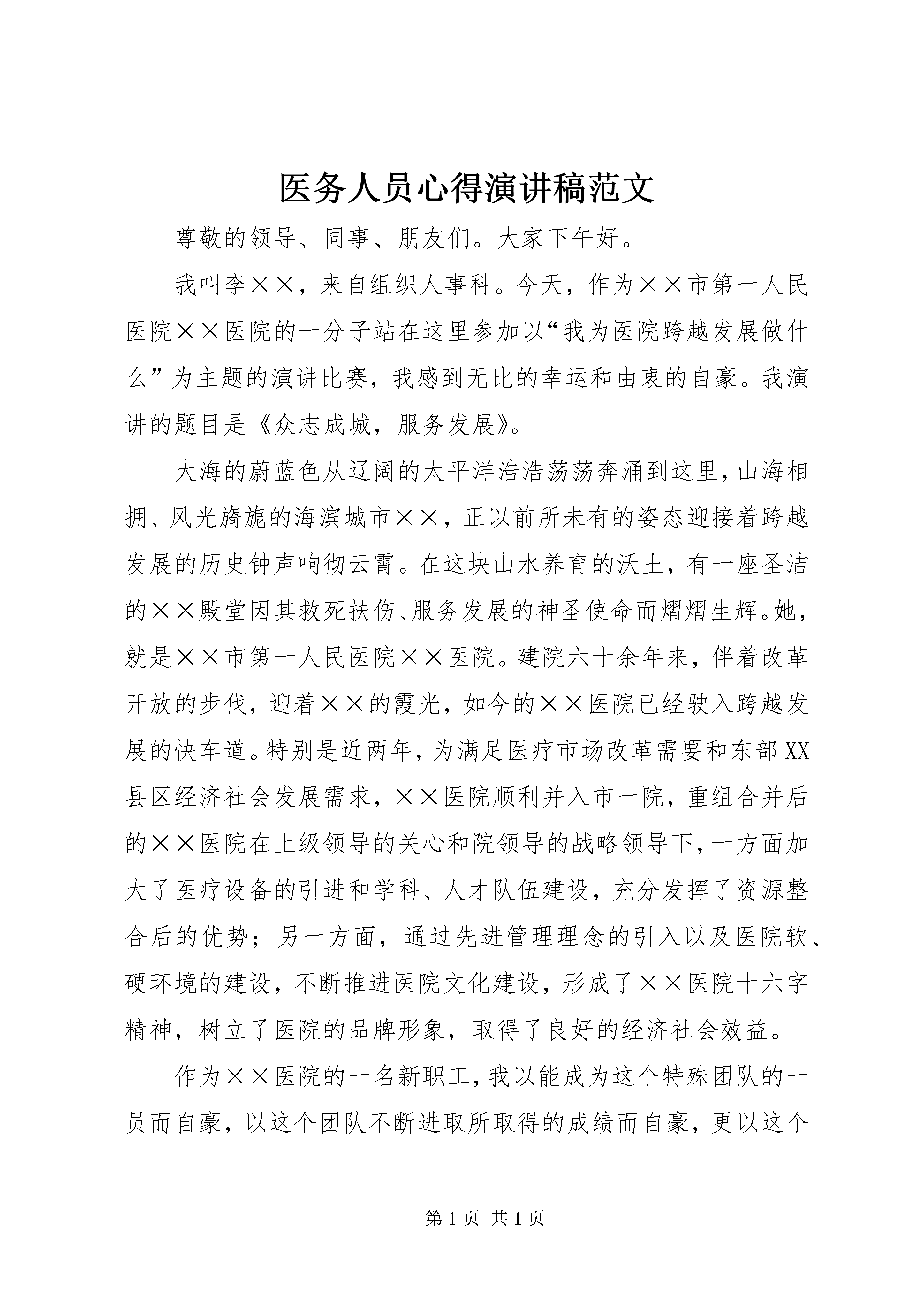 医务人员心得演讲稿范文尊敬的领导、同事、朋友们。大家下午好。我叫李××,来自组织人事科。今天,作为××市第一人民医院××医院的一分子站在这里参加以“我为医院跨越发展做什么”为主题的演讲比赛,我感到无比的幸运和由衷的自豪。我演讲的题目是《众志成城,服务发展》。大海的蔚蓝色从辽阔的太平洋浩浩荡荡奔涌到这里,山海相拥、风光旖旎的海滨城市××,正以前所未有的姿态迎接着跨越发展的历史钟声响彻云霄。在这块山水养育的沃土,有一座圣洁的××殿堂因其救死扶伤、服务发展的神圣使命而熠熠生辉。她,就是××市第一人民医院××医院。建院六十余年来,伴着改革开放的步伐,迎着××的霞光,如今的××医院已经驶入跨越发展的快车道。特别是近两年,为满足医疗市场改革需要和东部XX县区经济社会发展需求,××医院顺利并入市一院,重组合并后的××医院在上级领导的关心和院领导的战略领导下,一方面加大了医疗设备的引进和学科、人才队伍建设,充分发挥了资源整合后的优势;另一方面,通过先进管理理念的引入以及医院软、硬环境的建设,不断推进医院文化建设,形成了××医院十六字精神,树立了医院的品牌形象,取得了良好的经济社会效益。作为××医院的一名新职工,我以能成为这个特殊团队的一员而自豪,以这个团队不断进取所取得的成绩而自豪,更以这个团队能加入到港城跨越发展的大潮中而自豪。其实这自豪,源于团队每个个体对生命、生活和工作的态度。众志成城,作为医院行政科室的一员,根据行业性质和职业要求,我打算做好如下几点,来服务××一员的发展。一、热爱医疗卫生事业。生命是无价的,更是伟大的。我看到,当护士用精心的护理抚慰痛苦嗟叹的病人时,当医生用精湛的技术挽救徘徊在生死边缘的病人时,我被深深地感动着。这是多么有价值的职业和使命啊。我想,只有热爱这一事业,才能为这些临床一线的医护工作者做好我们的后勤服务,让他们为病人提供全方位的服务。二、努力学习学科相关知识,做好本职工作。医院是知识技术密集型领域,在知识更新飞快的今天,如果不能及时学习新知识,就很难适应工作的需要。要通过知识的积累,提高业务水平,积极创建学习型医院、创新型医院。三、发扬团队精神,宣传医院品牌形象。医务工作本身就是一项团结协作的活动,医院的发展离不开每位员工的集思广益和辛勤付出,打造医院的品牌也离不开每位员工的积极参与。只有发扬团队精神,精诚合作,才能让我们产生组织归属感和荣誉感,从而激励我们更好地打造医院品牌。面对新的发展机遇,我们也迎来了挑战。今天,我不是为谁唱赞歌,也不是为应付这场演讲比赛,我只是借此机会抒发出我内心的感受,让大家相信:在我市卫生方针的指导下,在院领导的正确领导下,在全院职工的精诚协作下,让我们发扬“服务至上,质量为本,艰苦创业,追求卓越”的××医院精神,坚持“以人为本”的服务宗旨,××医院的跨越发展一定能踏出前进的步伐,走向时代的最前沿,谋求一方人民的吉祥。谢谢大家。