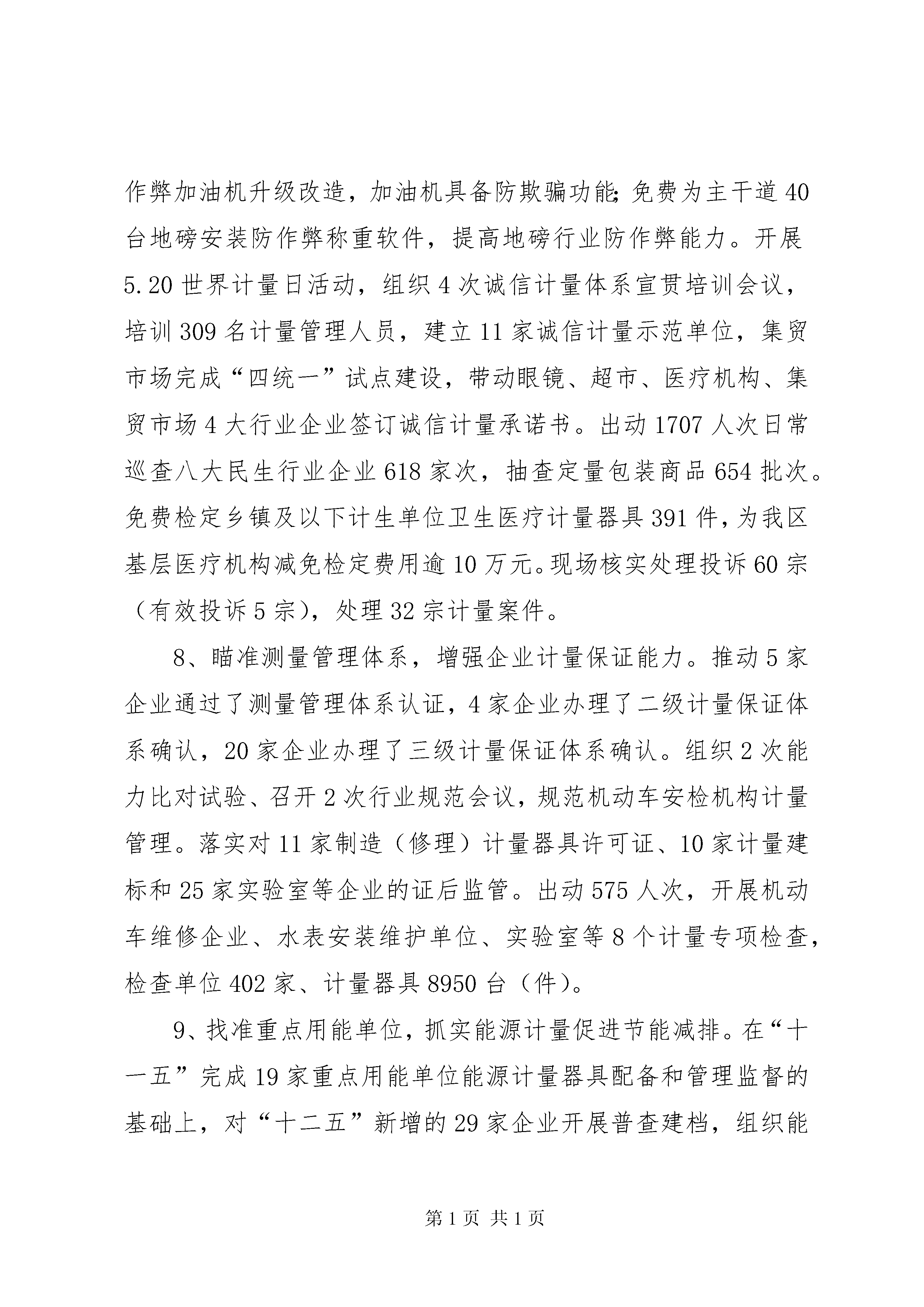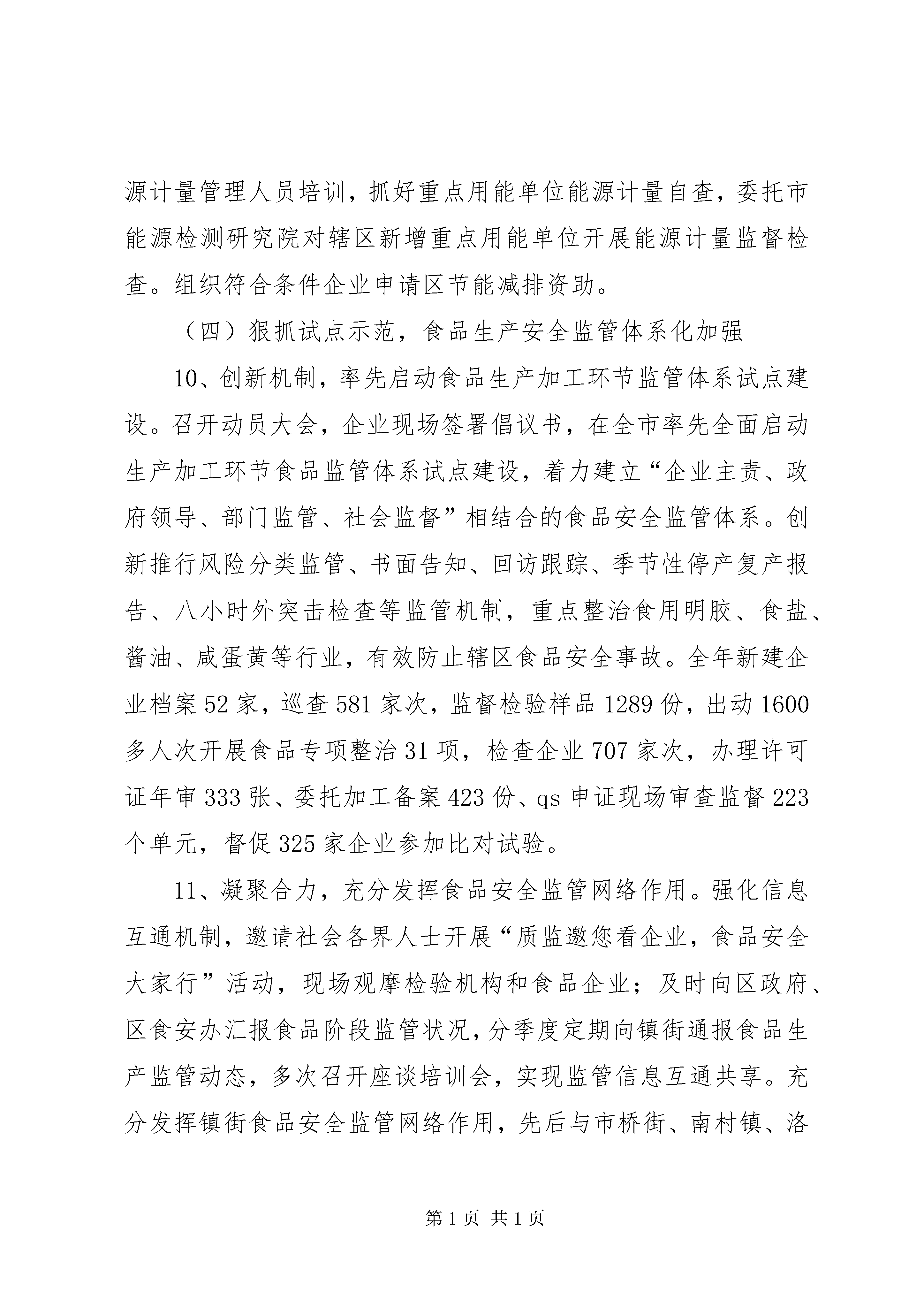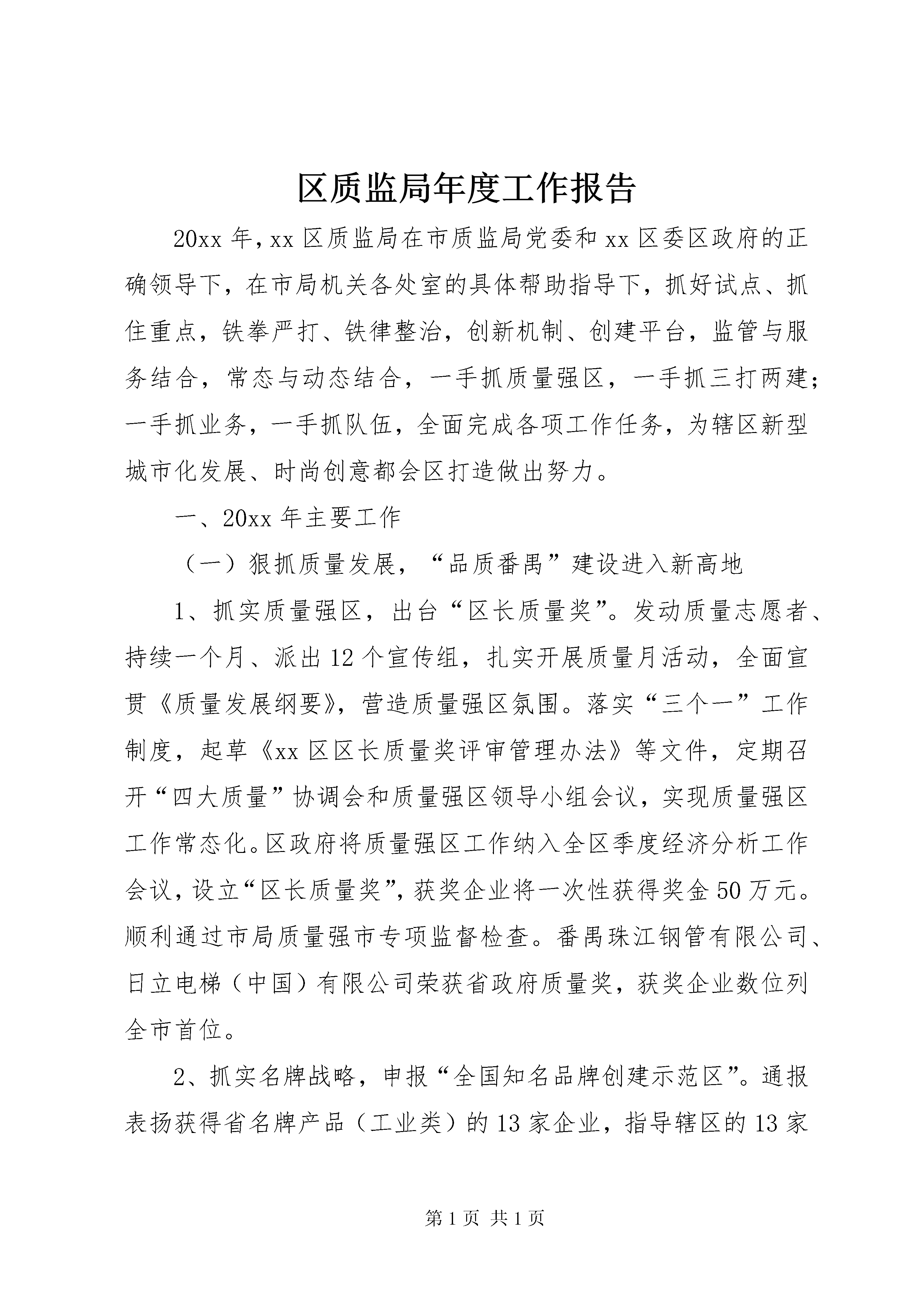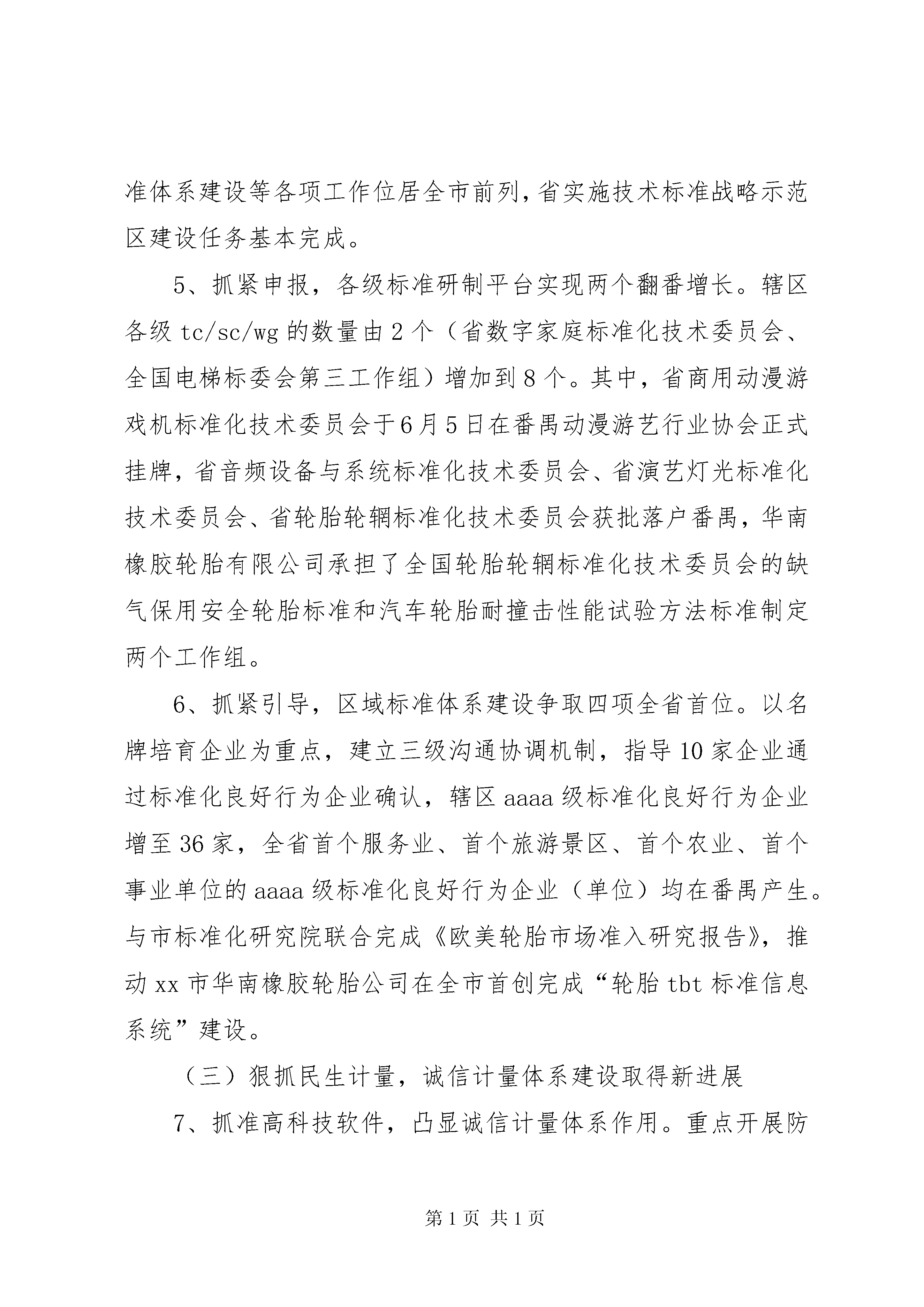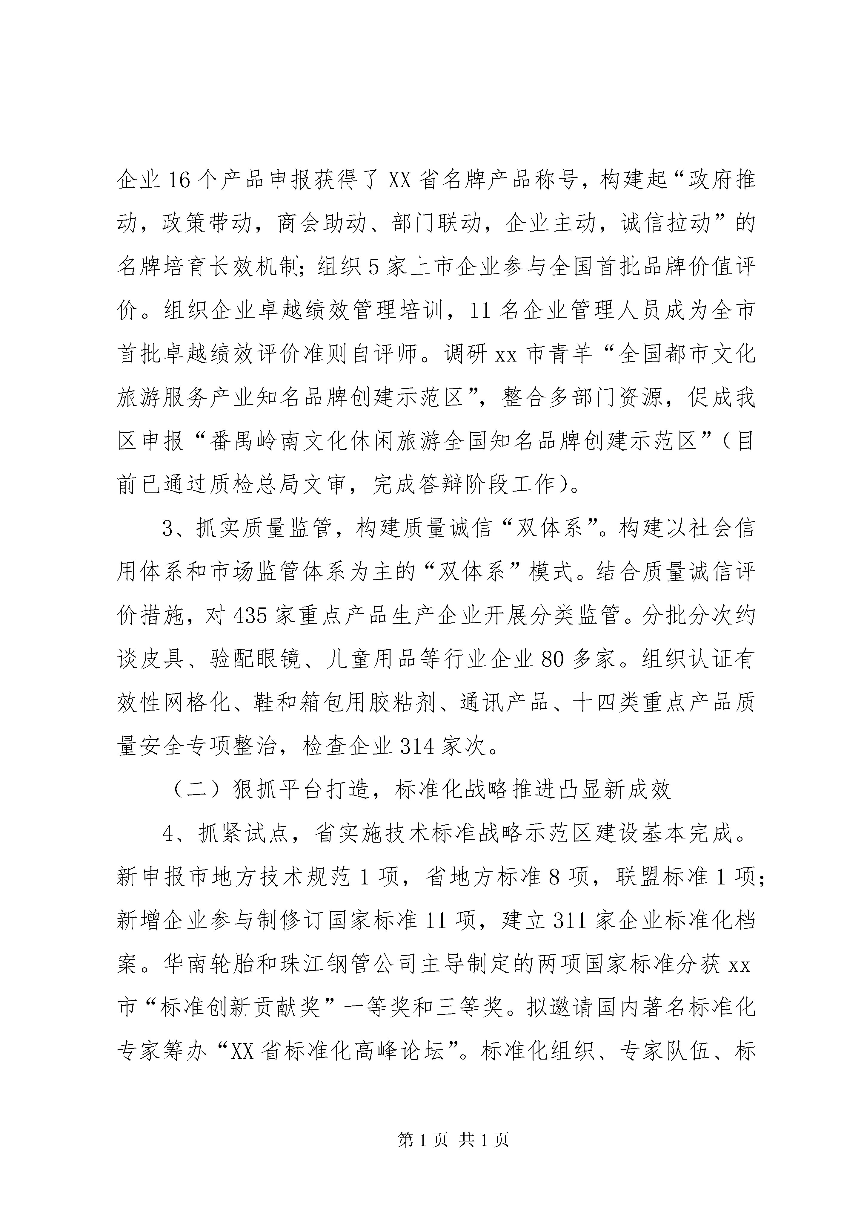 区质监局年度工作报告20xx年,xx区质监局在市质监局党委和xx区委区政府的正确领导下,在市局机关各处室的具体帮助指导下,抓好试点、抓住重点,铁拳严打、铁律整治,创新机制、创建平台,监管与服务结合,常态与动态结合,一手抓质量强区,一手抓三打两建;一手抓业务,一手抓队伍,全面完成各项工作任务,为辖区新型城市化发展、时尚创意都会区打造做出努力。一、20xx年主要工作(一)狠抓质量发展,“品质番禺”建设进入新高地1、抓实质量强区,出台“区长质量奖”。发动质量志愿者、持续一个月、派出12个宣传组,扎实开展质量月活动,全面宣贯《质量发展纲要》,营造质量强区氛围。落实“三个一”工作制度,起草《xx区区长质量奖评审管理办法》等文件,定期召开“四大质量”协调会和质量强区领导小组会议,实现质量强区工作常态化。区政府将质量强区工作纳入全区季度经济分析工作会议,设立“区长质量奖”,获奖企业将一次性获得奖金50万元。顺利通过市局质量强市专项监督检查。番禺珠江钢管有限公司、日立电梯(中国)有限公司荣获省政府质量奖,获奖企业数位列全市首位。2、抓实名牌战略,申报“全国知名品牌创建示范区”。通报表扬获得省名牌产品(工业类)的13家企业,指导辖区的13家企业16个产品申报获得了XX省名牌产品称号,构建起“政府推动,政策带动,商会助动、部门联动,企业主动,诚信拉动”的名牌培育长效机制;组织5家上市企业参与全国首批品牌价值评价。组织企业卓越绩效管理培训,11名企业管理人员成为全市首批卓越绩效评价准则自评师。调研xx市青羊“全国都市文化旅游服务产业知名品牌创建示范区”,整合多部门资源,促成我区申报“番禺岭南文化休闲旅游全国知名品牌创建示范区”(目前已通过质检总局文审,完成答辩阶段工作)。3、抓实质量监管,构建质量诚信“双体系”。构建以社会信用体系和市场监管体系为主的“双体系”模式。结合质量诚信评价措施,对435家重点产品生产企业开展分类监管。分批分次约谈皮具、验配眼镜、儿童用品等行业企业80多家。组织认证有效性网格化、鞋和箱包用胶粘剂、通讯产品、十四类重点产品质量安全专项整治,检查企业314家次。(二)狠抓平台打造,标准化战略推进凸显新成效4、抓紧试点,省实施技术标准战略示范区建设基本完成。新申报市地方技术规范1项,省地方标准8项,联盟标准1项;新增企业参与制修订国家标准11项,建立311家企业标准化档案。华南轮胎和珠江钢管公司主导制定的两项国家标准分获xx市“标准创新贡献奖”一等奖和三等奖。拟邀请国内著名标准化专家筹办“XX省标准化高峰论坛”。标准化组织、专家队伍、标准体系建设等各项工作位居全市前列,省实施技术标准战略示范区建设任务基本完成。5、抓紧申报,各级标准研制平台实现两个翻番增长。辖区各级tc/sc/wg的数量由2个(省数字家庭标准化技术委员会、全国电梯标委会第三工作组)增加到8个。其中,省商用动漫游戏机标准化技术委员会于6月5日在番禺动漫游艺行业协会正式挂牌,省音频设备与系统标准化技术委员会、省演艺灯光标准化技术委员会、省轮胎轮辋标准化技术委员会获批落户番禺,华南橡胶轮胎有限公司承担了全国轮胎轮辋标准化技术委员会的缺气保用安全轮胎标准和汽车轮胎耐撞击性能试验方法标准制定两个工作组。6、抓紧引导,区域标准体系建设争取四项全省首位。以名牌培育企业为重点,建立三级沟通协调机制,指导10家企业通过标准化良好行为企业确认,辖区aaaa级标准化良好行为企业增至36家,全省首个服务业、首个旅游景区、首个农业、首个事业单位的aaaa级标准化良好行为企业(单位)均在番禺产生。与市标准化研究院联合完成《欧美轮胎市场准入研究报告》,推动xx市华南橡胶轮胎公司在全市首创完成“轮胎tbt标准信息系统”建设。(三)狠抓民生计量,诚信计量体系建设取得新进展7、抓准高科技软件,凸显诚信计量体系作用。重点开展防作弊加油机升级改造,加油机具备防欺骗功能;免费为主干道40台地磅安装防作弊称重软件,提高地磅行业防作弊能力。开展5.20世界计量日活动,组织4次诚信计量体系宣贯培训会议,培训309名计量管理人员,建立11家诚信计量示范单位,集贸市场完成“四统一”试点建设,带动眼镜、超市、医疗机构、集贸市场4大行业企业签订诚信计量承诺书。出动1707人次日常巡查八大民生行业企业618家次,抽查定量包装商品654批次。免费检定乡镇及以下计生单位卫生医疗计量器具391件,为我区基层医疗机构减免检定费用逾10万元。现场核实处理投诉60宗(有效投诉5宗),处理32宗计量案件。8、瞄准测量管理体系,增强企业计量保证能力。推动5家企业通过了测量管理体系认证,4家企业办理了二级计量保证体系确认,20家企业办理了三级计量保证体系确认。组织2次能力比对试验、召开2次行业规范会议,规范机动车