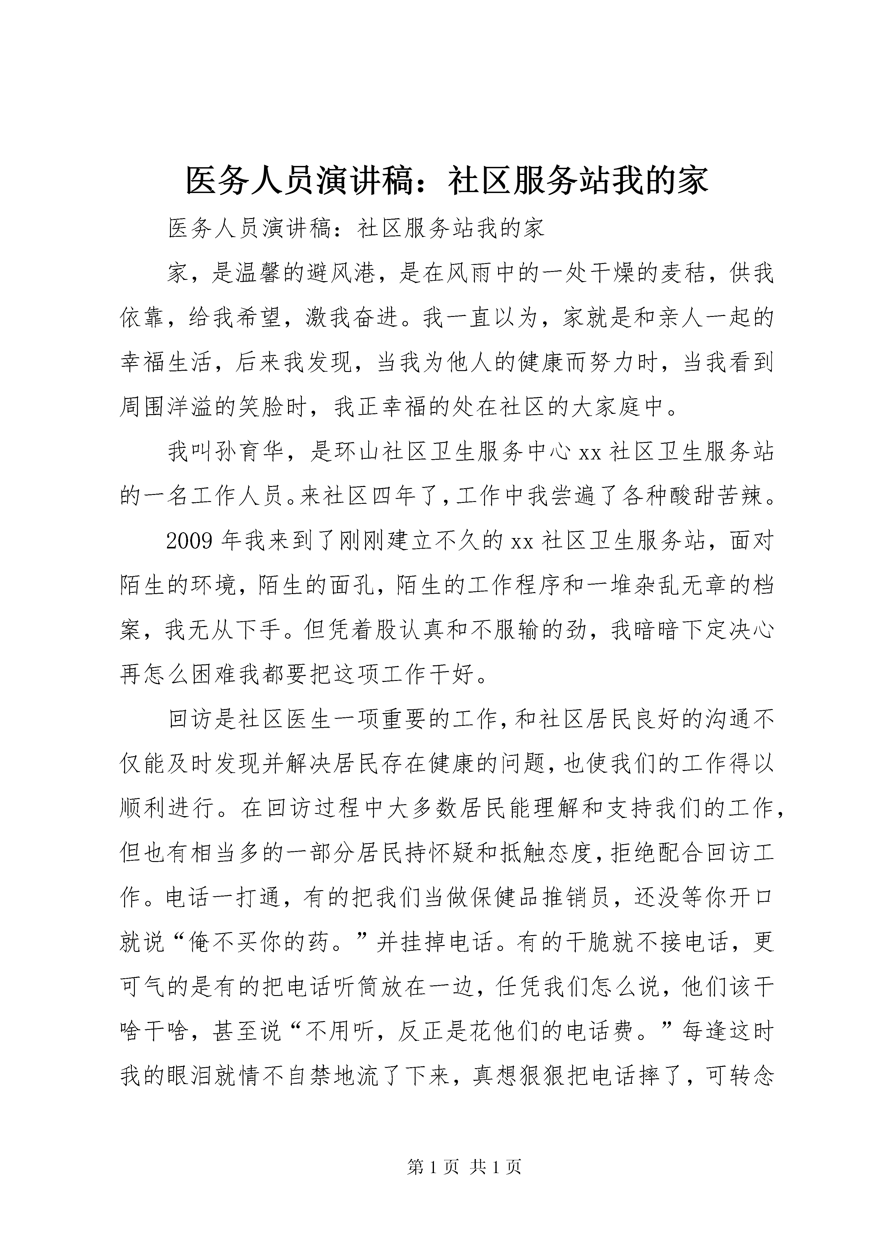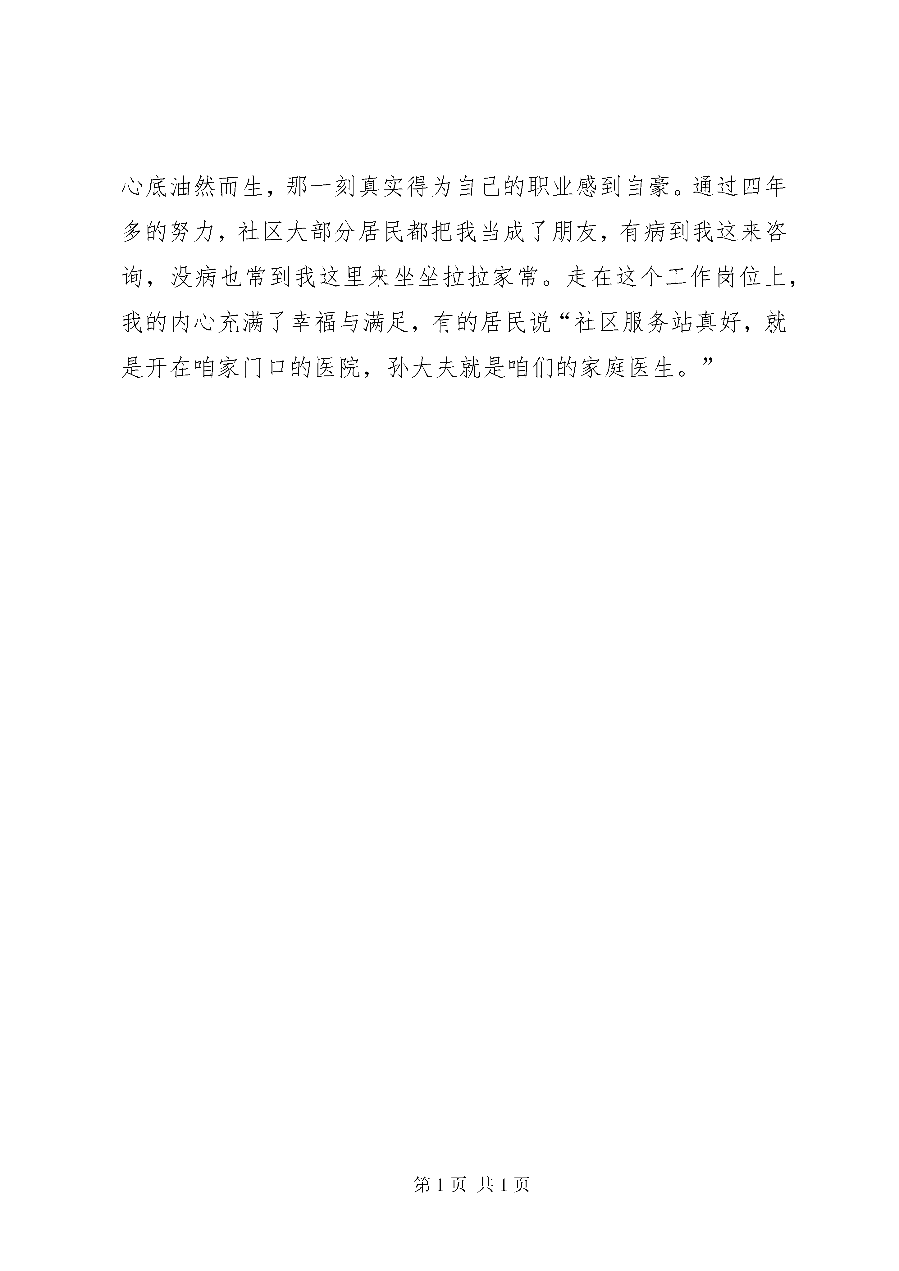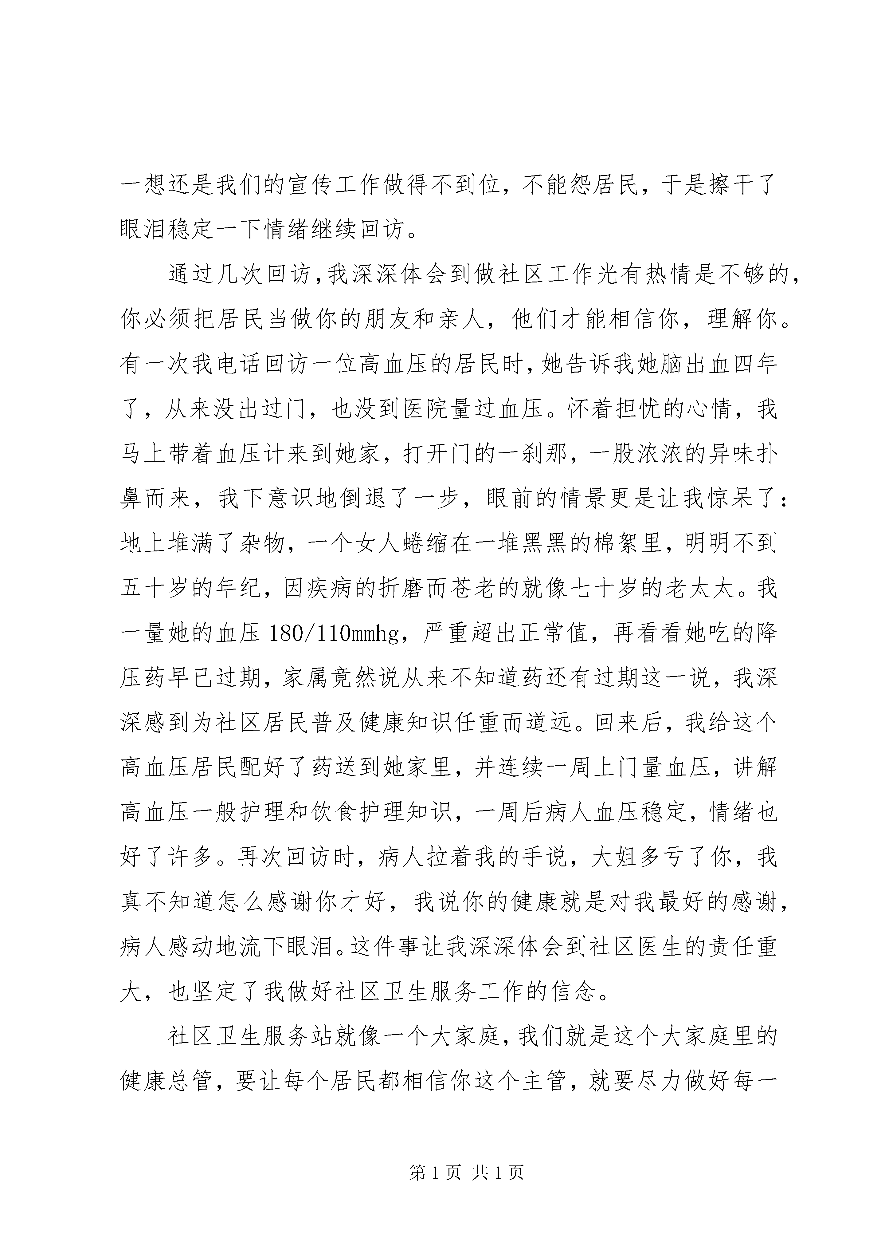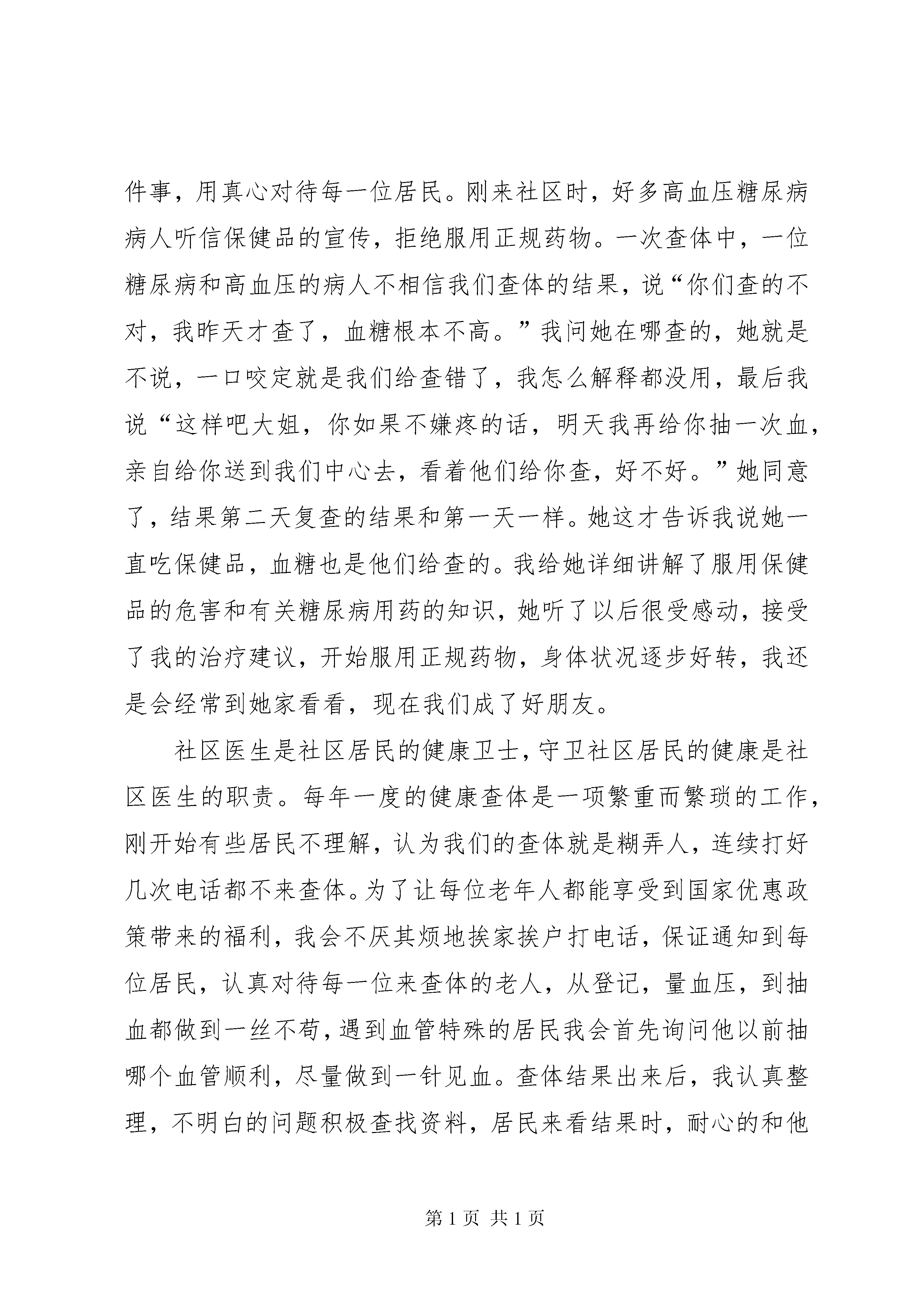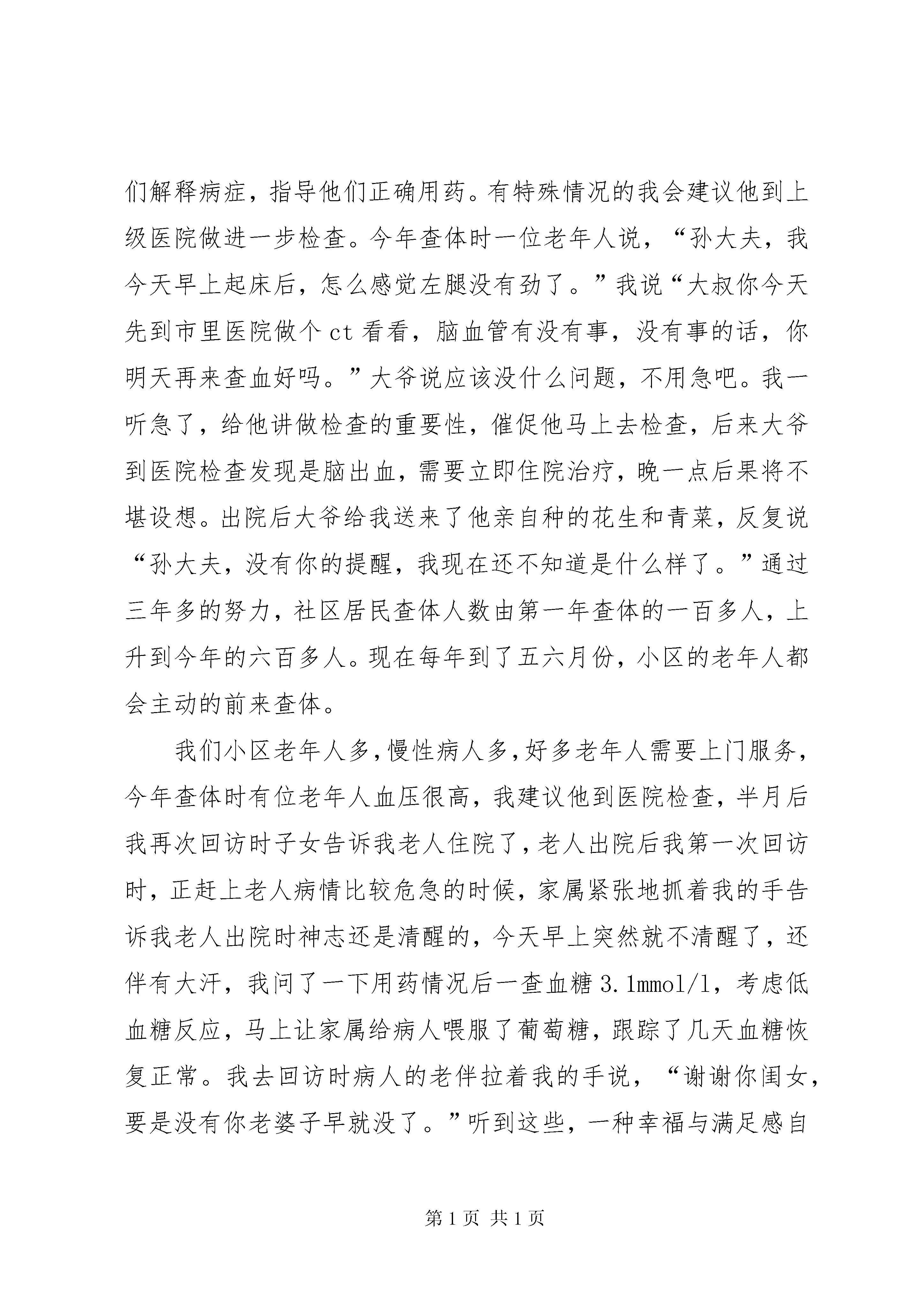 医务人员演讲稿:社区服务站我的家医务人员演讲稿:社区服务站我的家家,是温馨的避风港,是在风雨中的一处干燥的麦秸,供我依靠,给我希望,激我奋进。我一直以为,家就是和亲人一起的幸福生活,后来我发现,当我为他人的健康而努力时,当我看到周围洋溢的笑脸时,我正幸福的处在社区的大家庭中。我叫孙育华,是环山社区卫生服务中心xx社区卫生服务站的一名工作人员。来社区四年了,工作中我尝遍了各种酸甜苦辣。2009年我来到了刚刚建立不久的xx社区卫生服务站,面对陌生的环境,陌生的面孔,陌生的工作程序和一堆杂乱无章的档案,我无从下手。但凭着股认真和不服输的劲,我暗暗下定决心再怎么困难我都要把这项工作干好。回访是社区医生一项重要的工作,和社区居民良好的沟通不仅能及时发现并解决居民存在健康的问题,也使我们的工作得以顺利进行。在回访过程中大多数居民能理解和支持我们的工作,但也有相当多的一部分居民持怀疑和抵触态度,拒绝配合回访工作。电话一打通,有的把我们当做保健品推销员,还没等你开口就说“俺不买你的药。”并挂掉电话。有的干脆就不接电话,更可气的是有的把电话听筒放在一边,任凭我们怎么说,他们该干啥干啥,甚至说“不用听,反正是花他们的电话费。”每逢这时我的眼泪就情不自禁地流了下来,真想狠狠把电话摔了,可转念一想还是我们的宣传工作做得不到位,不能怨居民,于是擦干了眼泪稳定一下情绪继续回访。通过几次回访,我深深体会到做社区工作光有热情是不够的,你必须把居民当做你的朋友和亲人,他们才能相信你,理解你。有一次我电话回访一位高血压的居民时,她告诉我她脑出血四年了,从来没出过门,也没到医院量过血压。怀着担忧的心情,我马上带着血压计来到她家,打开门的一刹那,一股浓浓的异味扑鼻而来,我下意识地倒退了一步,眼前的情景更是让我惊呆了:地上堆满了杂物,一个女人蜷缩在一堆黑黑的棉絮里,明明不到五十岁的年纪,因疾病的折磨而苍老的就像七十岁的老太太。我一量她的血压180/110mmhg,严重超出正常值,再看看她吃的降压药早已过期,家属竟然说从来不知道药还有过期这一说,我深深感到为社区居民普及健康知识任重而道远。回来后,我给这个高血压居民配好了药送到她家里,并连续一周上门量血压,讲解高血压一般护理和饮食护理知识,一周后病人血压稳定,情绪也好了许多。再次回访时,病人拉着我的手说,大姐多亏了你,我真不知道怎么感谢你才好,我说你的健康就是对我最好的感谢,病人感动地流下眼泪。这件事让我深深体会到社区医生的责任重大,也坚定了我做好社区卫生服务工作的信念。社区卫生服务站就像一个大家庭,我们就是这个大家庭里的健康总管,要让每个居民都相信你这个主管,就要尽力做好每一件事,用真心对待每一位居民。刚来社区时,好多高血压糖尿病病人听信保健品的宣传,拒绝服用正规药物。一次查体中,一位糖尿病和高血压的病人不相信我们查体的结果,说“你们查的不对,我昨天才查了,血糖根本不高。”我问她在哪查的,她就是不说,一口咬定就是我们给查错了,我怎么解释都没用,最后我说“这样吧大姐,你如果不嫌疼的话,明天我再给你抽一次血,亲自给你送到我们中心去,看着他们给你查,好不好。”她同意了,结果第二天复查的结果和第一天一样。她这才告诉我说她一直吃保健品,血糖也是他们给查的。我给她详细讲解了服用保健品的危害和有关糖尿病用药的知识,她听了以后很受感动,接受了我的治疗建议,开始服用正规药物,身体状况逐步好转,我还是会经常到她家看看,现在我们成了好朋友。社区医生是社区居民的健康卫士,守卫社区居民的健康是社区医生的职责。每年一度的健康查体是一项繁重而繁琐的工作,刚开始有些居民不理解,认为我们的查体就是糊弄人,连续打好几次电话都不来查体。为了让每位老年人都能享受到国家优惠政策带来的福利,我会不厌其烦地挨家挨户打电话,保证通知到每位居民,认真对待每一位来查体的老人,从登记,量血压,到抽血都做到一丝不苟,遇到血管特殊的居民我会首先询问他以前抽哪个血管顺利,尽量做到一针见血。查体结果出来后,我认真整理,不明白的问题积极查找资料,居民来看结果时,耐心的和他们解释病症,指导他们正确用药。有特殊情况的我会建议他到上级医院做进一步检查。今年查体时一位老年人说,“孙大夫,我今天早上起床后,怎么感觉左腿没有劲了。”我说“大叔你今天先到市里医院做个ct看看,脑血管有没有事,没有事的话,你明天再来查血好吗。”大爷说应该没什么问题,不用急吧。我一听急了,给他讲做检查的重要性,催促他马上去检查,后来大爷到医院检查发现是脑出血,需要立即住院治疗,晚一点后果将不堪设想。出院后大爷给我送来了他亲自种的花生和青菜,反复说“孙大夫,没有你的提醒,我现在还不知道是什么样了。”通过三年多的努力,社区居民查体人数由第一年查体的一百多人,上升到今年的六百多人。现在每年到了五六