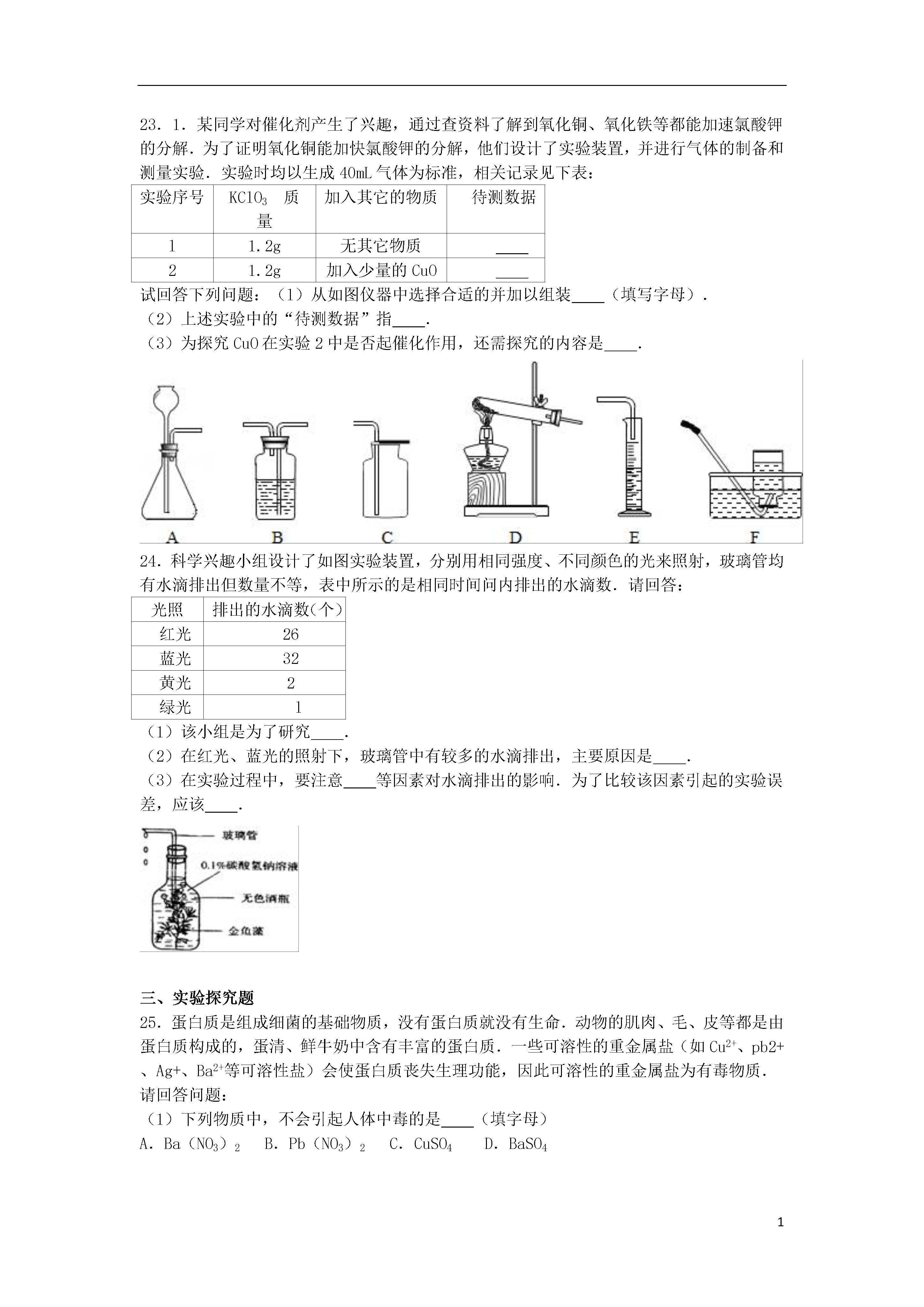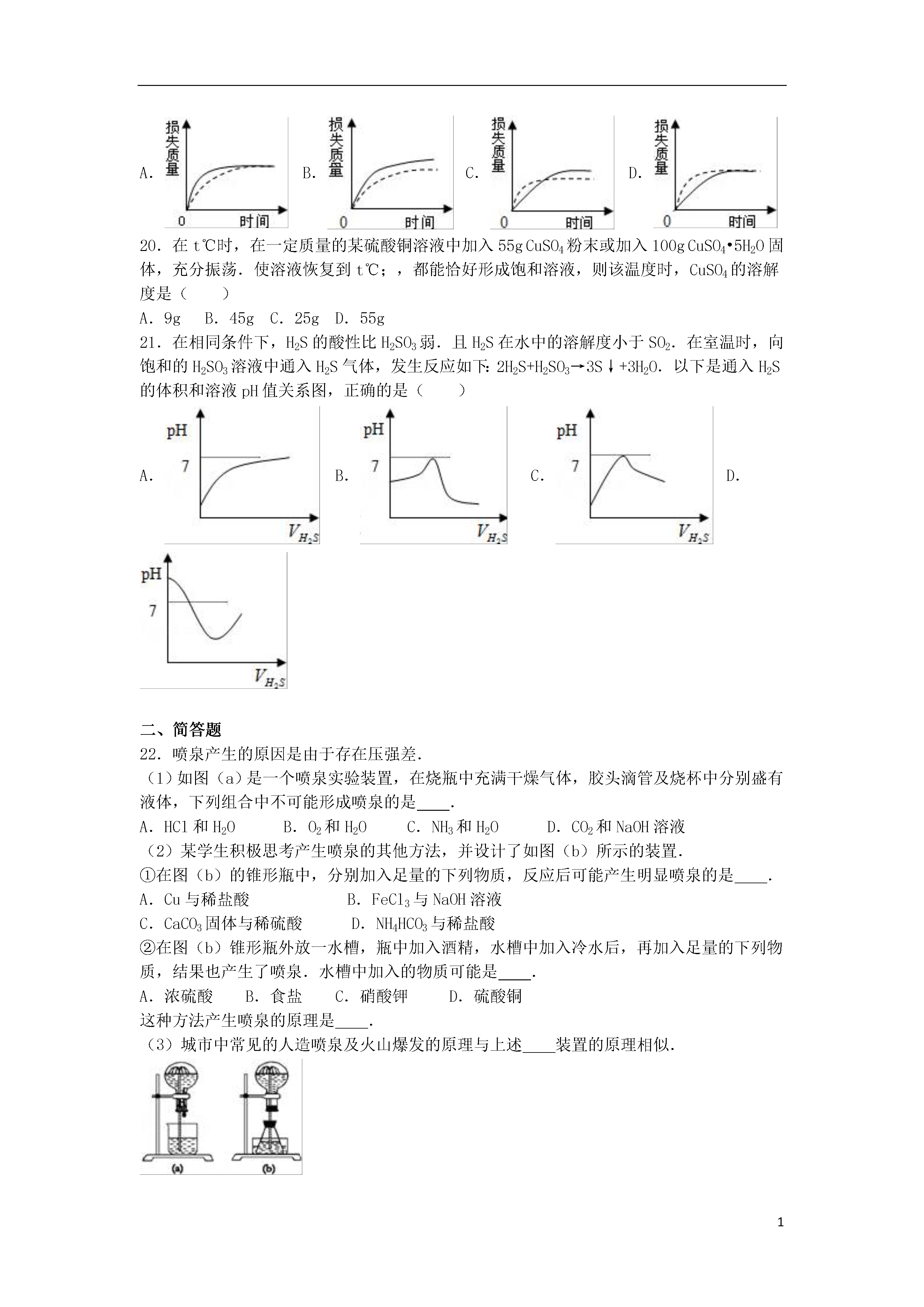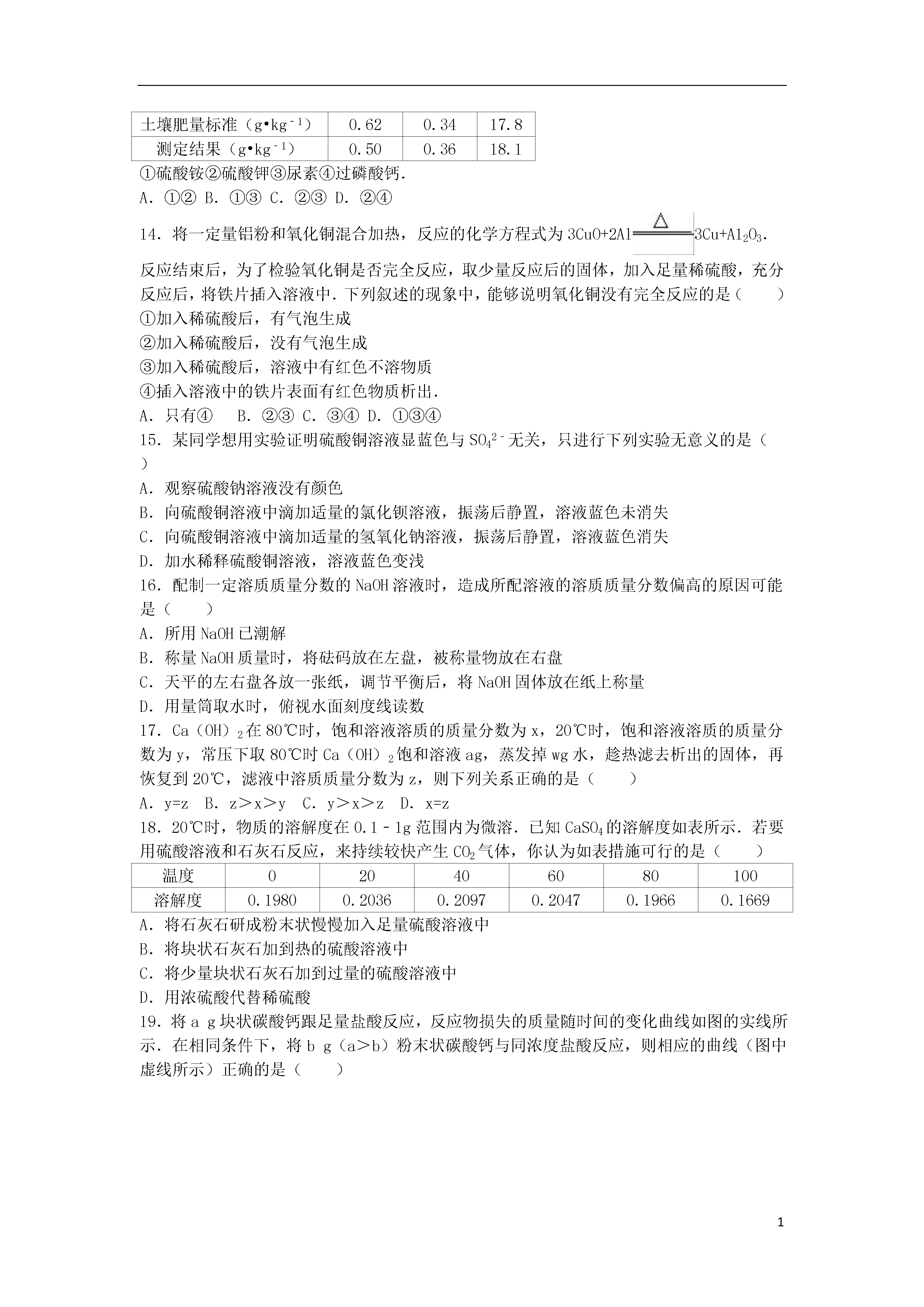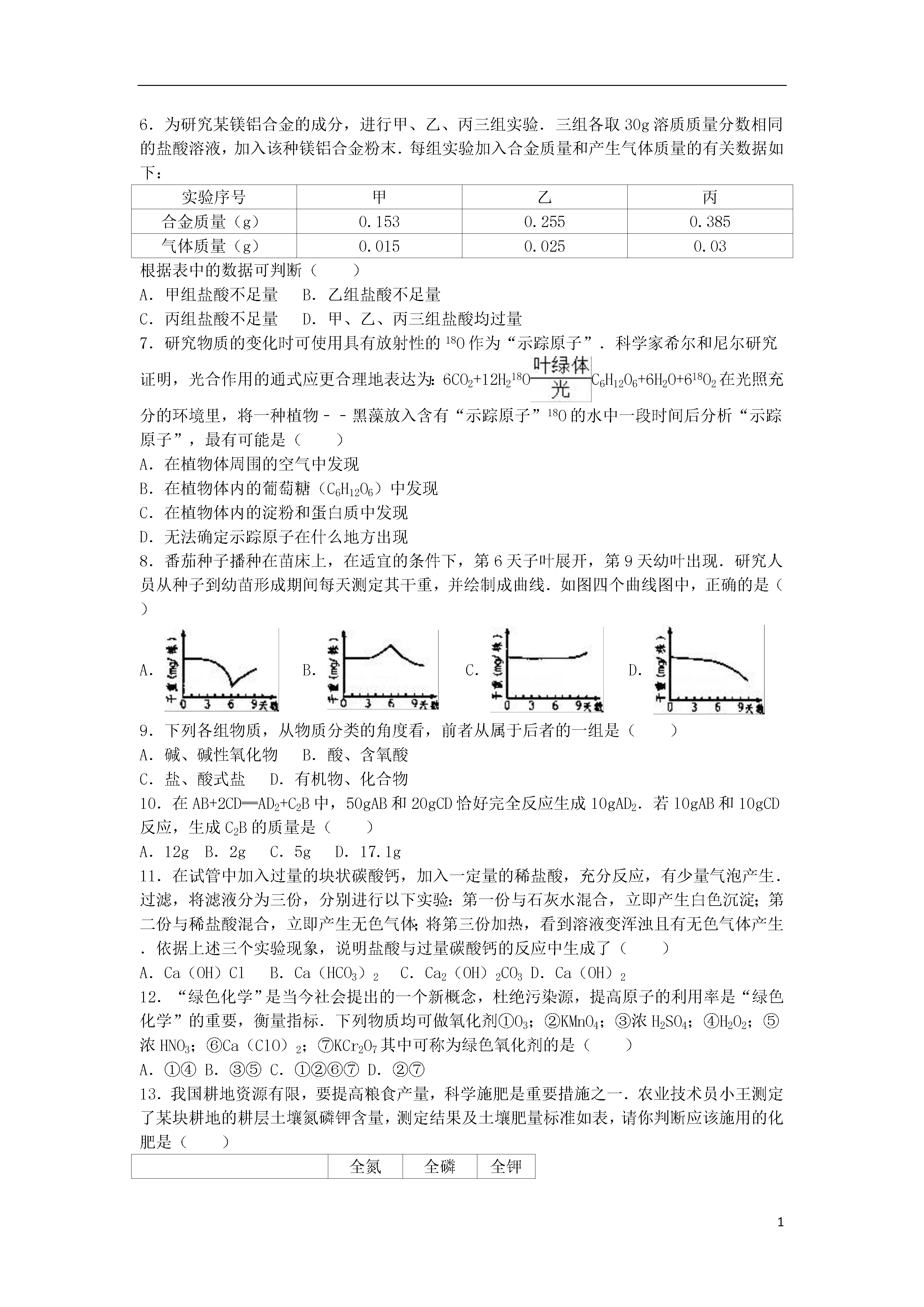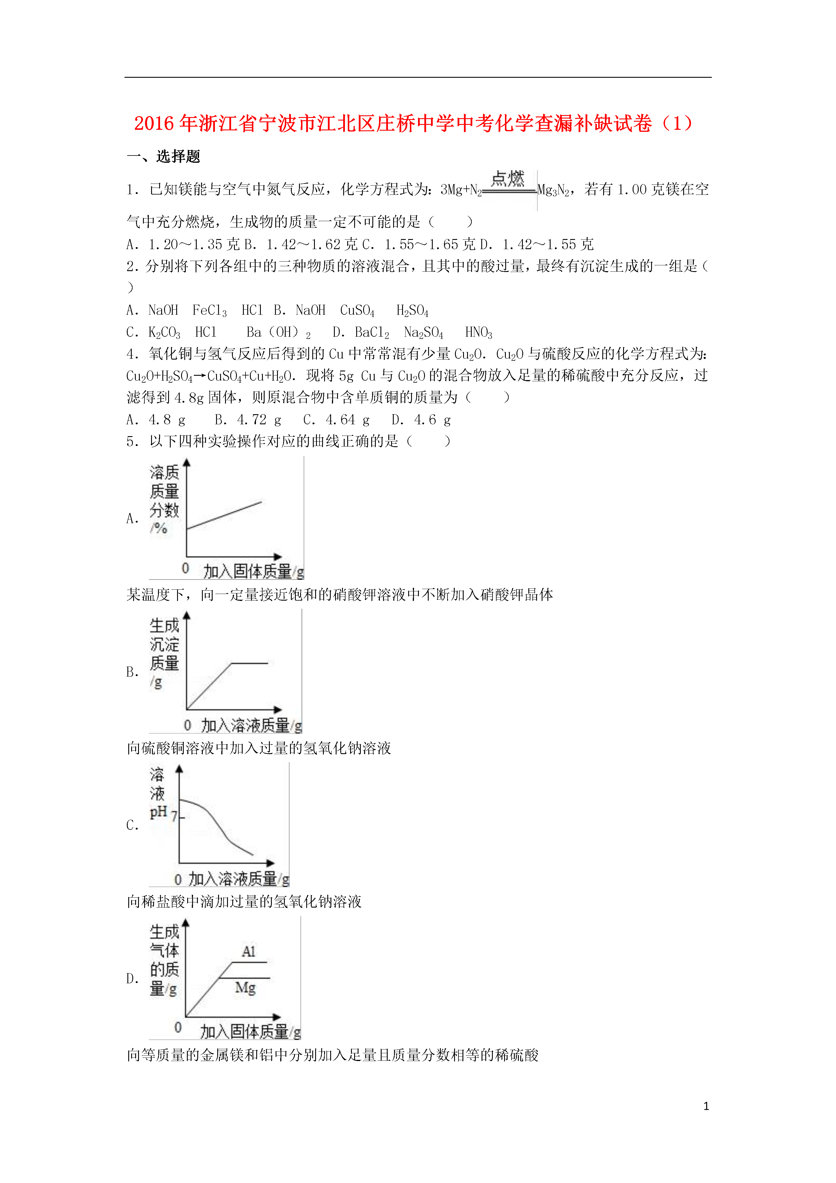12016年浙江省宁波市江北区庄桥中学中考化学查漏补缺试卷(1)一、选择题1.已知镁能与空气中氮气反应,化学方程式为:3Mg+N2Mg3N2,若有1.00克镁在空气中充分燃烧,生成物的质量一定不可能的是()A.1.20~1.35克B.1.42~1.62克C.1.55~1.65克D.1.42~1.55克2.分别将下列各组中的三种物质的溶液混合,且其中的酸过量,最终有沉淀生成的一组是()A.NaOHFeCl3HClB.NaOHCuSO4H2SO4C.K2CO3HClBa(OH)2D.BaCl2Na2SO4HNO34.氧化铜与氢气反应后得到的Cu中常常混有少量Cu2O.Cu2O与硫酸反应的化学方程式为:Cu2O+H2SO4→CuSO4+Cu+H2O.现将5gCu与Cu2O的混合物放入足量的稀硫酸中充分反应,过滤得到4.8g固体,则原混合物中含单质铜的质量为()A.4.8gB.4.72gC.4.64gD.4.6g5.以下四种实验操作对应的曲线正确的是()A.某温度下,向一定量接近饱和的硝酸钾溶液中不断加入硝酸钾晶体B.向硫酸铜溶液中加入过量的氢氧化钠溶液C.向稀盐酸中滴加过量的氢氧化钠溶液D.向等质量的金属镁和铝中分别加入足量且质量分数相等的稀硫酸6.为研究某镁铝合金的成分,进行甲、乙、丙三组实验.三组各取30g溶质质量分数相同的盐酸溶液,加入该种镁铝合金粉末.每组实验加入合金质量和产生气体质量的有关数据如下:实验序号甲乙丙合金质量(g)0.1530.2550.385气体质量(g)0.0150.0250.03根据表中的数据可判断()A.甲组盐酸不足量B.乙组盐酸不足量C.丙组盐酸不足量D.甲、乙、丙三组盐酸均过量7.研究物质的变化时可使用具有放射性的18O作为“示踪原子”.科学家希尔和尼尔研究证明,光合作用的通式应更合理地表达为:6CO2+12H218OC6H12O6+6H2O+618O2在光照充分的环境里,将一种植物﹣﹣黑藻放入含有“示踪原子”18O的水中一段时间后分析“示踪原子”,最有可能是()A.在植物体周围的空气中发现B.在植物体内的葡萄糖(C6H12O6)中发现C.在植物体内的淀粉和蛋白质中发现D.无法确定示踪原子在什么地方出现8.番茄种子播种在苗床上,在适宜的条件下,第6天子叶展开,第9天幼叶出现.研究人员从种子到幼苗形成期间每天测定其干重,并绘制成曲线.如图四个曲线图中,正确的是()A.B.C.D.9.下列各组物质,从物质分类的角度看,前者从属于后者的一组是()A.碱、碱性氧化物B.酸、含氧酸C.盐、酸式盐D.有机物、化合物10.在AB+2CD═AD2+C2B中,50gAB和20gCD恰好完全反应生成10gAD2.若l0gAB和10gCD反应,生成C2B的质量是()A.12gB.2gC.5gD.17.1g11.在试管中加入过量的块状碳酸钙,加入一定量的稀盐酸,充分反应,有少量气泡产生.过滤,将滤液分为三份,分别进行以下实验:第一份与石灰水混合,立即产生白色沉淀;第二份与稀盐酸混合,立即产生无色气体;将第三份加热,看到溶液变浑浊且有无色气体产生.依据上述三个实验现象,说明盐酸与过量碳酸钙的反应中生成了()A.Ca(OH)ClB.Ca(HCO3)2C.Ca2(OH)2CO3D.Ca(OH)212.“绿色化学”是当今社会提出的一个新概念,杜绝污染源,提高原子的利用率是“绿色化学”的重要,衡量指标.下列物质均可做氧化剂①O3;②KMnO4;③浓H2SO4;④H2O2;⑤浓HNO3;⑥Ca(ClO)2;⑦KCr2O7其中可称为绿色氧化剂的是()A.①④B.③⑤C.①②⑥⑦D.②⑦13.我国耕地资源有限,要提高粮食产量,科学施肥是重要措施之一.农业技术员小王测定了某块耕地的耕层土壤氮磷钾含量,测定结果及土壤肥量标准如表,请你判断应该施用的化肥是()全氮全磷全钾土壤肥量标准(g•kg﹣1)0.620.3417.8测定结果(g•kg﹣1)0.500.3618.1①硫酸铵②硫酸钾③尿素④过磷酸钙.A.①②B.①③C.②③D.②④14.将一定量铝粉和氧化铜混合加热,反应的化学方程式为3CuO+2Al3Cu+A12O3.反应结束后,为了检验氧化铜是否完全反应,取少量反应后的固体,加入足量稀硫酸,充分反应后,将铁片插入溶液中.下列叙述的现象中,能够说明氧化铜没有完全反应的是()①加入稀硫酸后,有气泡生成②加入稀硫酸后,没有气泡生成③加入稀硫酸后,溶液中有红色不溶物质④插入溶液中的铁片表面有红色物质析出.A.只有④B.②③C.③④D.①③④15.某同学想用实验证明硫酸铜溶液显蓝色与SO42﹣无关,只进行下列实验无意义的是()A.观察硫酸