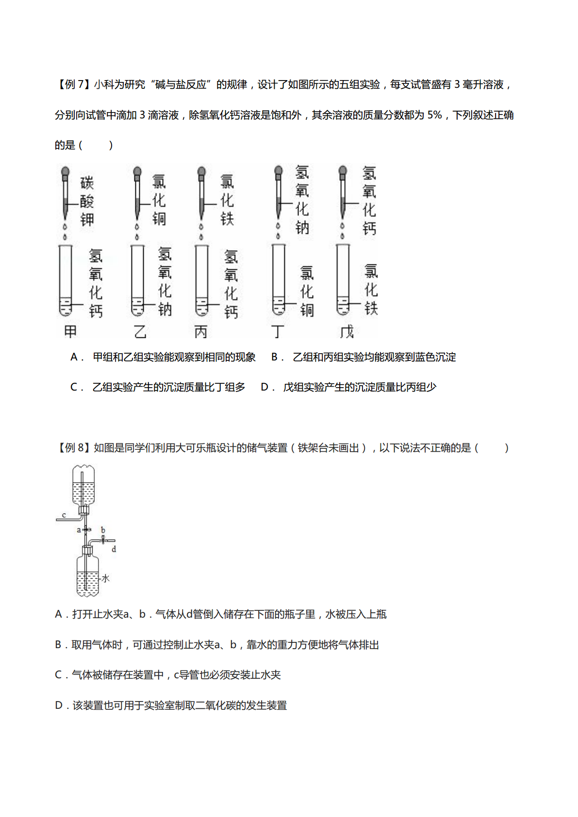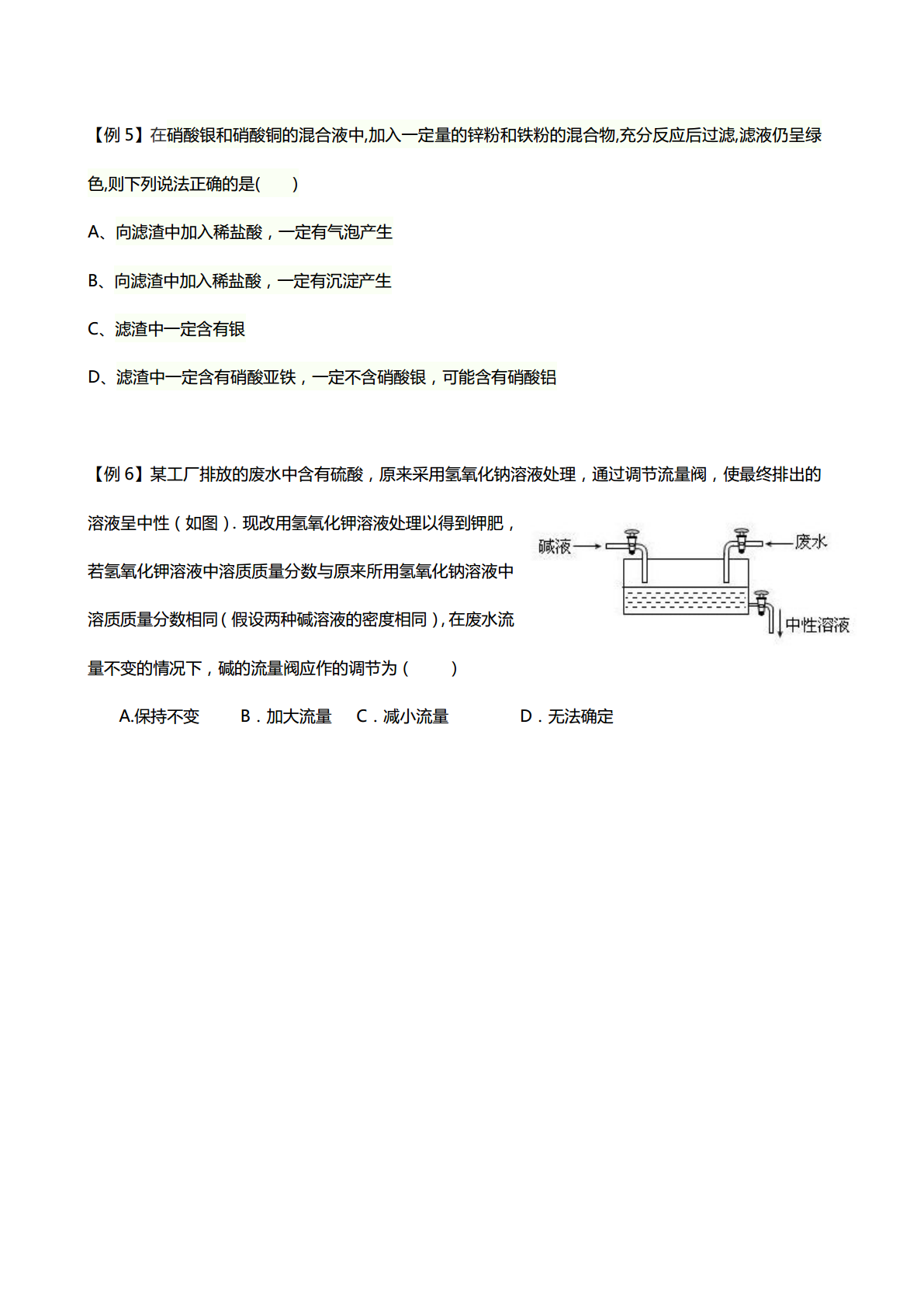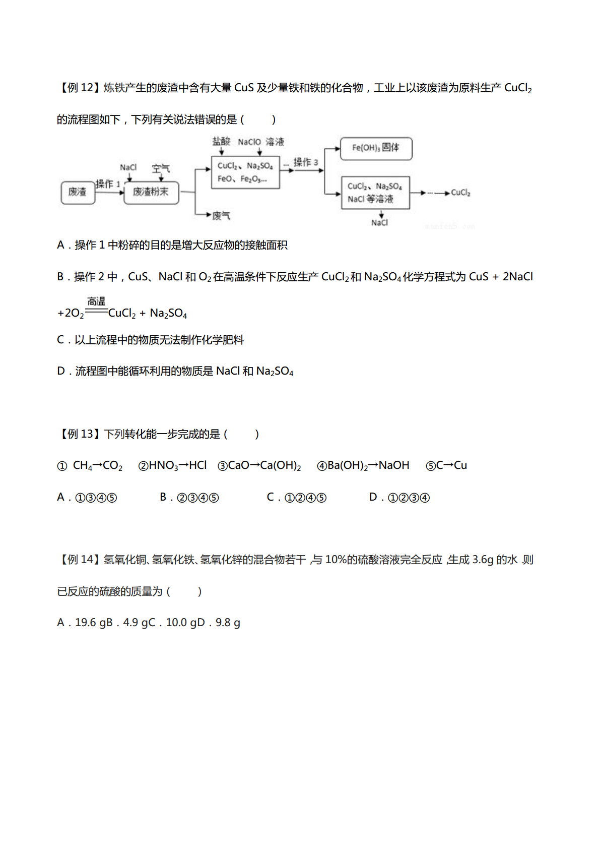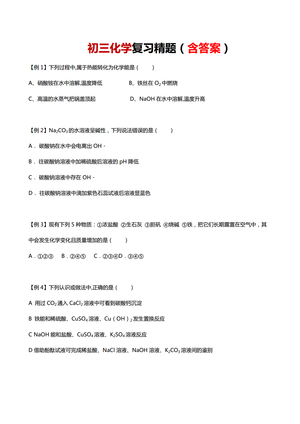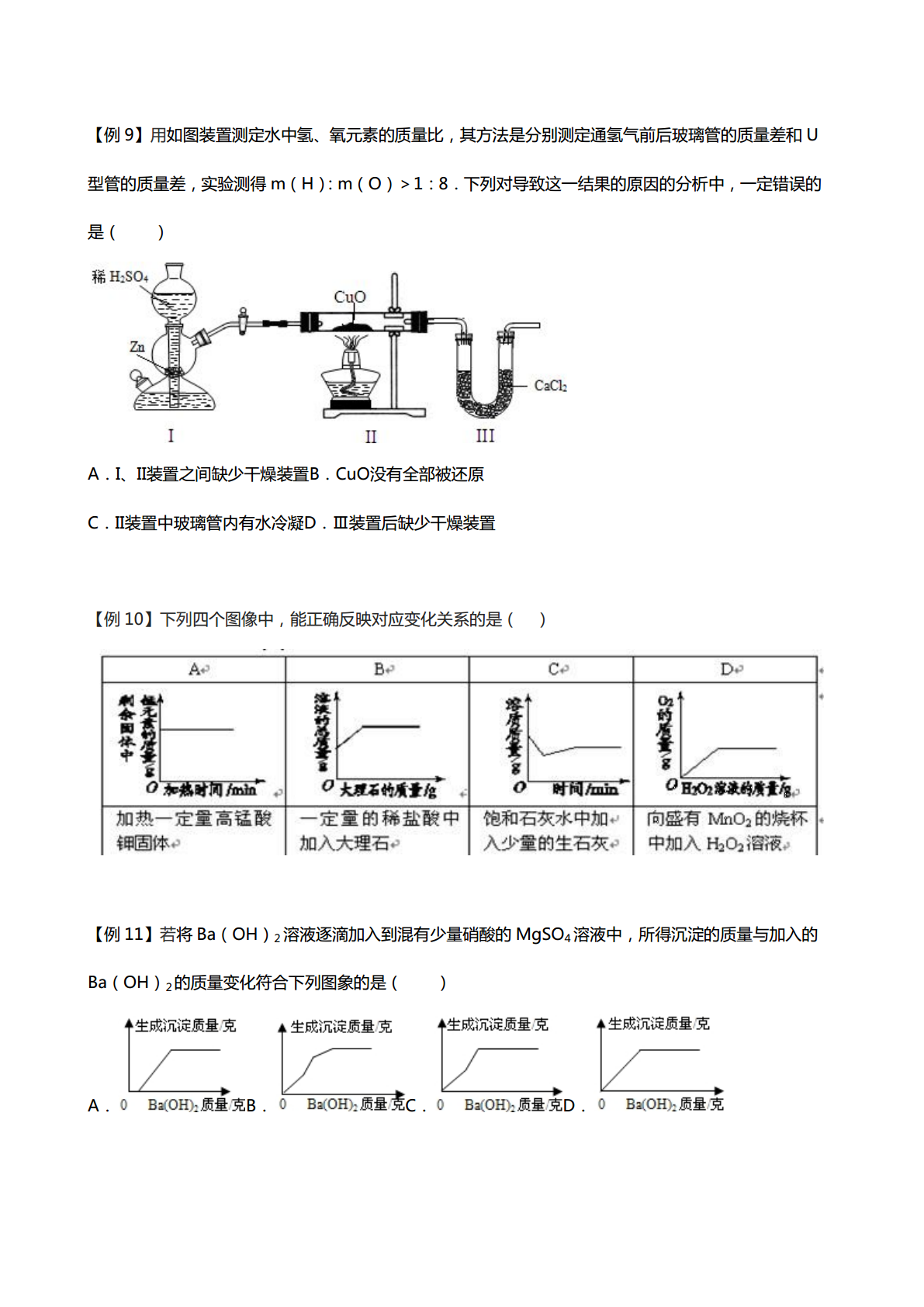 杭州初三化学复习精题(含答案)【例1】下列过程中,属于热能转化为化学能是()A、硝酸铵在水中溶解,温度降低B、铁丝在O2中燃烧C、高温的水蒸气把锅盖顶起D、NaOH在水中溶解,温度升高【例2】Na2CO3的水溶液呈碱性,下列说法错误的是()A.碳酸钠在水中会电离出OH﹣B.往碳酸钠溶液中加稀硫酸后溶液的pH降低C.碳酸钠溶液中存在OH﹣D.往碳酸钠溶液中滴加紫色石蕊试液后溶液显蓝色【例3】现有下列5种物质:①浓盐酸②生石灰③胆矾④烧碱⑤铁,把它们长期露置在空气中,其中会发生化学变化且质量增加的是()A.①②③B.②④⑤C.②③④D.③④⑤【例4】下列认识或做法中,正确的是()A用过CO2通入CaCl2溶液中可看到碳酸钙沉淀B铁能和稀硫酸、CuSO4溶液、Cu(OH)2发生置换反应CNaOH能和盐酸、CuSO4溶液、K2SO4溶液反应D借助酚酞试液可完成稀盐酸、NaCl溶液、NaOH溶液、K2CO3溶液间的鉴别学而思旗下1对1专业辅导,个性定制4-6人小组课,杭州家长首选:http://hz.jiajiaoban.com/【例5】在硝酸银和硝酸铜的混合液中,加入一定量的锌粉和铁粉的混合物,充分反应后过滤,滤液仍呈绿色,则下列说法正确的是()A、向滤渣中加入稀盐酸,一定有气泡产生B、向滤渣中加入稀盐酸,一定有沉淀产生C、滤渣中一定含有银D、滤渣中一定含有硝酸亚铁,一定不含硝酸银,可能含有硝酸铝【例6】某工厂排放的废水中含有硫酸,原来采用氢氧化钠溶液处理,通过调节流量阀,使最终排出的溶液呈中性(如图).现改用氢氧化钾溶液处理以得到钾肥,若氢氧化钾溶液中溶质质量分数与原来所用氢氧化钠溶液中溶质质量分数相同(假设两种碱溶液的密度相同),在废水流量不变的情况下,碱的流量阀应作的调节为()A.保持不变B.加大流量C.减小流量D.无法确定【例7】小科为研究“碱与盐反应”的规律,设计了如图所示的五组实验,每支试管盛有3毫升溶液,分别向试管中滴加3滴溶液,除氢氧化钙溶液是饱和外,其余溶液的质量分数都为5%,下列叙述正确的是()A.甲组和乙组实验能观察到相同的现象B.乙组和丙组实验均能观察到蓝色沉淀C.乙组实验产生的沉淀质量比丁组多D.戊组实验产生的沉淀质量比丙组少【例8】如图是同学们利用大可乐瓶设计的储气装置(铁架台未画出),以下说法不正确的是()A.打开止水夹a、b.气体从d管倒入储存在下面的瓶子里,水被压入上瓶B.取用气体时,可通过控制止水夹a、b,靠水的重力方便地将气体排出C.气体被储存在装置中,c导管也必须安装止水夹D.该装置也可用于实验室制取二氧化碳的发生装置【例9】用如图装置测定水中氢、氧元素的质量比,其方法是分别测定通氢气前后玻璃管的质量差和U型管的质量差,实验测得m(H):m(O)>1:8.下列对导致这一结果的原因的分析中,一定错误的是()A.I、II装置之间缺少干燥装置B.CuO没有全部被还原C.II装置中玻璃管内有水冷凝D.Ⅲ装置后缺少干燥装置【例10】下列四个图像中,能正确反映对应变化关系的是()【例11】若将Ba(OH)2溶液逐滴加入到混有少量硝酸的MgSO4溶液中,所得沉淀的质量与加入的Ba(OH)2的质量变化符合下列图象的是()A.B.C.D.【例12】炼铁产生的废渣中含有大量CuS及少量铁和铁的化合物,工业上以该废渣为原料生产CuCl2的流程图如下,下列有关说法错误的是()A.操作1中粉碎的目的是增大反应物的接触面积B.操作2中,CuS、NaCl和O2在高温条件下反应生产CuCl2和Na2SO4化学方程式为CuS+2NaCl+2O2CuCl2+Na2SO4C.以上流程中的物质无法制作化学肥料D.流程图中能循环利用的物质是NaCl和Na2SO4【例13】下列转化能一步完成的是()①CH4→CO2②HNO3→HCl③CaO→Ca(OH)2④Ba(OH)2→NaOH⑤C→CuA.①③④⑤B.②③④⑤C.①②④⑤D.①②③④【例14】氢氧化铜、氢氧化铁、氢氧化锌的混合物若干,与10%的硫酸溶液完全反应,生成3.6g的水.则已反应的硫酸的质量为()A.19.6gB.4.9gC.10.0gD.9.8g【例15】如图是常见物质的转换关系图.其中A、B常温下都为液体且组成元素相同,A、B、X、Y、E都为氧化物,X、E都为黑色固体,F为白色沉淀,I为蓝色絮状沉淀.(1)X在反应①中起作用.(2)写出反应⑥的化学方程式.(3)写出L的化