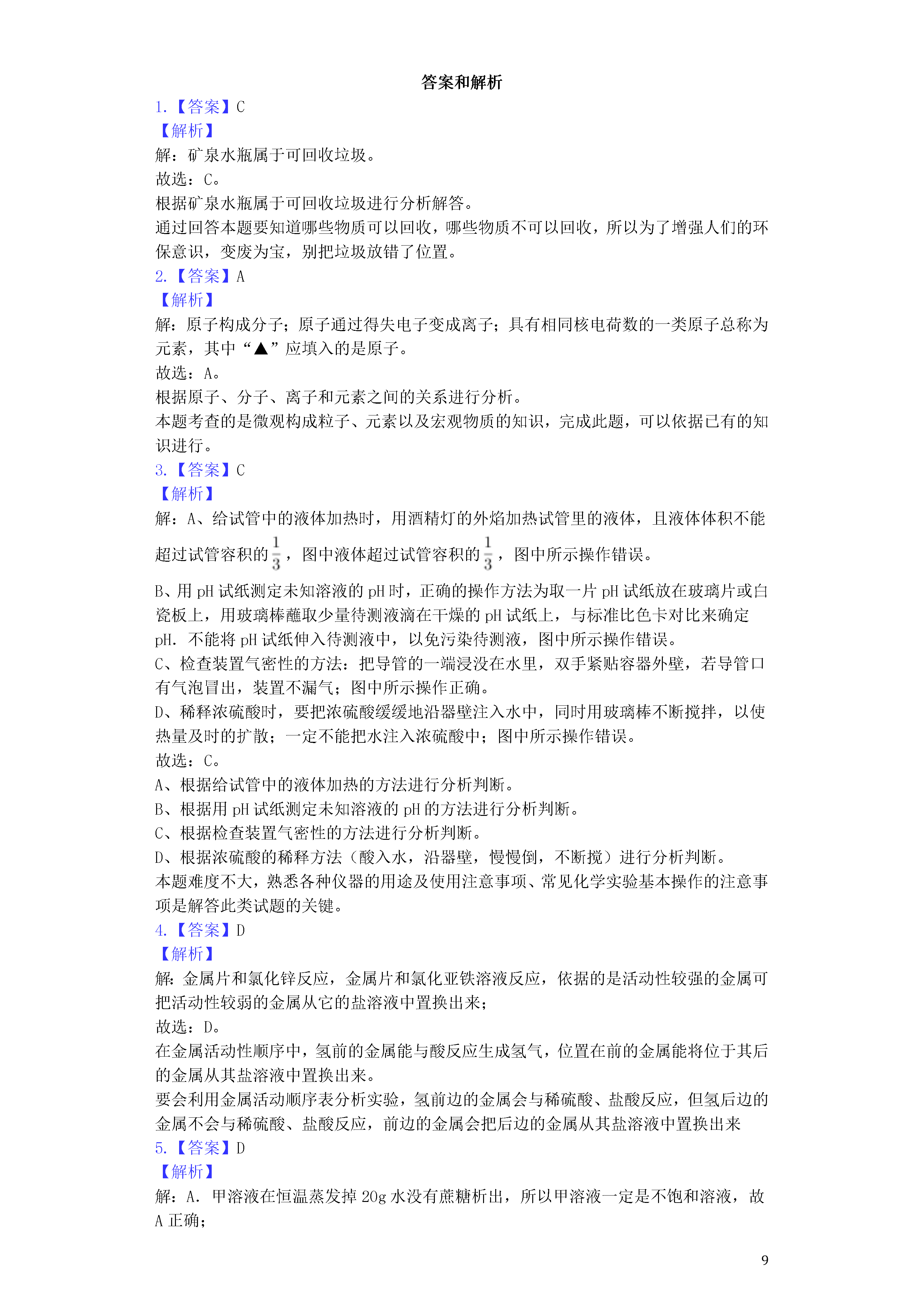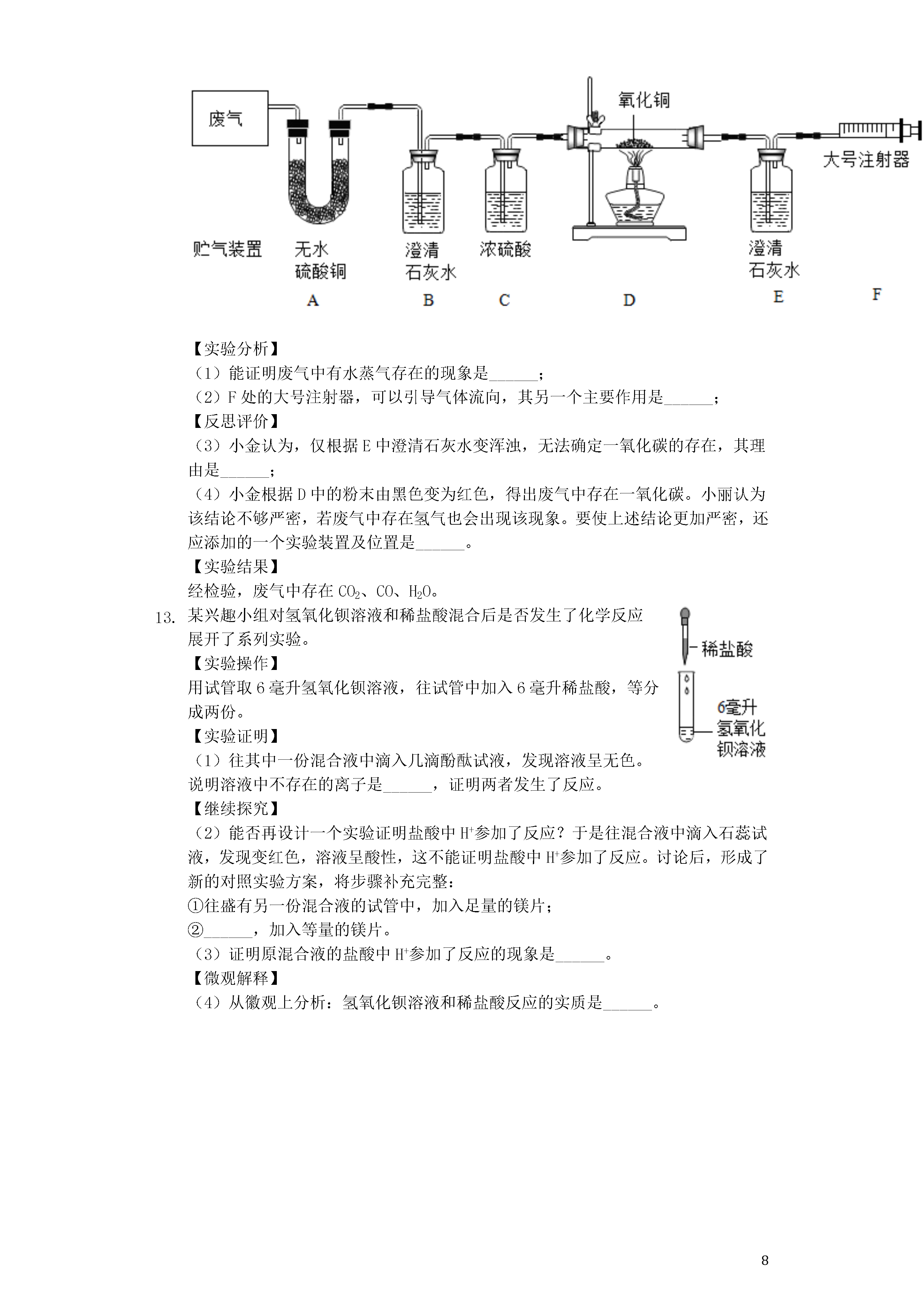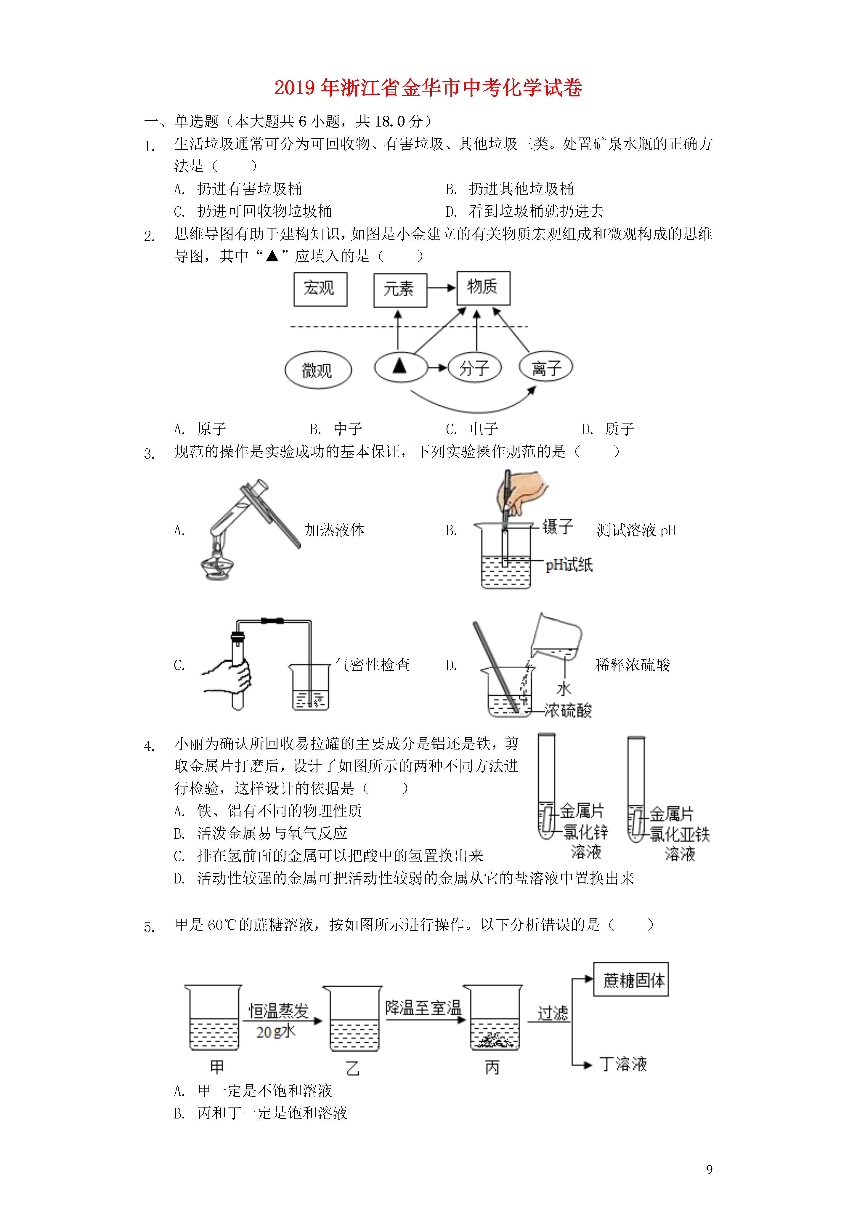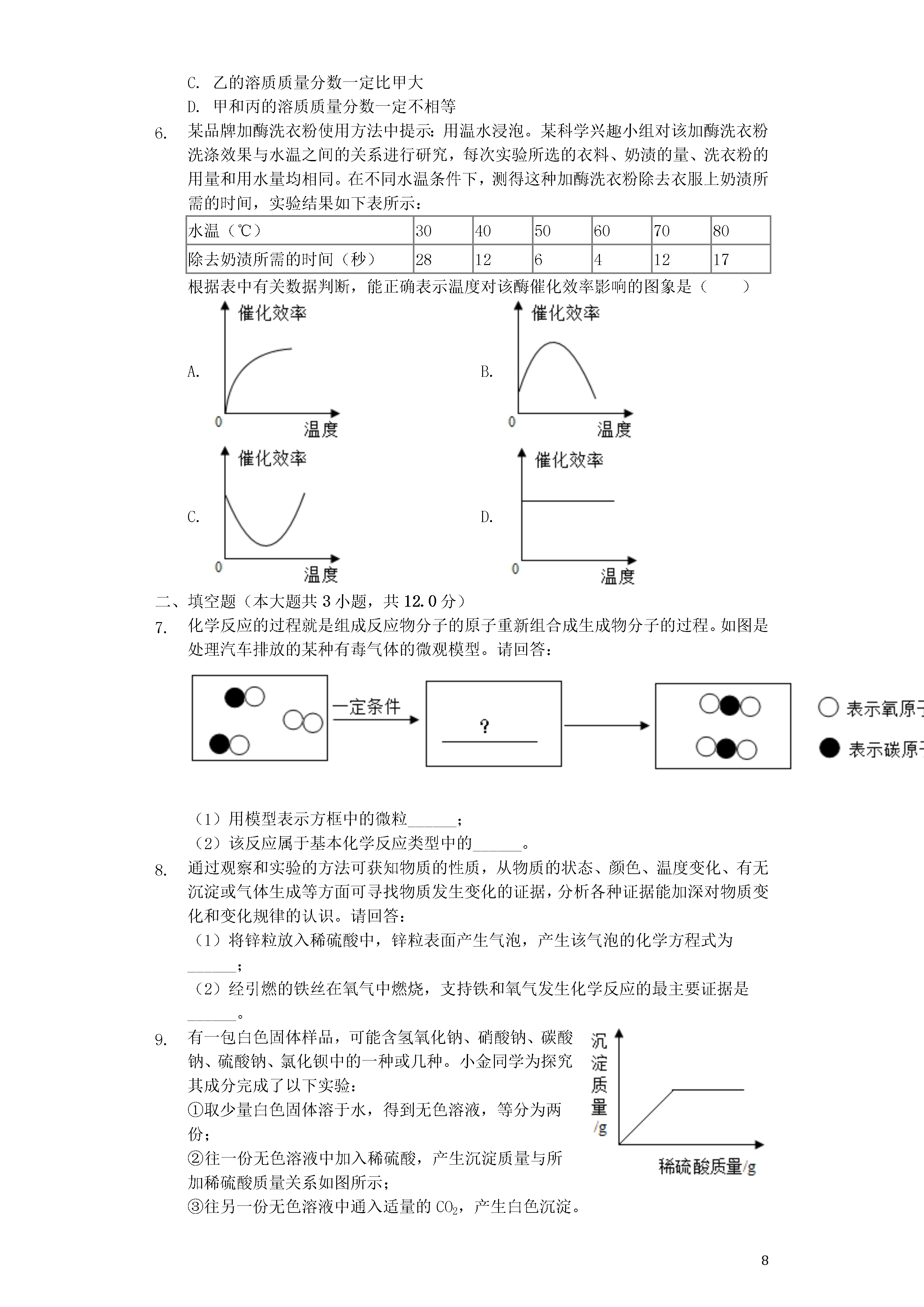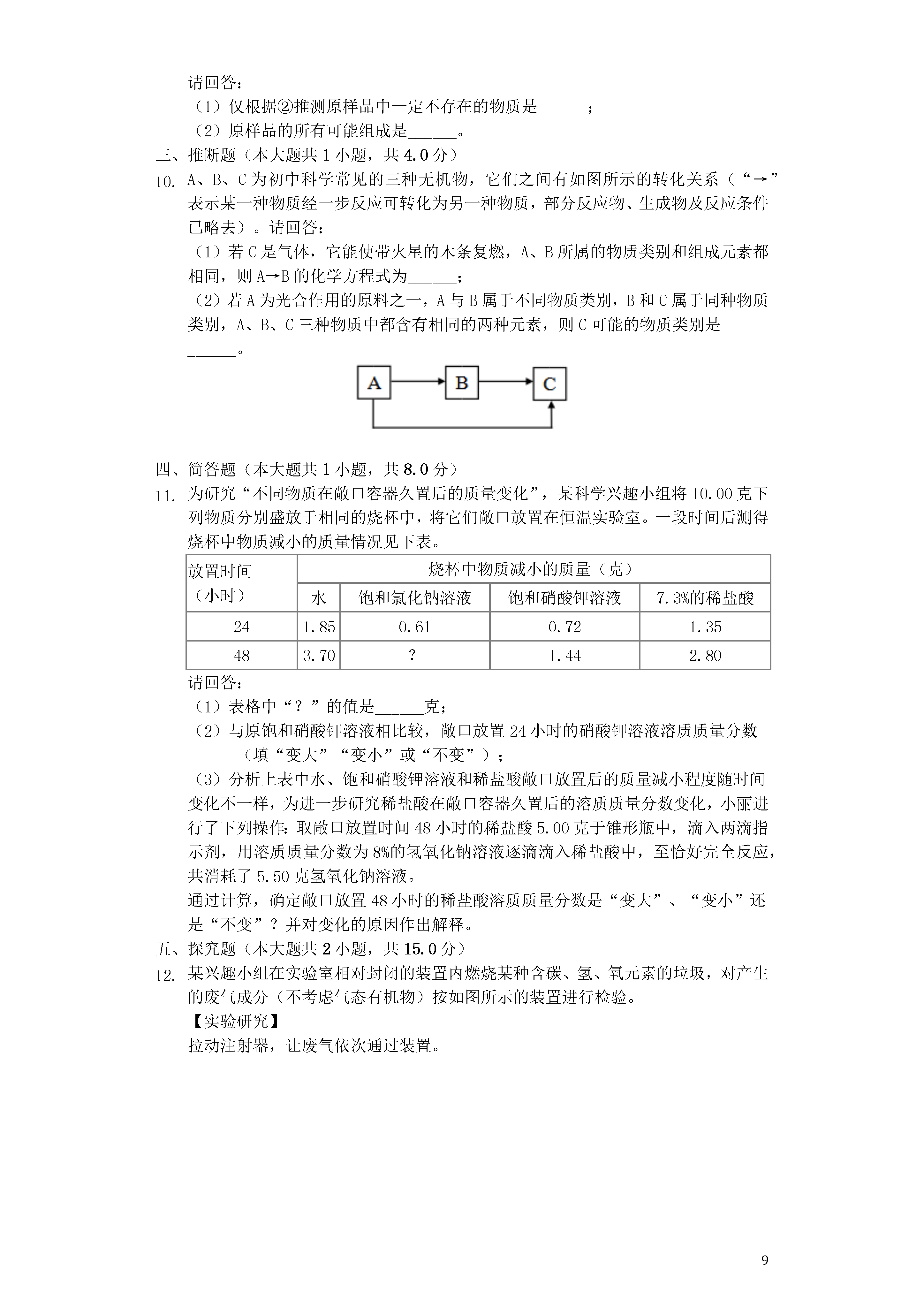 892019年浙江省金华市中考化学试卷一、单选题(本大题共6小题,共18.0分)生活垃圾通常可分为可回收物、有害垃圾、其他垃圾三类。处置矿泉水瓶的正确方法是()A.扔进有害垃圾桶B.扔进其他垃圾桶C.扔进可回收物垃圾桶D.看到垃圾桶就扔进去思维导图有助于建构知识,如图是小金建立的有关物质宏观组成和微观构成的思维导图,其中“▲”应填入的是()A.原子B.中子C.电子D.质子规范的操作是实验成功的基本保证,下列实验操作规范的是()A.加热液体B.测试溶液pHC.气密性检查D.稀释浓硫酸小丽为确认所回收易拉罐的主要成分是铝还是铁,剪取金属片打磨后,设计了如图所示的两种不同方法进行检验,这样设计的依据是()A.铁、铝有不同的物理性质B.活泼金属易与氧气反应C.排在氢前面的金属可以把酸中的氢置换出来D.活动性较强的金属可把活动性较弱的金属从它的盐溶液中置换出来甲是60℃的蔗糖溶液,按如图所示进行操作。以下分析错误的是()A.甲一定是不饱和溶液B.丙和丁一定是饱和溶液C.乙的溶质质量分数一定比甲大D.甲和丙的溶质质量分数一定不相等某品牌加酶洗衣粉使用方法中提示:用温水浸泡。某科学兴趣小组对该加酶洗衣粉洗涤效果与水温之间的关系进行研究,每次实验所选的衣料、奶渍的量、洗衣粉的用量和用水量均相同。在不同水温条件下,测得这种加酶洗衣粉除去衣服上奶渍所需的时间,实验结果如下表所示:水温(℃)304050607080除去奶渍所需的时间(秒)2812641217根据表中有关数据判断,能正确表示温度对该酶催化效率影响的图象是()A.B.C.D.二、填空题(本大题共3小题,共12.0分)化学反应的过程就是组成反应物分子的原子重新组合成生成物分子的过程。如图是处理汽车排放的某种有毒气体的微观模型。请回答:(1)用模型表示方框中的微粒______;(2)该反应属于基本化学反应类型中的______。通过观察和实验的方法可获知物质的性质,从物质的状态、颜色、温度变化、有无沉淀或气体生成等方面可寻找物质发生变化的证据,分析各种证据能加深对物质变化和变化规律的认识。请回答:(1)将锌粒放入稀硫酸中,锌粒表面产生气泡,产生该气泡的化学方程式为______;(2)经引燃的铁丝在氧气中燃烧,支持铁和氧气发生化学反应的最主要证据是______。有一包白色固体样品,可能含氢氧化钠、硝酸钠、碳酸钠、硫酸钠、氯化钡中的一种或几种。小金同学为探究其成分完成了以下实验:①取少量白色固体溶于水,得到无色溶液,等分为两份;②往一份无色溶液中加入稀硫酸,产生沉淀质量与所加稀硫酸质量关系如图所示;③往另一份无色溶液中通入适量的CO2,产生白色沉淀。请回答:(1)仅根据②推测原样品中一定不存在的物质是______;(2)原样品的所有可能组成是______。三、推断题(本大题共1小题,共4.0分)A、B、C为初中科学常见的三种无机物,它们之间有如图所示的转化关系(“→”表示某一种物质经一步反应可转化为另一种物质,部分反应物、生成物及反应条件已略去)。请回答:(1)若C是气体,它能使带火星的木条复燃,A、B所属的物质类别和组成元素都相同,则A→B的化学方程式为______;(2)若A为光合作用的原料之一,A与B属于不同物质类别,B和C属于同种物质类别,A、B、C三种物质中都含有相同的两种元素,则C可能的物质类别是______。四、简答题(本大题共1小题,共8.0分)为研究“不同物质在敞口容器久置后的质量变化”,某科学兴趣小组将10.00克下列物质分别盛放于相同的烧杯中,将它们敞口放置在恒温实验室。一段时间后测得烧杯中物质减小的质量情况见下表。放置时间(小时)烧杯中物质减小的质量(克)水饱和氯化钠溶液饱和硝酸钾溶液7.3%的稀盐酸241.850.610.721.35483.70?1.442.80请回答:(1)表格中“?”的值是______克;(2)与原饱和硝酸钾溶液相比较,敞口放置24小时的硝酸钾溶液溶质质量分数______(填“变大”“变小”或“不变”);(3)分析上表中水、饱和硝酸钾溶液和稀盐酸敞口放置后的质量减小程度随时间变化不一样,为进一步研究稀盐酸在敞口容器久置后的溶质质量分数变化,小丽进行了下列操作:取敞口放置时间48小时的稀盐酸5.00克于锥形瓶中,滴入两滴指示剂,用溶质质量分数为8%的氢氧化钠溶液逐滴滴入稀盐酸中,至恰好完全反应,共消耗了5.50克氢氧化钠溶液。通过计算,确定敞口放置48小时的稀盐酸溶质质量分数是“变大”、“变小”还是“不变”?并对变化的原因作出解释。五、探究题(本大题共2小题,共15.0分)某兴趣小组在实验室相对封闭的装置内燃烧某种含碳、氢、氧元素的垃圾,对产生的废气成分(不考虑气态有机物)按如图所示的装置进