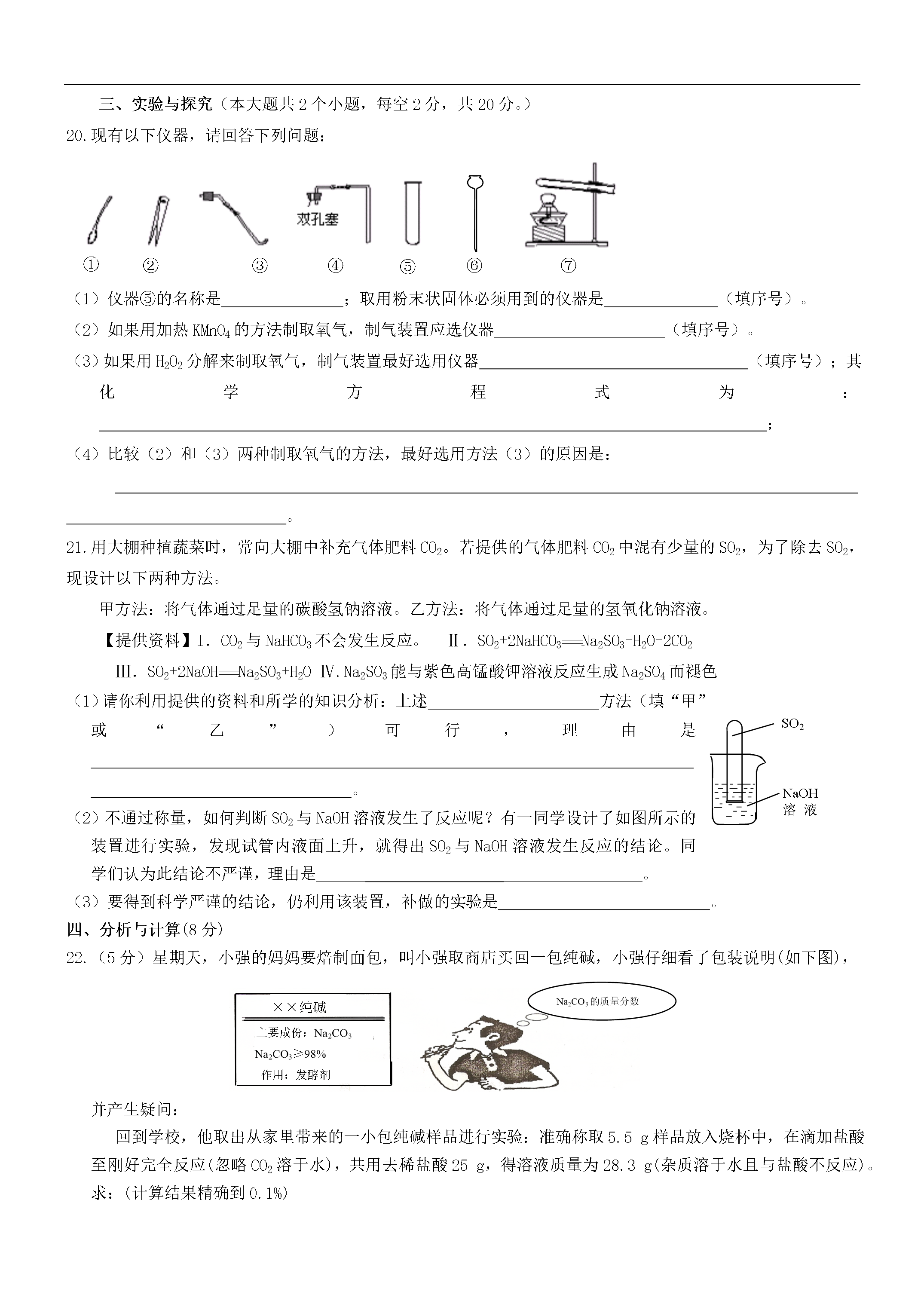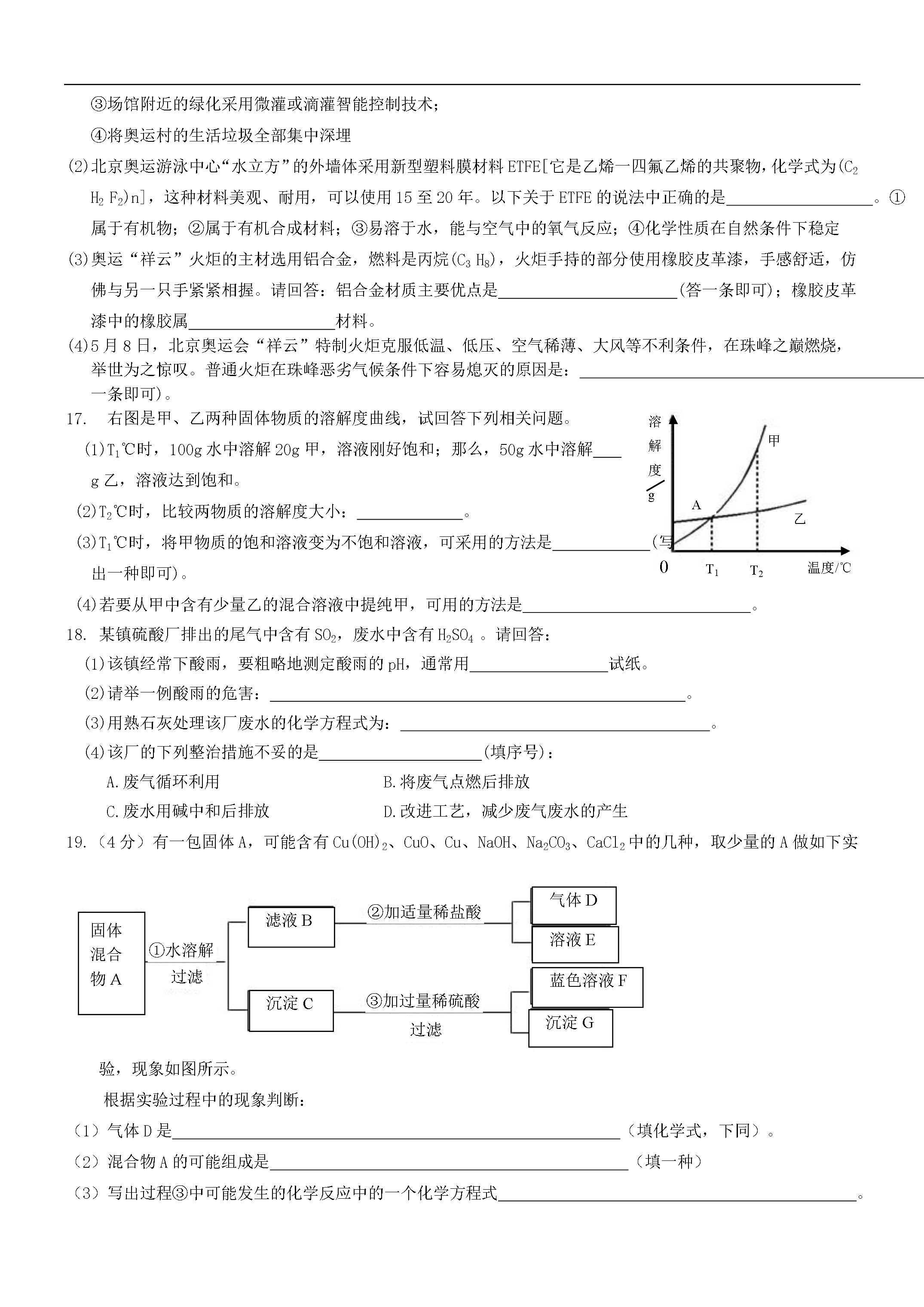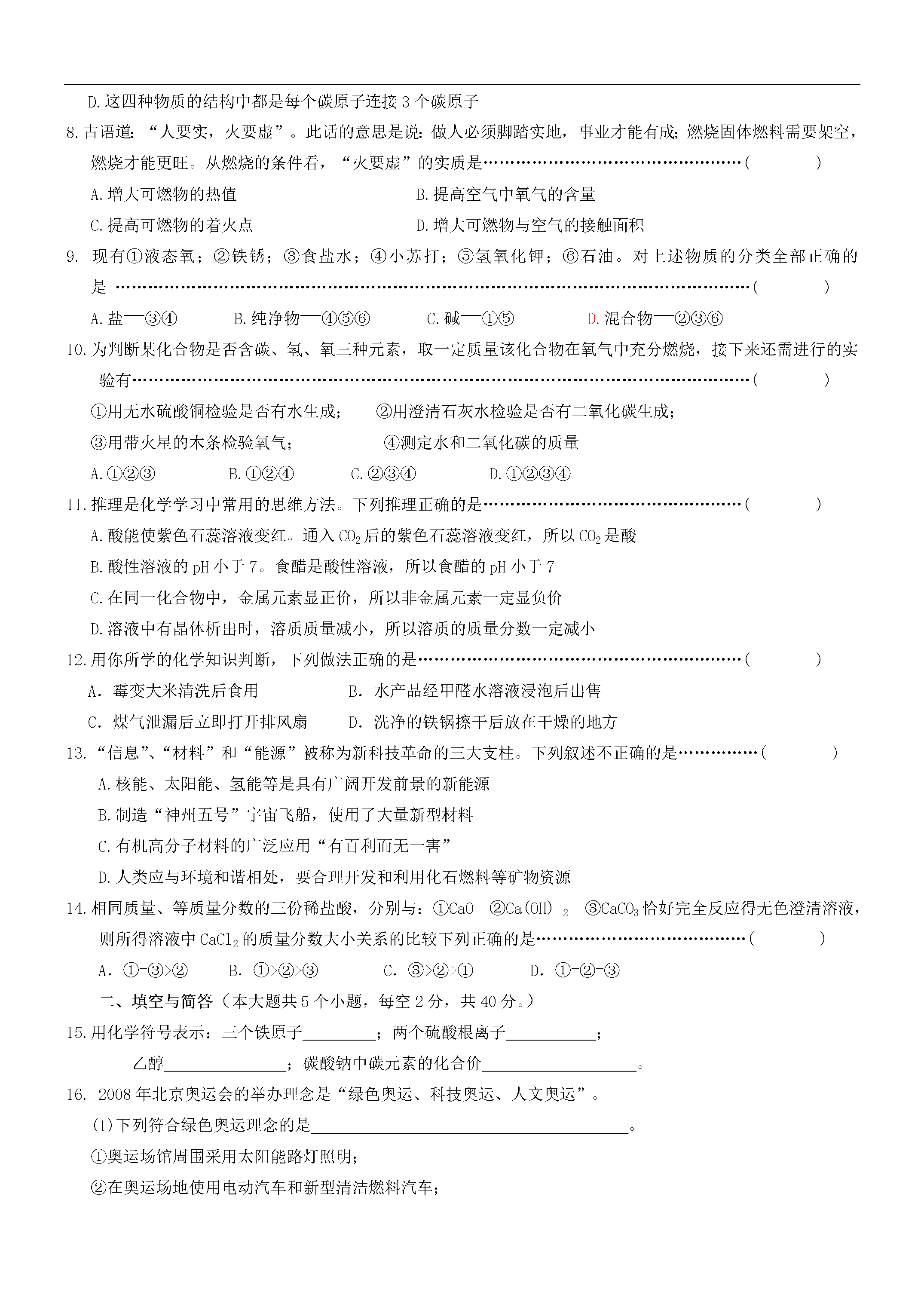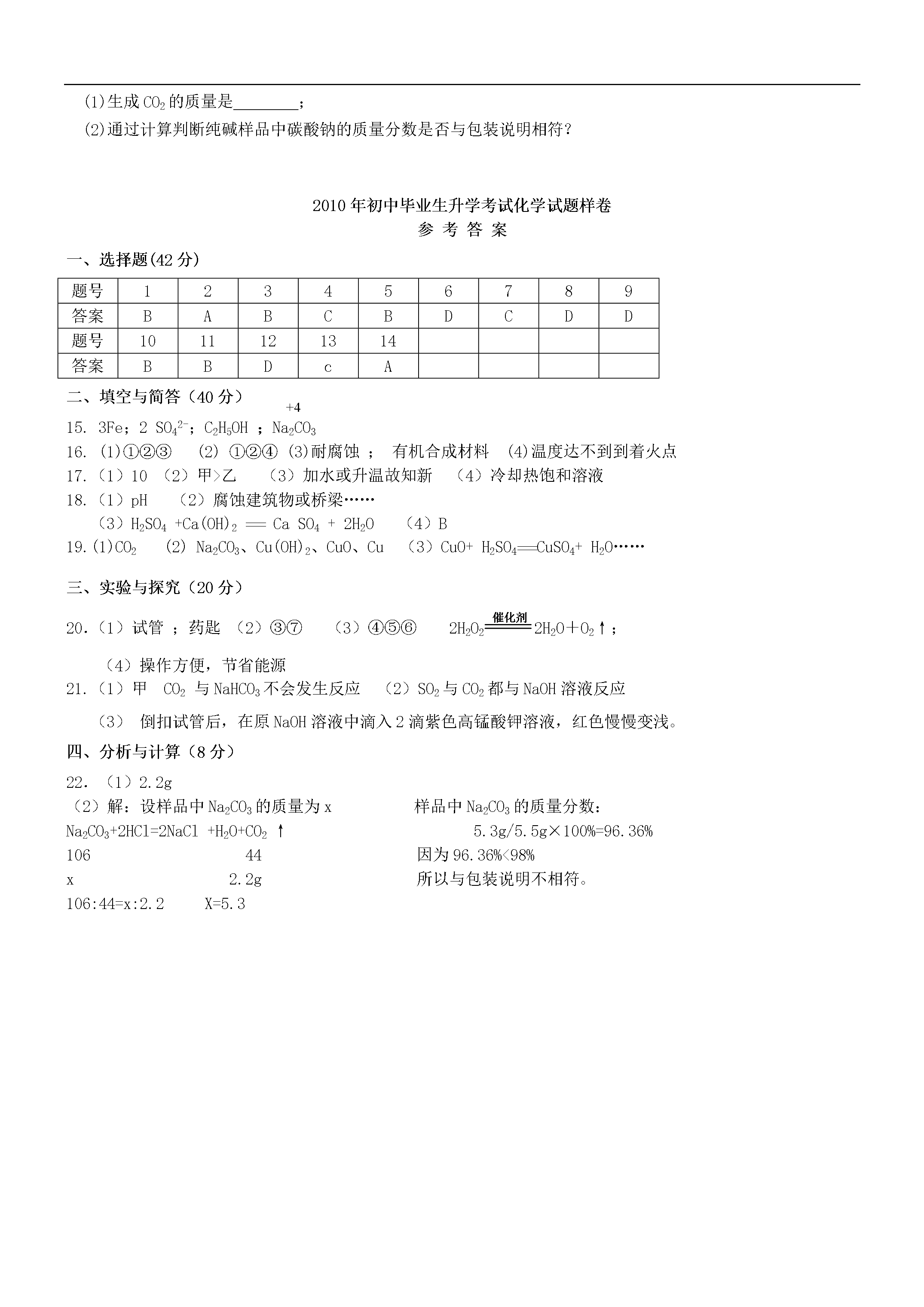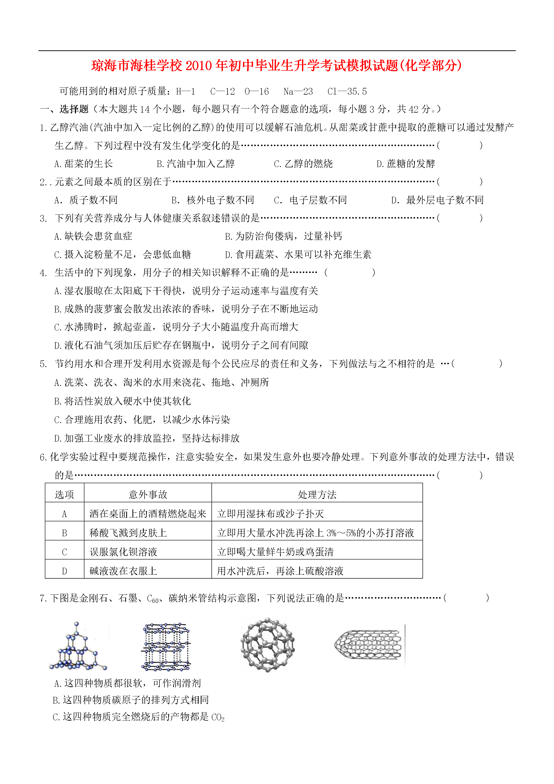 琼海市海桂学校2010年初中毕业生升学考试模拟试题(化学部分)可能用到的相对原子质量:H—1C—12O—16Na—23Cl—35.5一、选择题(本大题共14个小题,每小题只有一个符合题意的选项,每小题3分,共42分。)1.乙醇汽油(汽油中加入一定比例的乙醇)的使用可以缓解石油危机。从甜菜或甘蔗中提取的蔗糖可以通过发酵产生乙醇。下列过程中没有发生化学变化的是……………………………………………………()A.甜菜的生长B.汽油中加入乙醇C.乙醇的燃烧D.蔗糖的发酵2..元素之间最本质的区别在于………………………………………………………………………()A.质子数不同B.核外电子数不同C.电子层数不同D.最外层电子数不同3.下列有关营养成分与人体健康关系叙述错误的是………………………………………………()A.缺铁会患贫血症B.为防治佝偻病,过量补钙C.摄入淀粉量不足,会患低血糖D.食用蔬菜、水果可以补充维生素4.生活中的下列现象,用分子的相关知识解释不正确的是………()A.湿衣服晾在太阳底下干得快,说明分子运动速率与温度有关B.成熟的菠萝蜜会散发出浓浓的香味,说明分子在不断地运动C.水沸腾时,掀起壶盖,说明分子大小随温度升高而增大D.液化石油气须加压后贮存在钢瓶中,说明分子之间有间隙5.节约用水和合理开发利用水资源是每个公民应尽的责任和义务,下列做法与之不相符的是…()A.洗菜、洗衣、淘米的水用来浇花、拖地、冲厕所B.将活性炭放入硬水中使其软化C.合理施用农药、化肥,以减少水体污染D.加强工业废水的排放监控,坚持达标排放6.化学实验过程中要规范操作,注意实验安全,如果发生意外也要冷静处理。下列意外事故的处理方法中,错误的是…………………………………………………………………………………………………()选项意外事故处理方法A洒在桌面上的酒精燃烧起来立即用湿抹布或沙子扑灭B稀酸飞溅到皮肤上立即用大量水冲洗再涂上3%~5%的小苏打溶液C误服氯化钡溶液立即喝大量鲜牛奶或鸡蛋清D碱液泼在衣服上用水冲洗后,再涂上硫酸溶液7.下图是金刚石、石墨、C60、碳纳米管结构示意图,下列说法正确的是…………………………()A.这四种物质都很软,可作润滑剂B.这四种物质碳原子的排列方式相同C.这四种物质完全燃烧后的产物都是CO2D.这四种物质的结构中都是每个碳原子连接3个碳原子8.古语道:“人要实,火要虚”。此话的意思是说:做人必须脚踏实地,事业才能有成;燃烧固体燃料需要架空,燃烧才能更旺。从燃烧的条件看,“火要虚”的实质是…………………………………………()A.增大可燃物的热值B.提高空气中氧气的含量C.提高可燃物的着火点D.增大可燃物与空气的接触面积9.现有①液态氧;②铁锈;③食盐水;④小苏打;⑤氢氧化钾;⑥石油。对上述物质的分类全部正确的是………………………………………………………………………………………………………()A.盐—③④B.纯净物—④⑤⑥C.碱—①⑤D.混合物—②③⑥10.为判断某化合物是否含碳、氢、氧三种元素,取一定质量该化合物在氧气中充分燃烧,接下来还需进行的实验有……………………………………………………………………………………………………()①用无水硫酸铜检验是否有水生成;②用澄清石灰水检验是否有二氧化碳生成;③用带火星的木条检验氧气;④测定水和二氧化碳的质量A.①②③B.①②④C.②③④D.①②③④11.推理是化学学习中常用的思维方法。下列推理正确的是…………………………………………()A.酸能使紫色石蕊溶液变红。通入CO2后的紫色石蕊溶液变红,所以CO2是酸B.酸性溶液的pH小于7。食醋是酸性溶液,所以食醋的pH小于7C.在同一化合物中,金属元素显正价,所以非金属元素一定显负价D.溶液中有晶体析出时,溶质质量减小,所以溶质的质量分数一定减小12.用你所学的化学知识判断,下列做法正确的是……………………………………………………()A.霉变大米清洗后食用B.水产品经甲醛水溶液浸泡后出售C.煤气泄漏后立即打开排风扇D.洗净的铁锅擦干后放在干燥的地方13.“信息”、“材料”和“能源”被称为新科技革命的三大支柱。下列叙述不正确的是……………()A.核能、太阳能、氢能等是具有广阔开发前景的新能源B.制造“神州五号”宇宙飞船,使用了大量新型材料C.有机高分子材料的广泛应用“有百利而无一害”D.人类应与环境和谐相处,要合理开发和利用化石燃料等矿物资源14.相同质量、等质量分数的三份稀盐酸,分别与:①CaO②Ca(OH)2③CaCO3恰好完全反应得无色澄清溶液,则所得溶液中CaCl2的质量分数大小关系的比较下列正确的是…………………………………()A.①=③>②B.①>②>③C.③>②>①D.①=②=③二、填空与简答(本大题共5个小题,每空2分,共40分