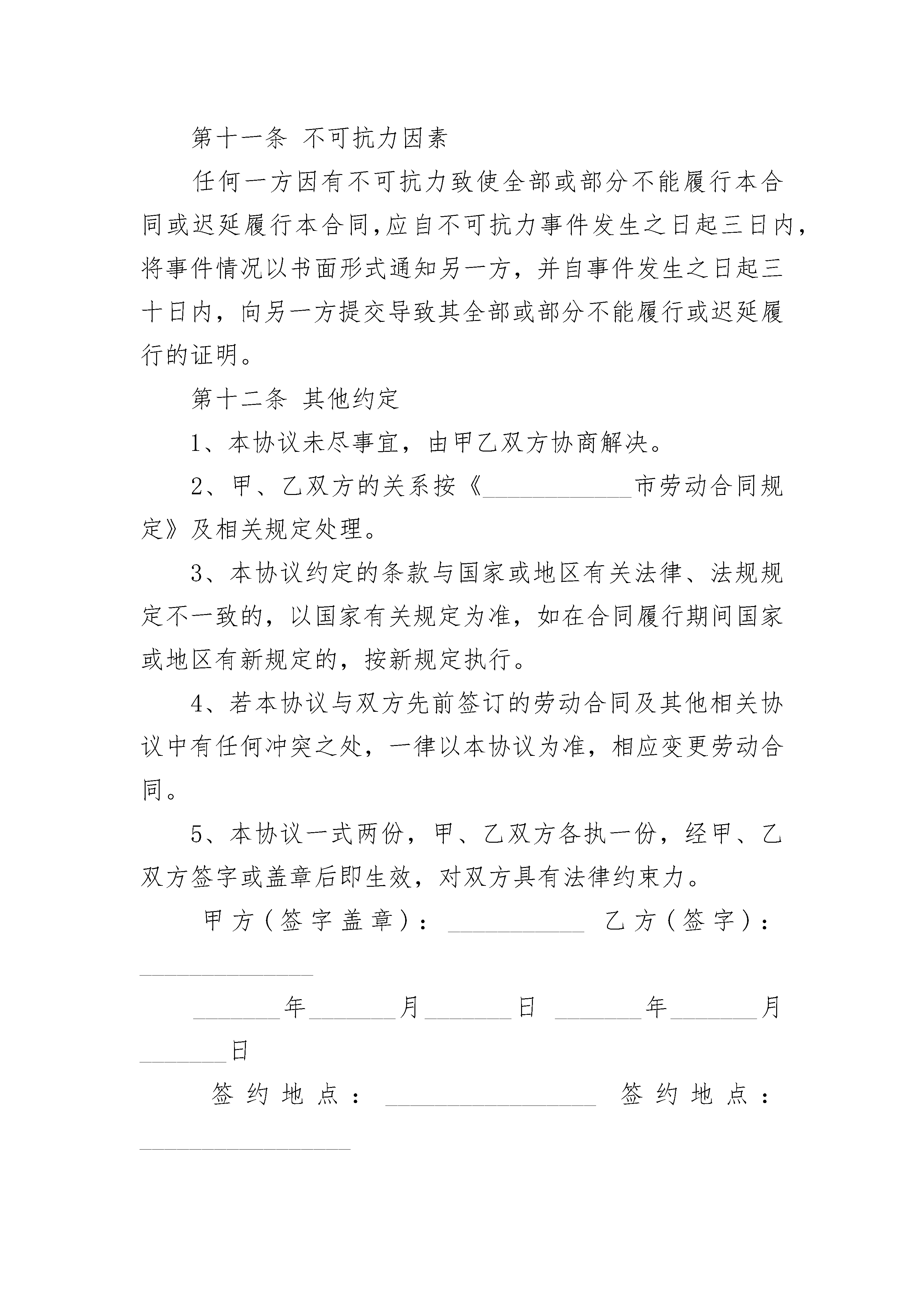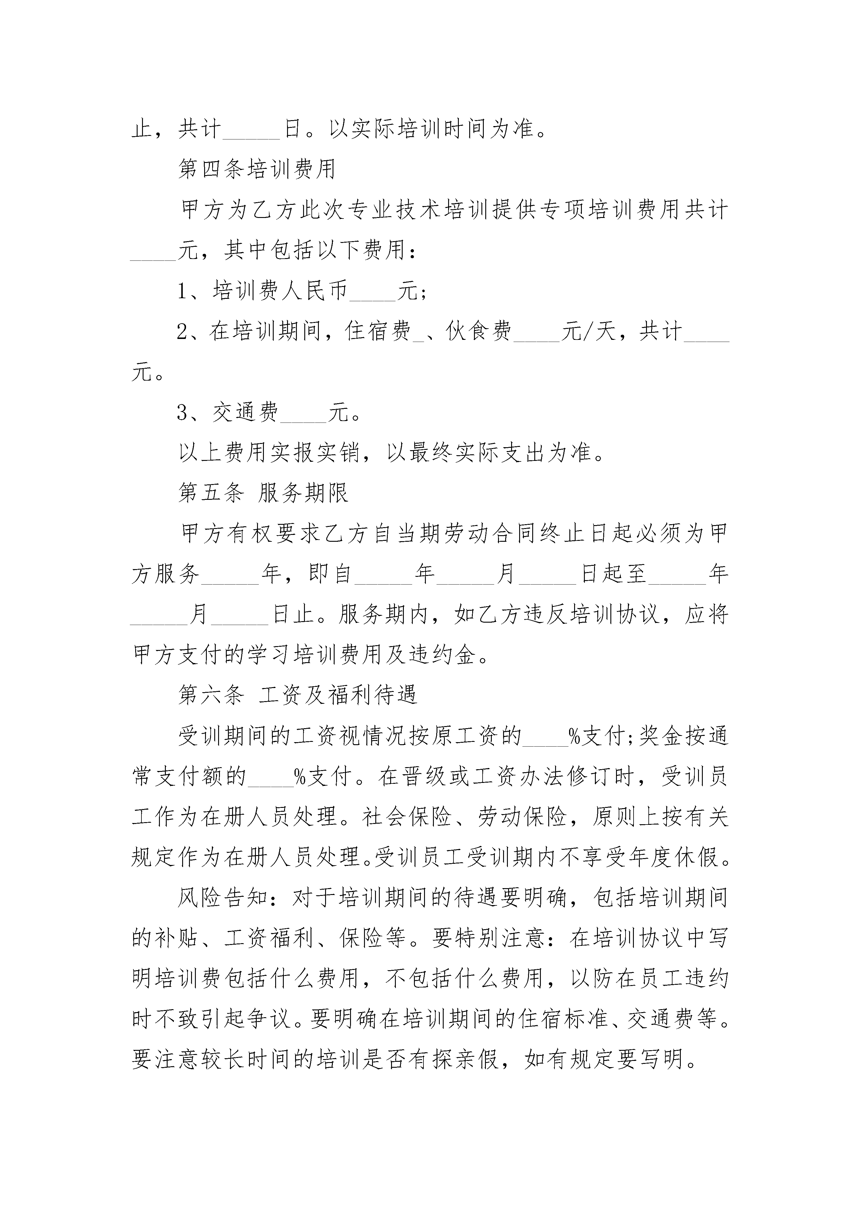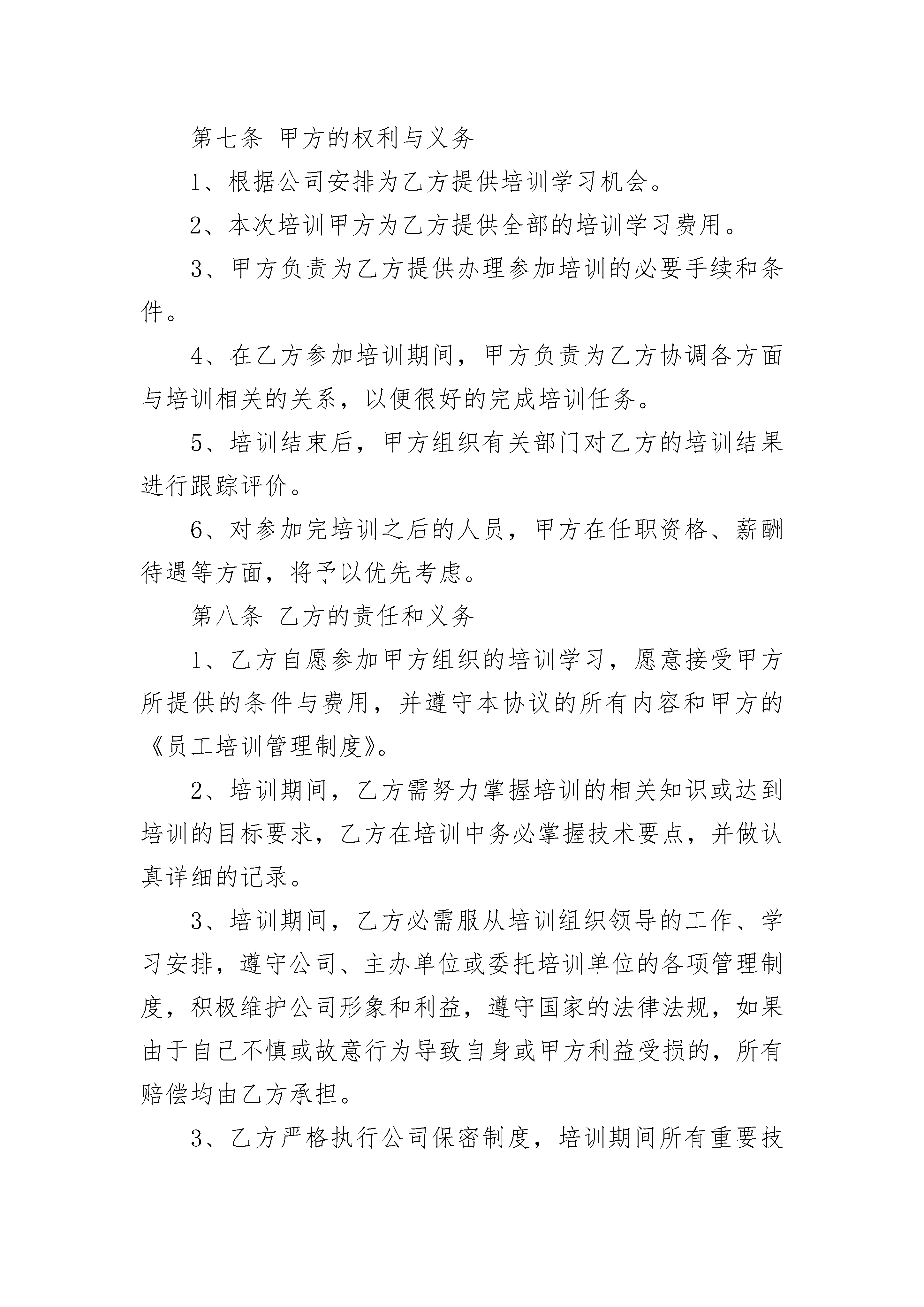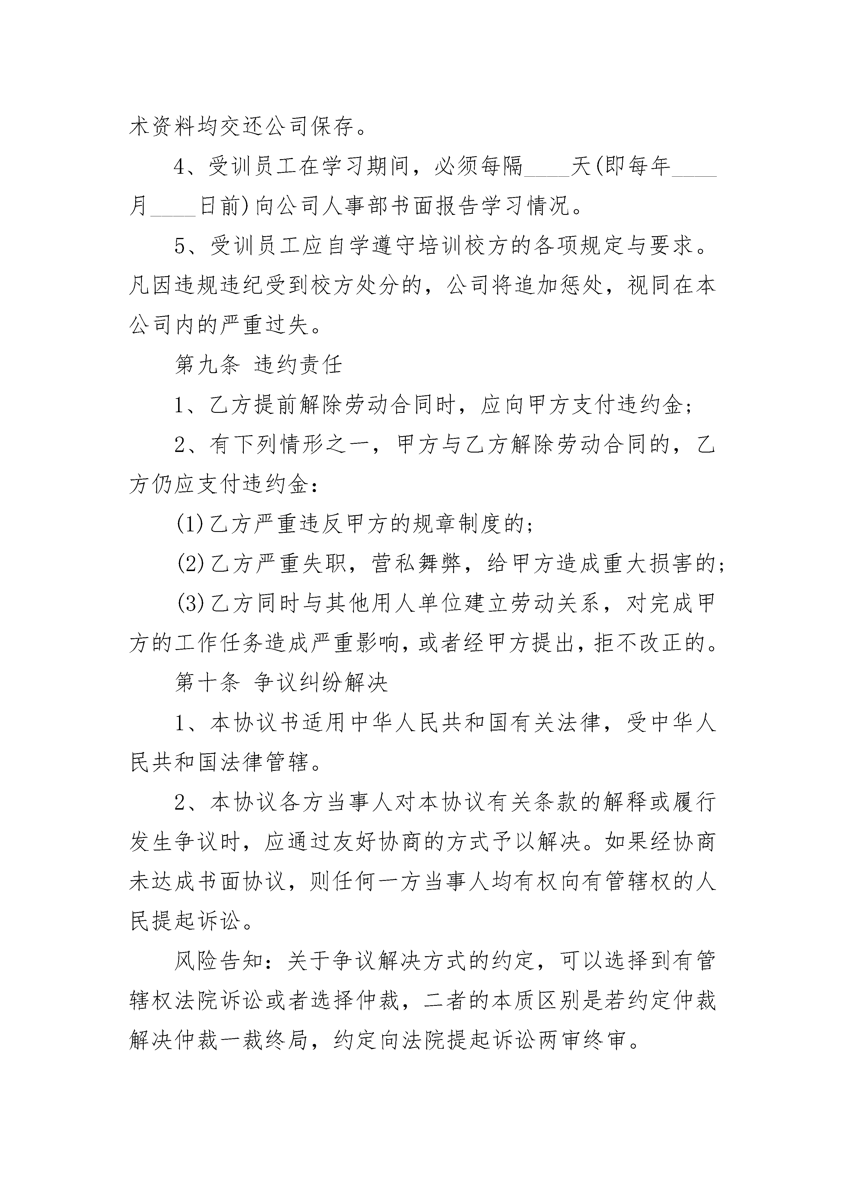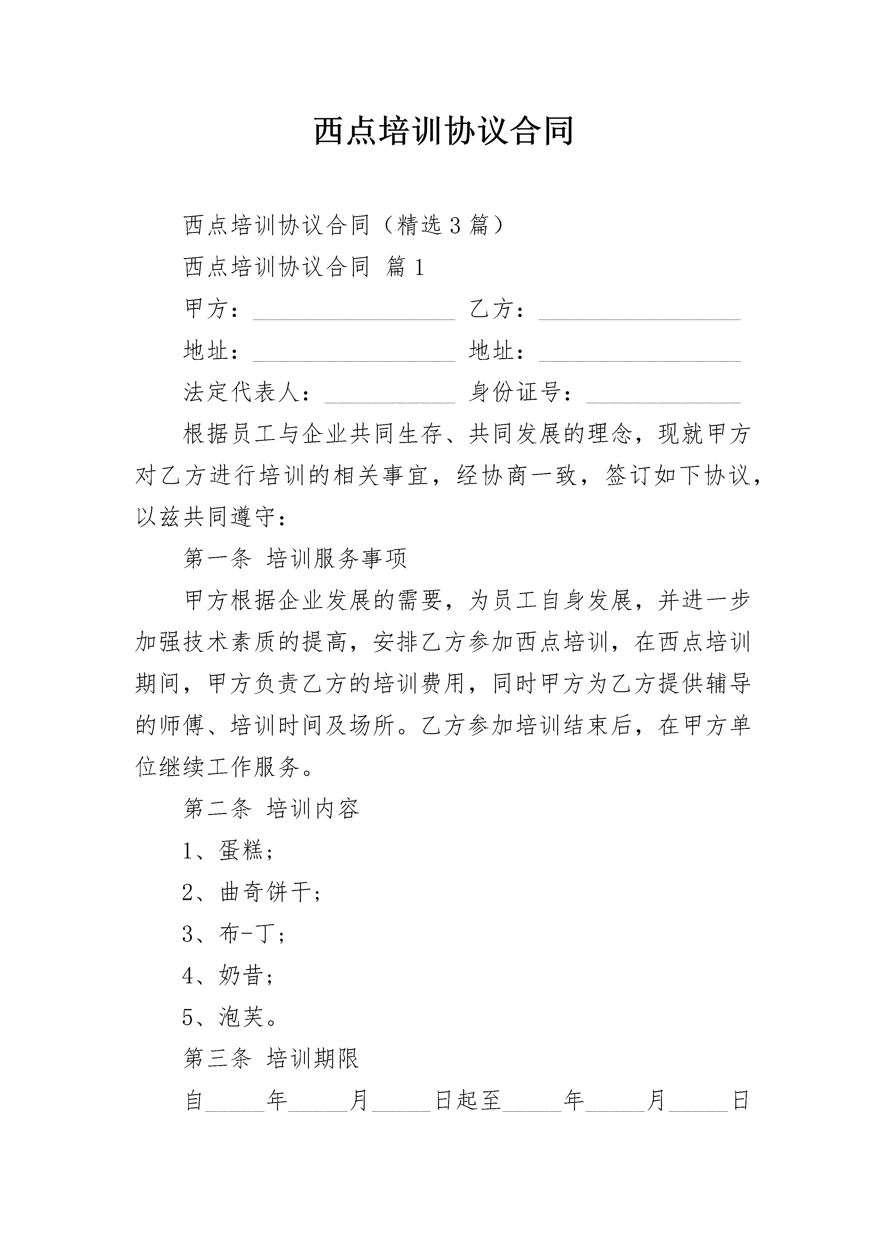 西点培训协议合同西点培训协议合同(精选3篇)西点培训协议合同篇1甲方:_________________乙方:_________________地址:_________________地址:_________________法定代表人:___________身份证号:_____________根据员工与企业共同生存、共同发展的理念,现就甲方对乙方进行培训的相关事宜,经协商一致,签订如下协议,以兹共同遵守:第一条培训服务事项甲方根据企业发展的需要,为员工自身发展,并进一步加强技术素质的提高,安排乙方参加西点培训,在西点培训期间,甲方负责乙方的培训费用,同时甲方为乙方提供辅导的师傅、培训时间及场所。乙方参加培训结束后,在甲方单位继续工作服务。第二条培训内容1、蛋糕;2、曲奇饼干;3、布-丁;4、奶昔;5、泡芙。第三条培训期限自_____年_____月_____日起至_____年_____月_____日止,共计_____日。以实际培训时间为准。第四条培训费用甲方为乙方此次专业技术培训提供专项培训费用共计____元,其中包括以下费用:1、培训费人民币____元;2、在培训期间,住宿费_、伙食费____元/天,共计____元。3、交通费____元。以上费用实报实销,以最终实际支出为准。第五条服务期限甲方有权要求乙方自当期劳动合同终止日起必须为甲方服务_____年,即自_____年_____月_____日起至_____年_____月_____日止。服务期内,如乙方违反培训协议,应将甲方支付的学习培训费用及违约金。第六条工资及福利待遇受训期间的工资视情况按原工资的____%支付;奖金按通常支付额的____%支付。在晋级或工资办法修订时,受训员工作为在册人员处理。社会保险、劳动保险,原则上按有关规定作为在册人员处理。受训员工受训期内不享受年度休假。风险告知:对于培训期间的待遇要明确,包括培训期间的补贴、工资福利、保险等。要特别注意:在培训协议中写明培训费包括什么费用,不包括什么费用,以防在员工违约时不致引起争议。要明确在培训期间的住宿标准、交通费等。要注意较长时间的培训是否有探亲假,如有规定要写明。第七条甲方的权利与义务1、根据公司安排为乙方提供培训学习机会。2、本次培训甲方为乙方提供全部的培训学习费用。3、甲方负责为乙方提供办理参加培训的必要手续和条件。4、在乙方参加培训期间,甲方负责为乙方协调各方面与培训相关的关系,以便很好的完成培训任务。5、培训结束后,甲方组织有关部门对乙方的培训结果进行跟踪评价。6、对参加完培训之后的人员,甲方在任职资格、薪酬待遇等方面,将予以优先考虑。第八条乙方的责任和义务1、乙方自愿参加甲方组织的培训学习,愿意接受甲方所提供的条件与费用,并遵守本协议的所有内容和甲方的《员工培训管理制度》。2、培训期间,乙方需努力掌握培训的相关知识或达到培训的目标要求,乙方在培训中务必掌握技术要点,并做认真详细的记录。3、培训期间,乙方必需服从培训组织领导的工作、学习安排,遵守公司、主办单位或委托培训单位的各项管理制度,积极维护公司形象和利益,遵守国家的法律法规,如果由于自己不慎或故意行为导致自身或甲方利益受损的,所有赔偿均由乙方承担。3、乙方严格执行公司保密制度,培训期间所有重要技术资料均交还公司保存。4、受训员工在学习期间,必须每隔____天(即每年____月____日前)向公司人事部书面报告学习情况。5、受训员工应自学遵守培训校方的各项规定与要求。凡因违规违纪受到校方处分的,公司将追加惩处,视同在本公司内的严重过失。第九条违约责任1、乙方提前解除劳动合同时,应向甲方支付违约金;2、有下列情形之一,甲方与乙方解除劳动合同的,乙方仍应支付违约金:(1)乙方严重违反甲方的规章制度的;(2)乙方严重失职,营私舞弊,给甲方造成重大损害的;(3)乙方同时与其他用人单位建立劳动关系,对完成甲方的工作任务造成严重影响,或者经甲方提出,拒不改正的。第十条争议纠纷解决1、本协议书适用中华人民共和国有关法律,受中华人民共和国法律管辖。2、本协议各方当事人对本协议有关条款的解释或履行发生争议时,应通过友好协商的方式予以解决。如果经协商未达成书面协议,则任何一方当事人均有权向有管辖权的人民提起诉讼。风险告知:关于争议解决方式的约定,可以选择到有管辖权法院诉讼或者选择仲裁,二者的本质区别是若约定仲裁解决仲裁一裁终局,约定向法院提起诉讼两审终审。第十一条不可抗力因素任何一方因有不可抗力致使全部或部分不能履行本合同或迟延履行本合同,应自不可抗力事件发生之日起三日内,将事件情况以书面形式通知另一方,并自事件发生之日起三十日内,向另一方提交导致其全部或部分不能履行或迟延履行的证明。第十二条其他约定1、本协议未尽事宜,由甲乙双方协商解决。2、甲、乙双方的关系