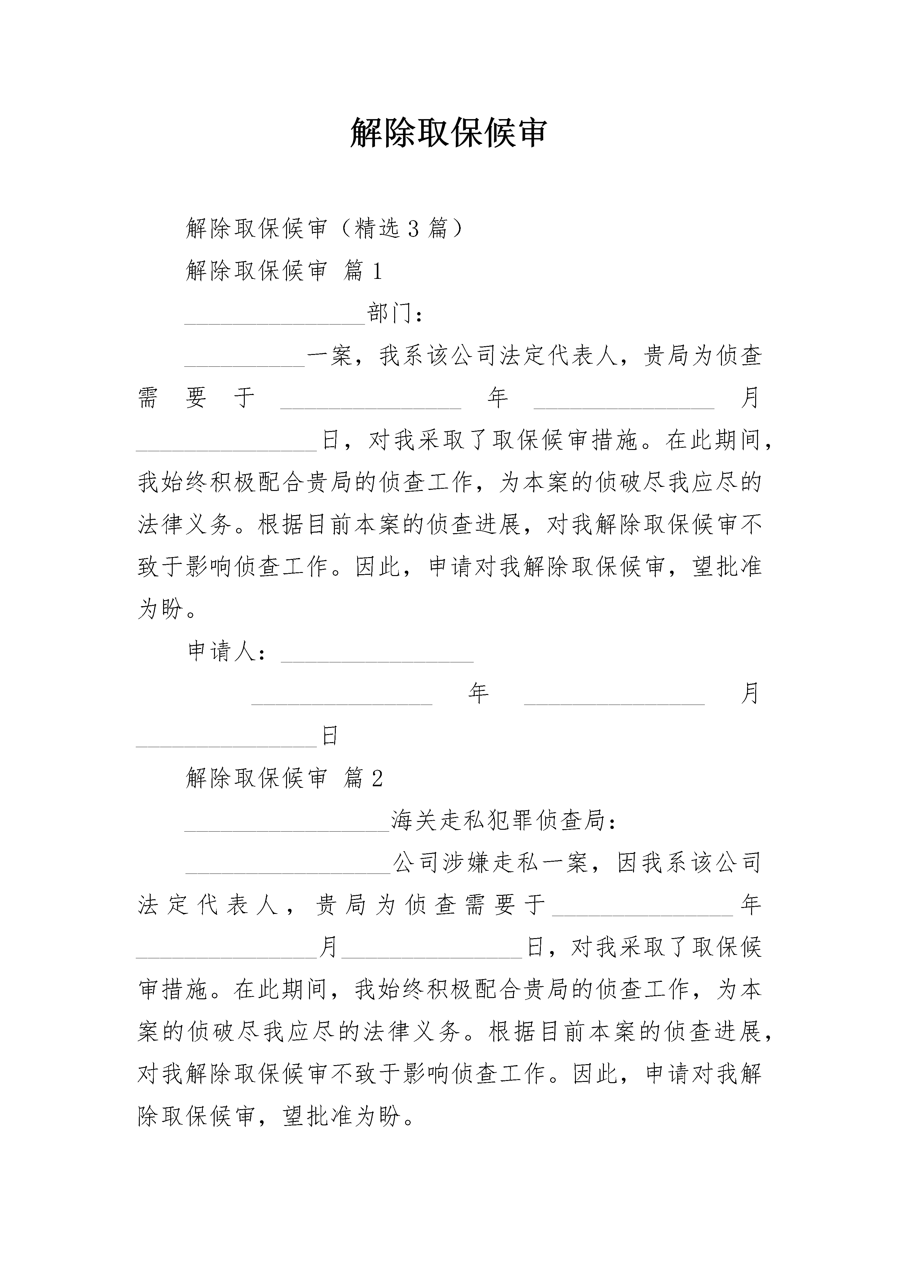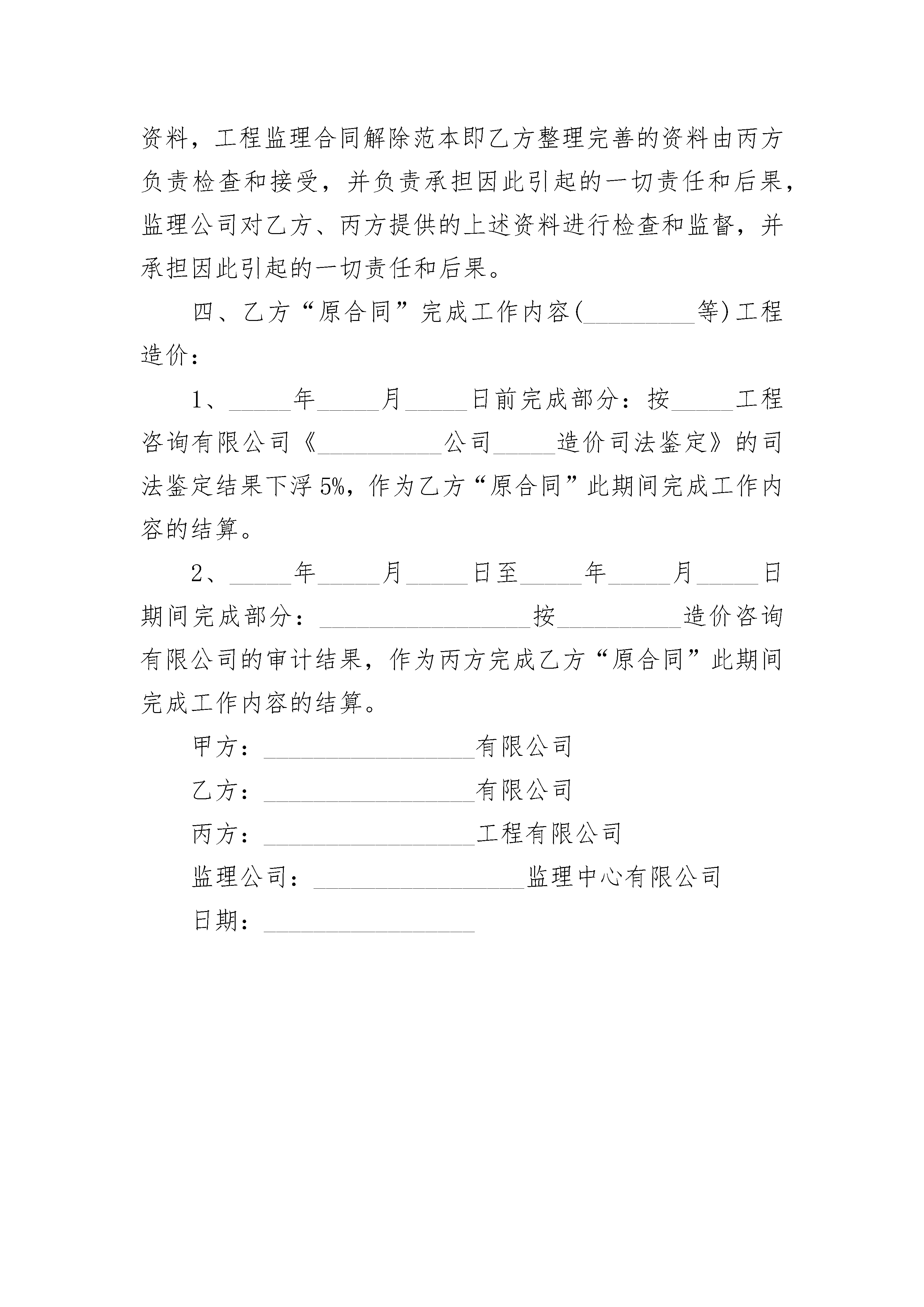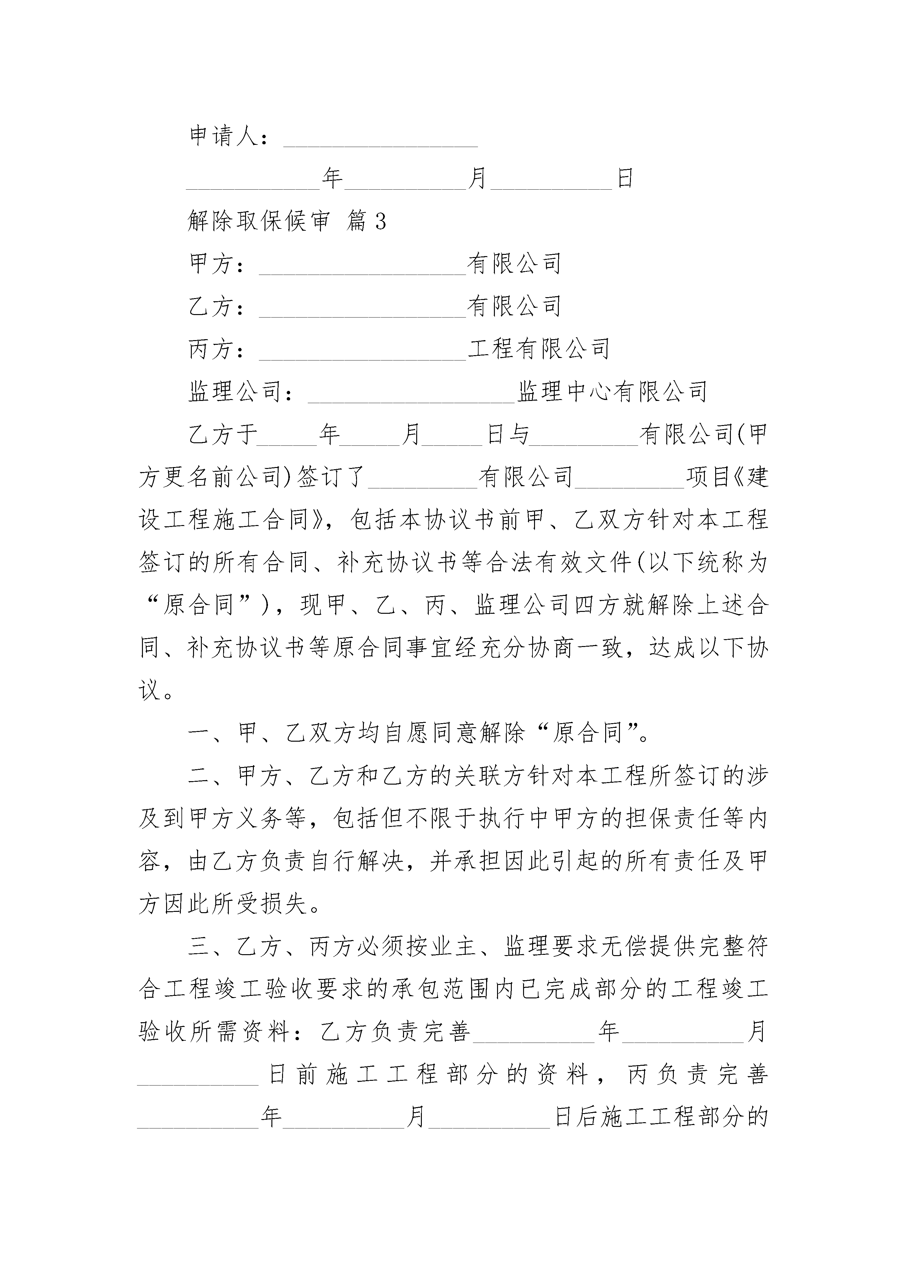 解除取保候审解除取保候审(精选3篇)解除取保候审篇1_______________部门:__________一案,我系该公司法定代表人,贵局为侦查需要于_______________年_______________月_______________日,对我采取了取保候审措施。在此期间,我始终积极配合贵局的侦查工作,为本案的侦破尽我应尽的法律义务。根据目前本案的侦查进展,对我解除取保候审不致于影响侦查工作。因此,申请对我解除取保候审,望批准为盼。申请人:_______________________________年_______________月_______________日解除取保候审篇2_________________海关走私犯罪侦查局:_________________公司涉嫌走私一案,因我系该公司法定代表人,贵局为侦查需要于_______________年_______________月_______________日,对我采取了取保候审措施。在此期间,我始终积极配合贵局的侦查工作,为本案的侦破尽我应尽的法律义务。根据目前本案的侦查进展,对我解除取保候审不致于影响侦查工作。因此,申请对我解除取保候审,望批准为盼。申请人:___________________________年__________月__________日解除取保候审篇3甲方:_________________有限公司乙方:_________________有限公司丙方:_________________工程有限公司监理公司:_________________监理中心有限公司乙方于_____年_____月_____日与_________有限公司(甲方更名前公司)签订了_________有限公司_________项目《建设工程施工合同》,包括本协议书前甲、乙双方针对本工程签订的所有合同、补充协议书等合法有效文件(以下统称为“原合同”),现甲、乙、丙、监理公司四方就解除上述合同、补充协议书等原合同事宜经充分协商一致,达成以下协议。一、甲、乙双方均自愿同意解除“原合同”。二、甲方、乙方和乙方的关联方针对本工程所签订的涉及到甲方义务等,包括但不限于执行中甲方的担保责任等内容,由乙方负责自行解决,并承担因此引起的所有责任及甲方因此所受损失。三、乙方、丙方必须按业主、监理要求无偿提供完整符合工程竣工验收要求的承包范围内已完成部分的工程竣工验收所需资料:乙方负责完善__________年__________月__________日前施工工程部分的资料,丙负责完善__________年__________月__________日后施工工程部分的资料,工程监理合同解除范本即乙方整理完善的资料由丙方负责检查和接受,并负责承担因此引起的一切责任和后果,监理公司对乙方、丙方提供的上述资料进行检查和监督,并承担因此引起的一切责任和后果。四、乙方“原合同”完成工作内容(_________等)工程造价:1、_____年_____月_____日前完成部分:按_____工程咨询有限公司《__________公司_____造价司法鉴定》的司法鉴定结果下浮5%,作为乙方“原合同”此期间完成工作内容的结算。2、_____年_____月_____日至_____年_____月_____日期间完成部分:_________________按__________造价咨询有限公司的审计结果,作为丙方完成乙方“原合同”此期间完成工作内容的结算。甲方:_________________有限公司乙方:_________________有限公司丙方:_________________工程有限公司监理公司:_________________监理中心有限公司日期:_________________