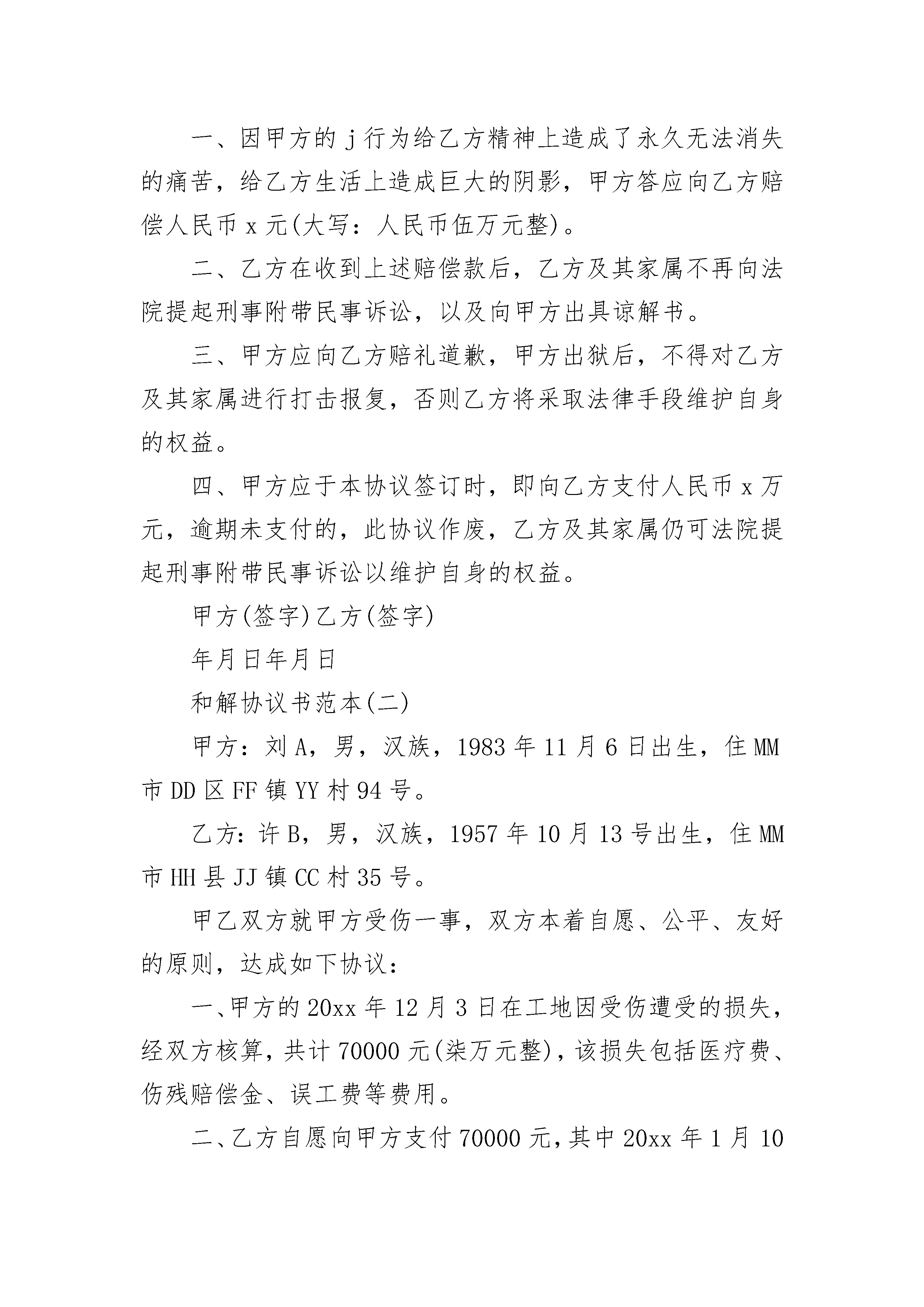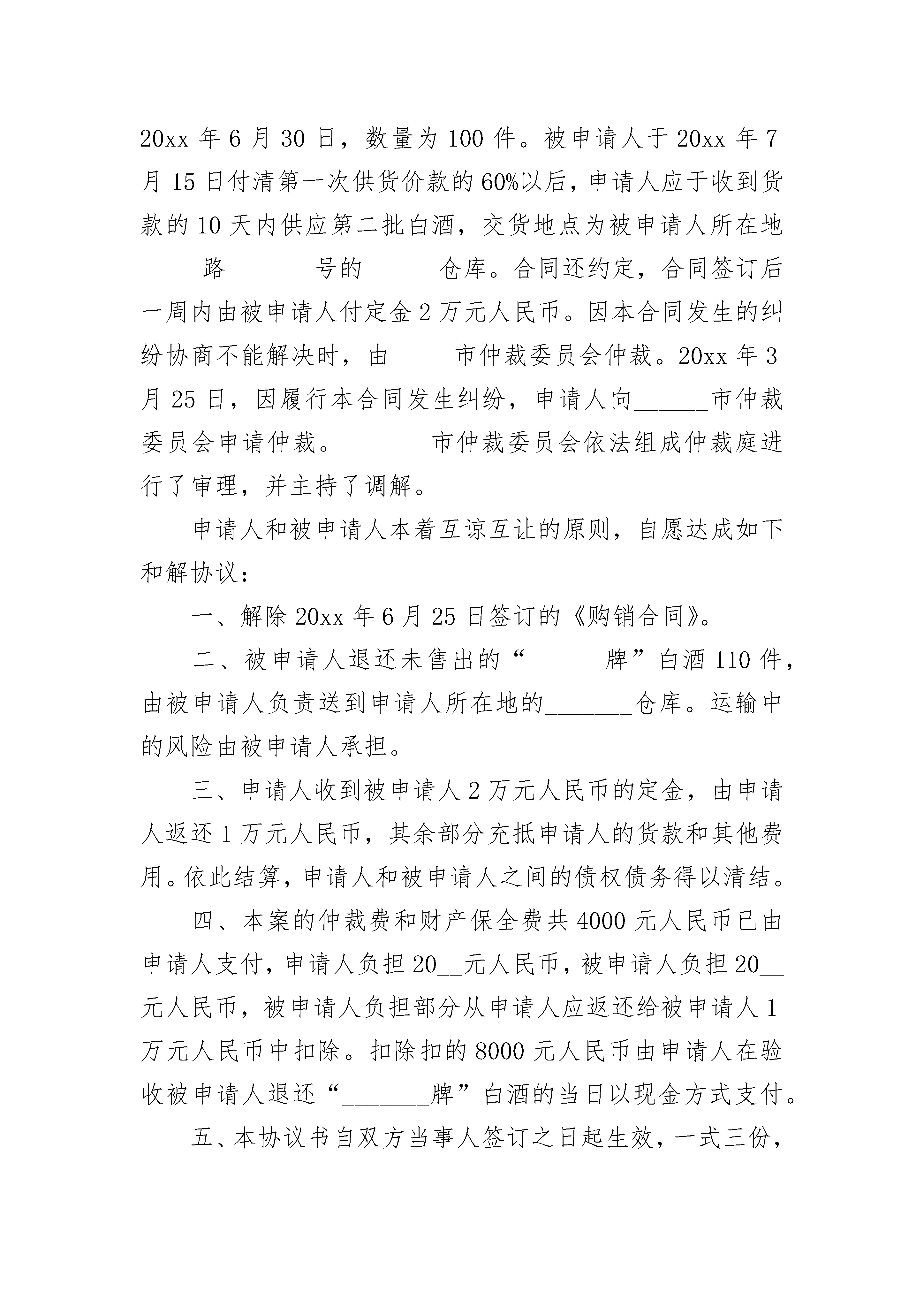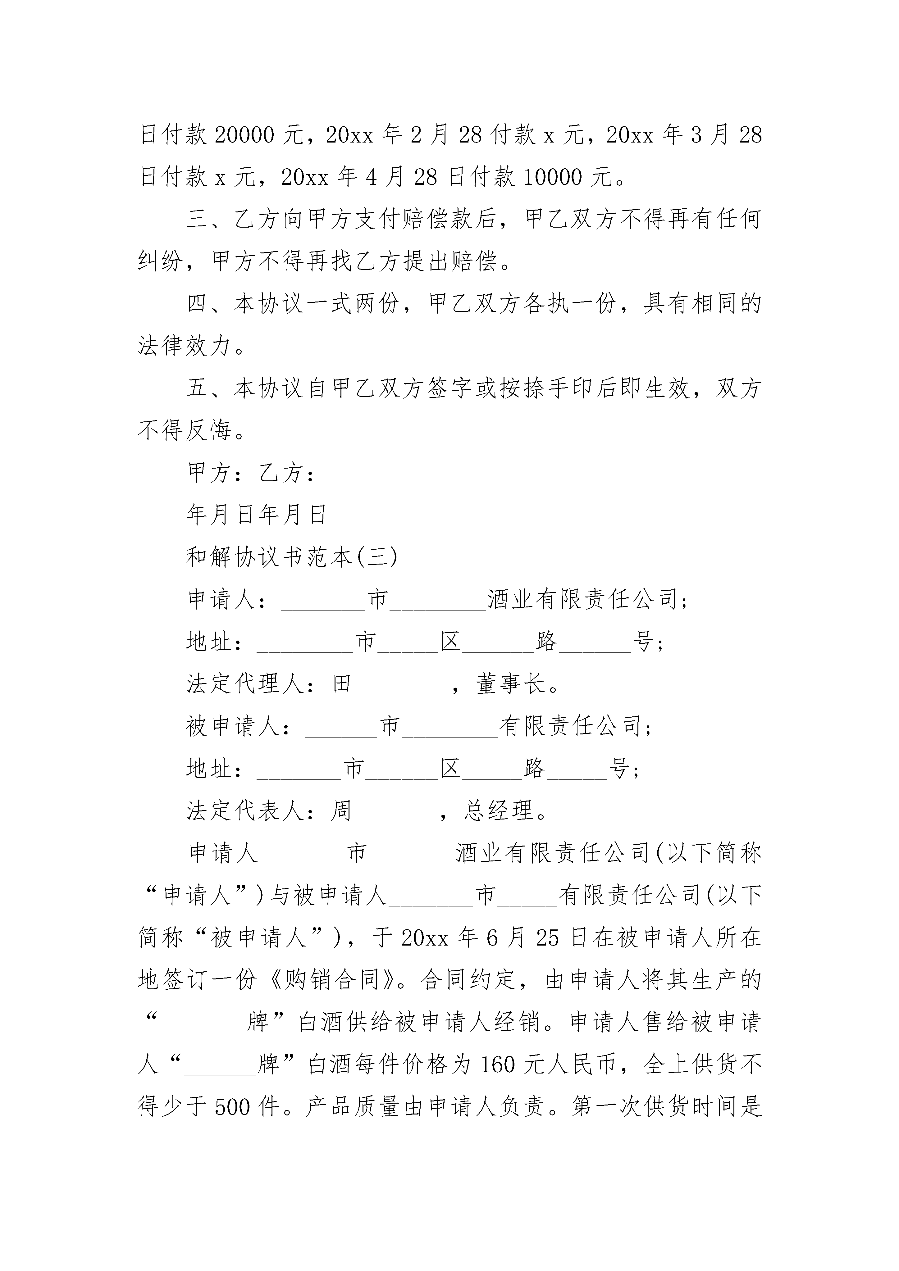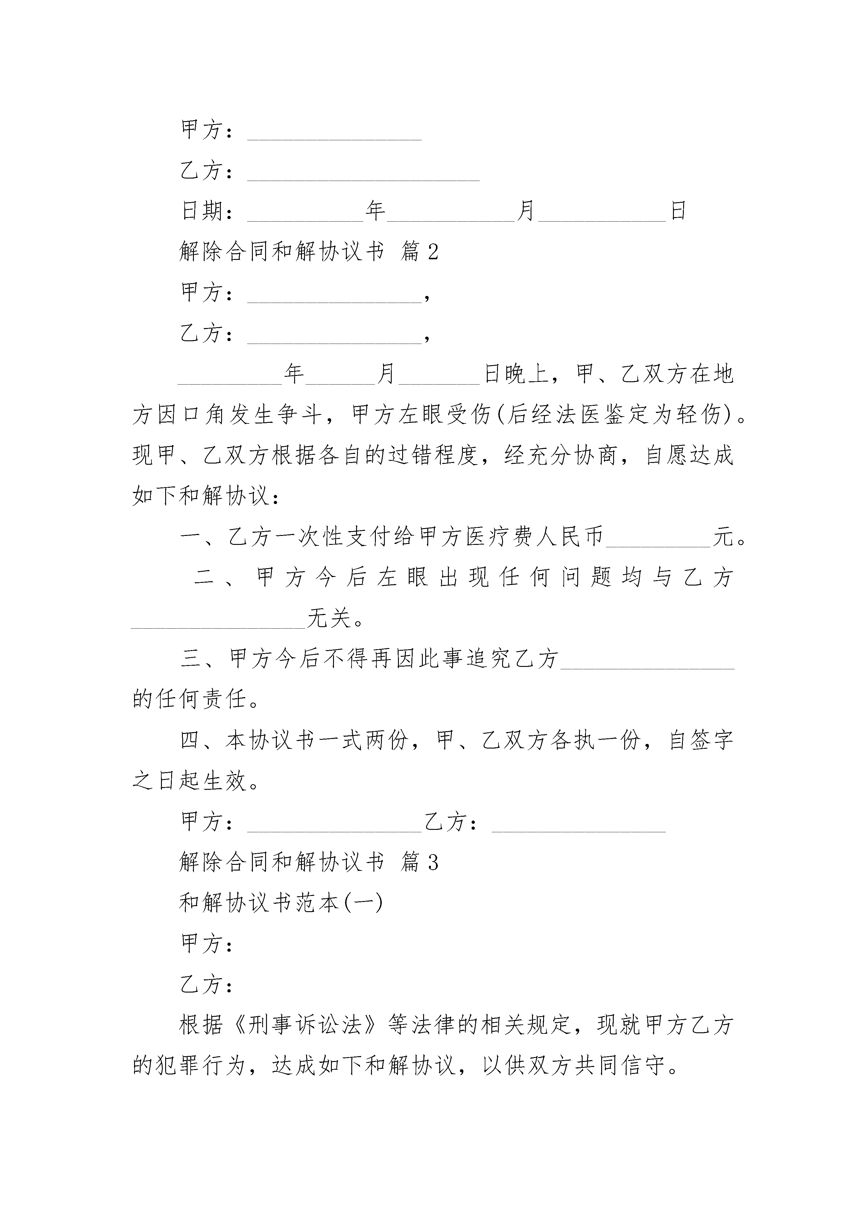 解除合同和解协议书解除合同和解协议书(精选3篇)解除合同和解协议书篇1甲方:_______________乙方:_______________根据实际情况,在平等协商,自愿互谅的基础上,本于诚信,甲乙双方达成如下解除合同协议书范本:第一、甲乙双方同意解除___________年___________月___________日签订的《工程承包合同》及其它相关协议。自协议解除之日起,甲乙双方彼此之间的权利、义务关系自行消灭。甲乙双方相互不再以任何形式追求对方的违约责任。第二、甲乙双方同意对于合同订立、执行过程中各自的任何形式的损失自行负责担。第三、鉴于合同未能履行是由于客观经济形势变迁造成的,甲方同意于本协议签订之日一次性退还乙方已经交纳的甲方施工管理费__________万元;待该工程施工完成计量结算后(__________年___________月___________日前)甲方退还乙方已交纳甲方__________万元履约保证金。第四、甲乙双方都保留通过诉讼解决本合同争议的权利,在本协议生效后,如果任何一方不履行本协议约定的义务,另一方有权寻求通过诉讼解决争议。在诉讼过程中,本协议将不利于违约方的解释。第五、未尽事宜双方协商解决。甲方:_______________乙方:____________________日期:__________年___________月___________日解除合同和解协议书篇2甲方:_______________,乙方:_______________,_________年______月_______日晚上,甲、乙双方在地方因口角发生争斗,甲方左眼受伤(后经法医鉴定为轻伤)。现甲、乙双方根据各自的过错程度,经充分协商,自愿达成如下和解协议:一、乙方一次性支付给甲方医疗费人民币_________元。二、甲方今后左眼出现任何问题均与乙方_______________无关。三、甲方今后不得再因此事追究乙方_______________的任何责任。四、本协议书一式两份,甲、乙双方各执一份,自签字之日起生效。甲方:_______________乙方:_______________解除合同和解协议书篇3和解协议书范本(一)甲方:乙方:根据《刑事诉讼法》等法律的相关规定,现就甲方乙方的犯罪行为,达成如下和解协议,以供双方共同信守。一、因甲方的j行为给乙方精神上造成了永久无法消失的痛苦,给乙方生活上造成巨大的阴影,甲方答应向乙方赔偿人民币x元(大写:人民币伍万元整)。二、乙方在收到上述赔偿款后,乙方及其家属不再向法院提起刑事附带民事诉讼,以及向甲方出具谅解书。三、甲方应向乙方赔礼道歉,甲方出狱后,不得对乙方及其家属进行打击报复,否则乙方将采取法律手段维护自身的权益。四、甲方应于本协议签订时,即向乙方支付人民币x万元,逾期未支付的,此协议作废,乙方及其家属仍可法院提起刑事附带民事诉讼以维护自身的权益。甲方(签字)乙方(签字)年月日年月日和解协议书范本(二)甲方:刘A,男,汉族,1983年11月6日出生,住MM市DD区FF镇YY村94号。乙方:许B,男,汉族,1957年10月13号出生,住MM市HH县JJ镇CC村35号。甲乙双方就甲方受伤一事,双方本着自愿、公平、友好的原则,达成如下协议:一、甲方的20xx年12月3日在工地因受伤遭受的损失,经双方核算,共计70000元(柒万元整),该损失包括医疗费、伤残赔偿金、误工费等费用。二、乙方自愿向甲方支付70000元,其中20xx年1月10日付款20000元,20xx年2月28付款x元,20xx年3月28日付款x元,20xx年4月28日付款10000元。三、乙方向甲方支付赔偿款后,甲乙双方不得再有任何纠纷,甲方不得再找乙方提出赔偿。四、本协议一式两份,甲乙双方各执一份,具有相同的法律效力。五、本协议自甲乙双方签字或按捺手印后即生效,双方不得反悔。甲方:乙方:年月日年月日和解协议书范本(三)申请人:_______市________酒业有限责任公司;地址:________市_____区______路______号;法定代理人:田________,董事长。被申请人:______市________有限责任公司;地址:_______市______区_____路_____号;法定代表人:周_______,总经理。申请人_______市_______酒业有限责任公司(以下简称“申请人”)与被申请人_______市_____有限责任公司(以下简称“被申请人”),于20xx年6月25日在被申请人所在地签订一份《购销合同》。合同约定,由申请人将其生产的“_______牌”白酒供给被申请人经销。申请人售给被申请人“______牌”白酒每件价格为160元人民币,全上供货不得少于500件。产品质