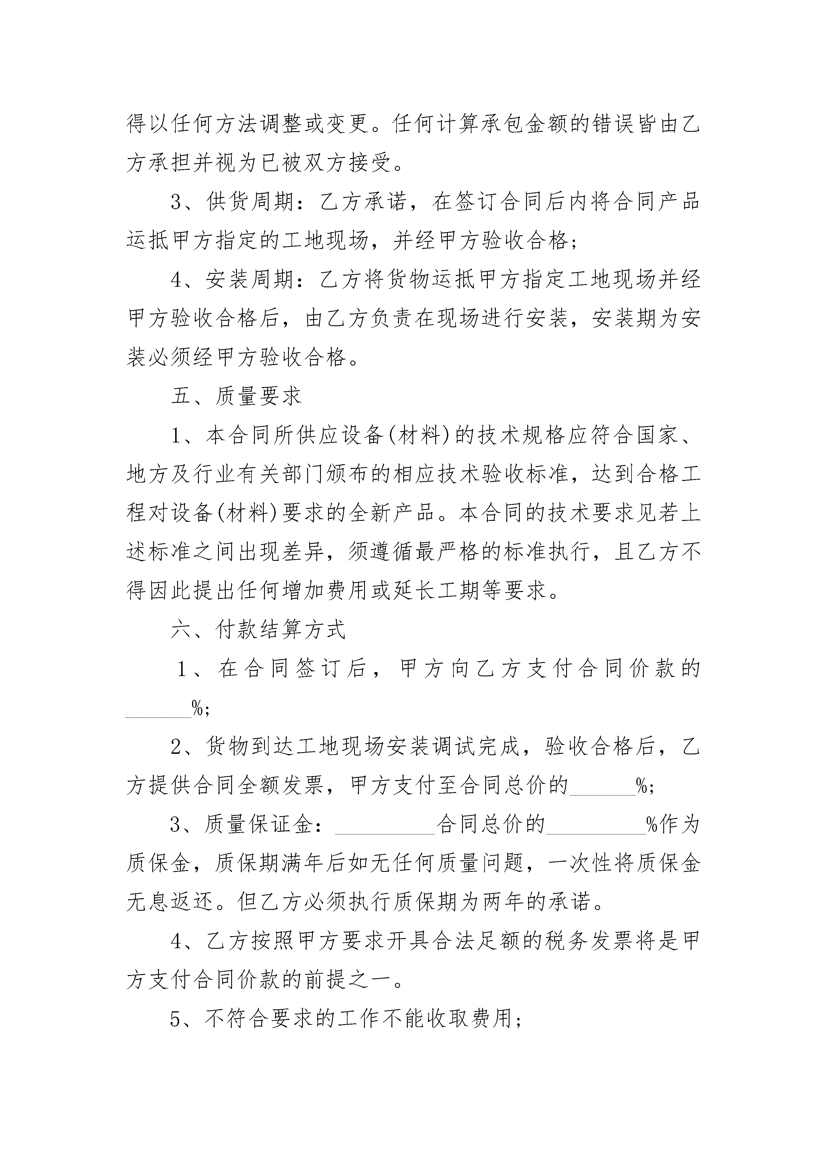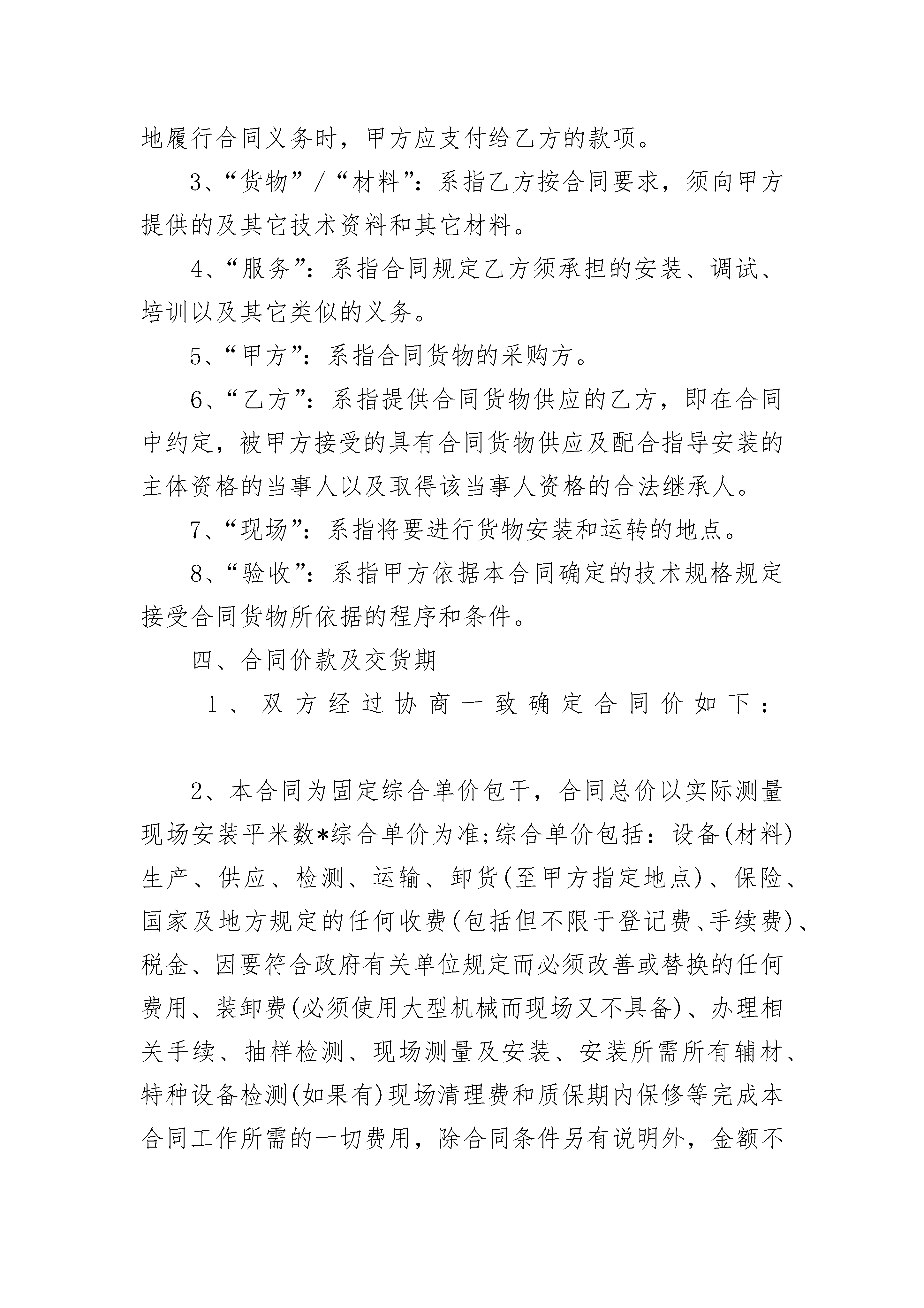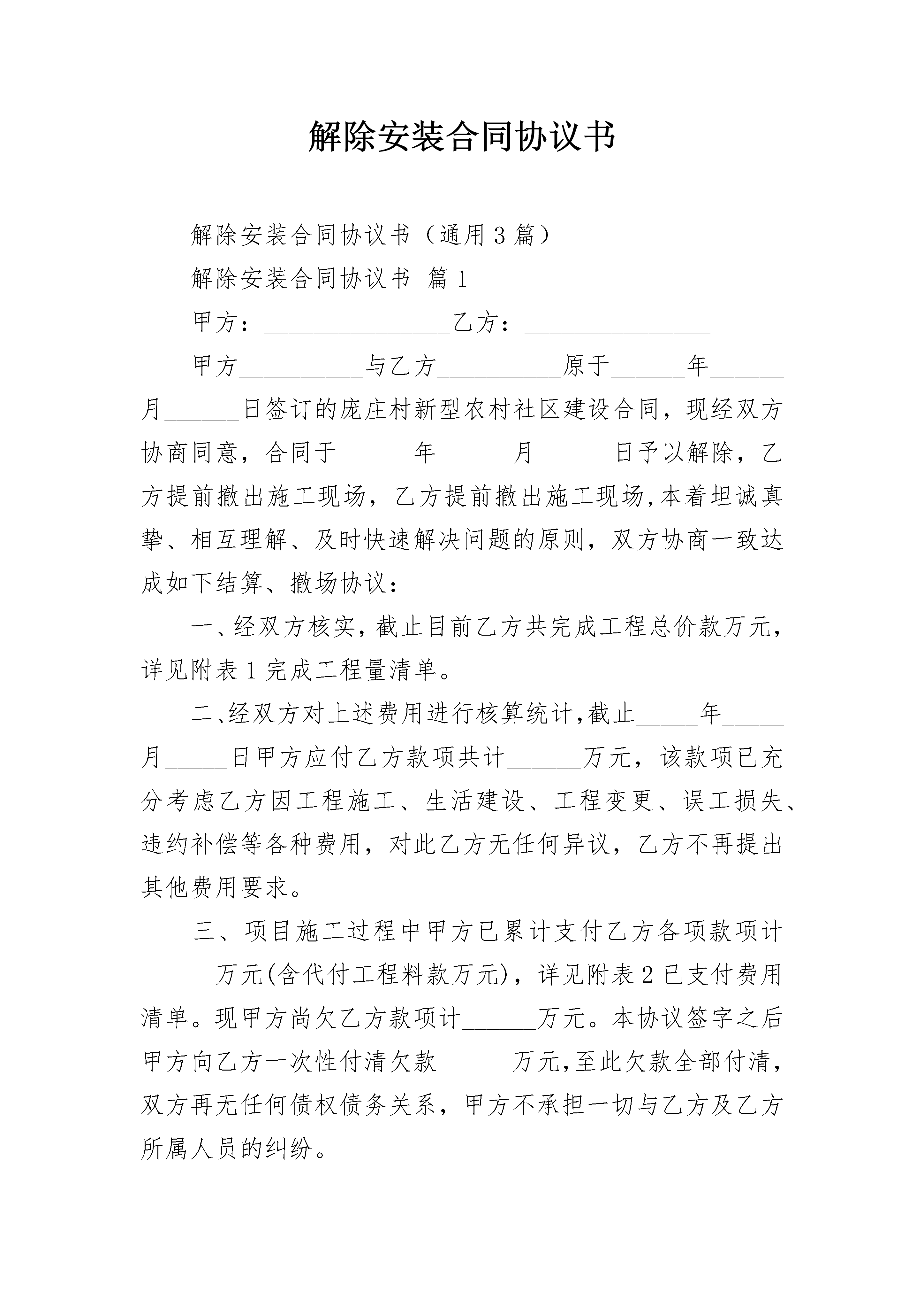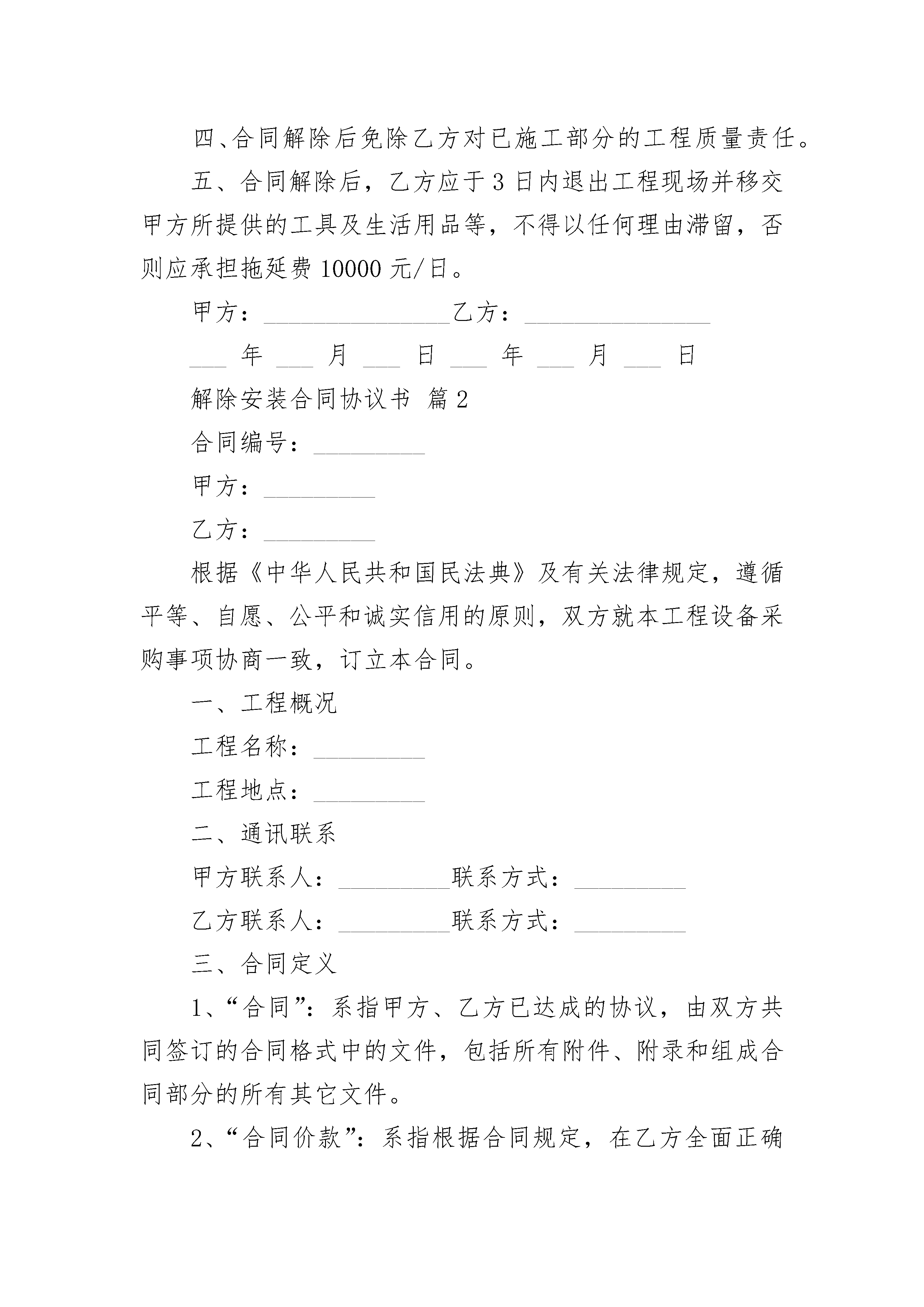 解除安装合同协议书解除安装合同协议书(通用3篇)解除安装合同协议书篇1甲方:_______________乙方:_______________甲方__________与乙方__________原于______年______月______日签订的庞庄村新型农村社区建设合同,现经双方协商同意,合同于______年______月______日予以解除,乙方提前撤出施工现场,乙方提前撤出施工现场,本着坦诚真挚、相互理解、及时快速解决问题的原则,双方协商一致达成如下结算、撤场协议:一、经双方核实,截止目前乙方共完成工程总价款万元,详见附表1完成工程量清单。二、经双方对上述费用进行核算统计,截止_____年_____月_____日甲方应付乙方款项共计______万元,该款项已充分考虑乙方因工程施工、生活建设、工程变更、误工损失、违约补偿等各种费用,对此乙方无任何异议,乙方不再提出其他费用要求。三、项目施工过程中甲方已累计支付乙方各项款项计______万元(含代付工程料款万元),详见附表2已支付费用清单。现甲方尚欠乙方款项计______万元。本协议签字之后甲方向乙方一次性付清欠款______万元,至此欠款全部付清,双方再无任何债权债务关系,甲方不承担一切与乙方及乙方所属人员的纠纷。四、合同解除后免除乙方对已施工部分的工程质量责任。五、合同解除后,乙方应于3日内退出工程现场并移交甲方所提供的工具及生活用品等,不得以任何理由滞留,否则应承担拖延费10000元/日。甲方:_______________乙方:__________________年___月___日___年___月___日解除安装合同协议书篇2合同编号:_________甲方:_________乙方:_________根据《中华人民共和国民法典》及有关法律规定,遵循平等、自愿、公平和诚实信用的原则,双方就本工程设备采购事项协商一致,订立本合同。一、工程概况工程名称:_________工程地点:_________二、通讯联系甲方联系人:_________联系方式:_________乙方联系人:_________联系方式:_________三、合同定义1、“合同”:系指甲方、乙方已达成的协议,由双方共同签订的合同格式中的文件,包括所有附件、附录和组成合同部分的所有其它文件。2、“合同价款”:系指根据合同规定,在乙方全面正确地履行合同义务时,甲方应支付给乙方的款项。3、“货物”/“材料”:系指乙方按合同要求,须向甲方提供的及其它技术资料和其它材料。4、“服务”:系指合同规定乙方须承担的安装、调试、培训以及其它类似的义务。5、“甲方”:系指合同货物的采购方。6、“乙方”:系指提供合同货物供应的乙方,即在合同中约定,被甲方接受的具有合同货物供应及配合指导安装的主体资格的当事人以及取得该当事人资格的合法继承人。7、“现场”:系指将要进行货物安装和运转的地点。8、“验收”:系指甲方依据本合同确定的技术规格规定接受合同货物所依据的程序和条件。四、合同价款及交货期1、双方经过协商一致确定合同价如下:__________________2、本合同为固定综合单价包干,合同总价以实际测量现场安装平米数*综合单价为准;综合单价包括:设备(材料)生产、供应、检测、运输、卸货(至甲方指定地点)、保险、国家及地方规定的任何收费(包括但不限于登记费、手续费)、税金、因要符合政府有关单位规定而必须改善或替换的任何费用、装卸费(必须使用大型机械而现场又不具备)、办理相关手续、抽样检测、现场测量及安装、安装所需所有辅材、特种设备检测(如果有)现场清理费和质保期内保修等完成本合同工作所需的一切费用,除合同条件另有说明外,金额不得以任何方法调整或变更。任何计算承包金额的错误皆由乙方承担并视为已被双方接受。3、供货周期:乙方承诺,在签订合同后内将合同产品运抵甲方指定的工地现场,并经甲方验收合格;4、安装周期:乙方将货物运抵甲方指定工地现场并经甲方验收合格后,由乙方负责在现场进行安装,安装期为安装必须经甲方验收合格。五、质量要求1、本合同所供应设备(材料)的技术规格应符合国家、地方及行业有关部门颁布的相应技术验收标准,达到合格工程对设备(材料)要求的全新产品。本合同的技术要求见若上述标准之间出现差异,须遵循最严格的标准执行,且乙方不得因此提出任何增加费用或延长工期等要求。六、付款结算方式1、在合同签订后,甲方向乙方支付合同价款的______%;2、货物到达工地现场安装调试完成,验收合格后,乙方提供合同全额发票,甲方支付至合同总价的______%;3、质量保证金:_________合同总价的_________%作为质保金,质保期满年后如无任何质量问题,一次性将质保金无息返还。但乙方必须执行质保期为两年的承诺。4、乙方按照甲方要求开