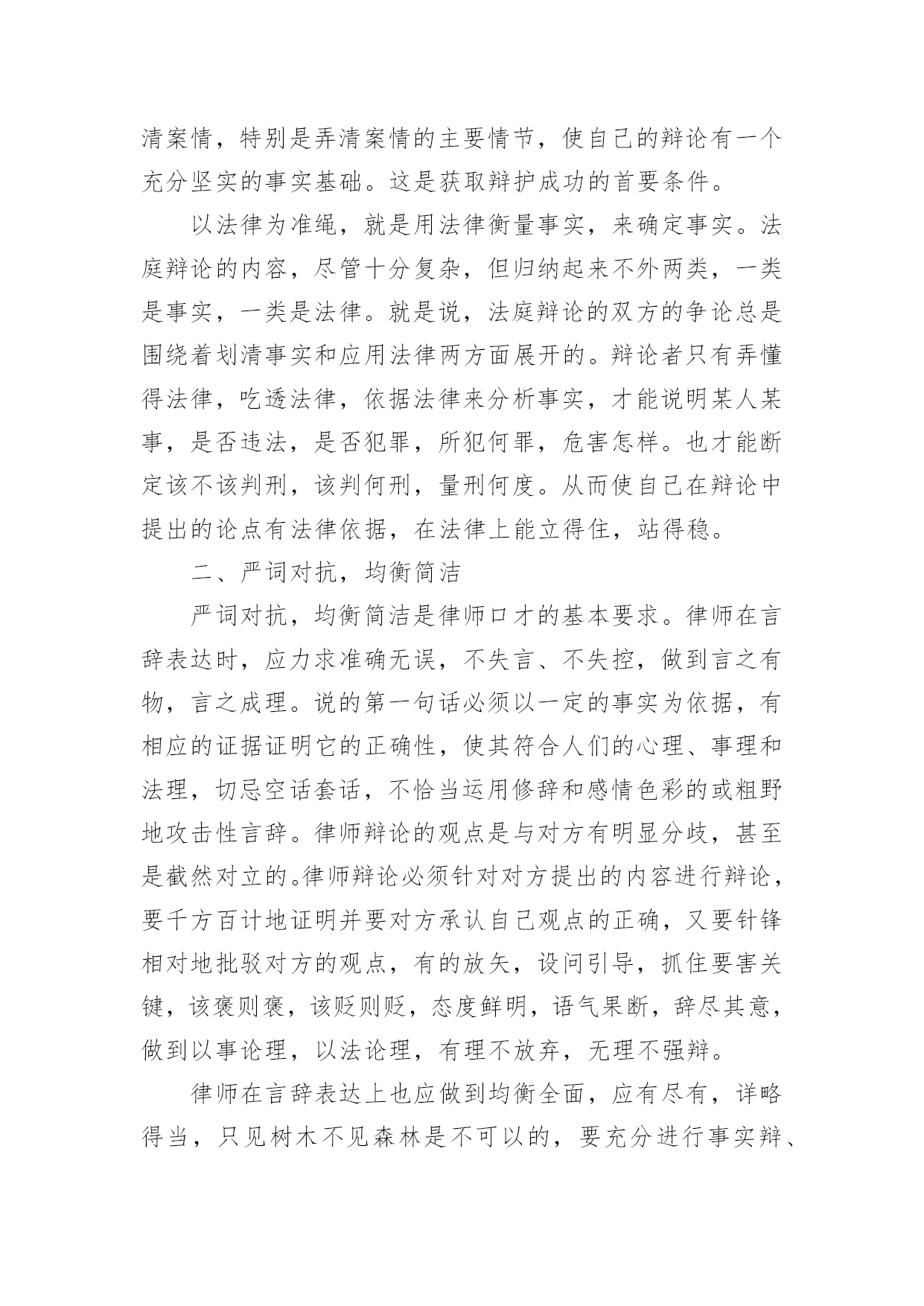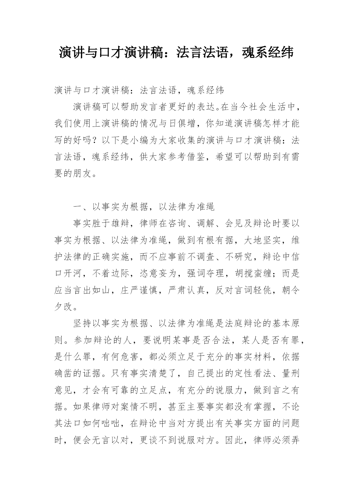 演讲与口才演讲稿:法言法语,魂系经纬 演讲与口才演讲稿:法言法语,魂系经纬演讲稿可以帮助发言者更好的表达。在当今社会生活中,我们使用上演讲稿的情况与日俱增,你知道演讲稿怎样才能写的好吗?以下是小编为大家收集的演讲与口才演讲稿:法言法语,魂系经纬,供大家参考借鉴,希望可以帮助到有需要的朋友。一、以事实为根据,以法律为准绳事实胜于雄辩,律师在咨询、调解、会见及辩论时要以事实为根据、以法律为准绳,做到有根有据,大地坚实,维护法律的正确实施,而不应事前不调查、不研究,辩论中信口开河,不着边际,恣意妄为,强词夺理,胡搅蛮缠;而是应当言出如山,庄严谨慎,严肃认真,反对言词轻佻,朝令夕改。坚持以事实为根据、以法律为准绳是法庭辩论的基本原则。参加辩论的人,要说明某事是否合法,某人是否有罪,是什么罪,有何危害,都必须立足于充分的事实材料,依据确凿的证据。只有事实清楚了,自己提出的定性看法、量刑意见,才会有可靠的立足点,有充分的说服力,做到言之有据。如果律师对案情不明,甚至主要事实都没有掌握,不论其法口如何咄咄,在辩论中当对方提出有关事实方面的问题时,便会无言以对,更谈不到说服对方。因此,律师必须弄清案情,特别是弄清案情的主要情节,使自己的辩论有一个充分坚实的事实基础。这是获取辩护成功的首要条件。以法律为准绳,就是用法律衡量事实,来确定事实。法庭辩论的内容,尽管十分复杂,但归纳起来不外两类,一类是事实,一类是法律。就是说,法庭辩论的双方的争论总是围绕着划清事实和应用法律两方面展开的。辩论者只有弄懂得法律,吃透法律,依据法律来分析事实,才能说明某人某事,是否违法,是否犯罪,所犯何罪,危害怎样。也才能断定该不该判刑,该判何刑,量刑何度。从而使自己在辩论中提出的论点有法律依据,在法律上能立得住,站得稳。二、严词对抗,均衡简洁严词对抗,均衡简洁是律师口才的基本要求。律师在言辞表达时,应力求准确无误,不失言、不失控,做到言之有物,言之成理。说的第一句话必须以一定的事实为依据,有相应的证据证明它的正确性,使其符合人们的心理、事理和法理,切忌空话套话,不恰当运用修辞和感情色彩的或粗野地攻击性言辞。律师辩论的观点是与对方有明显分歧,甚至是截然对立的。律师辩论必须针对对方提出的内容进行辩论,要千方百计地证明并要对方承认自己观点的正确,又要针锋相对地批驳对方的观点,有的放矢,设问引导,抓住要害关键,该褒则褒,该贬则贬,态度鲜明,语气果断,辞尽其意,做到以事论理,以法论理,有理不放弃,无理不强辩。律师在言辞表达上也应做到均衡全面,应有尽有,详略得当,只见树木不见森林是不可以的,要充分进行事实辩、法律辩、情节辩等,力求准确无误地、客观地展现事实的真象。另一方面,律师必须用简洁、明快的语言阐明自己的观点,击中对方的要害。论辩择词应简洁、明了、犀利,做到言简意赅,要言不繁,一语中的,不拖泥带水,从而使自己的发言质朴而不浮华,精炼而不冗长,通俗易懂而不罗嗦或词不达意,必要时应慷慨激昂,气吞山河,语言隽永凝练,透彻精辟,妙语连篇,字字珠玑。