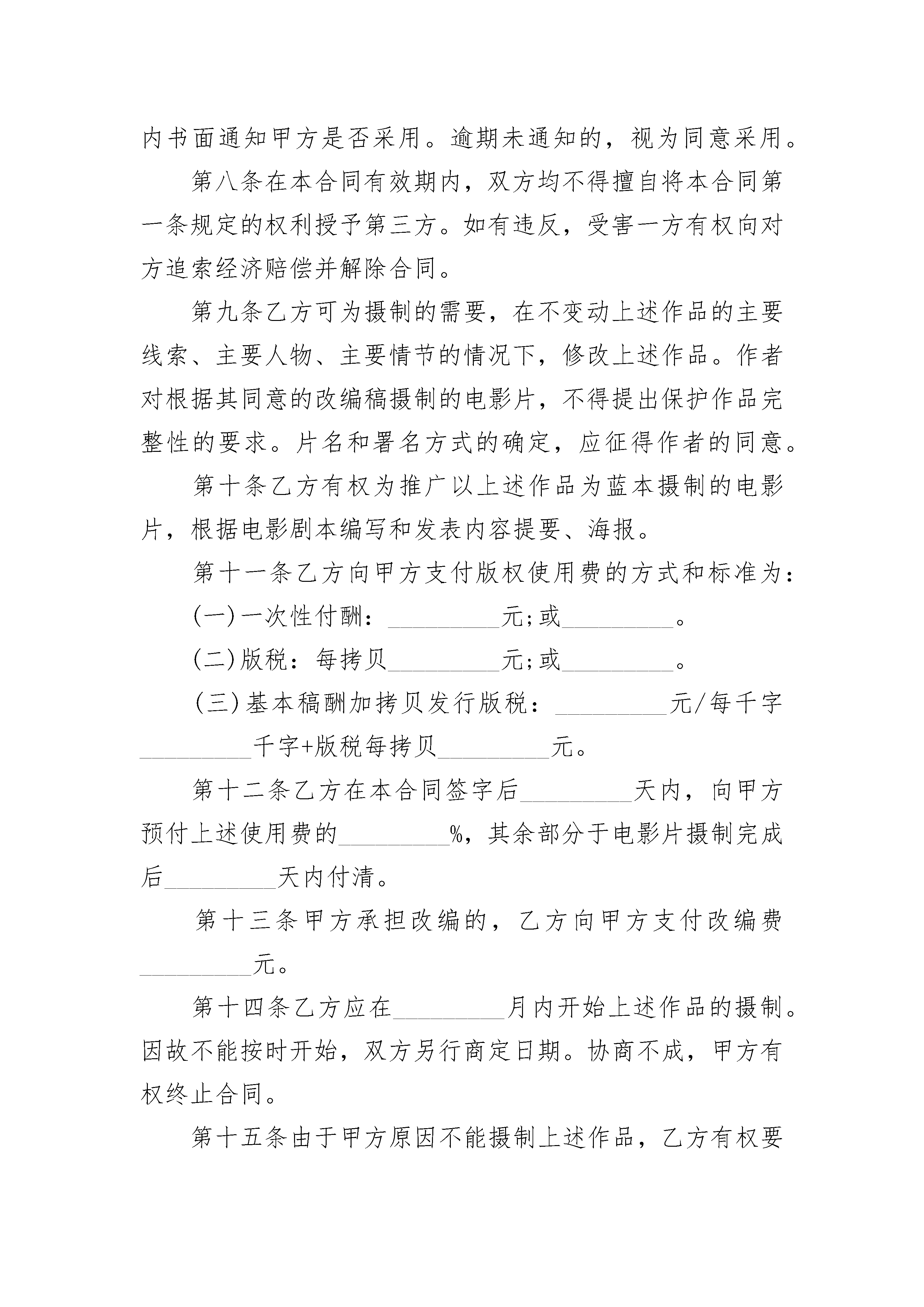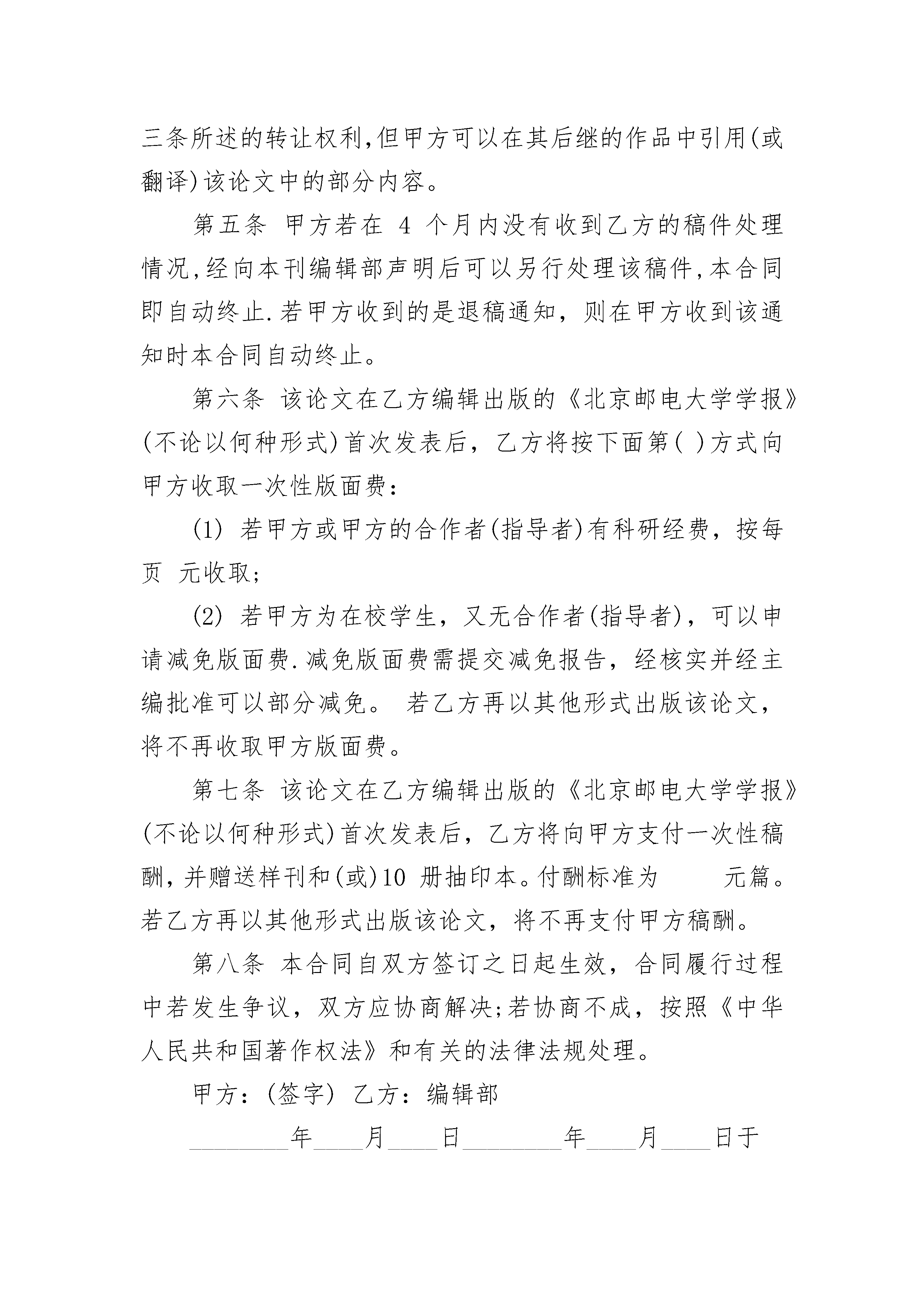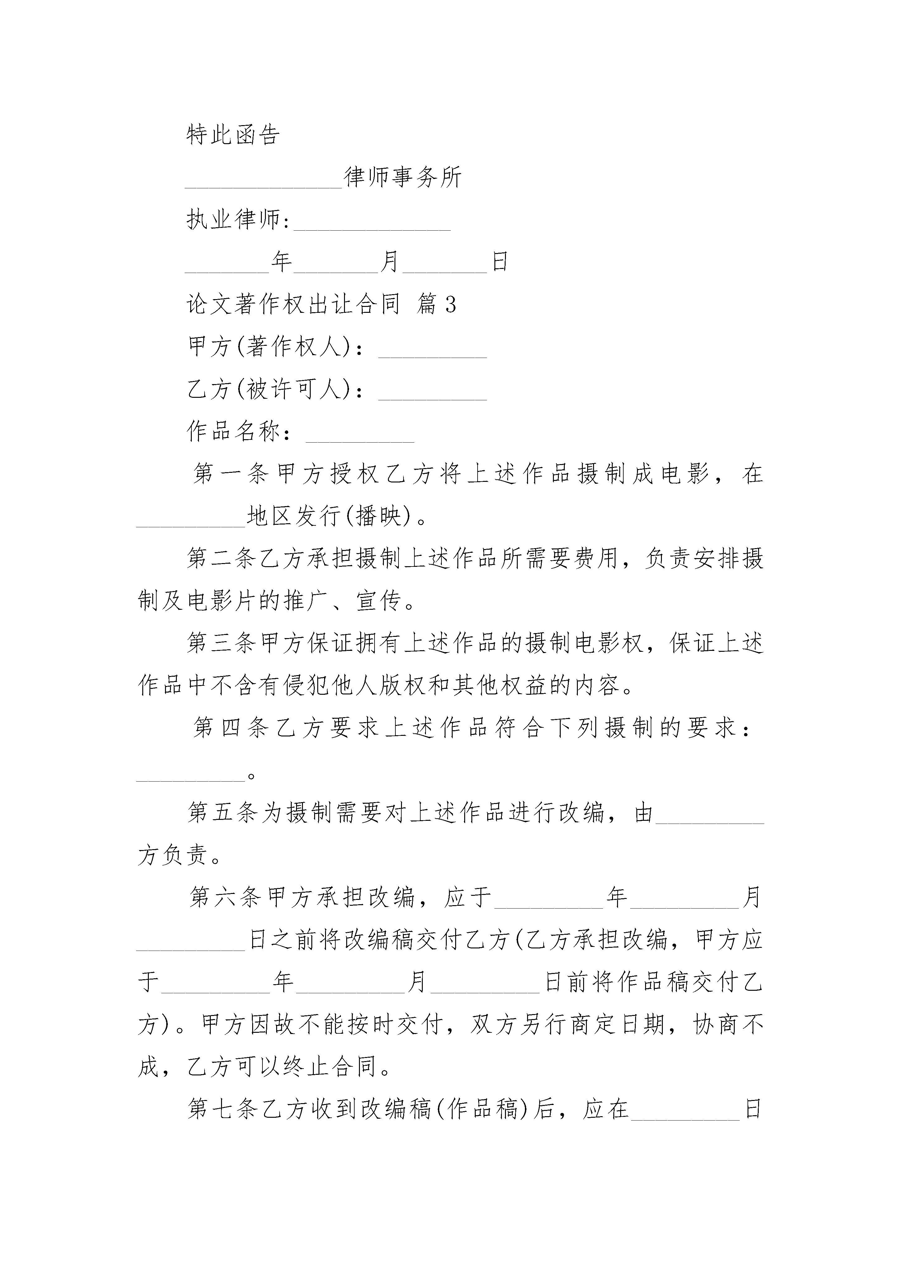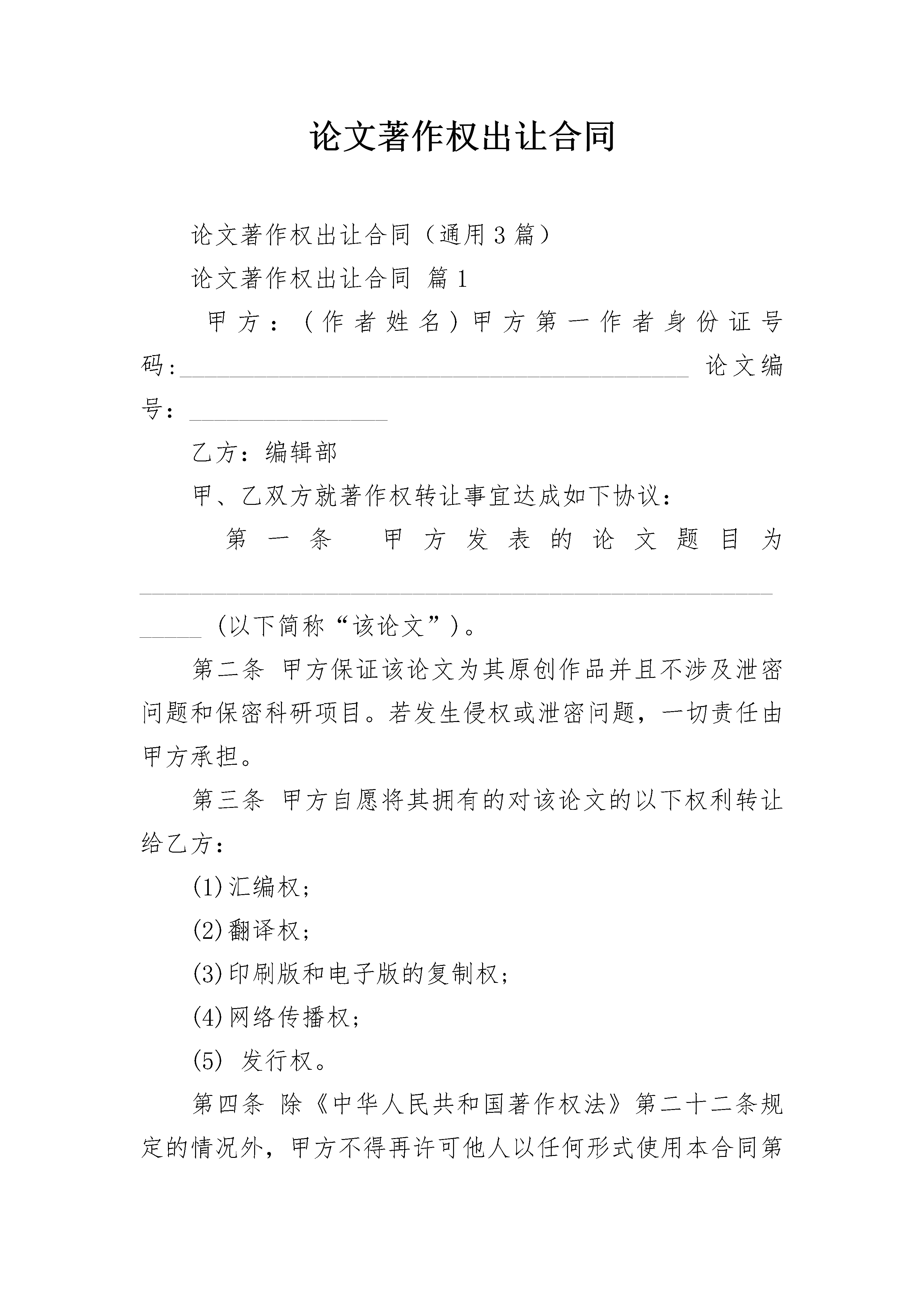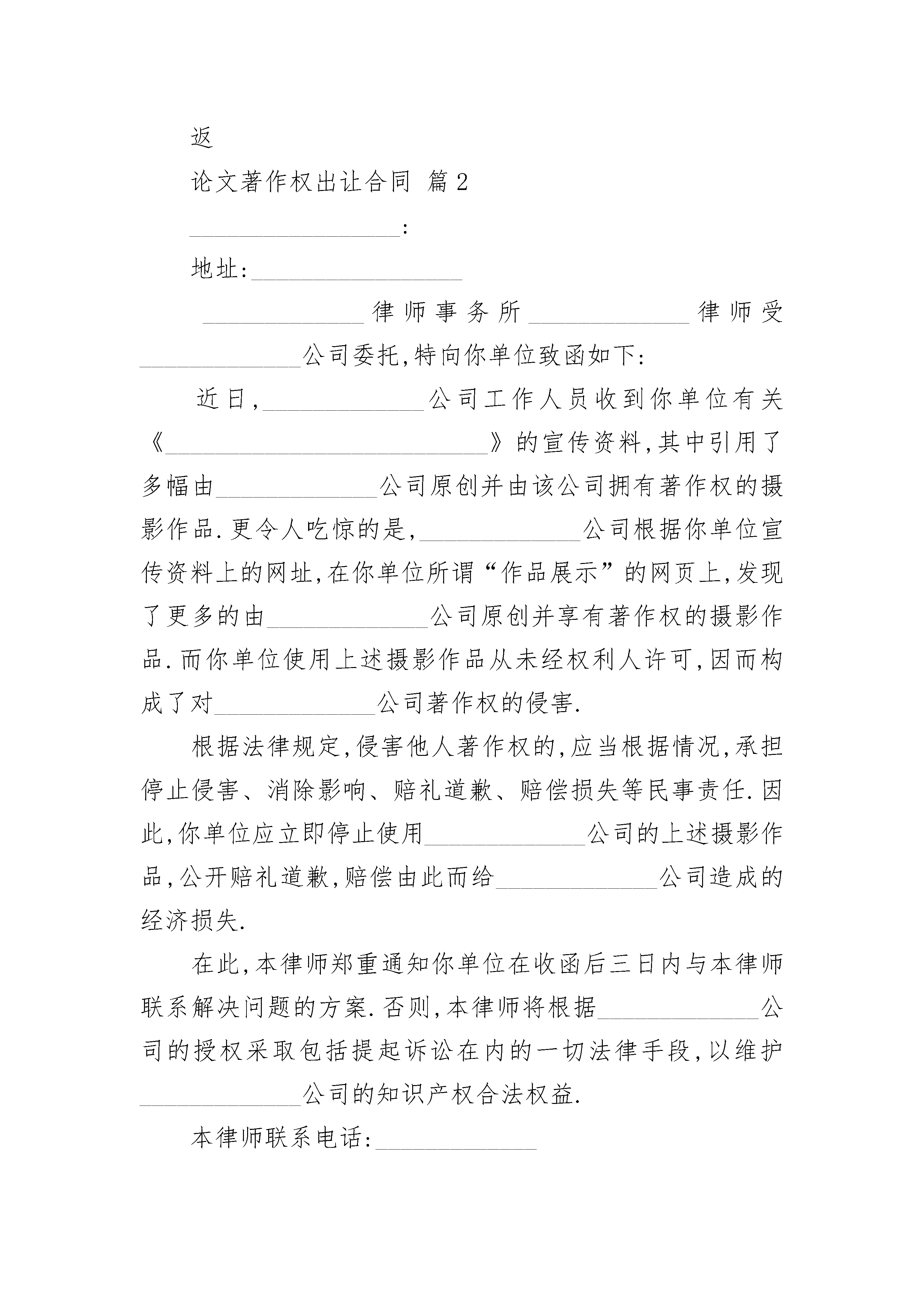 论文著作权出让合同论文著作权出让合同(通用3篇)论文著作权出让合同篇1甲方:(作者姓名)甲方第一作者身份证号码:_________________________________________论文编号:________________乙方:编辑部甲、乙双方就著作权转让事宜达成如下协议:第一条甲方发表的论文题目为________________________________________________________(以下简称“该论文”)。第二条甲方保证该论文为其原创作品并且不涉及泄密问题和保密科研项目。若发生侵权或泄密问题,一切责任由甲方承担。第三条甲方自愿将其拥有的对该论文的以下权利转让给乙方:(1)汇编权;(2)翻译权;(3)印刷版和电子版的复制权;(4)网络传播权;(5)发行权。第四条除《中华人民共和国著作权法》第二十二条规定的情况外,甲方不得再许可他人以任何形式使用本合同第三条所述的转让权利,但甲方可以在其后继的作品中引用(或翻译)该论文中的部分内容。第五条甲方若在4个月内没有收到乙方的稿件处理情况,经向本刊编辑部声明后可以另行处理该稿件,本合同即自动终止.若甲方收到的是退稿通知,则在甲方收到该通知时本合同自动终止。第六条该论文在乙方编辑出版的《北京邮电大学学报》(不论以何种形式)首次发表后,乙方将按下面第()方式向甲方收取一次性版面费:(1)若甲方或甲方的合作者(指导者)有科研经费,按每页元收取;(2)若甲方为在校学生,又无合作者(指导者),可以申请减免版面费.减免版面费需提交减免报告,经核实并经主编批准可以部分减免。若乙方再以其他形式出版该论文,将不再收取甲方版面费。第七条该论文在乙方编辑出版的《北京邮电大学学报》(不论以何种形式)首次发表后,乙方将向甲方支付一次性稿酬,并赠送样刊和(或)10册抽印本。付酬标准为元篇。若乙方再以其他形式出版该论文,将不再支付甲方稿酬。第八条本合同自双方签订之日起生效,合同履行过程中若发生争议,双方应协商解决;若协商不成,按照《中华人民共和国著作权法》和有关的法律法规处理。甲方:(签字)乙方:编辑部________年____月____日________年____月____日于返论文著作权出让合同篇2_________________:地址:______________________________律师事务所_____________律师受_____________公司委托,特向你单位致函如下:近日,_____________公司工作人员收到你单位有关《__________________________》的宣传资料,其中引用了多幅由_____________公司原创并由该公司拥有著作权的摄影作品.更令人吃惊的是,_____________公司根据你单位宣传资料上的网址,在你单位所谓“作品展示”的网页上,发现了更多的由_____________公司原创并享有著作权的摄影作品.而你单位使用上述摄影作品从未经权利人许可,因而构成了对_____________公司著作权的侵害.根据法律规定,侵害他人著作权的,应当根据情况,承担停止侵害、消除影响、赔礼道歉、赔偿损失等民事责任.因此,你单位应立即停止使用_____________公司的上述摄影作品,公开赔礼道歉,赔偿由此而给_____________公司造成的经济损失.在此,本律师郑重通知你单位在收函后三日内与本律师联系解决问题的方案.否则,本律师将根据_____________公司的授权采取包括提起诉讼在内的一切法律手段,以维护_____________公司的知识产权合法权益.本律师联系电话:_____________特此函告_____________律师事务所执业律师:____________________年_______月_______日论文著作权出让合同篇3甲方(著作权人):_________乙方(被许可人):_________作品名称:_________第一条甲方授权乙方将上述作品摄制成电影,在_________地区发行(播映)。第二条乙方承担摄制上述作品所需要费用,负责安排摄制及电影片的推广、宣传。第三条甲方保证拥有上述作品的摄制电影权,保证上述作品中不含有侵犯他人版权和其他权益的内容。第四条乙方要求上述作品符合下列摄制的要求:_________。第五条为摄制需要对上述作品进行改编,由_________方负责。第六条甲方承担改编,应于_________年_________月_________日之前将改编稿交付乙方(乙方承担改编,甲方应于_________年_________月_________日前将作品稿交付乙方)。甲方因故不能按时交付,双方另行商定日期,协商不成,乙方可以终止合同。第七条乙方收到改编稿(作品稿)