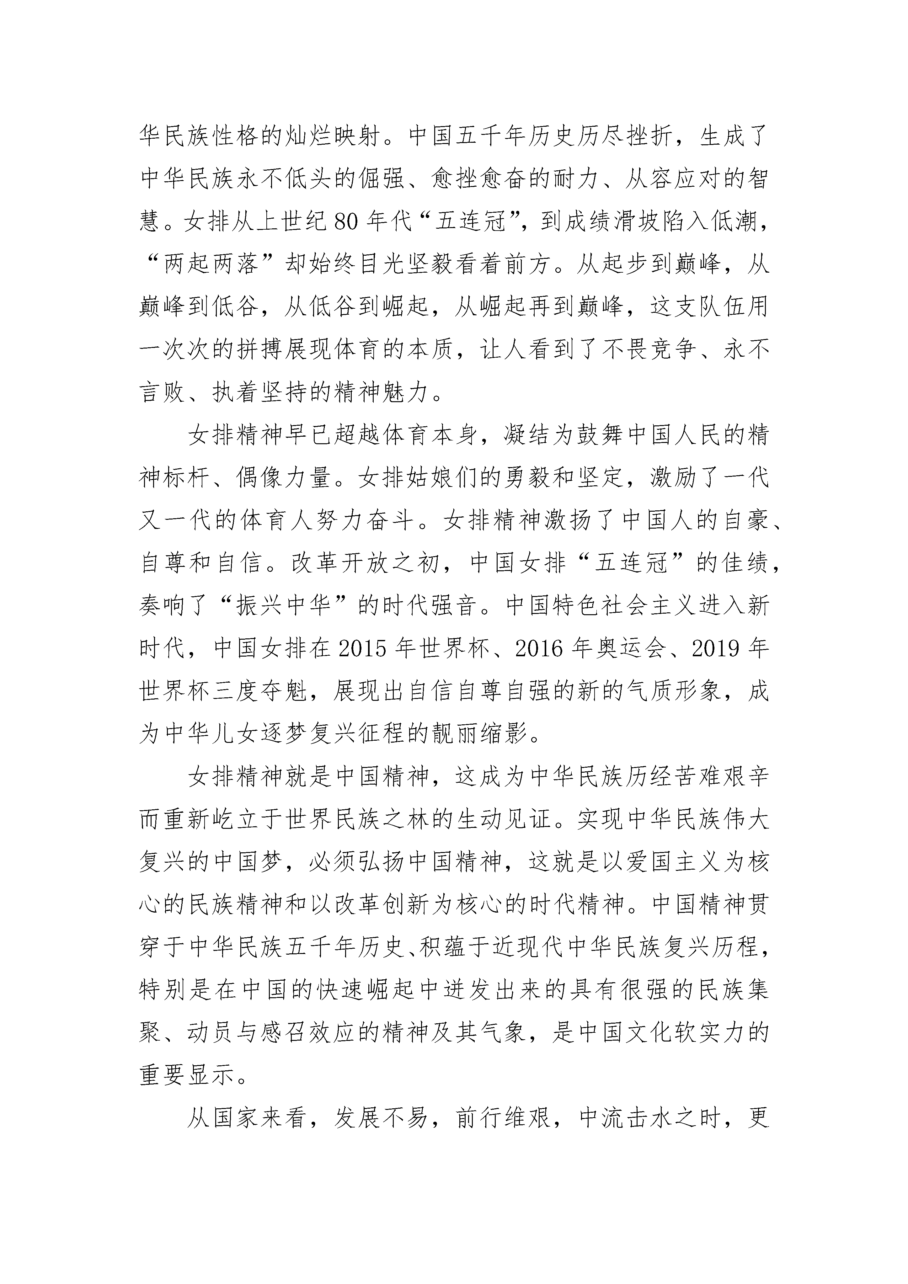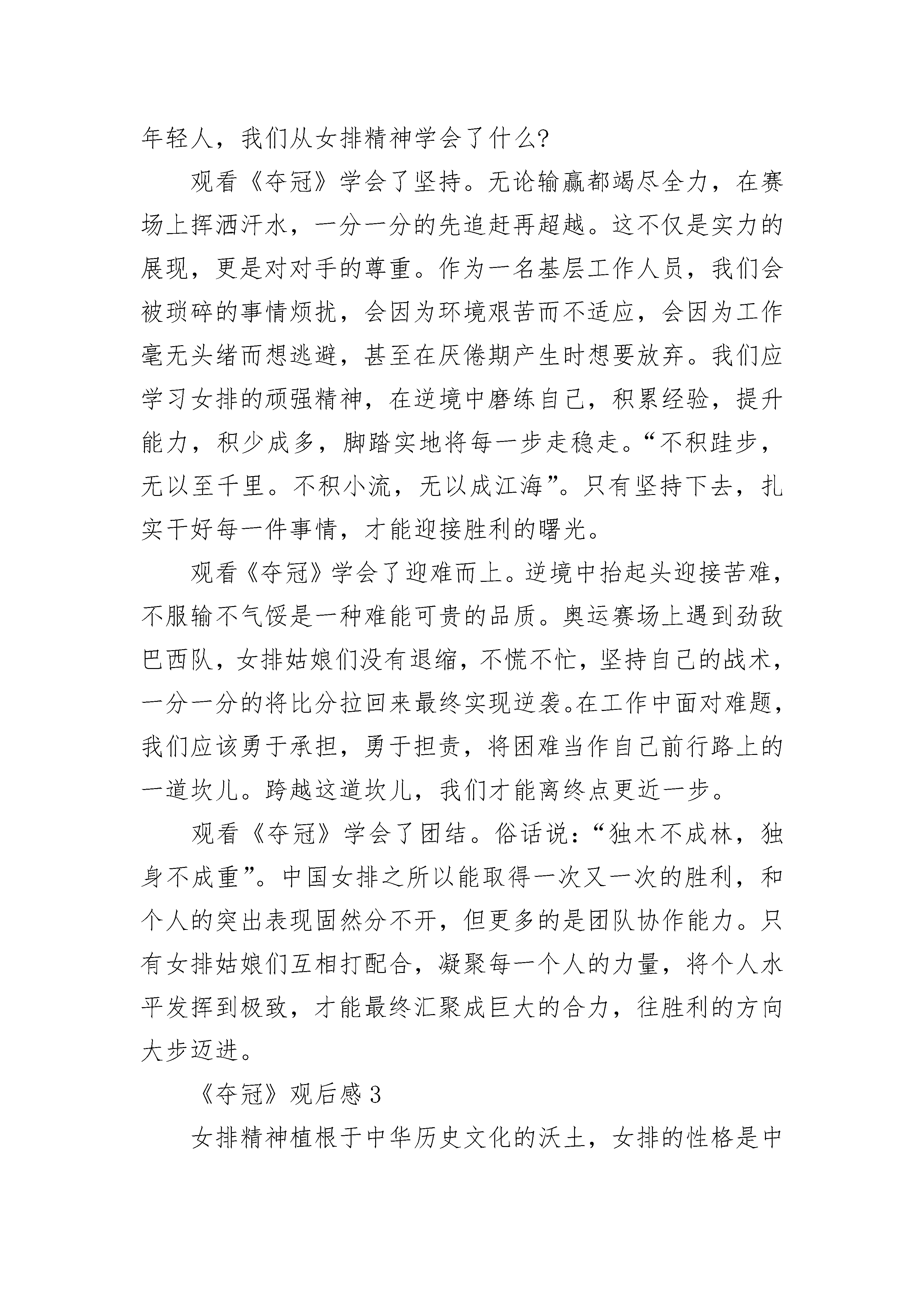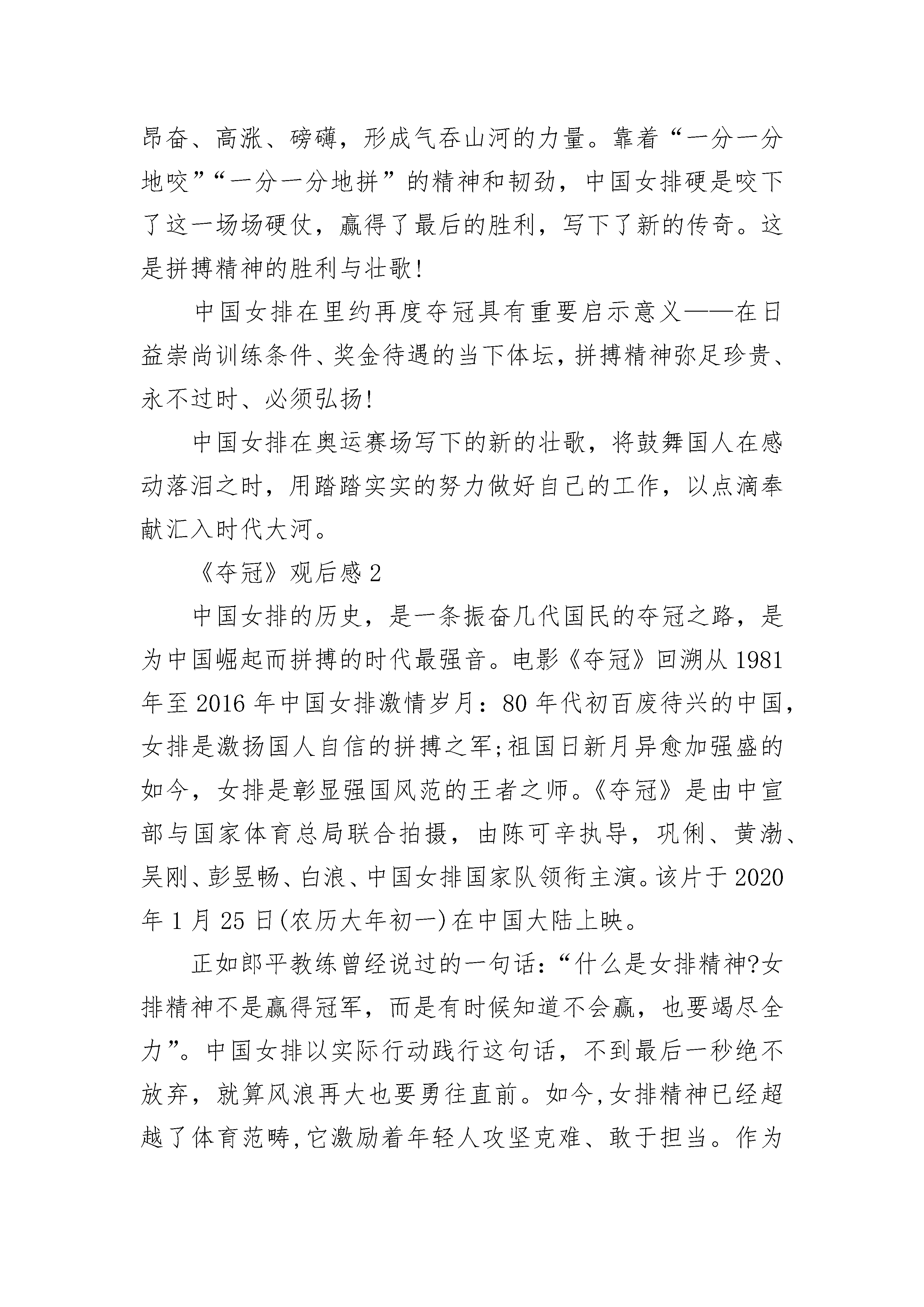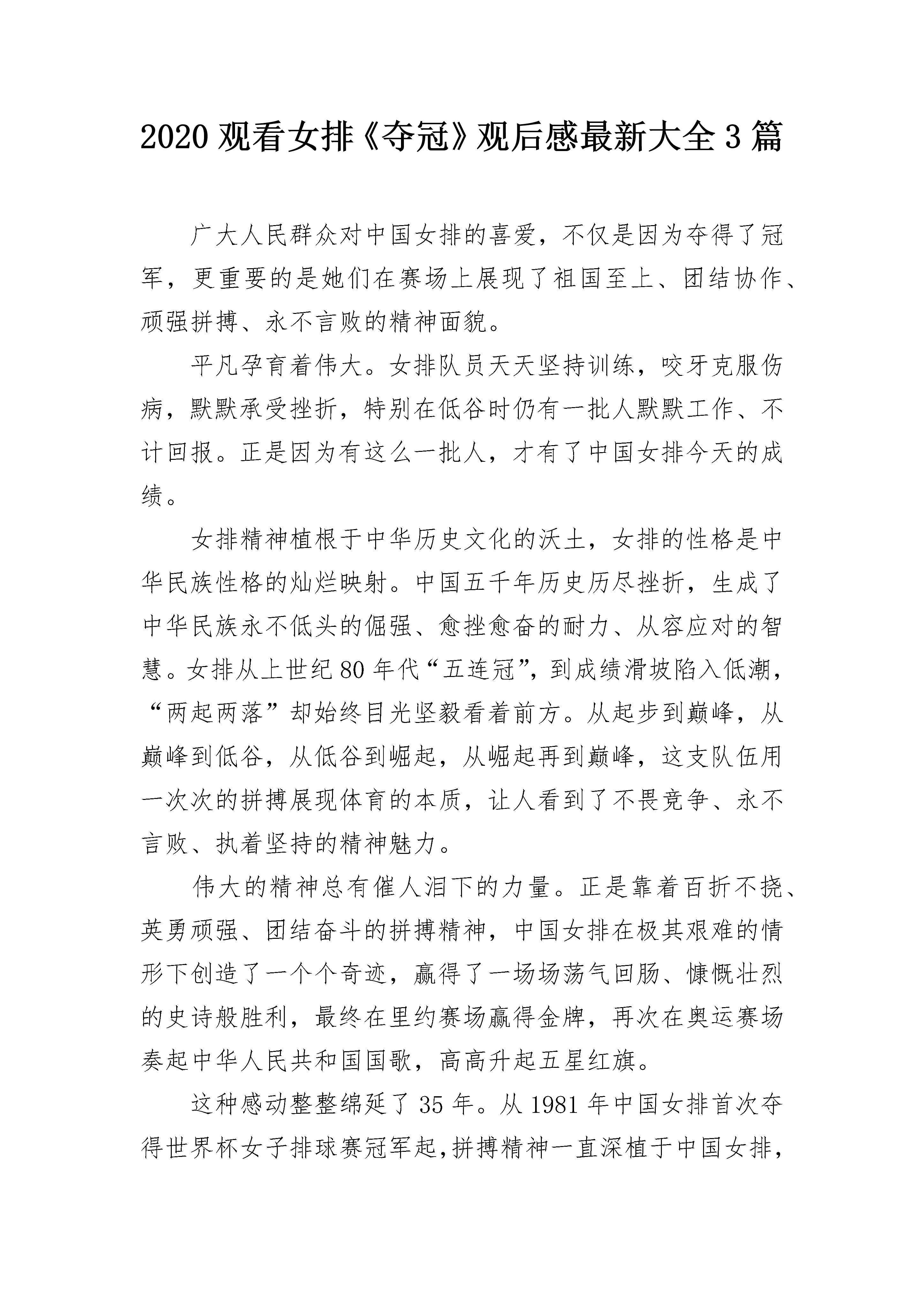 2020观看女排《夺冠》观后感最新大全3篇广大人民群众对中国女排的喜爱,不仅是因为夺得了冠军,更重要的是她们在赛场上展现了祖国至上、团结协作、顽强拼搏、永不言败的精神面貌。平凡孕育着伟大。女排队员天天坚持训练,咬牙克服伤病,默默承受挫折,特别在低谷时仍有一批人默默工作、不计回报。正是因为有这么一批人,才有了中国女排今天的成绩。女排精神植根于中华历史文化的沃土,女排的性格是中华民族性格的灿烂映射。中国五千年历史历尽挫折,生成了中华民族永不低头的倔强、愈挫愈奋的耐力、从容应对的智慧。女排从上世纪80年代“五连冠”,到成绩滑坡陷入低潮,“两起两落”却始终目光坚毅看着前方。从起步到巅峰,从巅峰到低谷,从低谷到崛起,从崛起再到巅峰,这支队伍用一次次的拼搏展现体育的本质,让人看到了不畏竞争、永不言败、执着坚持的精神魅力。伟大的精神总有催人泪下的力量。正是靠着百折不挠、英勇顽强、团结奋斗的拼搏精神,中国女排在极其艰难的情形下创造了一个个奇迹,赢得了一场场荡气回肠、慷慨壮烈的史诗般胜利,最终在里约赛场赢得金牌,再次在奥运赛场奏起中华人民共和国国歌,高高升起五星红旗。这种感动整整绵延了35年。从1981年中国女排首次夺得世界杯女子排球赛冠军起,拼搏精神一直深植于中国女排,成为这支光荣集体的强大基因。尽管其间几经挫折、磨难、沉浮,但中国女排的拼搏精神一直洋溢于国际赛场。在最艰困的情况下,我们看到的是一次次奋起,而没有丝毫放弃。这种愈挫愈奋的坚强,铸就了几代中国女排的精神气质,在漫漫岁月中丰富了中国女排精神的内涵,成为一代代中国观众热爱女排、支持女排、守望女排、将女排视作“英雄之师”的重要理由。一支英雄之师需要一代代人去奉献和传承。在中国女排漫长的奋斗历程中,有一位代表性人物需要我们铭记,她就是郎平。在中国女排最需要、在祖国最需要的时候,她一次又一次放弃个人利益,不计荣辱得失,毅然走向一线,担当起国人的期望与重任。几个普通镜头,留下了这种精神的感人瞬间:上世纪90年代中期,郎平从大洋彼岸归来执教陷于低谷的中国女排,首都机场欢迎的人群中,有她当年五连冠的老战友,她遥遥地向着战友们挥手示意,无声宣示着振兴这支英雄之师的意志。几年前,老队友陈招娣去世,郎平在深深的悲恸中坚定了重回中国女排、续写中国女排辉煌的信念。她忘不了,30多年前,正是陈招娣忍着伤痛,与大家奋战到夺冠的最后时刻,更忘不了女排姑娘誓把受伤的陈招娣“背上领奖台”的骨肉相连、荣辱与共的战斗情谊。这一切,赋予女排精神鲜活、实在的内容,成为郎平的生命意志。奥运赛场,向来是最高强度的竞技比拼,但是也是精神意志的较量。竞技者自身的潜力与能量,往往在拼搏中激发、昂奋、高涨、磅礴,形成气吞山河的力量。靠着“一分一分地咬”“一分一分地拼”的精神和韧劲,中国女排硬是咬下了这一场场硬仗,赢得了最后的胜利,写下了新的传奇。这是拼搏精神的胜利与壮歌!中国女排在里约再度夺冠具有重要启示意义——在日益崇尚训练条件、奖金待遇的当下体坛,拼搏精神弥足珍贵、永不过时、必须弘扬!中国女排在奥运赛场写下的新的壮歌,将鼓舞国人在感动落泪之时,用踏踏实实的努力做好自己的工作,以点滴奉献汇入时代大河。《夺冠》观后感2中国女排的历史,是一条振奋几代国民的夺冠之路,是为中国崛起而拼搏的时代最强音。电影《夺冠》回溯从1981年至2016年中国女排激情岁月:80年代初百废待兴的中国,女排是激扬国人自信的拼搏之军;祖国日新月异愈加强盛的如今,女排是彰显强国风范的王者之师。《夺冠》是由中宣部与国家体育总局联合拍摄,由陈可辛执导,巩俐、黄渤、吴刚、彭昱畅、白浪、中国女排国家队领衔主演。该片于2020年1月25日(农历大年初一)在中国大陆上映。正如郎平教练曾经说过的一句话:“什么是女排精神?女排精神不是赢得冠军,而是有时候知道不会赢,也要竭尽全力”。中国女排以实际行动践行这句话,不到最后一秒绝不放弃,就算风浪再大也要勇往直前。如今,女排精神已经超越了体育范畴,它激励着年轻人攻坚克难、敢于担当。作为年轻人,我们从女排精神学会了什么?观看《夺冠》学会了坚持。无论输赢都竭尽全力,在赛场上挥洒汗水,一分一分的先追赶再超越。这不仅是实力的展现,更是对对手的尊重。作为一名基层工作人员,我们会被琐碎的事情烦扰,会因为环境艰苦而不适应,会因为工作毫无头绪而想逃避,甚至在厌倦期产生时想要放弃。我们应学习女排的顽强精神,在逆境中磨练自己,积累经验,提升能力,积少成多,脚踏实地将每一步走稳走。“不积跬步,无以至千里。不积小流,无以成江海”。只有坚持下去,扎实干好每一件事情,才能迎接胜利的曙光。观看《夺冠》学会了迎难而上。逆境中抬起头迎接苦难,不服输不气馁是一种难能可贵的品质。奥运赛场上遇到劲敌巴西队,女排姑娘们没有退缩,不慌不忙,坚持自己的战术,一分一分的将比分拉回