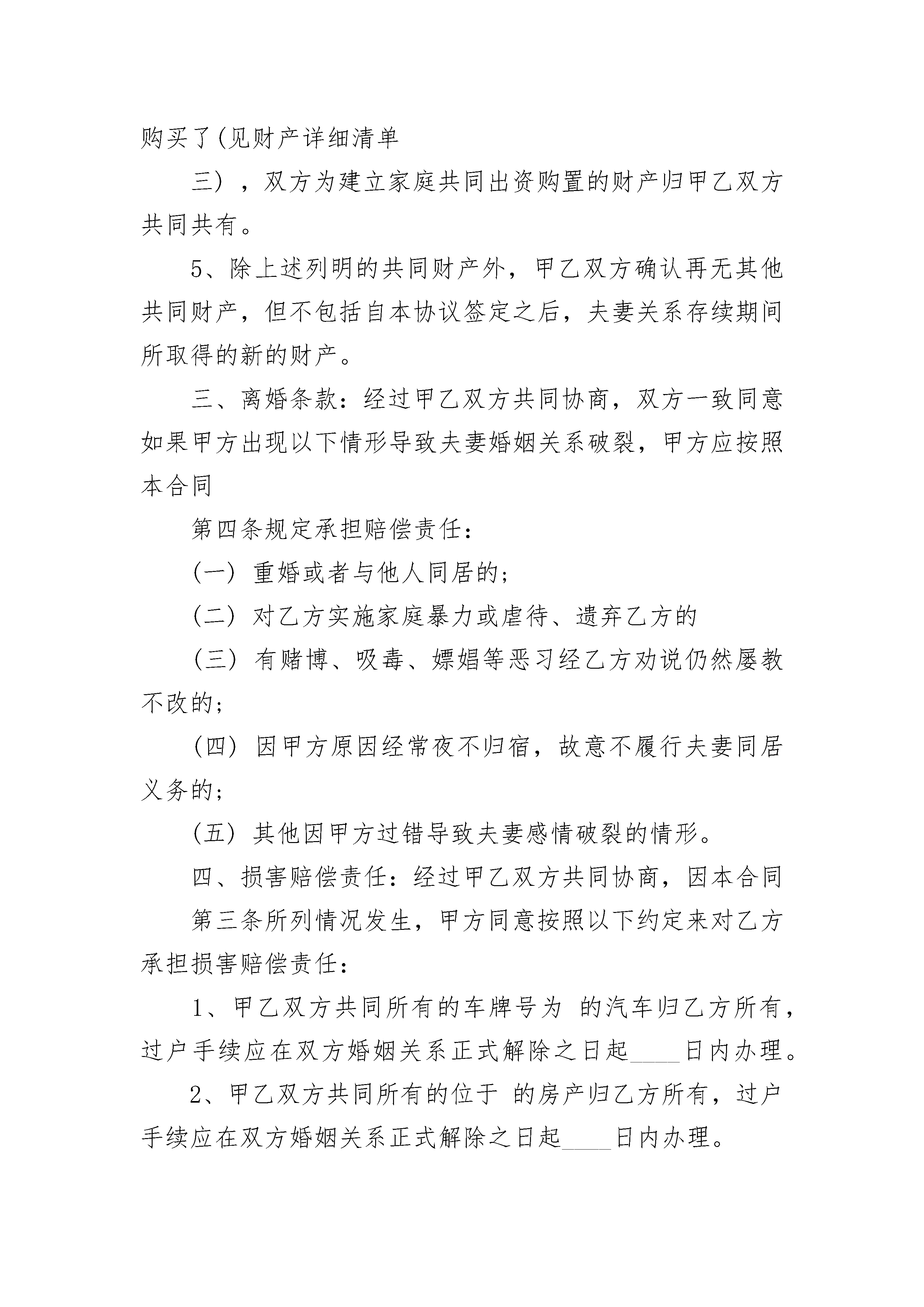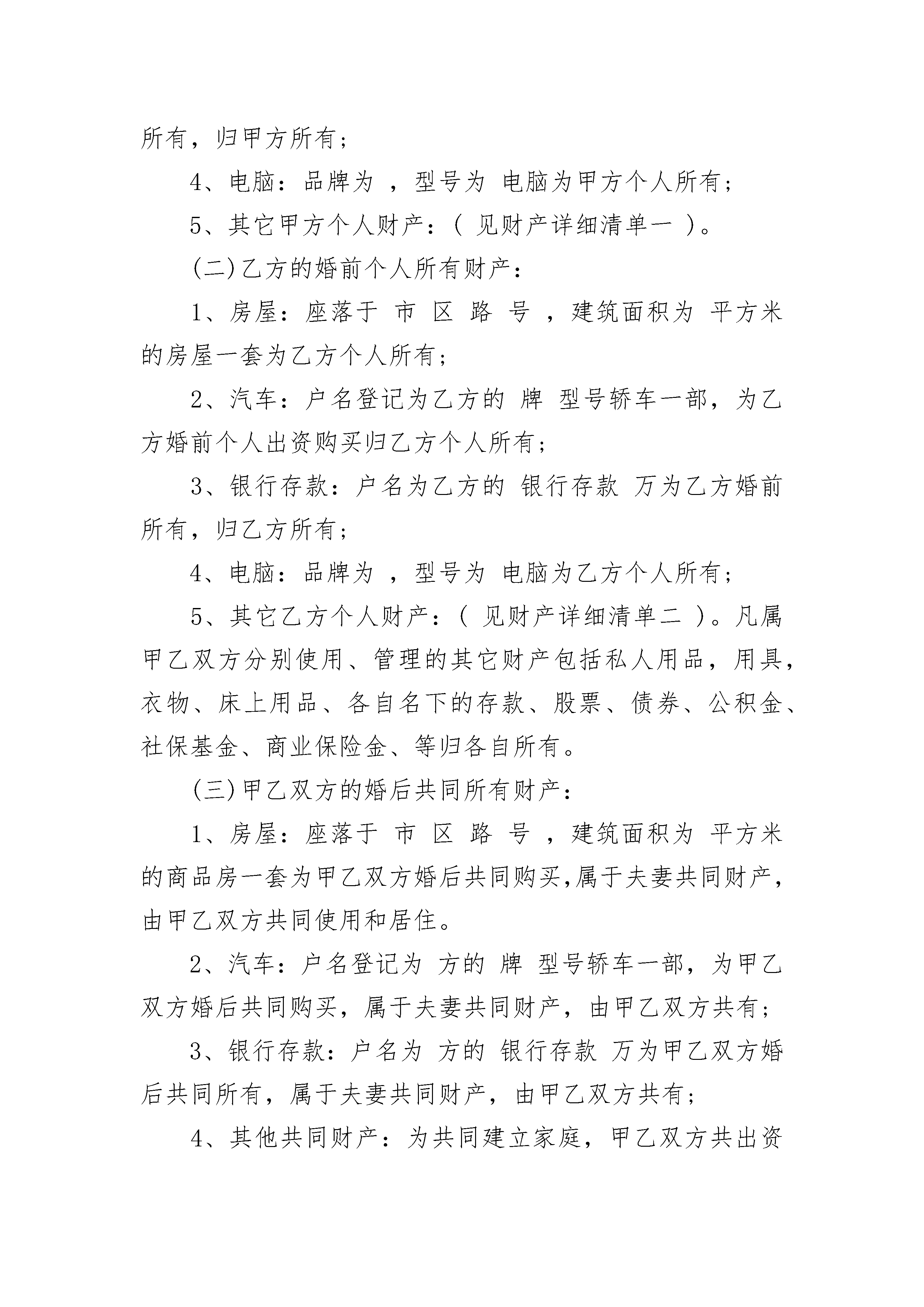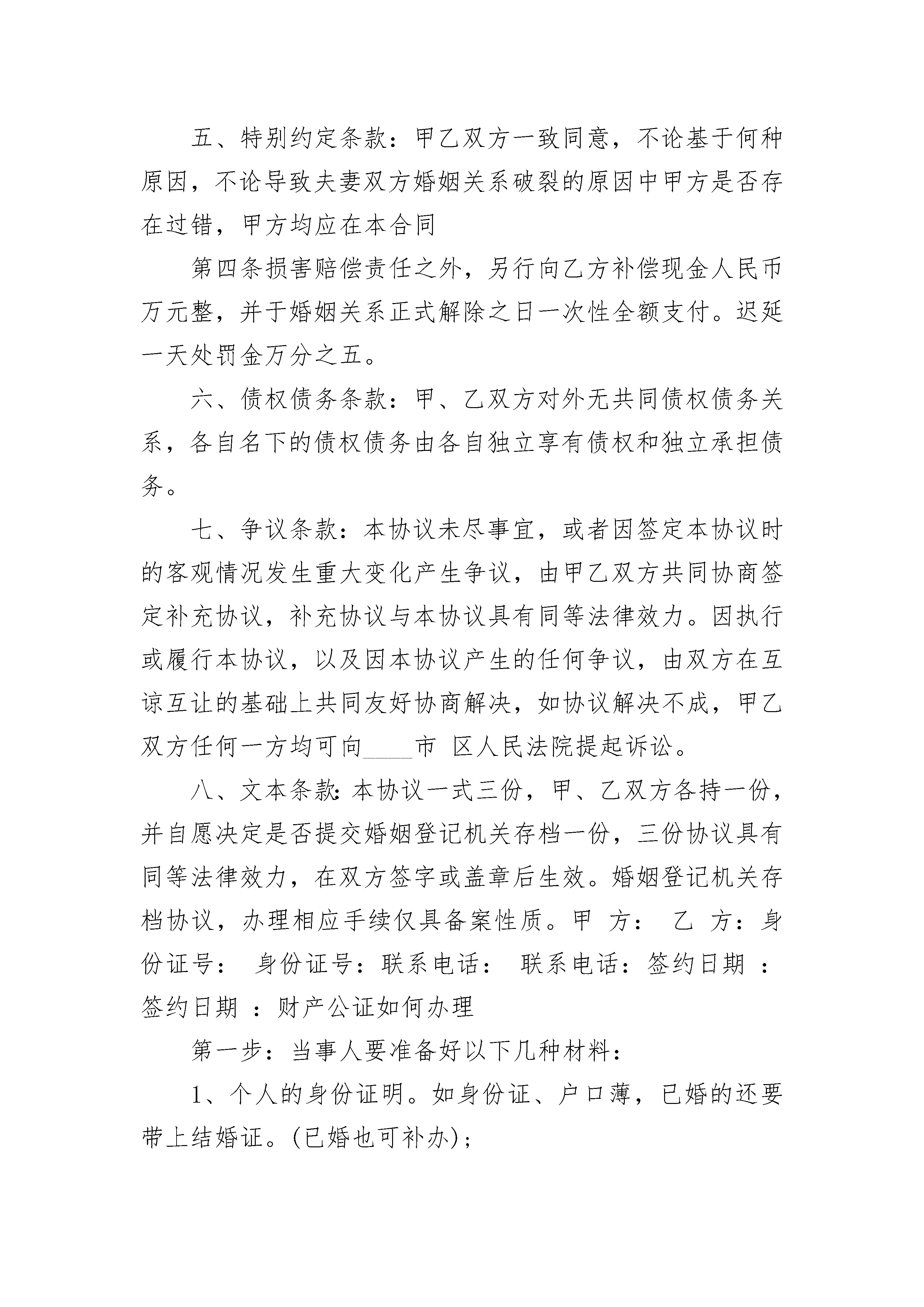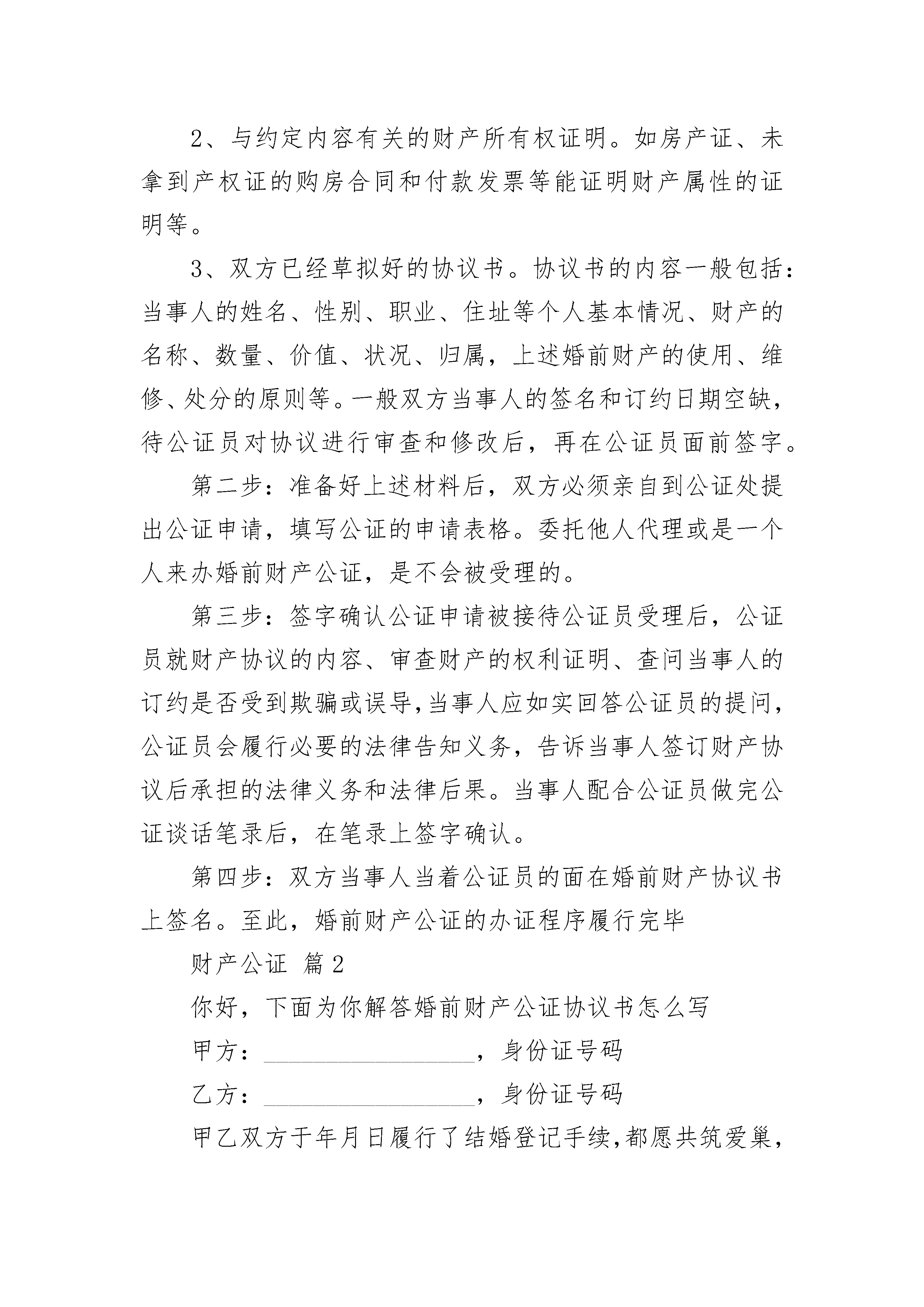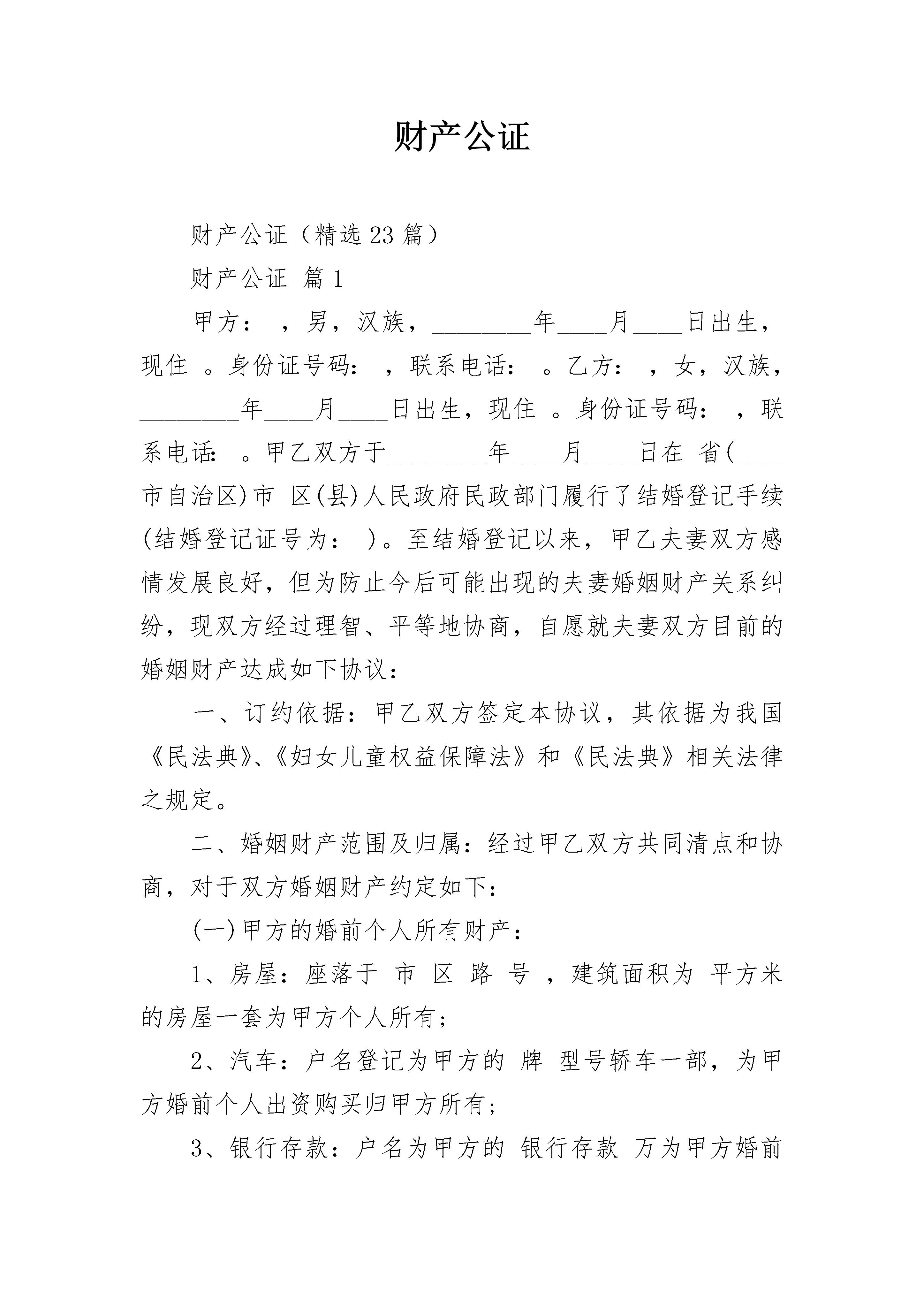 财产公证财产公证(精选23篇)财产公证篇1甲方:,男,汉族,________年____月____日出生,现住。身份证号码:,联系电话:。乙方:,女,汉族,________年____月____日出生,现住。身份证号码:,联系电话:。甲乙双方于________年____月____日在省(____市自治区)市区(县)人民政府民政部门履行了结婚登记手续(结婚登记证号为:)。至结婚登记以来,甲乙夫妻双方感情发展良好,但为防止今后可能出现的夫妻婚姻财产关系纠纷,现双方经过理智、平等地协商,自愿就夫妻双方目前的婚姻财产达成如下协议:一、订约依据:甲乙双方签定本协议,其依据为我国《民法典》、《妇女儿童权益保障法》和《民法典》相关法律之规定。二、婚姻财产范围及归属:经过甲乙双方共同清点和协商,对于双方婚姻财产约定如下:(一)甲方的婚前个人所有财产:1、房屋:座落于市区路号,建筑面积为平方米的房屋一套为甲方个人所有;2、汽车:户名登记为甲方的牌型号轿车一部,为甲方婚前个人出资购买归甲方所有;3、银行存款:户名为甲方的银行存款万为甲方婚前所有,归甲方所有;4、电脑:品牌为,型号为电脑为甲方个人所有;5、其它甲方个人财产:(见财产详细清单一)。(二)乙方的婚前个人所有财产:1、房屋:座落于市区路号,建筑面积为平方米的房屋一套为乙方个人所有;2、汽车:户名登记为乙方的牌型号轿车一部,为乙方婚前个人出资购买归乙方个人所有;3、银行存款:户名为乙方的银行存款万为乙方婚前所有,归乙方所有;4、电脑:品牌为,型号为电脑为乙方个人所有;5、其它乙方个人财产:(见财产详细清单二)。凡属甲乙双方分别使用、管理的其它财产包括私人用品,用具,衣物、床上用品、各自名下的存款、股票、债券、公积金、社保基金、商业保险金、等归各自所有。(三)甲乙双方的婚后共同所有财产:1、房屋:座落于市区路号,建筑面积为平方米的商品房一套为甲乙双方婚后共同购买,属于夫妻共同财产,由甲乙双方共同使用和居住。2、汽车:户名登记为方的牌型号轿车一部,为甲乙双方婚后共同购买,属于夫妻共同财产,由甲乙双方共有;3、银行存款:户名为方的银行存款万为甲乙双方婚后共同所有,属于夫妻共同财产,由甲乙双方共有;4、其他共同财产:为共同建立家庭,甲乙双方共出资购买了(见财产详细清单三),双方为建立家庭共同出资购置的财产归甲乙双方共同共有。5、除上述列明的共同财产外,甲乙双方确认再无其他共同财产,但不包括自本协议签定之后,夫妻关系存续期间所取得的新的财产。三、离婚条款:经过甲乙双方共同协商,双方一致同意如果甲方出现以下情形导致夫妻婚姻关系破裂,甲方应按照本合同第四条规定承担赔偿责任:(一)重婚或者与他人同居的;(二)对乙方实施家庭暴力或虐待、遗弃乙方的(三)有赌博、吸毒、嫖娼等恶习经乙方劝说仍然屡教不改的;(四)因甲方原因经常夜不归宿,故意不履行夫妻同居义务的;(五)其他因甲方过错导致夫妻感情破裂的情形。四、损害赔偿责任:经过甲乙双方共同协商,因本合同第三条所列情况发生,甲方同意按照以下约定来对乙方承担损害赔偿责任:1、甲乙双方共同所有的车牌号为的汽车归乙方所有,过户手续应在双方婚姻关系正式解除之日起____日内办理。2、甲乙双方共同所有的位于的房产归乙方所有,过户手续应在双方婚姻关系正式解除之日起____日内办理。五、特别约定条款:甲乙双方一致同意,不论基于何种原因,不论导致夫妻双方婚姻关系破裂的原因中甲方是否存在过错,甲方均应在本合同第四条损害赔偿责任之外,另行向乙方补偿现金人民币万元整,并于婚姻关系正式解除之日一次性全额支付。迟延一天处罚金万分之五。六、债权债务条款:甲、乙双方对外无共同债权债务关系,各自名下的债权债务由各自独立享有债权和独立承担债务。七、争议条款:本协议未尽事宜,或者因签定本协议时的客观情况发生重大变化产生争议,由甲乙双方共同协商签定补充协议,补充协议与本协议具有同等法律效力。因执行或履行本协议,以及因本协议产生的任何争议,由双方在互谅互让的基础上共同友好协商解决,如协议解决不成,甲乙双方任何一方均可向____市区人民法院提起诉讼。八、文本条款:本协议一式三份,甲、乙双方各持一份,并自愿决定是否提交婚姻登记机关存档一份,三份协议具有同等法律效力,在双方签字或盖章后生效。婚姻登记机关存档协议,办理相应手续仅具备案性质。甲方:乙方:身份证号:身份证号:联系电话:联系电话:签约日期:签约日期:财产公证如何办理第一步:当事人要准备好以下几种材料:1、个人的身份证明。如身份证、户口薄,已婚的还要带上结婚证。(已婚也可补办);2、与约定内容有关的财产所有权证明。如房产证、未拿到产权证的购房合同和付款发票等能证明财产属性的证明等。3、双方已经草拟好的协议书。协议书的内容一般包括:当事人的姓名、性别、职业