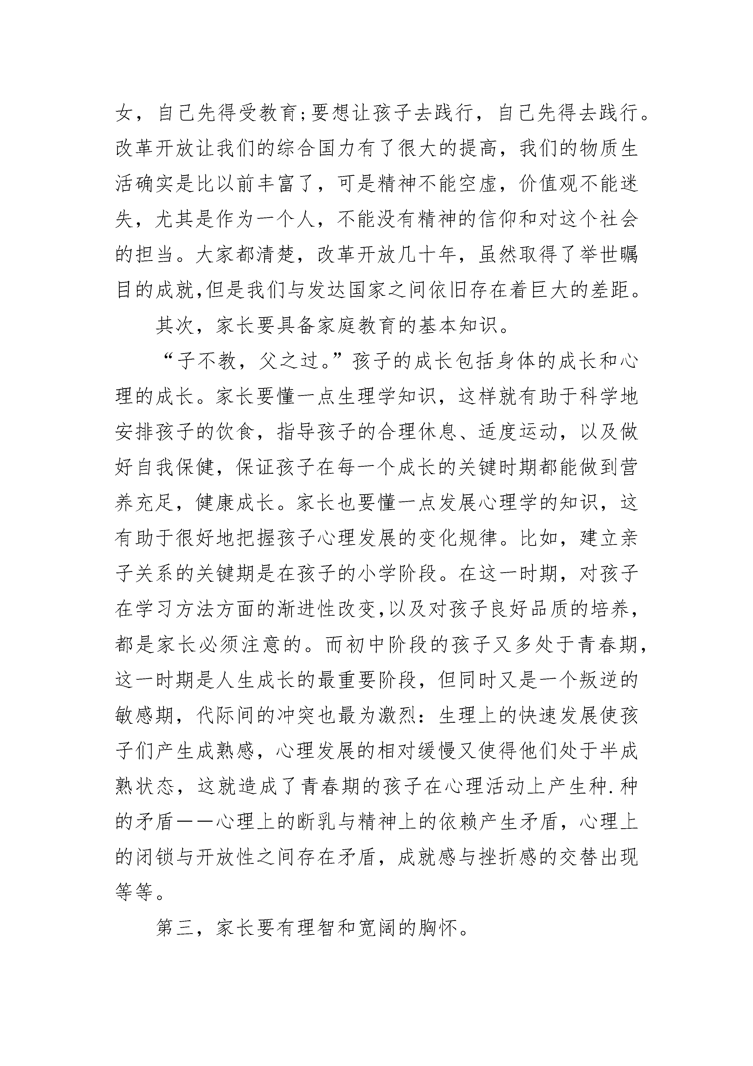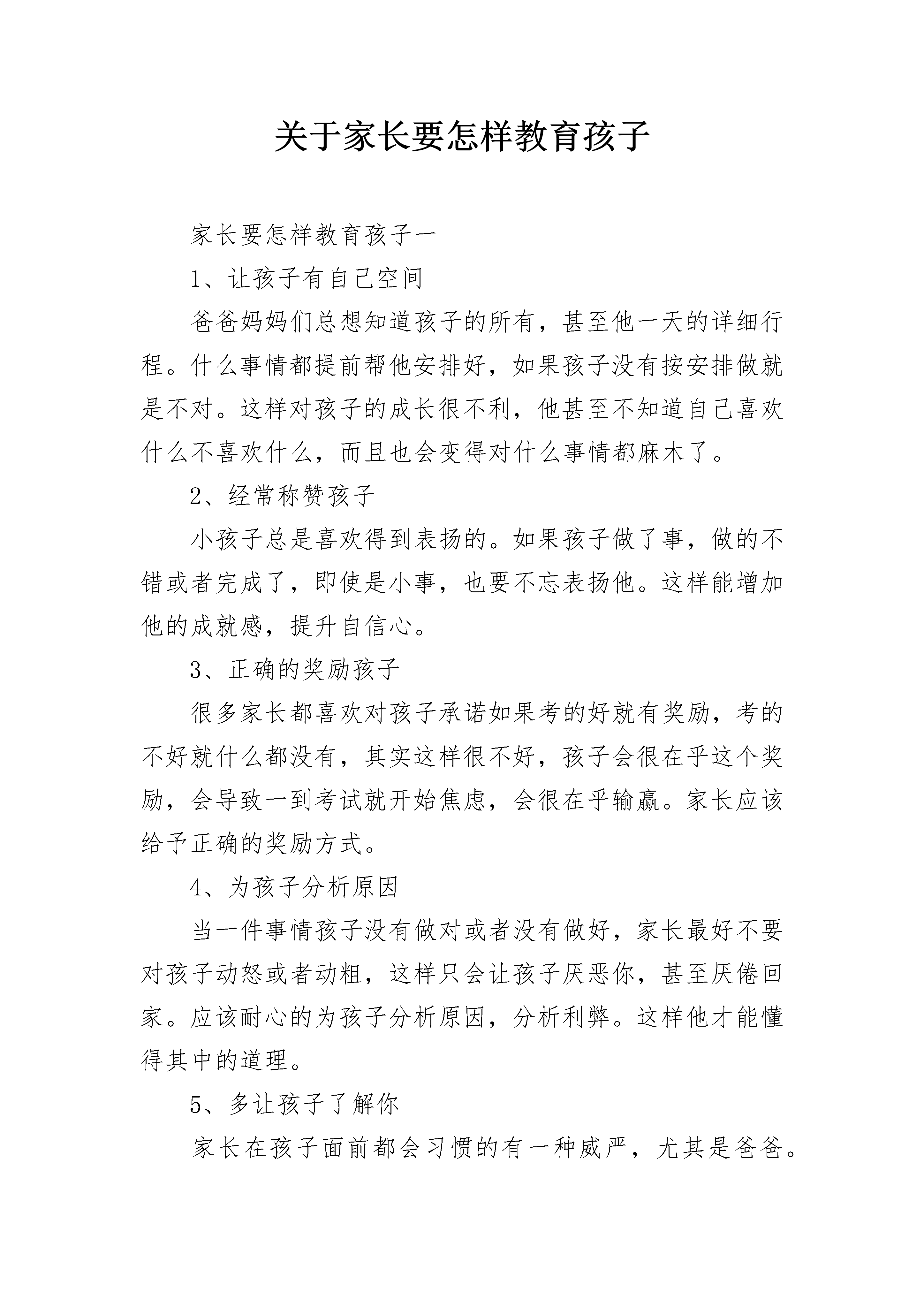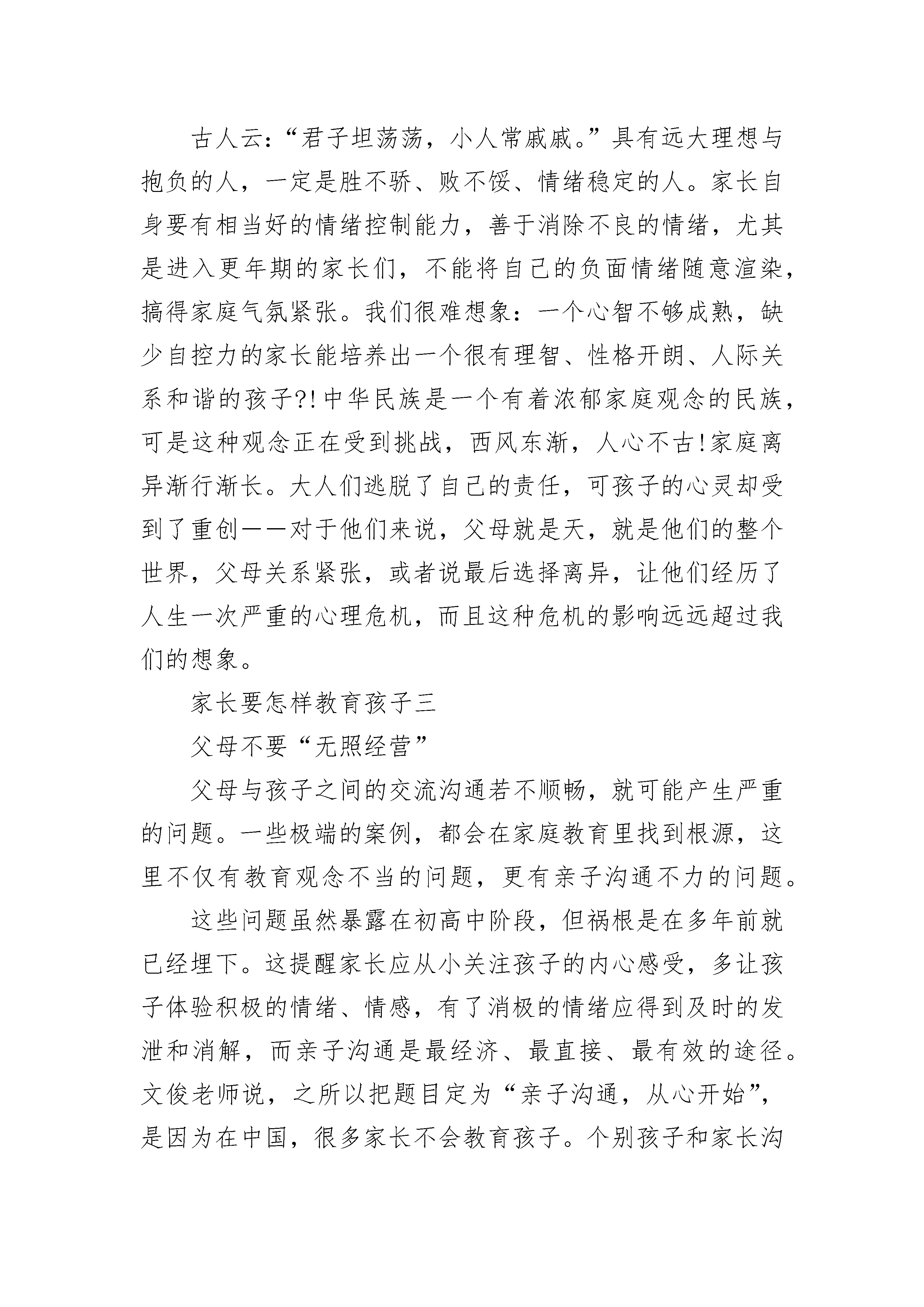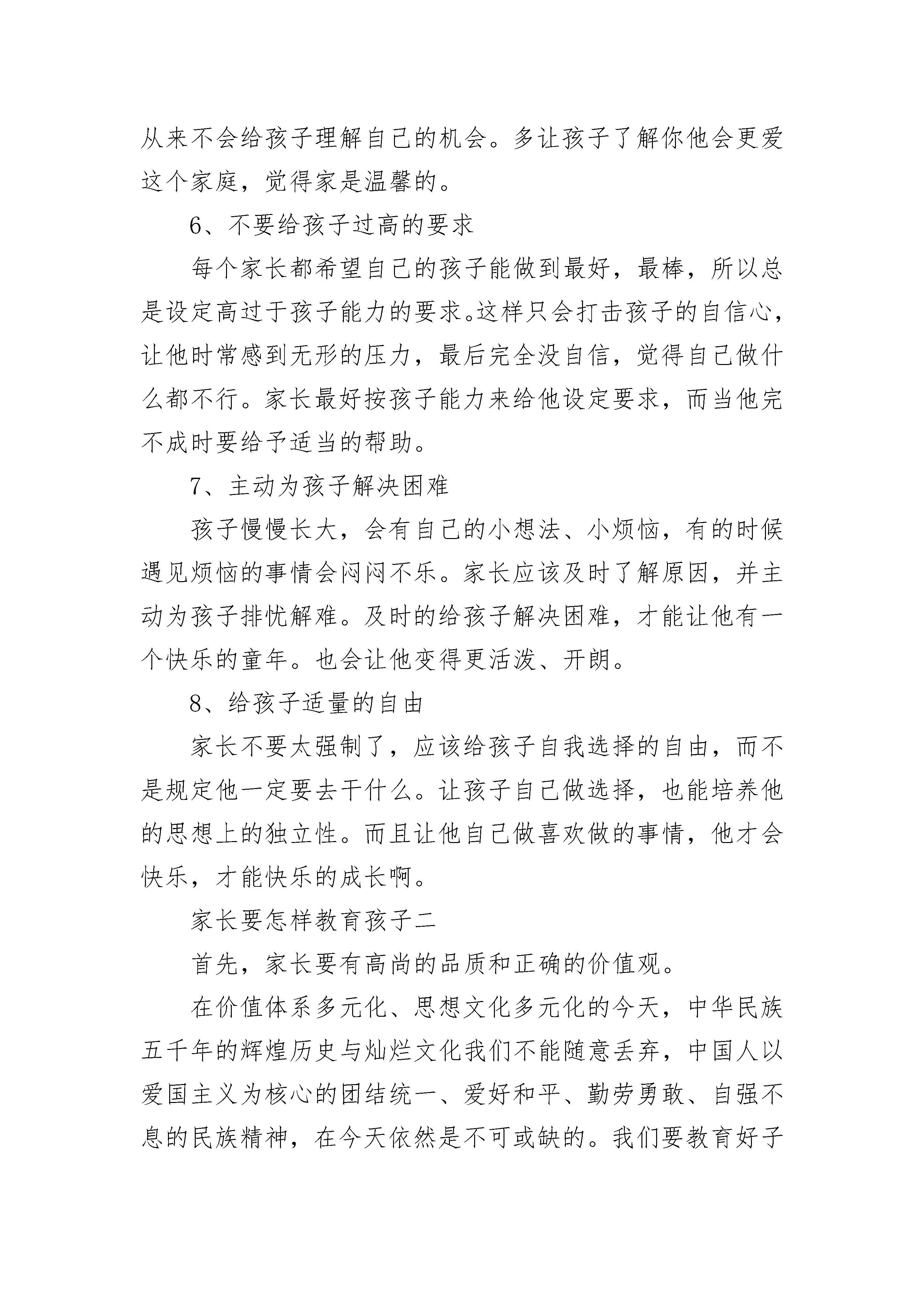关于家长要怎样教育孩子家长要怎样教育孩子一1、让孩子有自己空间爸爸妈妈们总想知道孩子的所有,甚至他一天的详细行程。什么事情都提前帮他安排好,如果孩子没有按安排做就是不对。这样对孩子的成长很不利,他甚至不知道自己喜欢什么不喜欢什么,而且也会变得对什么事情都麻木了。2、经常称赞孩子小孩子总是喜欢得到表扬的。如果孩子做了事,做的不错或者完成了,即使是小事,也要不忘表扬他。这样能增加他的成就感,提升自信心。3、正确的奖励孩子很多家长都喜欢对孩子承诺如果考的好就有奖励,考的不好就什么都没有,其实这样很不好,孩子会很在乎这个奖励,会导致一到考试就开始焦虑,会很在乎输赢。家长应该给予正确的奖励方式。4、为孩子分析原因当一件事情孩子没有做对或者没有做好,家长最好不要对孩子动怒或者动粗,这样只会让孩子厌恶你,甚至厌倦回家。应该耐心的为孩子分析原因,分析利弊。这样他才能懂得其中的道理。5、多让孩子了解你家长在孩子面前都会习惯的有一种威严,尤其是爸爸。从来不会给孩子理解自己的机会。多让孩子了解你他会更爱这个家庭,觉得家是温馨的。6、不要给孩子过高的要求每个家长都希望自己的孩子能做到最好,最棒,所以总是设定高过于孩子能力的要求。这样只会打击孩子的自信心,让他时常感到无形的压力,最后完全没自信,觉得自己做什么都不行。家长最好按孩子能力来给他设定要求,而当他完不成时要给予适当的帮助。7、主动为孩子解决困难孩子慢慢长大,会有自己的小想法、小烦恼,有的时候遇见烦恼的事情会闷闷不乐。家长应该及时了解原因,并主动为孩子排忧解难。及时的给孩子解决困难,才能让他有一个快乐的童年。也会让他变得更活泼、开朗。8、给孩子适量的自由家长不要太强制了,应该给孩子自我选择的自由,而不是规定他一定要去干什么。让孩子自己做选择,也能培养他的思想上的独立性。而且让他自己做喜欢做的事情,他才会快乐,才能快乐的成长啊。家长要怎样教育孩子二首先,家长要有高尚的品质和正确的价值观。在价值体系多元化、思想文化多元化的今天,中华民族五千年的辉煌历史与灿烂文化我们不能随意丢弃,中国人以爱国主义为核心的团结统一、爱好和平、勤劳勇敢、自强不息的民族精神,在今天依然是不可或缺的。我们要教育好子女,自己先得受教育;要想让孩子去践行,自己先得去践行。改革开放让我们的综合国力有了很大的提高,我们的物质生活确实是比以前丰富了,可是精神不能空虚,价值观不能迷失,尤其是作为一个人,不能没有精神的信仰和对这个社会的担当。大家都清楚,改革开放几十年,虽然取得了举世瞩目的成就,但是我们与发达国家之间依旧存在着巨大的差距。其次,家长要具备家庭教育的基本知识。“子不教,父之过。”孩子的成长包括身体的成长和心理的成长。家长要懂一点生理学知识,这样就有助于科学地安排孩子的饮食,指导孩子的合理休息、适度运动,以及做好自我保健,保证孩子在每一个成长的关键时期都能做到营养充足,健康成长。家长也要懂一点发展心理学的知识,这有助于很好地把握孩子心理发展的变化规律。比如,建立亲子关系的关键期是在孩子的小学阶段。在这一时期,对孩子在学习方法方面的渐进性改变,以及对孩子良好品质的培养,都是家长必须注意的。而初中阶段的孩子又多处于青春期,这一时期是人生成长的最重要阶段,但同时又是一个叛逆的敏感期,代际间的冲突也最为激烈:生理上的快速发展使孩子们产生成熟感,心理发展的相对缓慢又使得他们处于半成熟状态,这就造成了青春期的孩子在心理活动上产生种.种的矛盾――心理上的断乳与精神上的依赖产生矛盾,心理上的闭锁与开放性之间存在矛盾,成就感与挫折感的交替出现等等。第三,家长要有理智和宽阔的胸怀。古人云:“君子坦荡荡,小人常戚戚。”具有远大理想与抱负的人,一定是胜不骄、败不馁、情绪稳定的人。家长自身要有相当好的情绪控制能力,善于消除不良的情绪,尤其是进入更年期的家长们,不能将自己的负面情绪随意渲染,搞得家庭气氛紧张。我们很难想象:一个心智不够成熟,缺少自控力的家长能培养出一个很有理智、性格开朗、人际关系和谐的孩子?!中华民族是一个有着浓郁家庭观念的民族,可是这种观念正在受到挑战,西风东渐,人心不古!家庭离异渐行渐长。大人们逃脱了自己的责任,可孩子的心灵却受到了重创――对于他们来说,父母就是天,就是他们的整个世界,父母关系紧张,或者说最后选择离异,让他们经历了人生一次严重的心理危机,而且这种危机的影响远远超过我们的想象。家长要怎样教育孩子三父母不要“无照经营”父母与孩子之间的交流沟通若不顺畅,就可能产生严重的问题。一些极端的案例,都会在家庭教育里找到根源,这里不仅有教育观念不当的问题,更有亲子沟通不力的问题。这些问题虽然暴露在初高中阶段,但祸根是在多年前就已经埋下。这提醒家长应从小关注孩子的内心感受,多让孩子体验积极的情绪、情感,有了消极的情绪应得到及时的发泄