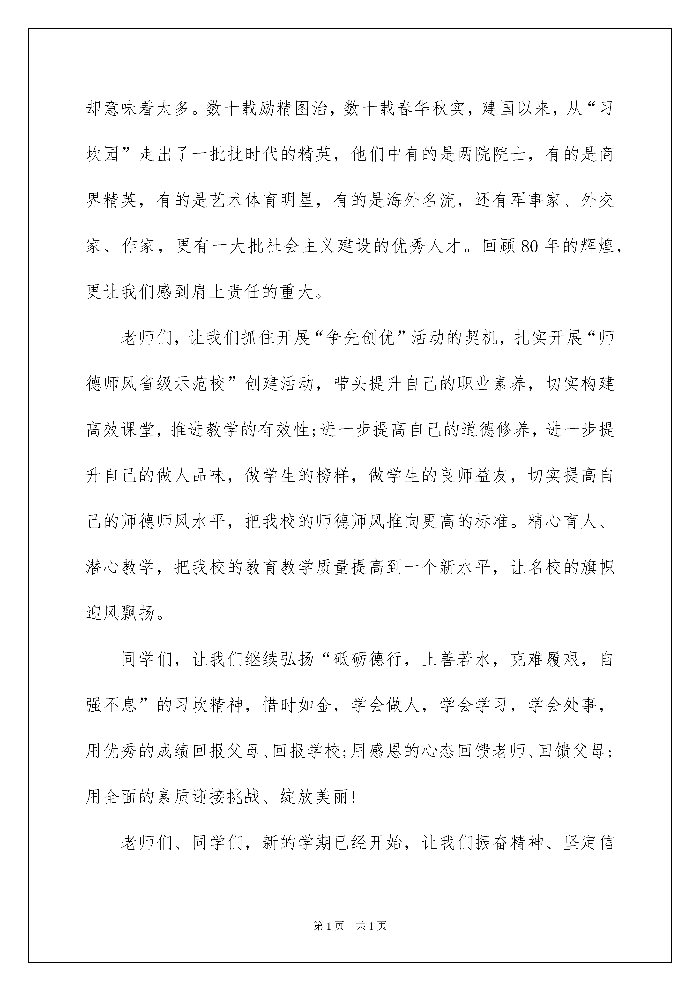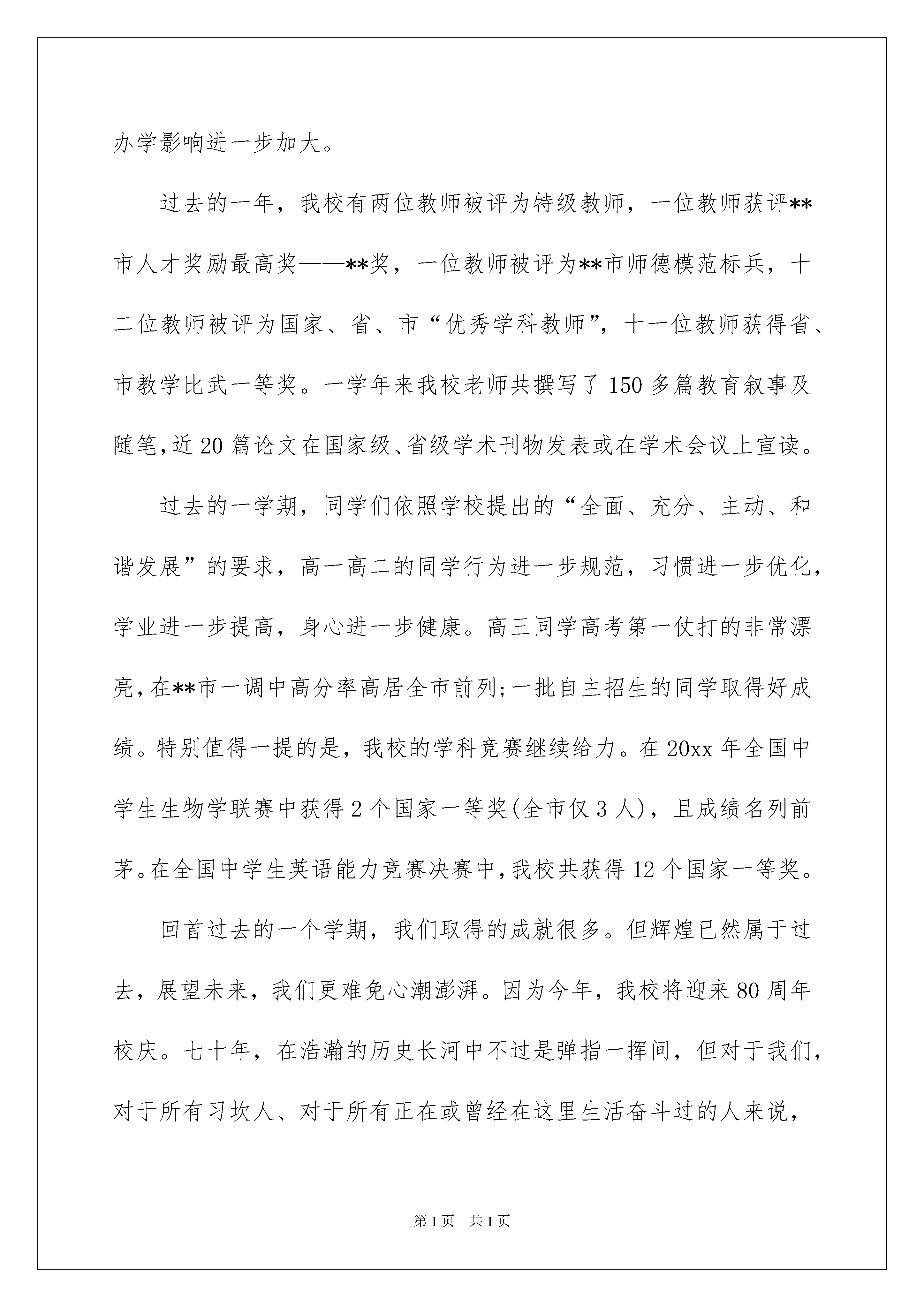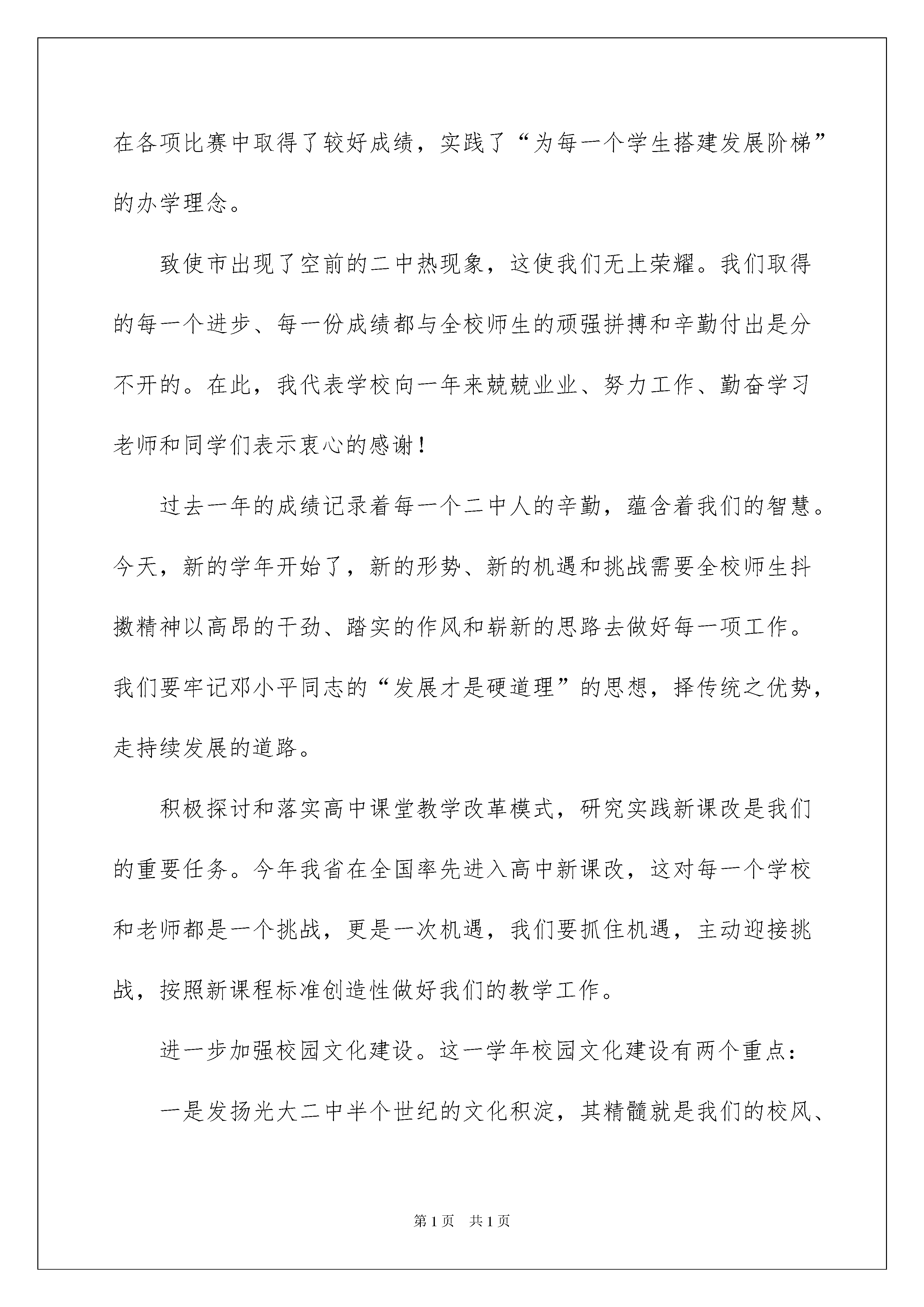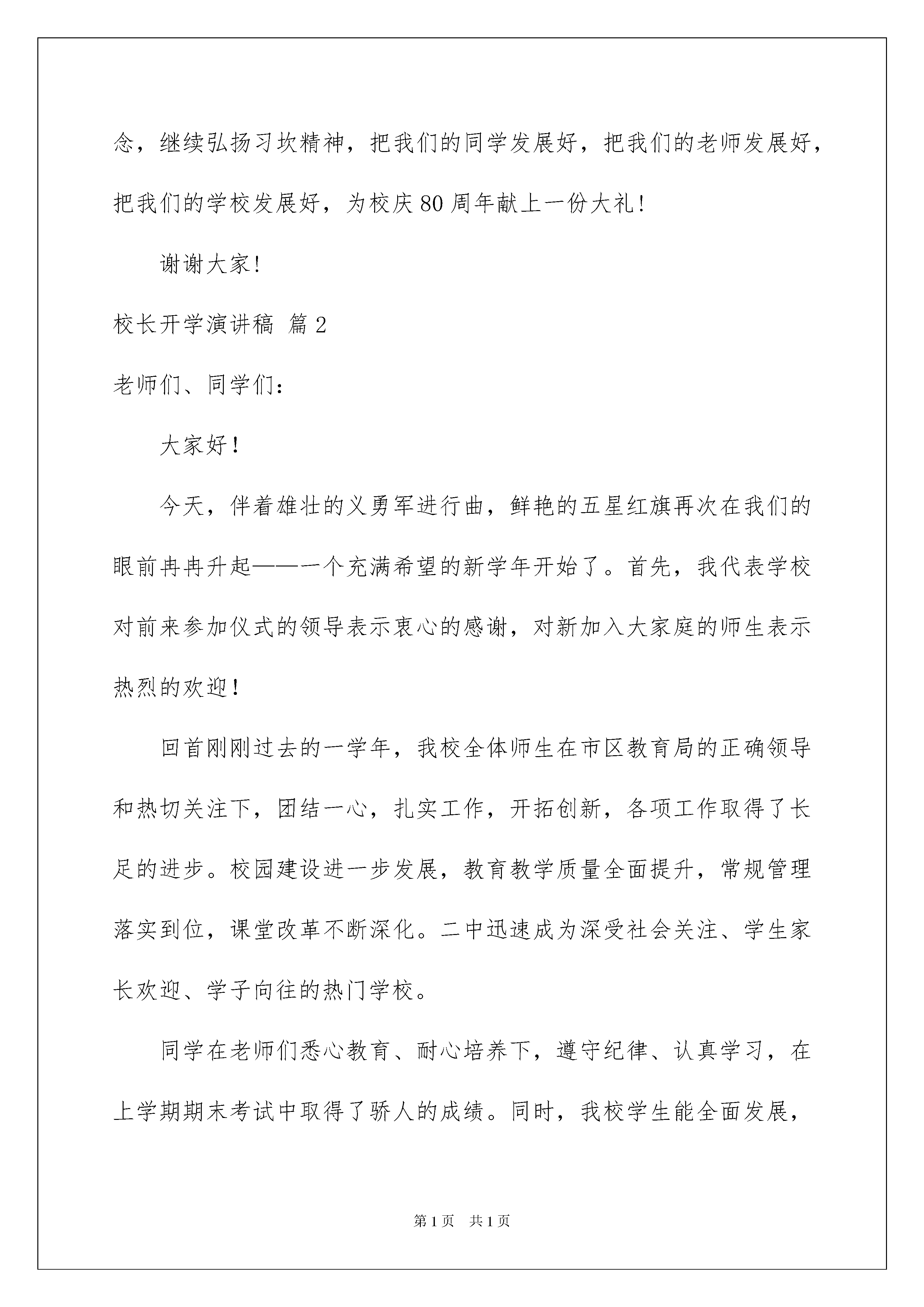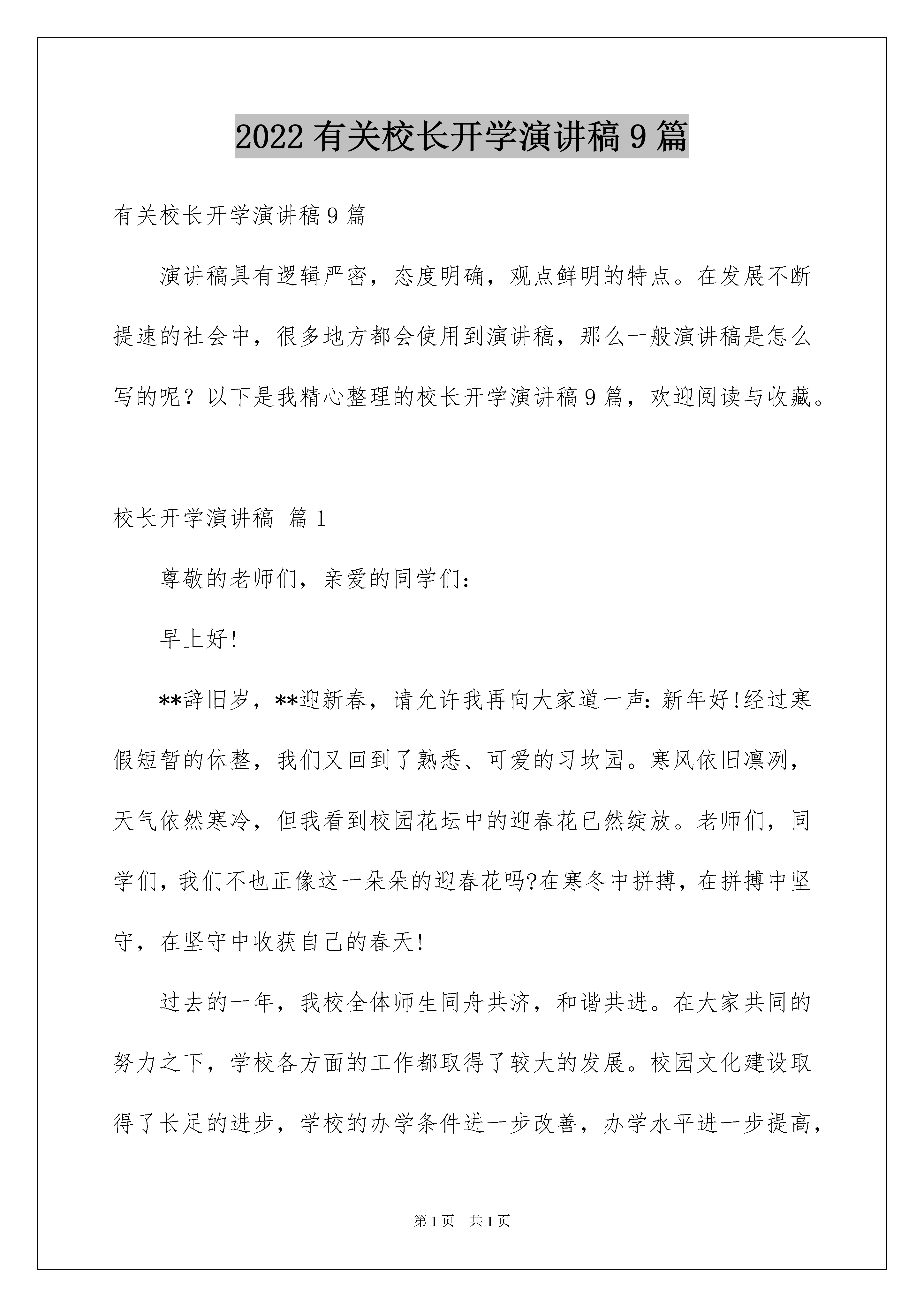 2022有关校长开学演讲稿9篇有关校长开学演讲稿9篇演讲稿具有逻辑严密,态度明确,观点鲜明的特点。在发展不断提速的社会中,很多地方都会使用到演讲稿,那么一般演讲稿是怎么写的呢?以下是我精心整理的校长开学演讲稿9篇,欢迎阅读与收藏。校长开学演讲稿篇1尊敬的老师们,亲爱的同学们:早上好!**辞旧岁,**迎新春,请允许我再向大家道一声:新年好!经过寒假短暂的休整,我们又回到了熟悉、可爱的习坎园。寒风依旧凛冽,天气依然寒冷,但我看到校园花坛中的迎春花已然绽放。老师们,同学们,我们不也正像这一朵朵的迎春花吗?在寒冬中拼搏,在拼搏中坚守,在坚守中收获自己的春天!过去的一年,我校全体师生同舟共济,和谐共进。在大家共同的努力之下,学校各方面的工作都取得了较大的发展。校园文化建设取得了长足的进步,学校的办学条件进一步改善,办学水平进一步提高,办学影响进一步加大。过去的一年,我校有两位教师被评为特级教师,一位教师获评**市人才奖励最高奖——**奖,一位教师被评为**市师德模范标兵,十二位教师被评为国家、省、市“优秀学科教师”,十一位教师获得省、市教学比武一等奖。一学年来我校老师共撰写了150多篇教育叙事及随笔,近20篇论文在国家级、省级学术刊物发表或在学术会议上宣读。过去的一学期,同学们依照学校提出的“全面、充分、主动、和谐发展”的要求,高一高二的同学行为进一步规范,习惯进一步优化,学业进一步提高,身心进一步健康。高三同学高考第一仗打的非常漂亮,在**市一调中高分率高居全市前列;一批自主招生的同学取得好成绩。特别值得一提的是,我校的学科竞赛继续给力。在20xx年全国中学生生物学联赛中获得2个国家一等奖(全市仅3人),且成绩名列前茅。在全国中学生英语能力竞赛决赛中,我校共获得12个国家一等奖。回首过去的一个学期,我们取得的成就很多。但辉煌已然属于过去,展望未来,我们更难免心潮澎湃。因为今年,我校将迎来80周年校庆。七十年,在浩瀚的历史长河中不过是弹指一挥间,但对于我们,对于所有习坎人、对于所有正在或曾经在这里生活奋斗过的人来说,却意味着太多。数十载励精图治,数十载春华秋实,建国以来,从“习坎园”走出了一批批时代的精英,他们中有的是两院院士,有的是商界精英,有的是艺术体育明星,有的是海外名流,还有军事家、外交家、作家,更有一大批社会主义建设的优秀人才。回顾80年的辉煌,更让我们感到肩上责任的重大。老师们,让我们抓住开展“争先创优”活动的契机,扎实开展“师德师风省级示范校”创建活动,带头提升自己的职业素养,切实构建高效课堂,推进教学的有效性;进一步提高自己的道德修养,进一步提升自己的做人品味,做学生的榜样,做学生的良师益友,切实提高自己的师德师风水平,把我校的师德师风推向更高的标准。精心育人、潜心教学,把我校的教育教学质量提高到一个新水平,让名校的旗帜迎风飘扬。同学们,让我们继续弘扬“砥砺德行,上善若水,克难履艰,自强不息”的习坎精神,惜时如金,学会做人,学会学习,学会处事,用优秀的成绩回报父母、回报学校;用感恩的心态回馈老师、回馈父母;用全面的素质迎接挑战、绽放美丽!老师们、同学们,新的学期已经开始,让我们振奋精神、坚定信念,继续弘扬习坎精神,把我们的同学发展好,把我们的老师发展好,把我们的学校发展好,为校庆80周年献上一份大礼!谢谢大家!校长开学演讲稿篇2老师们、同学们:大家好!今天,伴着雄壮的义勇军进行曲,鲜艳的五星红旗再次在我们的眼前冉冉升起——一个充满希望的新学年开始了。首先,我代表学校对前来参加仪式的领导表示衷心的感谢,对新加入大家庭的师生表示热烈的欢迎!回首刚刚过去的一学年,我校全体师生在市区教育局的正确领导和热切关注下,团结一心,扎实工作,开拓创新,各项工作取得了长足的进步。校园建设进一步发展,教育教学质量全面提升,常规管理落实到位,课堂改革不断深化。二中迅速成为深受社会关注、学生家长欢迎、学子向往的热门学校。同学在老师们悉心教育、耐心培养下,遵守纪律、认真学习,在上学期期末考试中取得了骄人的成绩。同时,我校学生能全面发展,在各项比赛中取得了较好成绩,实践了“为每一个学生搭建发展阶梯”的办学理念。致使市出现了空前的二中热现象,这使我们无上荣耀。我们取得的每一个进步、每一份成绩都与全校师生的顽强拼搏和辛勤付出是分不开的。在此,我代表学校向一年来兢兢业业、努力工作、勤奋学习老师和同学们表示衷心的感谢!过去一年的成绩记录着每一个二中人的辛勤,蕴含着我们的智慧。今天,新的学年开始了,新的形势、新的机遇和挑战需要全校师生抖擞精神以高昂的干劲、踏实的作风和崭新的思路去做好每一项工作。我们要牢记