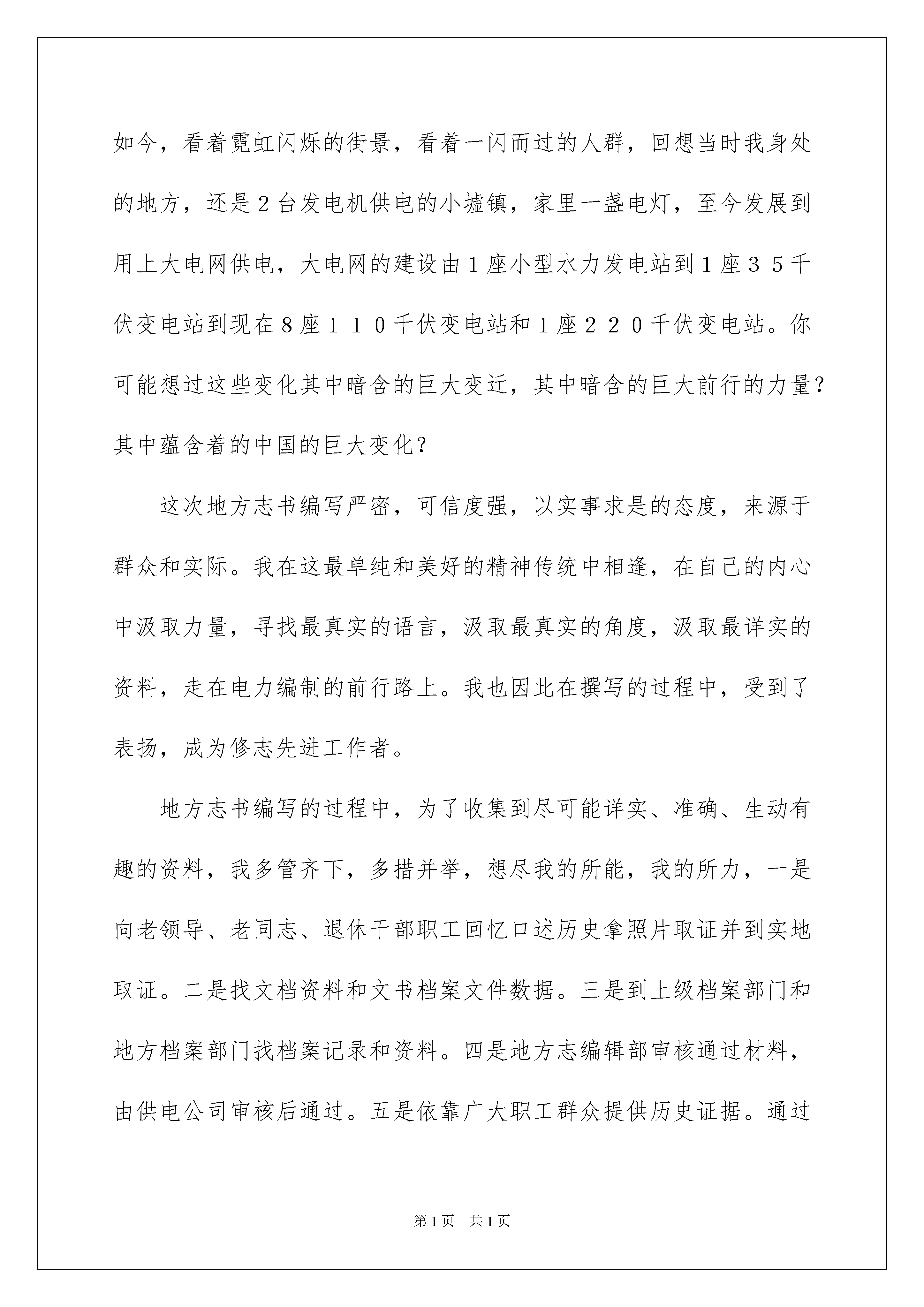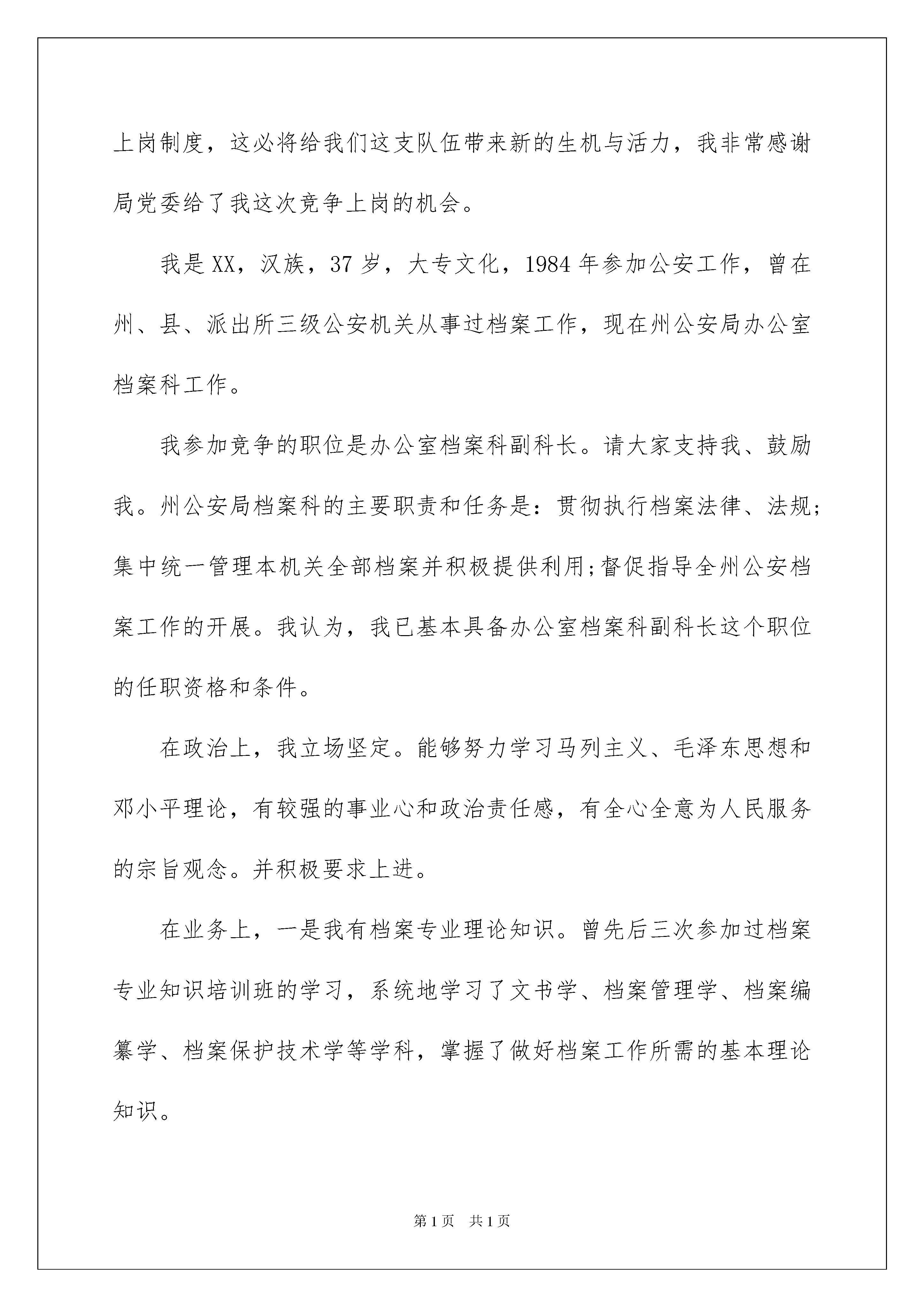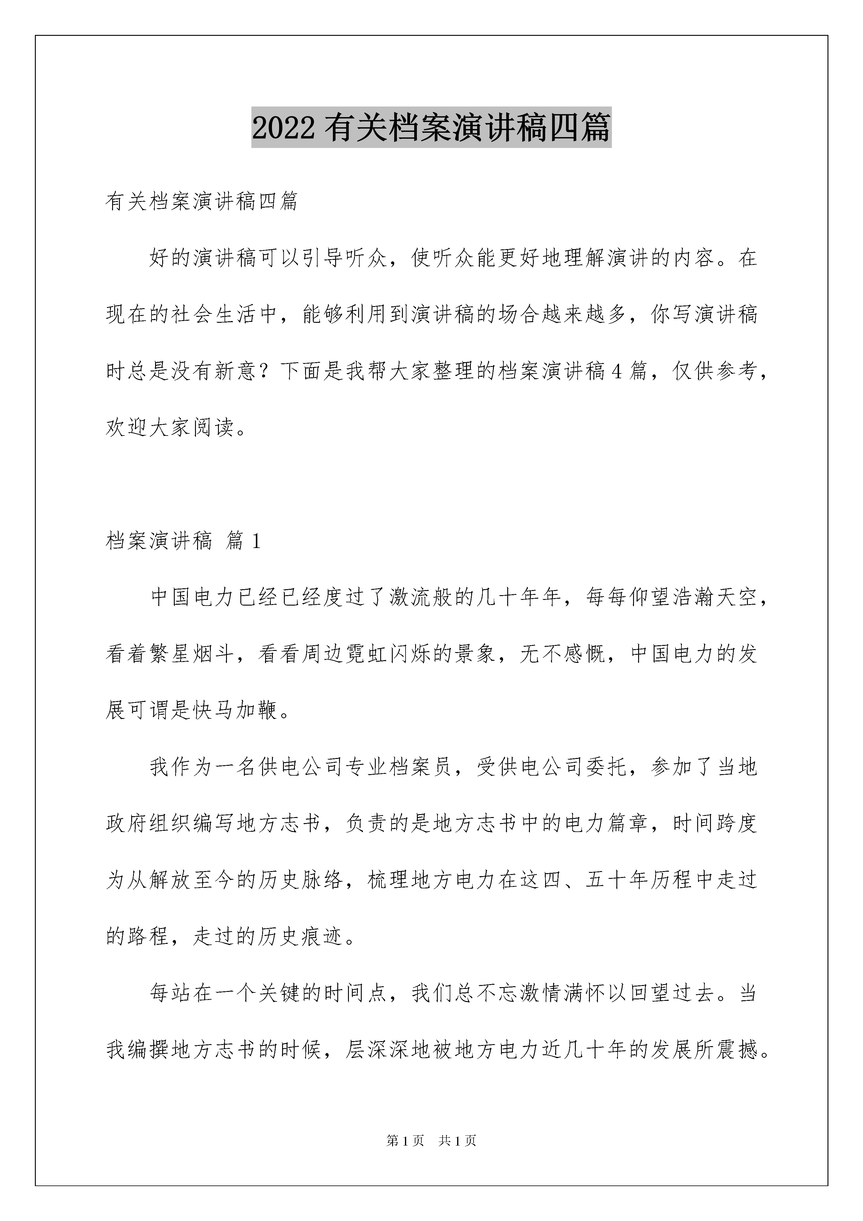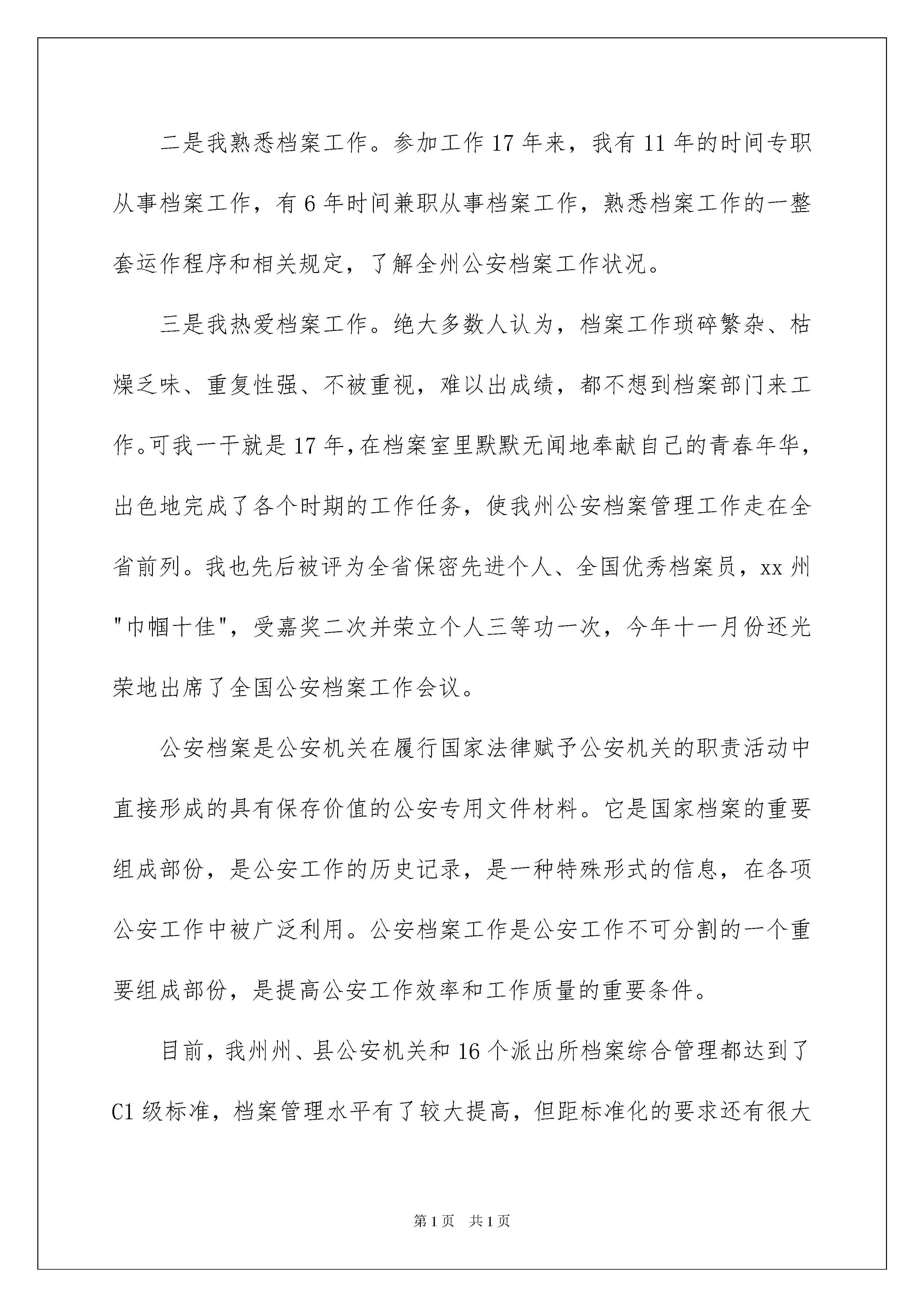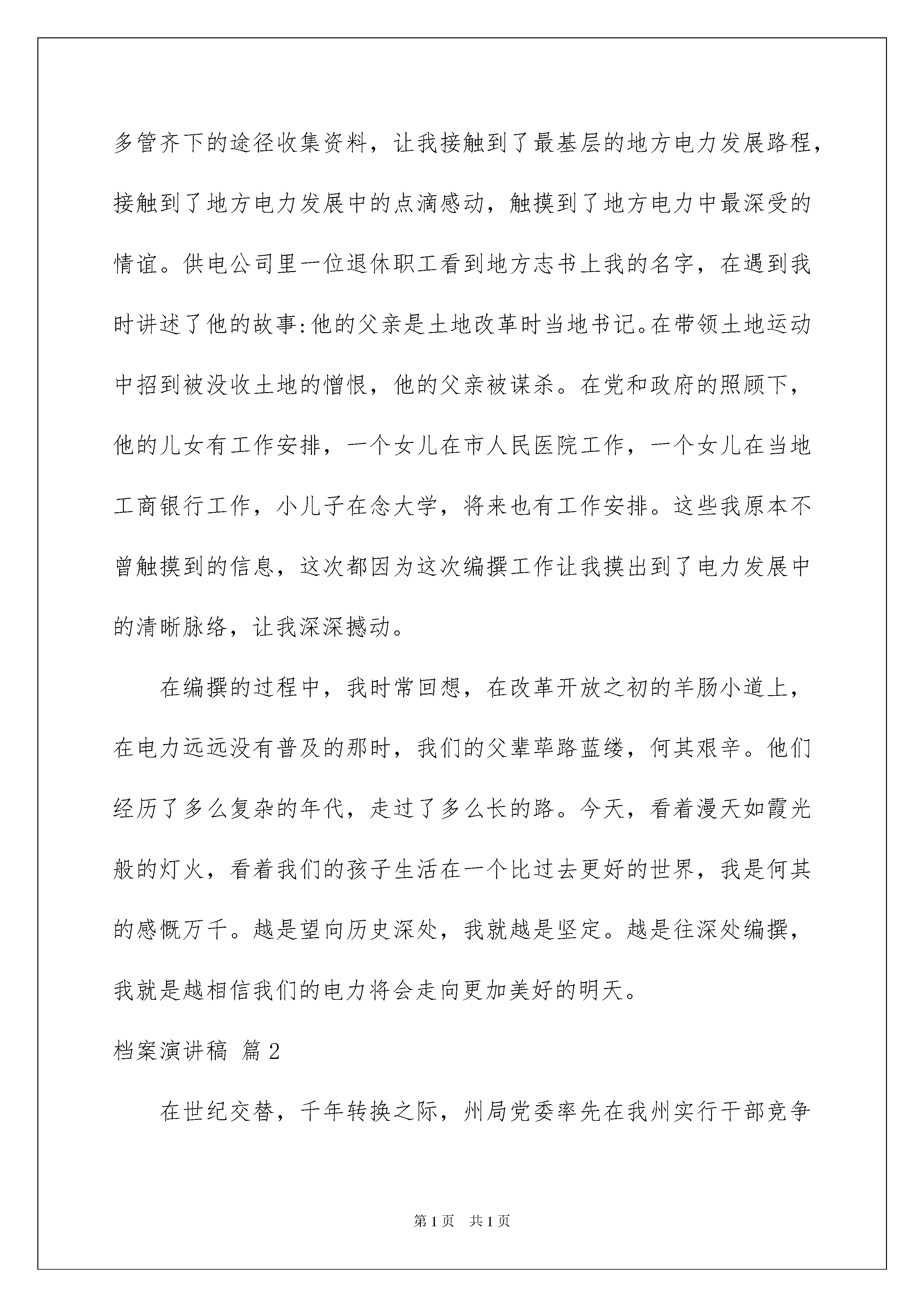 2022有关档案演讲稿四篇有关档案演讲稿四篇好的演讲稿可以引导听众,使听众能更好地理解演讲的内容。在现在的社会生活中,能够利用到演讲稿的场合越来越多,你写演讲稿时总是没有新意?下面是我帮大家整理的档案演讲稿4篇,仅供参考,欢迎大家阅读。档案演讲稿篇1中国电力已经已经度过了激流般的几十年年,每每仰望浩瀚天空,看着繁星烟斗,看看周边霓虹闪烁的景象,无不感慨,中国电力的发展可谓是快马加鞭。我作为一名供电公司专业档案员,受供电公司委托,参加了当地政府组织编写地方志书,负责的是地方志书中的电力篇章,时间跨度为从解放至今的历史脉络,梳理地方电力在这四、五十年历程中走过的路程,走过的历史痕迹。每站在一个关键的时间点,我们总不忘激情满怀以回望过去。当我编撰地方志书的时候,层深深地被地方电力近几十年的发展所震撼。如今,看着霓虹闪烁的街景,看着一闪而过的人群,回想当时我身处的地方,还是2台发电机供电的小墟镇,家里一盏电灯,至今发展到用上大电网供电,大电网的建设由1座小型水力发电站到1座35千伏变电站到现在8座110千伏变电站和1座220千伏变电站。你可能想过这些变化其中暗含的巨大变迁,其中暗含的巨大前行的力量?其中蕴含着的中国的巨大变化?这次地方志书编写严密,可信度强,以实事求是的态度,来源于群众和实际。我在这最单纯和美好的精神传统中相逢,在自己的内心中汲取力量,寻找最真实的语言,汲取最真实的角度,汲取最详实的资料,走在电力编制的前行路上。我也因此在撰写的过程中,受到了表扬,成为修志先进工作者。地方志书编写的过程中,为了收集到尽可能详实、准确、生动有趣的资料,我多管齐下,多措并举,想尽我的所能,我的所力,一是向老领导、老同志、退休干部职工回忆口述历史拿照片取证并到实地取证。二是找文档资料和文书档案文件数据。三是到上级档案部门和地方档案部门找档案记录和资料。四是地方志编辑部审核通过材料,由供电公司审核后通过。五是依靠广大职工群众提供历史证据。通过多管齐下的途径收集资料,让我接触到了最基层的地方电力发展路程,接触到了地方电力发展中的点滴感动,触摸到了地方电力中最深受的情谊。供电公司里一位退休职工看到地方志书上我的名字,在遇到我时讲述了他的故事:他的父亲是土地改革时当地书记。在带领土地运动中招到被没收土地的憎恨,他的父亲被谋杀。在党和政府的照顾下,他的儿女有工作安排,一个女儿在市人民医院工作,一个女儿在当地工商银行工作,小儿子在念大学,将来也有工作安排。这些我原本不曾触摸到的信息,这次都因为这次编撰工作让我摸出到了电力发展中的清晰脉络,让我深深撼动。在编撰的过程中,我时常回想,在改革开放之初的羊肠小道上,在电力远远没有普及的那时,我们的父辈荜路蓝缕,何其艰辛。他们经历了多么复杂的年代,走过了多么长的路。今天,看着漫天如霞光般的灯火,看着我们的孩子生活在一个比过去更好的世界,我是何其的感慨万千。越是望向历史深处,我就越是坚定。越是往深处编撰,我就是越相信我们的电力将会走向更加美好的明天。档案演讲稿篇2在世纪交替,千年转换之际,州局党委率先在我州实行干部竞争上岗制度,这必将给我们这支队伍带来新的生机与活力,我非常感谢局党委给了我这次竞争上岗的机会。我是XX,汉族,37岁,大专文化,1984年参加公安工作,曾在州、县、派出所三级公安机关从事过档案工作,现在州公安局办公室档案科工作。我参加竞争的职位是办公室档案科副科长。请大家支持我、鼓励我。州公安局档案科的主要职责和任务是:贯彻执行档案法律、法规;集中统一管理本机关全部档案并积极提供利用;督促指导全州公安档案工作的开展。我认为,我已基本具备办公室档案科副科长这个职位的任职资格和条件。在政治上,我立场坚定。能够努力学习马列主义、毛泽东思想和邓小平理论,有较强的事业心和政治责任感,有全心全意为人民服务的宗旨观念。并积极要求上进。在业务上,一是我有档案专业理论知识。曾先后三次参加过档案专业知识培训班的学习,系统地学习了文书学、档案管理学、档案编纂学、档案保护技术学等学科,掌握了做好档案工作所需的基本理论知识。二是我熟悉档案工作。参加工作17年来,我有11年的时间专职从事档案工作,有6年时间兼职从事档案工作,熟悉档案工作的一整套运作程序和相关规定,了解全州公安档案工作状况。三是我热爱档案工作。绝大多数人认为,档案工作琐碎繁杂、枯燥乏味、重复性强、不被重视,难以出成绩,都不想到档案部门来工作。可我一干就是17年,在档案室里默默无闻地奉献自己的青春年华,出色地完成了各个时期的工作任务,使我州公安档案管理工作走在全省前列。我也先后被评为全省保密先进个人、全国优秀档案员
