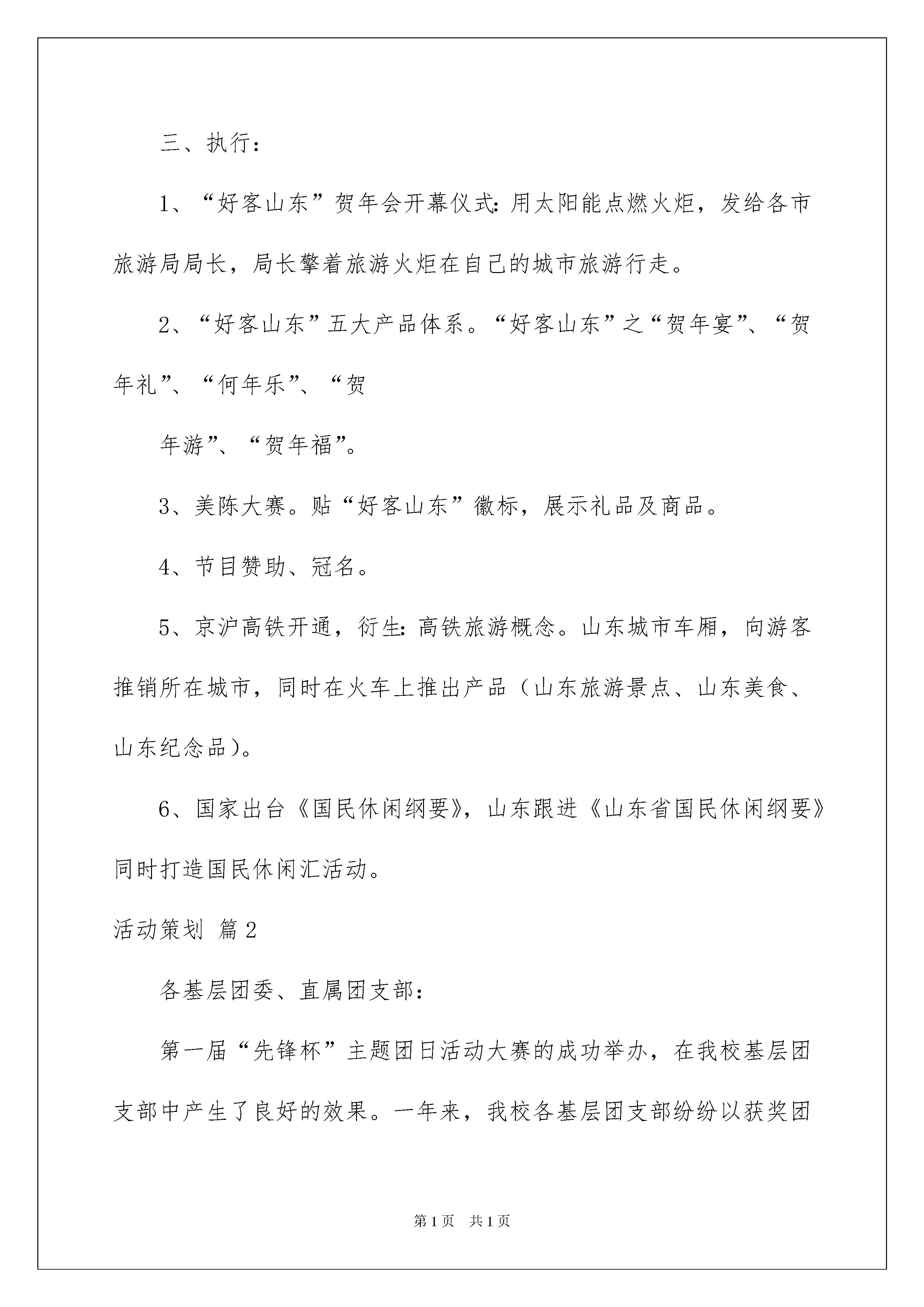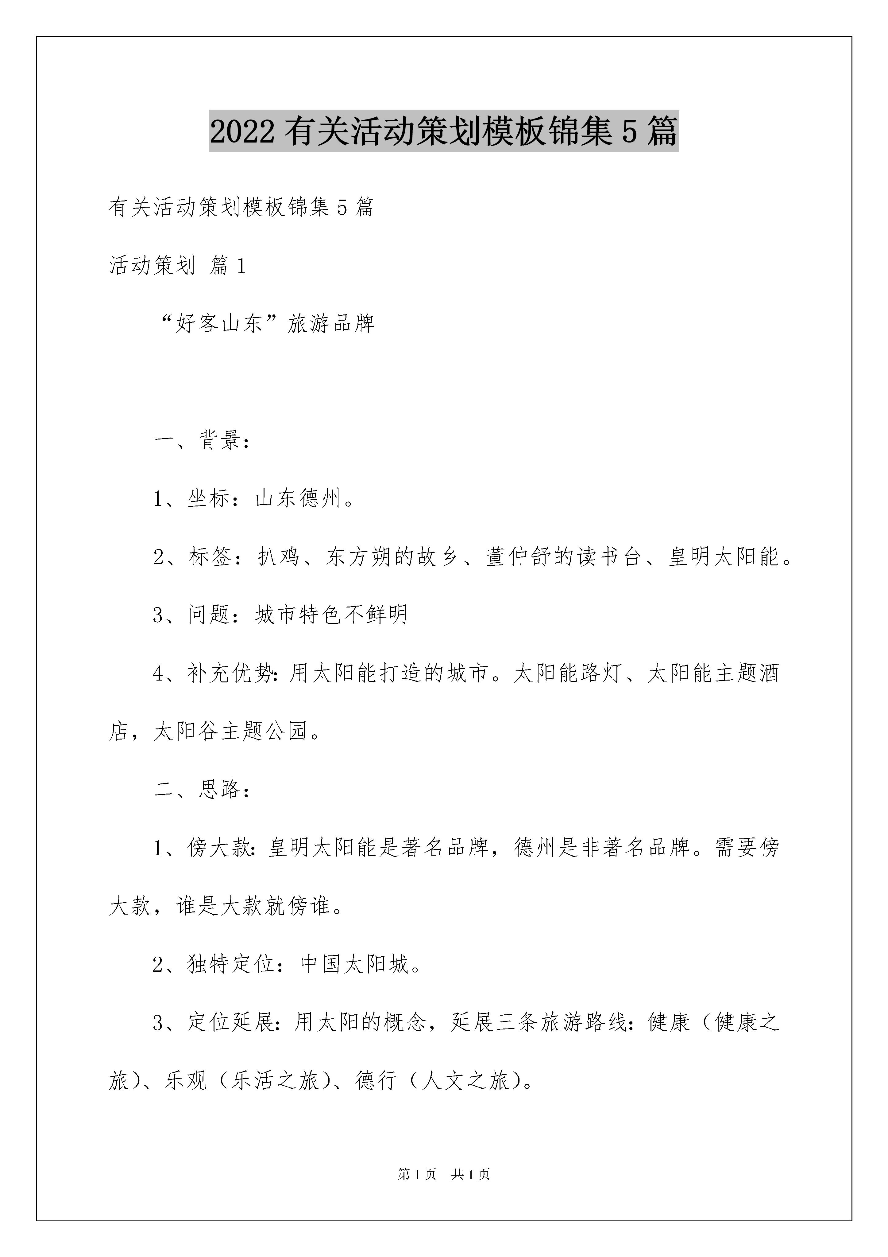 2022有关活动策划模板锦集5篇有关活动策划模板锦集5篇活动策划篇1“好客山东”旅游品牌一、背景:1、坐标:山东德州。2、标签:扒鸡、东方朔的故乡、董仲舒的读书台、皇明太阳能。3、问题:城市特色不鲜明4、补充优势:用太阳能打造的城市。太阳能路灯、太阳能主题酒店,太阳谷主题公园。二、思路:1、傍大款:皇明太阳能是著名品牌,德州是非著名品牌。需要傍大款,谁是大款就傍谁。2、独特定位:中国太阳城。3、定位延展:用太阳的概念,延展三条旅游路线:健康(健康之旅)、乐观(乐活之旅)、德行(人文之旅)。三、执行:1、“好客山东”贺年会开幕仪式:用太阳能点燃火炬,发给各市旅游局局长,局长擎着旅游火炬在自己的城市旅游行走。2、“好客山东”五大产品体系。“好客山东”之“贺年宴”、“贺年礼”、“何年乐”、“贺年游”、“贺年福”。3、美陈大赛。贴“好客山东”徽标,展示礼品及商品。4、节目赞助、冠名。5、京沪高铁开通,衍生:高铁旅游概念。山东城市车厢,向游客推销所在城市,同时在火车上推出产品(山东旅游景点、山东美食、山东纪念品)。6、国家出台《国民休闲纲要》,山东跟进《山东省国民休闲纲要》同时打造国民休闲汇活动。活动策划篇2各基层团委、直属团支部:第一届“先锋杯”主题团日活动大赛的成功举办,在我校基层团支部中产生了良好的效果。一年来,我校各基层团支部纷纷以获奖团支部为榜样,通过开展内容丰富、形式多样的主题团日活动,积极引导青年学生、服务青年学生,为学校的校风、学风建设做出了积极的贡献。为了进一步加强我校团的基层组织建设,丰富团员青年的文化生活,增强团组织的凝聚力,提高团员参加组织生活的热情,营造积极健康的活动氛围,使团组织更具有创造力和生命力,努力打造我校团日活动的新品牌,不断增强基层团组织的活力,以实际行动迎接建团85周年,经校团委研究,决定在全校各团支部中开展第二届“先锋杯”主题团日活动设计大赛,现将有关事宜通知如下:一、活动主题争做时代先锋,创建和谐校园。本次活动以“凝聚团员青年,活跃支部工作,构建和谐校园”为目标;本着集思广益、博采众长、推陈出新的原则,结合各团支部特点,锐意创新,大胆实践;紧密围绕构建和谐校园的主题和基层团支部建设;倡导有利于青年学生健康成长的校园文化活动氛围,加强青年学生的素质拓展和创新能力的培养,促进广大学生综合素质的全面提高。二、活动内容本次“先锋杯”团日活动设计大赛,面向全校学生,积极组织开展各种有益于支部建设,有益于大学生身心健康,有利于大学生成才就业和社会进步的公益性活动,体现广泛参与性和不断创新性。主题团日活动形式应多样化,鼓励主题团日活动方案在与专业特色相结合的基础上进行更深入的研究,大力提倡主题团日活动品牌化、长期化、项目化,强调团组织生活的与时俱进,加强基层团组织的凝聚力、创造性和战斗力。三、实施办法1.本次“先锋杯”主题团日活动大赛分为初赛和决赛。初赛由各基层团委(直属团支部)在各单位范围内自行开展,决赛由校团委统一举行。2.本次活动以各基层团支部为参赛单位,参加各院(系)的初赛。3.各基层团委(直属团支部)根据初赛结果评选出1个优秀团支部,推荐到校团委参加决赛。4.活动结束后,各基层团委(直属团支部)将所有参赛团支部设计方案、活动总结及宣传材料整理成电子档案交校团委存档。四、具体实施步骤:第一阶段(4月2日—4月8日):宣传发动与方案设计各基层团委(直属团支部)要进行广泛宣传、动员,充分调动广大团员的积极性,引导各团支部积极参与。围绕活动的主题,充分利用各种资源,按照“主题鲜明、形式新颖,立足基层、面向团员,重在创意、注重实效”的原则,进行主题团日活动方案的设计。第二阶段(4月9日—4月15日):组织实施观摩各团支部根据设计的活动方案将本支部开展的团日活动以项目的方式向院(系)团委申报,经基层团委同意后,认真组织支部成员对活动方案付诸实施。在实施过程中注意及时总结,要有书面材料及相应的文字、图片等资料。各基层团委在方案实施过程中,要大力指导,现场观摩,考核实效。第三阶段(4月16日—4月22日):院(系)评比推荐活动的评比采用申报制,各团支部将《郑州大学“先锋杯”主题团日活动大赛申报表》及活动有关材料报各基层团委(直属团支部),参加院(系)的评比,各基层团委(直属团支部)结合实际观摩的考核效果进行评定,根据最后结果,于4月24日之前推荐上报1个团支部参加学校的决赛。第四阶段(4月30日—5月6日):决赛及表彰校团委根据各院(系)推荐团支部的活动申报表及相关活动材料,选出参加最后决赛的10—12个团支部,并进行赛前培训。进入总决赛的团支部要求将总结材