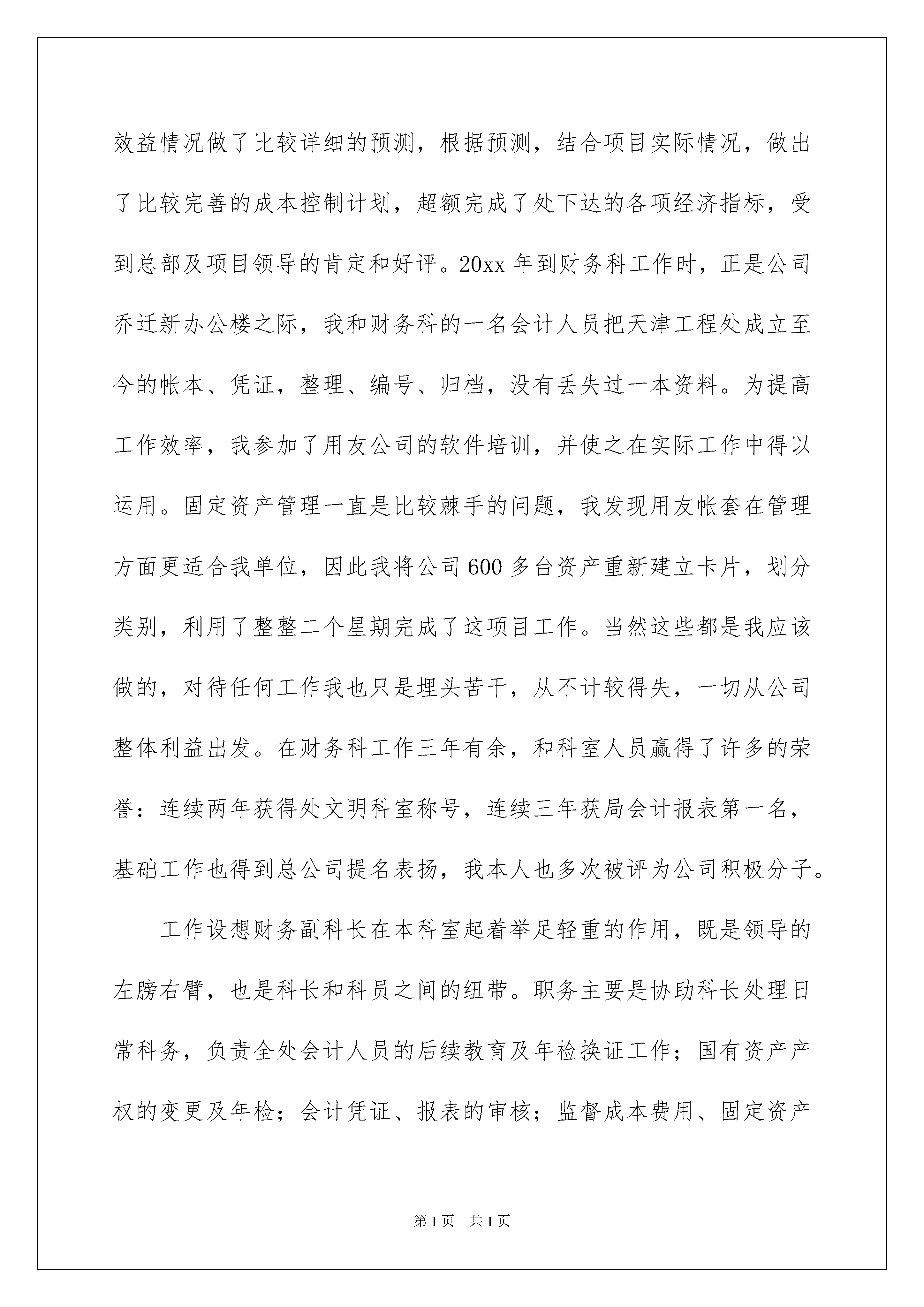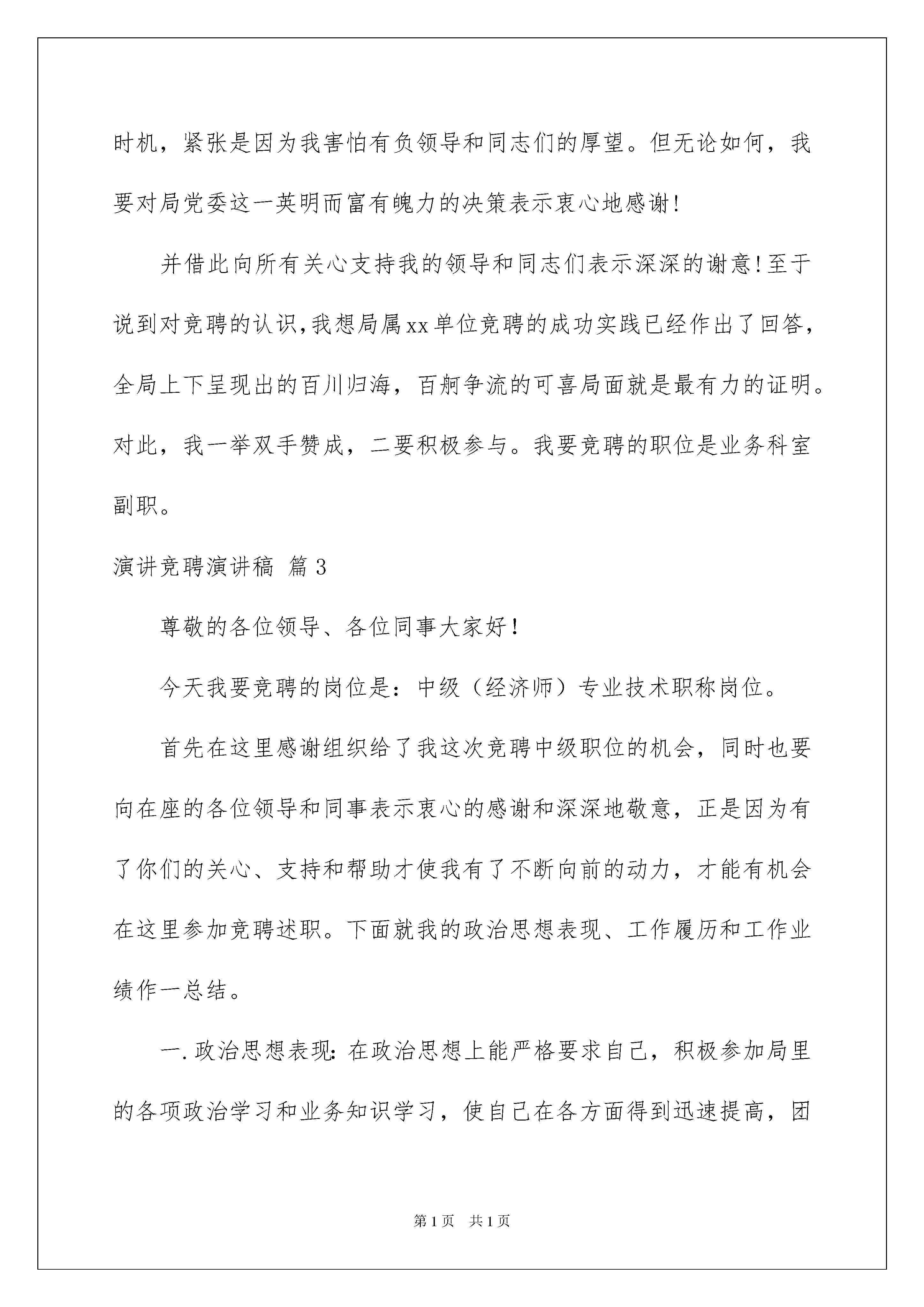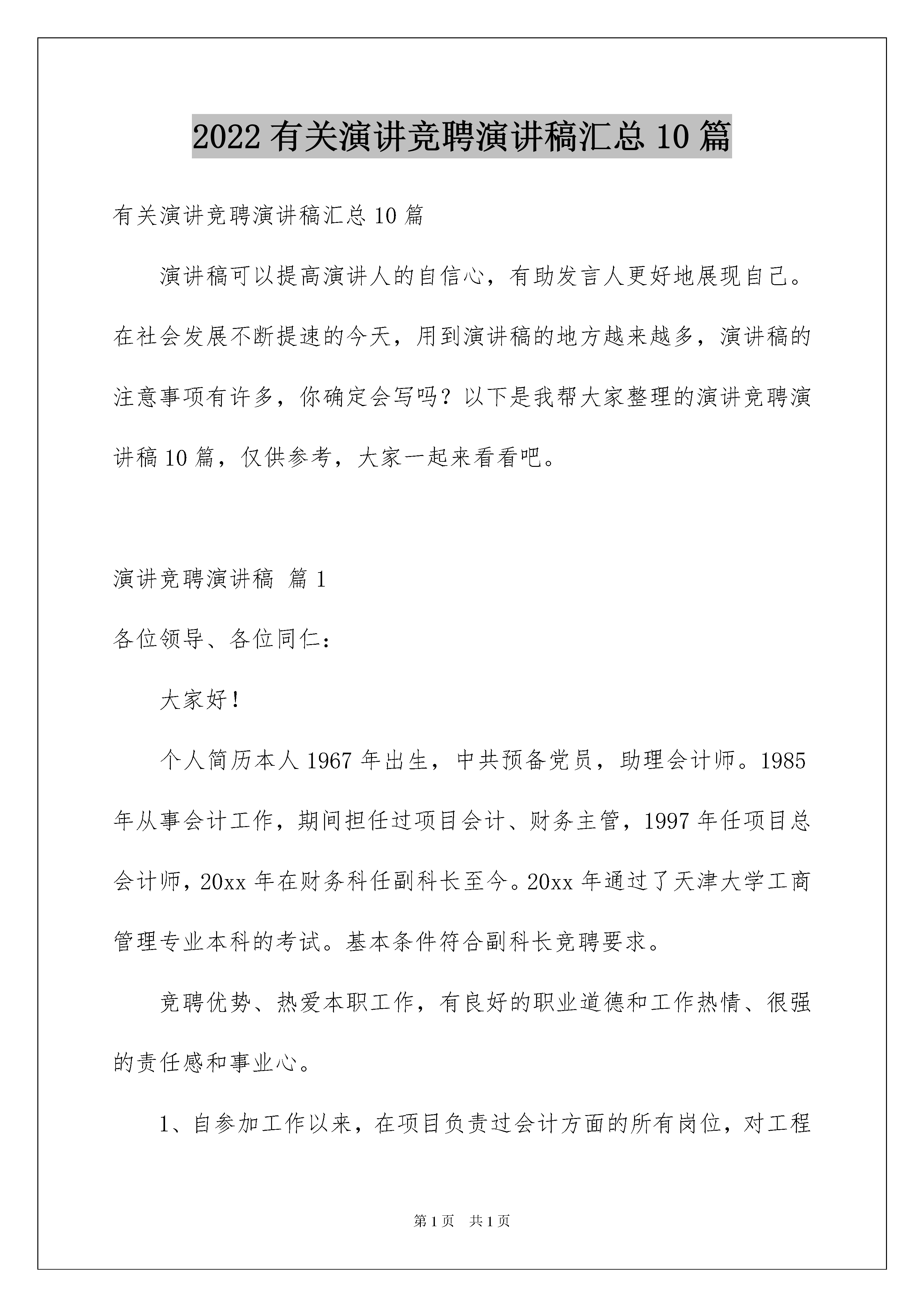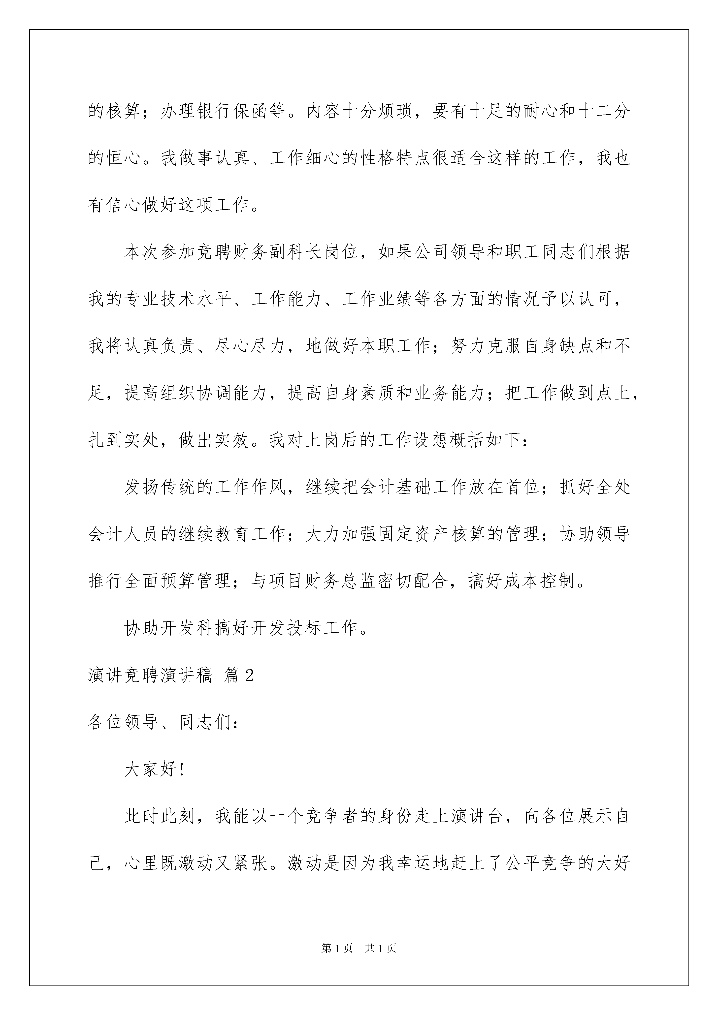 2022有关演讲竞聘演讲稿汇总10篇有关演讲竞聘演讲稿汇总10篇演讲稿可以提高演讲人的自信心,有助发言人更好地展现自己。在社会发展不断提速的今天,用到演讲稿的地方越来越多,演讲稿的注意事项有许多,你确定会写吗?以下是我帮大家整理的演讲竞聘演讲稿10篇,仅供参考,大家一起来看看吧。演讲竞聘演讲稿篇1各位领导、各位同仁:大家好!个人简历本人1967年出生,中共预备党员,助理会计师。1985年从事会计工作,期间担任过项目会计、财务主管,1997年任项目总会计师,20xx年在财务科任副科长至今。20xx年通过了天津大学工商管理专业本科的考试。基本条件符合副科长竞聘要求。竞聘优势、热爱本职工作,有良好的职业道德和工作热情、很强的责任感和事业心。1、自参加工作以来,在项目负责过会计方面的所有岗位,对工程处项目财务管理情况比较了解,能够很好的与项目财务总监沟通。2、熟悉财务会计制度及相关法律法规,对财务报表成本核算等一系列财务核算程序比较精通。具有扎实的专业理论知识、较宽的知识面和丰富的工作经验。在财务管理方面综合素质较强。3、虚心好学,求学上进,经常利用业余时间学习各种业务知识,不断提高自身素质,能够利用自己所掌握的财务管理知识、会计软件知识和多年从事会计工作的经验协助搞好财务科的工作。主要业绩从事财务工作没有什么惊天动地的大事,也没有特殊的业绩,但在平凡的岗位上也能做出成绩来:参加工作至今,分别从事过平双公路、济青高速公路、河北107工程、南疆大桥、河北307国道等工程的财务管理工作,积累了可贵的工作经验。1995年任财务主管后更加严格要求自己,因工作出色1997年被处聘任为南疆项目总会,在职期间,积极参与管理,尤其在资金管理方面做了大量的工作,协助领导与业主结算、核对、索要工程款。同时狠抓会计基础工作,以《规范》为标准,踏踏实实把基础工作做到位,南疆项目的基础工作至今仍是公司的典范,这里也渗透着我的一份汗水。在衡水项目担任财务总会期间,会同项目领导及各部门负责人对河北307国道的成本效益情况做了比较详细的预测,根据预测,结合项目实际情况,做出了比较完善的成本控制计划,超额完成了处下达的各项经济指标,受到总部及项目领导的肯定和好评。20xx年到财务科工作时,正是公司乔迁新办公楼之际,我和财务科的一名会计人员把天津工程处成立至今的帐本、凭证,整理、编号、归档,没有丢失过一本资料。为提高工作效率,我参加了用友公司的软件培训,并使之在实际工作中得以运用。固定资产管理一直是比较棘手的问题,我发现用友帐套在管理方面更适合我单位,因此我将公司600多台资产重新建立卡片,划分类别,利用了整整二个星期完成了这项目工作。当然这些都是我应该做的,对待任何工作我也只是埋头苦干,从不计较得失,一切从公司整体利益出发。在财务科工作三年有余,和科室人员赢得了许多的荣誉:连续两年获得处文明科室称号,连续三年获局会计报表第一名,基础工作也得到总公司提名表扬,我本人也多次被评为公司积极分子。工作设想财务副科长在本科室起着举足轻重的作用,既是领导的左膀右臂,也是科长和科员之间的纽带。职务主要是协助科长处理日常科务,负责全处会计人员的后续教育及年检换证工作;国有资产产权的变更及年检;会计凭证、报表的审核;监督成本费用、固定资产的核算;办理银行保函等。内容十分烦琐,要有十足的耐心和十二分的恒心。我做事认真、工作细心的性格特点很适合这样的工作,我也有信心做好这项工作。本次参加竞聘财务副科长岗位,如果公司领导和职工同志们根据我的专业技术水平、工作能力、工作业绩等各方面的情况予以认可,我将认真负责、尽心尽力,地做好本职工作;努力克服自身缺点和不足,提高组织协调能力,提高自身素质和业务能力;把工作做到点上,扎到实处,做出实效。我对上岗后的工作设想概括如下:发扬传统的工作作风,继续把会计基础工作放在首位;抓好全处会计人员的继续教育工作;大力加强固定资产核算的管理;协助领导推行全面预算管理;与项目财务总监密切配合,搞好成本控制。协助开发科搞好开发投标工作。演讲竞聘演讲稿篇2各位领导、同志们:大家好!此时此刻,我能以一个竞争者的身份走上演讲台,向各位展示自己,心里既激动又紧张。激动是因为我幸运地赶上了公平竞争的大好时机,紧张是因为我害怕有负领导和同志们的厚望。但无论如何,我要对局党委这一英明而富有魄力的决策表示衷心地感谢!并借此向所有关心支持我的领导和同志们表示深深的谢意!至于说到对竞聘的认识,我想局属xx单位竞聘的成功实践已经作出了回答,全局上下呈现出的百川归海,百舸争流的可喜局面就是最有力的证明。对此,我一举双手赞成,二要积极参与
