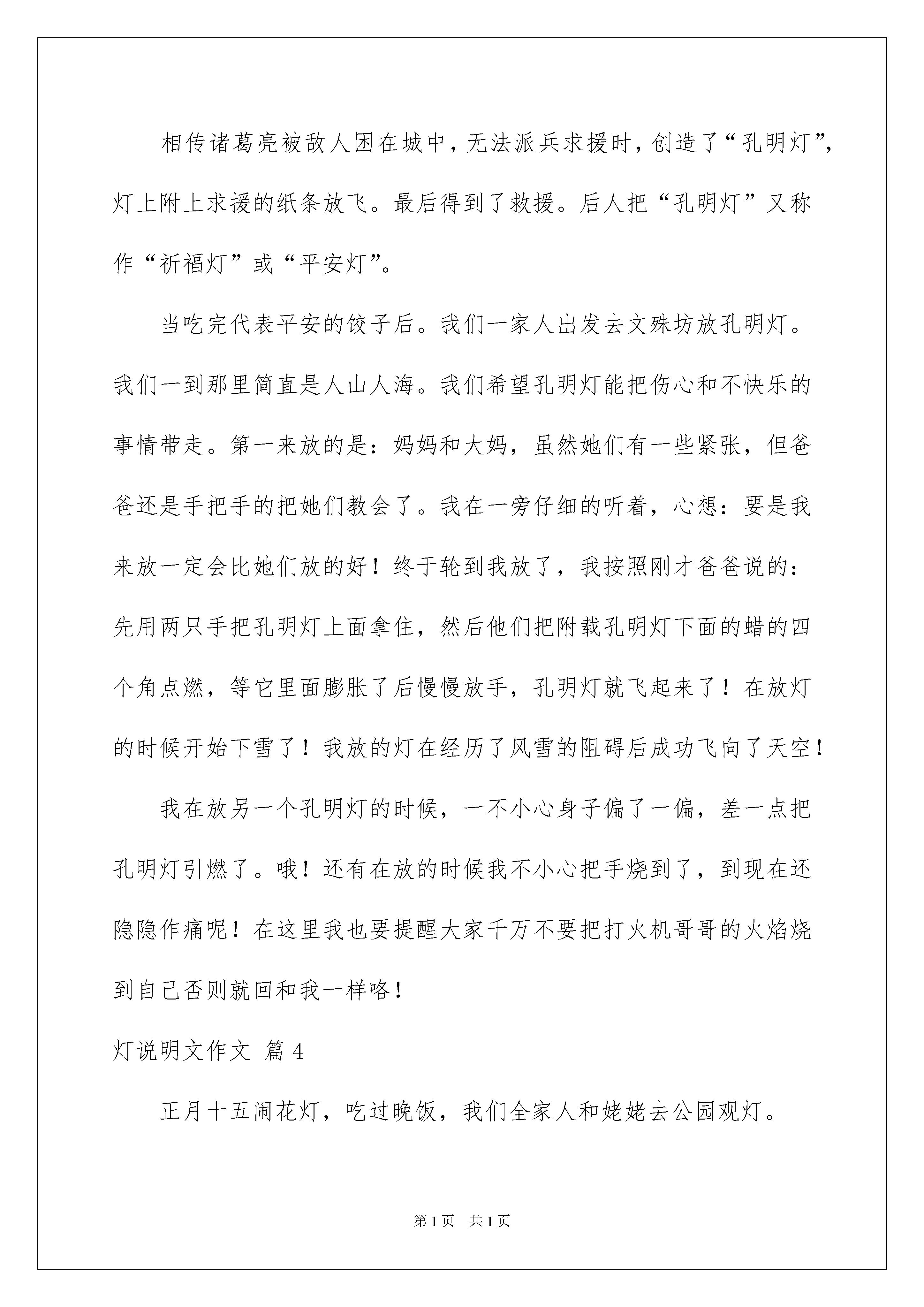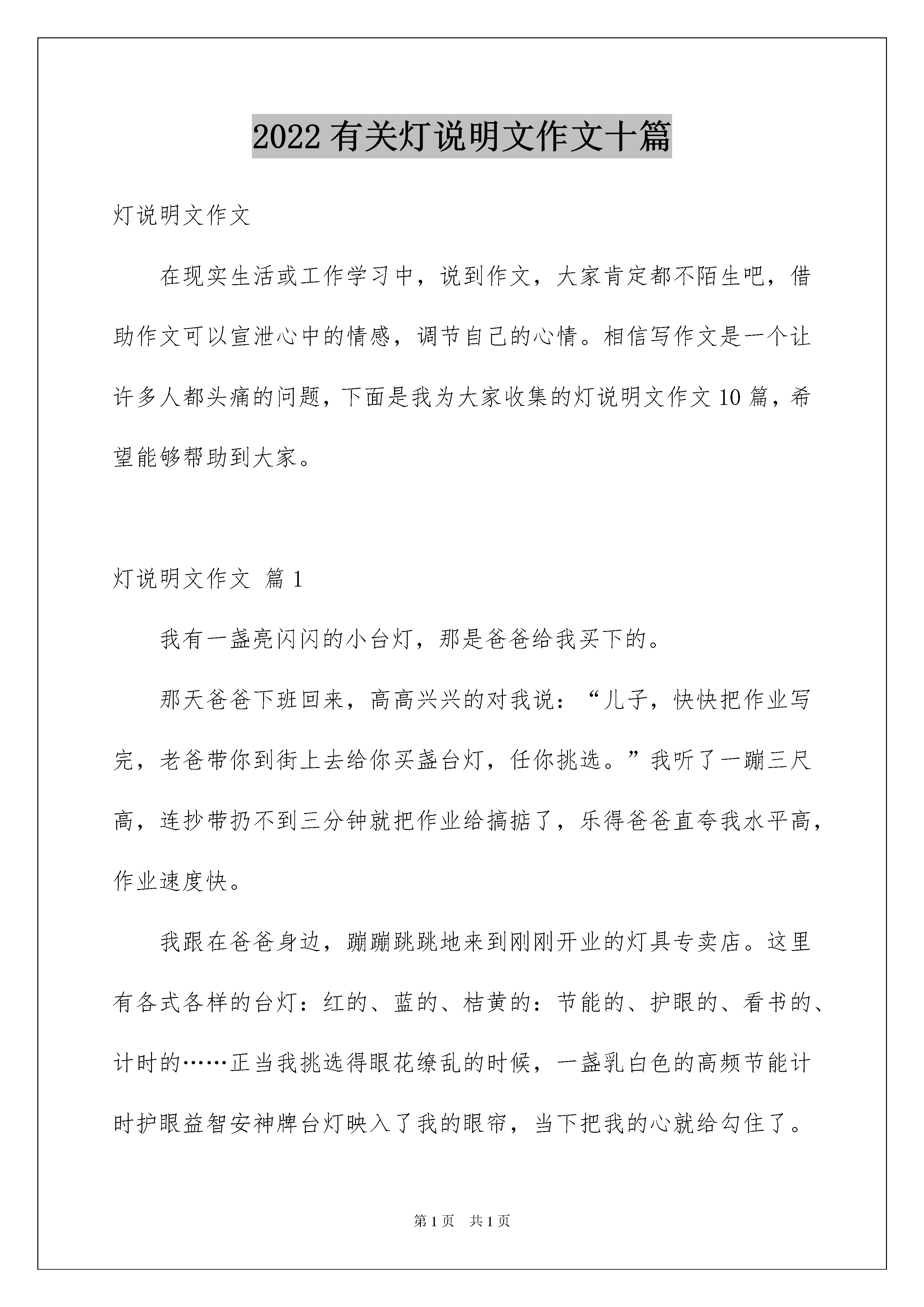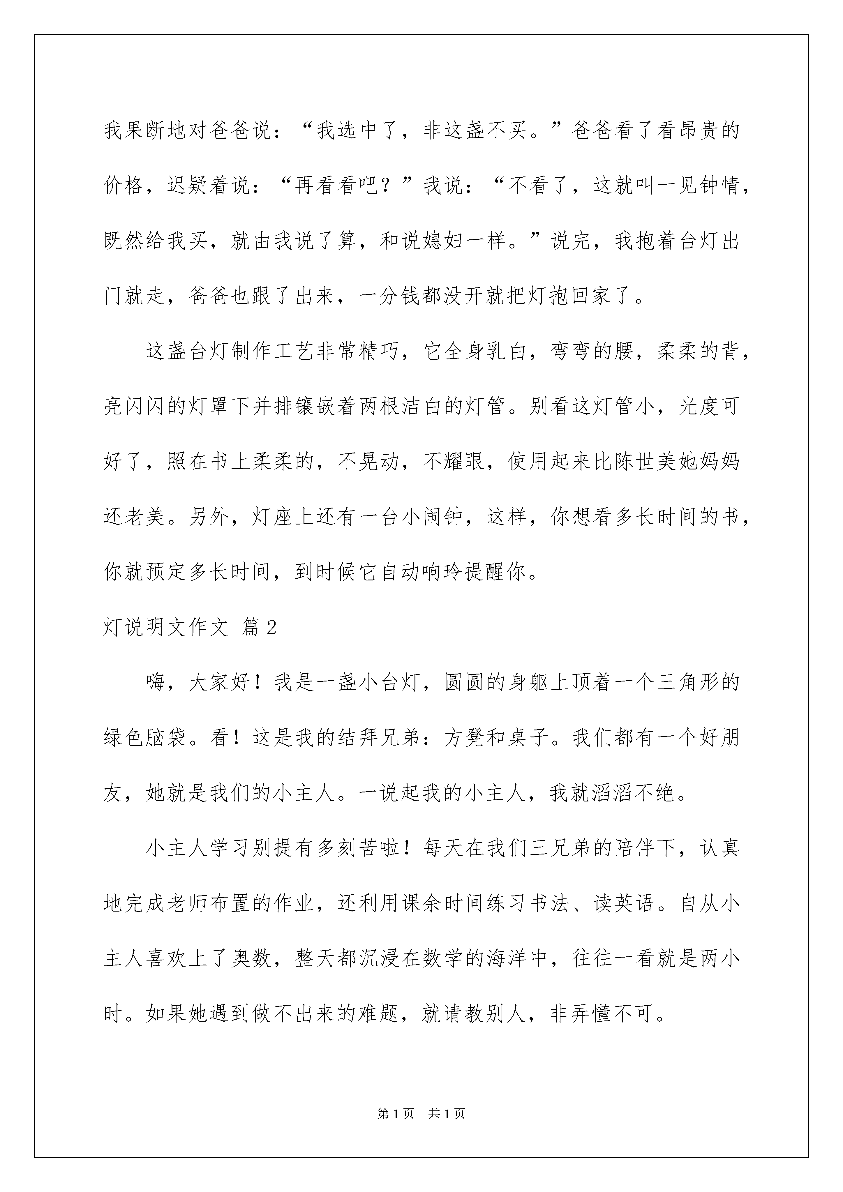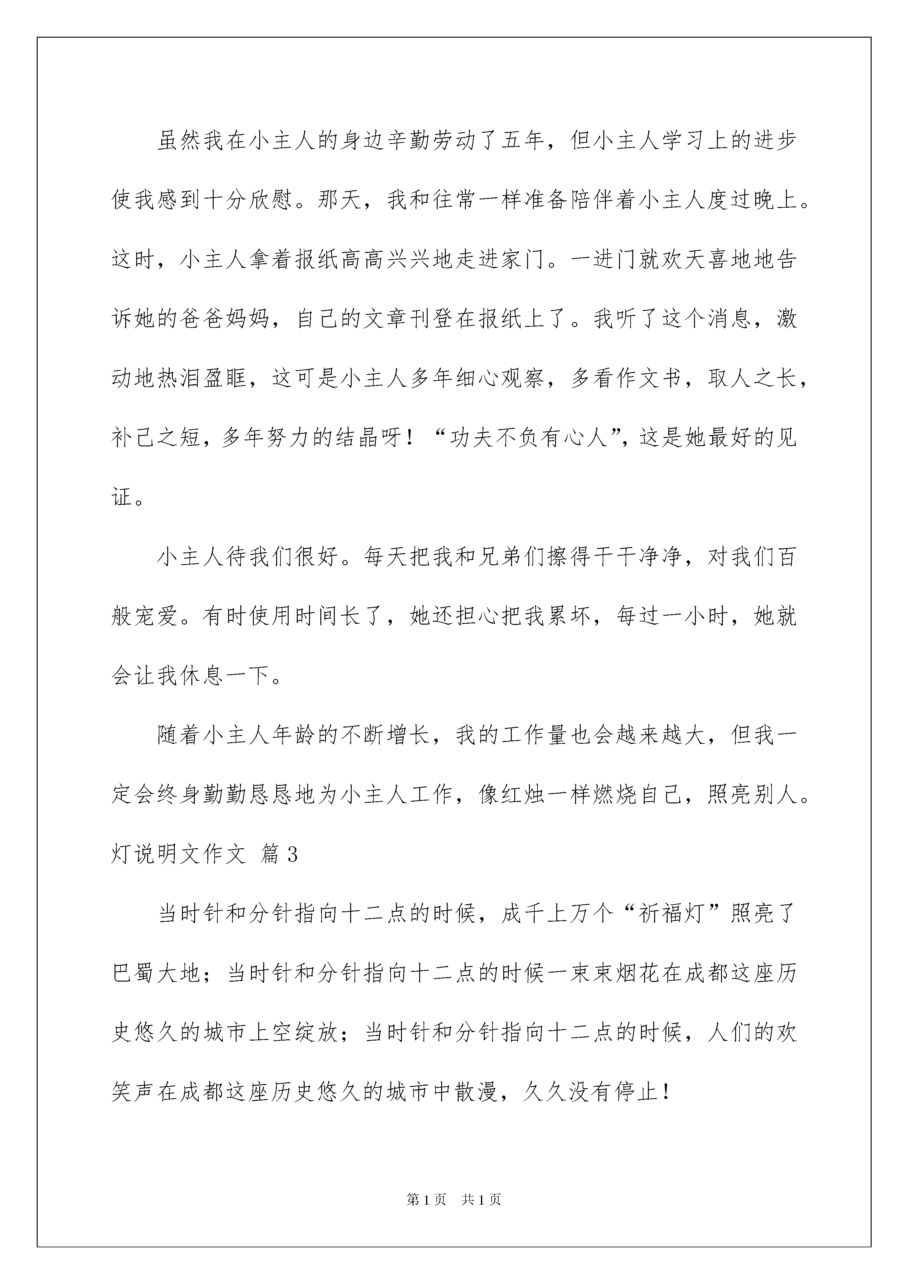 2022有关灯说明文作文十篇灯说明文作文在现实生活或工作学习中,说到作文,大家肯定都不陌生吧,借助作文可以宣泄心中的情感,调节自己的心情。相信写作文是一个让许多人都头痛的问题,下面是我为大家收集的灯说明文作文10篇,希望能够帮助到大家。灯说明文作文篇1我有一盏亮闪闪的小台灯,那是爸爸给我买下的。那天爸爸下班回来,高高兴兴的对我说:“儿子,快快把作业写完,老爸带你到街上去给你买盏台灯,任你挑选。”我听了一蹦三尺高,连抄带扔不到三分钟就把作业给搞掂了,乐得爸爸直夸我水平高,作业速度快。我跟在爸爸身边,蹦蹦跳跳地来到刚刚开业的灯具专卖店。这里有各式各样的台灯:红的、蓝的、桔黄的:节能的、护眼的、看书的、计时的……正当我挑选得眼花缭乱的时候,一盏乳白色的高频节能计时护眼益智安神牌台灯映入了我的眼帘,当下把我的心就给勾住了。我果断地对爸爸说:“我选中了,非这盏不买。”爸爸看了看昂贵的价格,迟疑着说:“再看看吧?”我说:“不看了,这就叫一见钟情,既然给我买,就由我说了算,和说媳妇一样。”说完,我抱着台灯出门就走,爸爸也跟了出来,一分钱都没开就把灯抱回家了。这盏台灯制作工艺非常精巧,它全身乳白,弯弯的腰,柔柔的背,亮闪闪的灯罩下并排镶嵌着两根洁白的灯管。别看这灯管小,光度可好了,照在书上柔柔的,不晃动,不耀眼,使用起来比陈世美她妈妈还老美。另外,灯座上还有一台小闹钟,这样,你想看多长时间的书,你就预定多长时间,到时候它自动响玲提醒你。灯说明文作文篇2嗨,大家好!我是一盏小台灯,圆圆的身躯上顶着一个三角形的绿色脑袋。看!这是我的结拜兄弟:方凳和桌子。我们都有一个好朋友,她就是我们的小主人。一说起我的小主人,我就滔滔不绝。小主人学习别提有多刻苦啦!每天在我们三兄弟的陪伴下,认真地完成老师布置的作业,还利用课余时间练习书法、读英语。自从小主人喜欢上了奥数,整天都沉浸在数学的海洋中,往往一看就是两小时。如果她遇到做不出来的难题,就请教别人,非弄懂不可。虽然我在小主人的身边辛勤劳动了五年,但小主人学习上的进步使我感到十分欣慰。那天,我和往常一样准备陪伴着小主人度过晚上。这时,小主人拿着报纸高高兴兴地走进家门。一进门就欢天喜地地告诉她的爸爸妈妈,自己的文章刊登在报纸上了。我听了这个消息,激动地热泪盈眶,这可是小主人多年细心观察,多看作文书,取人之长,补己之短,多年努力的结晶呀!“功夫不负有心人”,这是她最好的见证。小主人待我们很好。每天把我和兄弟们擦得干干净净,对我们百般宠爱。有时使用时间长了,她还担心把我累坏,每过一小时,她就会让我休息一下。随着小主人年龄的不断增长,我的工作量也会越来越大,但我一定会终身勤勤恳恳地为小主人工作,像红烛一样燃烧自己,照亮别人。灯说明文作文篇3当时针和分针指向十二点的时候,成千上万个“祈福灯”照亮了巴蜀大地;当时针和分针指向十二点的时候一束束烟花在成都这座历史悠久的城市上空绽放;当时针和分针指向十二点的时候,人们的欢笑声在成都这座历史悠久的城市中散漫,久久没有停止!相传诸葛亮被敌人困在城中,无法派兵求援时,创造了“孔明灯”,灯上附上求援的纸条放飞。最后得到了救援。后人把“孔明灯”又称作“祈福灯”或“平安灯”。当吃完代表平安的饺子后。我们一家人出发去文殊坊放孔明灯。我们一到那里简直是人山人海。我们希望孔明灯能把伤心和不快乐的事情带走。第一来放的是:妈妈和大妈,虽然她们有一些紧张,但爸爸还是手把手的把她们教会了。我在一旁仔细的听着,心想:要是我来放一定会比她们放的好!终于轮到我放了,我按照刚才爸爸说的:先用两只手把孔明灯上面拿住,然后他们把附载孔明灯下面的蜡的四个角点燃,等它里面膨胀了后慢慢放手,孔明灯就飞起来了!在放灯的时候开始下雪了!我放的灯在经历了风雪的阻碍后成功飞向了天空!我在放另一个孔明灯的时候,一不小心身子偏了一偏,差一点把孔明灯引燃了。哦!还有在放的时候我不小心把手烧到了,到现在还隐隐作痛呢!在这里我也要提醒大家千万不要把打火机哥哥的火焰烧到自己否则就回和我一样咯!灯说明文作文篇4正月十五闹花灯,吃过晚饭,我们全家人和姥姥去公园观灯。到了晚上,我们看见街上真是人山人海,我们边走边看烟花,有红的、绿的、黄的、白的、还有粉的五颜六色,真是美丽极了。到了公园我看见公园里灯火通明。首先映入我眼帘的是天下第一关这五个大字,啊,真美呀!金壁辉煌,雄伟壮观,我被深深吸引住了,我还没有看够就被人群挤走了,然后我们看见了“凤凰展翅”这些凤凰一动一动的,有嘴里喷气的、有嘴里吐泡的、有嘴里喷水的,不小心就会喷上一身水,不过我们小孩才不怕,在那哈哈大笑,又好玩又新奇………那边还有