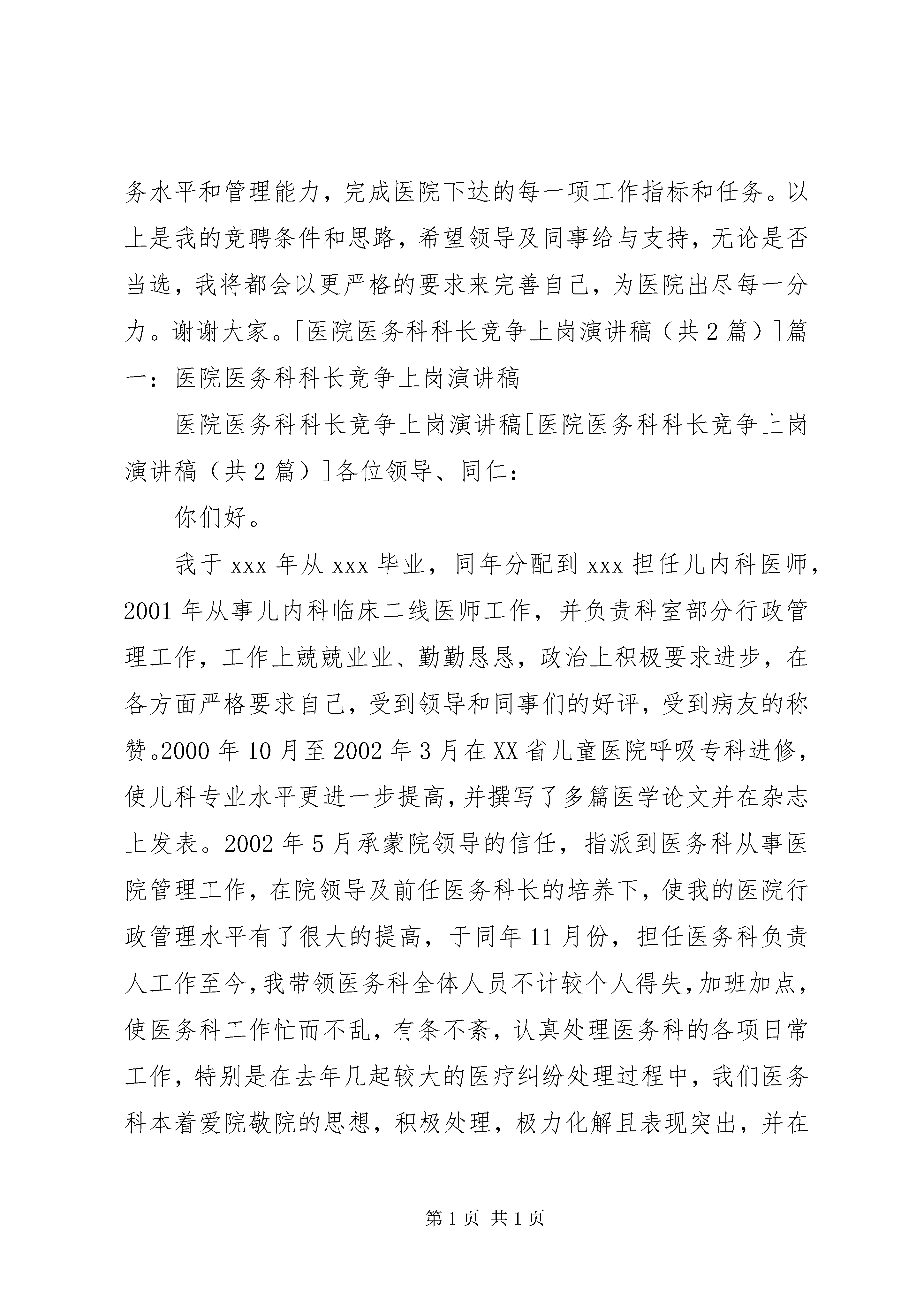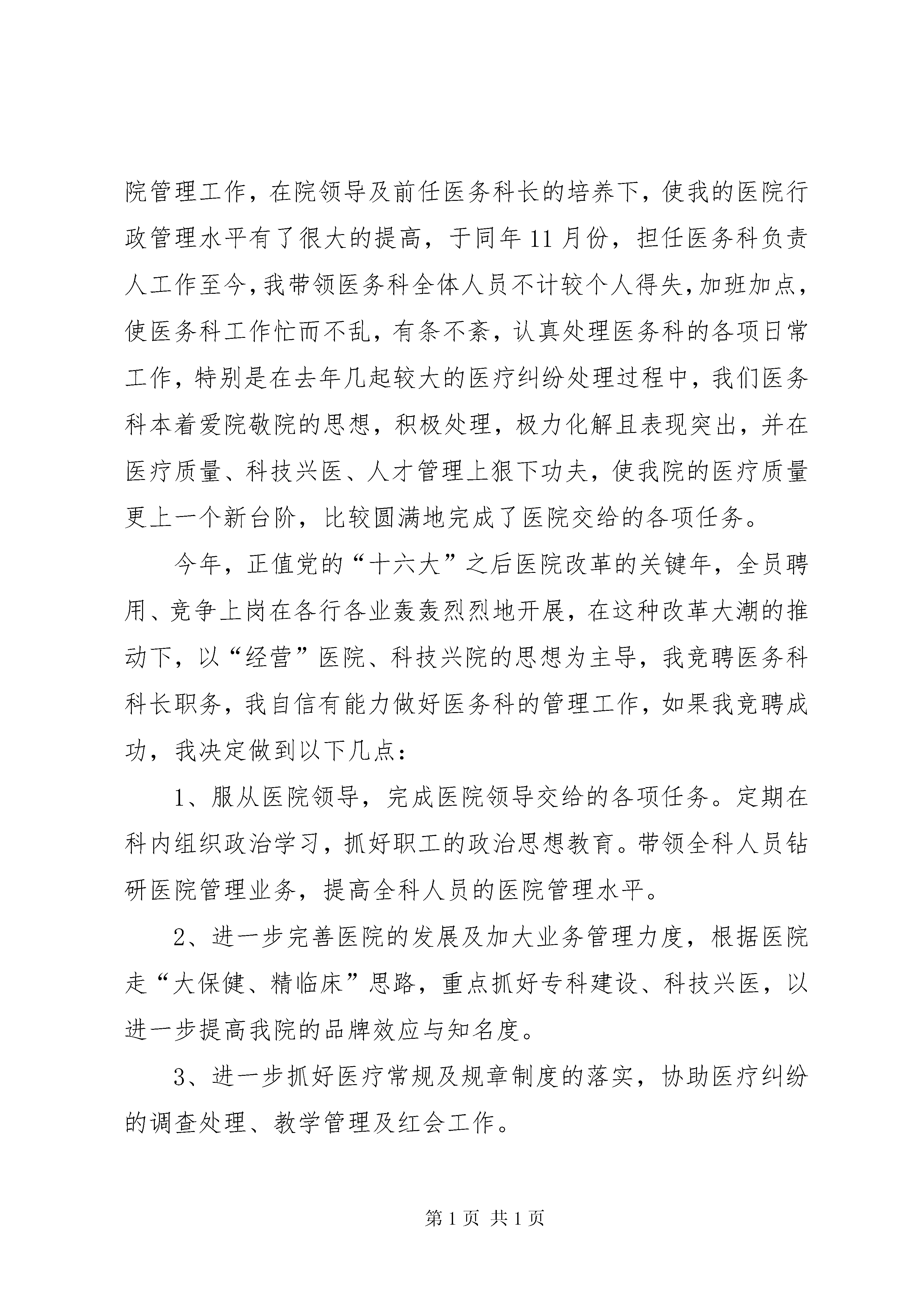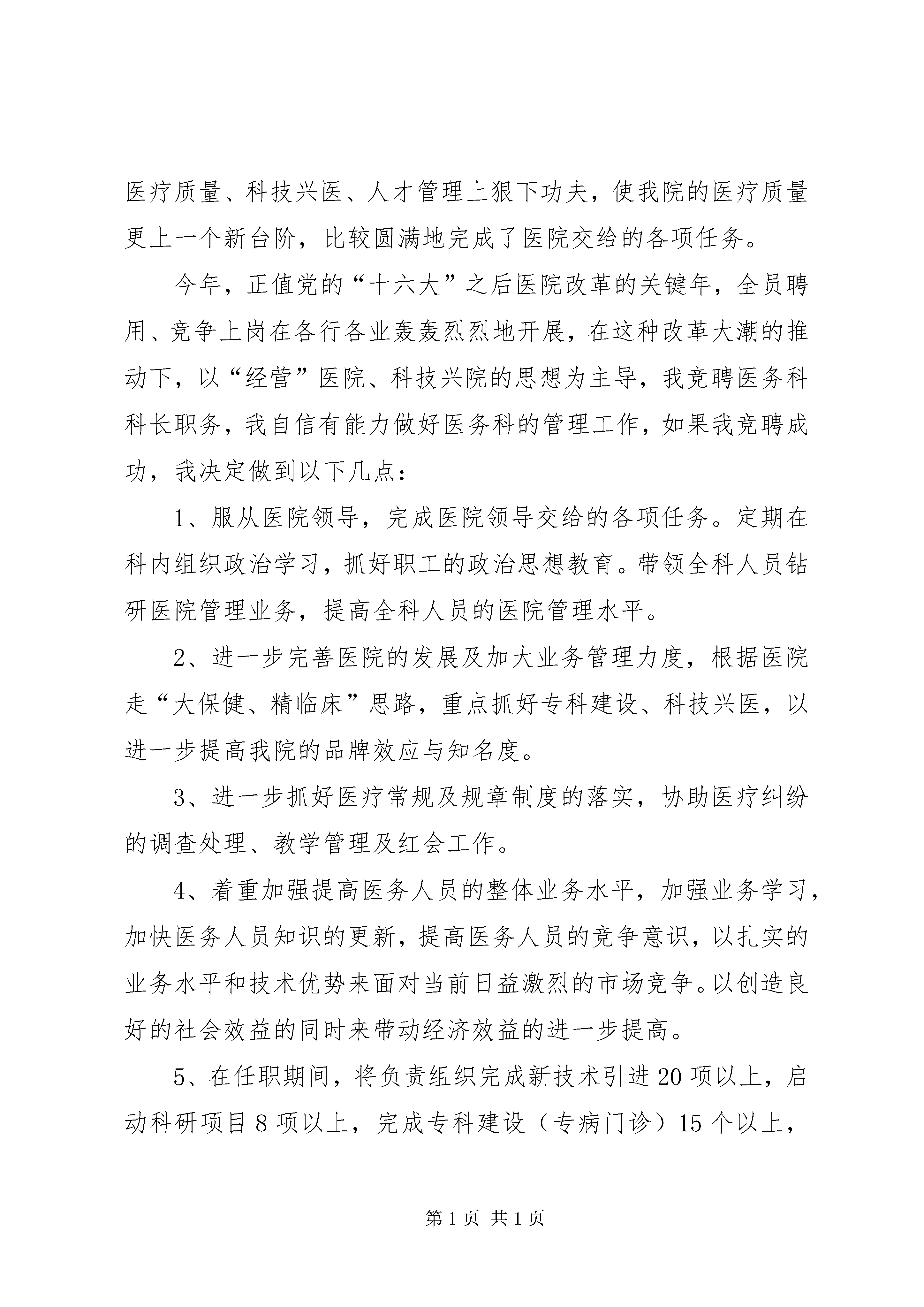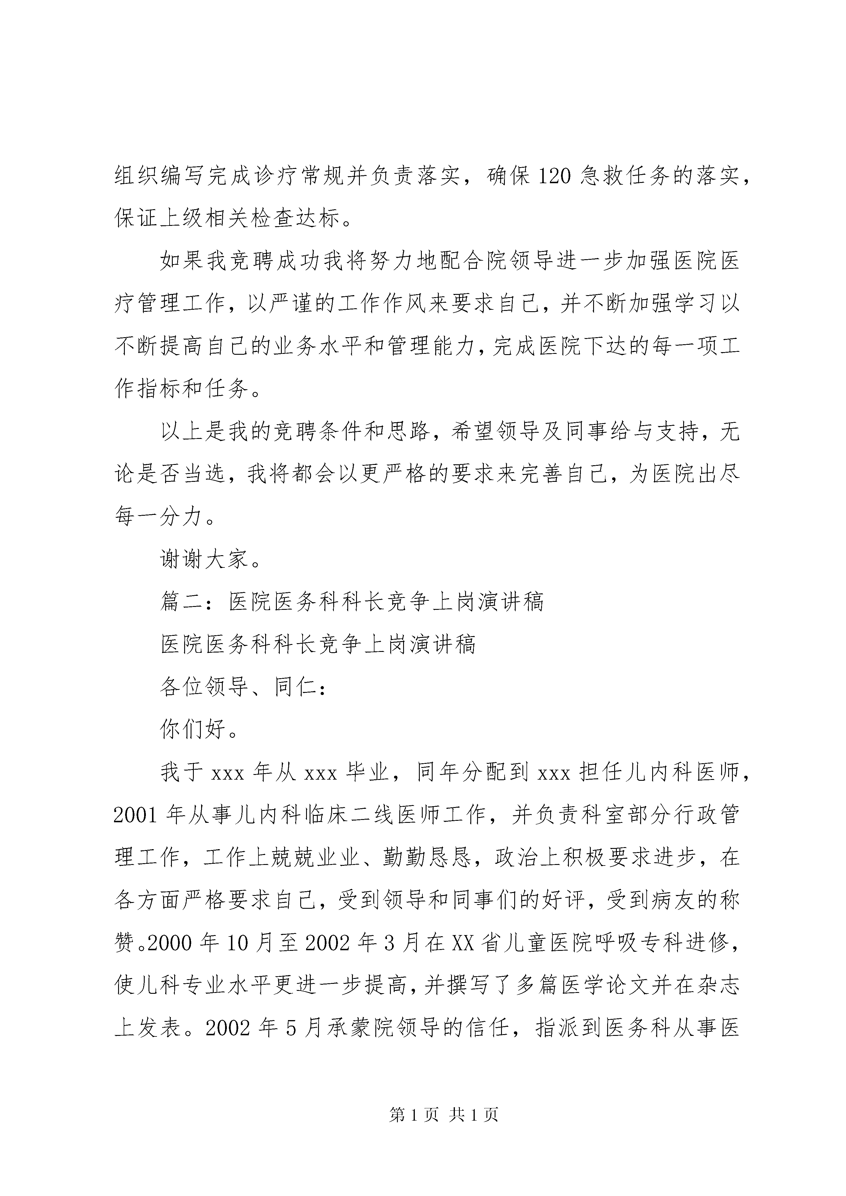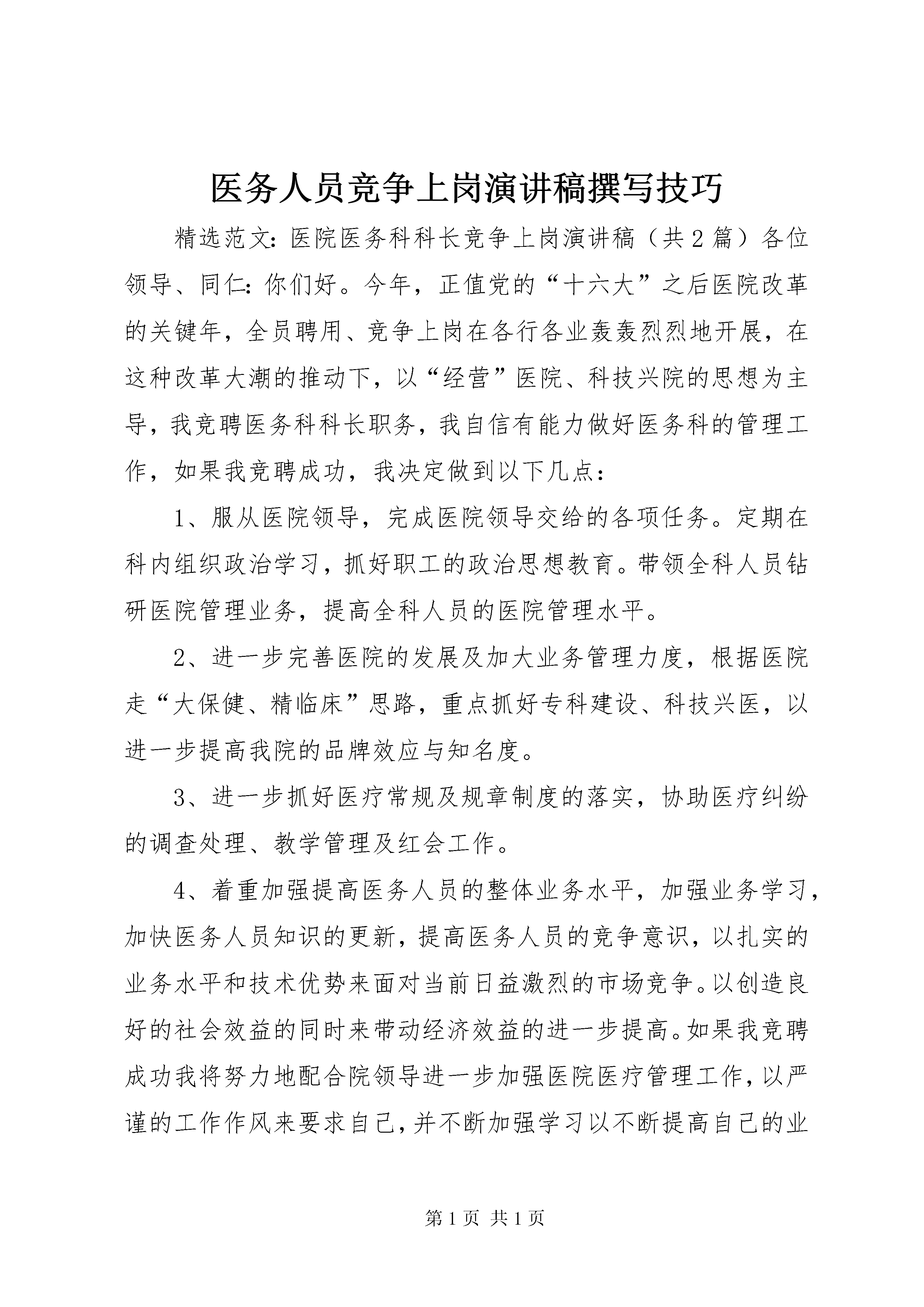医务人员竞争上岗演讲稿撰写技巧精选范文:医院医务科科长竞争上岗演讲稿(共2篇)各位领导、同仁:你们好。今年,正值党的“十六大”之后医院改革的关键年,全员聘用、竞争上岗在各行各业轰轰烈烈地开展,在这种改革大潮的推动下,以“经营”医院、科技兴院的思想为主导,我竞聘医务科科长职务,我自信有能力做好医务科的管理工作,如果我竞聘成功,我决定做到以下几点:1、服从医院领导,完成医院领导交给的各项任务。定期在科内组织政治学习,抓好职工的政治思想教育。带领全科人员钻研医院管理业务,提高全科人员的医院管理水平。2、进一步完善医院的发展及加大业务管理力度,根据医院走“大保健、精临床”思路,重点抓好专科建设、科技兴医,以进一步提高我院的品牌效应与知名度。3、进一步抓好医疗常规及规章制度的落实,协助医疗纠纷的调查处理、教学管理及红会工作。4、着重加强提高医务人员的整体业务水平,加强业务学习,加快医务人员知识的更新,提高医务人员的竞争意识,以扎实的业务水平和技术优势来面对当前日益激烈的市场竞争。以创造良好的社会效益的同时来带动经济效益的进一步提高。如果我竞聘成功我将努力地配合院领导进一步加强医院医疗管理工作,以严谨的工作作风来要求自己,并不断加强学习以不断提高自己的业务水平和管理能力,完成医院下达的每一项工作指标和任务。以上是我的竞聘条件和思路,希望领导及同事给与支持,无论是否当选,我将都会以更严格的要求来完善自己,为医院出尽每一分力。谢谢大家。[医院医务科科长竞争上岗演讲稿(共2篇)]篇一:医院医务科科长竞争上岗演讲稿医院医务科科长竞争上岗演讲稿[医院医务科科长竞争上岗演讲稿(共2篇)]各位领导、同仁:你们好。我于xxx年从xxx毕业,同年分配到xxx担任儿内科医师,2001年从事儿内科临床二线医师工作,并负责科室部分行政管理工作,工作上兢兢业业、勤勤恳恳,政治上积极要求进步,在各方面严格要求自己,受到领导和同事们的好评,受到病友的称赞。2000年10月至2002年3月在XX省儿童医院呼吸专科进修,使儿科专业水平更进一步提高,并撰写了多篇医学论文并在杂志上发表。2002年5月承蒙院领导的信任,指派到医务科从事医院管理工作,在院领导及前任医务科长的培养下,使我的医院行政管理水平有了很大的提高,于同年11月份,担任医务科负责人工作至今,我带领医务科全体人员不计较个人得失,加班加点,使医务科工作忙而不乱,有条不紊,认真处理医务科的各项日常工作,特别是在去年几起较大的医疗纠纷处理过程中,我们医务科本着爱院敬院的思想,积极处理,极力化解且表现突出,并在医疗质量、科技兴医、人才管理上狠下功夫,使我院的医疗质量更上一个新台阶,比较圆满地完成了医院交给的各项任务。今年,正值党的“十六大”之后医院改革的关键年,全员聘用、竞争上岗在各行各业轰轰烈烈地开展,在这种改革大潮的推动下,以“经营”医院、科技兴院的思想为主导,我竞聘医务科科长职务,我自信有能力做好医务科的管理工作,如果我竞聘成功,我决定做到以下几点:1、服从医院领导,完成医院领导交给的各项任务。定期在科内组织政治学习,抓好职工的政治思想教育。带领全科人员钻研医院管理业务,提高全科人员的医院管理水平。2、进一步完善医院的发展及加大业务管理力度,根据医院走“大保健、精临床”思路,重点抓好专科建设、科技兴医,以进一步提高我院的品牌效应与知名度。3、进一步抓好医疗常规及规章制度的落实,协助医疗纠纷的调查处理、教学管理及红会工作。4、着重加强提高医务人员的整体业务水平,加强业务学习,加快医务人员知识的更新,提高医务人员的竞争意识,以扎实的业务水平和技术优势来面对当前日益激烈的市场竞争。以创造良好的社会效益的同时来带动经济效益的进一步提高。5、在任职期间,将负责组织完成新技术引进20项以上,启动科研项目8项以上,完成专科建设(专病门诊)15个以上,组织编写完成诊疗常规并负责落实,确保120急救任务的落实,保证上级相关检查达标。如果我竞聘成功我将努力地配合院领导进一步加强医院医疗管理工作,以严谨的工作作风来要求自己,并不断加强学习以不断提高自己的业务水平和管理能力,完成医院下达的每一项工作指标和任务。以上是我的竞聘条件和思路,希望领导及同事给与支持,无论是否当选,我将都会以更严格的要求来完善自己,为医院出尽每一分力。谢谢大家。篇二:医院医务科科长竞争上岗演讲稿医院医务科科长竞争上岗演讲稿各位领导、同仁:你们好。我于xxx年从xxx毕业,同年分配到xxx担任儿内科医师,2001年从事儿内科临床二线医师工作,并负责科室部分行政管理工作,工作上兢兢业业、勤勤恳恳,政治上积极要求进步,在各方面严格要求自己,受到领导和同事们的好评,受到病友的称赞。2000年10月至2002年3月在XX省儿童医院呼吸专科进修,使