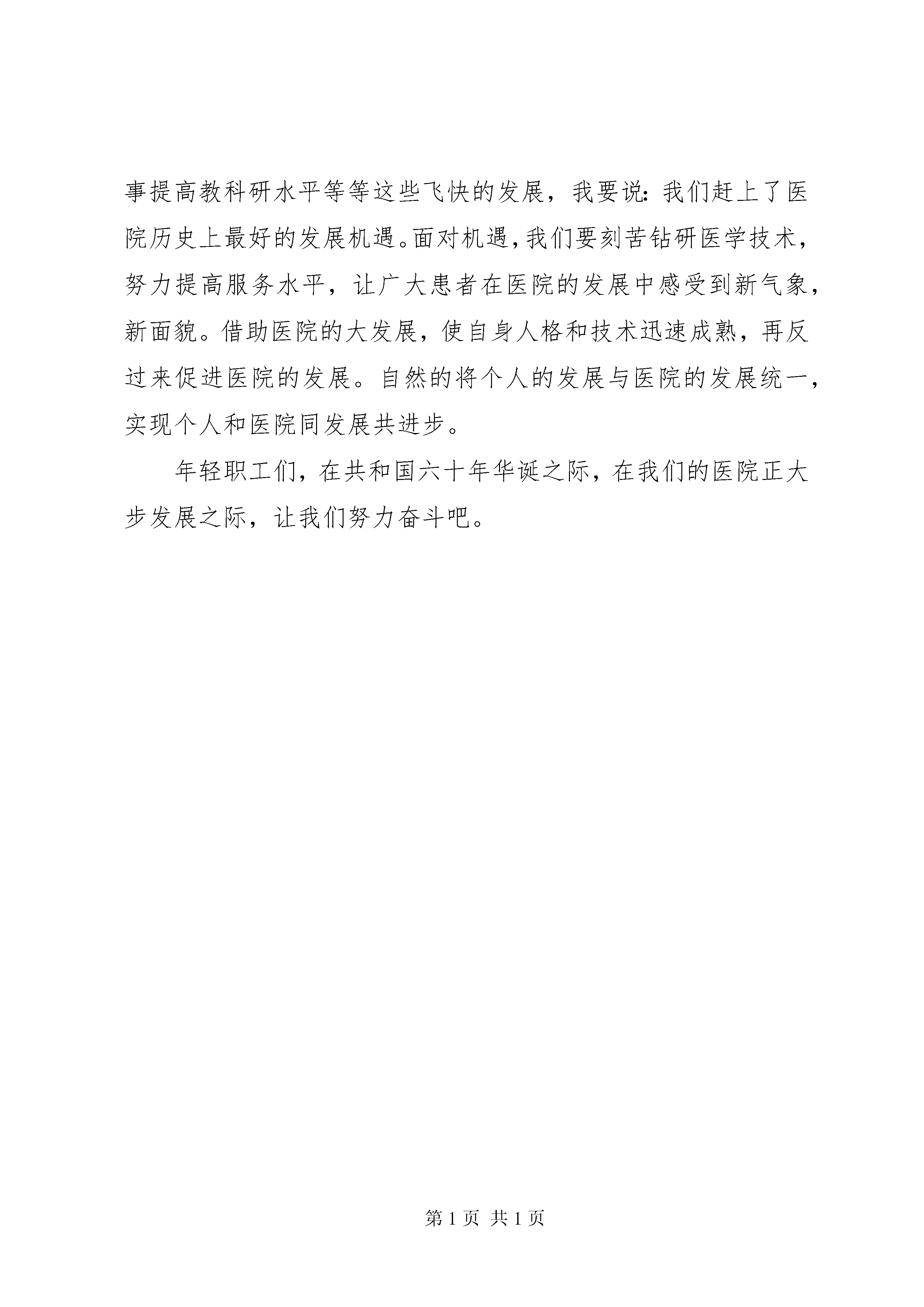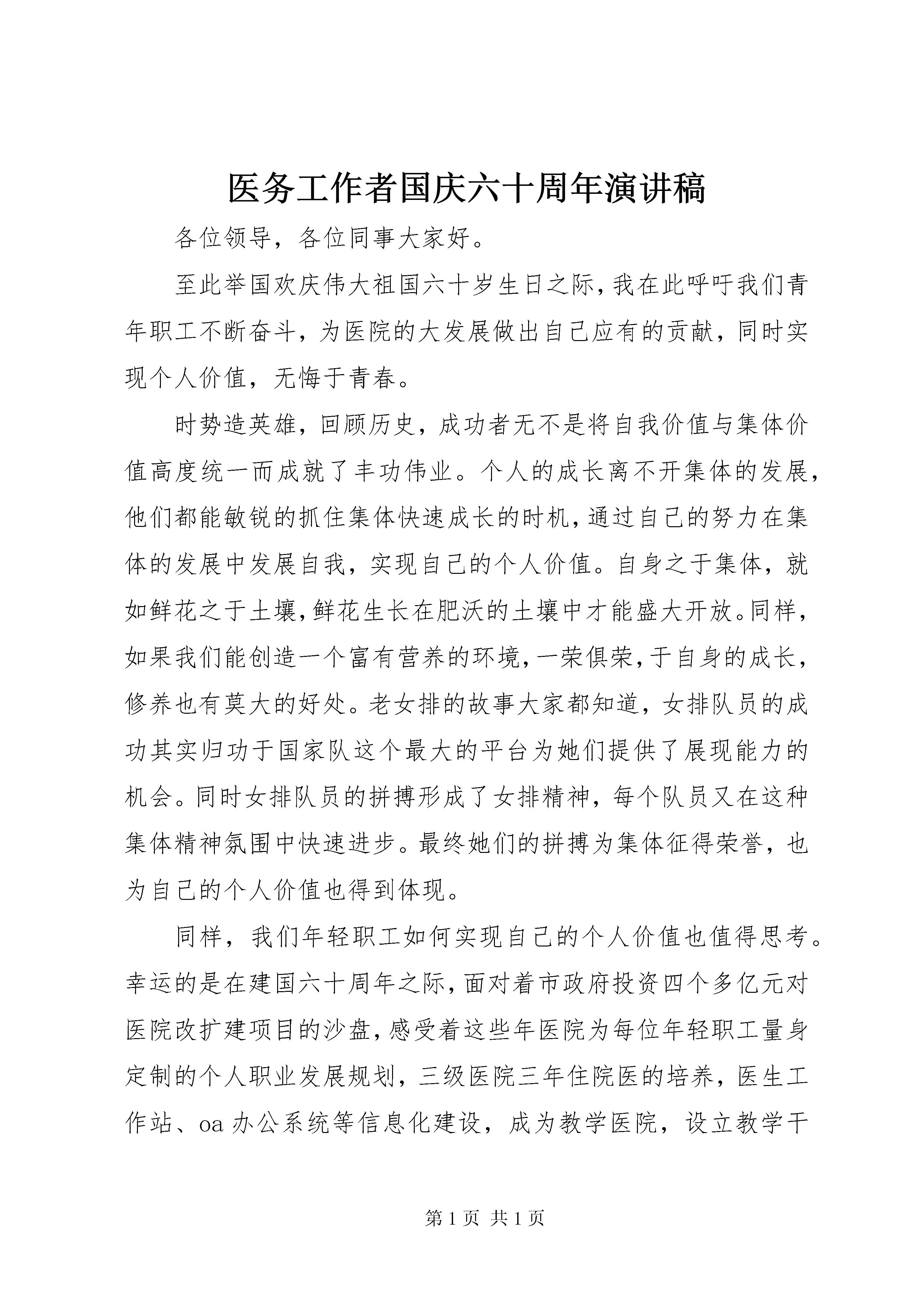 医务工作者国庆六十周年演讲稿各位领导,各位同事大家好。至此举国欢庆伟大祖国六十岁生日之际,我在此呼吁我们青年职工不断奋斗,为医院的大发展做出自己应有的贡献,同时实现个人价值,无悔于青春。时势造英雄,回顾历史,成功者无不是将自我价值与集体价值高度统一而成就了丰功伟业。个人的成长离不开集体的发展,他们都能敏锐的抓住集体快速成长的时机,通过自己的努力在集体的发展中发展自我,实现自己的个人价值。自身之于集体,就如鲜花之于土壤,鲜花生长在肥沃的土壤中才能盛大开放。同样,如果我们能创造一个富有营养的环境,一荣俱荣,于自身的成长,修养也有莫大的好处。老女排的故事大家都知道,女排队员的成功其实归功于国家队这个最大的平台为她们提供了展现能力的机会。同时女排队员的拼搏形成了女排精神,每个队员又在这种集体精神氛围中快速进步。最终她们的拼搏为集体征得荣誉,也为自己的个人价值也得到体现。同样,我们年轻职工如何实现自己的个人价值也值得思考。幸运的是在建国六十周年之际,面对着市政府投资四个多亿元对医院改扩建项目的沙盘,感受着这些年医院为每位年轻职工量身定制的个人职业发展规划,三级医院三年住院医的培养,医生工作站、oa办公系统等信息化建设,成为教学医院,设立教学干事提高教科研水平等等这些飞快的发展,我要说:我们赶上了医院历史上最好的发展机遇。面对机遇,我们要刻苦钻研医学技术,努力提高服务水平,让广大患者在医院的发展中感受到新气象,新面貌。借助医院的大发展,使自身人格和技术迅速成熟,再反过来促进医院的发展。自然的将个人的发展与医院的发展统一,实现个人和医院同发展共进步。年轻职工们,在共和国六十年华诞之际,在我们的医院正大步发展之际,让我们努力奋斗吧。