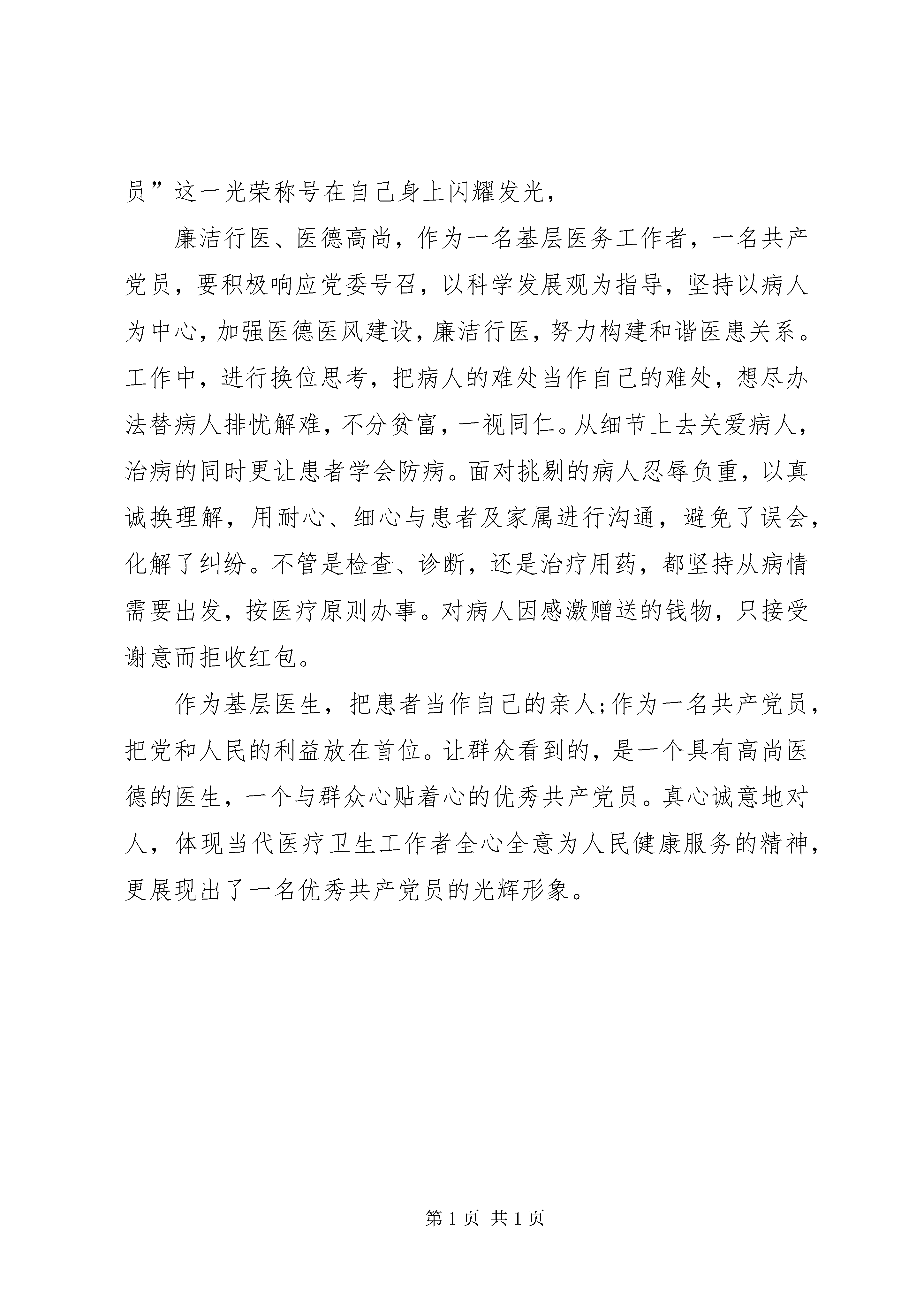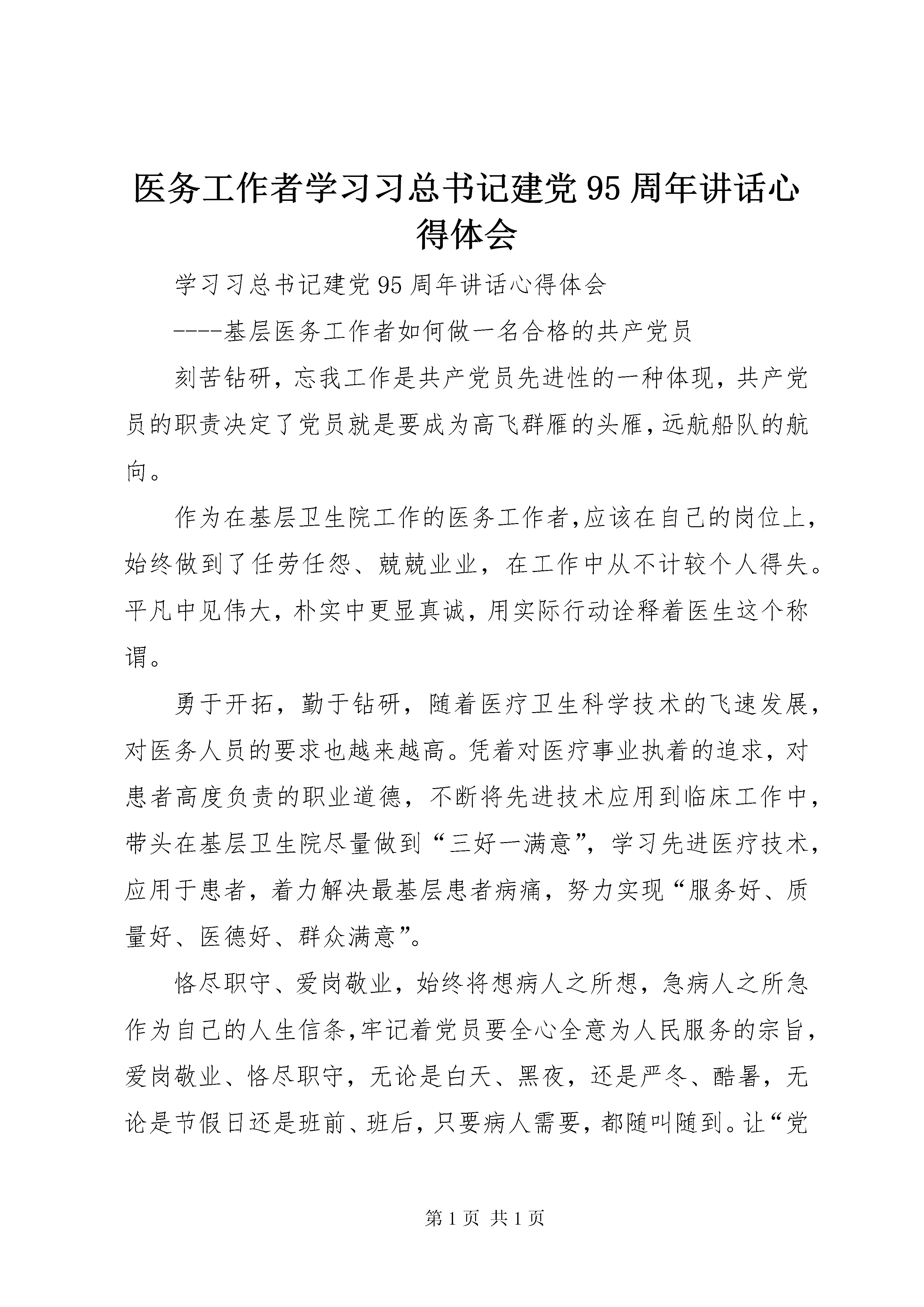 医务工作者学习习总书记建党95周年讲话心得体会学习习总书记建党95周年讲话心得体会----基层医务工作者如何做一名合格的共产党员刻苦钻研,忘我工作是共产党员先进性的一种体现,共产党员的职责决定了党员就是要成为高飞群雁的头雁,远航船队的航向。作为在基层卫生院工作的医务工作者,应该在自己的岗位上,始终做到了任劳任怨、兢兢业业,在工作中从不计较个人得失。平凡中见伟大,朴实中更显真诚,用实际行动诠释着医生这个称谓。勇于开拓,勤于钻研,随着医疗卫生科学技术的飞速发展,对医务人员的要求也越来越高。凭着对医疗事业执着的追求,对患者高度负责的职业道德,不断将先进技术应用到临床工作中,带头在基层卫生院尽量做到“三好一满意”,学习先进医疗技术,应用于患者,着力解决最基层患者病痛,努力实现“服务好、质量好、医德好、群众满意”。恪尽职守、爱岗敬业,始终将想病人之所想,急病人之所急作为自己的人生信条,牢记着党员要全心全意为人民服务的宗旨,爱岗敬业、恪尽职守,无论是白天、黑夜,还是严冬、酷暑,无论是节假日还是班前、班后,只要病人需要,都随叫随到。让“党员”这一光荣称号在自己身上闪耀发光,廉洁行医、医德高尚,作为一名基层医务工作者,一名共产党员,要积极响应党委号召,以科学发展观为指导,坚持以病人为中心,加强医德医风建设,廉洁行医,努力构建和谐医患关系。工作中,进行换位思考,把病人的难处当作自己的难处,想尽办法替病人排忧解难,不分贫富,一视同仁。从细节上去关爱病人,治病的同时更让患者学会防病。面对挑剔的病人忍辱负重,以真诚换理解,用耐心、细心与患者及家属进行沟通,避免了误会,化解了纠纷。不管是检查、诊断,还是治疗用药,都坚持从病情需要出发,按医疗原则办事。对病人因感激赠送的钱物,只接受谢意而拒收红包。作为基层医生,把患者当作自己的亲人;作为一名共产党员,把党和人民的利益放在首位。让群众看到的,是一个具有高尚医德的医生,一个与群众心贴着心的优秀共产党员。真心诚意地对人,体现当代医疗卫生工作者全心全意为人民健康服务的精神,更展现出了一名优秀共产党员的光辉形象。